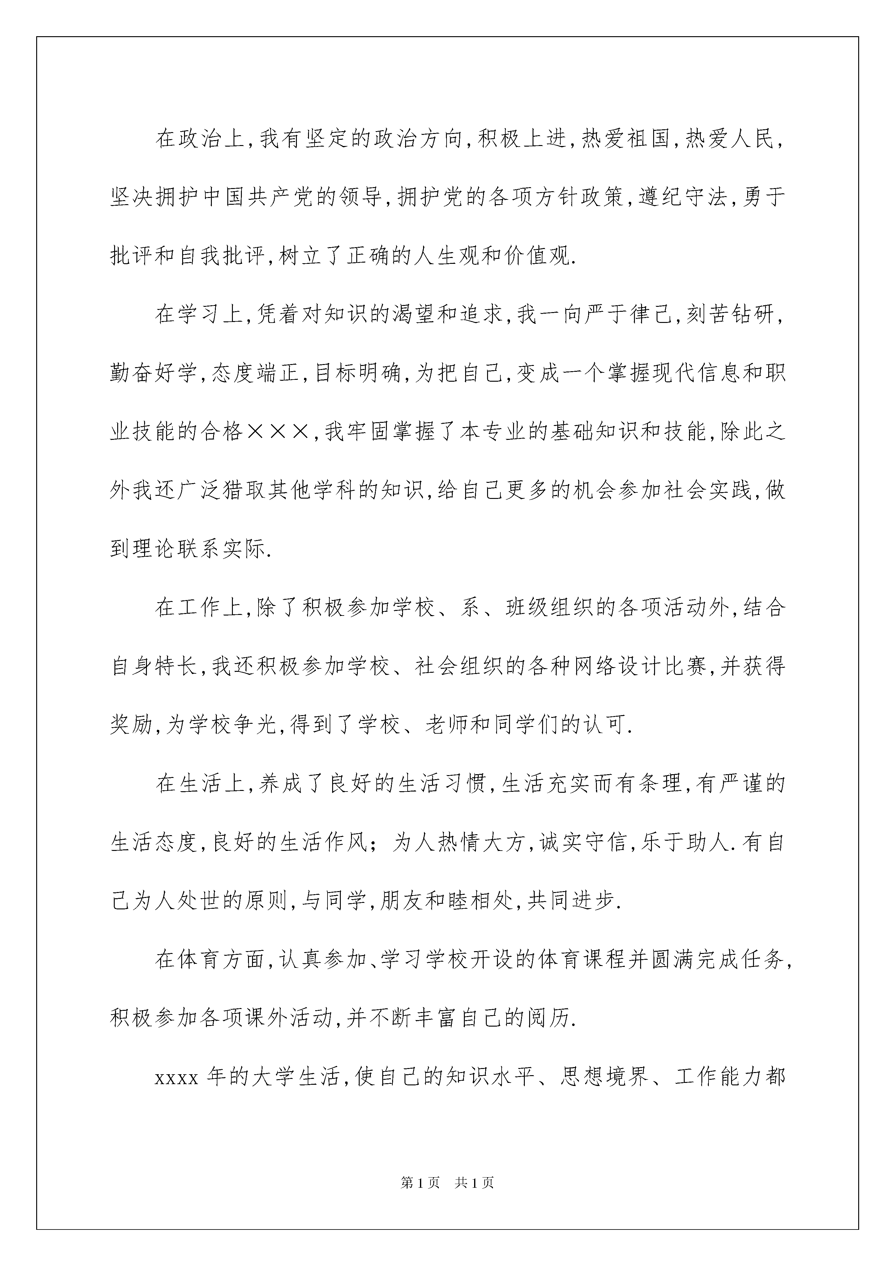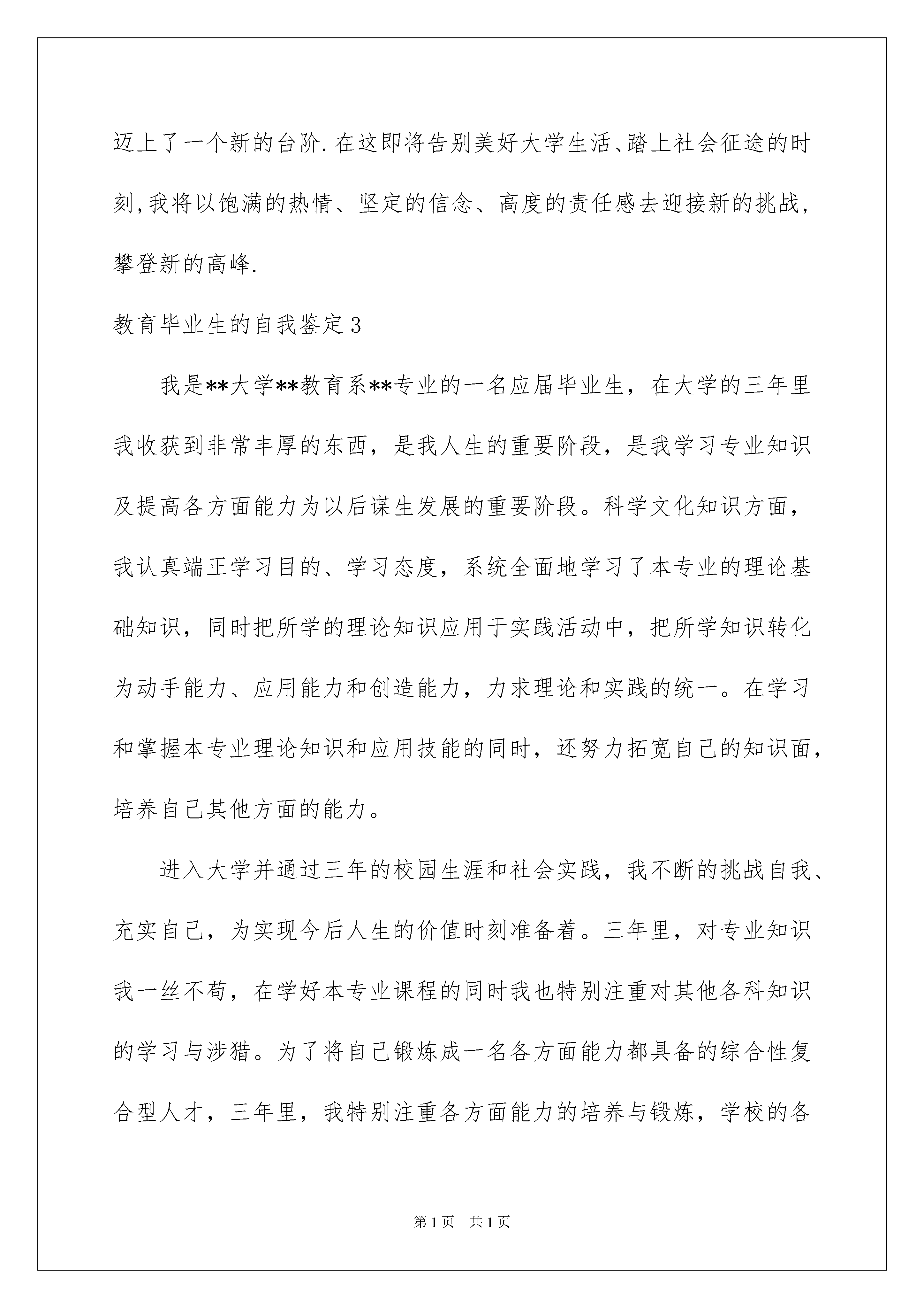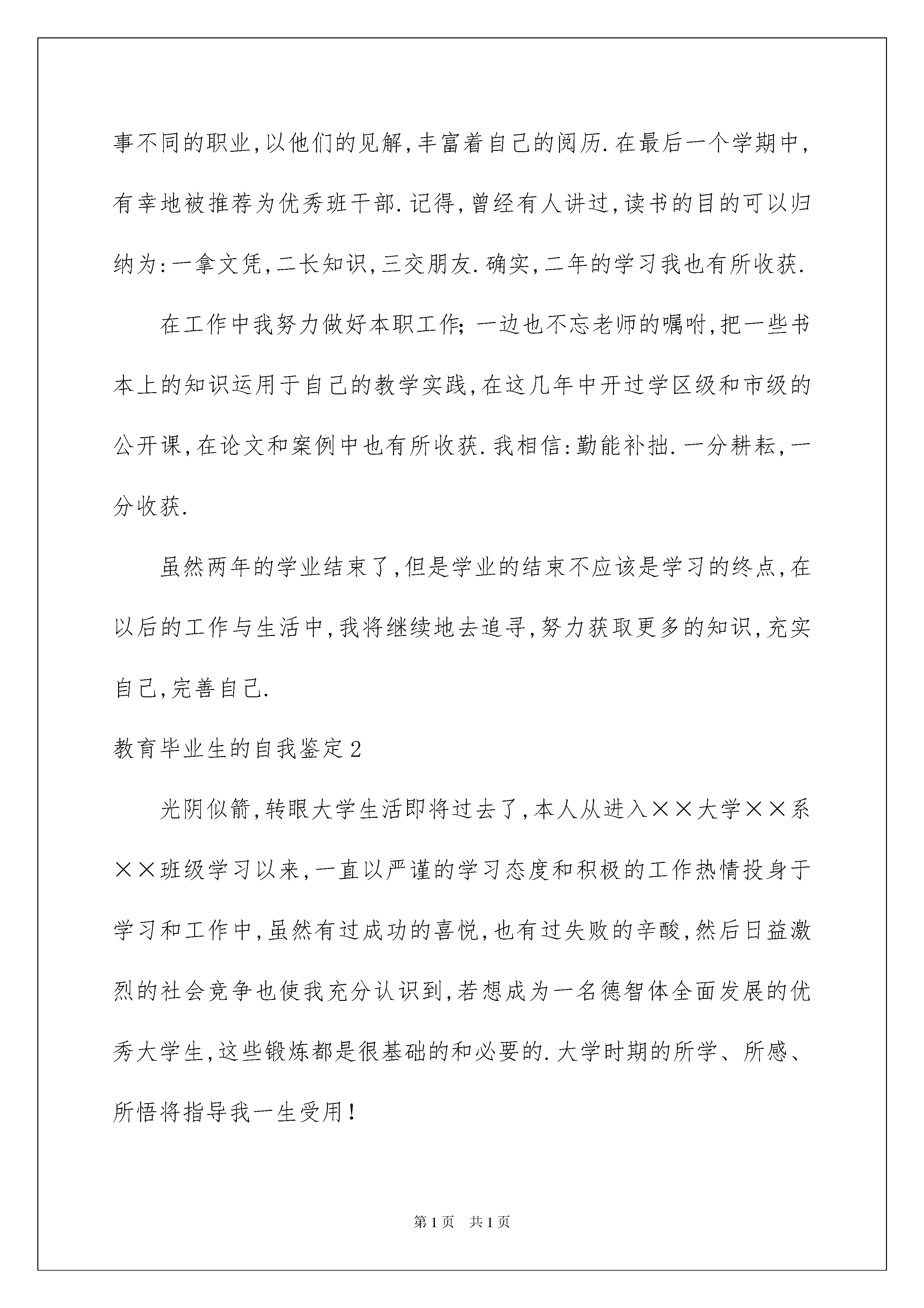 2022教育毕业生的自我鉴定教育毕业生的自我鉴定自我鉴定是个人在一个阶段的自我总结,自我鉴定就可以促使我们思考,为此要我们做好自我鉴定。那么你真的懂得怎么写自我鉴定吗?下面是我为大家收集的教育毕业生的自我鉴定,仅供参考,大家一起来看看吧。教育毕业生的自我鉴定1参加浙师大本科函授学习两年了,通过学习获得的不仅是一个学历,更多的是知识,是经历.现在即将毕业,回首过往的足迹,点点滴滴依旧清晰可见.自从xx年被师大成教学院汉语言文学专业录取后,充满信心的我以满腔的热情全身心地投入函授学习中.大学毕业出来进入社会工作以后,意识到了学习的重要性,警醒着过去三年大学生活的庸碌.于是上课期间,我改变了以往大学学习的态度,不迟到、不早退,勤做笔记.我不仅喜欢自己所学的专业,也喜欢自己的班级.班中的事务我主动参与,与班级的同学和睦相处.有些和自己一样从事教育,也有些从事不同的职业,以他们的见解,丰富着自己的阅历.在最后一个学期中,有幸地被推荐为优秀班干部.记得,曾经有人讲过,读书的目的可以归纳为:一拿文凭,二长知识,三交朋友.确实,二年的学习我也有所收获.在工作中我努力做好本职工作;一边也不忘老师的嘱咐,把一些书本上的知识运用于自己的教学实践,在这几年中开过学区级和市级的公开课,在论文和案例中也有所收获.我相信:勤能补拙.一分耕耘,一分收获.虽然两年的学业结束了,但是学业的结束不应该是学习的终点,在以后的工作与生活中,我将继续地去追寻,努力获取更多的知识,充实自己,完善自己.教育毕业生的自我鉴定2光阴似箭,转眼大学生活即将过去了,本人从进入××大学××系××班级学习以来,一直以严谨的学习态度和积极的工作热情投身于学习和工作中,虽然有过成功的喜悦,也有过失败的辛酸,然后日益激烈的社会竞争也使我充分认识到,若想成为一名德智体全面发展的优秀大学生,这些锻炼都是很基础的和必要的.大学时期的所学、所感、所悟将指导我一生受用!在政治上,我有坚定的政治方向,积极上进,热爱祖国,热爱人民,坚决拥护中国共产党的领导,拥护党的各项方针政策,遵纪守法,勇于批评和自我批评,树立了正确的人生观和价值观.在学习上,凭着对知识的渴望和追求,我一向严于律己,刻苦钻研,勤奋好学,态度端正,目标明确,为把自己,变成一个掌握现代信息和职业技能的合格×××,我牢固掌握了本专业的基础知识和技能,除此之外我还广泛猎取其他学科的知识,给自己更多的机会参加社会实践,做到理论联系实际.在工作上,除了积极参加学校、系、班级组织的各项活动外,结合自身特长,我还积极参加学校、社会组织的各种网络设计比赛,并获得奖励,为学校争光,得到了学校、老师和同学们的认可.在生活上,养成了良好的生活习惯,生活充实而有条理,有严谨的生活态度,良好的生活作风;为人热情大方,诚实守信,乐于助人.有自己为人处世的原则,与同学,朋友和睦相处,共同进步.在体育方面,认真参加、学习学校开设的体育课程并圆满完成任务,积极参加各项课外活动,并不断丰富自己的阅历.xxxx年的大学生活,使自己的知识水平、思想境界、工作能力都迈上了一个新的台阶.在这即将告别美好大学生活、踏上社会征途的时刻,我将以饱满的热情、坚定的信念、高度的责任感去迎接新的挑战,攀登新的高峰.教育毕业生的自我鉴定3我是**大学**教育系**专业的一名应届毕业生,在大学的三年里我收获到非常丰厚的东西,是我人生的重要阶段,是我学习专业知识及提高各方面能力为以后谋生发展的重要阶段。科学文化知识方面,我认真端正学习目的、学习态度,系统全面地学习了本专业的理论基础知识,同时把所学的理论知识应用于实践活动中,把所学知识转化为动手能力、应用能力和创造能力,力求理论和实践的统一。在学习和掌握本专业理论知识和应用技能的同时,还努力拓宽自己的知识面,培养自己其他方面的能力。进入大学并通过三年的校园生涯和社会实践,我不断的挑战自我、充实自己,为实现今后人生的价值时刻准备着。三年里,对专业知识我一丝不苟,在学好本专业课程的同时我也特别注重对其他各科知识的学习与涉猎。为了将自己锻炼成一名各方面能力都具备的综合性复合型人才,三年里,我特别注重各方面能力的培养与锻炼,学校的各种活动我都热情、积极、踊跃的参加,在校期间,我严格要求自己,力争全面发展。在生活方面,养成了良好的生活习惯,生活充实而有条理,有严谨的生活态度和良好的生活作风,为人性格外向、活泼开朗、热情大方,诚实守信、乐于助人,有积极向上的人生态度和理想追求,拥有良好的处世原则,能与同学们和睦相处;营造了良好的人际关系,受到他人的好评。虽然我真正的工作经历并不多,但是作为初学者,年轻和活力