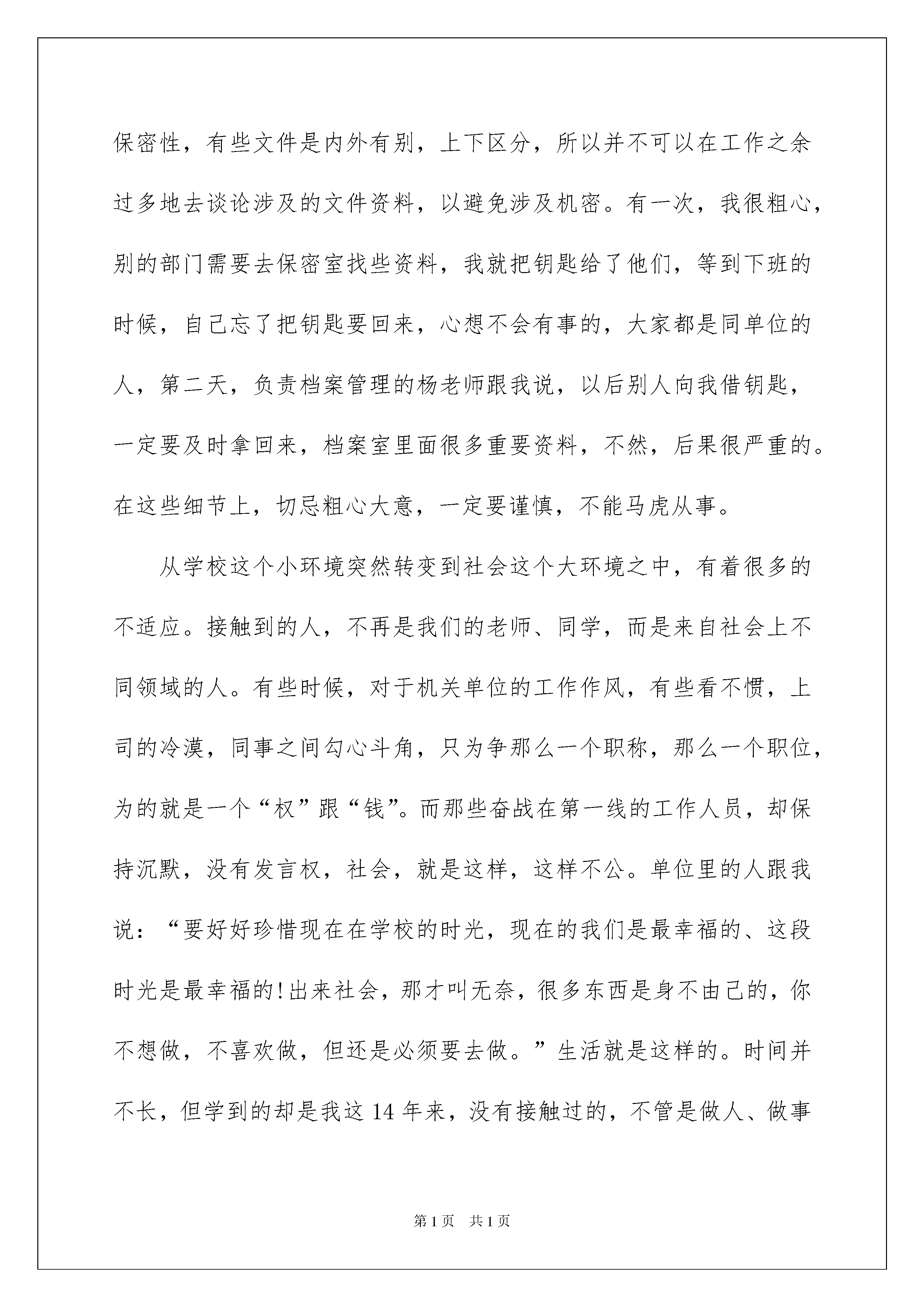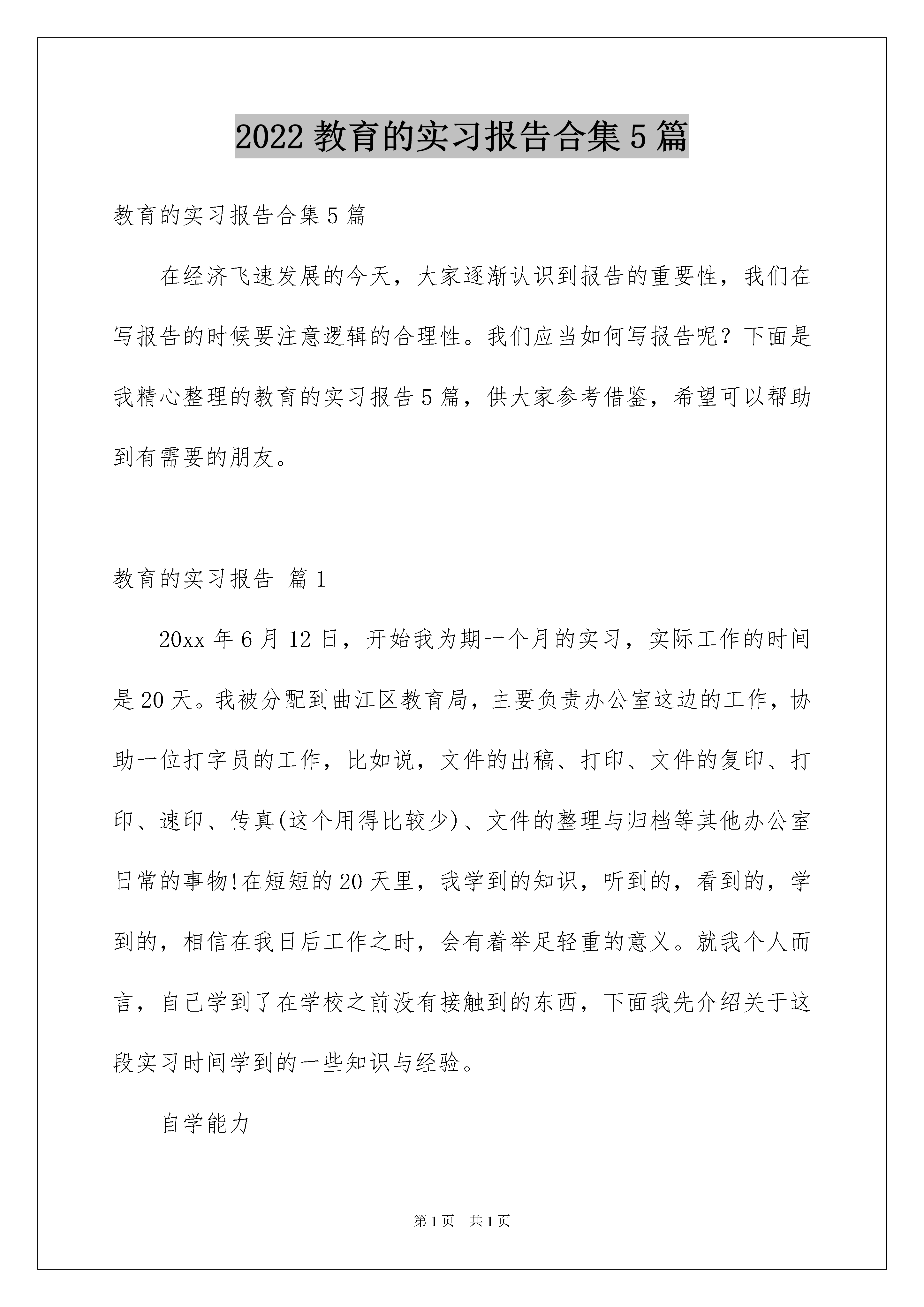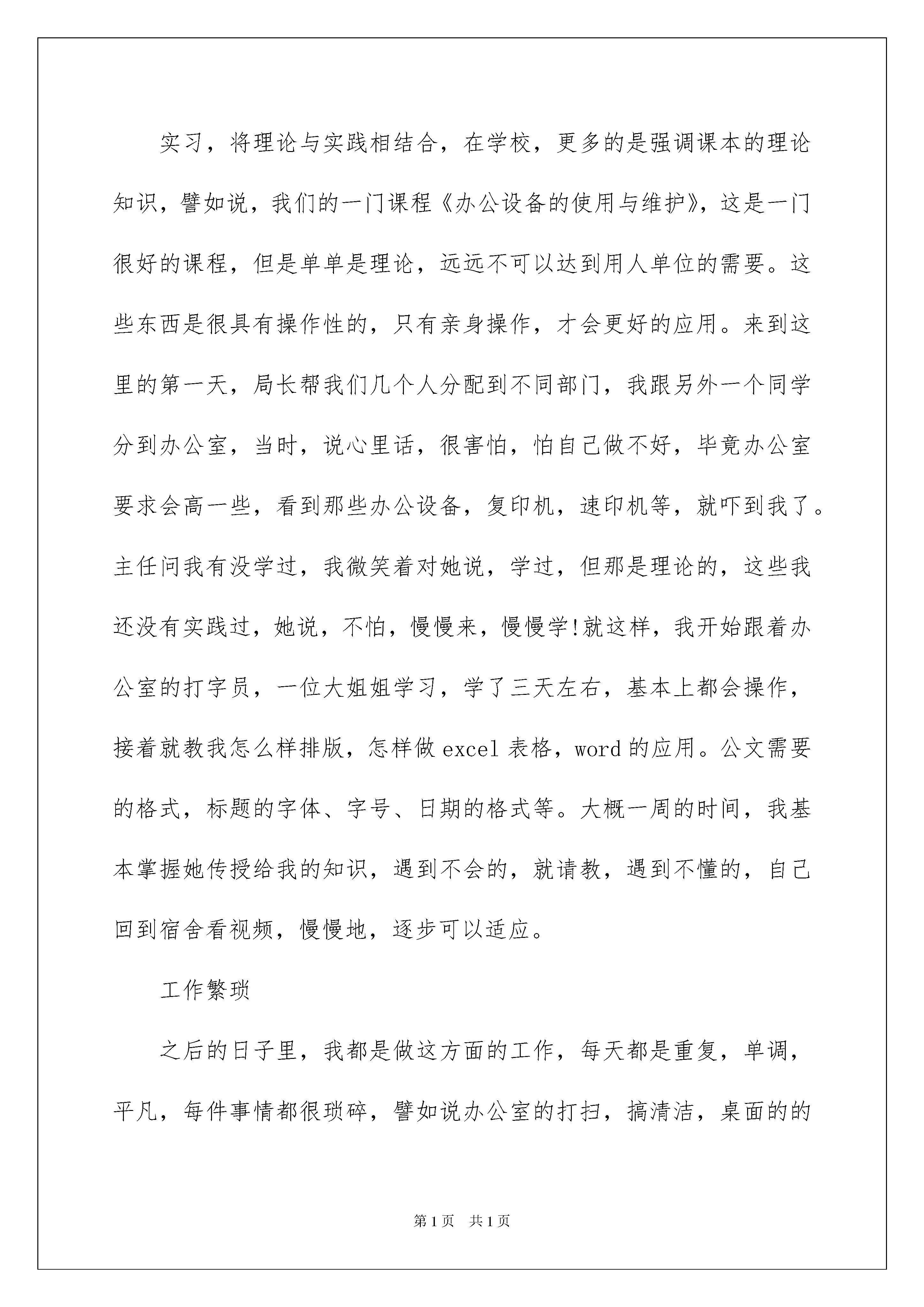 2022教育的实习报告合集5篇教育的实习报告合集5篇在经济飞速发展的今天,大家逐渐认识到报告的重要性,我们在写报告的时候要注意逻辑的合理性。我们应当如何写报告呢?下面是我精心整理的教育的实习报告5篇,供大家参考借鉴,希望可以帮助到有需要的朋友。教育的实习报告篇120xx年6月12日,开始我为期一个月的实习,实际工作的时间是20天。我被分配到曲江区教育局,主要负责办公室这边的工作,协助一位打字员的工作,比如说,文件的出稿、打印、文件的复印、打印、速印、传真(这个用得比较少)、文件的整理与归档等其他办公室日常的事物!在短短的20天里,我学到的知识,听到的,看到的,学到的,相信在我日后工作之时,会有着举足轻重的意义。就我个人而言,自己学到了在学校之前没有接触到的东西,下面我先介绍关于这段实习时间学到的一些知识与经验。自学能力实习,将理论与实践相结合,在学校,更多的是强调课本的理论知识,譬如说,我们的一门课程《办公设备的使用与维护》,这是一门很好的课程,但是单单是理论,远远不可以达到用人单位的需要。这些东西是很具有操作性的,只有亲身操作,才会更好的应用。来到这里的第一天,局长帮我们几个人分配到不同部门,我跟另外一个同学分到办公室,当时,说心里话,很害怕,怕自己做不好,毕竟办公室要求会高一些,看到那些办公设备,复印机,速印机等,就吓到我了。主任问我有没学过,我微笑着对她说,学过,但那是理论的,这些我还没有实践过,她说,不怕,慢慢来,慢慢学!就这样,我开始跟着办公室的打字员,一位大姐姐学习,学了三天左右,基本上都会操作,接着就教我怎么样排版,怎样做excel表格,word的应用。公文需要的格式,标题的字体、字号、日期的格式等。大概一周的时间,我基本掌握她传授给我的知识,遇到不会的,就请教,遇到不懂的,自己回到宿舍看视频,慢慢地,逐步可以适应。工作繁琐之后的日子里,我都是做这方面的工作,每天都是重复,单调,平凡,每件事情都很琐碎,譬如说办公室的打扫,搞清洁,桌面的的整理,会议中的服务,发放资料,斟茶倒水,给相关单位送文件、拿文件……还记得老师说过,秘书工作无小事,确实是这样的。这一次,切身体会到,感触很深。工作态度、正视错误俗话说:“人无完人”,刚出来,走出学校,融入到这个复杂的社会之中,确实有很多的不懂,有许多的不会。还记得有一次,在速印的时候,需要的是80份文件,它的原稿一共有五份,双面的,因为之前没有接触到这么多,一般的量都是比较少的,居然在速印第二张的时候,忘记了先“制版”,天啊,打印出来的东西全部是跟第一张的模式一样,幸亏我发现到,按下“停止”,不然,就浪费了好多纸张,办公室的人员也跟我说,一定要记住,先“制版”!尽管没有说我什么,但我已经认识到自己做错事情了,很内疚,希望这是个教训,以后不要再犯同样的错误。作为一名秘书,在更多的场合需要时刻提醒自己注意自己的言行举止,凡事都需要有个分寸,随时保持一名秘书应有的的气质与修养。坚守自己的岗位、不说空话档案的管理,这段时间,我也接触到一小部分,档案具有很强的保密性,有些文件是内外有别,上下区分,所以并不可以在工作之余过多地去谈论涉及的文件资料,以避免涉及机密。有一次,我很粗心,别的部门需要去保密室找些资料,我就把钥匙给了他们,等到下班的时候,自己忘了把钥匙要回来,心想不会有事的,大家都是同单位的人,第二天,负责档案管理的杨老师跟我说,以后别人向我借钥匙,一定要及时拿回来,档案室里面很多重要资料,不然,后果很严重的。在这些细节上,切忌粗心大意,一定要谨慎,不能马虎从事。从学校这个小环境突然转变到社会这个大环境之中,有着很多的不适应。接触到的人,不再是我们的老师、同学,而是来自社会上不同领域的人。有些时候,对于机关单位的工作作风,有些看不惯,上司的冷漠,同事之间勾心斗角,只为争那么一个职称,那么一个职位,为的就是一个“权”跟“钱”。而那些奋战在第一线的工作人员,却保持沉默,没有发言权,社会,就是这样,这样不公。单位里的人跟我说:“要好好珍惜现在在学校的时光,现在的我们是最幸福的、这段时光是最幸福的!出来社会,那才叫无奈,很多东西是身不由己的,你不想做,不喜欢做,但还是必须要去做。”生活就是这样的。时间并不长,但学到的却是我这14年来,没有接触过的,不管是做人、做事方面,意义重大、影响深远。在这里,有不少的压力,但过后,却发现自己学到不少,也成长了,过程辛苦,流过的汗水,值得,因为我学到我想要的东西。人际关系应酬,是一个秘书必须面对的一项必不可少的工作。对于一个刚踏进社会的我,说心里话,我不喜欢这样的场合,那里有太多形形式式来自不同的人