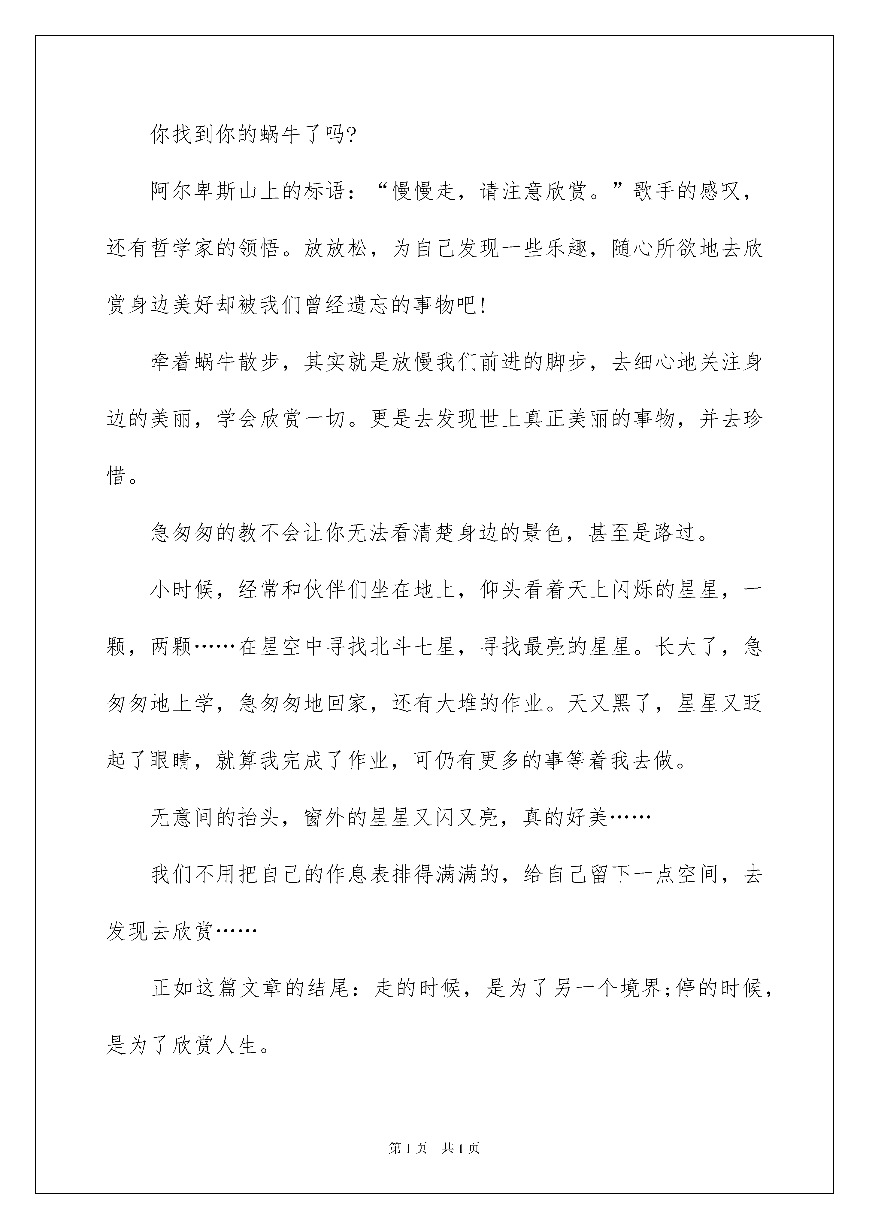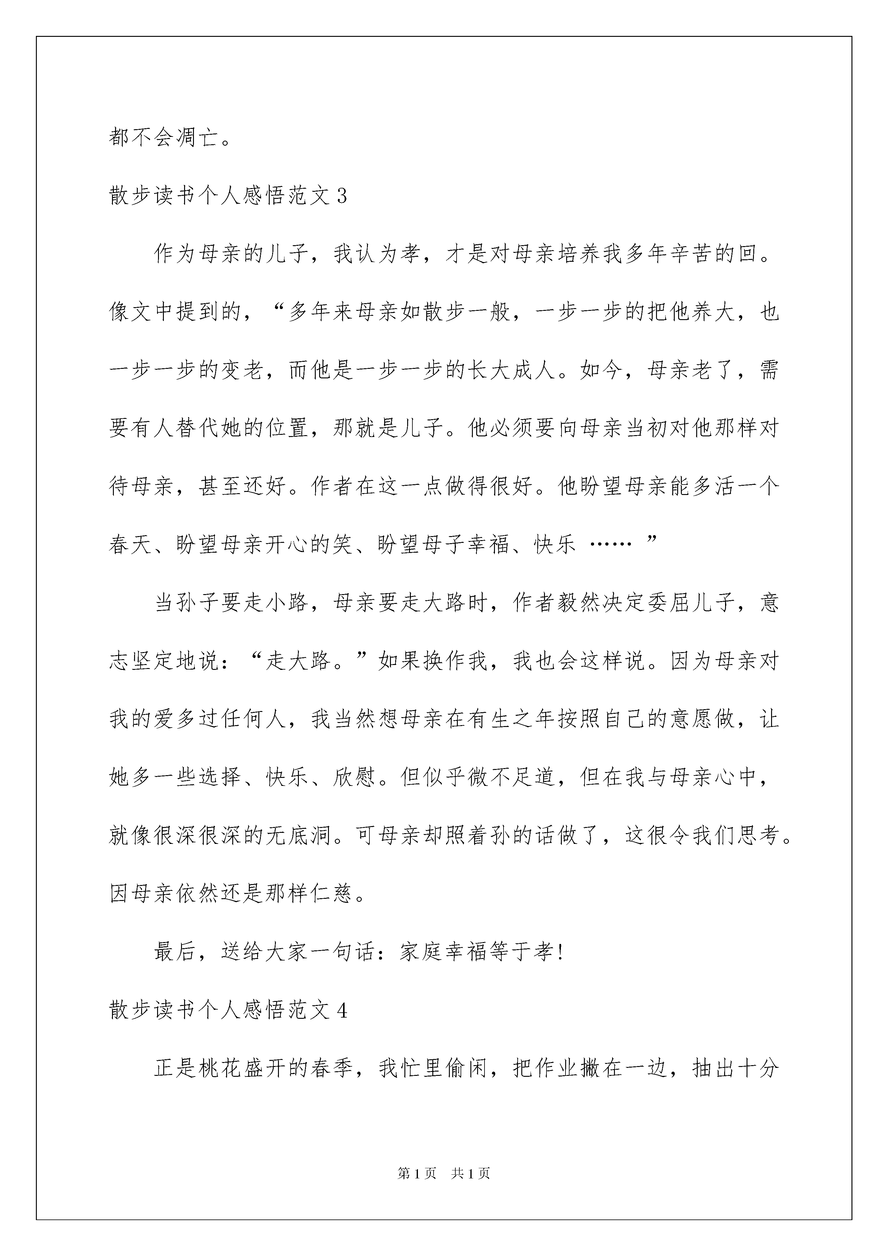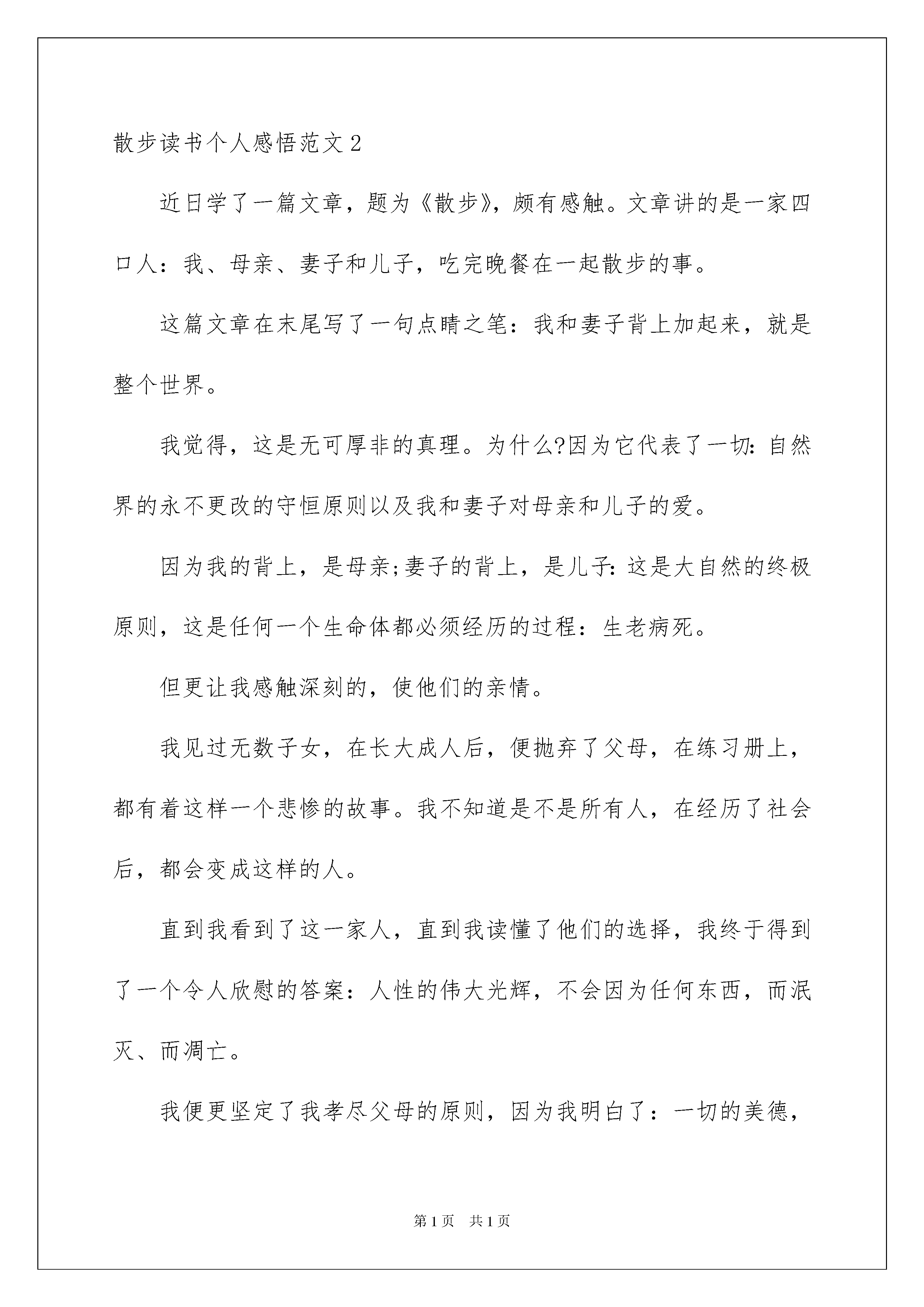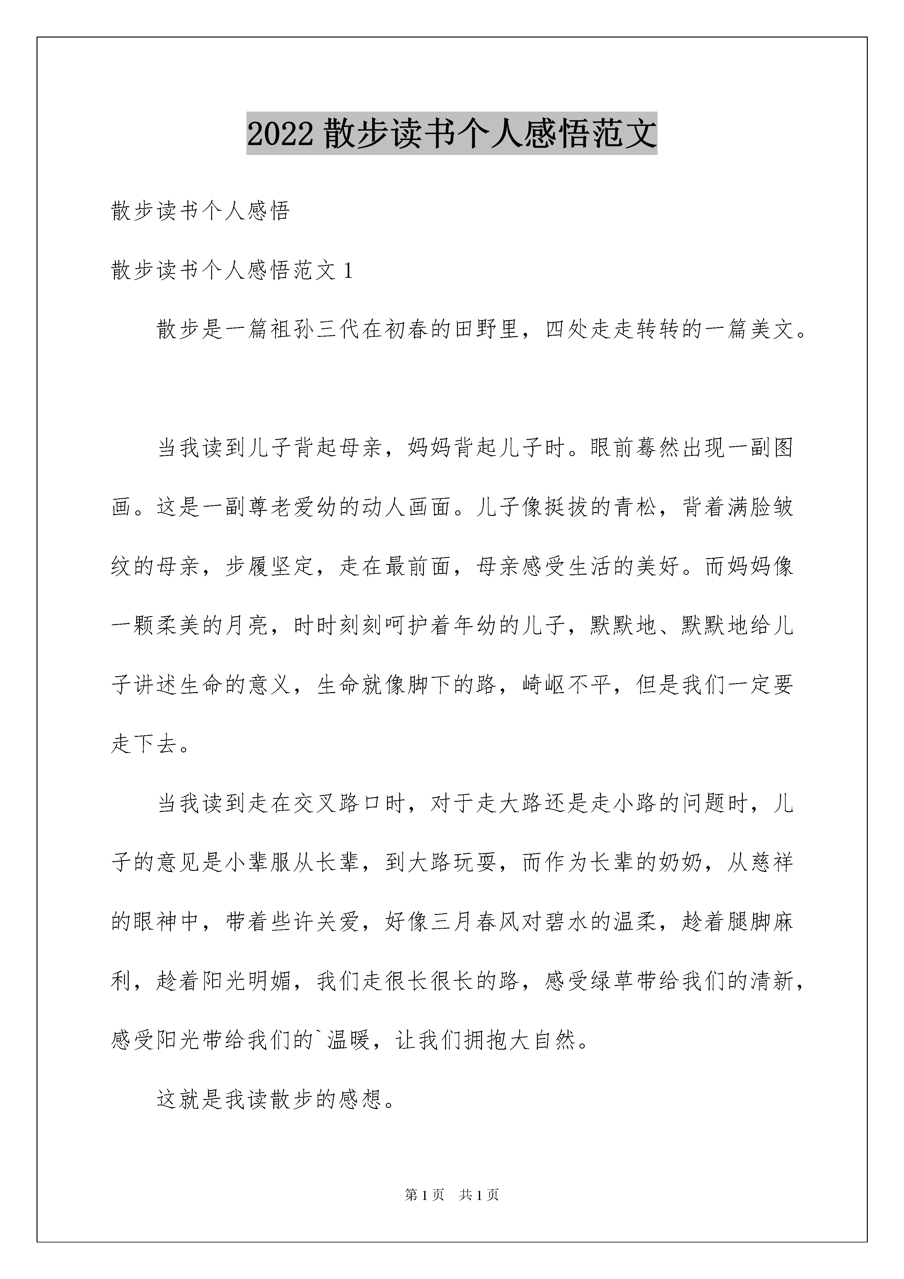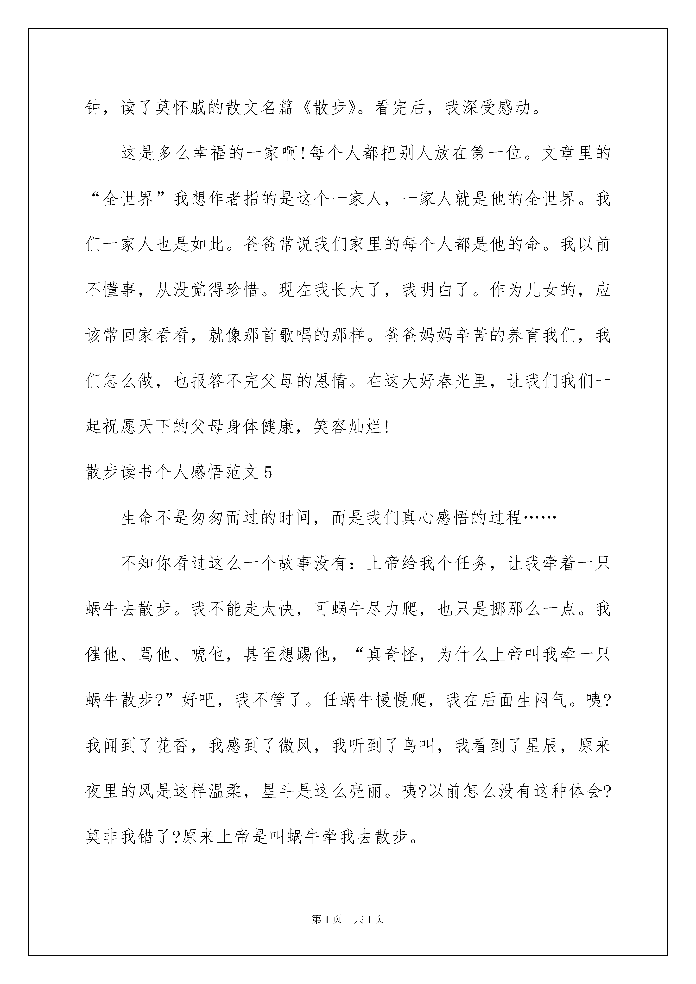 2022散步读书个人感悟范文散步读书个人感悟散步读书个人感悟范文1散步是一篇祖孙三代在初春的田野里,四处走走转转的一篇美文。当我读到儿子背起母亲,妈妈背起儿子时。眼前蓦然出现一副图画。这是一副尊老爱幼的动人画面。儿子像挺拔的青松,背着满脸皱纹的母亲,步履坚定,走在最前面,母亲感受生活的美好。而妈妈像一颗柔美的月亮,时时刻刻呵护着年幼的儿子,默默地、默默地给儿子讲述生命的意义,生命就像脚下的路,崎岖不平,但是我们一定要走下去。当我读到走在交叉路口时,对于走大路还是走小路的问题时,儿子的意见是小辈服从长辈,到大路玩耍,而作为长辈的奶奶,从慈祥的眼神中,带着些许关爱,好像三月春风对碧水的温柔,趁着腿脚麻利,趁着阳光明媚,我们走很长很长的路,感受绿草带给我们的清新,感受阳光带给我们的`温暖,让我们拥抱大自然。这就是我读散步的感想。散步读书个人感悟范文2近日学了一篇文章,题为《散步》,颇有感触。文章讲的是一家四口人:我、母亲、妻子和儿子,吃完晚餐在一起散步的事。这篇文章在末尾写了一句点睛之笔:我和妻子背上加起来,就是整个世界。我觉得,这是无可厚非的真理。为什么?因为它代表了一切:自然界的永不更改的守恒原则以及我和妻子对母亲和儿子的爱。因为我的背上,是母亲;妻子的背上,是儿子:这是大自然的终极原则,这是任何一个生命体都必须经历的过程:生老病死。但更让我感触深刻的,使他们的亲情。我见过无数子女,在长大成人后,便抛弃了父母,在练习册上,都有着这样一个悲惨的故事。我不知道是不是所有人,在经历了社会后,都会变成这样的人。直到我看到了这一家人,直到我读懂了他们的选择,我终于得到了一个令人欣慰的答案:人性的伟大光辉,不会因为任何东西,而泯灭、而凋亡。我便更坚定了我孝尽父母的原则,因为我明白了:一切的美德,都不会凋亡。散步读书个人感悟范文3作为母亲的儿子,我认为孝,才是对母亲培养我多年辛苦的回。像文中提到的,“多年来母亲如散步一般,一步一步的把他养大,也一步一步的变老,而他是一步一步的长大成人。如今,母亲老了,需要有人替代她的位置,那就是儿子。他必须要向母亲当初对他那样对待母亲,甚至还好。作者在这一点做得很好。他盼望母亲能多活一个春天、盼望母亲开心的笑、盼望母子幸福、快乐……”当孙子要走小路,母亲要走大路时,作者毅然决定委屈儿子,意志坚定地说:“走大路。”如果换作我,我也会这样说。因为母亲对我的爱多过任何人,我当然想母亲在有生之年按照自己的意愿做,让她多一些选择、快乐、欣慰。但似乎微不足道,但在我与母亲心中,就像很深很深的无底洞。可母亲却照着孙的话做了,这很令我们思考。因母亲依然还是那样仁慈。最后,送给大家一句话:家庭幸福等于孝!散步读书个人感悟范文4正是桃花盛开的春季,我忙里偷闲,把作业撇在一边,抽出十分钟,读了莫怀戚的散文名篇《散步》。看完后,我深受感动。这是多么幸福的一家啊!每个人都把别人放在第一位。文章里的“全世界”我想作者指的是这个一家人,一家人就是他的全世界。我们一家人也是如此。爸爸常说我们家里的每个人都是他的命。我以前不懂事,从没觉得珍惜。现在我长大了,我明白了。作为儿女的,应该常回家看看,就像那首歌唱的那样。爸爸妈妈辛苦的养育我们,我们怎么做,也报答不完父母的恩情。在这大好春光里,让我们我们一起祝愿天下的父母身体健康,笑容灿烂!散步读书个人感悟范文5生命不是匆匆而过的时间,而是我们真心感悟的过程……不知你看过这么一个故事没有:上帝给我个任务,让我牵着一只蜗牛去散步。我不能走太快,可蜗牛尽力爬,也只是挪那么一点。我催他、骂他、唬他,甚至想踢他,“真奇怪,为什么上帝叫我牵一只蜗牛散步?”好吧,我不管了。任蜗牛慢慢爬,我在后面生闷气。咦?我闻到了花香,我感到了微风,我听到了鸟叫,我看到了星辰,原来夜里的风是这样温柔,星斗是这么亮丽。咦?以前怎么没有这种体会?莫非我错了?原来上帝是叫蜗牛牵我去散步。你找到你的蜗牛了吗?阿尔卑斯山上的标语:“慢慢走,请注意欣赏。”歌手的感叹,还有哲学家的领悟。放放松,为自己发现一些乐趣,随心所欲地去欣赏身边美好却被我们曾经遗忘的事物吧!牵着蜗牛散步,其实就是放慢我们前进的脚步,去细心地关注身边的美丽,学会欣赏一切。更是去发现世上真正美丽的事物,并去珍惜。急匆匆的教不会让你无法看清楚身边的景色,甚至是路过。小时候,经常和伙伴们坐在地上,仰头看着天上闪烁的星星,一颗,两颗……在星空中寻找北斗七星,寻找最亮的星星。长大了,急匆匆地上学,急匆匆地回家,还有大堆的作业。天又黑了,星星又眨起了眼睛,就算我完成了作业,可仍有更多的事等着我去做。无意间的抬头,窗外的星星又闪