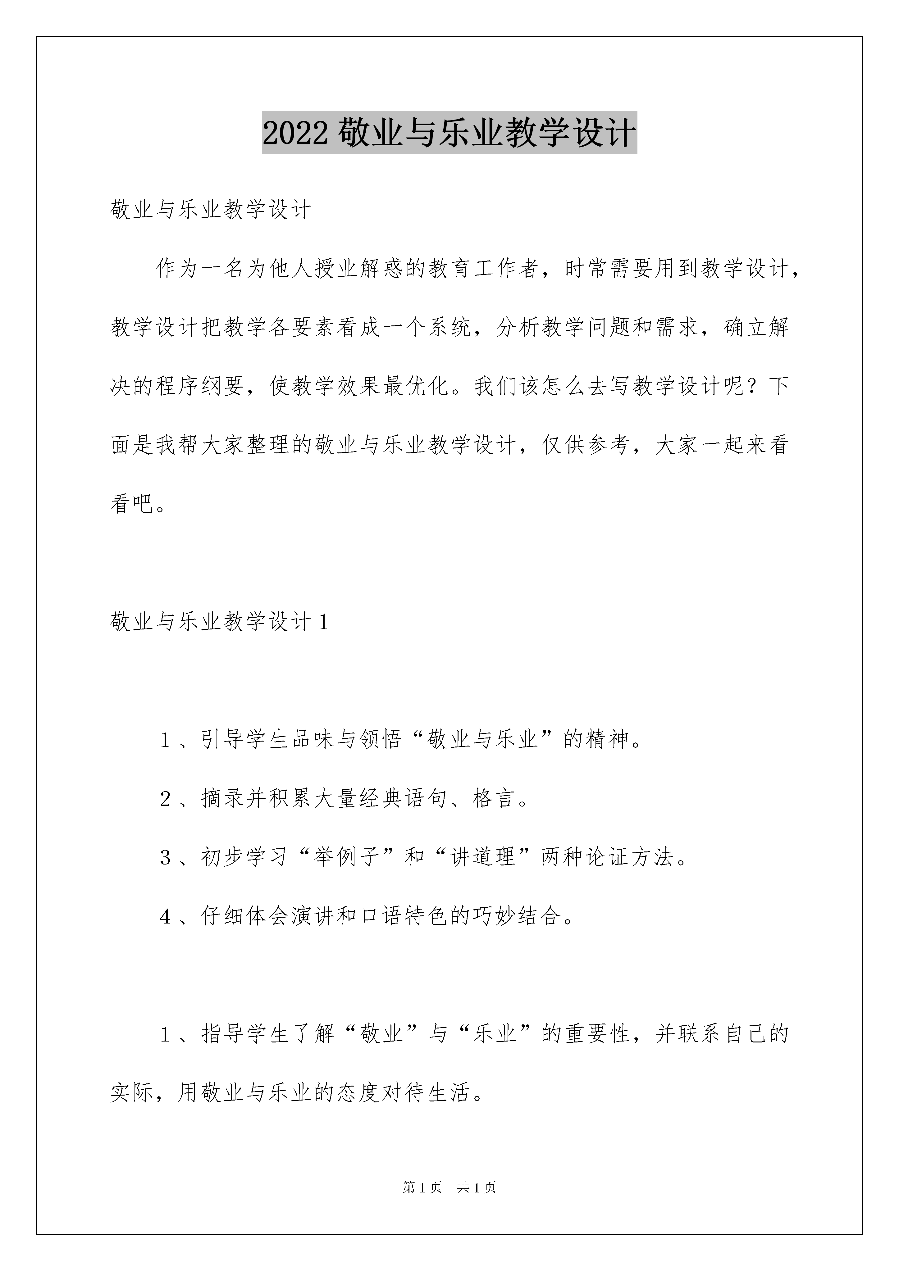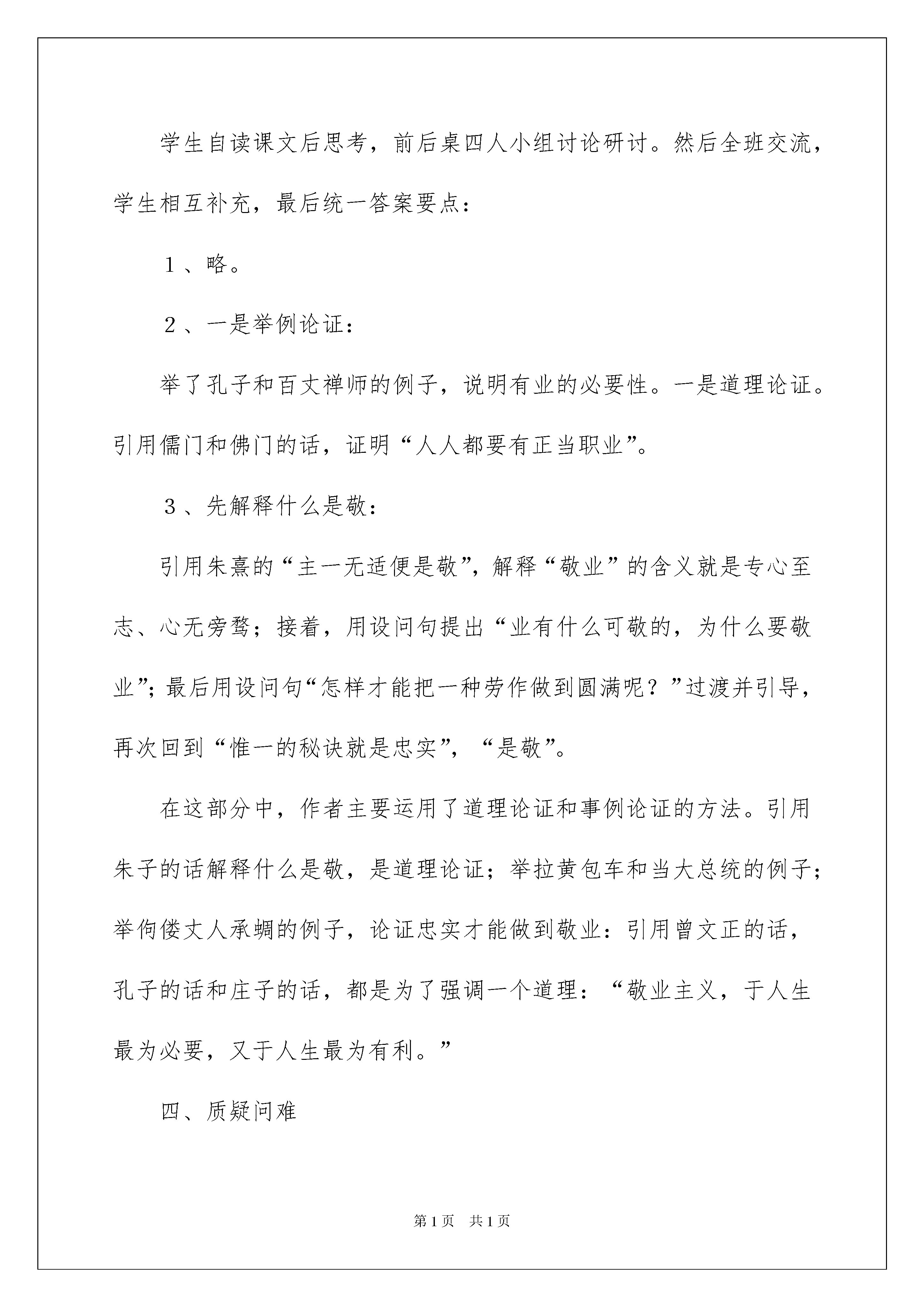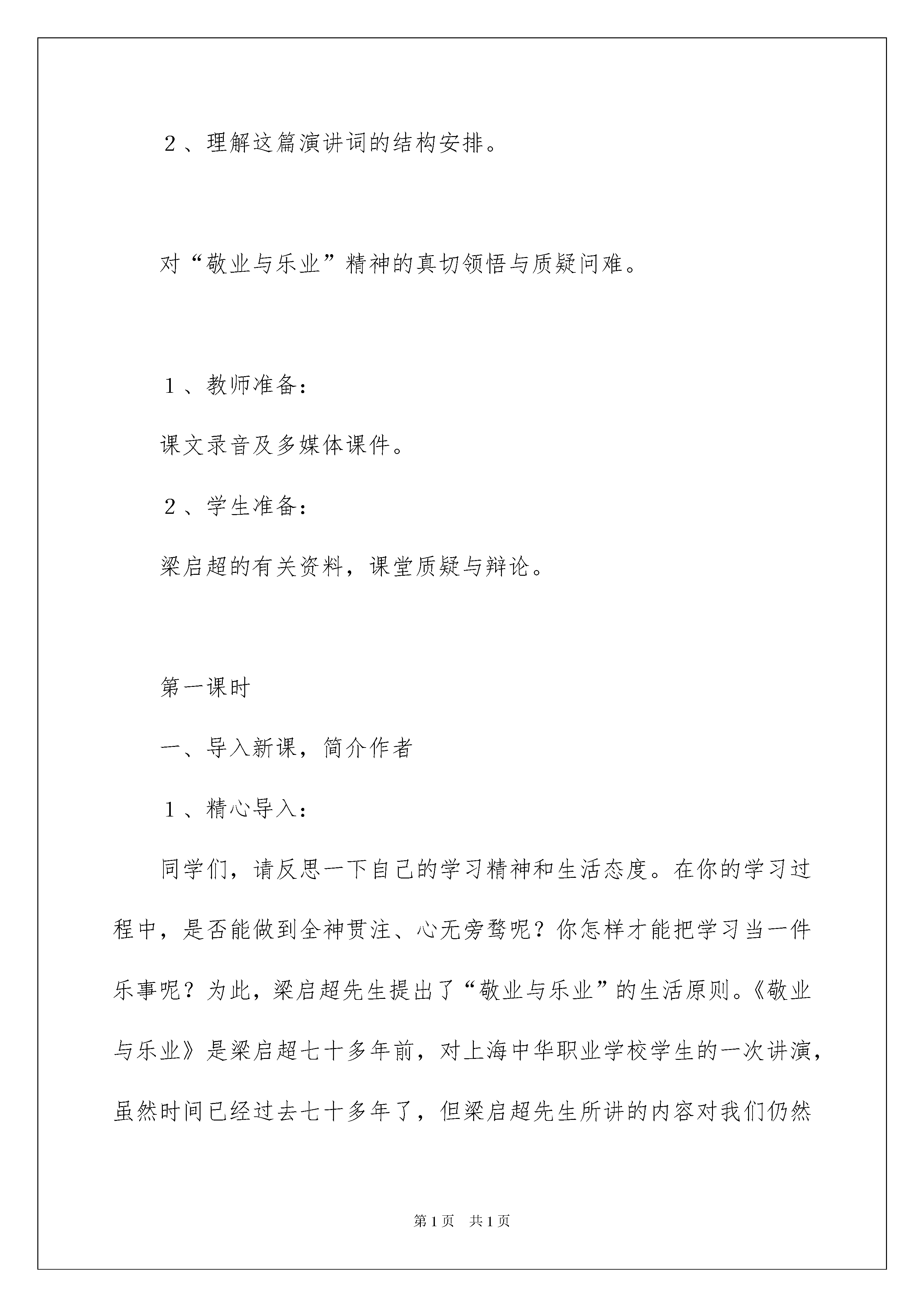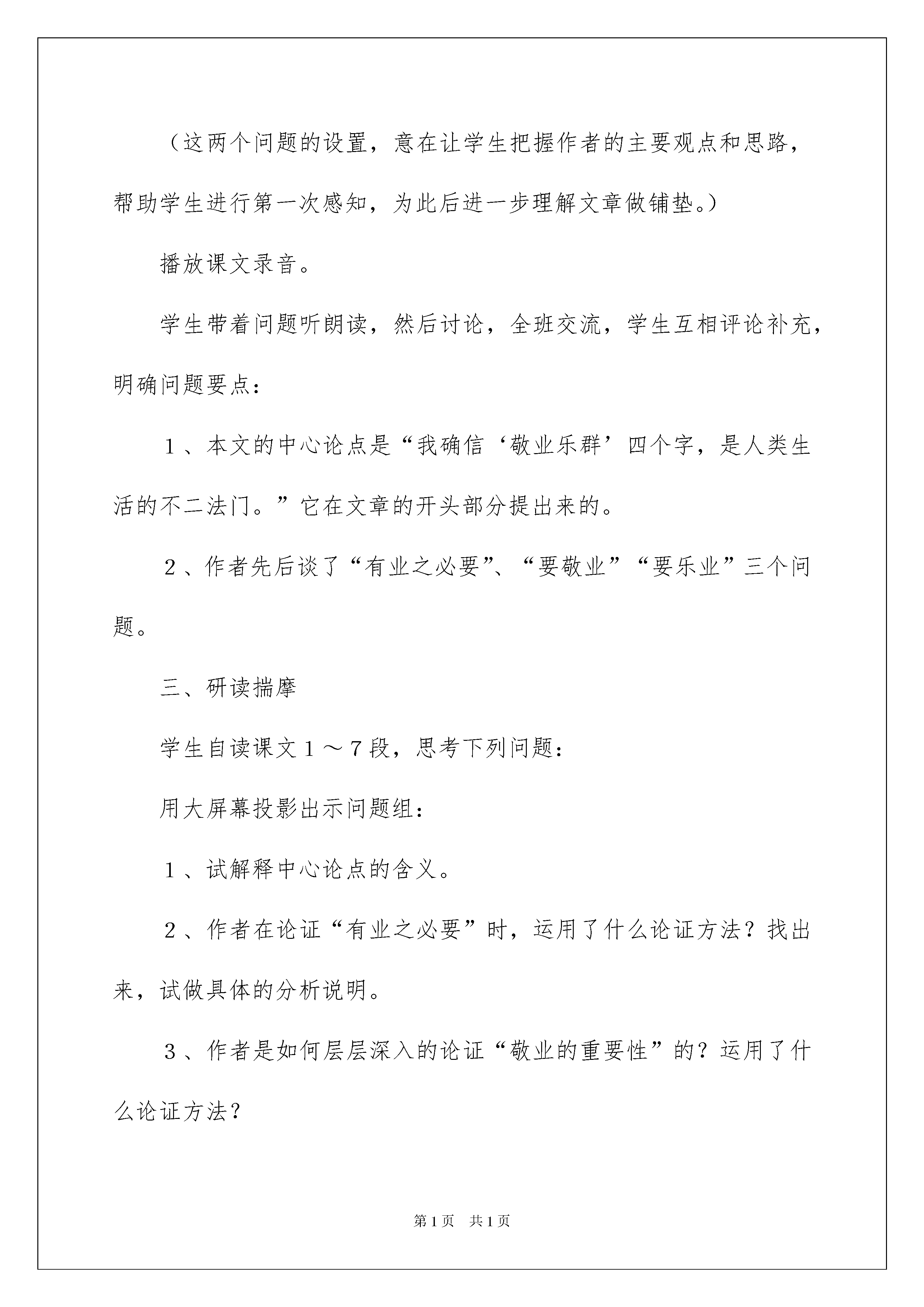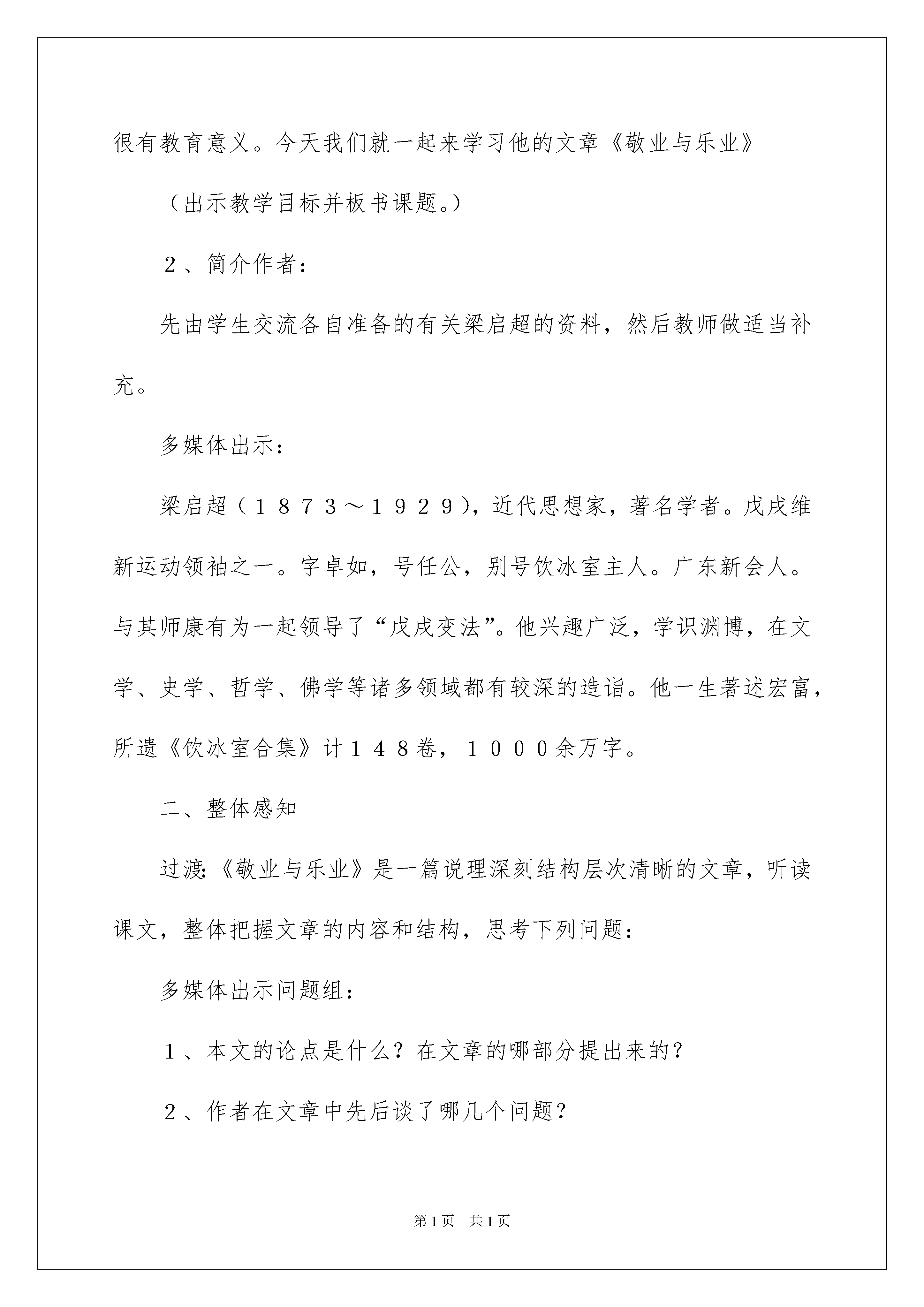2022敬业与乐业教学设计敬业与乐业教学设计作为一名为他人授业解惑的教育工作者,时常需要用到教学设计,教学设计把教学各要素看成一个系统,分析教学问题和需求,确立解决的程序纲要,使教学效果最优化。我们该怎么去写教学设计呢?下面是我帮大家整理的敬业与乐业教学设计,仅供参考,大家一起来看看吧。敬业与乐业教学设计11、引导学生品味与领悟“敬业与乐业”的精神。2、摘录并积累大量经典语句、格言。3、初步学习“举例子”和“讲道理”两种论证方法。4、仔细体会演讲和口语特色的巧妙结合。1、指导学生了解“敬业”与“乐业”的重要性,并联系自己的实际,用敬业与乐业的态度对待生活。2、理解这篇演讲词的结构安排。对“敬业与乐业”精神的真切领悟与质疑问难。1、教师准备:课文录音及多媒体课件。2、学生准备:梁启超的有关资料,课堂质疑与辩论。第一课时一、导入新课,简介作者1、精心导入:同学们,请反思一下自己的学习精神和生活态度。在你的学习过程中,是否能做到全神贯注、心无旁骛呢?你怎样才能把学习当一件乐事呢?为此,梁启超先生提出了“敬业与乐业”的生活原则。《敬业与乐业》是梁启超七十多年前,对上海中华职业学校学生的一次讲演,虽然时间已经过去七十多年了,但梁启超先生所讲的内容对我们仍然很有教育意义。今天我们就一起来学习他的文章《敬业与乐业》(出示教学目标并板书课题。)2、简介作者:先由学生交流各自准备的有关梁启超的资料,然后教师做适当补充。多媒体出示:梁启超(1873~1929),近代思想家,著名学者。戊戌维新运动领袖之一。字卓如,号任公,别号饮冰室主人。广东新会人。与其师康有为一起领导了“戊戌变法”。他兴趣广泛,学识渊博,在文学、史学、哲学、佛学等诸多领域都有较深的造诣。他一生著述宏富,所遗《饮冰室合集》计148卷,1000余万字。二、整体感知过渡:《敬业与乐业》是一篇说理深刻结构层次清晰的文章,听读课文,整体把握文章的内容和结构,思考下列问题:多媒体出示问题组:1、本文的论点是什么?在文章的哪部分提出来的?2、作者在文章中先后谈了哪几个问题?(这两个问题的设置,意在让学生把握作者的主要观点和思路,帮助学生进行第一次感知,为此后进一步理解文章做铺垫。)播放课文录音。学生带着问题听朗读,然后讨论,全班交流,学生互相评论补充,明确问题要点:1、本文的中心论点是“我确信‘敬业乐群’四个字,是人类生活的不二法门。”它在文章的开头部分提出来的。2、作者先后谈了“有业之必要”、“要敬业”“要乐业”三个问题。三、研读揣摩学生自读课文1~7段,思考下列问题:用大屏幕投影出示问题组:1、试解释中心论点的含义。2、作者在论证“有业之必要”时,运用了什么论证方法?找出来,试做具体的分析说明。3、作者是如何层层深入的论证“敬业的重要性”的?运用了什么论证方法?学生自读课文后思考,前后桌四人小组讨论研讨。然后全班交流,学生相互补充,最后统一答案要点:1、略。2、一是举例论证:举了孔子和百丈禅师的例子,说明有业的必要性。一是道理论证。引用儒门和佛门的话,证明“人人都要有正当职业”。3、先解释什么是敬:引用朱熹的“主一无适便是敬”,解释“敬业”的含义就是专心至志、心无旁骛;接着,用设问句提出“业有什么可敬的,为什么要敬业”;最后用设问句“怎样才能把一种劳作做到圆满呢?”过渡并引导,再次回到“惟一的秘诀就是忠实”,“是敬”。在这部分中,作者主要运用了道理论证和事例论证的方法。引用朱子的话解释什么是敬,是道理论证;举拉黄包车和当大总统的例子;举佝偻丈人承蜩的例子,论证忠实才能做到敬业:引用曾文正的话,孔子的话和庄子的话,都是为了强调一个道理:“敬业主义,于人生最为必要,又于人生最为有利。”四、质疑问难1、学生发问:鼓励学生提出问题,别的同学按自己的理解解答,其他同学补充,教师可做适当引导。2、教师发问:在论证敬业的重要性时,作者两次运用了设问句,有什么好处?学生思考讨论,踊跃做答,教师做适当点拨。五、拓展延伸多媒体出示:文中说“因自己的才能、境地,做一种劳作做到圆满,便是天地间第一等人。”依据作者的这一标准来衡量,你能从身边也发现一两位这样“天地间第一等人”吗?请联系自己的实际谈谈我们中学生该如何去做。教师点拨:那些凡人做的琐事,很多都忠实圆满的完成,他们都可以称为“天地间第一等人”。这样的例子在我们身边有很多,我们中学生怎样做才算天地间第一等人呢?学生即席发言交流,其他学生做适当的评析。六、布置作业1、摘录并积累文中的经典语句、格言。2、完成课后练习二。第二课时一、复习巩固1、听写词语,进一步巩固掌握基础知识。读积累的经典语句、格言。2、回