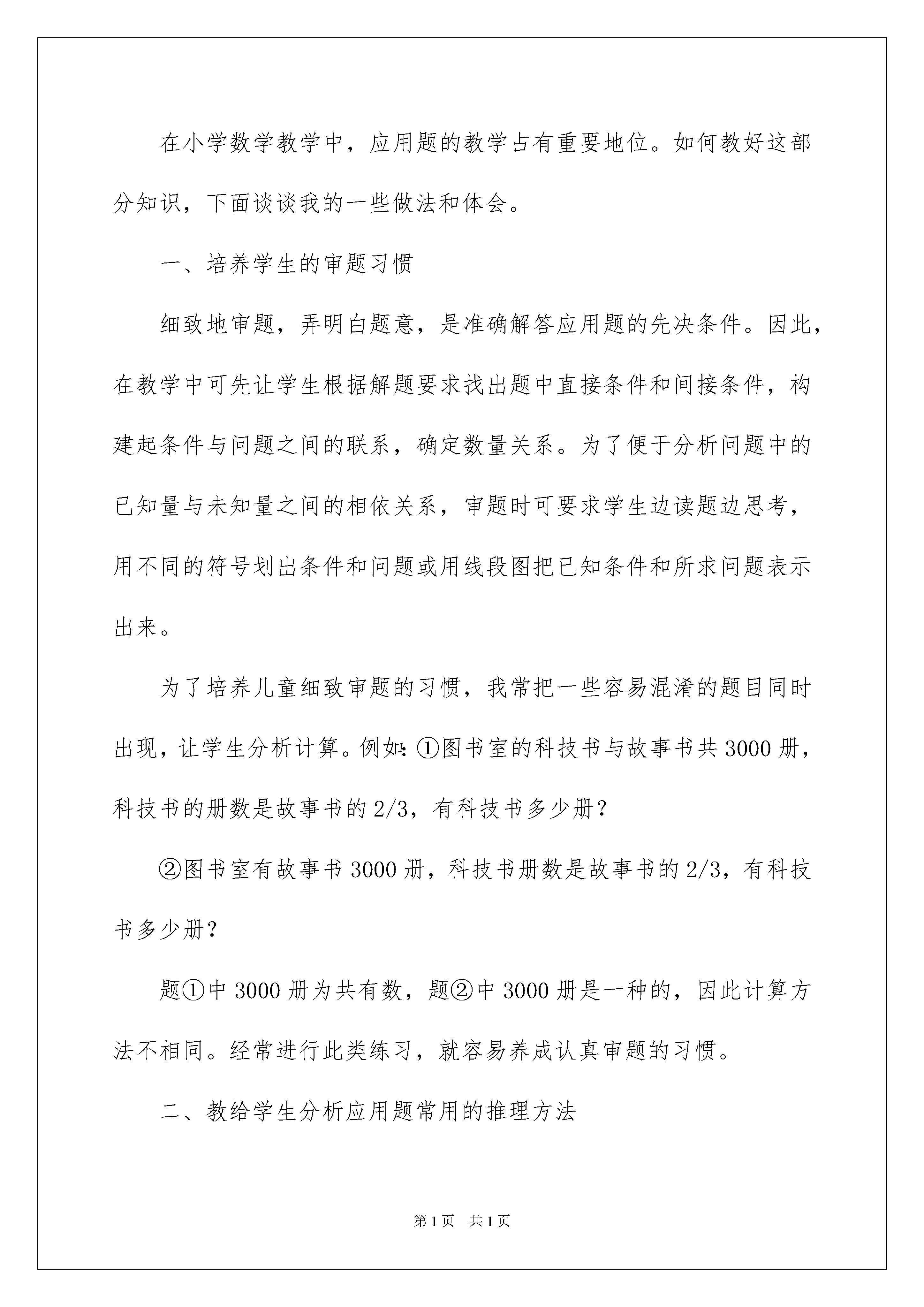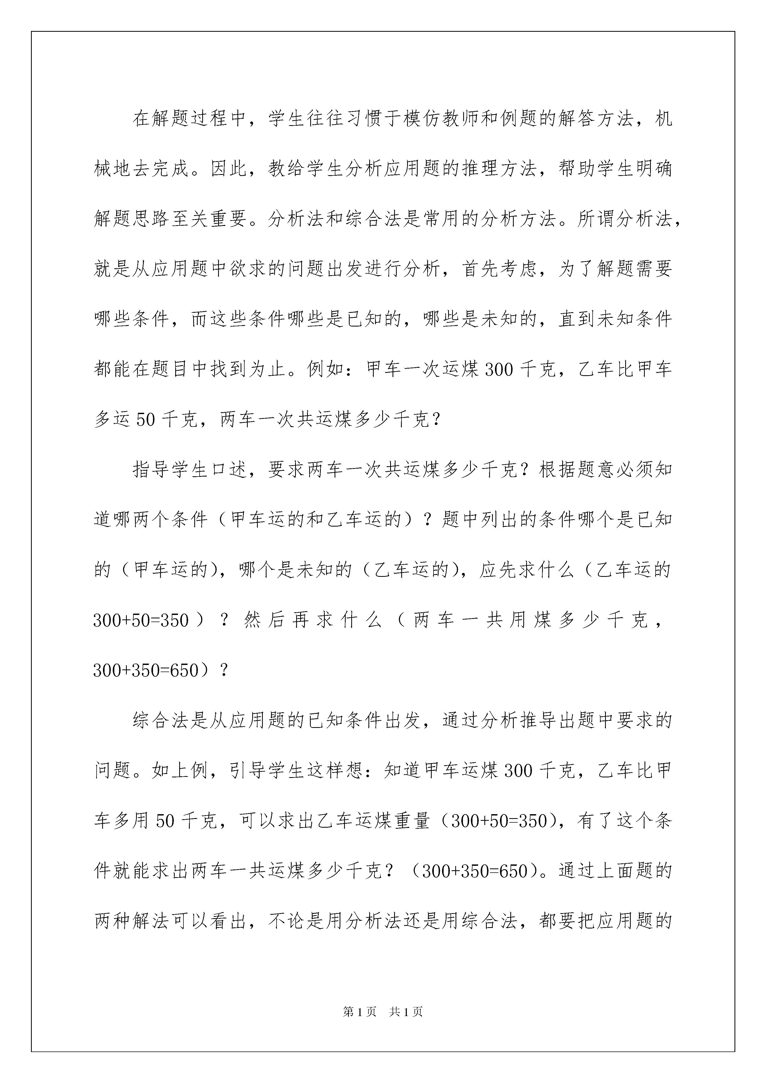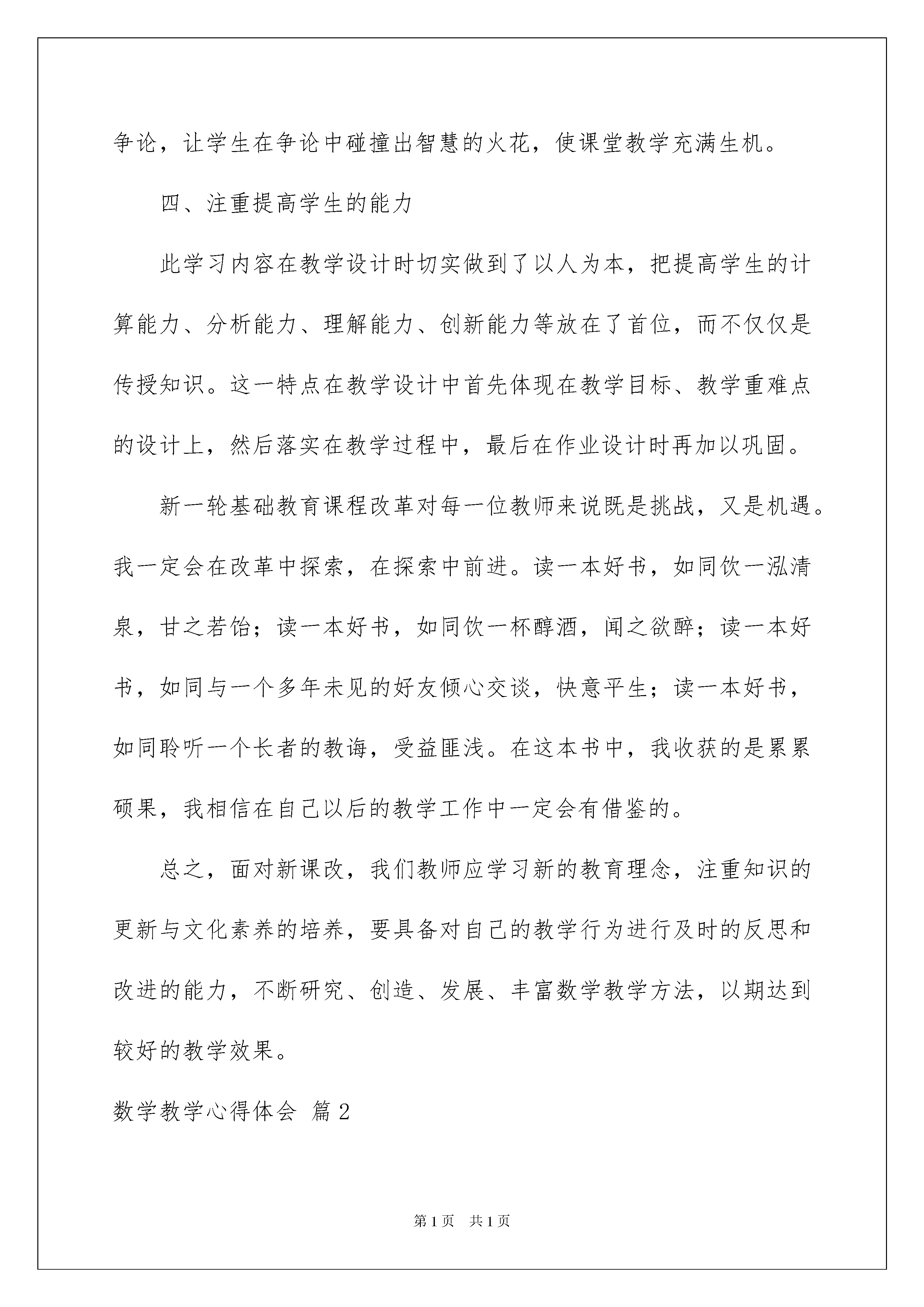 2022数学教学心得体会模板汇总五篇数学教学心得体会模板汇总五篇心中有不少心得体会时,可以通过写心得体会的方式将其记录下来,它可以帮助我们了解自己的这段时间的学习、工作生活状态。应该怎么写才合适呢?以下是我为大家收集的数学教学心得体会5篇,希望能够帮助到大家。数学教学心得体会篇1作为一名小学数学教师,应该按照新课程标准,在教学中大胆创新,采用反常规教学法,设计课堂活动,创设情境,充分调动学生,激发学生的兴趣,让学生充分展示自己,成为学习的主人。以下是我阅读后的几点心得:一、教学方法灵活多样任何一种教学方法无论多么好,长期使用学生都会产生单调厌倦之感,因此,教师要从学生和教材的实际出发,在课堂上精当选择。《新课程理念下的创新教学设计》在课堂设计上就根据不同的内容来采用了多种多样的、灵活多变的教学方法,不是让教师以灌输式的方式把所有的知识灌输给学生,而是以学生为主体,教师为主导。让学生真正融入了课堂,做了课堂的主人。二、采用“任务型”的教学途径任务型教学是以具体的任务为学习动力或动机以完成任务的过程为学习的过程,以展示成果的方式来体现教学的成就。通过阅读,我明白了任务型教学是双边或多边的交互式活动,有利于提高学生学习的自觉性。在今后的教学活动中,我将依据课程的总体目标并结合教学内容,尽量设计贴近学生实际的教学活动,吸引和组织他们积极参与。学生通过思考、调查、讨论、交流和合作等方式,学习新知识,完成学习任务。三、鼓励学生发表意见“鼓励学生个性发展,让学生自由表达意见”是新课程倡导的一个新理念,也是我们每个教师追求的目标。读了《新课程理念下创新教学设计》,让我知道了自己教学设计的优点和不足。书中的教学设计重视了学生的差异性,照顾了全体学生。鼓励每个学生发言了我们才有可能更好的因材施教,关注每个学生。因此在今后的课堂教学中,我将更加鼓励学生大胆质疑,让学生在课堂上敢说、敢想、敢问、敢争论,让学生在争论中碰撞出智慧的火花,使课堂教学充满生机。四、注重提高学生的能力此学习内容在教学设计时切实做到了以人为本,把提高学生的计算能力、分析能力、理解能力、创新能力等放在了首位,而不仅仅是传授知识。这一特点在教学设计中首先体现在教学目标、教学重难点的设计上,然后落实在教学过程中,最后在作业设计时再加以巩固。新一轮基础教育课程改革对每一位教师来说既是挑战,又是机遇。我一定会在改革中探索,在探索中前进。读一本好书,如同饮一泓清泉,甘之若饴;读一本好书,如同饮一杯醇酒,闻之欲醉;读一本好书,如同与一个多年未见的好友倾心交谈,快意平生;读一本好书,如同聆听一个长者的教诲,受益匪浅。在这本书中,我收获的是累累硕果,我相信在自己以后的教学工作中一定会有借鉴的。总之,面对新课改,我们教师应学习新的教育理念,注重知识的更新与文化素养的培养,要具备对自己的教学行为进行及时的反思和改进的能力,不断研究、创造、发展、丰富数学教学方法,以期达到较好的教学效果。数学教学心得体会篇2在小学数学教学中,应用题的教学占有重要地位。如何教好这部分知识,下面谈谈我的一些做法和体会。一、培养学生的审题习惯细致地审题,弄明白题意,是准确解答应用题的先决条件。因此,在教学中可先让学生根据解题要求找出题中直接条件和间接条件,构建起条件与问题之间的联系,确定数量关系。为了便于分析问题中的已知量与未知量之间的相依关系,审题时可要求学生边读题边思考,用不同的符号划出条件和问题或用线段图把已知条件和所求问题表示出来。为了培养儿童细致审题的习惯,我常把一些容易混淆的题目同时出现,让学生分析计算。例如:①图书室的科技书与故事书共3000册,科技书的册数是故事书的2/3,有科技书多少册?②图书室有故事书3000册,科技书册数是故事书的2/3,有科技书多少册?题①中3000册为共有数,题②中3000册是一种的,因此计算方法不相同。经常进行此类练习,就容易养成认真审题的习惯。二、教给学生分析应用题常用的推理方法在解题过程中,学生往往习惯于模仿教师和例题的解答方法,机械地去完成。因此,教给学生分析应用题的推理方法,帮助学生明确解题思路至关重要。分析法和综合法是常用的分析方法。所谓分析法,就是从应用题中欲求的问题出发进行分析,首先考虑,为了解题需要哪些条件,而这些条件哪些是已知的,哪些是未知的,直到未知条件都能在题目中找到为止。例如:甲车一次运煤300千克,乙车比甲车多运50千克,两车一次共运煤多少千克?指导学生口述,要求两车一次共运煤多少千克?根据题意必须知道哪两个条件(甲车运的和乙车运的)?题中列出的条件哪个是已知的(甲车运的),哪个是未知的(乙车运的),