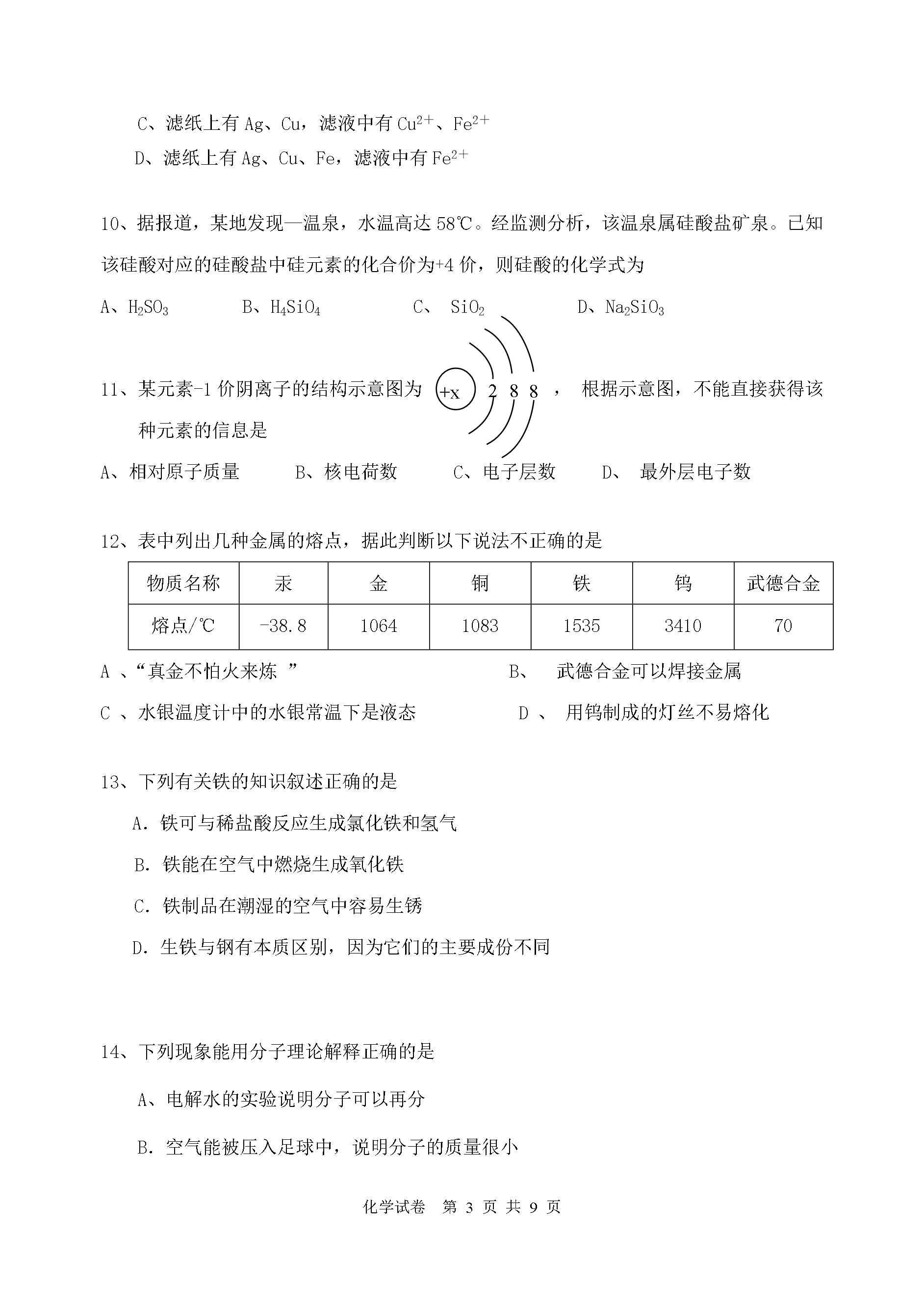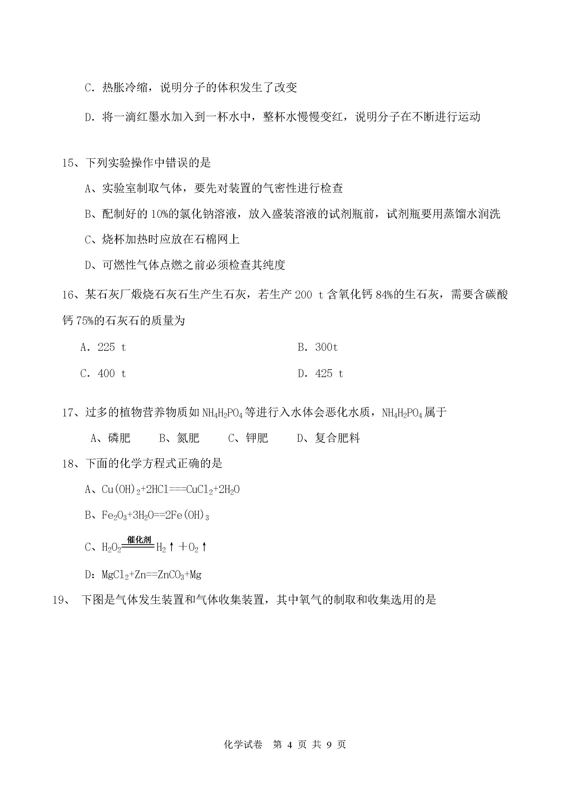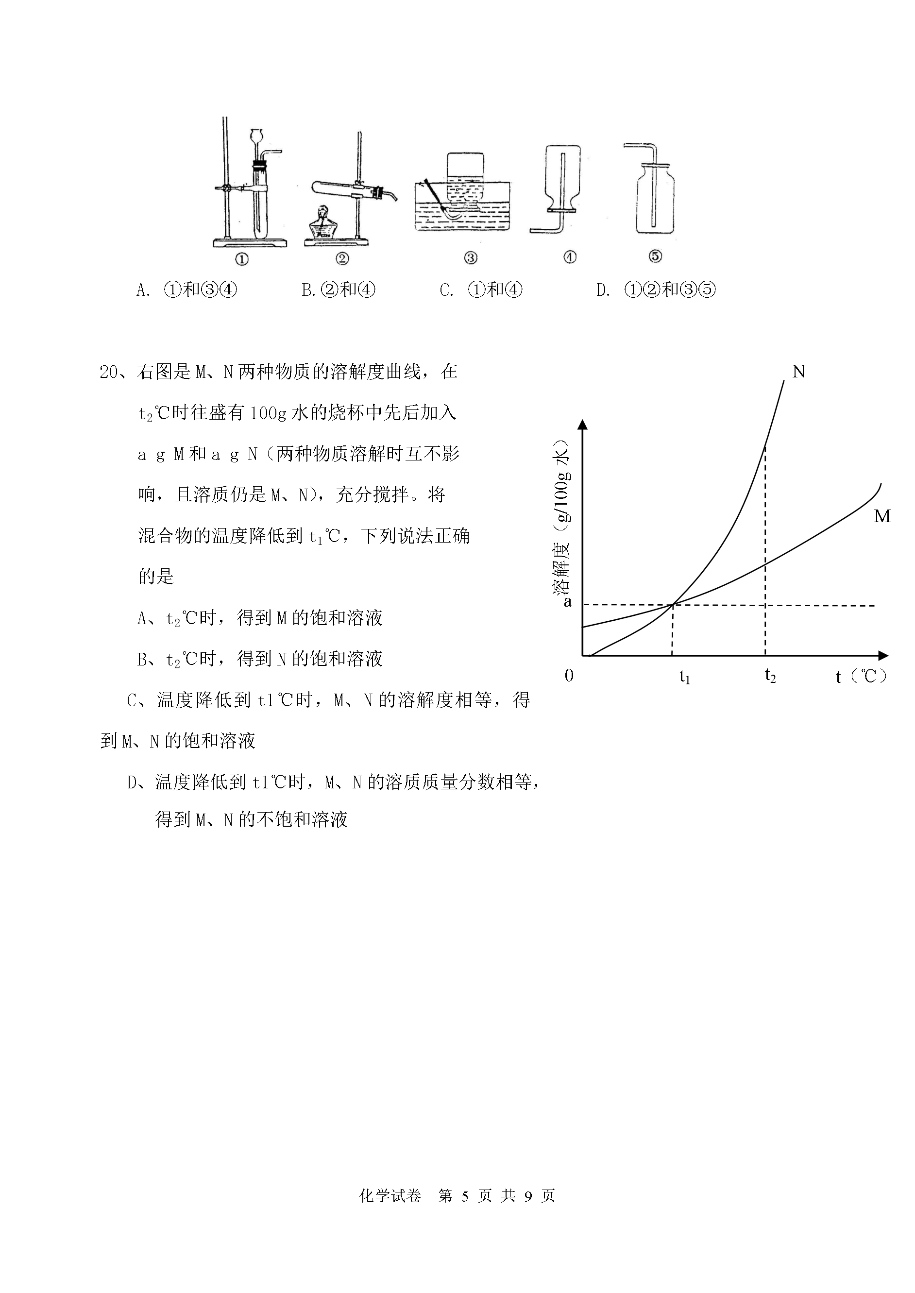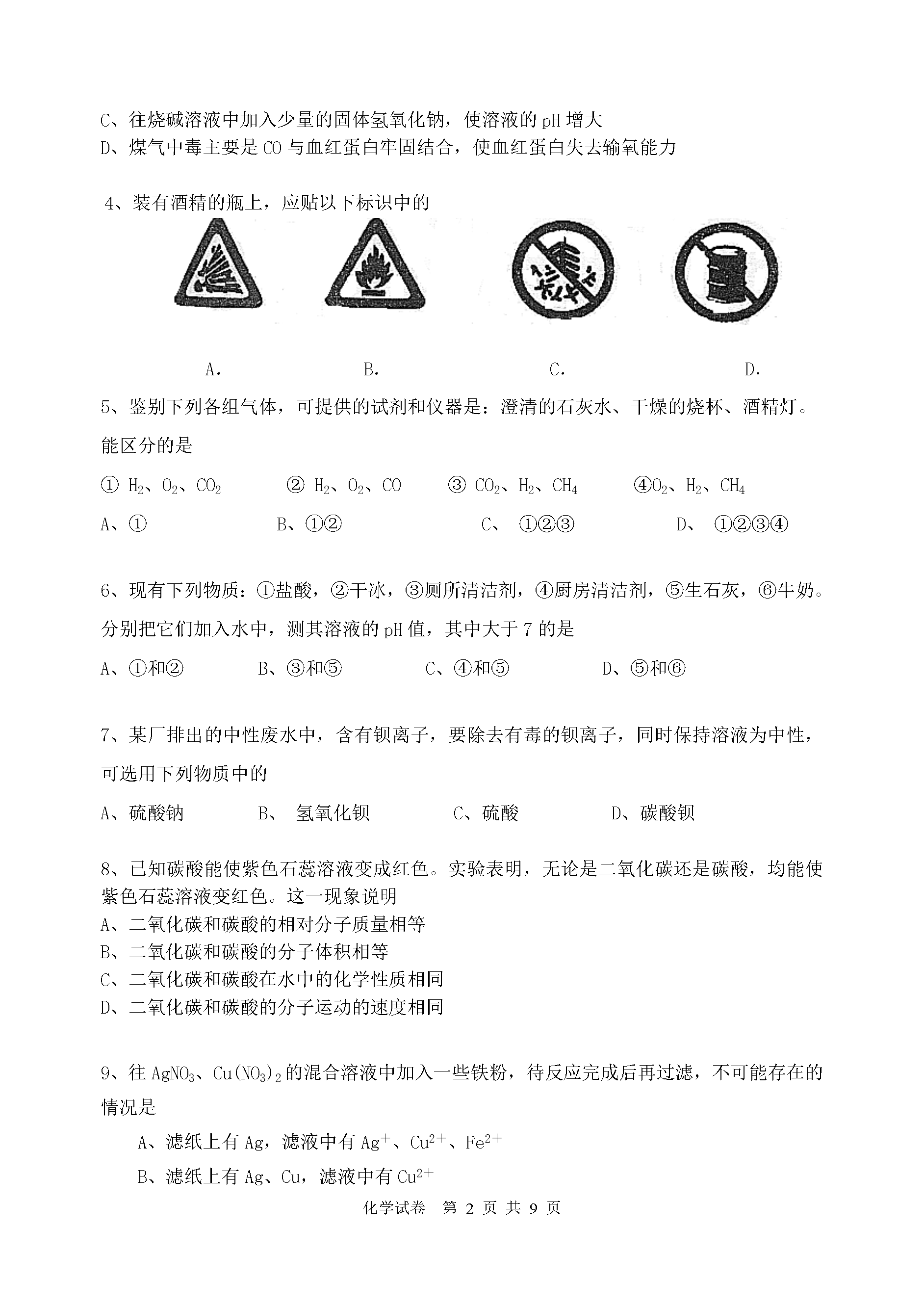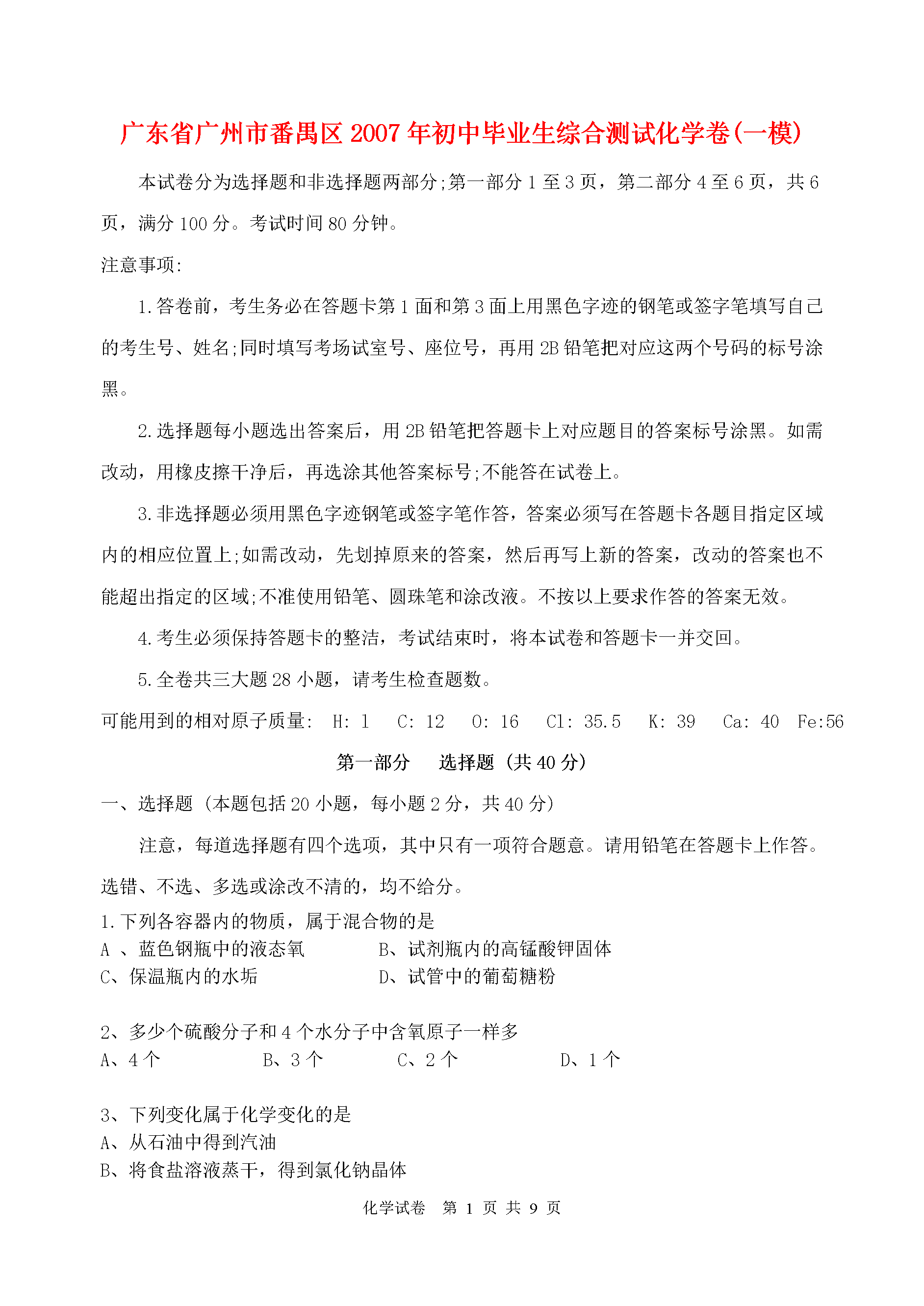 化学试卷广东省广州市番禺区2007年初中毕业生综合测试化学卷(一模)本试卷分为选择题和非选择题两部分;第一部分1至3页,第二部分4至6页,,满分100分。考试时间80分钟。注意事项:1.答卷前,考生务必在答题卡第1面和第3面上用黑色字迹的钢笔或签字笔填写自己的考生号、姓名;同时填写考场试室号、座位号,再用2B铅笔把对应这两个号码的标号涂黑。2.选择题每小题选出答案后,用2B铅笔把答题卡上对应题目的答案标号涂黑。如需改动,用橡皮擦干净后,再选涂其他答案标号;不能答在试卷上。3.非选择题必须用黑色字迹钢笔或签字笔作答,答案必须写在答题卡各题目指定区域内的相应位置上;如需改动,先划掉原来的答案,然后再写上新的答案,改动的答案也不能超出指定的区域;不准使用铅笔、圆珠笔和涂改液。不按以上要求作答的答案无效。4.考生必须保持答题卡的整洁,考试结束时,将本试卷和答题卡一并交回。5.全卷共三大题28小题,请考生检查题数。可能用到的相对原子质量:H:lC:12O:16Cl:35.5K:39Ca:40Fe:56第一部分选择题(共40分)一、选择题(本题包括20小题,每小题2分,共40分)注意,每道选择题有四个选项,其中只有一项符合题意。请用铅笔在答题卡上作答。选错、不选、多选或涂改不清的,均不给分。1.下列各容器内的物质,属于混合物的是A、蓝色钢瓶中的液态氧B、试剂瓶内的高锰酸钾固体C、保温瓶内的水垢D、试管中的葡萄糖粉2、多少个硫酸分子和4个水分子中含氧原子一样多A、4个B、3个C、2个D、1个3、下列变化属于化学变化的是A、从石油中得到汽油B、将食盐溶液蒸干,得到氯化钠晶体C、往烧碱溶液中加入少量的固体氢氧化钠,使溶液的pH增大D、煤气中毒主要是CO与血红蛋白牢固结合,使血红蛋白失去输氧能力4、装有酒精的瓶上,应贴以下标识中的A.B.C.D.5、鉴别下列各组气体,可提供的试剂和仪器是:澄清的石灰水、干燥的烧杯、酒精灯。能区分的是①H2、O2、CO2②H2、O2、CO③CO2、H2、CH4④O2、H2、CH4A、①B、①②C、①②③D、①②③④6、现有下列物质:①盐酸,②干冰,③厕所清洁剂,④厨房清洁剂,⑤生石灰,⑥牛奶。分别把它们加入水中,测其溶液的pH值,其中大于7的是A、①和②B、③和⑤C、④和⑤D、⑤和⑥7、某厂排出的中性废水中,含有钡离子,要除去有毒的钡离子,同时保持溶液为中性,可选用下列物质中的A、硫酸钠B、氢氧化钡C、硫酸D、碳酸钡8、已知碳酸能使紫色石蕊溶液变成红色。实验表明,无论是二氧化碳还是碳酸,均能使紫色石蕊溶液变红色。这一现象说明A、二氧化碳和碳酸的相对分子质量相等B、二氧化碳和碳酸的分子体积相等C、二氧化碳和碳酸在水中的化学性质相同D、二氧化碳和碳酸的分子运动的速度相同9、往AgNO3、Cu(NO3)2的混合溶液中加入一些铁粉,待反应完成后再过滤,不可能存在的情况是A、滤纸上有Ag,滤液中有Ag+、Cu2+、Fe2+B、滤纸上有Ag、Cu,滤液中有Cu2+C、滤纸上有Ag、Cu,滤液中有Cu2+、Fe2+D、滤纸上有Ag、Cu、Fe,滤液中有Fe2+10、据报道,某地发现—温泉,水温高达58℃。经监测分析,该温泉属硅酸盐矿泉。已知该硅酸对应的硅酸盐中硅元素的化合价为+4价,则硅酸的化学式为+x828A、H2SO3B、H4SiO4C、SiO2D、Na2SiO311、某元素-1价阴离子的结构示意图为,根据示意图,不能直接获得该种元素的信息是A、相对原子质量B、核电荷数C、电子层数D、最外层电子数12、表中列出几种金属的熔点,据此判断以下说法不正确的是物质名称汞金铜铁钨武德合金熔点/℃-38.8106410831535341070A、“真金不怕火来炼”B、武德合金可以焊接金属C、水银温度计中的水银常温下是液态D、用钨制成的灯丝不易熔化13、下列有关铁的知识叙述正确的是A.铁可与稀盐酸反应生成氯化铁和氢气B.铁能在空气中燃烧生成氧化铁C.铁制品在潮湿的空气中容易生锈D.生铁与钢有本质区别,因为它们的主要成份不同14、下列现象能用分子理论解释正确的是A、电解水的实验说明分子可以再分B.空气能被压入足球中,说明分子的质量很小C.热胀冷缩,说明分子的体积发生了改变D.将一滴红墨水加入到一杯水中,整杯水慢慢变红,说明分子在不断进行运动15、下列实验操作中错误的是A、实验室制取气体,要先对装置的气密性进行检查B、配制好的10%的氯化钠溶液,放入盛装溶液的试剂瓶前,试剂瓶要用蒸馏水润洗C、烧杯加热时应放在石棉网上D、可燃性气体点燃之前必须检查其纯度16、某石灰厂煅烧石灰石生产生石灰,若生产200t含氧化钙84%的生石灰,需要含碳酸钙75%的石灰石的质量为A.225tB.300tC.400tD.425t17、过多的植物营养物质