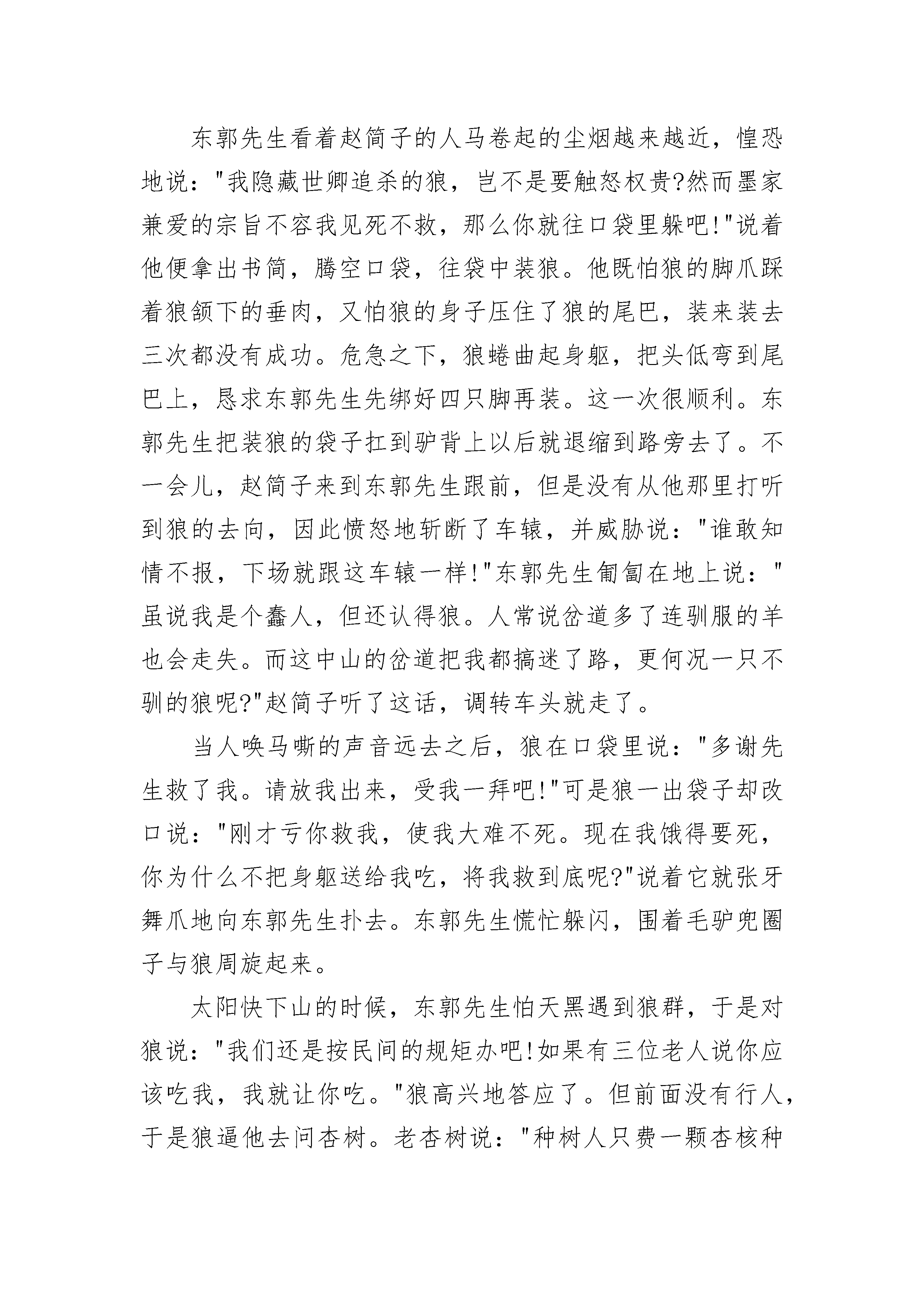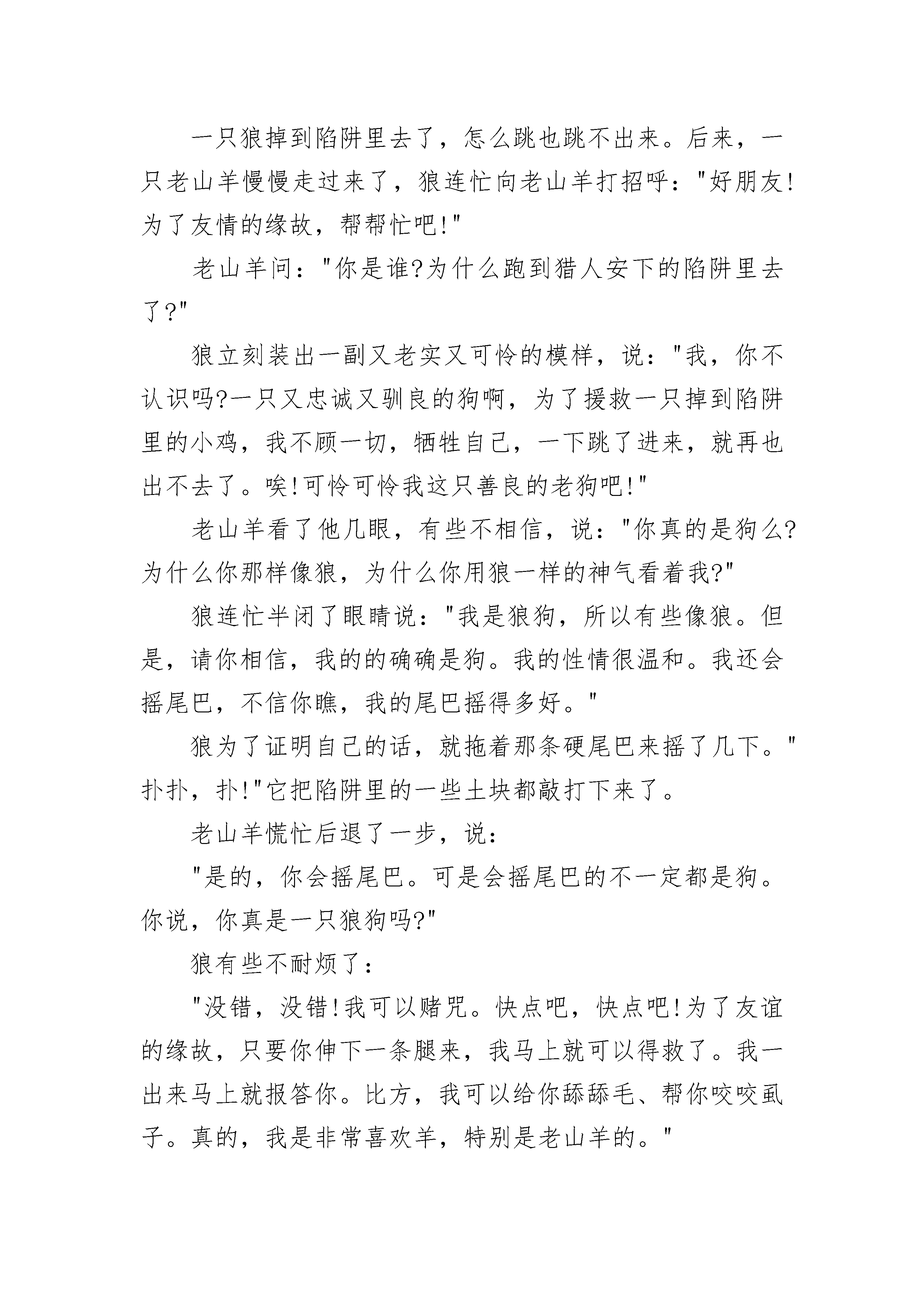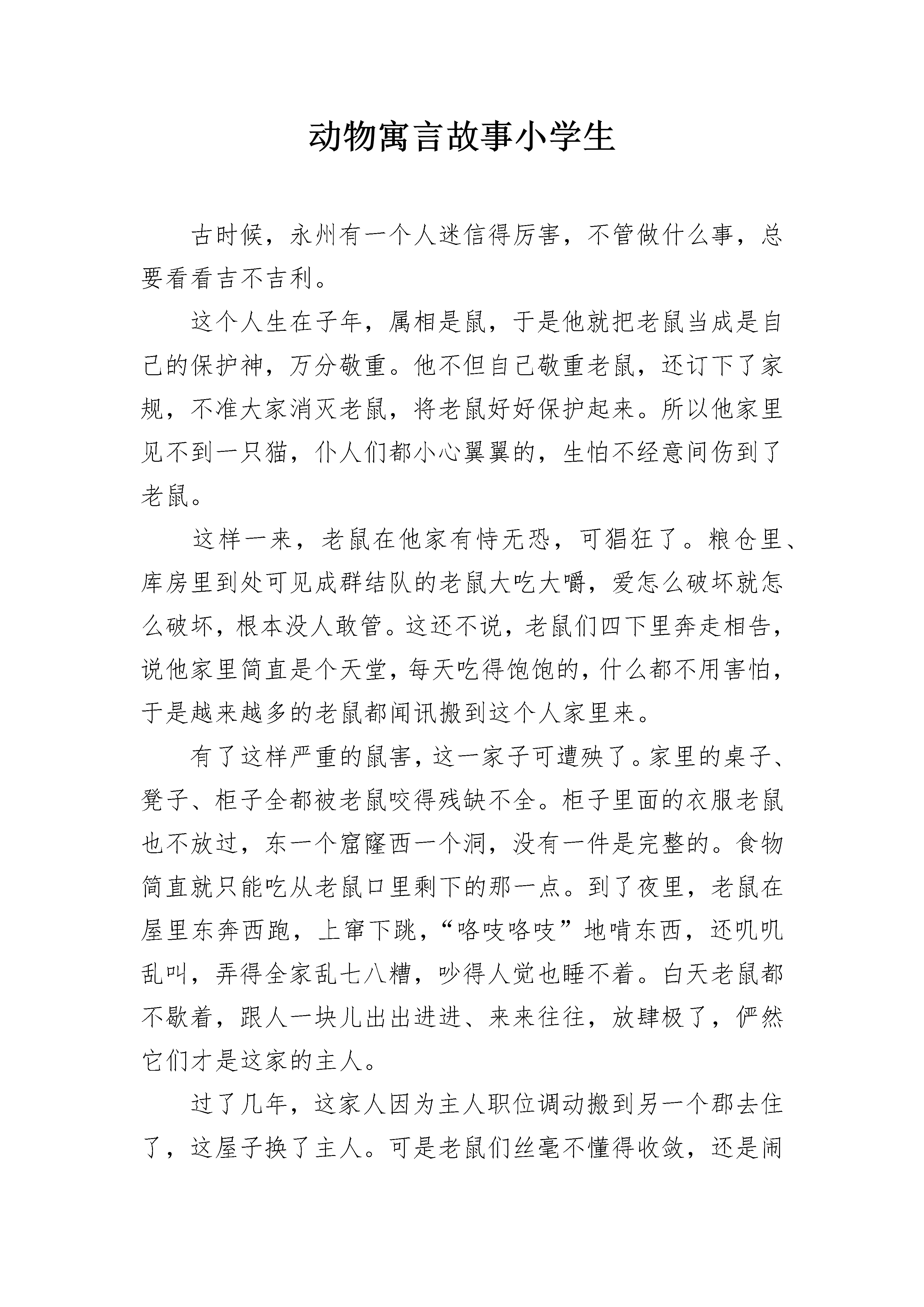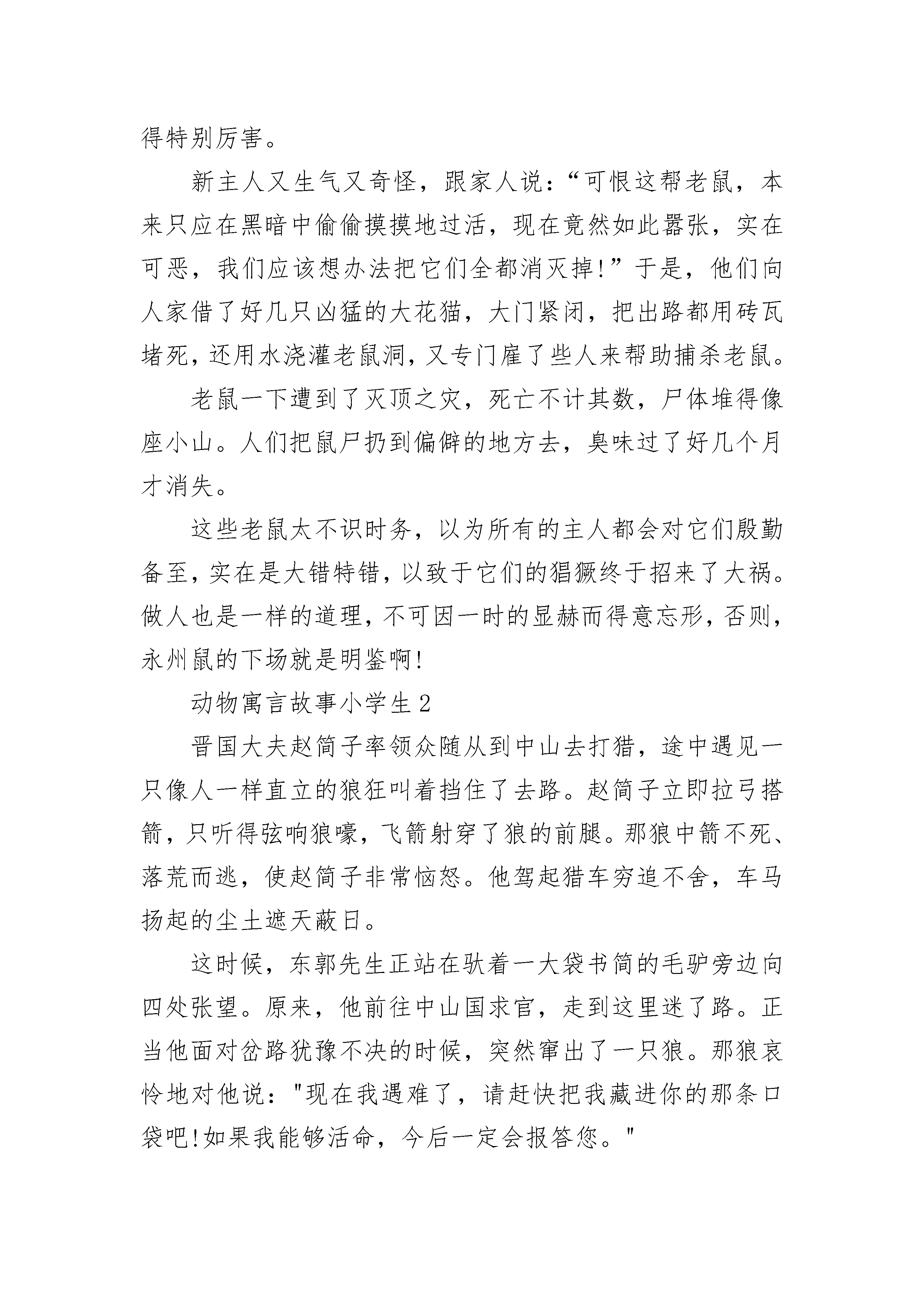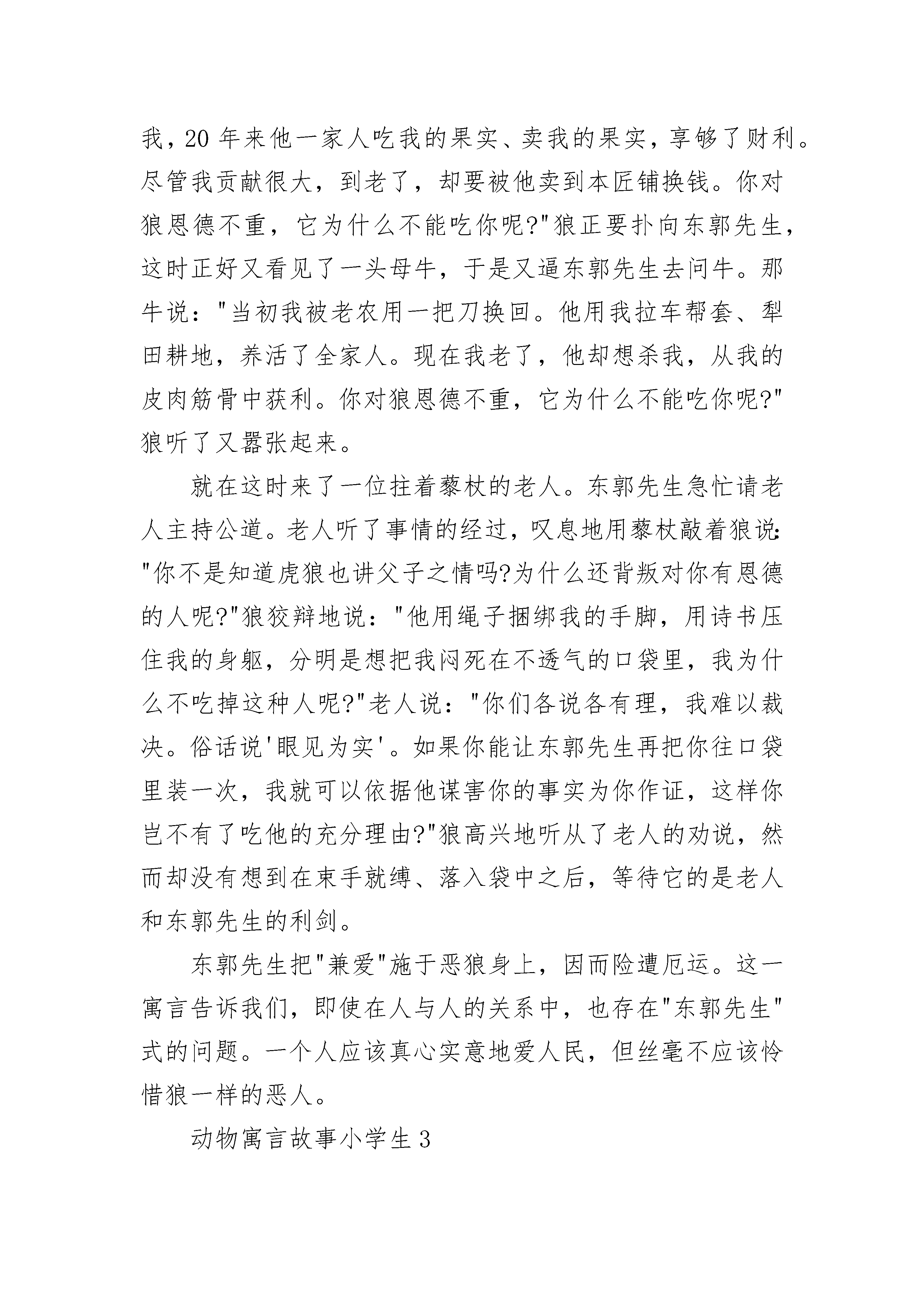 动物寓言故事小学生古时候,永州有一个人迷信得厉害,不管做什么事,总要看看吉不吉利。这个人生在子年,属相是鼠,于是他就把老鼠当成是自己的保护神,万分敬重。他不但自己敬重老鼠,还订下了家规,不准大家消灭老鼠,将老鼠好好保护起来。所以他家里见不到一只猫,仆人们都小心翼翼的,生怕不经意间伤到了老鼠。这样一来,老鼠在他家有恃无恐,可猖狂了。粮仓里、库房里到处可见成群结队的老鼠大吃大嚼,爱怎么破坏就怎么破坏,根本没人敢管。这还不说,老鼠们四下里奔走相告,说他家里简直是个天堂,每天吃得饱饱的,什么都不用害怕,于是越来越多的老鼠都闻讯搬到这个人家里来。有了这样严重的鼠害,这一家子可遭殃了。家里的桌子、凳子、柜子全都被老鼠咬得残缺不全。柜子里面的衣服老鼠也不放过,东一个窟窿西一个洞,没有一件是完整的。食物简直就只能吃从老鼠口里剩下的那一点。到了夜里,老鼠在屋里东奔西跑,上窜下跳,“咯吱咯吱”地啃东西,还叽叽乱叫,弄得全家乱七八糟,吵得人觉也睡不着。白天老鼠都不歇着,跟人一块儿出出进进、来来往往,放肆极了,俨然它们才是这家的主人。过了几年,这家人因为主人职位调动搬到另一个郡去住了,这屋子换了主人。可是老鼠们丝毫不懂得收敛,还是闹得特别厉害。新主人又生气又奇怪,跟家人说:“可恨这帮老鼠,本来只应在黑暗中偷偷摸摸地过活,现在竟然如此嚣张,实在可恶,我们应该想办法把它们全都消灭掉!”于是,他们向人家借了好几只凶猛的大花猫,大门紧闭,把出路都用砖瓦堵死,还用水浇灌老鼠洞,又专门雇了些人来帮助捕杀老鼠。老鼠一下遭到了灭顶之灾,死亡不计其数,尸体堆得像座小山。人们把鼠尸扔到偏僻的地方去,臭味过了好几个月才消失。这些老鼠太不识时务,以为所有的主人都会对它们殷勤备至,实在是大错特错,以致于它们的猖獗终于招来了大祸。做人也是一样的道理,不可因一时的显赫而得意忘形,否则,永州鼠的下场就是明鉴啊!动物寓言故事小学生2晋国大夫赵简子率领众随从到中山去打猎,途中遇见一只像人一样直立的狼狂叫着挡住了去路。赵简子立即拉弓搭箭,只听得弦响狼嚎,飞箭射穿了狼的前腿。那狼中箭不死、落荒而逃,使赵简子非常恼怒。他驾起猎车穷追不舍,车马扬起的尘土遮天蔽日。这时候,东郭先生正站在驮着一大袋书简的毛驴旁边向四处张望。原来,他前往中山国求官,走到这里迷了路。正当他面对岔路犹豫不决的时候,突然窜出了一只狼。那狼哀怜地对他说:"现在我遇难了,请赶快把我藏进你的那条口袋吧!如果我能够活命,今后一定会报答您。"东郭先生看着赵简子的人马卷起的尘烟越来越近,惶恐地说:"我隐藏世卿追杀的狼,岂不是要触怒权贵?然而墨家兼爱的宗旨不容我见死不救,那么你就往口袋里躲吧!"说着他便拿出书简,腾空口袋,往袋中装狼。他既怕狼的脚爪踩着狼颔下的垂肉,又怕狼的身子压住了狼的尾巴,装来装去三次都没有成功。危急之下,狼蜷曲起身躯,把头低弯到尾巴上,恳求东郭先生先绑好四只脚再装。这一次很顺利。东郭先生把装狼的袋子扛到驴背上以后就退缩到路旁去了。不一会儿,赵简子来到东郭先生跟前,但是没有从他那里打听到狼的去向,因此愤怒地斩断了车辕,并威胁说:"谁敢知情不报,下场就跟这车辕一样!"东郭先生匍匐在地上说:"虽说我是个蠢人,但还认得狼。人常说岔道多了连驯服的羊也会走失。而这中山的岔道把我都搞迷了路,更何况一只不驯的狼呢?"赵简子听了这话,调转车头就走了。当人唤马嘶的声音远去之后,狼在口袋里说:"多谢先生救了我。请放我出来,受我一拜吧!"可是狼一出袋子却改口说:"刚才亏你救我,使我大难不死。现在我饿得要死,你为什么不把身躯送给我吃,将我救到底呢?"说着它就张牙舞爪地向东郭先生扑去。东郭先生慌忙躲闪,围着毛驴兜圈子与狼周旋起来。太阳快下山的时候,东郭先生怕天黑遇到狼群,于是对狼说:"我们还是按民间的规矩办吧!如果有三位老人说你应该吃我,我就让你吃。"狼高兴地答应了。但前面没有行人,于是狼逼他去问杏树。老杏树说:"种树人只费一颗杏核种我,20年来他一家人吃我的果实、卖我的果实,享够了财利。尽管我贡献很大,到老了,却要被他卖到本匠铺换钱。你对狼恩德不重,它为什么不能吃你呢?"狼正要扑向东郭先生,这时正好又看见了一头母牛,于是又逼东郭先生去问牛。那牛说:"当初我被老农用一把刀换回。他用我拉车帮套、犁田耕地,养活了全家人。现在我老了,他却想杀我,从我的皮肉筋骨中获利。你对狼恩德不重,它为什么不能吃你呢?"狼听了又嚣张起来。就在这时来了一位拄着藜杖的老人。东郭先生急忙请老人主持公道。老人听了事情的经过,叹息地用藜杖敲着狼说:"你不是知道虎狼也讲父子之情吗?为什么还背叛对你有恩德的人呢?"狼狡辩地说:"他用绳子捆绑我的手脚,用诗书压住我的身躯,分明是想把我闷死在不透气的口袋里,我为什么不吃掉这种人呢?"老人说:"你们各说各有理,我难以裁决。俗话说