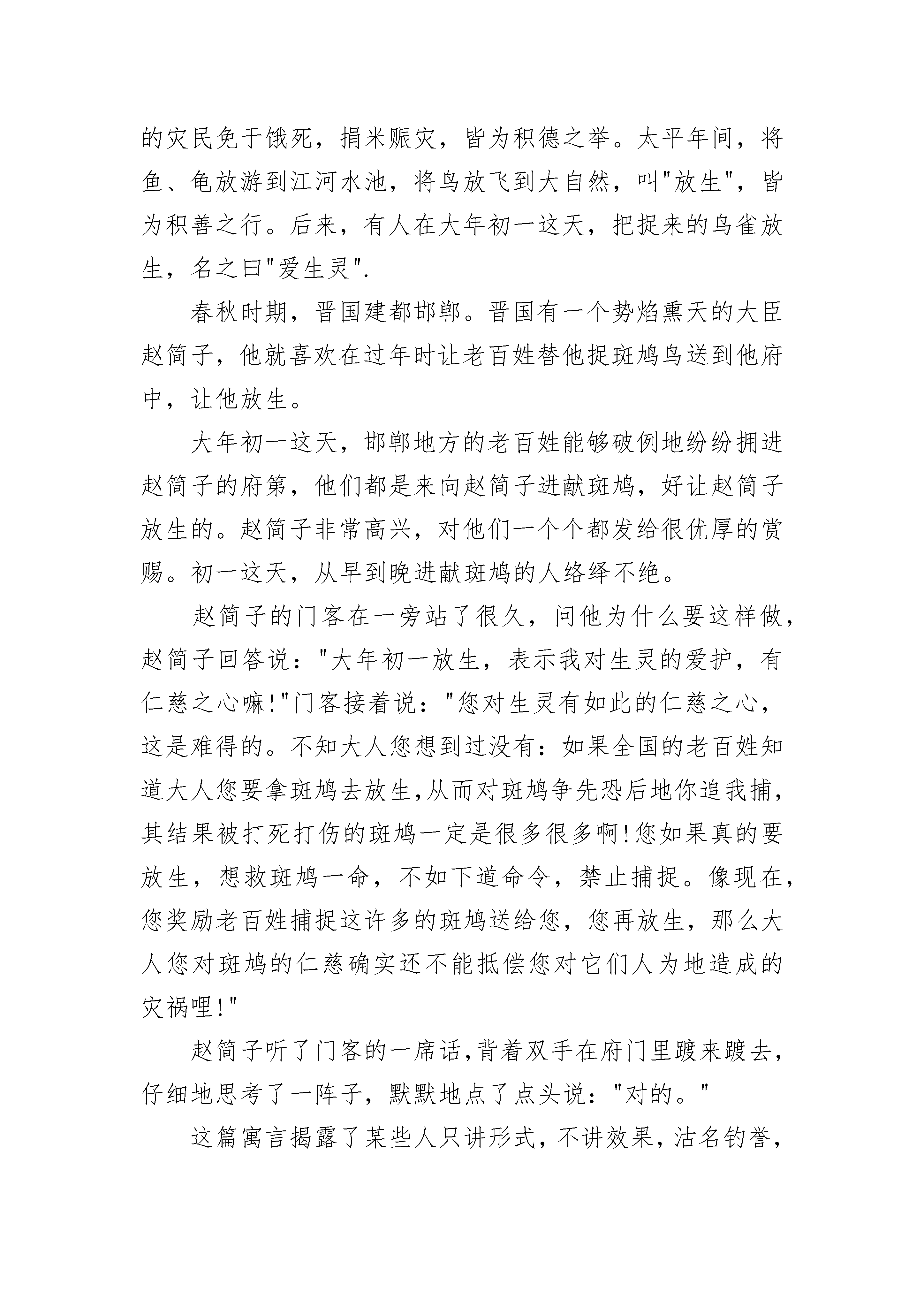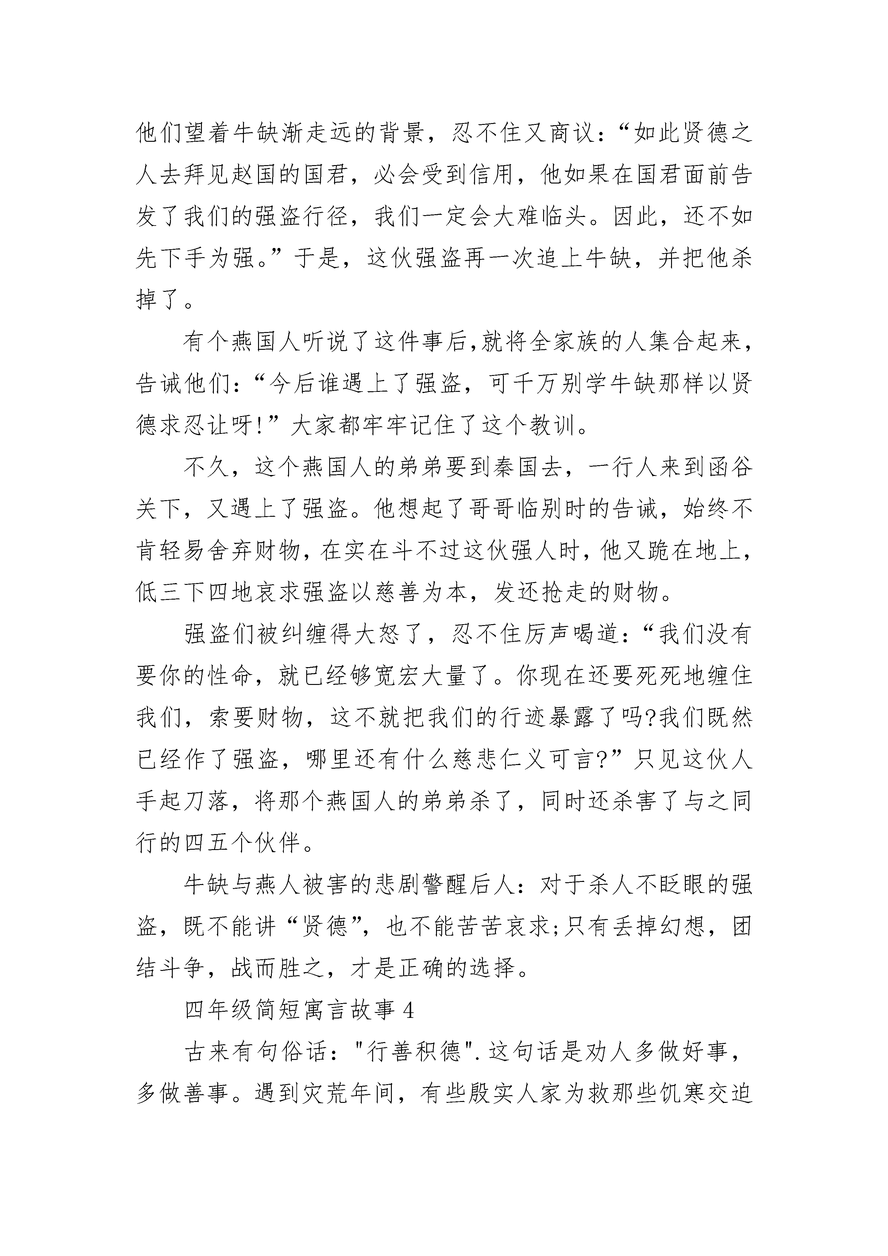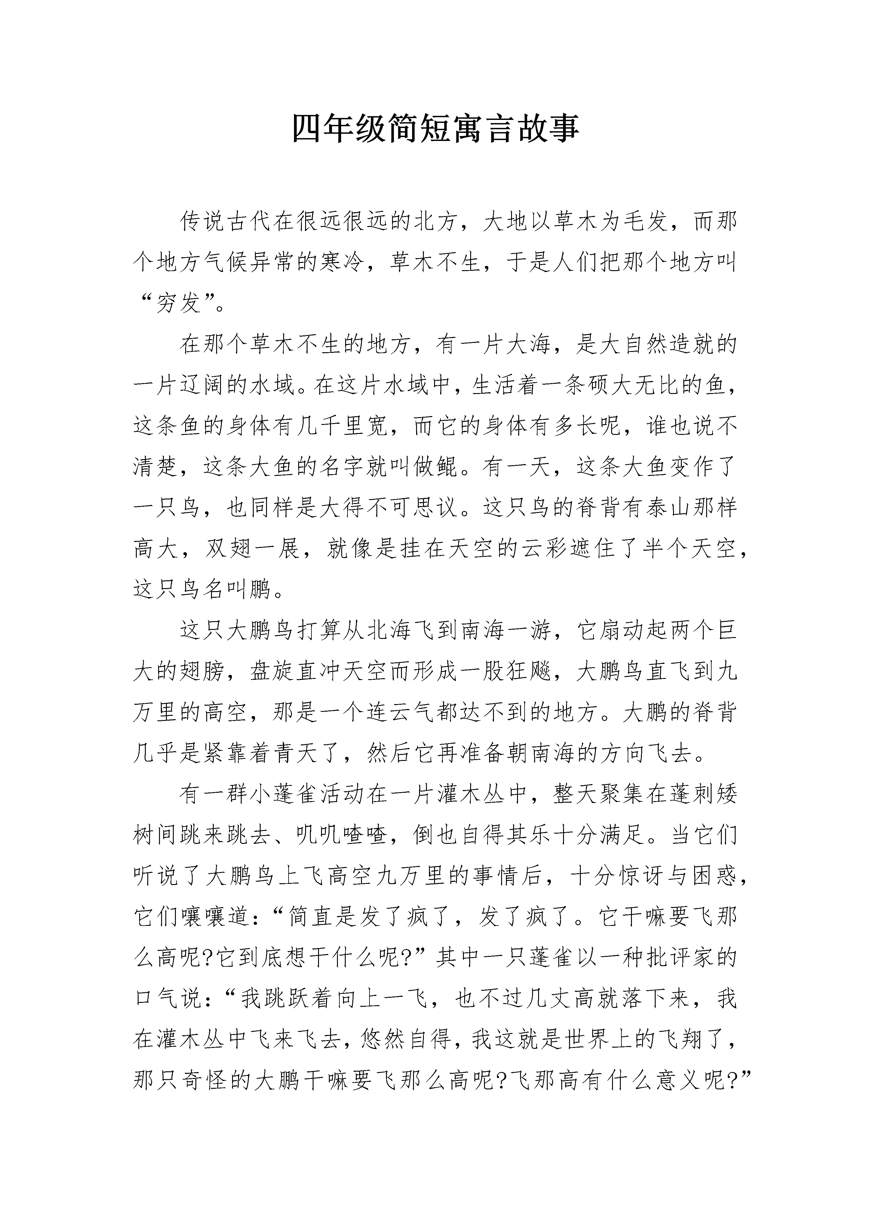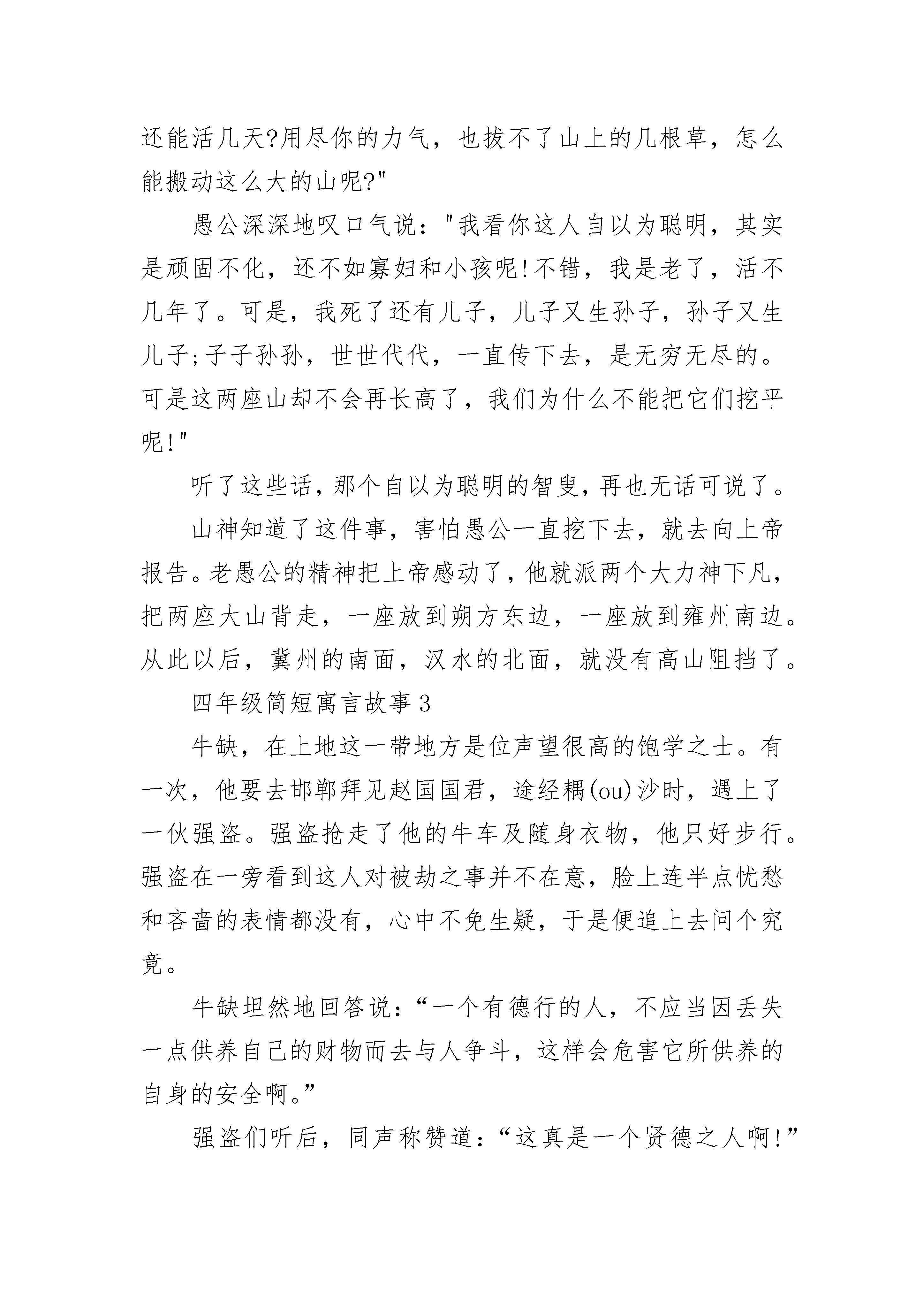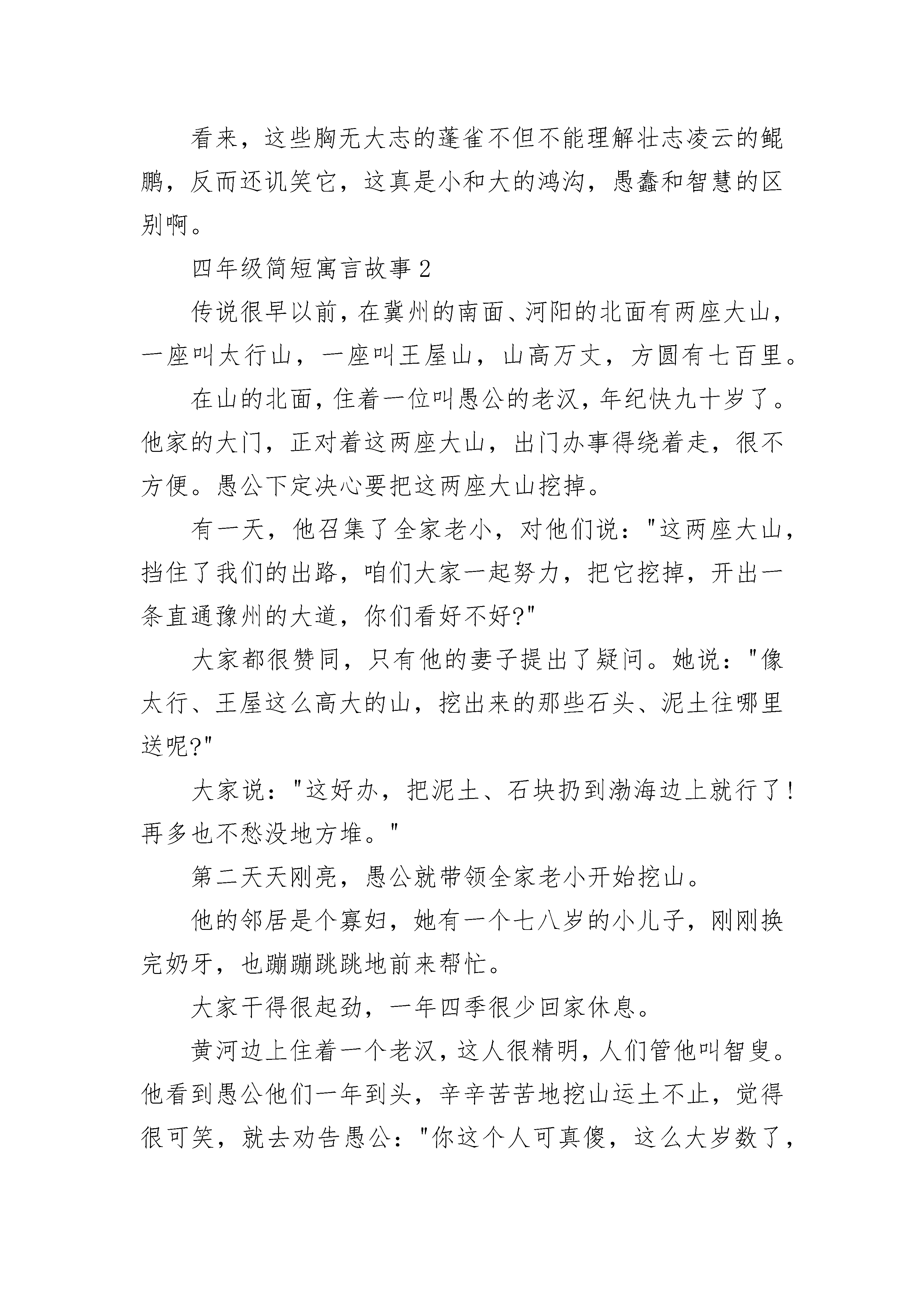 四年级简短寓言故事传说古代在很远很远的北方,大地以草木为毛发,而那个地方气候异常的寒冷,草木不生,于是人们把那个地方叫“穷发”。在那个草木不生的地方,有一片大海,是大自然造就的一片辽阔的水域。在这片水域中,生活着一条硕大无比的鱼,这条鱼的身体有几千里宽,而它的身体有多长呢,谁也说不清楚,这条大鱼的名字就叫做鲲。有一天,这条大鱼变作了一只鸟,也同样是大得不可思议。这只鸟的脊背有泰山那样高大,双翅一展,就像是挂在天空的云彩遮住了半个天空,这只鸟名叫鹏。这只大鹏鸟打算从北海飞到南海一游,它扇动起两个巨大的翅膀,盘旋直冲天空而形成一股狂飚,大鹏鸟直飞到九万里的高空,那是一个连云气都达不到的地方。大鹏的脊背几乎是紧靠着青天了,然后它再准备朝南海的方向飞去。有一群小蓬雀活动在一片灌木丛中,整天聚集在蓬刺矮树间跳来跳去、叽叽喳喳,倒也自得其乐十分满足。当它们听说了大鹏鸟上飞高空九万里的事情后,十分惊讶与困惑,它们嚷嚷道:“简直是发了疯了,发了疯了。它干嘛要飞那么高呢?它到底想干什么呢?”其中一只蓬雀以一种批评家的口气说:“我跳跃着向上一飞,也不过几丈高就落下来,我在灌木丛中飞来飞去,悠然自得,我这就是世界上的飞翔了,那只奇怪的大鹏干嘛要飞那么高呢?飞那高有什么意义呢?”看来,这些胸无大志的蓬雀不但不能理解壮志凌云的鲲鹏,反而还讥笑它,这真是小和大的鸿沟,愚蠢和智慧的区别啊。四年级简短寓言故事2传说很早以前,在冀州的南面、河阳的北面有两座大山,一座叫太行山,一座叫王屋山,山高万丈,方圆有七百里。在山的北面,住着一位叫愚公的老汉,年纪快九十岁了。他家的大门,正对着这两座大山,出门办事得绕着走,很不方便。愚公下定决心要把这两座大山挖掉。有一天,他召集了全家老小,对他们说:"这两座大山,挡住了我们的出路,咱们大家一起努力,把它挖掉,开出一条直通豫州的大道,你们看好不好?"大家都很赞同,只有他的妻子提出了疑问。她说:"像太行、王屋这么高大的山,挖出来的那些石头、泥土往哪里送呢?"大家说:"这好办,把泥土、石块扔到渤海边上就行了!再多也不愁没地方堆。"第二天天刚亮,愚公就带领全家老小开始挖山。他的邻居是个寡妇,她有一个七八岁的小儿子,刚刚换完奶牙,也蹦蹦跳跳地前来帮忙。大家干得很起劲,一年四季很少回家休息。黄河边上住着一个老汉,这人很精明,人们管他叫智叟。他看到愚公他们一年到头,辛辛苦苦地挖山运土不止,觉得很可笑,就去劝告愚公:"你这个人可真傻,这么大岁数了,还能活几天?用尽你的力气,也拔不了山上的几根草,怎么能搬动这么大的山呢?"愚公深深地叹口气说:"我看你这人自以为聪明,其实是顽固不化,还不如寡妇和小孩呢!不错,我是老了,活不几年了。可是,我死了还有儿子,儿子又生孙子,孙子又生儿子;子子孙孙,世世代代,一直传下去,是无穷无尽的。可是这两座山却不会再长高了,我们为什么不能把它们挖平呢!"听了这些话,那个自以为聪明的智叟,再也无话可说了。山神知道了这件事,害怕愚公一直挖下去,就去向上帝报告。老愚公的精神把上帝感动了,他就派两个大力神下凡,把两座大山背走,一座放到朔方东边,一座放到雍州南边。从此以后,冀州的南面,汉水的北面,就没有高山阻挡了。四年级简短寓言故事3牛缺,在上地这一带地方是位声望很高的饱学之士。有一次,他要去邯郸拜见赵国国君,途经耦(ou)沙时,遇上了一伙强盗。强盗抢走了他的牛车及随身衣物,他只好步行。强盗在一旁看到这人对被劫之事并不在意,脸上连半点忧愁和吝啬的表情都没有,心中不免生疑,于是便追上去问个究竟。牛缺坦然地回答说:“一个有德行的人,不应当因丢失一点供养自己的财物而去与人争斗,这样会危害它所供养的自身的安全啊。”强盗们听后,同声称赞道:“这真是一个贤德之人啊!”他们望着牛缺渐走远的背景,忍不住又商议:“如此贤德之人去拜见赵国的国君,必会受到信用,他如果在国君面前告发了我们的强盗行径,我们一定会大难临头。因此,还不如先下手为强。”于是,这伙强盗再一次追上牛缺,并把他杀掉了。有个燕国人听说了这件事后,就将全家族的人集合起来,告诫他们:“今后谁遇上了强盗,可千万别学牛缺那样以贤德求忍让呀!”大家都牢牢记住了这个教训。不久,这个燕国人的弟弟要到秦国去,一行人来到函谷关下,又遇上了强盗。他想起了哥哥临别时的告诫,始终不肯轻易舍弃财物,在实在斗不过这伙强人时,他又跪在地上,低三下四地哀求强盗以慈善为本,发还抢走的财物。强盗们被纠缠得大怒了,忍不住厉声喝道:“我们没有要你的性命,就已经够宽宏大量了。你现在还要死死地缠住我们,索要财物,这不就把我们的行迹暴露了吗?我们既然已经作了强盗,哪里还有什么慈悲仁义可言?”只见这伙人手起刀落,将那个燕国人的弟弟杀了,同时还杀害了与之同行的四五个伙伴。牛缺与燕人被害的悲剧警醒后人:对于杀人不眨眼的强盗,既不