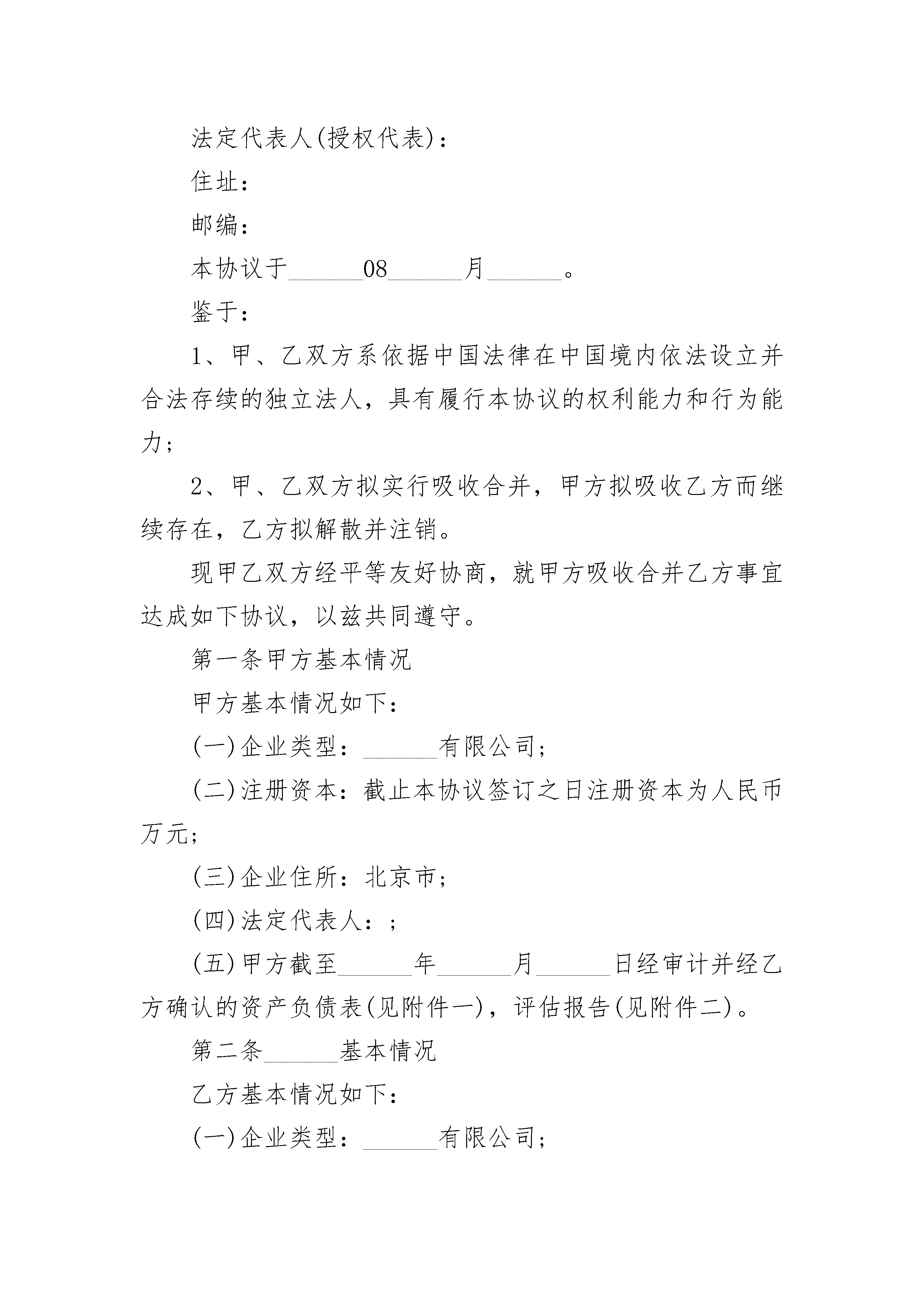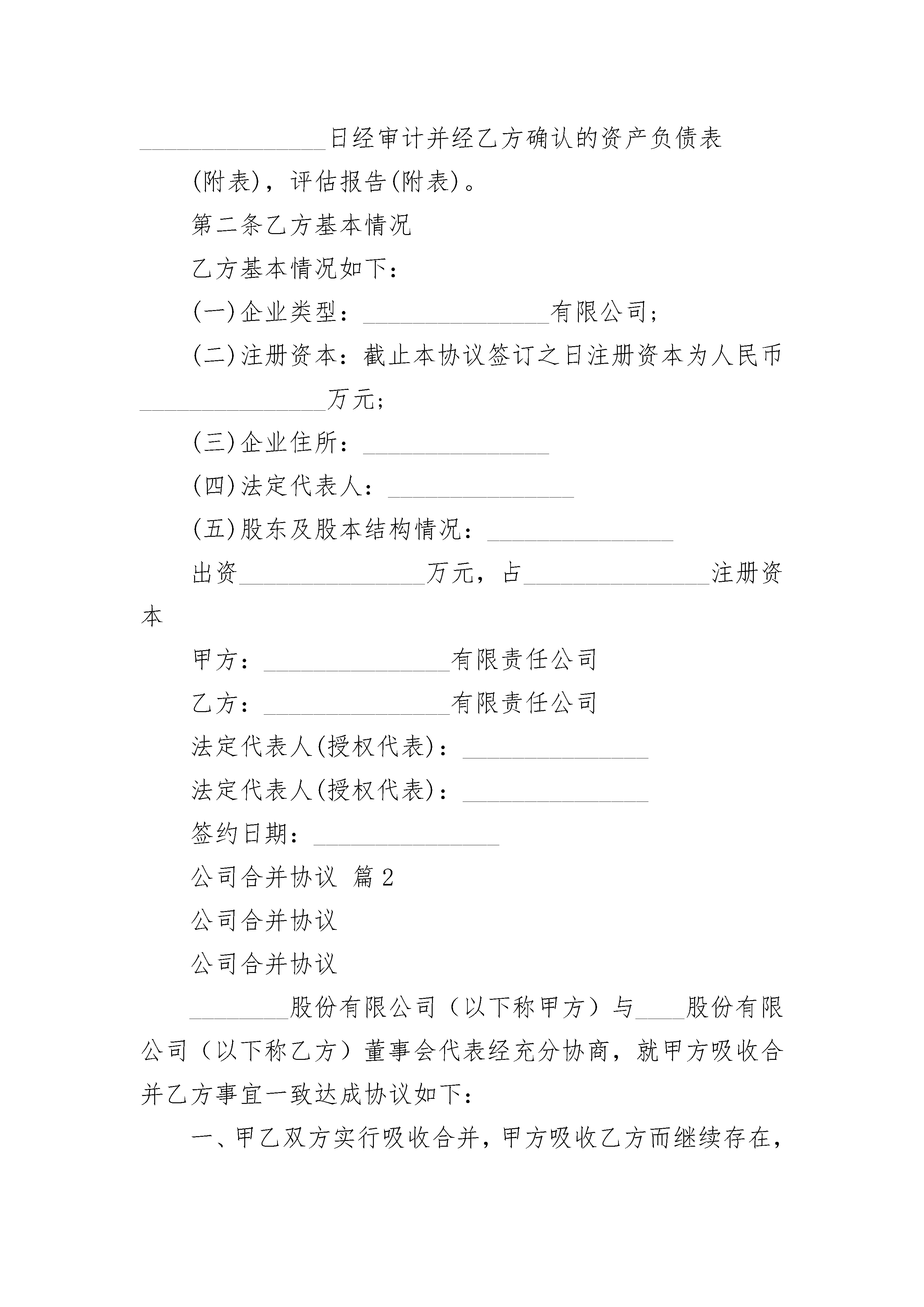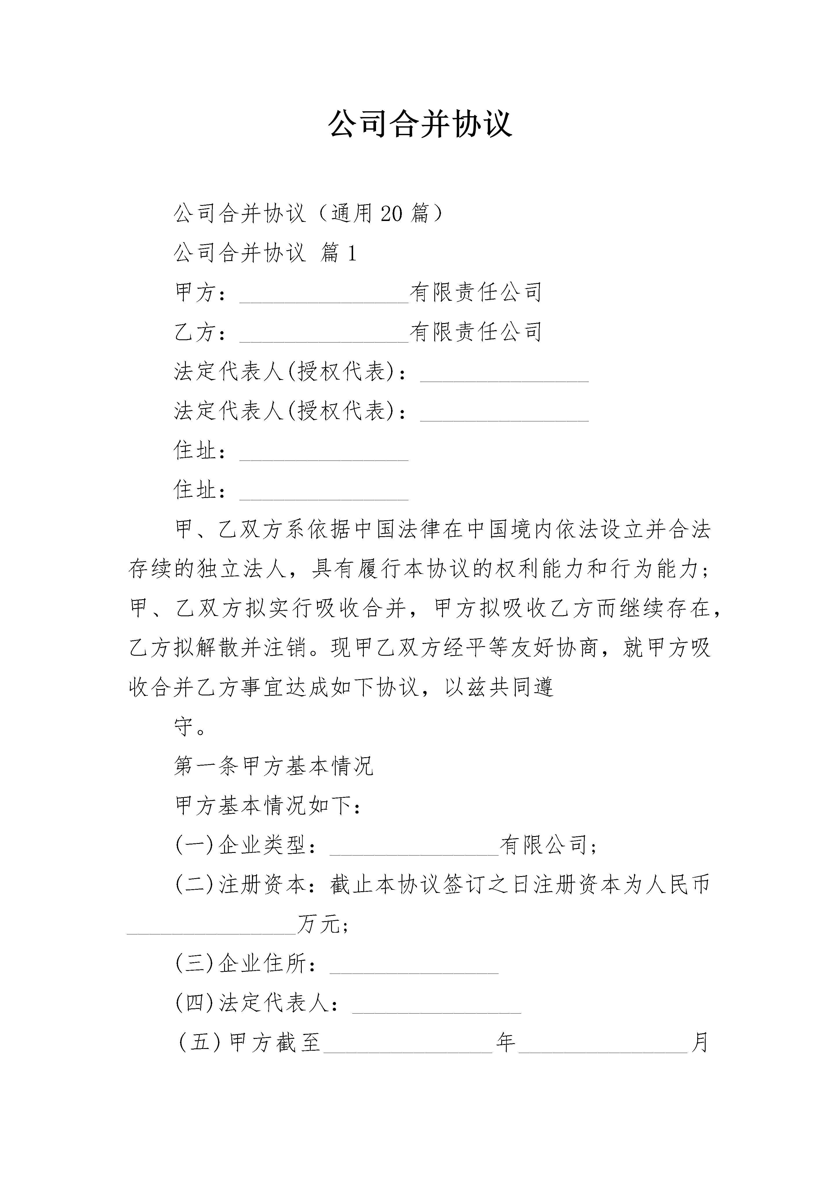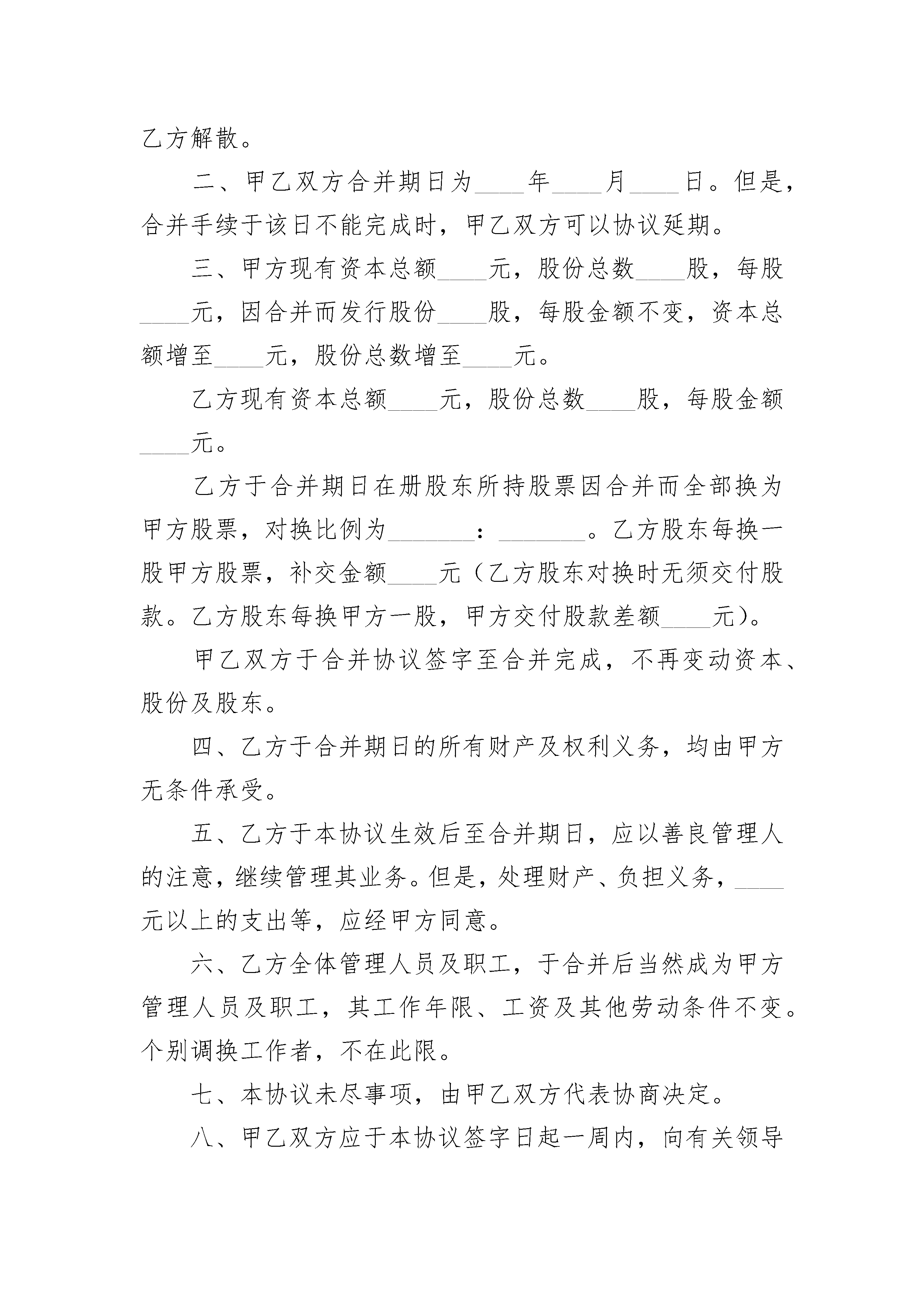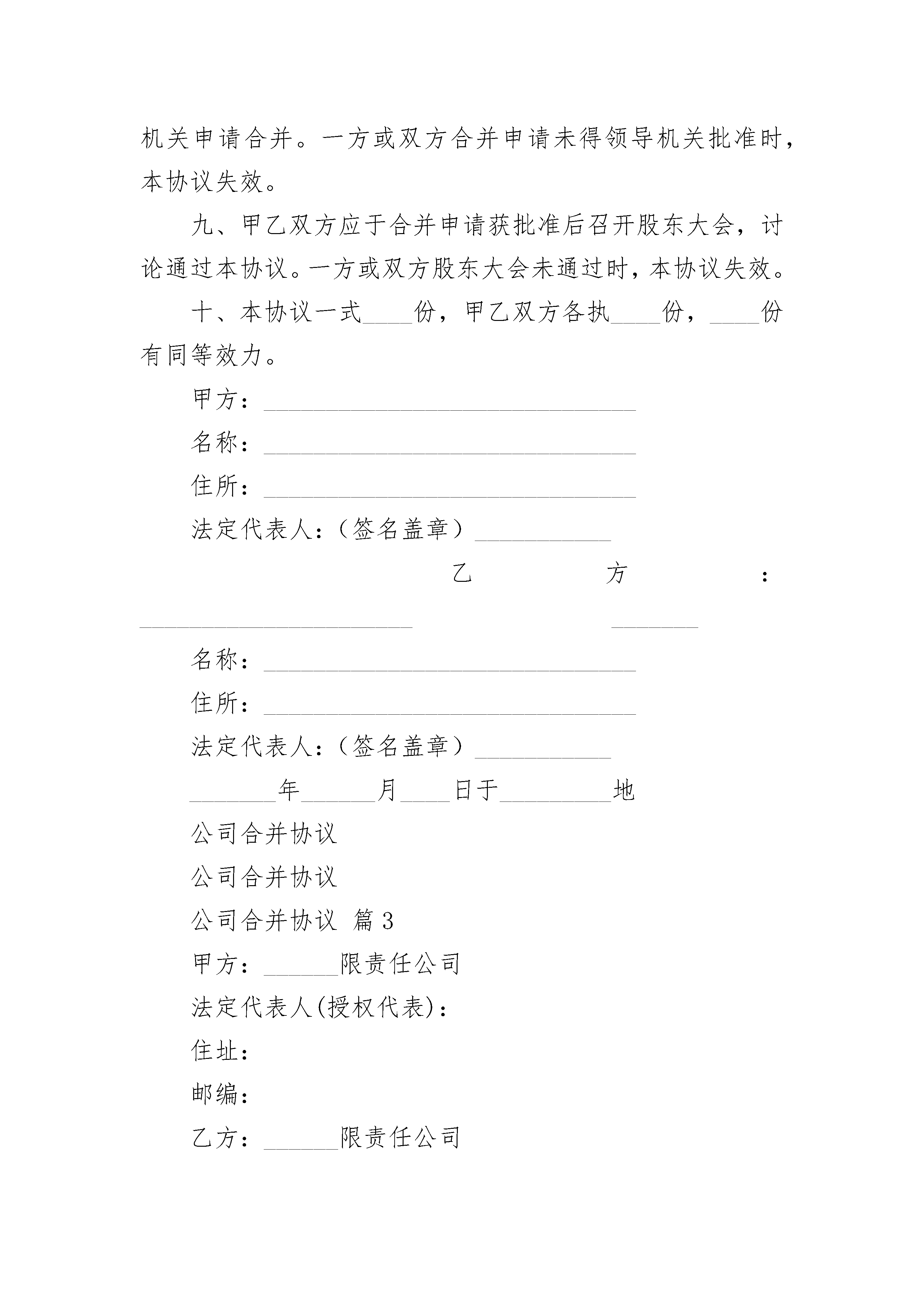 公司合并协议公司合并协议(通用20篇)公司合并协议篇1甲方:_______________有限责任公司乙方:_______________有限责任公司法定代表人(授权代表):_______________法定代表人(授权代表):_______________住址:_______________住址:_______________甲、乙双方系依据中国法律在中国境内依法设立并合法存续的独立法人,具有履行本协议的权利能力和行为能力;甲、乙双方拟实行吸收合并,甲方拟吸收乙方而继续存在,乙方拟解散并注销。现甲乙双方经平等友好协商,就甲方吸收合并乙方事宜达成如下协议,以兹共同遵守。第一条甲方基本情况甲方基本情况如下:(一)企业类型:_______________有限公司;(二)注册资本:截止本协议签订之日注册资本为人民币_______________万元;(三)企业住所:_______________(四)法定代表人:_______________(五)甲方截至_______________年_______________月_______________日经审计并经乙方确认的资产负债表(附表),评估报告(附表)。第二条乙方基本情况乙方基本情况如下:(一)企业类型:_______________有限公司;(二)注册资本:截止本协议签订之日注册资本为人民币_______________万元;(三)企业住所:_______________(四)法定代表人:_______________(五)股东及股本结构情况:_______________出资_______________万元,占_______________注册资本甲方:_______________有限责任公司乙方:_______________有限责任公司法定代表人(授权代表):_______________法定代表人(授权代表):_______________签约日期:_______________公司合并协议篇2公司合并协议公司合并协议________股份有限公司(以下称甲方)与____股份有限公司(以下称乙方)董事会代表经充分协商,就甲方吸收合并乙方事宜一致达成协议如下:一、甲乙双方实行吸收合并,甲方吸收乙方而继续存在,乙方解散。二、甲乙双方合并期日为____年____月____日。但是,合并手续于该日不能完成时,甲乙双方可以协议延期。三、甲方现有资本总额____元,股份总数____股,每股____元,因合并而发行股份____股,每股金额不变,资本总额增至____元,股份总数增至____元。乙方现有资本总额____元,股份总数____股,每股金额____元。乙方于合并期日在册股东所持股票因合并而全部换为甲方股票,对换比例为_______:_______。乙方股东每换一股甲方股票,补交金额____元(乙方股东对换时无须交付股款。乙方股东每换甲方一股,甲方交付股款差额____元)。甲乙双方于合并协议签字至合并完成,不再变动资本、股份及股东。四、乙方于合并期日的所有财产及权利义务,均由甲方无条件承受。五、乙方于本协议生效后至合并期日,应以善良管理人的注意,继续管理其业务。但是,处理财产、负担义务,____元以上的支出等,应经甲方同意。六、乙方全体管理人员及职工,于合并后当然成为甲方管理人员及职工,其工作年限、工资及其他劳动条件不变。个别调换工作者,不在此限。七、本协议未尽事项,由甲乙双方代表协商决定。八、甲乙双方应于本协议签字日起一周内,向有关领导机关申请合并。一方或双方合并申请未得领导机关批准时,本协议失效。九、甲乙双方应于合并申请获批准后召开股东大会,讨论通过本协议。一方或双方股东大会未通过时,本协议失效。十、本协议一式____份,甲乙双方各执____份,____份有同等效力。甲方:______________________________名称:______________________________住所:______________________________法定代表人:(签名盖章)___________乙方:_____________________________名称:______________________________住所:______________________________法定代表人:(签名盖章)__________________年______月____日于_________地公司合并协议公司合并协议公司合并协议篇3甲方:______限责任公司法定代表人(授权代表):住址:邮编:乙方:______限责任公司法定代表人(授权代表):住址:邮编:本协议于______08______月______。鉴于:1、甲、乙双方系依据中国法律