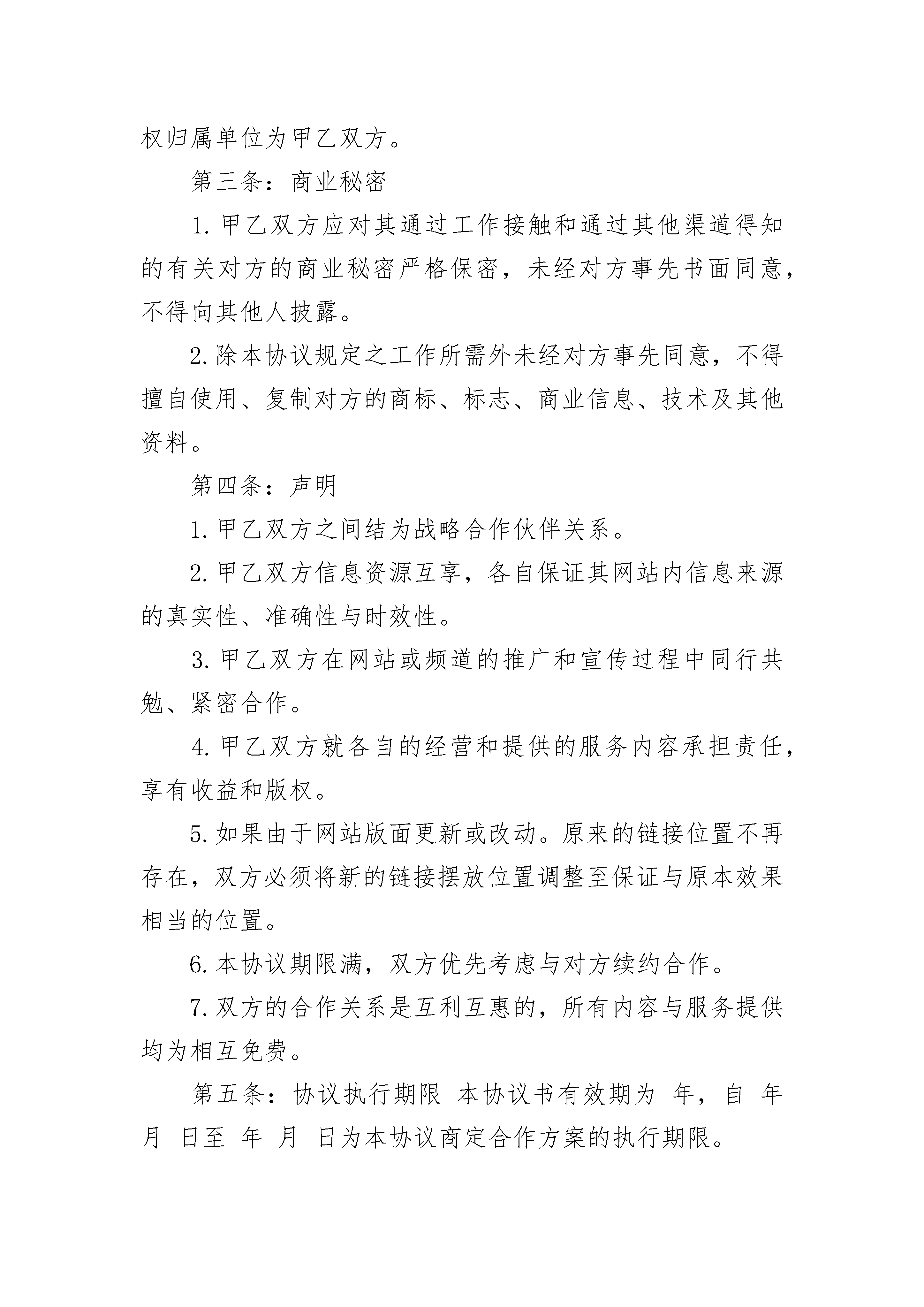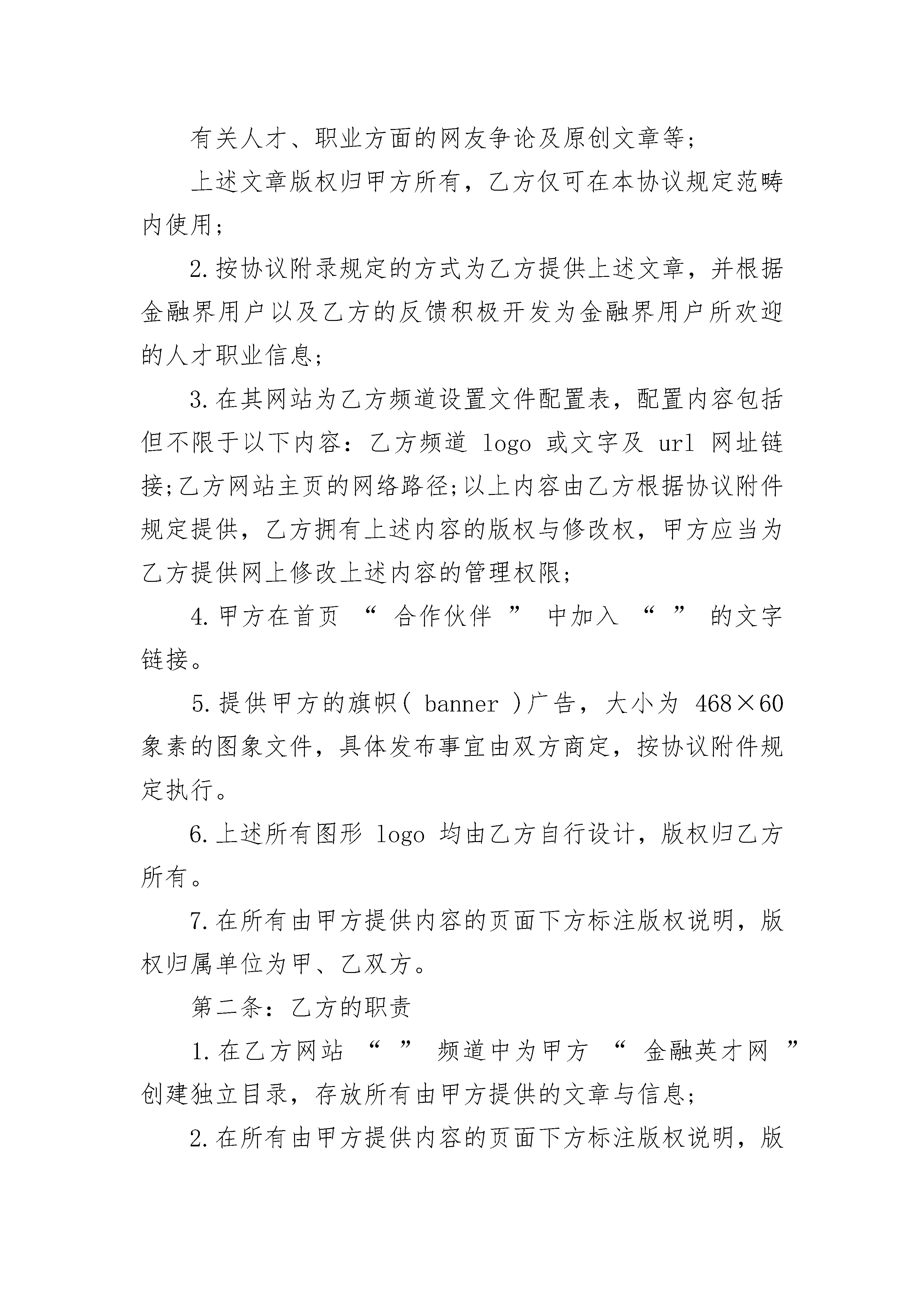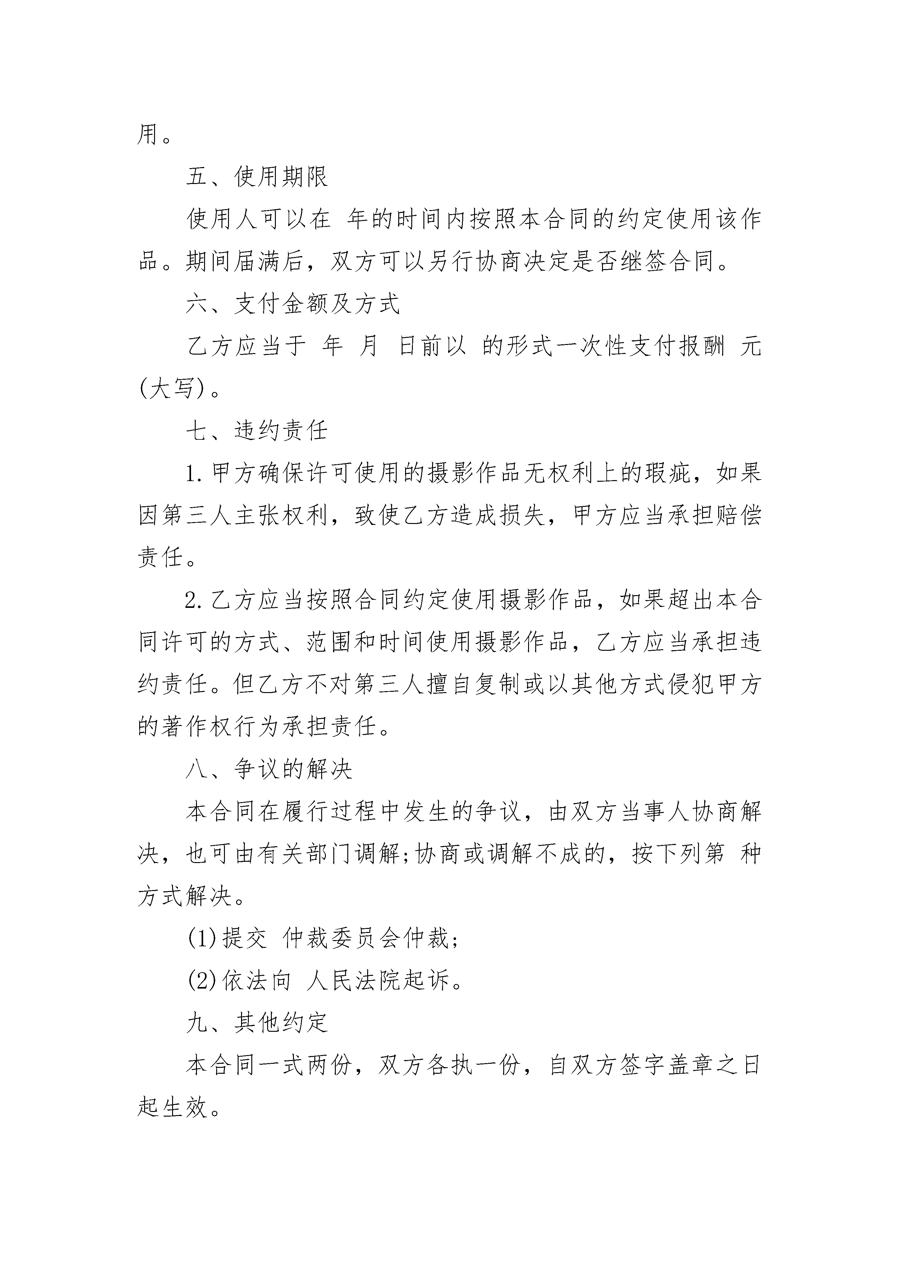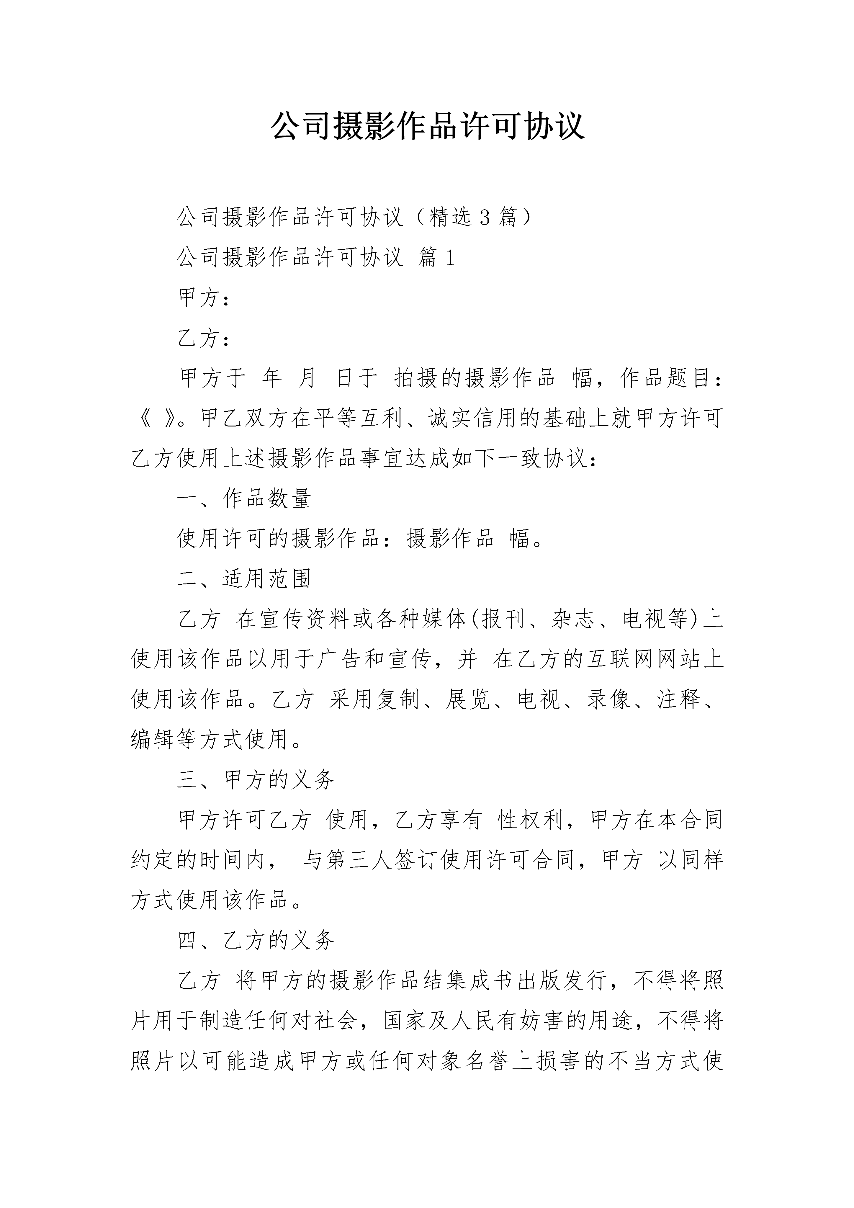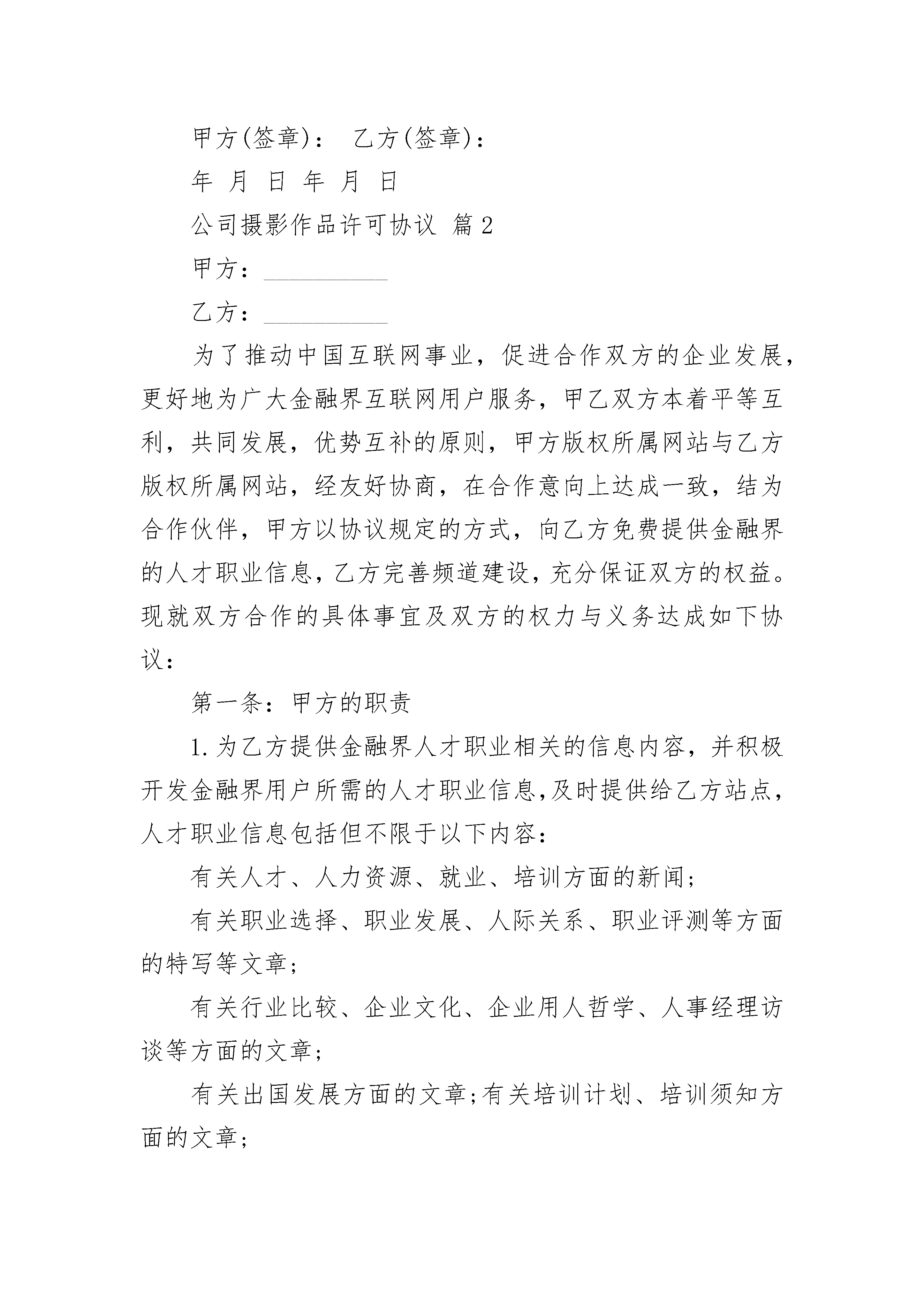公司摄影作品许可协议公司摄影作品许可协议(精选3篇)公司摄影作品许可协议篇1甲方:乙方:甲方于年月日于拍摄的摄影作品幅,作品题目:《》。甲乙双方在平等互利、诚实信用的基础上就甲方许可乙方使用上述摄影作品事宜达成如下一致协议:一、作品数量使用许可的摄影作品:摄影作品幅。二、适用范围乙方在宣传资料或各种媒体(报刊、杂志、电视等)上使用该作品以用于广告和宣传,并在乙方的互联网网站上使用该作品。乙方采用复制、展览、电视、录像、注释、编辑等方式使用。三、甲方的义务甲方许可乙方使用,乙方享有性权利,甲方在本合同约定的时间内,与第三人签订使用许可合同,甲方以同样方式使用该作品。四、乙方的义务乙方将甲方的摄影作品结集成书出版发行,不得将照片用于制造任何对社会,国家及人民有妨害的用途,不得将照片以可能造成甲方或任何对象名誉上损害的不当方式使用。五、使用期限使用人可以在年的时间内按照本合同的约定使用该作品。期间届满后,双方可以另行协商决定是否继签合同。六、支付金额及方式乙方应当于年月日前以的形式一次性支付报酬元(大写)。七、违约责任1.甲方确保许可使用的摄影作品无权利上的瑕疵,如果因第三人主张权利,致使乙方造成损失,甲方应当承担赔偿责任。2.乙方应当按照合同约定使用摄影作品,如果超出本合同许可的方式、范围和时间使用摄影作品,乙方应当承担违约责任。但乙方不对第三人擅自复制或以其他方式侵犯甲方的著作权行为承担责任。八、争议的解决本合同在履行过程中发生的争议,由双方当事人协商解决,也可由有关部门调解;协商或调解不成的,按下列第种方式解决。(1)提交仲裁委员会仲裁;(2)依法向人民法院起诉。九、其他约定本合同一式两份,双方各执一份,自双方签字盖章之日起生效。甲方(签章):乙方(签章):年月日年月日公司摄影作品许可协议篇2甲方:__________乙方:__________为了推动中国互联网事业,促进合作双方的企业发展,更好地为广大金融界互联网用户服务,甲乙双方本着平等互利,共同发展,优势互补的原则,甲方版权所属网站与乙方版权所属网站,经友好协商,在合作意向上达成一致,结为合作伙伴,甲方以协议规定的方式,向乙方免费提供金融界的人才职业信息,乙方完善频道建设,充分保证双方的权益。现就双方合作的具体事宜及双方的权力与义务达成如下协议:第一条:甲方的职责1.为乙方提供金融界人才职业相关的信息内容,并积极开发金融界用户所需的人才职业信息,及时提供给乙方站点,人才职业信息包括但不限于以下内容:有关人才、人力资源、就业、培训方面的新闻;有关职业选择、职业发展、人际关系、职业评测等方面的特写等文章;有关行业比较、企业文化、企业用人哲学、人事经理访谈等方面的文章;有关出国发展方面的文章;有关培训计划、培训须知方面的文章;有关人才、职业方面的网友争论及原创文章等;上述文章版权归甲方所有,乙方仅可在本协议规定范畴内使用;2.按协议附录规定的方式为乙方提供上述文章,并根据金融界用户以及乙方的反馈积极开发为金融界用户所欢迎的人才职业信息;3.在其网站为乙方频道设置文件配置表,配置内容包括但不限于以下内容:乙方频道logo或文字及url网址链接;乙方网站主页的网络路径;以上内容由乙方根据协议附件规定提供,乙方拥有上述内容的版权与修改权,甲方应当为乙方提供网上修改上述内容的管理权限;4.甲方在首页“合作伙伴”中加入“”的文字链接。5.提供甲方的旗帜(banner)广告,大小为468×60象素的图象文件,具体发布事宜由双方商定,按协议附件规定执行。6.上述所有图形logo均由乙方自行设计,版权归乙方所有。7.在所有由甲方提供内容的页面下方标注版权说明,版权归属单位为甲、乙双方。第二条:乙方的职责1.在乙方网站“”频道中为甲方“金融英才网”创建独立目录,存放所有由甲方提供的文章与信息;2.在所有由甲方提供内容的页面下方标注版权说明,版权归属单位为甲乙双方。第三条:商业秘密1.甲乙双方应对其通过工作接触和通过其他渠道得知的有关对方的商业秘密严格保密,未经对方事先书面同意,不得向其他人披露。2.除本协议规定之工作所需外未经对方事先同意,不得擅自使用、复制对方的商标、标志、商业信息、技术及其他资料。第四条:声明1.甲乙双方之间结为战略合作伙伴关系。2.甲乙双方信息资源互享,各自保证其网站内信息来源的真实性、准确性与时效性。3.甲乙双方在网站或频道的推广和宣传过程中同行共勉、紧密合作。4.甲乙双方就各自的经营和提供的服务内容承担责任,享有收益和版权。5.如果由于网站版面更新或改动。原来的链接位置不再存在,双方必须将新的链接摆放位置调整至保证与原本效果相当的位置。6.本协议期限满,双方优先考虑与对方续约合作。7.双方的合作关系是互利互惠的,所有内容与服务提供均为相互免费。第五条:协议执行期限本