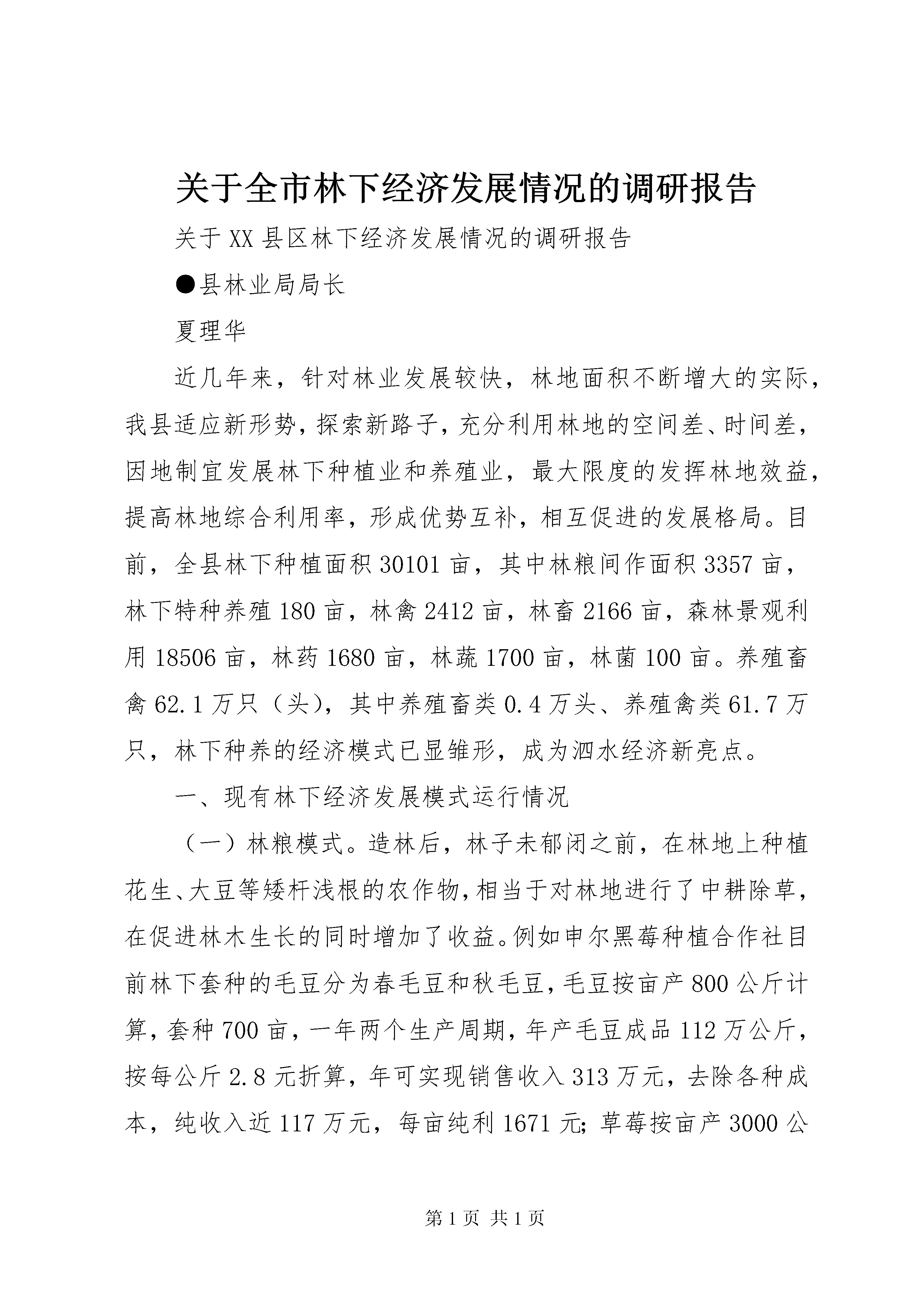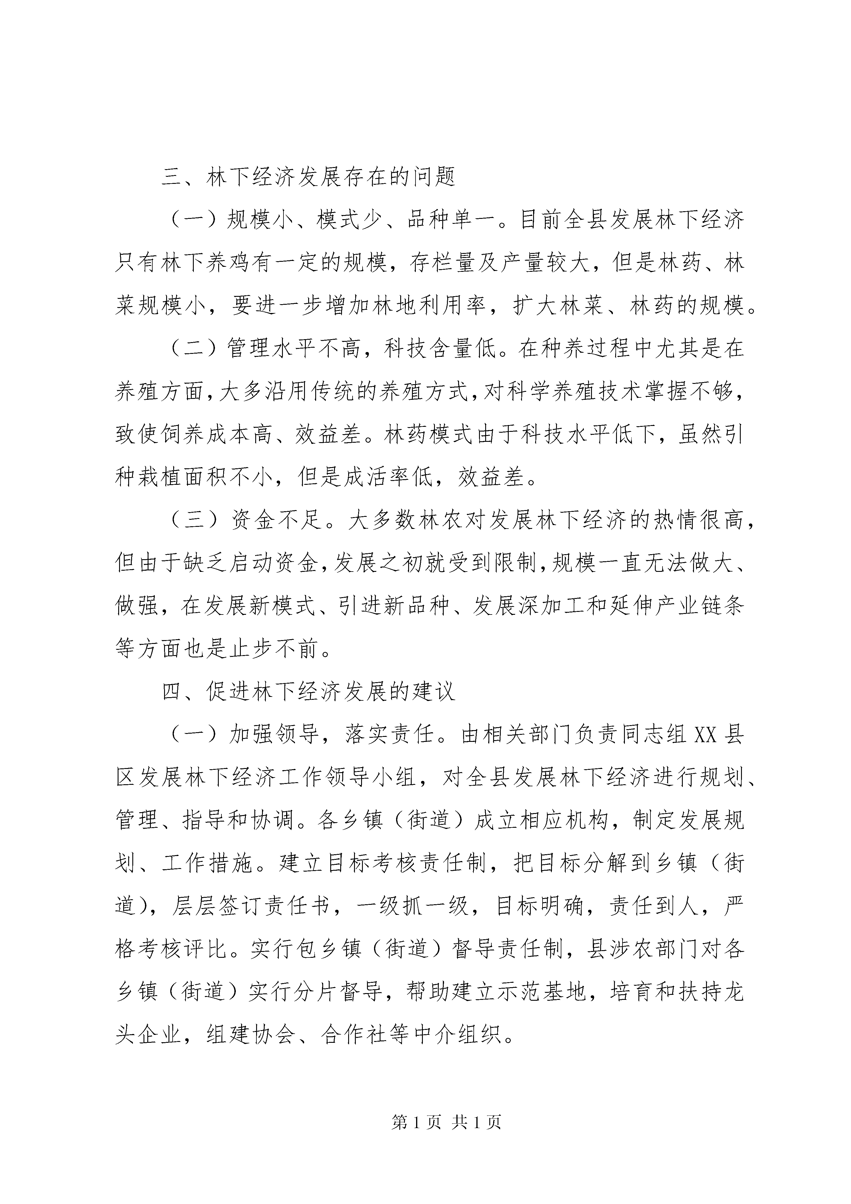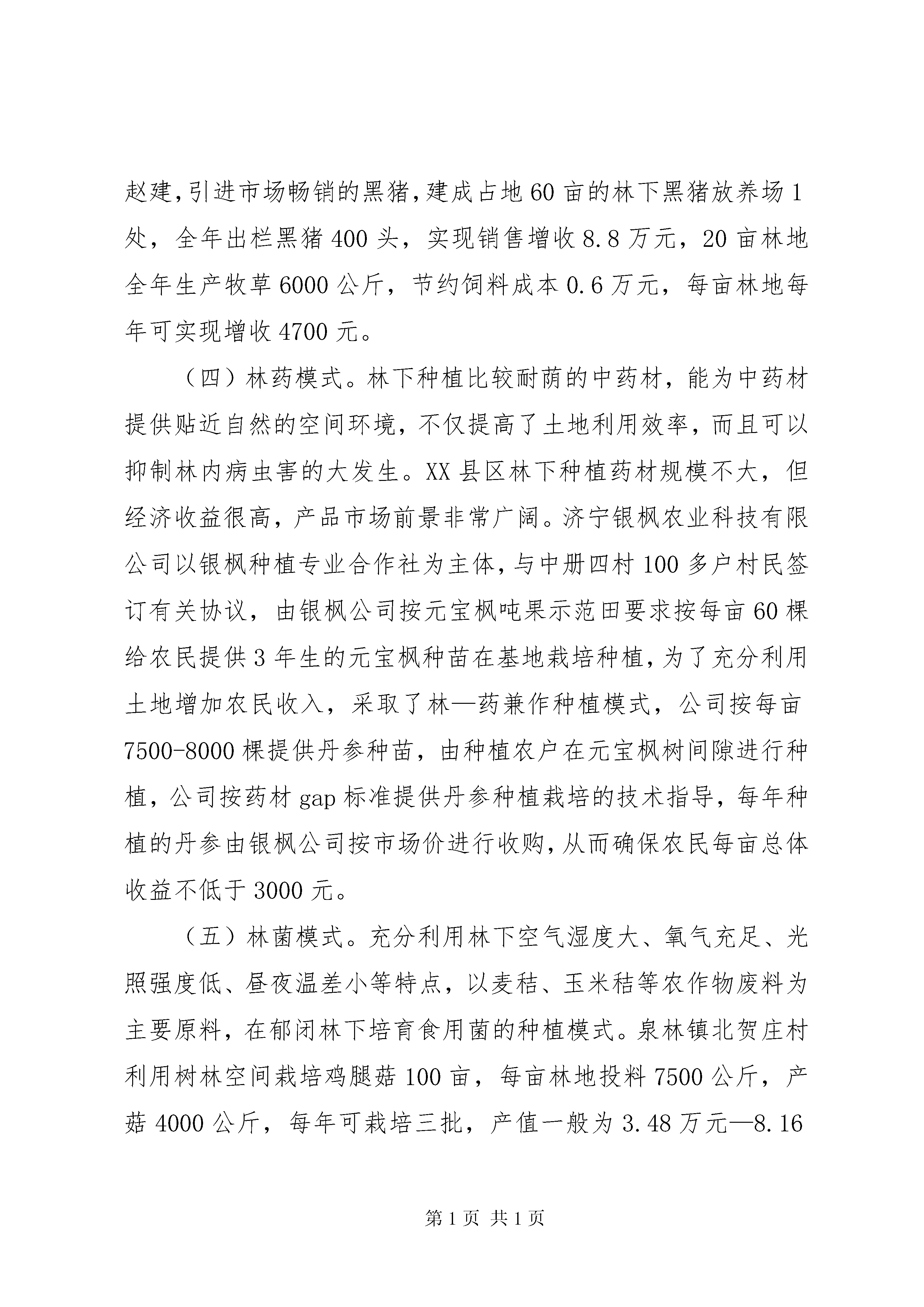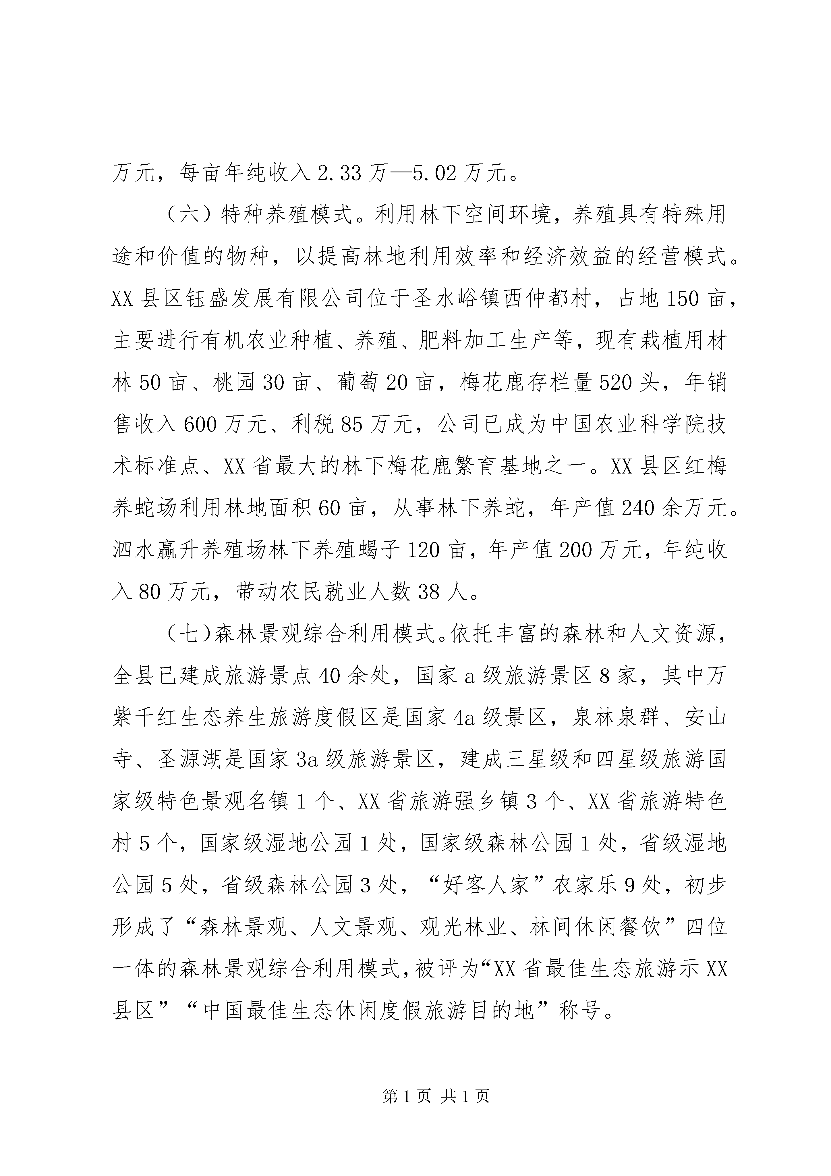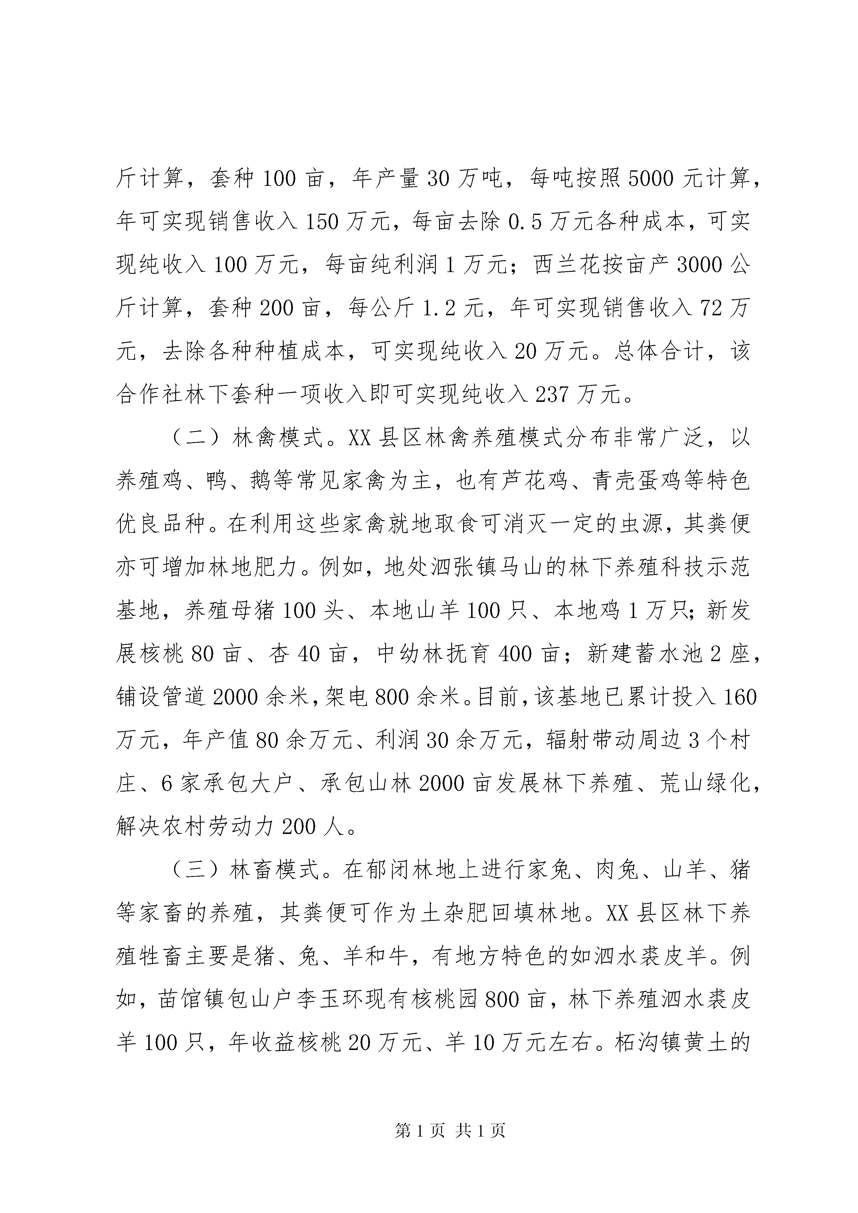 关于全市林下经济发展情况的调研报告关于XX县区林下经济发展情况的调研报告●县林业局局长夏理华近几年来,针对林业发展较快,林地面积不断增大的实际,我县适应新形势,探索新路子,充分利用林地的空间差、时间差,因地制宜发展林下种植业和养殖业,最大限度的发挥林地效益,提高林地综合利用率,形成优势互补,相互促进的发展格局。目前,全县林下种植面积30101亩,其中林粮间作面积3357亩,林下特种养殖180亩,林禽2412亩,林畜2166亩,森林景观利用18506亩,林药1680亩,林蔬1700亩,林菌100亩。养殖畜禽62.1万只(头),其中养殖畜类0.4万头、养殖禽类61.7万只,林下种养的经济模式已显雏形,成为泗水经济新亮点。一、现有林下经济发展模式运行情况(一)林粮模式。造林后,林子未郁闭之前,在林地上种植花生、大豆等矮杆浅根的农作物,相当于对林地进行了中耕除草,在促进林木生长的同时增加了收益。例如申尔黑莓种植合作社目前林下套种的毛豆分为春毛豆和秋毛豆,毛豆按亩产800公斤计算,套种700亩,一年两个生产周期,年产毛豆成品112万公斤,按每公斤2.8元折算,年可实现销售收入313万元,去除各种成本,纯收入近117万元,每亩纯利1671元;草莓按亩产3000公斤计算,套种100亩,年产量30万吨,每吨按照5000元计算,年可实现销售收入150万元,每亩去除0.5万元各种成本,可实现纯收入100万元,每亩纯利润1万元;西兰花按亩产3000公斤计算,套种200亩,每公斤1.2元,年可实现销售收入72万元,去除各种种植成本,可实现纯收入20万元。总体合计,该合作社林下套种一项收入即可实现纯收入237万元。(二)林禽模式。XX县区林禽养殖模式分布非常广泛,以养殖鸡、鸭、鹅等常见家禽为主,也有芦花鸡、青壳蛋鸡等特色优良品种。在利用这些家禽就地取食可消灭一定的虫源,其粪便亦可增加林地肥力。例如,地处泗张镇马山的林下养殖科技示范基地,养殖母猪100头、本地山羊100只、本地鸡1万只;新发展核桃80亩、杏40亩,中幼林抚育400亩;新建蓄水池2座,铺设管道2000余米,架电800余米。目前,该基地已累计投入160万元,年产值80余万元、利润30余万元,辐射带动周边3个村庄、6家承包大户、承包山林2000亩发展林下养殖、荒山绿化,解决农村劳动力200人。(三)林畜模式。在郁闭林地上进行家兔、肉兔、山羊、猪等家畜的养殖,其粪便可作为土杂肥回填林地。XX县区林下养殖牲畜主要是猪、兔、羊和牛,有地方特色的如泗水裘皮羊。例如,苗馆镇包山户李玉环现有核桃园800亩,林下养殖泗水裘皮羊100只,年收益核桃20万元、羊10万元左右。柘沟镇黄土的赵建,引进市场畅销的黑猪,建成占地60亩的林下黑猪放养场1处,全年出栏黑猪400头,实现销售增收8.8万元,20亩林地全年生产牧草6000公斤,节约饲料成本0.6万元,每亩林地每年可实现增收4700元。(四)林药模式。林下种植比较耐荫的中药材,能为中药材提供贴近自然的空间环境,不仅提高了土地利用效率,而且可以抑制林内病虫害的大发生。XX县区林下种植药材规模不大,但经济收益很高,产品市场前景非常广阔。济宁银枫农业科技有限公司以银枫种植专业合作社为主体,与中册四村100多户村民签订有关协议,由银枫公司按元宝枫吨果示范田要求按每亩60棵给农民提供3年生的元宝枫种苗在基地栽培种植,为了充分利用土地增加农民收入,采取了林—药兼作种植模式,公司按每亩7500-8000棵提供丹参种苗,由种植农户在元宝枫树间隙进行种植,公司按药材gap标准提供丹参种植栽培的技术指导,每年种植的丹参由银枫公司按市场价进行收购,从而确保农民每亩总体收益不低于3000元。(五)林菌模式。充分利用林下空气湿度大、氧气充足、光照强度低、昼夜温差小等特点,以麦秸、玉米秸等农作物废料为主要原料,在郁闭林下培育食用菌的种植模式。泉林镇北贺庄村利用树林空间栽培鸡腿菇100亩,每亩林地投料7500公斤,产菇4000公斤,每年可栽培三批,产值一般为3.48万元—8.16万元,每亩年纯收入2.33万—5.02万元。(六)特种养殖模式。利用林下空间环境,养殖具有特殊用途和价值的物种,以提高林地利用效率和经济效益的经营模式。XX县区钰盛发展有限公司位于圣水峪镇西仲都村,占地150亩,主要进行有机农业种植、养殖、肥料加工生产等,现有栽植用材林50亩、桃园30亩、葡萄20亩,梅花鹿存栏量520头,年销售收入600万元、利税85万元,公司已成为中国农业科学院技术标准点、XX省最大的林下梅花鹿繁育基地之一。XX县区红梅养蛇场利用林地面积60亩,从事林下养蛇,年产值240余万元。泗水赢升养殖场林下养殖蝎子120亩,年产值200万元,年纯收入80万元,带动农民就业人数38人