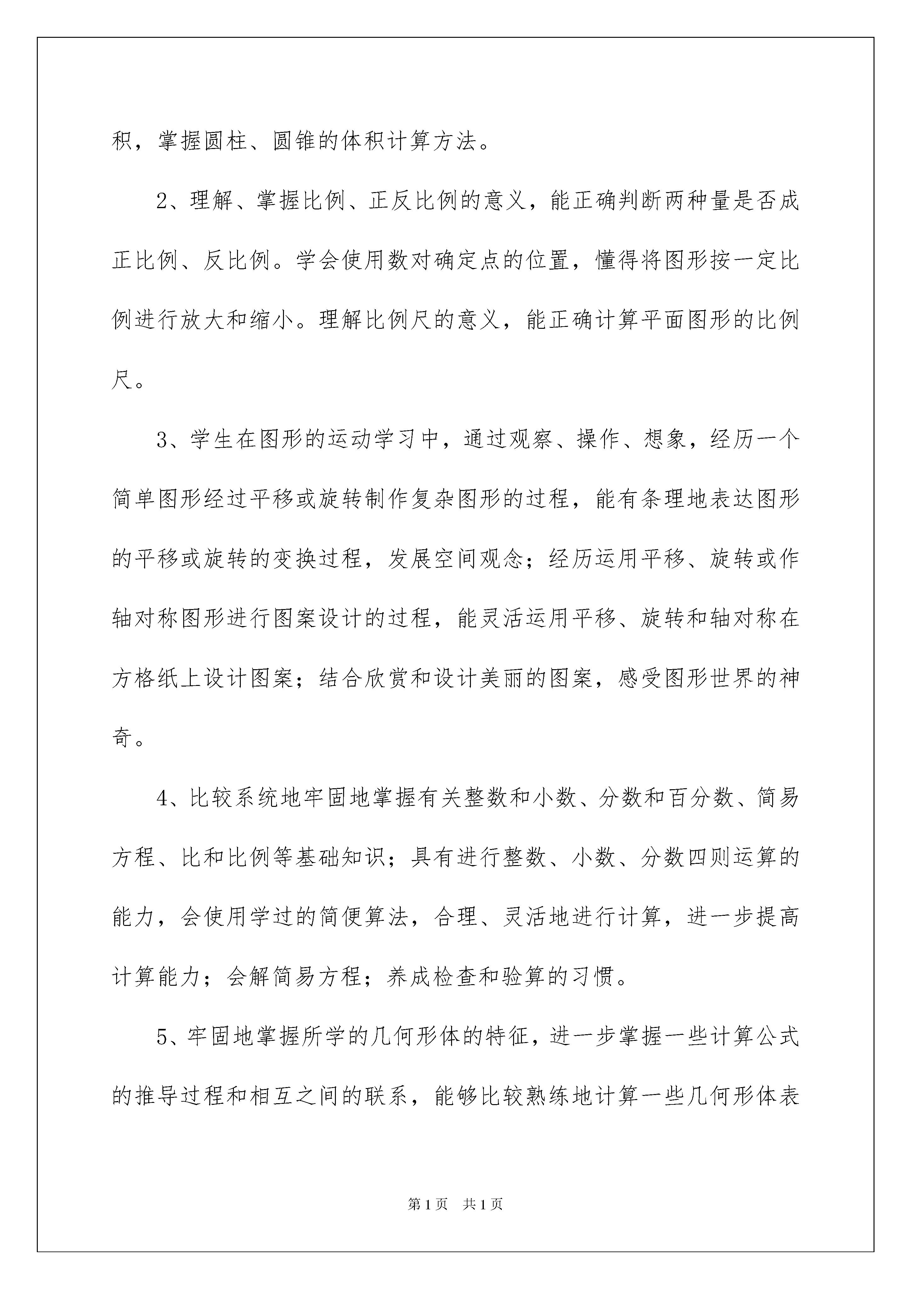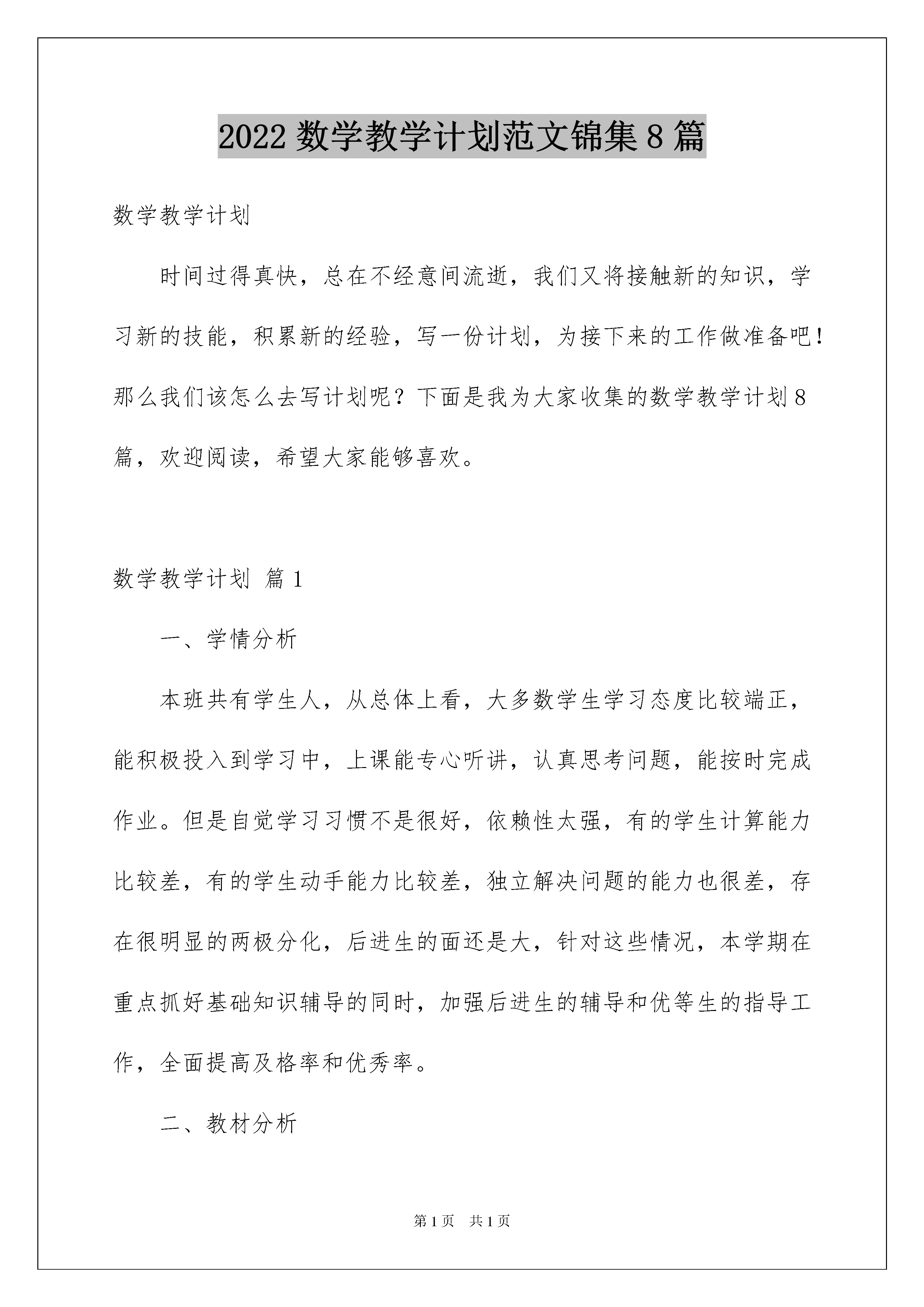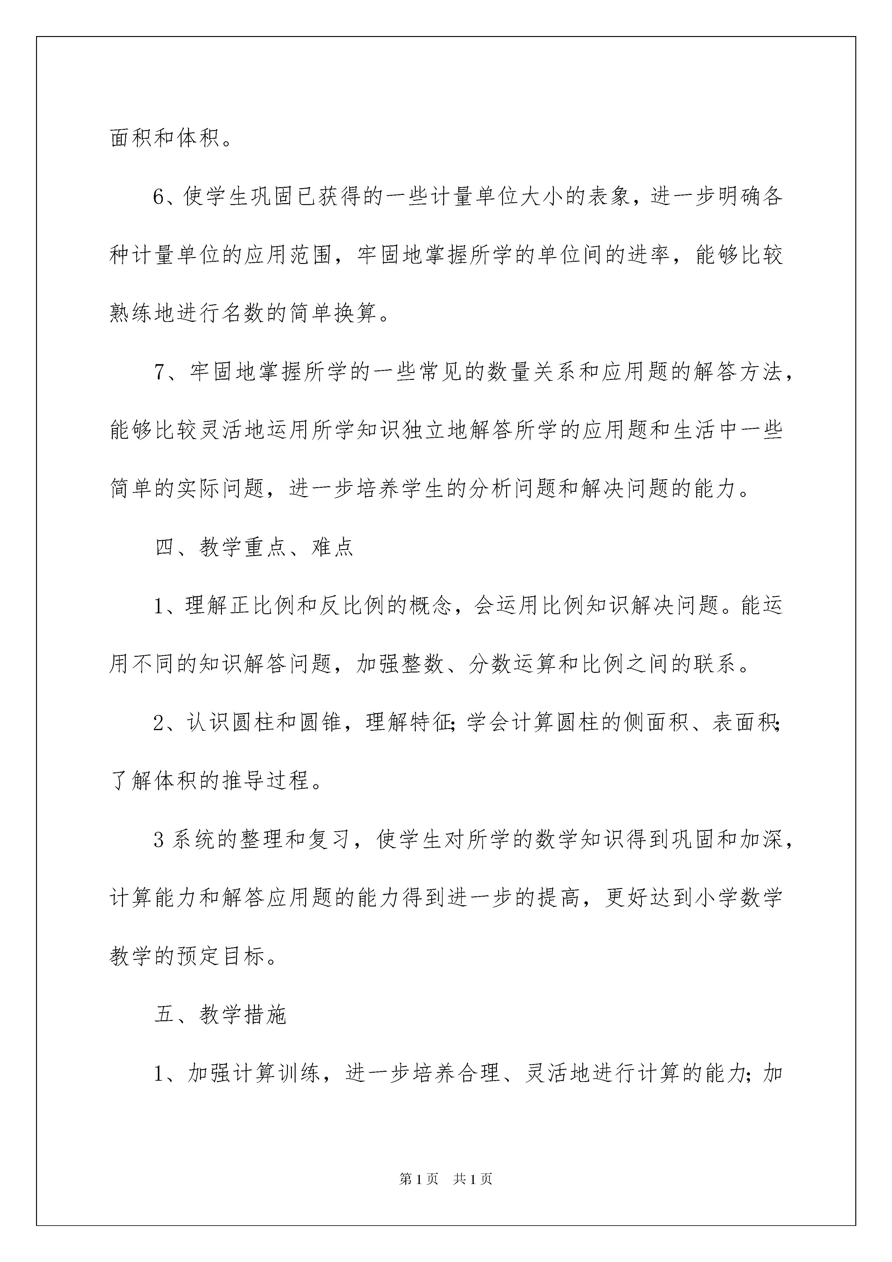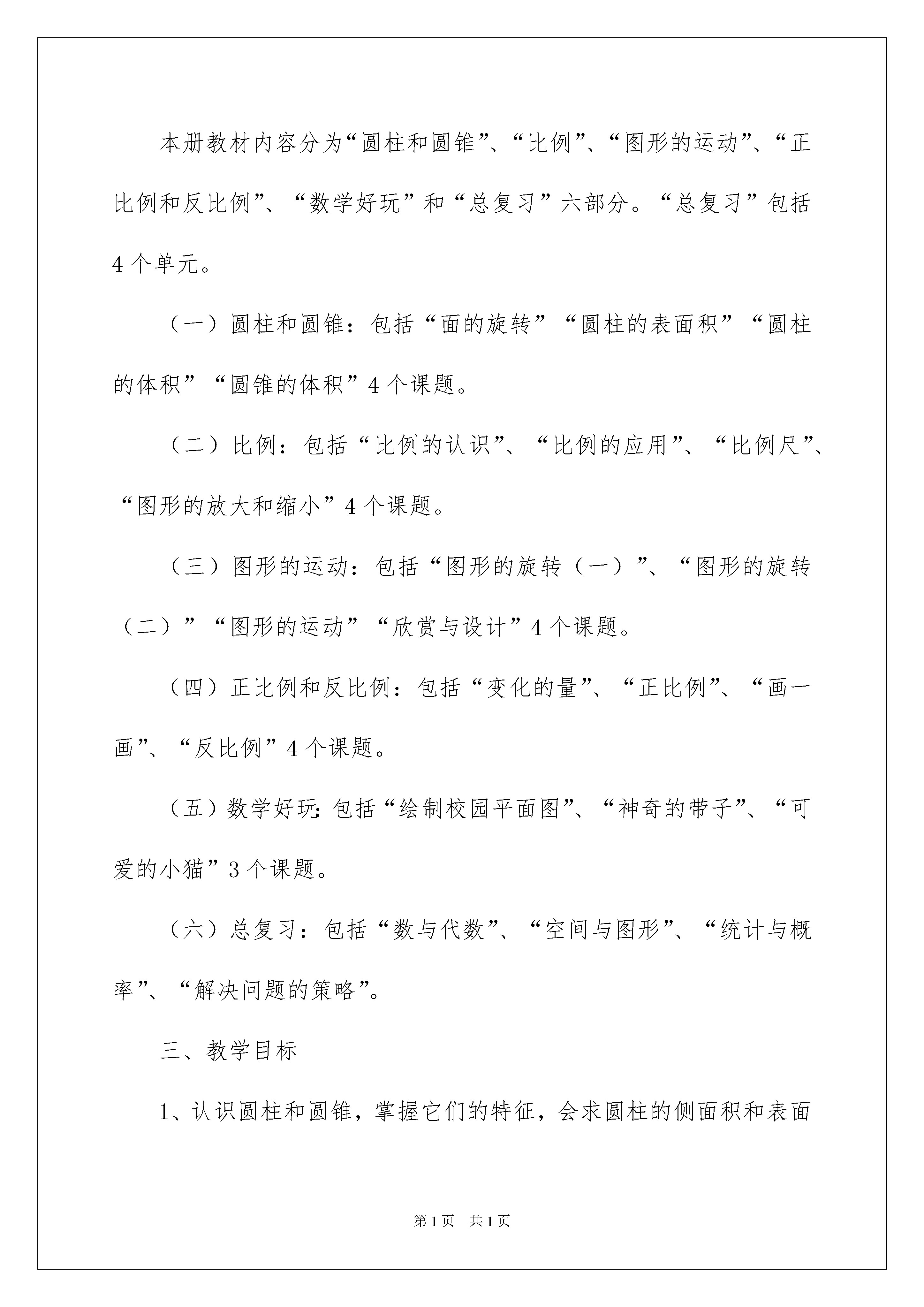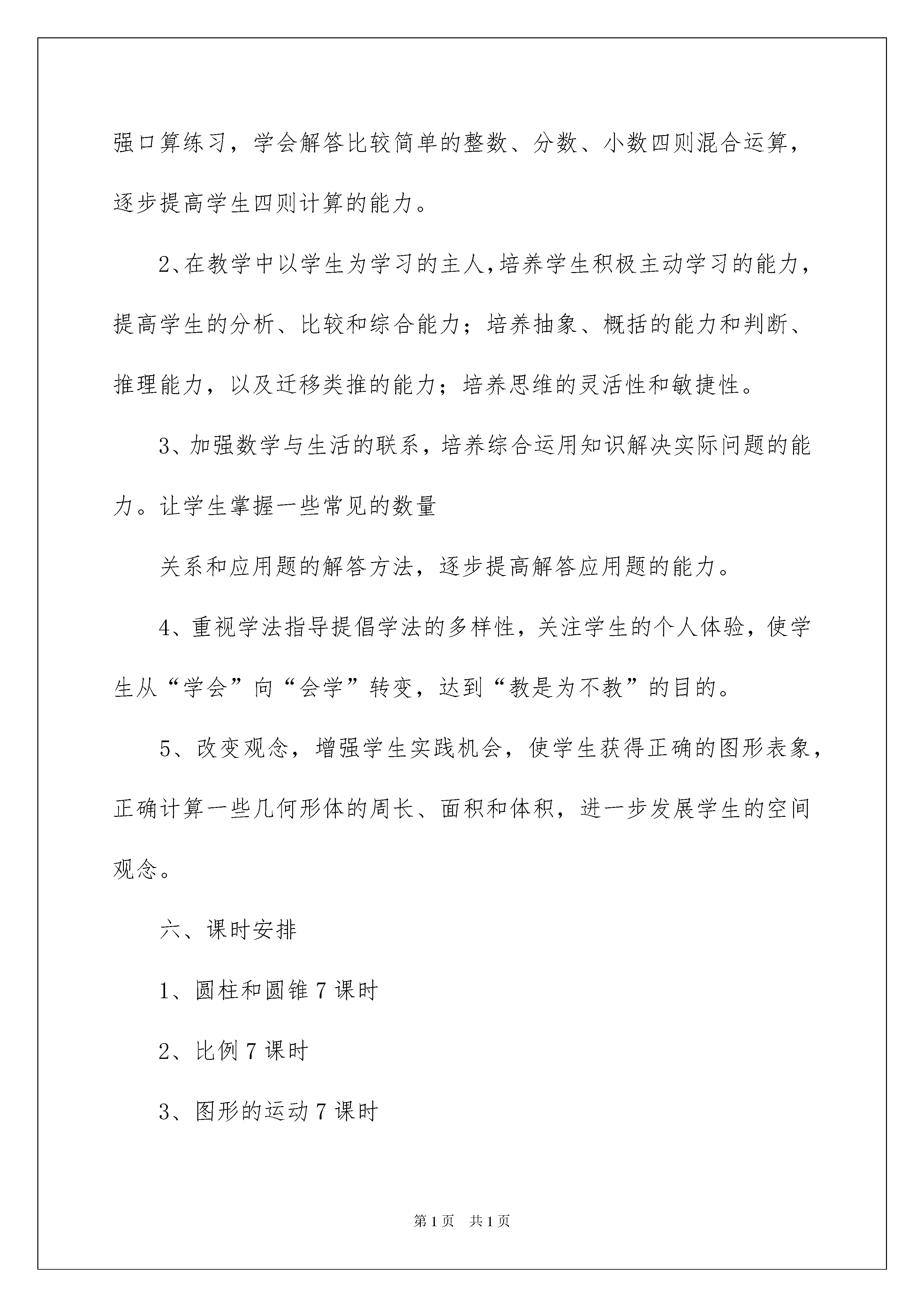 2022数学教学计划范文锦集8篇数学教学计划时间过得真快,总在不经意间流逝,我们又将接触新的知识,学习新的技能,积累新的经验,写一份计划,为接下来的工作做准备吧!那么我们该怎么去写计划呢?下面是我为大家收集的数学教学计划8篇,欢迎阅读,希望大家能够喜欢。数学教学计划篇1一、学情分析本班共有学生人,从总体上看,大多数学生学习态度比较端正,能积极投入到学习中,上课能专心听讲,认真思考问题,能按时完成作业。但是自觉学习习惯不是很好,依赖性太强,有的学生计算能力比较差,有的学生动手能力比较差,独立解决问题的能力也很差,存在很明显的两极分化,后进生的面还是大,针对这些情况,本学期在重点抓好基础知识辅导的同时,加强后进生的辅导和优等生的指导工作,全面提高及格率和优秀率。二、教材分析本册教材内容分为“圆柱和圆锥”、“比例”、“图形的运动”、“正比例和反比例”、“数学好玩”和“总复习”六部分。“总复习”包括4个单元。(一)圆柱和圆锥:包括“面的旋转”“圆柱的表面积”“圆柱的体积”“圆锥的体积”4个课题。(二)比例:包括“比例的认识”、“比例的应用”、“比例尺”、“图形的放大和缩小”4个课题。(三)图形的运动:包括“图形的旋转(一)”、“图形的旋转(二)”“图形的运动”“欣赏与设计”4个课题。(四)正比例和反比例:包括“变化的量”、“正比例”、“画一画”、“反比例”4个课题。(五)数学好玩:包括“绘制校园平面图”、“神奇的带子”、“可爱的小猫”3个课题。(六)总复习:包括“数与代数”、“空间与图形”、“统计与概率”、“解决问题的策略”。三、教学目标1、认识圆柱和圆锥,掌握它们的特征,会求圆柱的侧面积和表面积,掌握圆柱、圆锥的体积计算方法。2、理解、掌握比例、正反比例的意义,能正确判断两种量是否成正比例、反比例。学会使用数对确定点的位置,懂得将图形按一定比例进行放大和缩小。理解比例尺的意义,能正确计算平面图形的比例尺。3、学生在图形的运动学习中,通过观察、操作、想象,经历一个简单图形经过平移或旋转制作复杂图形的过程,能有条理地表达图形的平移或旋转的变换过程,发展空间观念;经历运用平移、旋转或作轴对称图形进行图案设计的过程,能灵活运用平移、旋转和轴对称在方格纸上设计图案;结合欣赏和设计美丽的图案,感受图形世界的神奇。4、比较系统地牢固地掌握有关整数和小数、分数和百分数、简易方程、比和比例等基础知识;具有进行整数、小数、分数四则运算的能力,会使用学过的简便算法,合理、灵活地进行计算,进一步提高计算能力;会解简易方程;养成检查和验算的习惯。5、牢固地掌握所学的几何形体的特征,进一步掌握一些计算公式的推导过程和相互之间的联系,能够比较熟练地计算一些几何形体表面积和体积。6、使学生巩固已获得的一些计量单位大小的表象,进一步明确各种计量单位的应用范围,牢固地掌握所学的单位间的进率,能够比较熟练地进行名数的简单换算。7、牢固地掌握所学的一些常见的数量关系和应用题的解答方法,能够比较灵活地运用所学知识独立地解答所学的应用题和生活中一些简单的实际问题,进一步培养学生的分析问题和解决问题的能力。四、教学重点、难点1、理解正比例和反比例的概念,会运用比例知识解决问题。能运用不同的知识解答问题,加强整数、分数运算和比例之间的联系。2、认识圆柱和圆锥,理解特征;学会计算圆柱的侧面积、表面积;了解体积的推导过程。3系统的整理和复习,使学生对所学的数学知识得到巩固和加深,计算能力和解答应用题的能力得到进一步的提高,更好达到小学数学教学的预定目标。五、教学措施1、加强计算训练,进一步培养合理、灵活地进行计算的能力;加强口算练习,学会解答比较简单的整数、分数、小数四则混合运算,逐步提高学生四则计算的能力。2、在教学中以学生为学习的主人,培养学生积极主动学习的能力,提高学生的分析、比较和综合能力;培养抽象、概括的能力和判断、推理能力,以及迁移类推的能力;培养思维的灵活性和敏捷性。3、加强数学与生活的联系,培养综合运用知识解决实际问题的能力。让学生掌握一些常见的数量关系和应用题的解答方法,逐步提高解答应用题的能力。4、重视学法指导提倡学法的多样性,关注学生的个人体验,使学生从“学会”向“会学”转变,达到“教是为不教”的目的。5、改变观念,增强学生实践机会,使学生获得正确的图形表象,正确计算一些几何形体的周长、面积和体积,进一步发展学生的空间观念。六、课时安排1、圆柱和圆锥7课时2、比例7课时3、图形的运动7课时4、正比例和反比例7课时数学好玩3课时整理与复习3课时总复习数与代数15课时总复习图形与几何9课时总复习统计与概率5课时