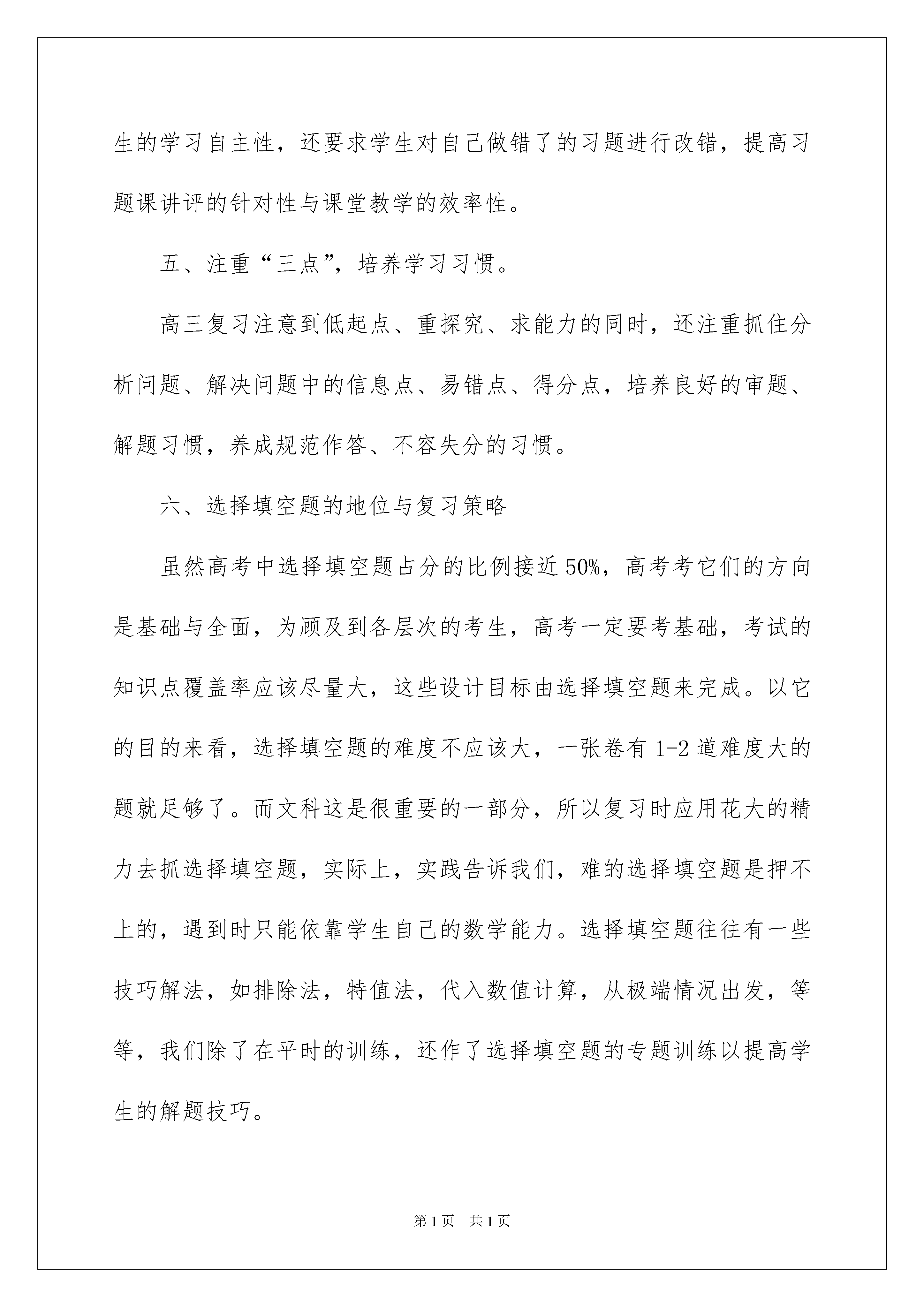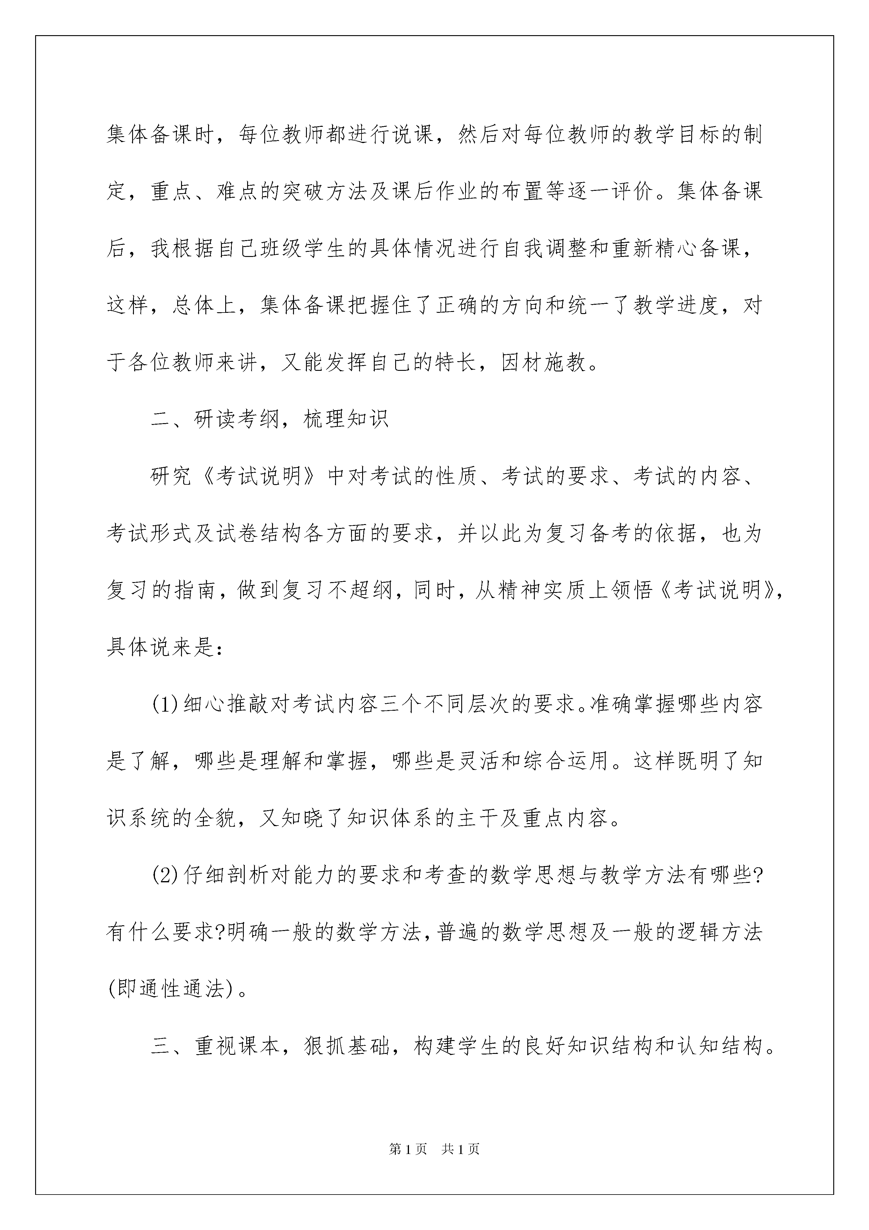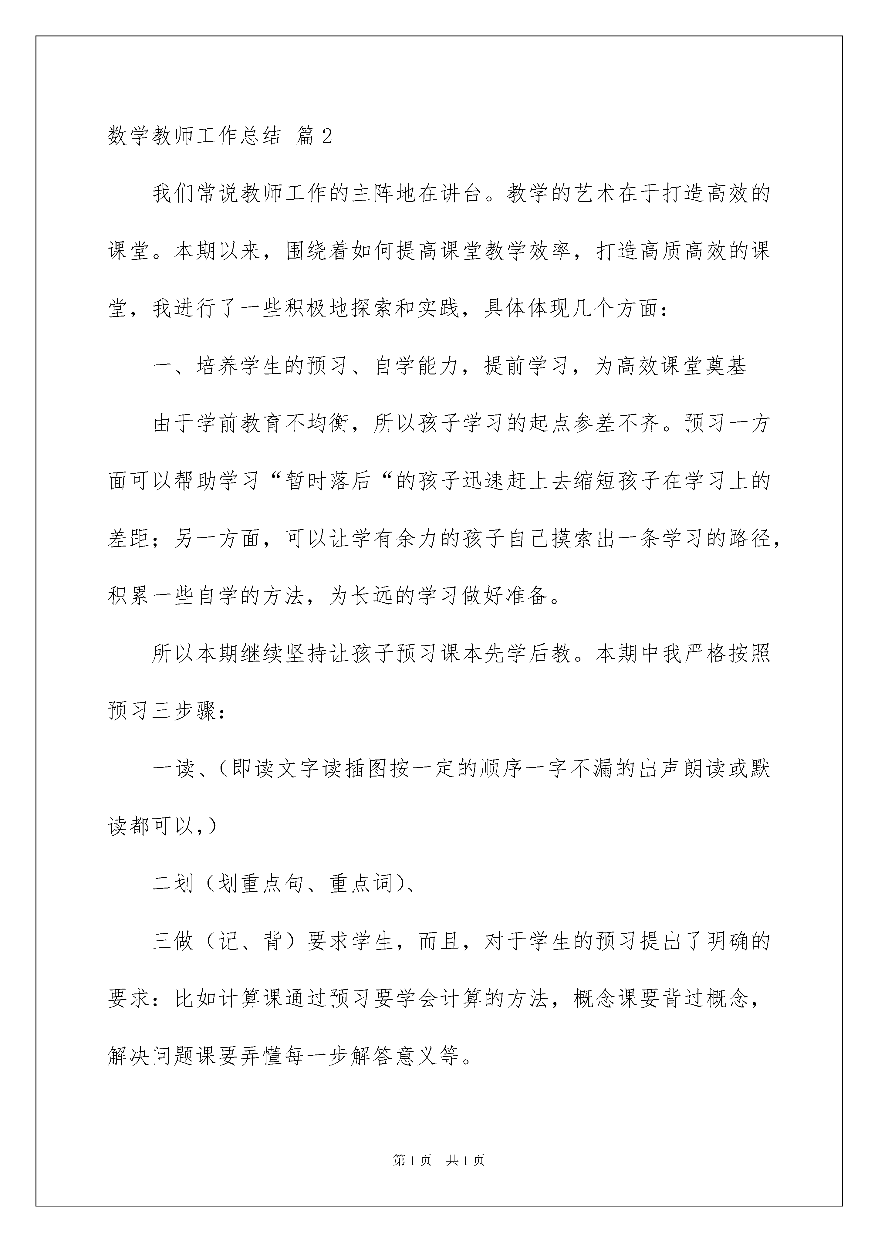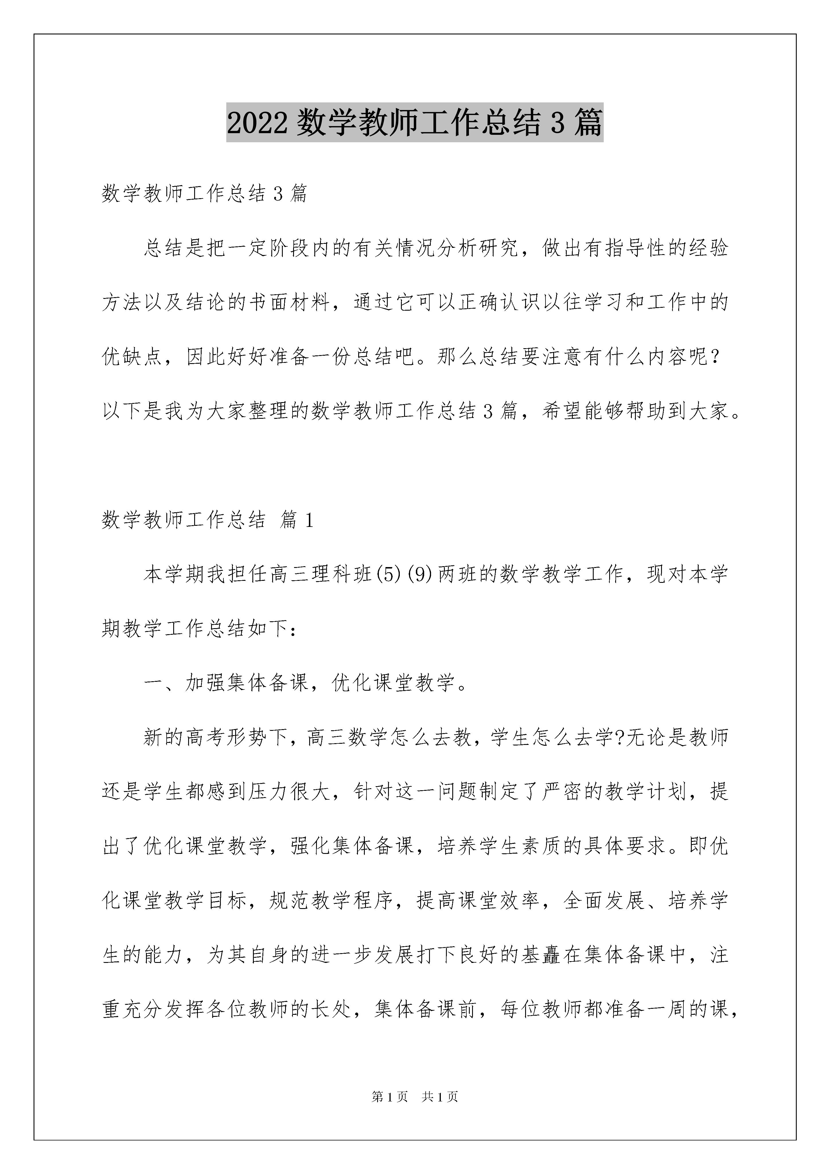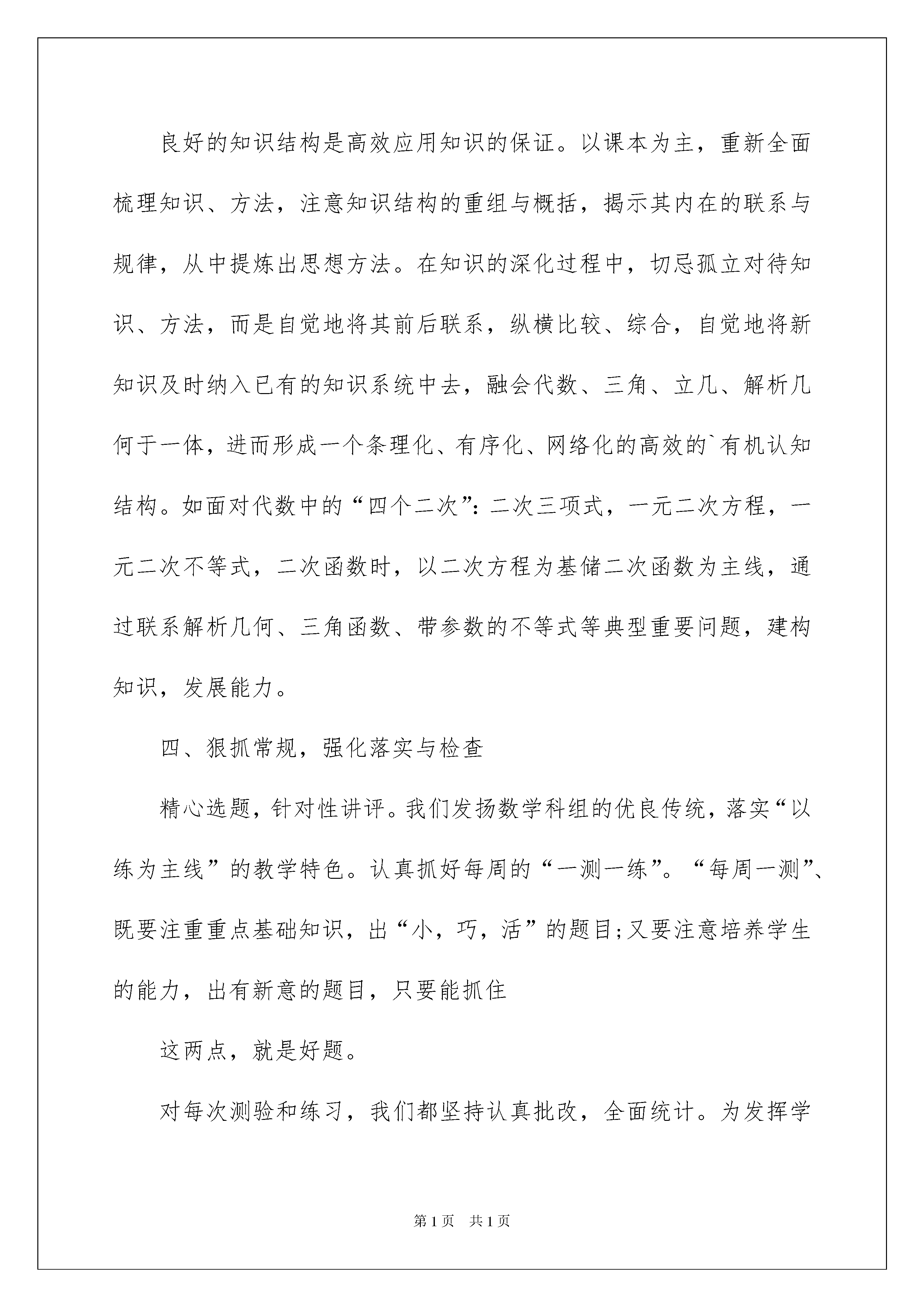 2022数学教师工作总结3篇数学教师工作总结3篇总结是把一定阶段内的有关情况分析研究,做出有指导性的经验方法以及结论的书面材料,通过它可以正确认识以往学习和工作中的优缺点,因此好好准备一份总结吧。那么总结要注意有什么内容呢?以下是我为大家整理的数学教师工作总结3篇,希望能够帮助到大家。数学教师工作总结篇1本学期我担任高三理科班(5)(9)两班的数学教学工作,现对本学期教学工作总结如下:一、加强集体备课,优化课堂教学。新的高考形势下,高三数学怎么去教,学生怎么去学?无论是教师还是学生都感到压力很大,针对这一问题制定了严密的教学计划,提出了优化课堂教学,强化集体备课,培养学生素质的具体要求。即优化课堂教学目标,规范教学程序,提高课堂效率,全面发展、培养学生的能力,为其自身的进一步发展打下良好的基矗在集体备课中,注重充分发挥各位教师的长处,集体备课前,每位教师都准备一周的课,集体备课时,每位教师都进行说课,然后对每位教师的教学目标的制定,重点、难点的突破方法及课后作业的布置等逐一评价。集体备课后,我根据自己班级学生的具体情况进行自我调整和重新精心备课,这样,总体上,集体备课把握住了正确的方向和统一了教学进度,对于各位教师来讲,又能发挥自己的特长,因材施教。二、研读考纲,梳理知识研究《考试说明》中对考试的性质、考试的要求、考试的内容、考试形式及试卷结构各方面的要求,并以此为复习备考的依据,也为复习的指南,做到复习不超纲,同时,从精神实质上领悟《考试说明》,具体说来是:(1)细心推敲对考试内容三个不同层次的要求。准确掌握哪些内容是了解,哪些是理解和掌握,哪些是灵活和综合运用。这样既明了知识系统的全貌,又知晓了知识体系的主干及重点内容。(2)仔细剖析对能力的要求和考查的数学思想与教学方法有哪些?有什么要求?明确一般的数学方法,普遍的数学思想及一般的逻辑方法(即通性通法)。三、重视课本,狠抓基础,构建学生的良好知识结构和认知结构。良好的知识结构是高效应用知识的保证。以课本为主,重新全面梳理知识、方法,注意知识结构的重组与概括,揭示其内在的联系与规律,从中提炼出思想方法。在知识的深化过程中,切忌孤立对待知识、方法,而是自觉地将其前后联系,纵横比较、综合,自觉地将新知识及时纳入已有的知识系统中去,融会代数、三角、立几、解析几何于一体,进而形成一个条理化、有序化、网络化的高效的`有机认知结构。如面对代数中的“四个二次”:二次三项式,一元二次方程,一元二次不等式,二次函数时,以二次方程为基储二次函数为主线,通过联系解析几何、三角函数、带参数的不等式等典型重要问题,建构知识,发展能力。四、狠抓常规,强化落实与检查精心选题,针对性讲评。我们发扬数学科组的优良传统,落实“以练为主线”的教学特色。认真抓好每周的“一测一练”。“每周一测”、既要注重重点基础知识,出“小,巧,活”的题目;又要注意培养学生的能力,出有新意的题目,只要能抓住这两点,就是好题。对每次测验和练习,我们都坚持认真批改,全面统计。为发挥学生的学习自主性,还要求学生对自己做错了的习题进行改错,提高习题课讲评的针对性与课堂教学的效率性。五、注重“三点”,培养学习习惯。高三复习注意到低起点、重探究、求能力的同时,还注重抓住分析问题、解决问题中的信息点、易错点、得分点,培养良好的审题、解题习惯,养成规范作答、不容失分的习惯。六、选择填空题的地位与复习策略虽然高考中选择填空题占分的比例接近50%,高考考它们的方向是基础与全面,为顾及到各层次的考生,高考一定要考基础,考试的知识点覆盖率应该尽量大,这些设计目标由选择填空题来完成。以它的目的来看,选择填空题的难度不应该大,一张卷有1-2道难度大的题就足够了。而文科这是很重要的一部分,所以复习时应用花大的精力去抓选择填空题,实际上,实践告诉我们,难的选择填空题是押不上的,遇到时只能依靠学生自己的数学能力。选择填空题往往有一些技巧解法,如排除法,特值法,代入数值计算,从极端情况出发,等等,我们除了在平时的训练,还作了选择填空题的专题训练以提高学生的解题技巧。数学教师工作总结篇2我们常说教师工作的主阵地在讲台。教学的艺术在于打造高效的课堂。本期以来,围绕着如何提高课堂教学效率,打造高质高效的课堂,我进行了一些积极地探索和实践,具体体现几个方面:一、培养学生的预习、自学能力,提前学习,为高效课堂奠基由于学前教育不均衡,所以孩子学习的起点参差不齐。预习一方面可以帮助学习“暂时落后“的孩子迅速赶上去缩短孩子在学习上的差距;另一方面,可以让学有余力的孩子自己摸索出一条学习的路径,积累一些自学的方法,为长远的学习做