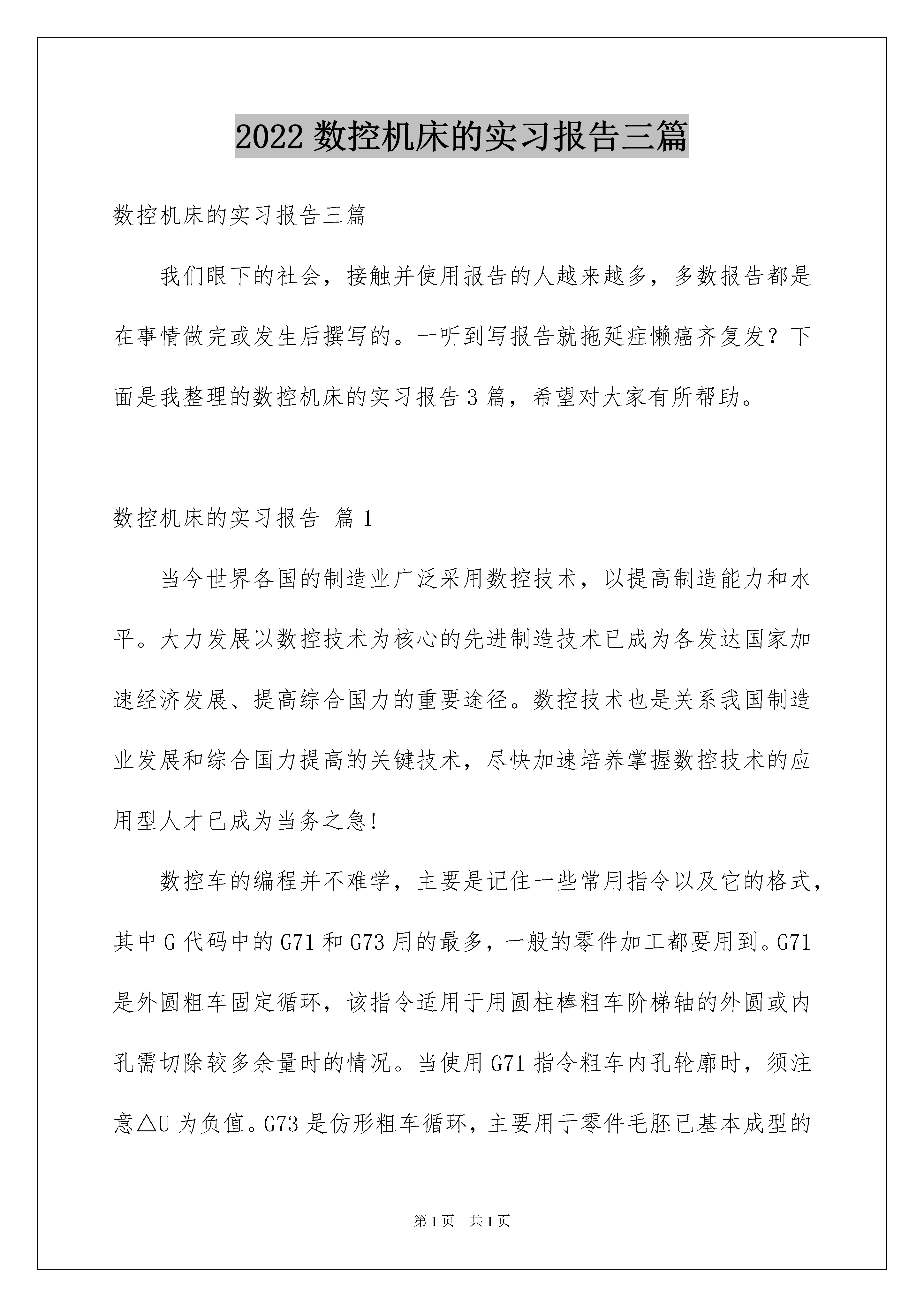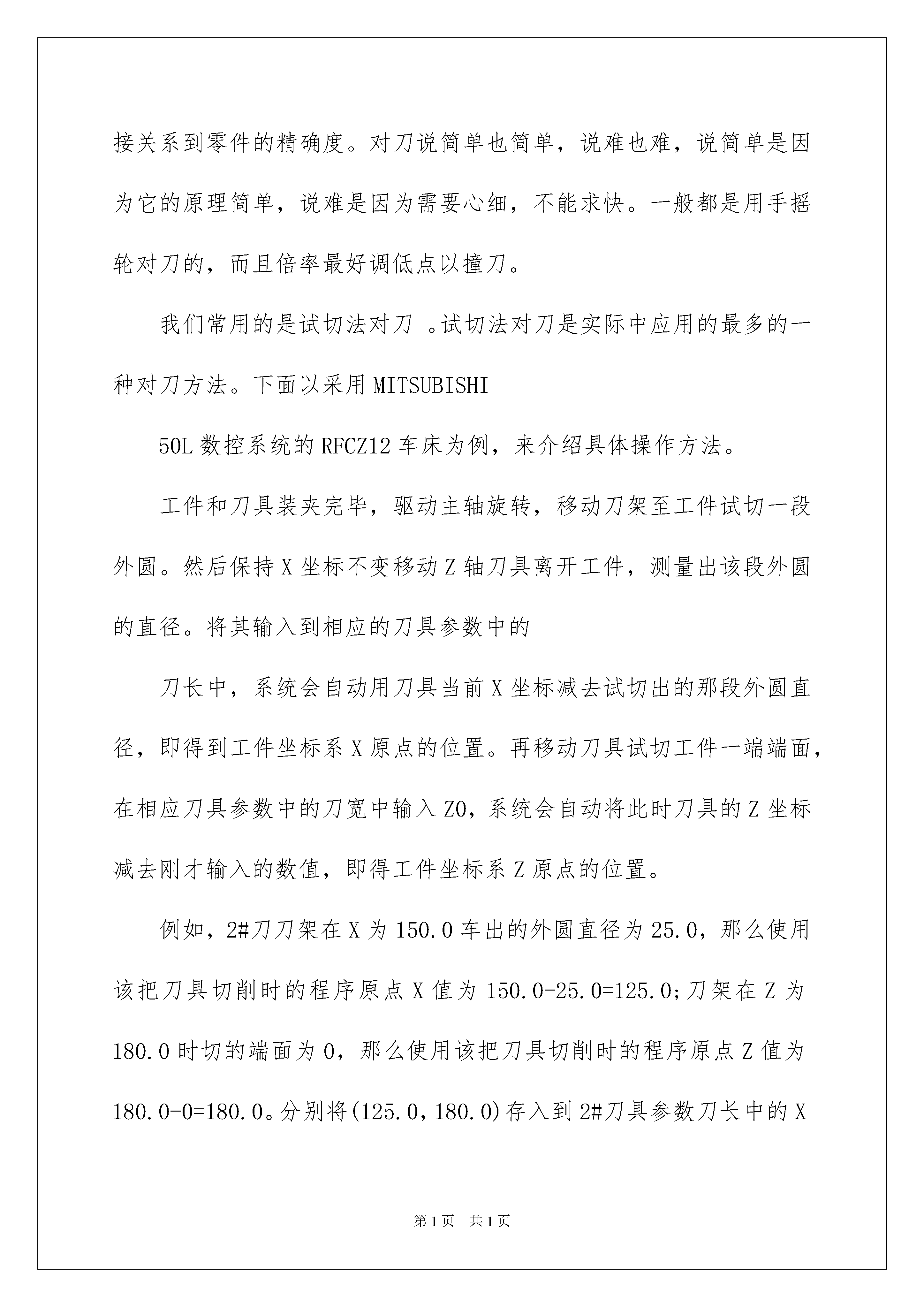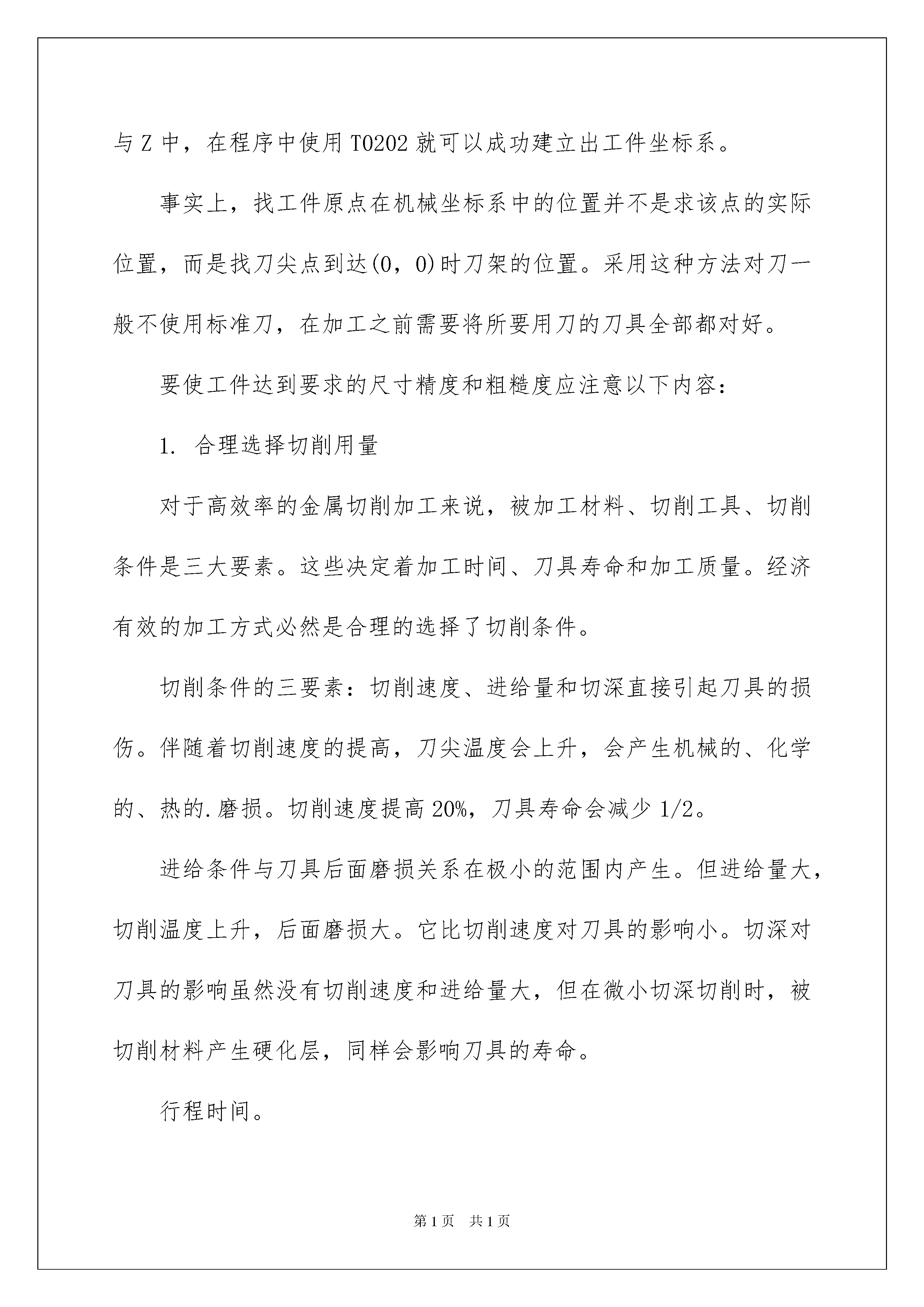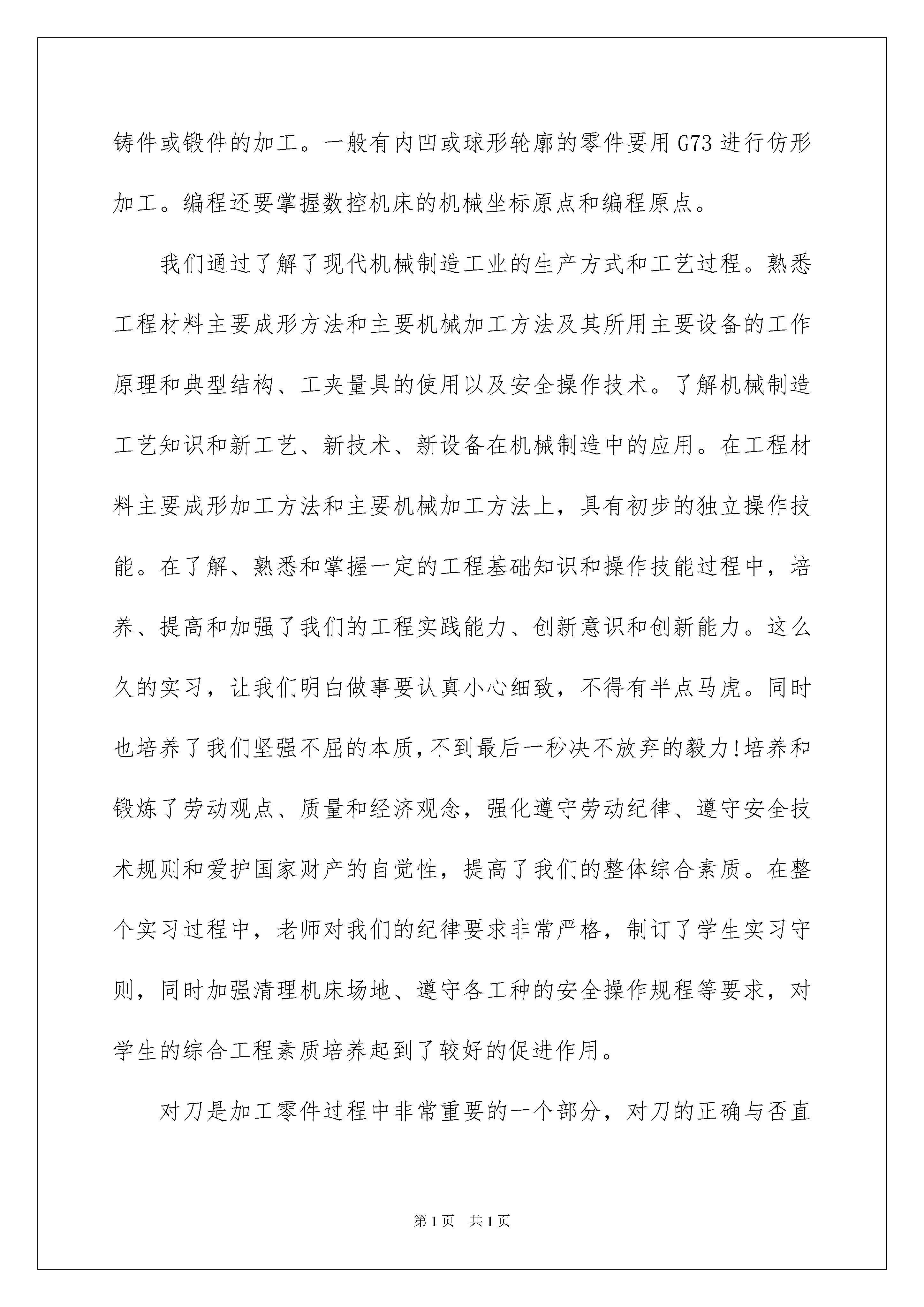 2022数控机床的实习报告三篇数控机床的实习报告三篇我们眼下的社会,接触并使用报告的人越来越多,多数报告都是在事情做完或发生后撰写的。一听到写报告就拖延症懒癌齐复发?下面是我整理的数控机床的实习报告3篇,希望对大家有所帮助。数控机床的实习报告篇1当今世界各国的制造业广泛采用数控技术,以提高制造能力和水平。大力发展以数控技术为核心的先进制造技术已成为各发达国家加速经济发展、提高综合国力的重要途径。数控技术也是关系我国制造业发展和综合国力提高的关键技术,尽快加速培养掌握数控技术的应用型人才已成为当务之急!数控车的编程并不难学,主要是记住一些常用指令以及它的格式,其中G代码中的G71和G73用的最多,一般的零件加工都要用到。G71是外圆粗车固定循环,该指令适用于用圆柱棒粗车阶梯轴的外圆或内孔需切除较多余量时的情况。当使用G71指令粗车内孔轮廓时,须注意△U为负值。G73是仿形粗车循环,主要用于零件毛胚已基本成型的铸件或锻件的加工。一般有内凹或球形轮廓的零件要用G73进行仿形加工。编程还要掌握数控机床的机械坐标原点和编程原点。我们通过了解了现代机械制造工业的生产方式和工艺过程。熟悉工程材料主要成形方法和主要机械加工方法及其所用主要设备的工作原理和典型结构、工夹量具的使用以及安全操作技术。了解机械制造工艺知识和新工艺、新技术、新设备在机械制造中的应用。在工程材料主要成形加工方法和主要机械加工方法上,具有初步的独立操作技能。在了解、熟悉和掌握一定的工程基础知识和操作技能过程中,培养、提高和加强了我们的工程实践能力、创新意识和创新能力。这么久的实习,让我们明白做事要认真小心细致,不得有半点马虎。同时也培养了我们坚强不屈的本质,不到最后一秒决不放弃的毅力!培养和锻炼了劳动观点、质量和经济观念,强化遵守劳动纪律、遵守安全技术规则和爱护国家财产的自觉性,提高了我们的整体综合素质。在整个实习过程中,老师对我们的纪律要求非常严格,制订了学生实习守则,同时加强清理机床场地、遵守各工种的安全操作规程等要求,对学生的综合工程素质培养起到了较好的促进作用。对刀是加工零件过程中非常重要的一个部分,对刀的正确与否直接关系到零件的精确度。对刀说简单也简单,说难也难,说简单是因为它的原理简单,说难是因为需要心细,不能求快。一般都是用手摇轮对刀的,而且倍率最好调低点以撞刀。我们常用的是试切法对刀。试切法对刀是实际中应用的最多的一种对刀方法。下面以采用MITSUBISHI50L数控系统的RFCZ12车床为例,来介绍具体操作方法。工件和刀具装夹完毕,驱动主轴旋转,移动刀架至工件试切一段外圆。然后保持X坐标不变移动Z轴刀具离开工件,测量出该段外圆的直径。将其输入到相应的刀具参数中的刀长中,系统会自动用刀具当前X坐标减去试切出的那段外圆直径,即得到工件坐标系X原点的位置。再移动刀具试切工件一端端面,在相应刀具参数中的刀宽中输入Z0,系统会自动将此时刀具的Z坐标减去刚才输入的数值,即得工件坐标系Z原点的位置。例如,2#刀刀架在X为150.0车出的外圆直径为25.0,那么使用该把刀具切削时的程序原点X值为150.0-25.0=125.0;刀架在Z为180.0时切的端面为0,那么使用该把刀具切削时的程序原点Z值为180.0-0=180.0。分别将(125.0,180.0)存入到2#刀具参数刀长中的X与Z中,在程序中使用T0202就可以成功建立出工件坐标系。事实上,找工件原点在机械坐标系中的位置并不是求该点的实际位置,而是找刀尖点到达(0,0)时刀架的位置。采用这种方法对刀一般不使用标准刀,在加工之前需要将所要用刀的刀具全部都对好。要使工件达到要求的尺寸精度和粗糙度应注意以下内容:1.合理选择切削用量对于高效率的金属切削加工来说,被加工材料、切削工具、切削条件是三大要素。这些决定着加工时间、刀具寿命和加工质量。经济有效的加工方式必然是合理的选择了切削条件。切削条件的三要素:切削速度、进给量和切深直接引起刀具的损伤。伴随着切削速度的提高,刀尖温度会上升,会产生机械的、化学的、热的.磨损。切削速度提高20%,刀具寿命会减少1/2。进给条件与刀具后面磨损关系在极小的范围内产生。但进给量大,切削温度上升,后面磨损大。它比切削速度对刀具的影响小。切深对刀具的影响虽然没有切削速度和进给量大,但在微小切深切削时,被切削材料产生硬化层,同样会影响刀具的寿命。行程时间。2.合理选择刀具1)粗车时,要选强度高、耐用度好的刀具,以便满足粗车时大背吃刀量、大进给量的要求。2)精车时,要选精度高、耐用度好的刀具,以保证加工精度的要求。3)为减少换刀时间和