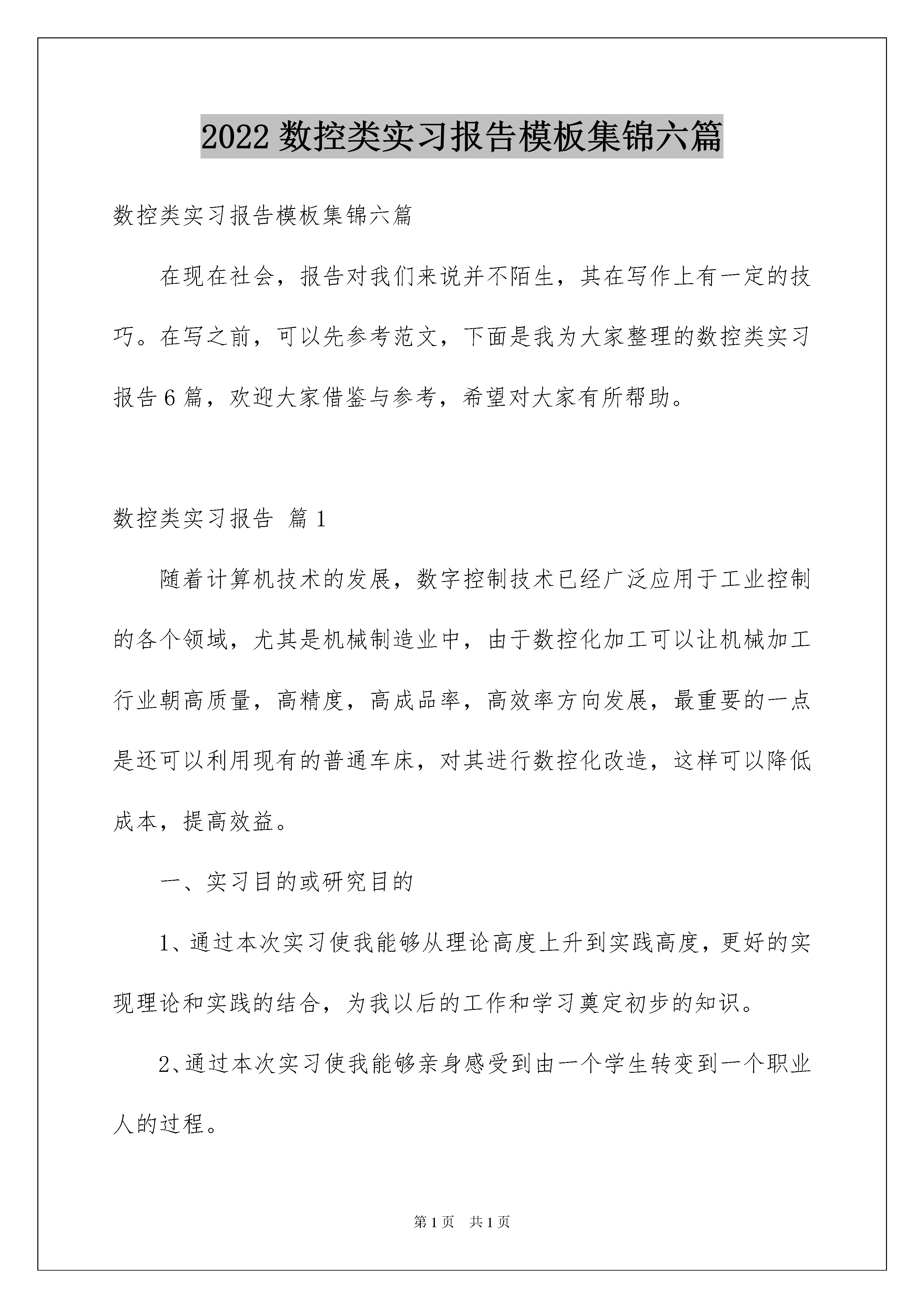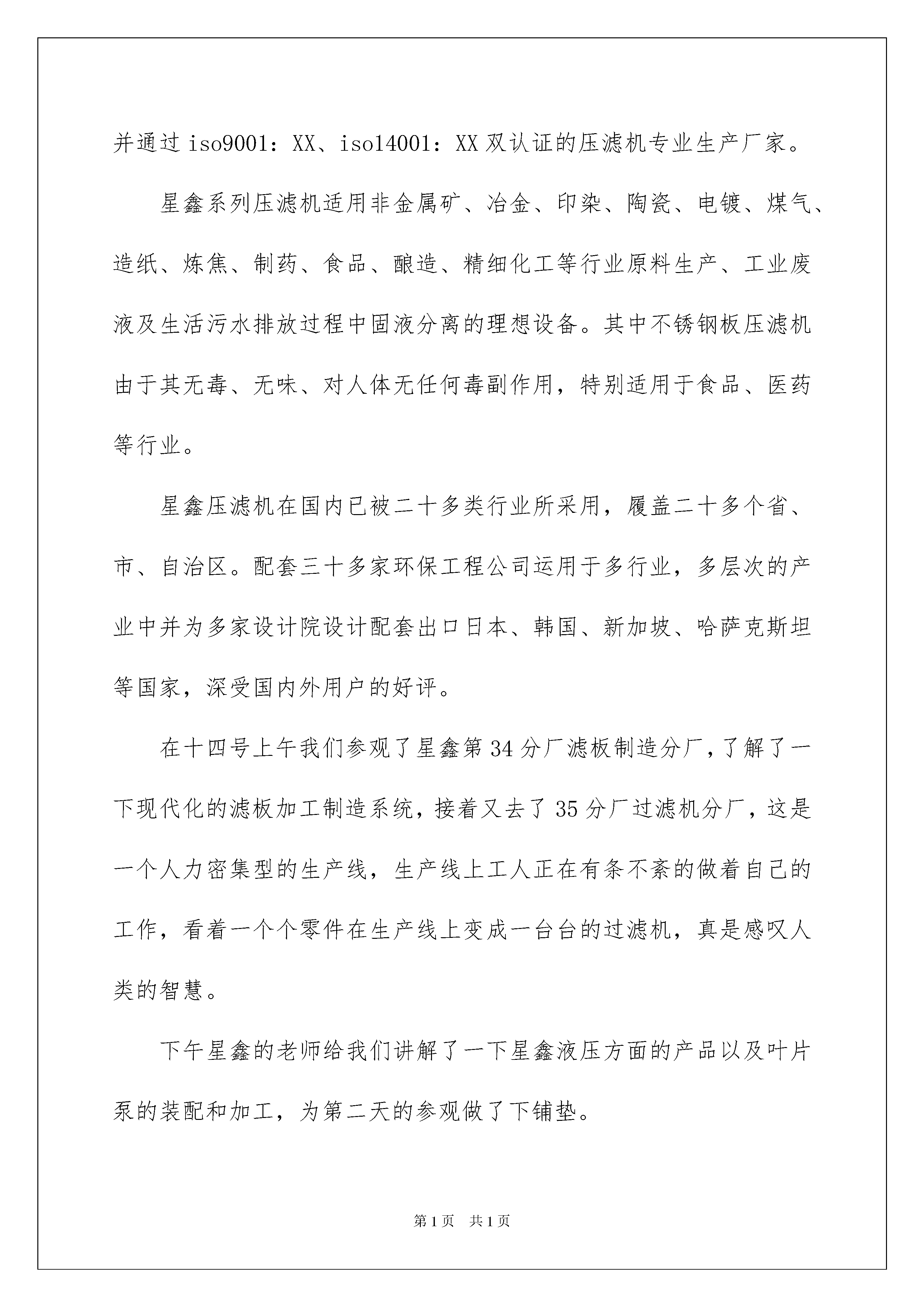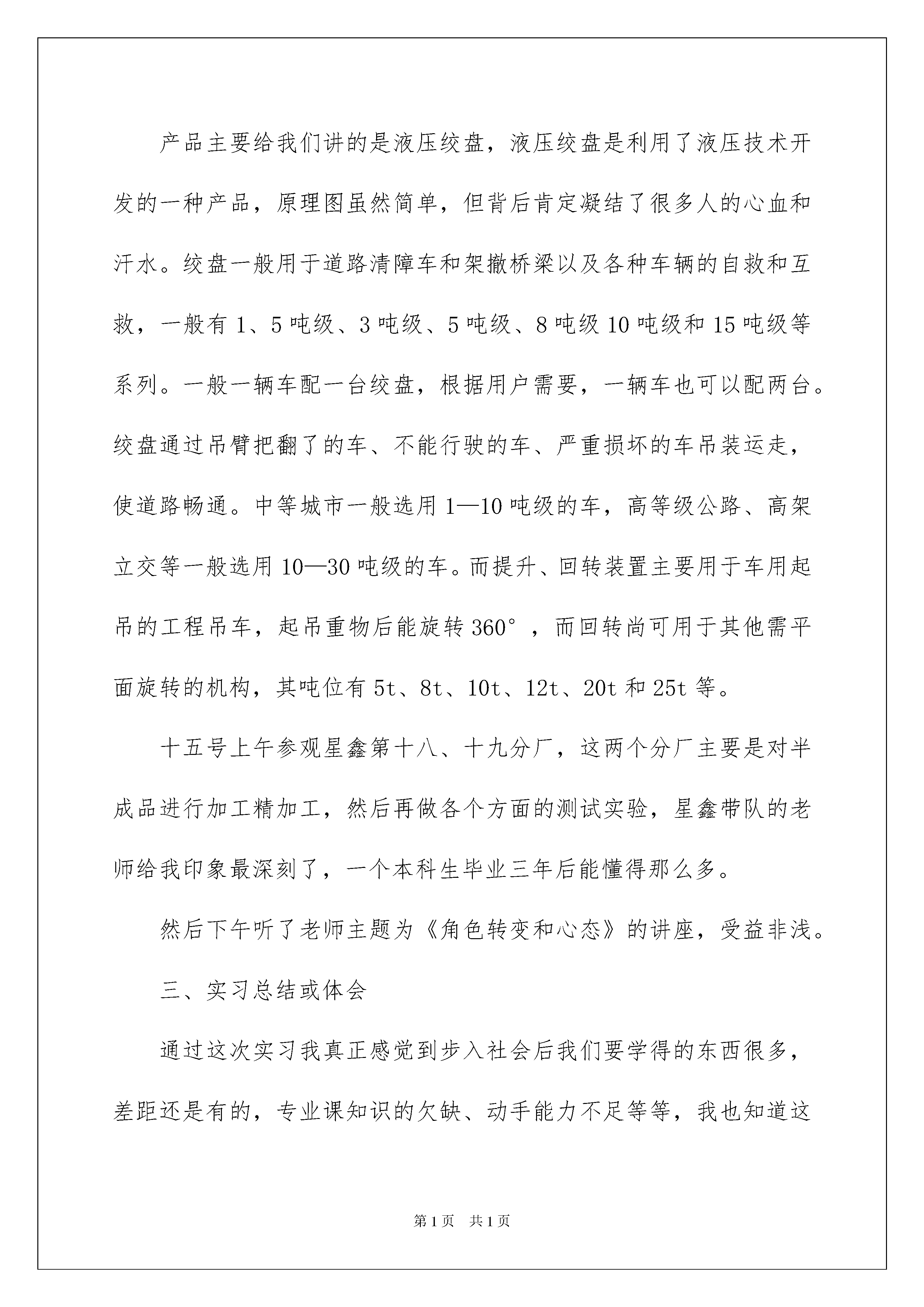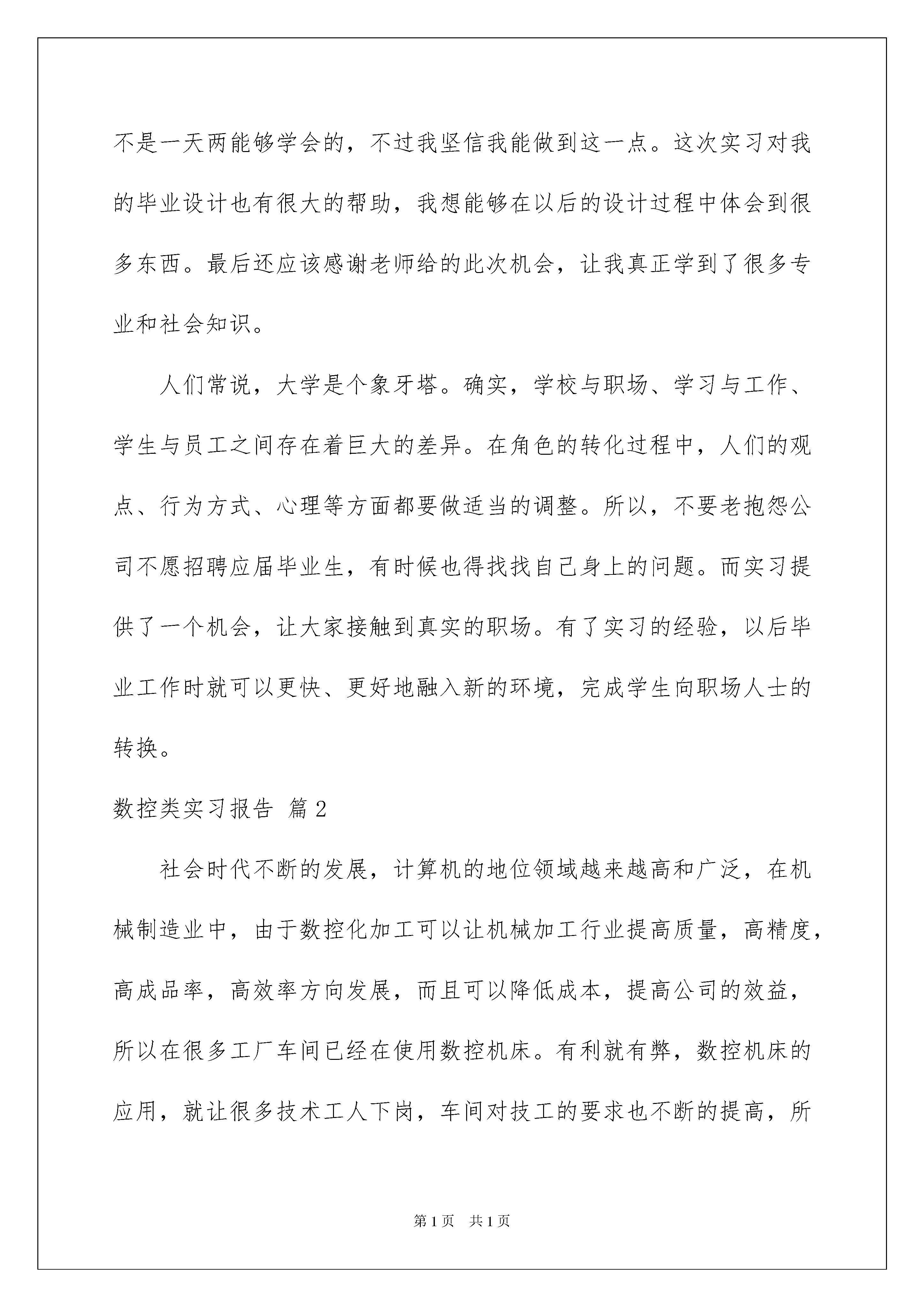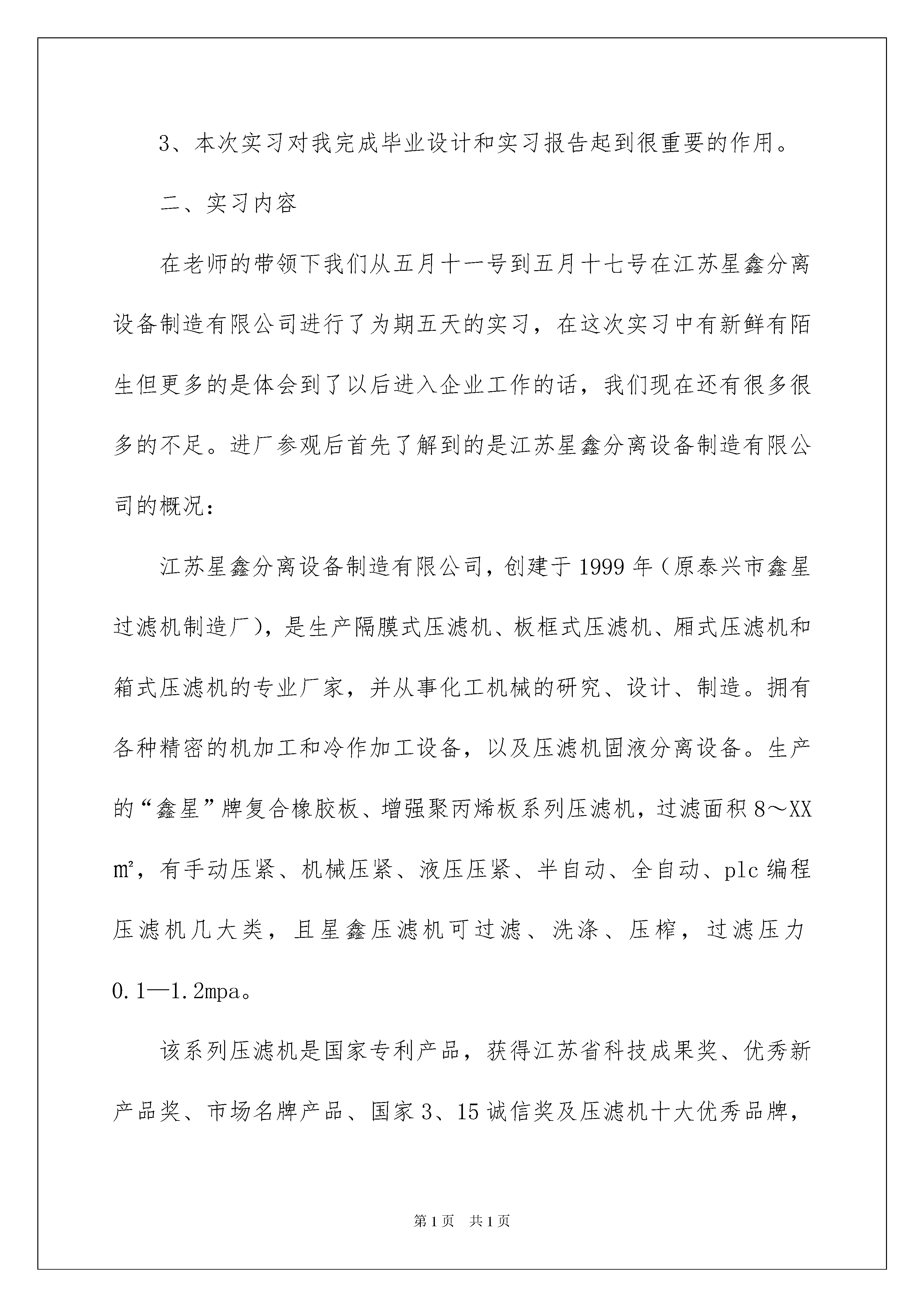 2022数控类实习报告模板集锦六篇数控类实习报告模板集锦六篇在现在社会,报告对我们来说并不陌生,其在写作上有一定的技巧。在写之前,可以先参考范文,下面是我为大家整理的数控类实习报告6篇,欢迎大家借鉴与参考,希望对大家有所帮助。数控类实习报告篇1随着计算机技术的发展,数字控制技术已经广泛应用于工业控制的各个领域,尤其是机械制造业中,由于数控化加工可以让机械加工行业朝高质量,高精度,高成品率,高效率方向发展,最重要的一点是还可以利用现有的普通车床,对其进行数控化改造,这样可以降低成本,提高效益。一、实习目的或研究目的1、通过本次实习使我能够从理论高度上升到实践高度,更好的实现理论和实践的结合,为我以后的工作和学习奠定初步的知识。2、通过本次实习使我能够亲身感受到由一个学生转变到一个职业人的过程。3、本次实习对我完成毕业设计和实习报告起到很重要的作用。二、实习内容在老师的带领下我们从五月十一号到五月十七号在江苏星鑫分离设备制造有限公司进行了为期五天的实习,在这次实习中有新鲜有陌生但更多的是体会到了以后进入企业工作的话,我们现在还有很多很多的不足。进厂参观后首先了解到的是江苏星鑫分离设备制造有限公司的概况:江苏星鑫分离设备制造有限公司,创建于1999年(原泰兴市鑫星过滤机制造厂),是生产隔膜式压滤机、板框式压滤机、厢式压滤机和箱式压滤机的专业厂家,并从事化工机械的研究、设计、制造。拥有各种精密的机加工和冷作加工设备,以及压滤机固液分离设备。生产的“鑫星”牌复合橡胶板、增强聚丙烯板系列压滤机,过滤面积8~XX㎡,有手动压紧、机械压紧、液压压紧、半自动、全自动、plc编程压滤机几大类,且星鑫压滤机可过滤、洗涤、压榨,过滤压力0.1—1.2mpa。该系列压滤机是国家专利产品,获得江苏省科技成果奖、优秀新产品奖、市场名牌产品、国家3、15诚信奖及压滤机十大优秀品牌,并通过iso9001:XX、iso14001:XX双认证的压滤机专业生产厂家。星鑫系列压滤机适用非金属矿、冶金、印染、陶瓷、电镀、煤气、造纸、炼焦、制药、食品、酿造、精细化工等行业原料生产、工业废液及生活污水排放过程中固液分离的理想设备。其中不锈钢板压滤机由于其无毒、无味、对人体无任何毒副作用,特别适用于食品、医药等行业。星鑫压滤机在国内已被二十多类行业所采用,履盖二十多个省、市、自治区。配套三十多家环保工程公司运用于多行业,多层次的产业中并为多家设计院设计配套出口日本、韩国、新加坡、哈萨克斯坦等国家,深受国内外用户的好评。在十四号上午我们参观了星鑫第34分厂滤板制造分厂,了解了一下现代化的滤板加工制造系统,接着又去了35分厂过滤机分厂,这是一个人力密集型的生产线,生产线上工人正在有条不紊的做着自己的工作,看着一个个零件在生产线上变成一台台的过滤机,真是感叹人类的智慧。下午星鑫的老师给我们讲解了一下星鑫液压方面的产品以及叶片泵的装配和加工,为第二天的参观做了下铺垫。产品主要给我们讲的是液压绞盘,液压绞盘是利用了液压技术开发的一种产品,原理图虽然简单,但背后肯定凝结了很多人的心血和汗水。绞盘一般用于道路清障车和架撤桥梁以及各种车辆的自救和互救,一般有1、5吨级、3吨级、5吨级、8吨级10吨级和15吨级等系列。一般一辆车配一台绞盘,根据用户需要,一辆车也可以配两台。绞盘通过吊臂把翻了的车、不能行驶的车、严重损坏的车吊装运走,使道路畅通。中等城市一般选用1—10吨级的车,高等级公路、高架立交等一般选用10—30吨级的车。而提升、回转装置主要用于车用起吊的工程吊车,起吊重物后能旋转360°,而回转尚可用于其他需平面旋转的机构,其吨位有5t、8t、10t、12t、20t和25t等。十五号上午参观星鑫第十八、十九分厂,这两个分厂主要是对半成品进行加工精加工,然后再做各个方面的测试实验,星鑫带队的老师给我印象最深刻了,一个本科生毕业三年后能懂得那么多。然后下午听了老师主题为《角色转变和心态》的讲座,受益非浅。三、实习总结或体会通过这次实习我真正感觉到步入社会后我们要学得的东西很多,差距还是有的,专业课知识的欠缺、动手能力不足等等,我也知道这不是一天两能够学会的,不过我坚信我能做到这一点。这次实习对我的毕业设计也有很大的帮助,我想能够在以后的设计过程中体会到很多东西。最后还应该感谢老师给的此次机会,让我真正学到了很多专业和社会知识。人们常说,大学是个象牙塔。确实,学校与职场、学习与工作、学生与员工之间存在着巨大的差异。在角色的转化过程中,人们的观点、行为方式、心理等方面都要做适当的调整。所以,不要老抱怨公司不愿招聘应届毕业生,有时候也得找找自