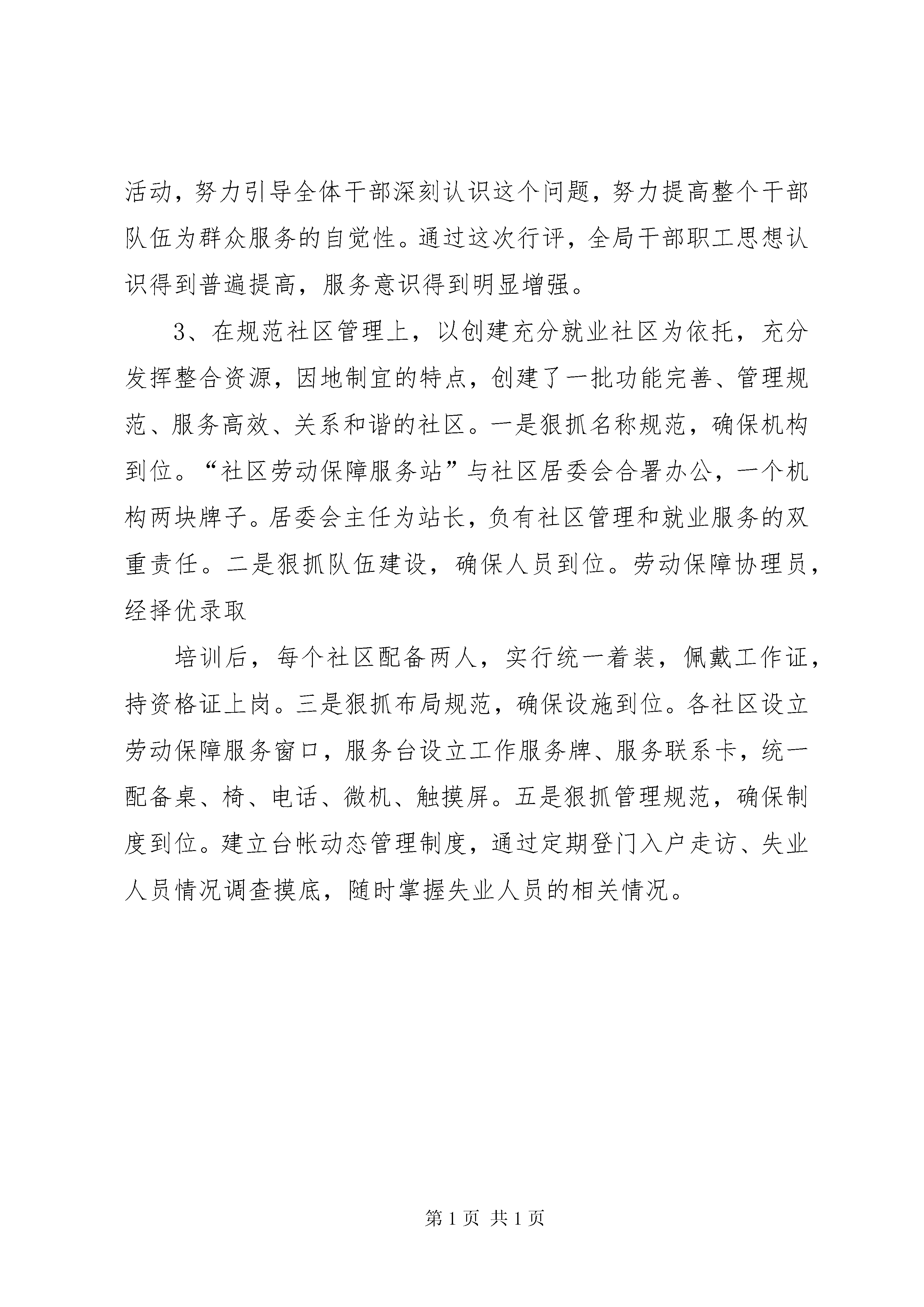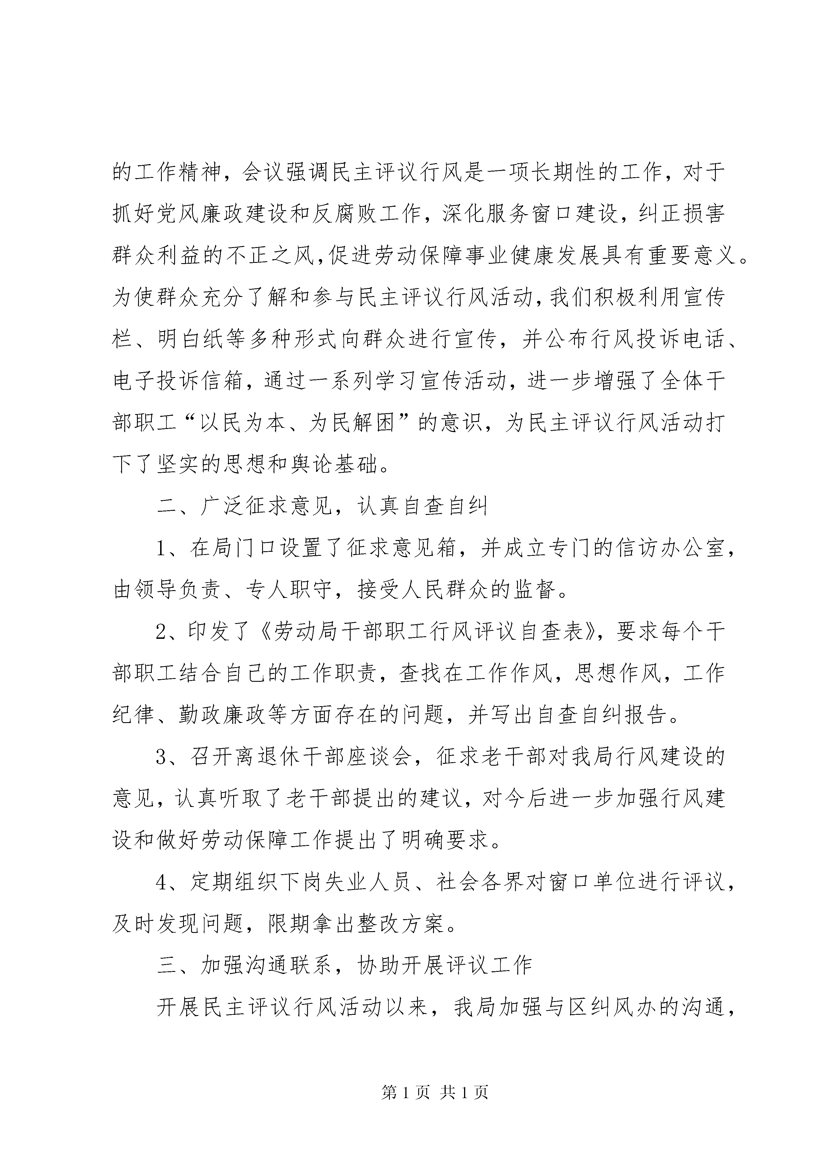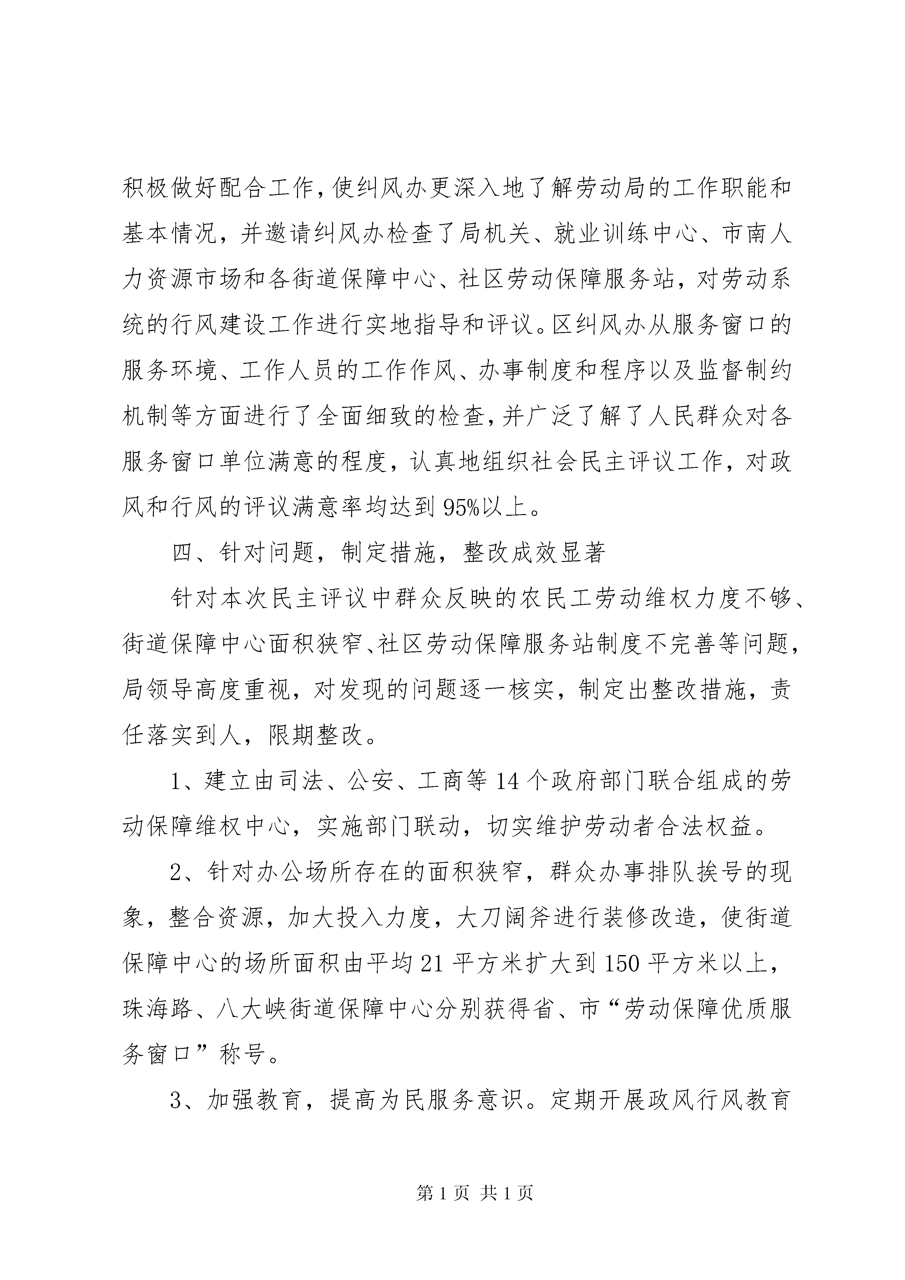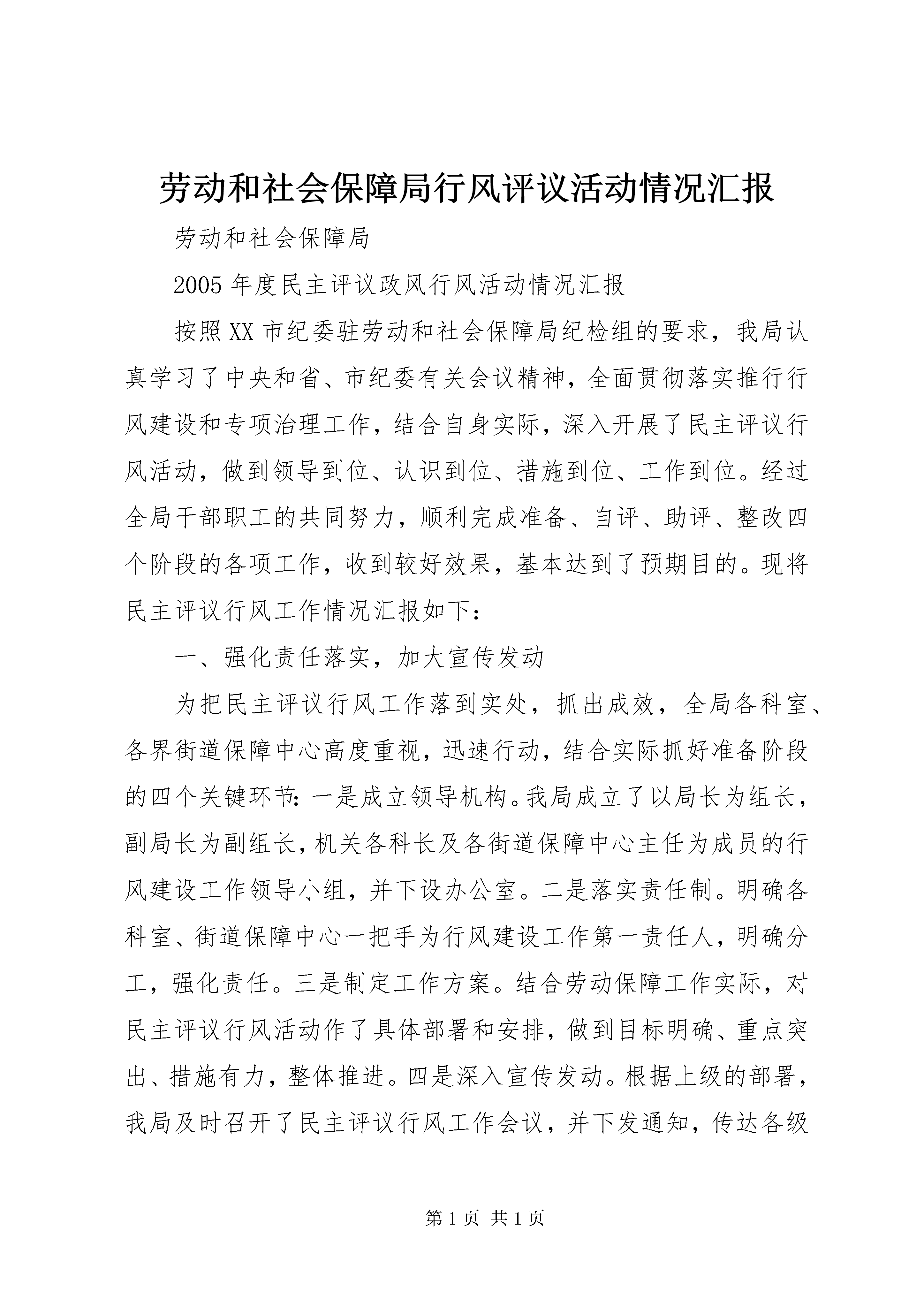 劳动和社会保障局行风评议活动情况汇报劳动和社会保障局2005年度民主评议政风行风活动情况汇报按照XX市纪委驻劳动和社会保障局纪检组的要求,我局认真学习了中央和省、市纪委有关会议精神,全面贯彻落实推行行风建设和专项治理工作,结合自身实际,深入开展了民主评议行风活动,做到领导到位、认识到位、措施到位、工作到位。经过全局干部职工的共同努力,顺利完成准备、自评、助评、整改四个阶段的各项工作,收到较好效果,基本达到了预期目的。现将民主评议行风工作情况汇报如下:一、强化责任落实,加大宣传发动为把民主评议行风工作落到实处,抓出成效,全局各科室、各界街道保障中心高度重视,迅速行动,结合实际抓好准备阶段的四个关键环节:一是成立领导机构。我局成立了以局长为组长,副局长为副组长,机关各科长及各街道保障中心主任为成员的行风建设工作领导小组,并下设办公室。二是落实责任制。明确各科室、街道保障中心一把手为行风建设工作第一责任人,明确分工,强化责任。三是制定工作方案。结合劳动保障工作实际,对民主评议行风活动作了具体部署和安排,做到目标明确、重点突出、措施有力,整体推进。四是深入宣传发动。根据上级的部署,我局及时召开了民主评议行风工作会议,并下发通知,传达各级的工作精神,会议强调民主评议行风是一项长期性的工作,对于抓好党风廉政建设和反腐败工作,深化服务窗口建设,纠正损害群众利益的不正之风,促进劳动保障事业健康发展具有重要意义。为使群众充分了解和参与民主评议行风活动,我们积极利用宣传栏、明白纸等多种形式向群众进行宣传,并公布行风投诉电话、电子投诉信箱,通过一系列学习宣传活动,进一步增强了全体干部职工“以民为本、为民解困”的意识,为民主评议行风活动打下了坚实的思想和舆论基础。二、广泛征求意见,认真自查自纠1、在局门口设置了征求意见箱,并成立专门的信访办公室,由领导负责、专人职守,接受人民群众的监督。2、印发了《劳动局干部职工行风评议自查表》,要求每个干部职工结合自己的工作职责,查找在工作作风,思想作风,工作纪律、勤政廉政等方面存在的问题,并写出自查自纠报告。3、召开离退休干部座谈会,征求老干部对我局行风建设的意见,认真听取了老干部提出的建议,对今后进一步加强行风建设和做好劳动保障工作提出了明确要求。4、定期组织下岗失业人员、社会各界对窗口单位进行评议,及时发现问题,限期拿出整改方案。三、加强沟通联系,协助开展评议工作开展民主评议行风活动以来,我局加强与区纠风办的沟通,积极做好配合工作,使纠风办更深入地了解劳动局的工作职能和基本情况,并邀请纠风办检查了局机关、就业训练中心、市南人力资源市场和各街道保障中心、社区劳动保障服务站,对劳动系统的行风建设工作进行实地指导和评议。区纠风办从服务窗口的服务环境、工作人员的工作作风、办事制度和程序以及监督制约机制等方面进行了全面细致的检查,并广泛了解了人民群众对各服务窗口单位满意的程度,认真地组织社会民主评议工作,对政风和行风的评议满意率均达到95%以上。四、针对问题,制定措施,整改成效显著针对本次民主评议中群众反映的农民工劳动维权力度不够、街道保障中心面积狭窄、社区劳动保障服务站制度不完善等问题,局领导高度重视,对发现的问题逐一核实,制定出整改措施,责任落实到人,限期整改。1、建立由司法、公安、工商等14个政府部门联合组成的劳动保障维权中心,实施部门联动,切实维护劳动者合法权益。2、针对办公场所存在的面积狭窄,群众办事排队挨号的现象,整合资源,加大投入力度,大刀阔斧进行装修改造,使街道保障中心的场所面积由平均21平方米扩大到150平方米以上,珠海路、八大峡街道保障中心分别获得省、市“劳动保障优质服务窗口”称号。3、加强教育,提高为民服务意识。定期开展政风行风教育活动,努力引导全体干部深刻认识这个问题,努力提高整个干部队伍为群众服务的自觉性。通过这次行评,全局干部职工思想认识得到普遍提高,服务意识得到明显增强。3、在规范社区管理上,以创建充分就业社区为依托,充分发挥整合资源,因地制宜的特点,创建了一批功能完善、管理规范、服务高效、关系和谐的社区。一是狠抓名称规范,确保机构到位。“社区劳动保障服务站”与社区居委会合署办公,一个机构两块牌子。居委会主任为站长,负有社区管理和就业服务的双重责任。二是狠抓队伍建设,确保人员到位。劳动保障协理员,经择优录取培训后,每个社区配备两人,实行统一着装,佩戴工作证,持资格证上岗。三是狠抓布局规范,确保设施到位。各社区设立劳动保障服务窗口,服务台设立工作服务牌、服务联系卡,统一配备桌、椅、电话、微机、触摸屏。五是狠抓管理规范,确保制度到位。建立台帐动态管理制度,通过定期登门入户走访、失业人员情况调查摸底,随时掌握失业人员的相关情况。