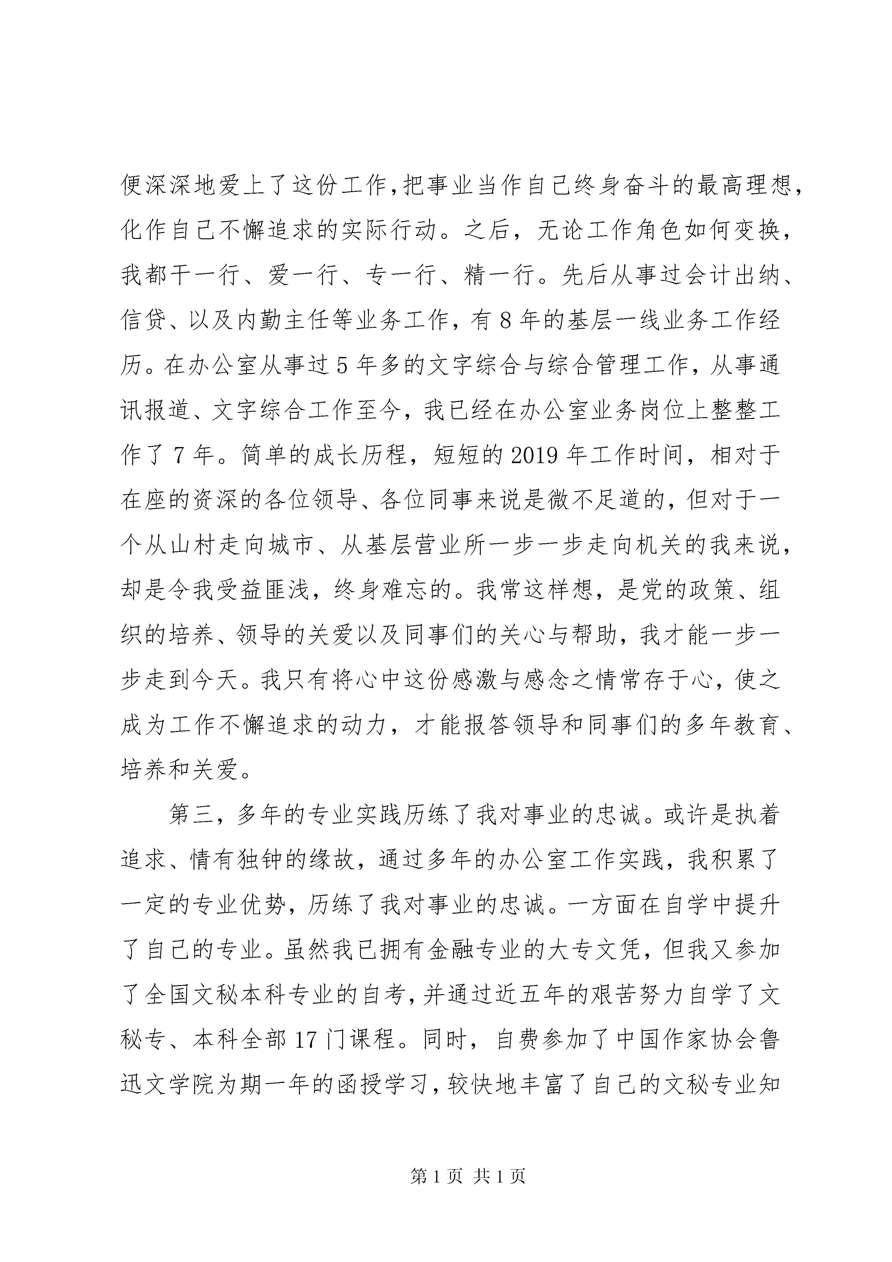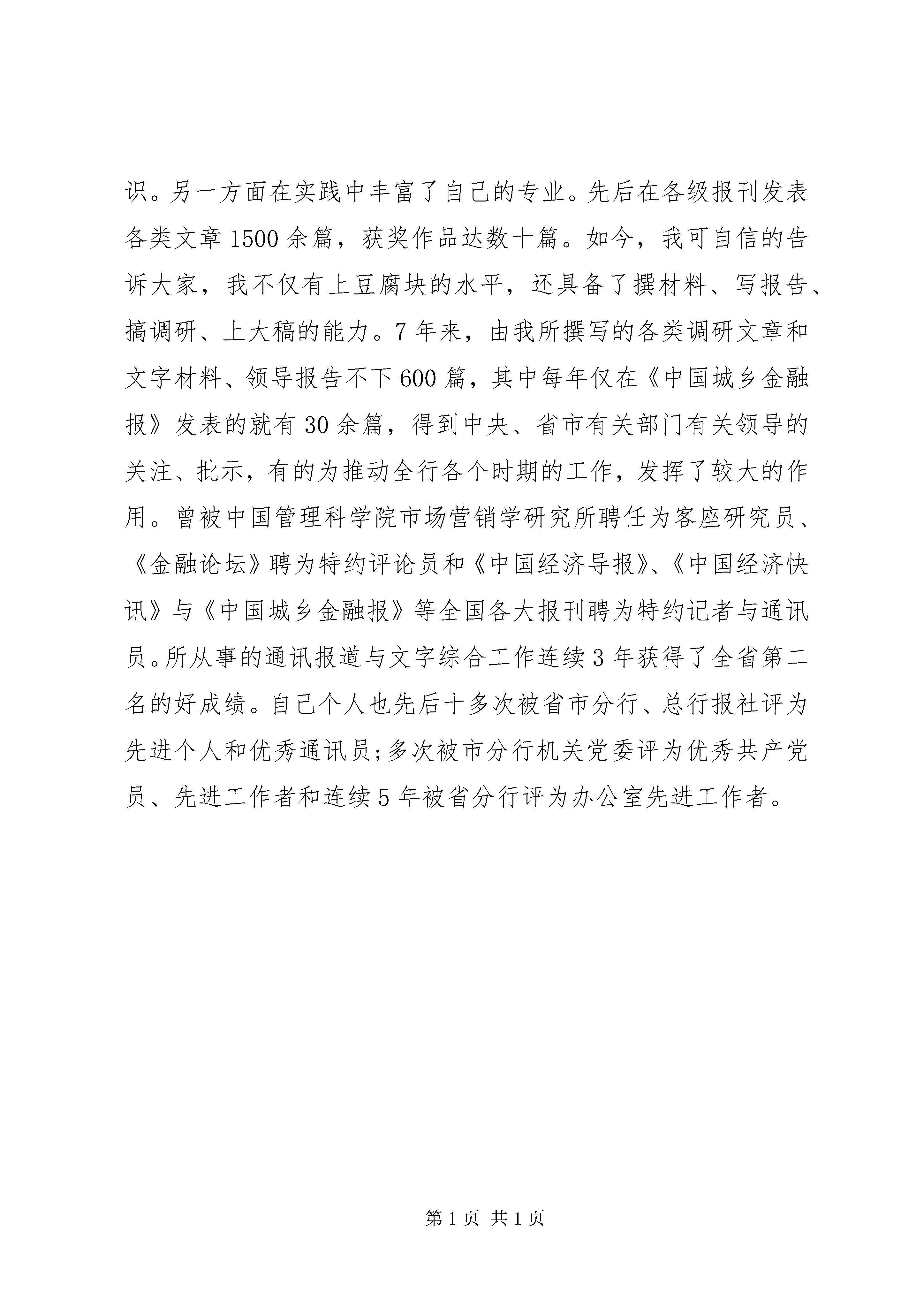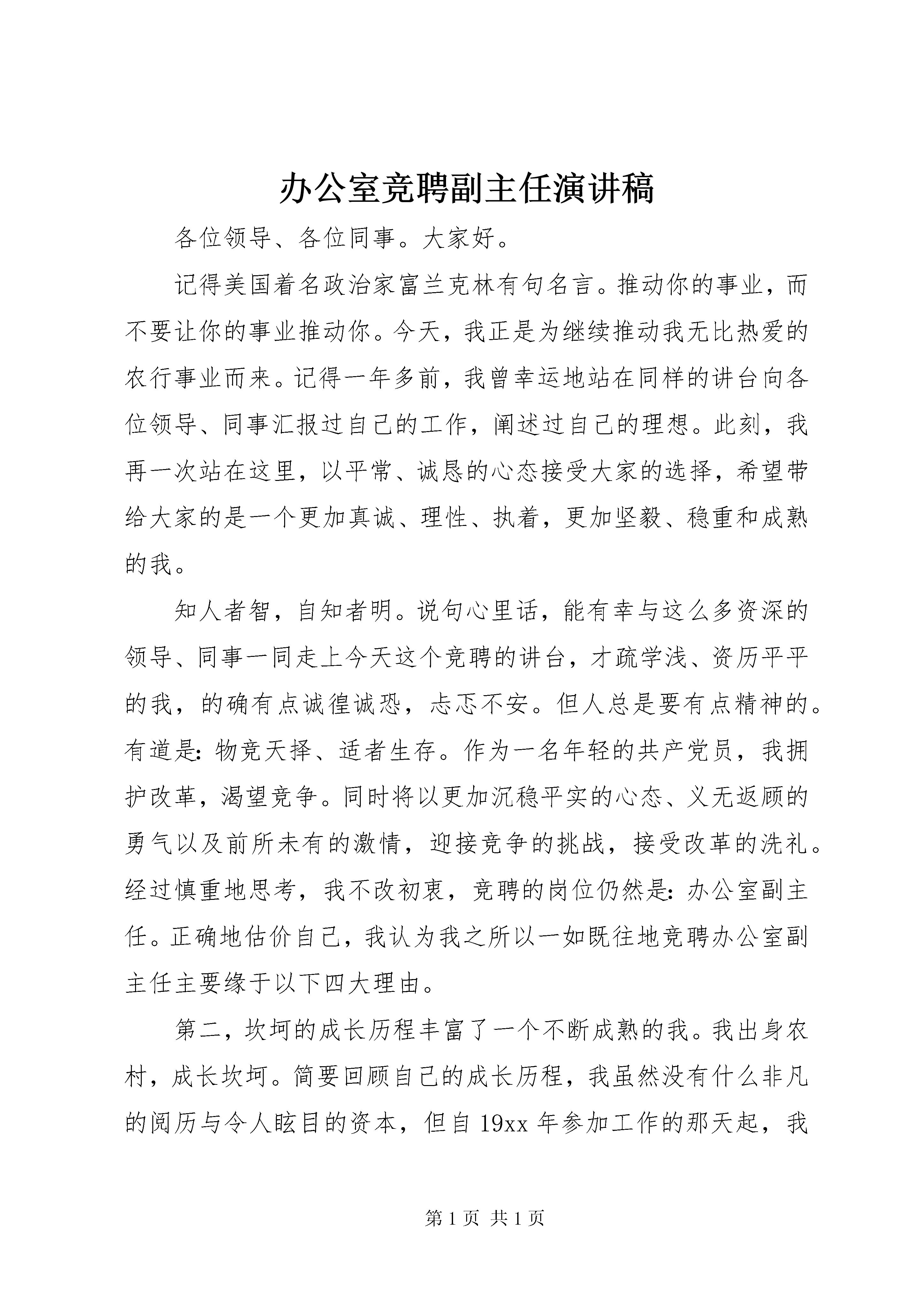 办公室竞聘副主任演讲稿各位领导、各位同事。大家好。记得美国着名政治家富兰克林有句名言。推动你的事业,而不要让你的事业推动你。今天,我正是为继续推动我无比热爱的农行事业而来。记得一年多前,我曾幸运地站在同样的讲台向各位领导、同事汇报过自己的工作,阐述过自己的理想。此刻,我再一次站在这里,以平常、诚恳的心态接受大家的选择,希望带给大家的是一个更加真诚、理性、执着,更加坚毅、稳重和成熟的我。知人者智,自知者明。说句心里话,能有幸与这么多资深的领导、同事一同走上今天这个竞聘的讲台,才疏学浅、资历平平的我,的确有点诚徨诚恐,忐忑不安。但人总是要有点精神的。有道是:物竞天择、适者生存。作为一名年轻的共产党员,我拥护改革,渴望竞争。同时将以更加沉稳平实的心态、义无返顾的勇气以及前所未有的激情,迎接竞争的挑战,接受改革的洗礼。经过慎重地思考,我不改初衷,竞聘的岗位仍然是:办公室副主任。正确地估价自己,我认为我之所以一如既往地竞聘办公室副主任主要缘于以下四大理由。第二,坎坷的成长历程丰富了一个不断成熟的我。我出身农村,成长坎坷。简要回顾自己的成长历程,我虽然没有什么非凡的阅历与令人眩目的资本,但自19xx年参加工作的那天起,我便深深地爱上了这份工作,把事业当作自己终身奋斗的最高理想,化作自己不懈追求的实际行动。之后,无论工作角色如何变换,我都干一行、爱一行、专一行、精一行。先后从事过会计出纳、信贷、以及内勤主任等业务工作,有8年的基层一线业务工作经历。在办公室从事过5年多的文字综合与综合管理工作,从事通讯报道、文字综合工作至今,我已经在办公室业务岗位上整整工作了7年。简单的成长历程,短短的2019年工作时间,相对于在座的资深的各位领导、各位同事来说是微不足道的,但对于一个从山村走向城市、从基层营业所一步一步走向机关的我来说,却是令我受益匪浅,终身难忘的。我常这样想,是党的政策、组织的培养、领导的关爱以及同事们的关心与帮助,我才能一步一步走到今天。我只有将心中这份感激与感念之情常存于心,使之成为工作不懈追求的动力,才能报答领导和同事们的多年教育、培养和关爱。第三,多年的专业实践历练了我对事业的忠诚。或许是执着追求、情有独钟的缘故,通过多年的办公室工作实践,我积累了一定的专业优势,历练了我对事业的忠诚。一方面在自学中提升了自己的专业。虽然我已拥有金融专业的大专文凭,但我又参加了全国文秘本科专业的自考,并通过近五年的艰苦努力自学了文秘专、本科全部17门课程。同时,自费参加了中国作家协会鲁迅文学院为期一年的函授学习,较快地丰富了自己的文秘专业知识。另一方面在实践中丰富了自己的专业。先后在各级报刊发表各类文章1500余篇,获奖作品达数十篇。如今,我可自信的告诉大家,我不仅有上豆腐块的水平,还具备了撰材料、写报告、搞调研、上大稿的能力。7年来,由我所撰写的各类调研文章和文字材料、领导报告不下600篇,其中每年仅在《中国城乡金融报》发表的就有30余篇,得到中央、省市有关部门有关领导的关注、批示,有的为推动全行各个时期的工作,发挥了较大的作用。曾被中国管理科学院市场营销学研究所聘任为客座研究员、《金融论坛》聘为特约评论员和《中国经济导报》、《中国经济快讯》与《中国城乡金融报》等全国各大报刊聘为特约记者与通讯员。所从事的通讯报道与文字综合工作连续3年获得了全省第二名的好成绩。自己个人也先后十多次被省市分行、总行报社评为先进个人和优秀通讯员;多次被市分行机关党委评为优秀共产党员、先进工作者和连续5年被省分行评为办公室先进工作者。