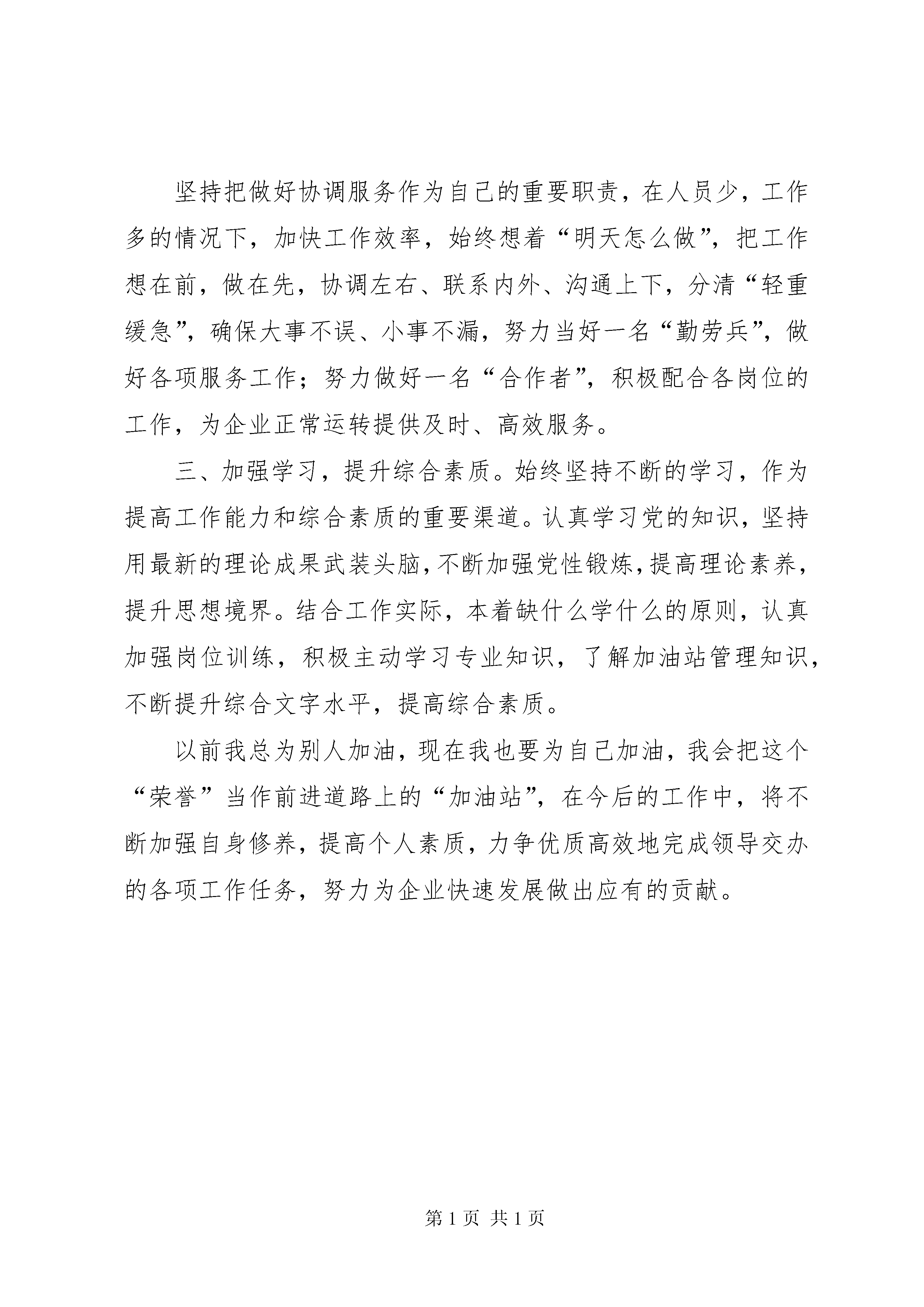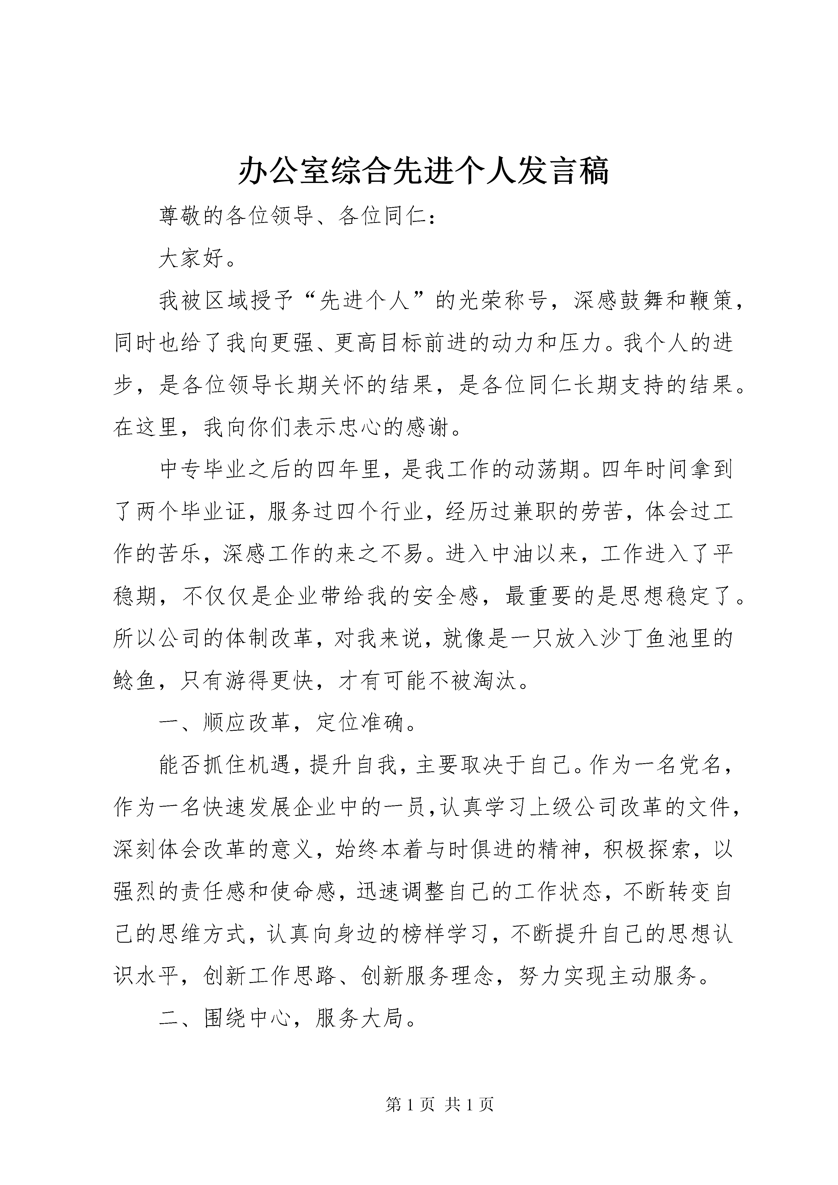办公室综合先进个人发言稿尊敬的各位领导、各位同仁:大家好。我被区域授予“先进个人”的光荣称号,深感鼓舞和鞭策,同时也给了我向更强、更高目标前进的动力和压力。我个人的进步,是各位领导长期关怀的结果,是各位同仁长期支持的结果。在这里,我向你们表示忠心的感谢。中专毕业之后的四年里,是我工作的动荡期。四年时间拿到了两个毕业证,服务过四个行业,经历过兼职的劳苦,体会过工作的苦乐,深感工作的来之不易。进入中油以来,工作进入了平稳期,不仅仅是企业带给我的安全感,最重要的是思想稳定了。所以公司的体制改革,对我来说,就像是一只放入沙丁鱼池里的鲶鱼,只有游得更快,才有可能不被淘汰。一、顺应改革,定位准确。能否抓住机遇,提升自我,主要取决于自己。作为一名党名,作为一名快速发展企业中的一员,认真学习上级公司改革的文件,深刻体会改革的意义,始终本着与时俱进的精神,积极探索,以强烈的责任感和使命感,迅速调整自己的工作状态,不断转变自己的思维方式,认真向身边的榜样学习,不断提升自己的思想认识水平,创新工作思路、创新服务理念,努力实现主动服务。二、围绕中心,服务大局。坚持把做好协调服务作为自己的重要职责,在人员少,工作多的情况下,加快工作效率,始终想着“明天怎么做”,把工作想在前,做在先,协调左右、联系内外、沟通上下,分清“轻重缓急”,确保大事不误、小事不漏,努力当好一名“勤劳兵”,做好各项服务工作;努力做好一名“合作者”,积极配合各岗位的工作,为企业正常运转提供及时、高效服务。三、加强学习,提升综合素质。始终坚持不断的学习,作为提高工作能力和综合素质的重要渠道。认真学习党的知识,坚持用最新的理论成果武装头脑,不断加强党性锻炼,提高理论素养,提升思想境界。结合工作实际,本着缺什么学什么的原则,认真加强岗位训练,积极主动学习专业知识,了解加油站管理知识,不断提升综合文字水平,提高综合素质。以前我总为别人加油,现在我也要为自己加油,我会把这个“荣誉”当作前进道路上的“加油站”,在今后的工作中,将不断加强自身修养,提高个人素质,力争优质高效地完成领导交办的各项工作任务,努力为企业快速发展做出应有的贡献。