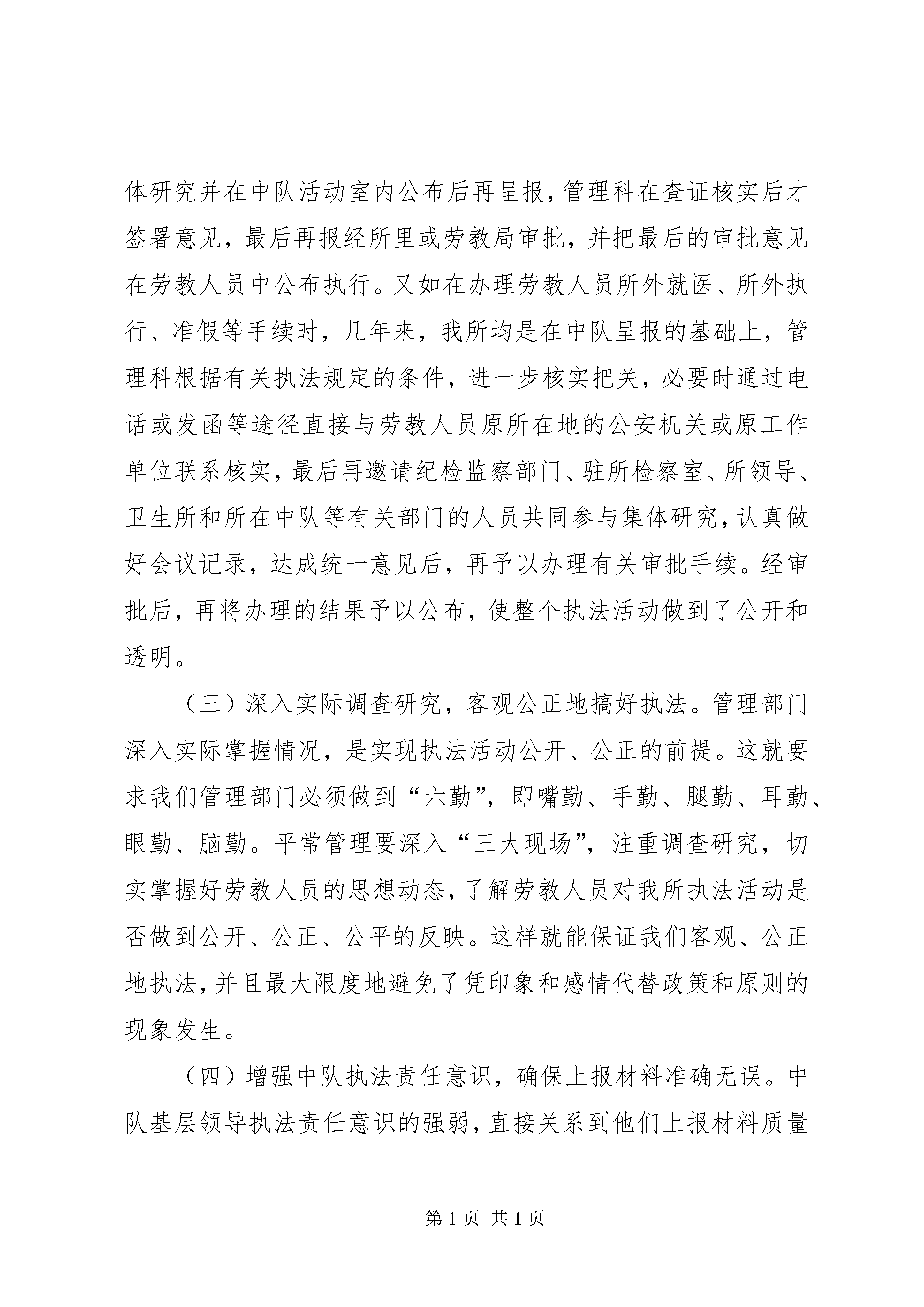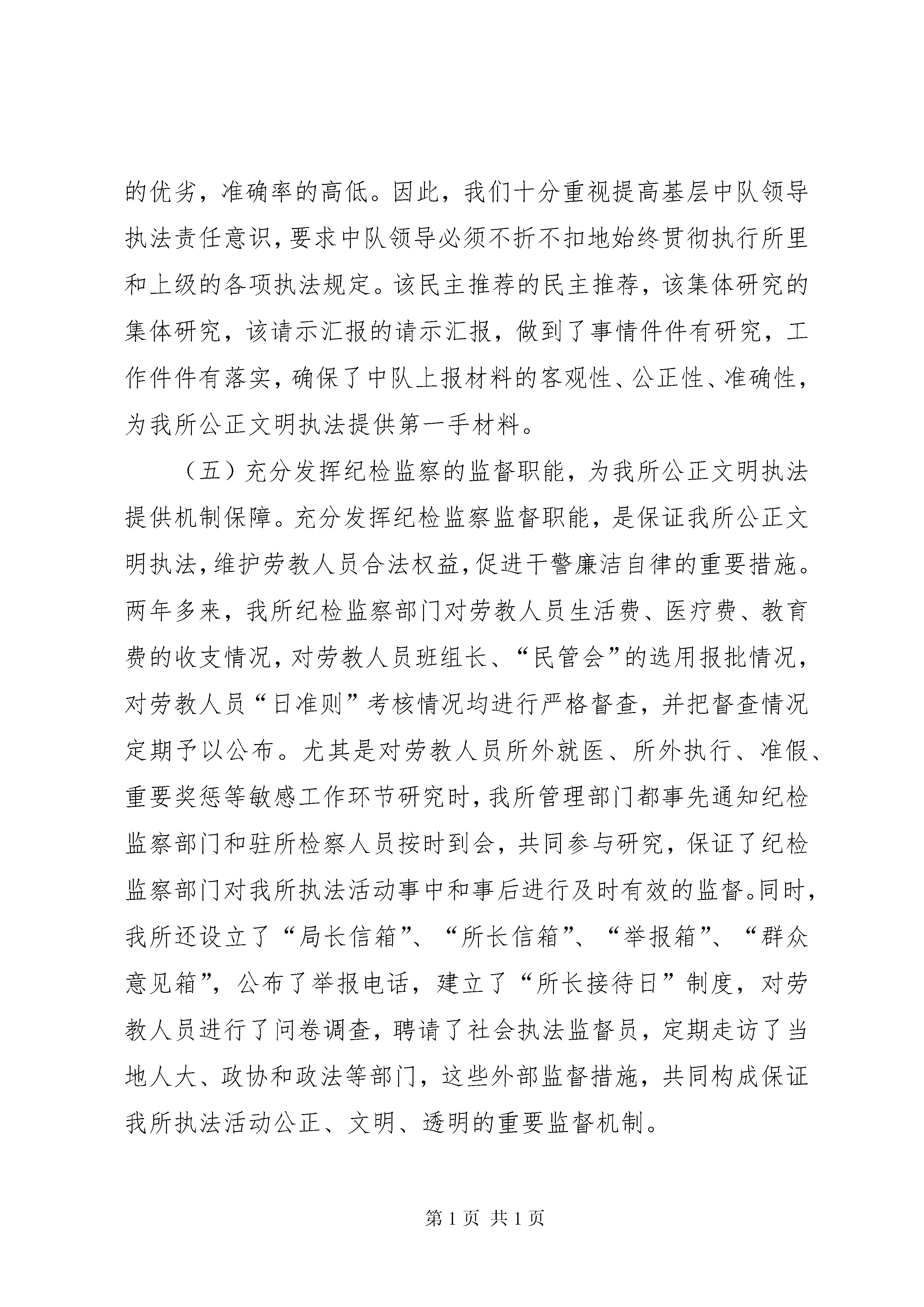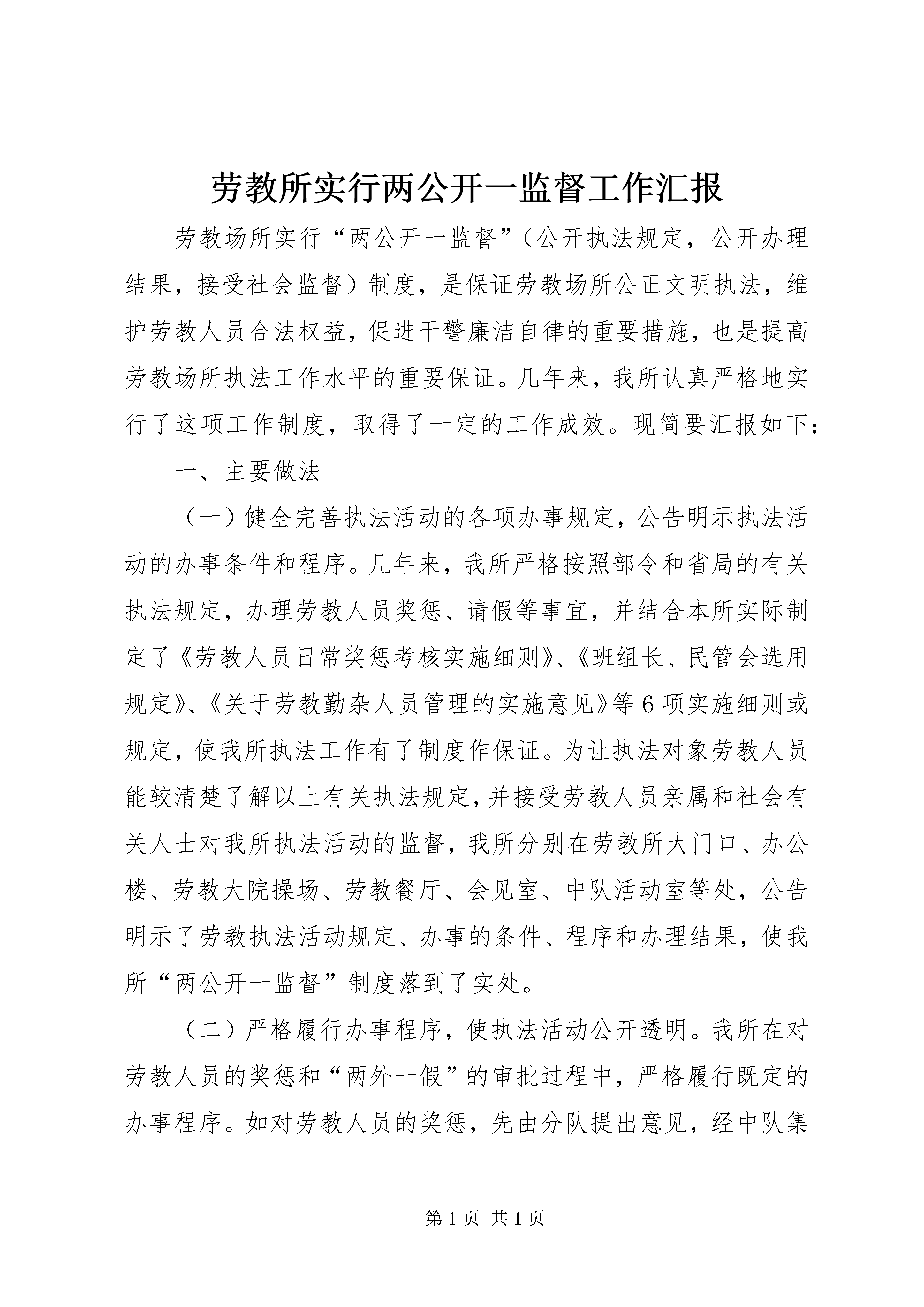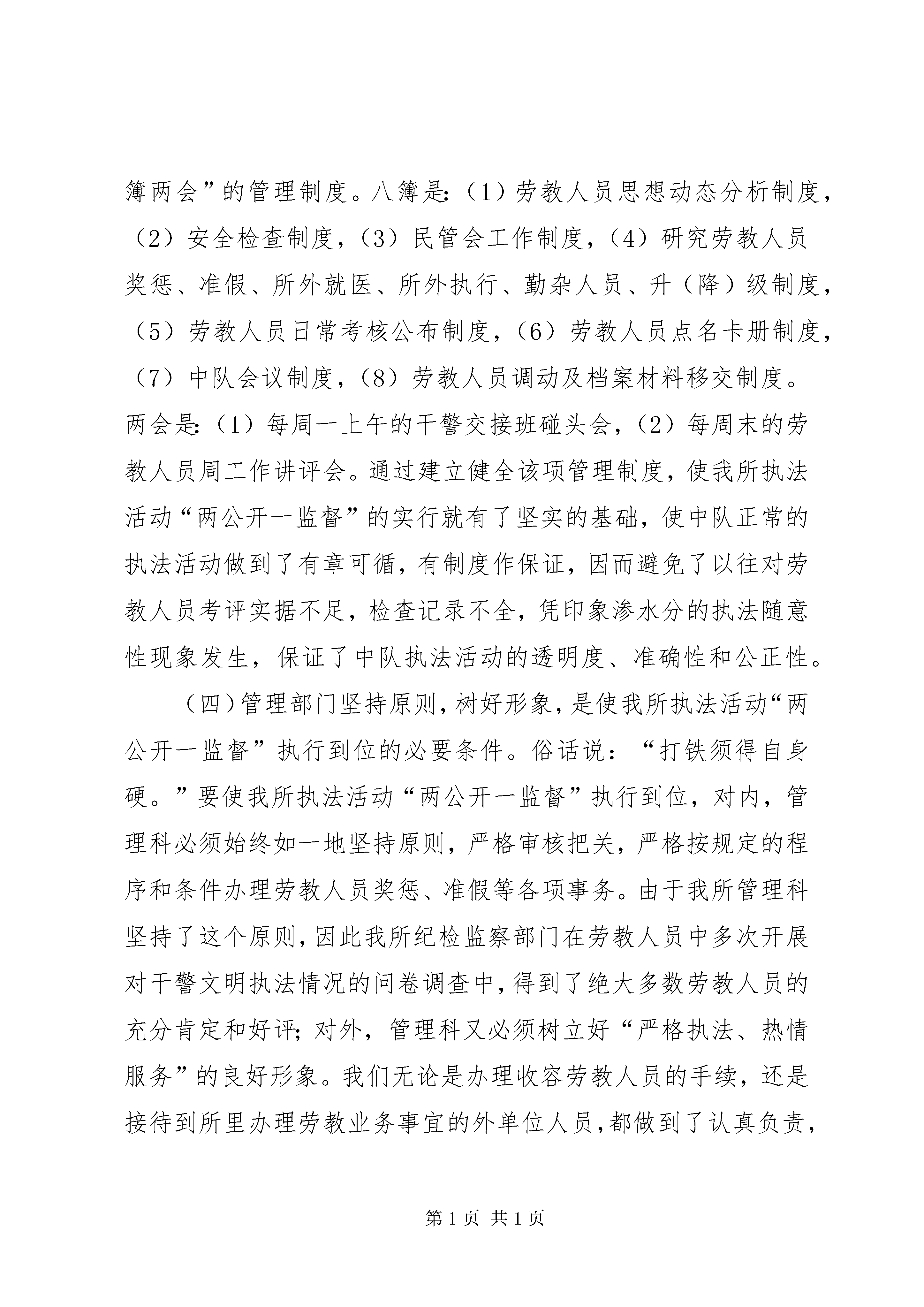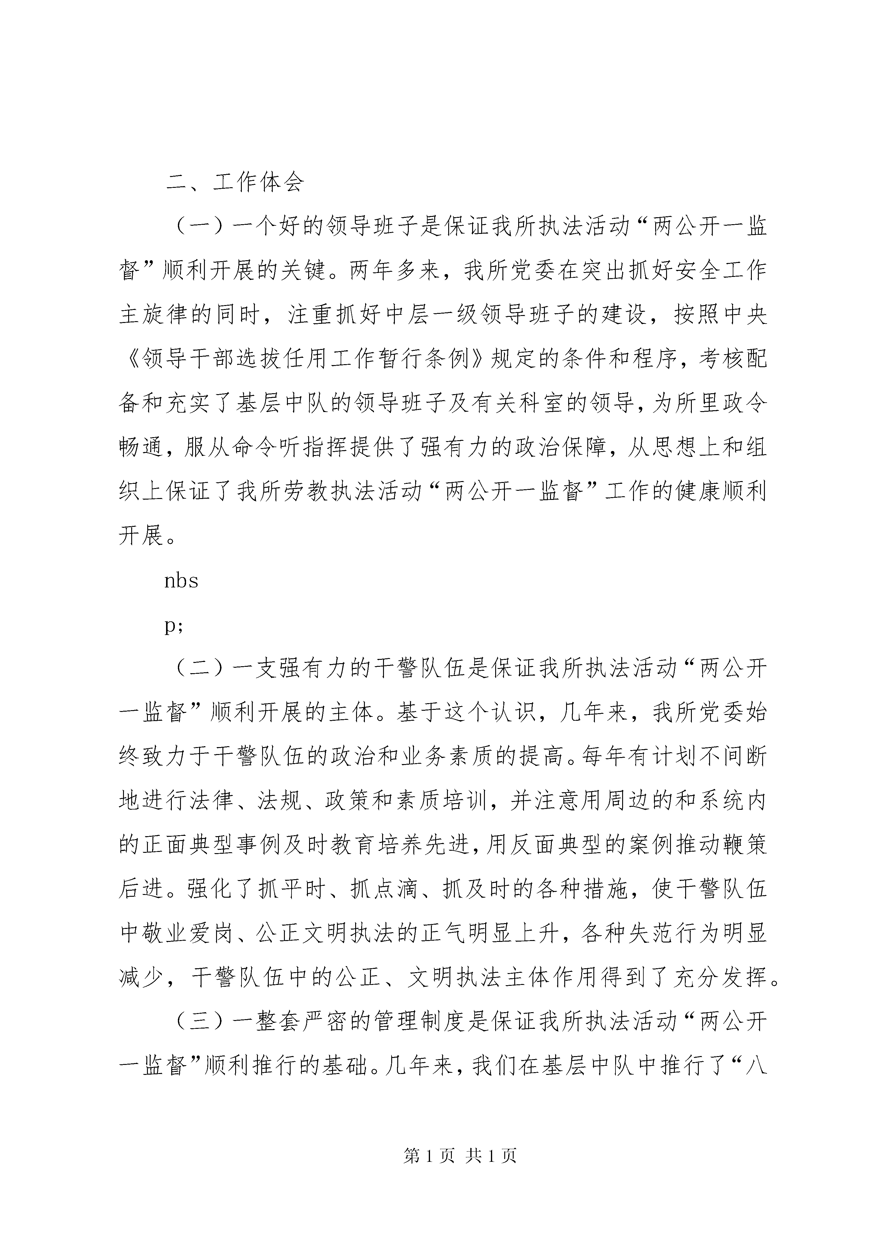 劳教所实行两公开一监督工作汇报劳教场所实行“两公开一监督”(公开执法规定,公开办理结果,接受社会监督)制度,是保证劳教场所公正文明执法,维护劳教人员合法权益,促进干警廉洁自律的重要措施,也是提高劳教场所执法工作水平的重要保证。几年来,我所认真严格地实行了这项工作制度,取得了一定的工作成效。现简要汇报如下:一、主要做法(一)健全完善执法活动的各项办事规定,公告明示执法活动的办事条件和程序。几年来,我所严格按照部令和省局的有关执法规定,办理劳教人员奖惩、请假等事宜,并结合本所实际制定了《劳教人员日常奖惩考核实施细则》、《班组长、民管会选用规定》、《关于劳教勤杂人员管理的实施意见》等6项实施细则或规定,使我所执法工作有了制度作保证。为让执法对象劳教人员能较清楚了解以上有关执法规定,并接受劳教人员亲属和社会有关人士对我所执法活动的监督,我所分别在劳教所大门口、办公楼、劳教大院操场、劳教餐厅、会见室、中队活动室等处,公告明示了劳教执法活动规定、办事的条件、程序和办理结果,使我所“两公开一监督”制度落到了实处。(二)严格履行办事程序,使执法活动公开透明。我所在对劳教人员的奖惩和“两外一假”的审批过程中,严格履行既定的办事程序。如对劳教人员的奖惩,先由分队提出意见,经中队集体研究并在中队活动室内公布后再呈报,管理科在查证核实后才签署意见,最后再报经所里或劳教局审批,并把最后的审批意见在劳教人员中公布执行。又如在办理劳教人员所外就医、所外执行、准假等手续时,几年来,我所均是在中队呈报的基础上,管理科根据有关执法规定的条件,进一步核实把关,必要时通过电话或发函等途径直接与劳教人员原所在地的公安机关或原工作单位联系核实,最后再邀请纪检监察部门、驻所检察室、所领导、卫生所和所在中队等有关部门的人员共同参与集体研究,认真做好会议记录,达成统一意见后,再予以办理有关审批手续。经审批后,再将办理的结果予以公布,使整个执法活动做到了公开和透明。(三)深入实际调查研究,客观公正地搞好执法。管理部门深入实际掌握情况,是实现执法活动公开、公正的前提。这就要求我们管理部门必须做到“六勤”,即嘴勤、手勤、腿勤、耳勤、眼勤、脑勤。平常管理要深入“三大现场”,注重调查研究,切实掌握好劳教人员的思想动态,了解劳教人员对我所执法活动是否做到公开、公正、公平的反映。这样就能保证我们客观、公正地执法,并且最大限度地避免了凭印象和感情代替政策和原则的现象发生。(四)增强中队执法责任意识,确保上报材料准确无误。中队基层领导执法责任意识的强弱,直接关系到他们上报材料质量的优劣,准确率的高低。因此,我们十分重视提高基层中队领导执法责任意识,要求中队领导必须不折不扣地始终贯彻执行所里和上级的各项执法规定。该民主推荐的民主推荐,该集体研究的集体研究,该请示汇报的请示汇报,做到了事情件件有研究,工作件件有落实,确保了中队上报材料的客观性、公正性、准确性,为我所公正文明执法提供第一手材料。(五)充分发挥纪检监察的监督职能,为我所公正文明执法提供机制保障。充分发挥纪检监察监督职能,是保证我所公正文明执法,维护劳教人员合法权益,促进干警廉洁自律的重要措施。两年多来,我所纪检监察部门对劳教人员生活费、医疗费、教育费的收支情况,对劳教人员班组长、“民管会”的选用报批情况,对劳教人员“日准则”考核情况均进行严格督查,并把督查情况定期予以公布。尤其是对劳教人员所外就医、所外执行、准假、重要奖惩等敏感工作环节研究时,我所管理部门都事先通知纪检监察部门和驻所检察人员按时到会,共同参与研究,保证了纪检监察部门对我所执法活动事中和事后进行及时有效的监督。同时,我所还设立了“局长信箱”、“所长信箱”、“举报箱”、“群众意见箱”,公布了举报电话,建立了“所长接待日”制度,对劳教人员进行了问卷调查,聘请了社会执法监督员,定期走访了当地人大、政协和政法等部门,这些外部监督措施,共同构成保证我所执法活动公正、文明、透明的重要监督机制。二、工作体会(一)一个好的领导班子是保证我所执法活动“两公开一监督”顺利开展的关键。两年多来,我所党委在突出抓好安全工作主旋律的同时,注重抓好中层一级领导班子的建设,按照中央《领导干部选拔任用工作暂行条例》规定的条件和程序,考核配备和充实了基层中队的领导班子及有关科室的领导,为所里政令畅通,服从命令听指挥提供了强有力的政治保障,从思想上和组织上保证了我所劳教执法活动“两公开一监督”工作的健康顺利开展。nbsp;(二)一支强有力的干警队伍是保证我所执法活动“两公开一监督”顺利开展的主体。基于这个认识,几年来,我所党委始终致力于干警队伍的政治和业务素质的提高。每年有计划不间断地进行法律、法规、政策和素质培训,并注意用周边的和系统内的正面典型事例及时教育培养先进,用反面典型