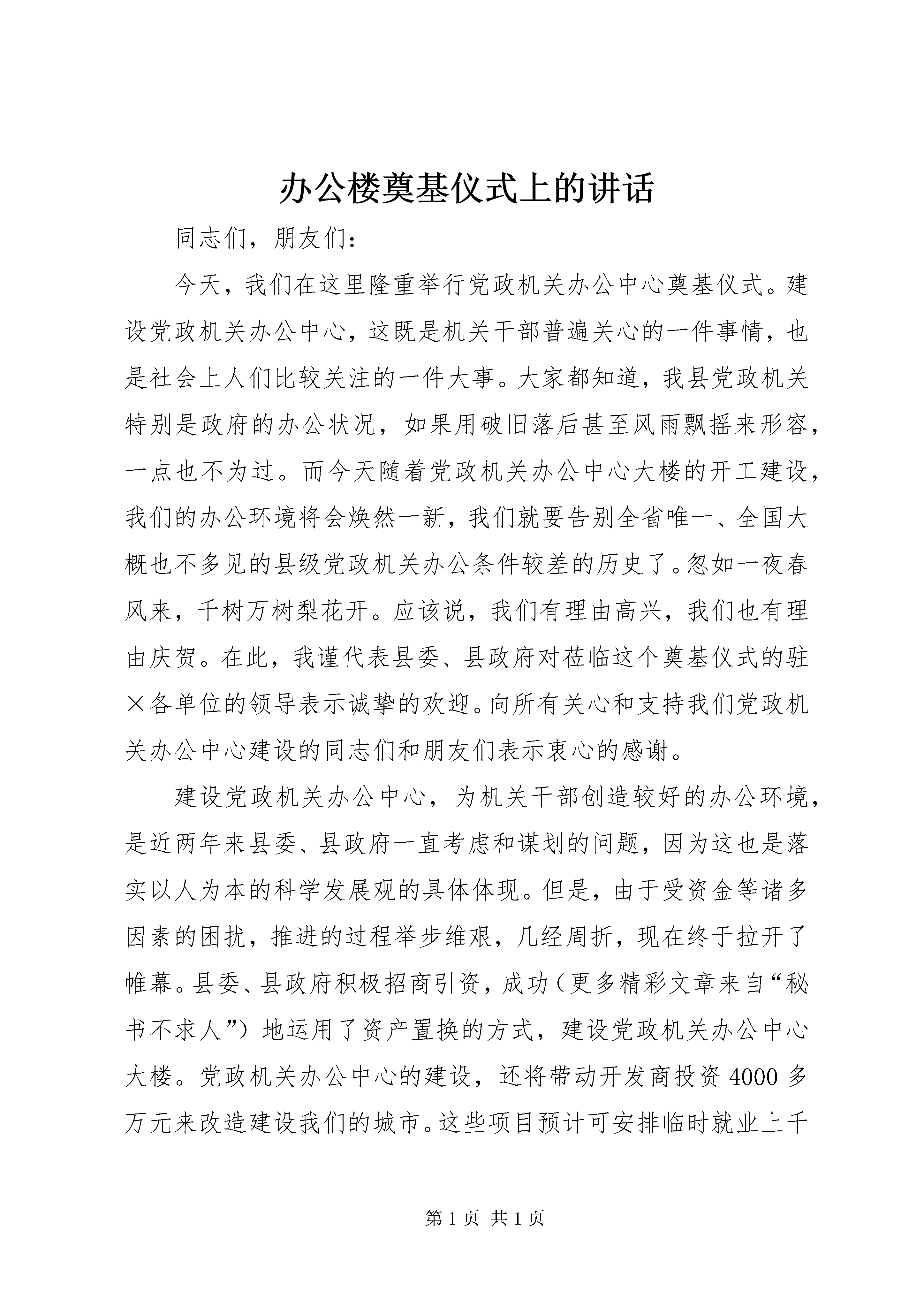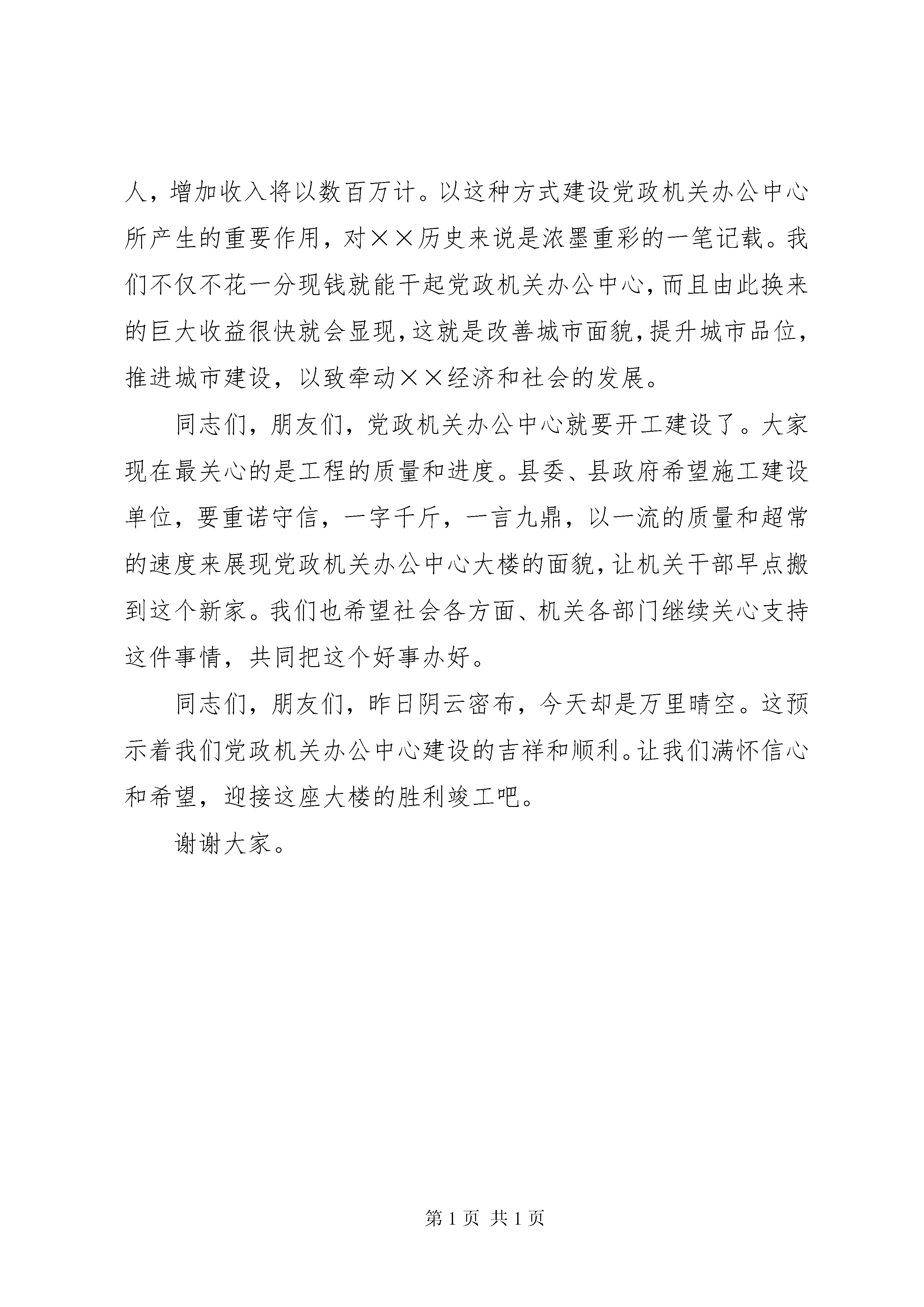 办公楼奠基仪式上的讲话同志们,朋友们:今天,我们在这里隆重举行党政机关办公中心奠基仪式。建设党政机关办公中心,这既是机关干部普遍关心的一件事情,也是社会上人们比较关注的一件大事。大家都知道,我县党政机关特别是政府的办公状况,如果用破旧落后甚至风雨飘摇来形容,一点也不为过。而今天随着党政机关办公中心大楼的开工建设,我们的办公环境将会焕然一新,我们就要告别全省唯一、全国大概也不多见的县级党政机关办公条件较差的历史了。忽如一夜春风来,千树万树梨花开。应该说,我们有理由高兴,我们也有理由庆贺。在此,我谨代表县委、县政府对莅临这个奠基仪式的驻×各单位的领导表示诚挚的欢迎。向所有关心和支持我们党政机关办公中心建设的同志们和朋友们表示衷心的感谢。建设党政机关办公中心,为机关干部创造较好的办公环境,是近两年来县委、县政府一直考虑和谋划的问题,因为这也是落实以人为本的科学发展观的具体体现。但是,由于受资金等诸多因素的困扰,推进的过程举步维艰,几经周折,现在终于拉开了帷幕。县委、县政府积极招商引资,成功(更多精彩文章来自“秘书不求人”)地运用了资产置换的方式,建设党政机关办公中心大楼。党政机关办公中心的建设,还将带动开发商投资4000多万元来改造建设我们的城市。这些项目预计可安排临时就业上千人,增加收入将以数百万计。以这种方式建设党政机关办公中心所产生的重要作用,对××历史来说是浓墨重彩的一笔记载。我们不仅不花一分现钱就能干起党政机关办公中心,而且由此换来的巨大收益很快就会显现,这就是改善城市面貌,提升城市品位,推进城市建设,以致牵动××经济和社会的发展。同志们,朋友们,党政机关办公中心就要开工建设了。大家现在最关心的是工程的质量和进度。县委、县政府希望施工建设单位,要重诺守信,一字千斤,一言九鼎,以一流的质量和超常的速度来展现党政机关办公中心大楼的面貌,让机关干部早点搬到这个新家。我们也希望社会各方面、机关各部门继续关心支持这件事情,共同把这个好事办好。同志们,朋友们,昨日阴云密布,今天却是万里晴空。这预示着我们党政机关办公中心建设的吉祥和顺利。让我们满怀信心和希望,迎接这座大楼的胜利竣工吧。谢谢大家。