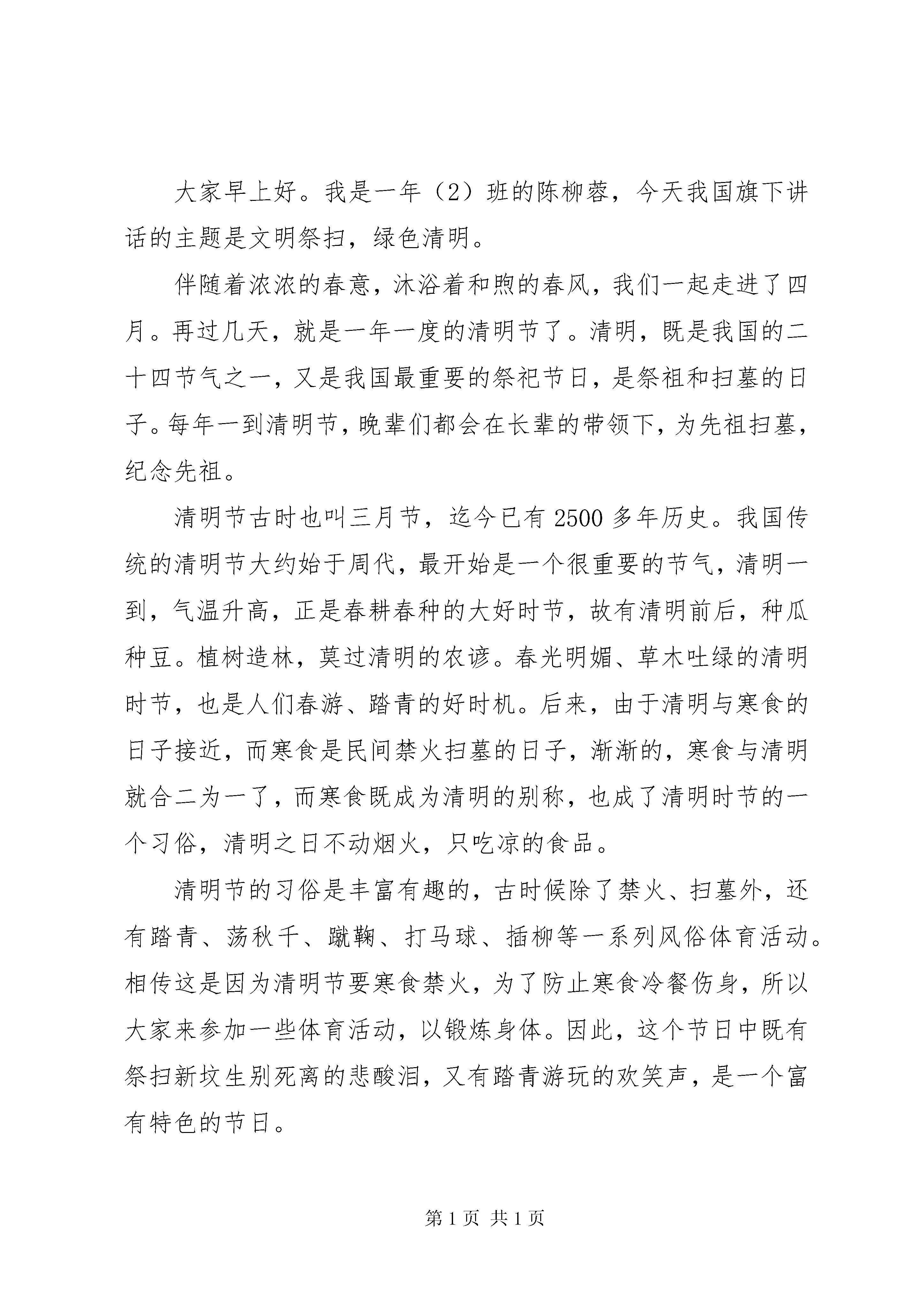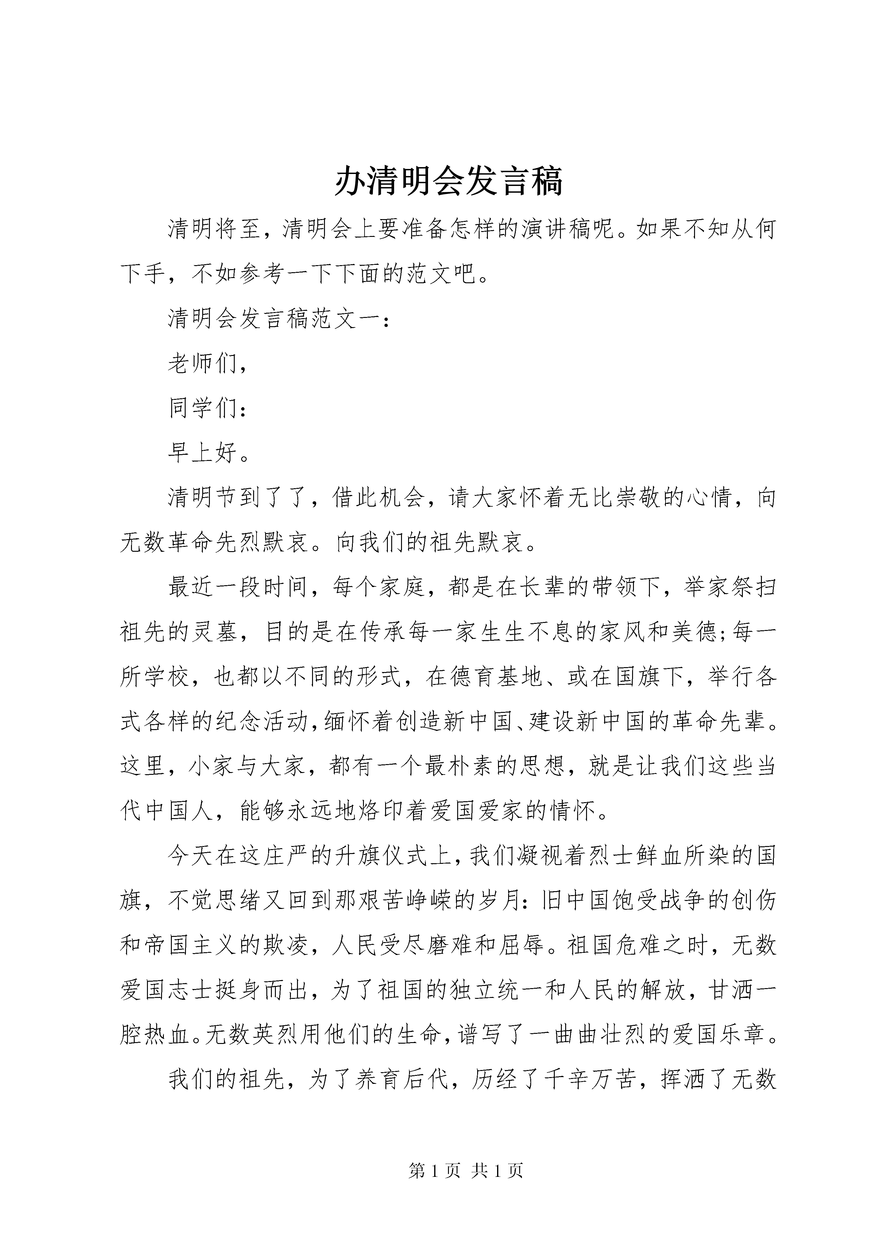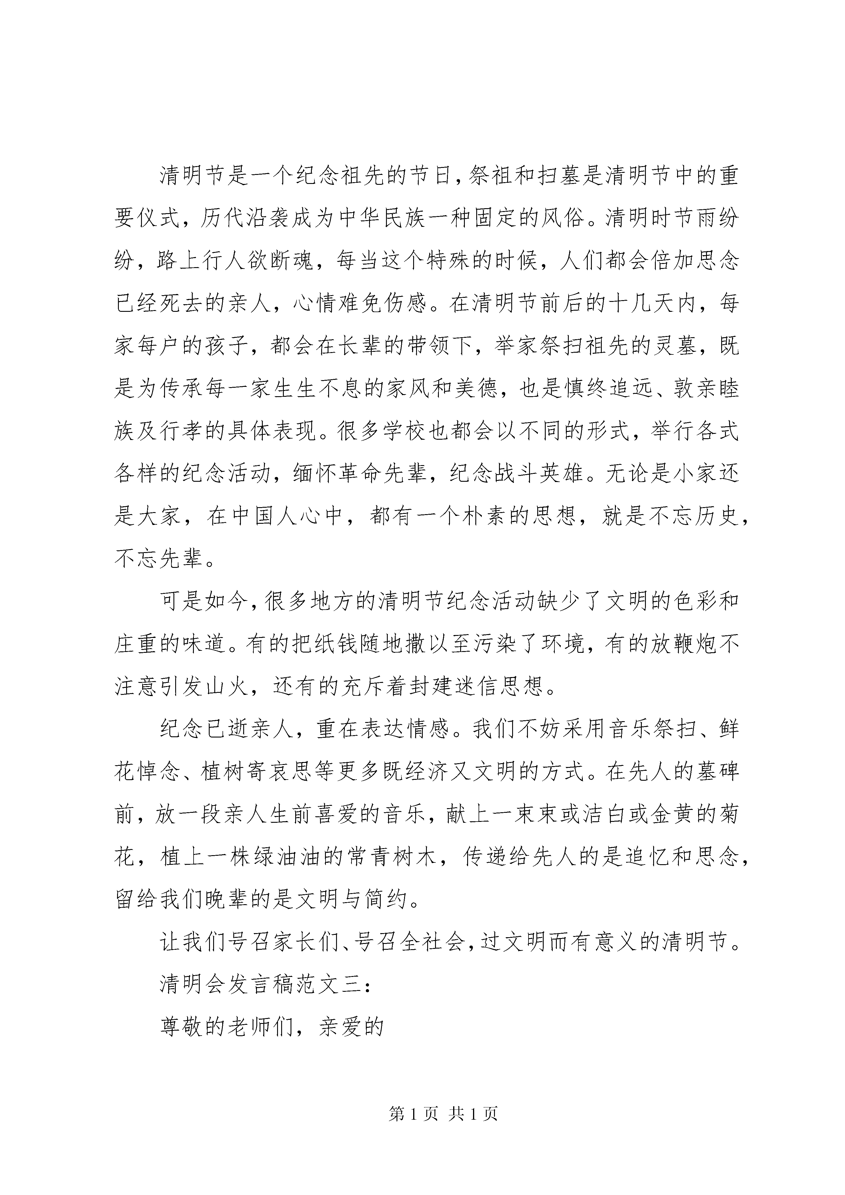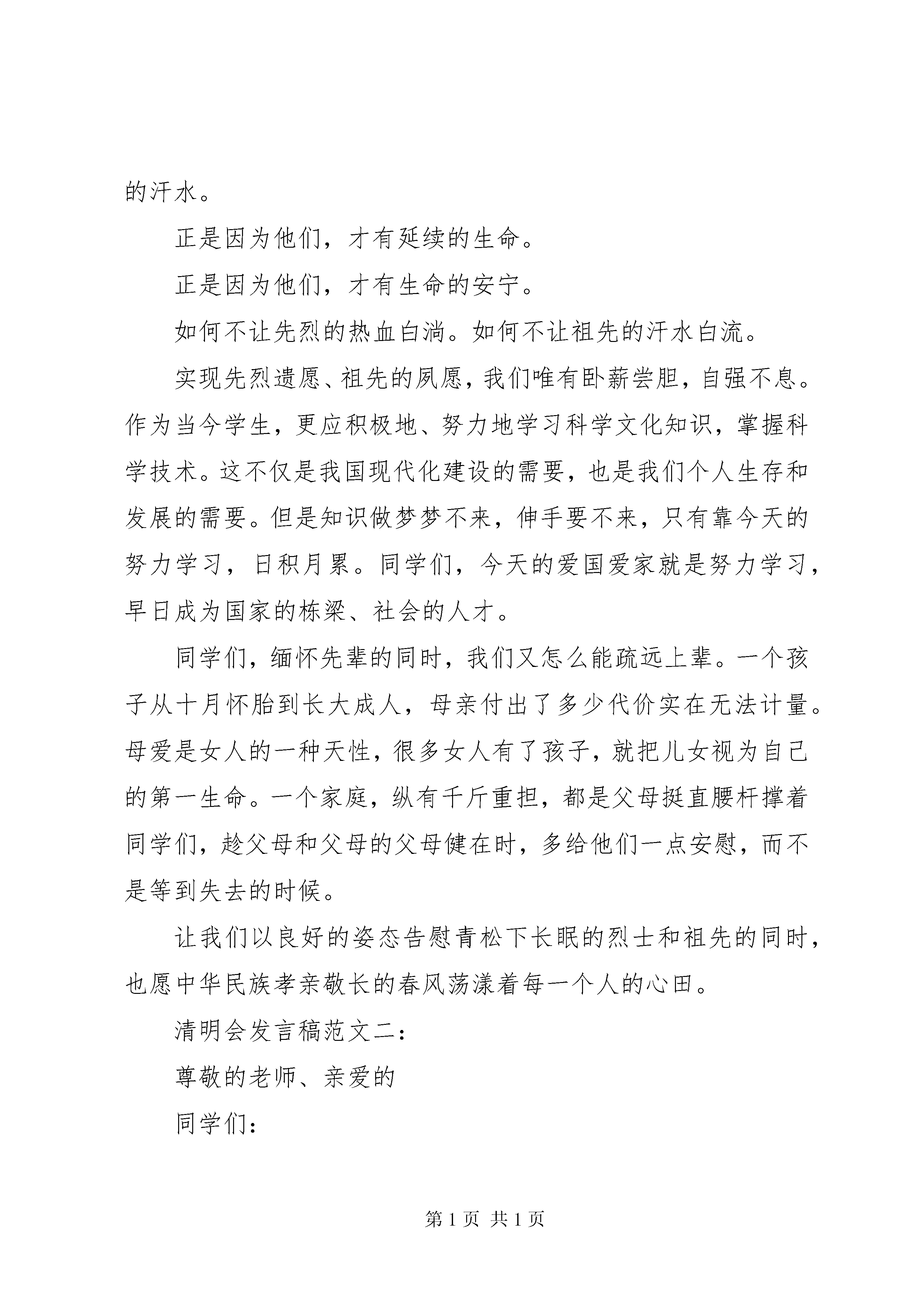 办清明会发言稿清明将至,清明会上要准备怎样的演讲稿呢。如果不知从何下手,不如参考一下下面的范文吧。清明会发言稿范文一:老师们,同学们:早上好。清明节到了了,借此机会,请大家怀着无比崇敬的心情,向无数革命先烈默哀。向我们的祖先默哀。最近一段时间,每个家庭,都是在长辈的带领下,举家祭扫祖先的灵墓,目的是在传承每一家生生不息的家风和美德;每一所学校,也都以不同的形式,在德育基地、或在国旗下,举行各式各样的纪念活动,缅怀着创造新中国、建设新中国的革命先辈。这里,小家与大家,都有一个最朴素的思想,就是让我们这些当代中国人,能够永远地烙印着爱国爱家的情怀。今天在这庄严的升旗仪式上,我们凝视着烈士鲜血所染的国旗,不觉思绪又回到那艰苦峥嵘的岁月:旧中国饱受战争的创伤和帝国主义的欺凌,人民受尽磨难和屈辱。祖国危难之时,无数爱国志士挺身而出,为了祖国的独立统一和人民的解放,甘洒一腔热血。无数英烈用他们的生命,谱写了一曲曲壮烈的爱国乐章。我们的祖先,为了养育后代,历经了千辛万苦,挥洒了无数的汗水。正是因为他们,才有延续的生命。正是因为他们,才有生命的安宁。如何不让先烈的热血白淌。如何不让祖先的汗水白流。实现先烈遗愿、祖先的夙愿,我们唯有卧薪尝胆,自强不息。作为当今学生,更应积极地、努力地学习科学文化知识,掌握科学技术。这不仅是我国现代化建设的需要,也是我们个人生存和发展的需要。但是知识做梦梦不来,伸手要不来,只有靠今天的努力学习,日积月累。同学们,今天的爱国爱家就是努力学习,早日成为国家的栋梁、社会的人才。同学们,缅怀先辈的同时,我们又怎么能疏远上辈。一个孩子从十月怀胎到长大成人,母亲付出了多少代价实在无法计量。母爱是女人的一种天性,很多女人有了孩子,就把儿女视为自己的第一生命。一个家庭,纵有千斤重担,都是父母挺直腰杆撑着同学们,趁父母和父母的父母健在时,多给他们一点安慰,而不是等到失去的时候。让我们以良好的姿态告慰青松下长眠的烈士和祖先的同时,也愿中华民族孝亲敬长的春风荡漾着每一个人的心田。清明会发言稿范文二:尊敬的老师、亲爱的同学们:大家早上好。我是一年(2)班的陈柳蓉,今天我国旗下讲话的主题是文明祭扫,绿色清明。伴随着浓浓的春意,沐浴着和煦的春风,我们一起走进了四月。再过几天,就是一年一度的清明节了。清明,既是我国的二十四节气之一,又是我国最重要的祭祀节日,是祭祖和扫墓的日子。每年一到清明节,晚辈们都会在长辈的带领下,为先祖扫墓,纪念先祖。清明节古时也叫三月节,迄今已有2500多年历史。我国传统的清明节大约始于周代,最开始是一个很重要的节气,清明一到,气温升高,正是春耕春种的大好时节,故有清明前后,种瓜种豆。植树造林,莫过清明的农谚。春光明媚、草木吐绿的清明时节,也是人们春游、踏青的好时机。后来,由于清明与寒食的日子接近,而寒食是民间禁火扫墓的日子,渐渐的,寒食与清明就合二为一了,而寒食既成为清明的别称,也成了清明时节的一个习俗,清明之日不动烟火,只吃凉的食品。清明节的习俗是丰富有趣的,古时候除了禁火、扫墓外,还有踏青、荡秋千、蹴鞠、打马球、插柳等一系列风俗体育活动。相传这是因为清明节要寒食禁火,为了防止寒食冷餐伤身,所以大家来参加一些体育活动,以锻炼身体。因此,这个节日中既有祭扫新坟生别死离的悲酸泪,又有踏青游玩的欢笑声,是一个富有特色的节日。清明节是一个纪念祖先的节日,祭祖和扫墓是清明节中的重要仪式,历代沿袭成为中华民族一种固定的风俗。清明时节雨纷纷,路上行人欲断魂,每当这个特殊的时候,人们都会倍加思念已经死去的亲人,心情难免伤感。在清明节前后的十几天内,每家每户的孩子,都会在长辈的带领下,举家祭扫祖先的灵墓,既是为传承每一家生生不息的家风和美德,也是慎终追远、敦亲睦族及行孝的具体表现。很多学校也都会以不同的形式,举行各式各样的纪念活动,缅怀革命先辈,纪念战斗英雄。无论是小家还是大家,在中国人心中,都有一个朴素的思想,就是不忘历史,不忘先辈。可是如今,很多地方的清明节纪念活动缺少了文明的色彩和庄重的味道。有的把纸钱随地撒以至污染了环境,有的放鞭炮不注意引发山火,还有的充斥着封建迷信思想。纪念已逝亲人,重在表达情感。我们不妨采用音乐祭扫、鲜花悼念、植树寄哀思等更多既经济又文明的方式。在先人的墓碑前,放一段亲人生前喜爱的音乐,献上一束束或洁白或金黄的菊花,植上一株绿油油的常青树木,传递给先人的是追忆和思念,留给我们晚辈的是文明与简约。让我们号召家长们、号召全社会,过文明而有意义的清明节。清明会发言稿范文三:尊敬的老师们,亲爱的同学们:大家下午好。很高兴能有这样一次机会与大家聚在一起,共同纪念那些英勇的先烈们。历史,像一面镜子,让我们看清自己,也认识自己。惨痛的历史,就像一个难以愈合的伤疤,时时让人感到心痛。今天,我们