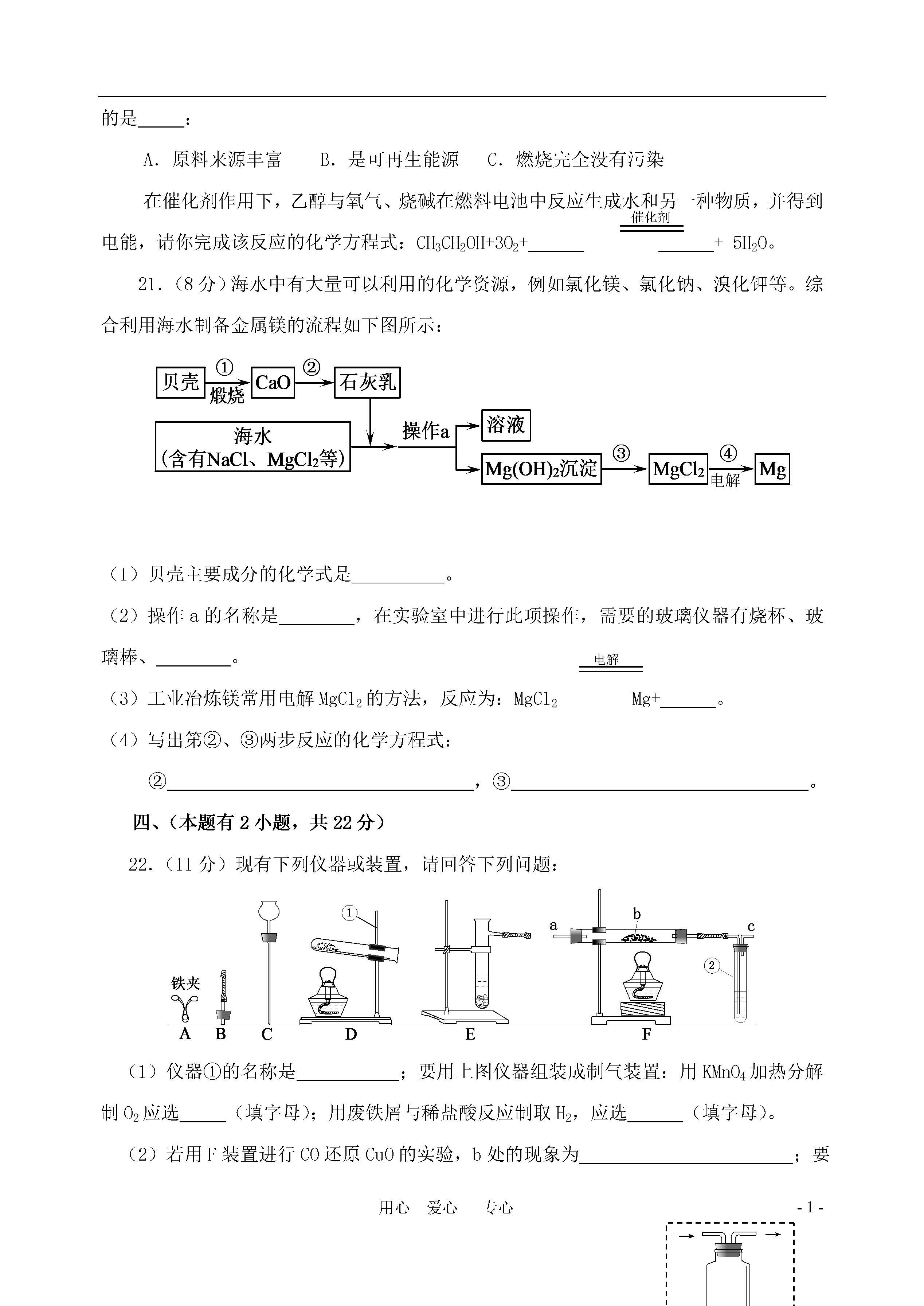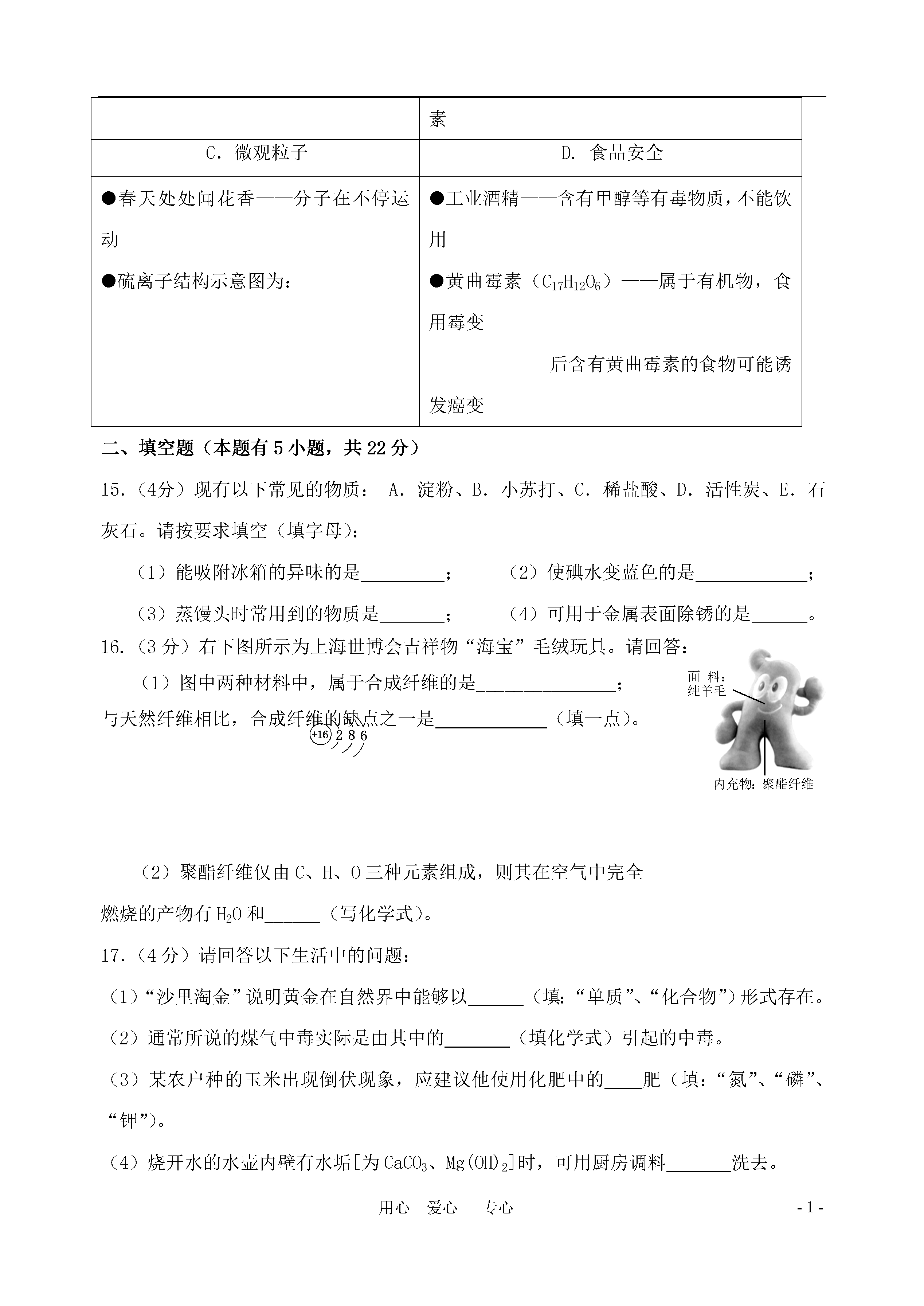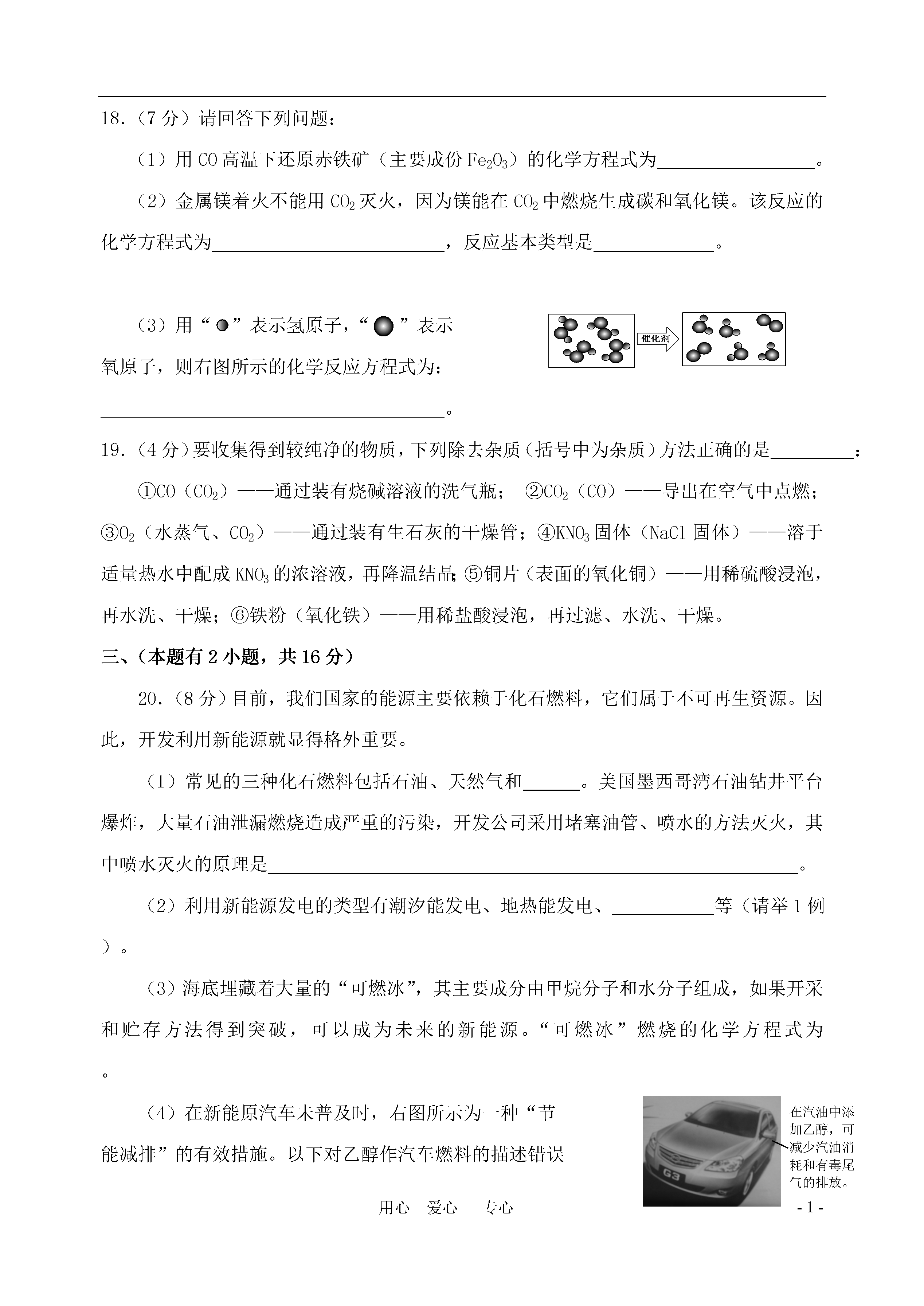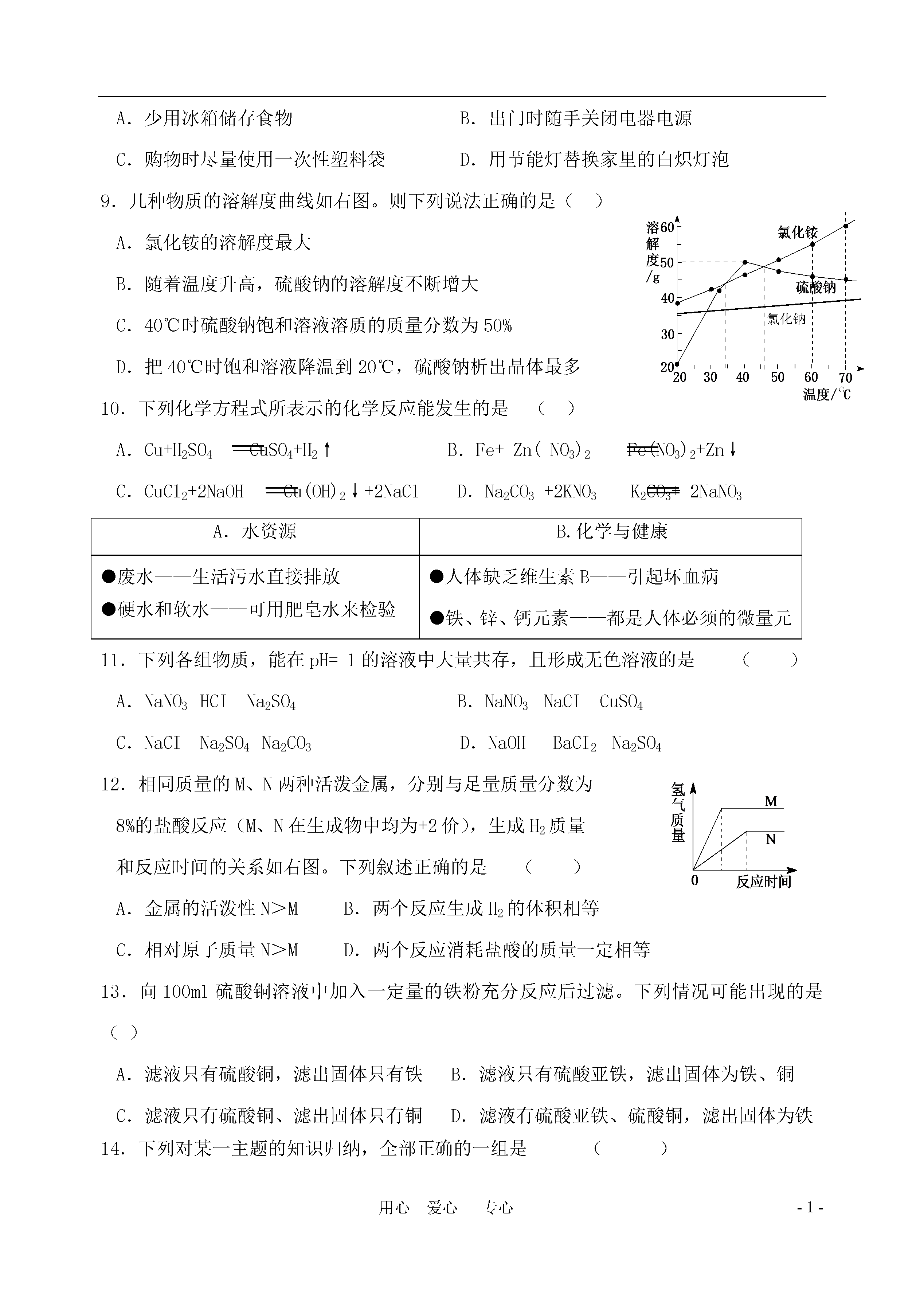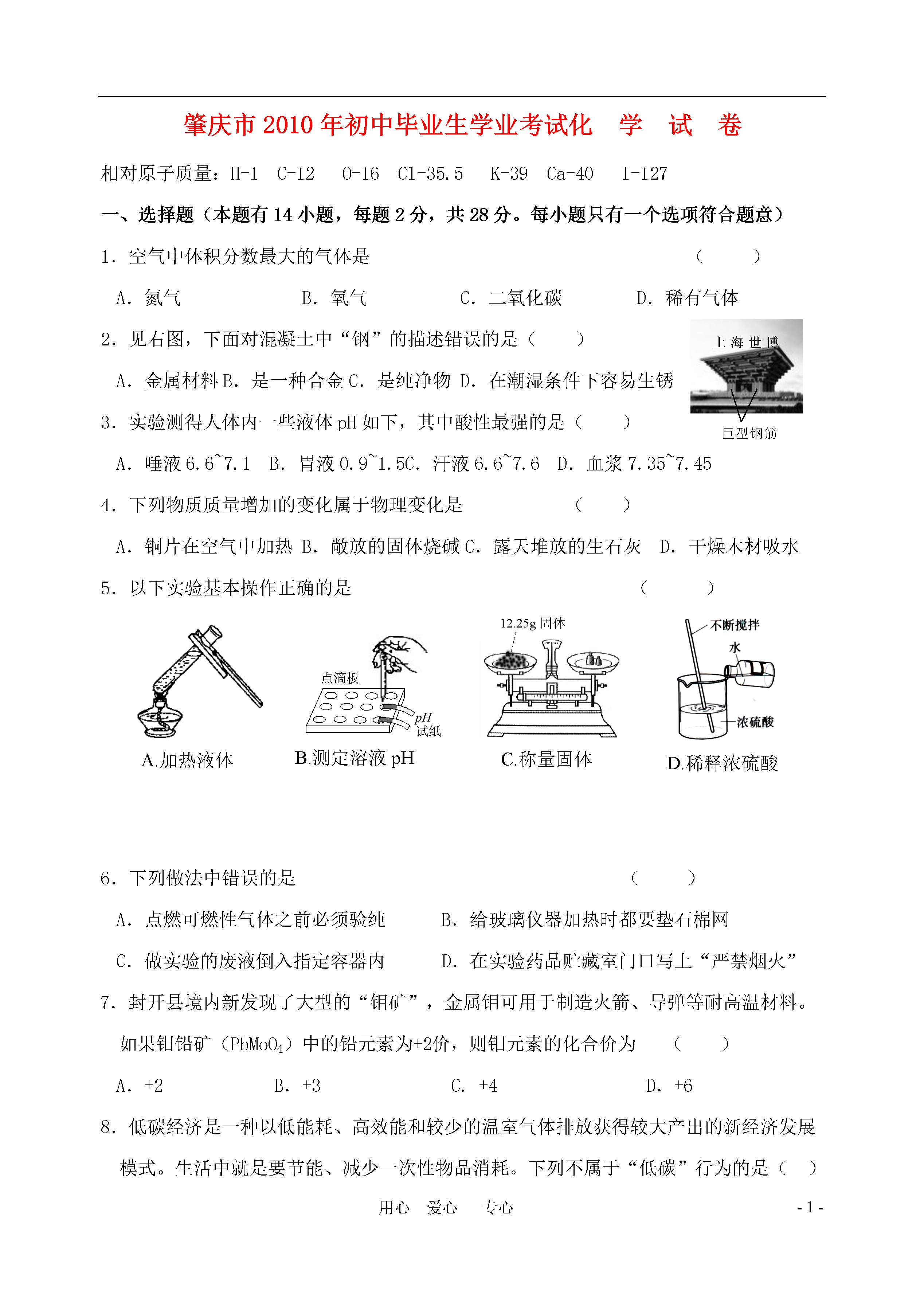-1-用心爱心专心肇庆市2010年初中毕业生学业考试化学试卷相对原子质量:H-1C-12O-16Cl-35.5K-39Ca-40I-127一、选择题(本题有14小题,每题2分,共28分。每小题只有一个选项符合题意)1.空气中体积分数最大的气体是()A.氮气B.氧气C.二氧化碳D.稀有气体上海世博会中国馆巨型钢筋混凝土2.见右图,下面对混凝土中“钢”的描述错误的是()A.金属材料B.是一种合金C.是纯净物D.在潮湿条件下容易生锈3.实验测得人体内一些液体pH如下,其中酸性最强的是()A.唾液6.6~7.1B.胃液0.9~1.5C.汗液6.6~7.6D.血浆7.35~7.454.下列物质质量增加的变化属于物理变化是()A.铜片在空气中加热B.敞放的固体烧碱C.露天堆放的生石灰D.干燥木材吸水5.以下实验基本操作正确的是()12.25g固体A.加热液体B.测定溶液pHC.称量固体D.稀释浓硫酸pH试纸点滴板6.下列做法中错误的是()A.点燃可燃性气体之前必须验纯B.给玻璃仪器加热时都要垫石棉网C.做实验的废液倒入指定容器内D.在实验药品贮藏室门口写上“严禁烟火”7.封开县境内新发现了大型的“钼矿”,金属钼可用于制造火箭、导弹等耐高温材料。如果钼铅矿(PbMoO4)中的铅元素为+2价,则钼元素的化合价为()A.+2B.+3C.+4D.+68.低碳经济是一种以低能耗、高效能和较少的温室气体排放获得较大产出的新经济发展模式。生活中就是要节能、减少一次性物品消耗。下列不属于“低碳”行为的是()A.少用冰箱储存食物B.出门时随手关闭电器电源C.购物时尽量使用一次性塑料袋D.用节能灯替换家里的白炽灯泡氯化钠9.几种物质的溶解度曲线如右图。则下列说法正确的是()A.氯化铵的溶解度最大B.随着温度升高,硫酸钠的溶解度不断增大C.40℃时硫酸钠饱和溶液溶质的质量分数为50%D.把40℃时饱和溶液降温到20℃,硫酸钠析出晶体最多10.下列化学方程式所表示的化学反应能发生的是()A.Cu+H2SO4CuSO4+H2↑B.Fe+Zn(NO3)2Fe(NO3)2+Zn↓C.CuCl2+2NaOHCu(OH)2↓+2NaClD.Na2CO3+2KNO3K2CO3+2NaNO311.下列各组物质,能在pH=1的溶液中大量共存,且形成无色溶液的是()A.NaNO3HCINa2SO4B.NaNO3NaCICuSO4C.NaCINa2SO4Na2CO3D.NaOHBaCI2Na2SO412.相同质量的M、N两种活泼金属,分别与足量质量分数为8%的盐酸反应(M、N在生成物中均为+2价),生成H2质量和反应时间的关系如右图。下列叙述正确的是()A.金属的活泼性N>MB.两个反应生成H2的体积相等C.相对原子质量N>MD.两个反应消耗盐酸的质量一定相等13.向100ml硫酸铜溶液中加入一定量的铁粉充分反应后过滤。下列情况可能出现的是()A.滤液只有硫酸铜,滤出固体只有铁B.滤液只有硫酸亚铁,滤出固体为铁、铜C.滤液只有硫酸铜、滤出固体只有铜D.滤液有硫酸亚铁、硫酸铜,滤出固体为铁14.下列对某一主题的知识归纳,全部正确的一组是()A.水资源B.化学与健康废水——生活污水直接排放硬水和软水——可用肥皂水来检验人体缺乏维生素B——引起坏血病铁、锌、钙元素——都是人体必须的微量元素C.微观粒子D.食品安全春天处处闻花香——分子在不停运动硫离子结构示意图为:工业酒精——含有甲醇等有毒物质,不能饮用黄曲霉素(C17H12O6)——属于有机物,食用霉变后含有黄曲霉素的食物可能诱发癌变二、填空题(本题有5小题,共22分)15.(4分)现有以下常见的物质:A.淀粉、B.小苏打、C.稀盐酸、D.活性炭、E.石灰石。请按要求填空(填字母):(1)能吸附冰箱的异味的是;(2)使碘水变蓝色的是;(3)蒸馒头时常用到的物质是;(4)可用于金属表面除锈的是。面料:纯羊毛内充物:聚酯纤维16.(3分)右下图所示为上海世博会吉祥物“海宝”毛绒玩具。请回答:(1)图中两种材料中,属于合成纤维的是_______________;与天然纤维相比,合成纤维的缺点之一是(填一点)。(2)聚酯纤维仅由C、H、O三种元素组成,则其在空气中完全燃烧的产物有H2O和______(写化学式)。17.(4分)请回答以下生活中的问题:(1)“沙里淘金”说明黄金在自然界中能够以(填:“单质”、“化合物”)形式存在。(2)通常所说的煤气中毒实际是由其中的(填化学式)引起的中毒。(3)某农户种的玉米出现倒伏现象,应建议他使用化肥