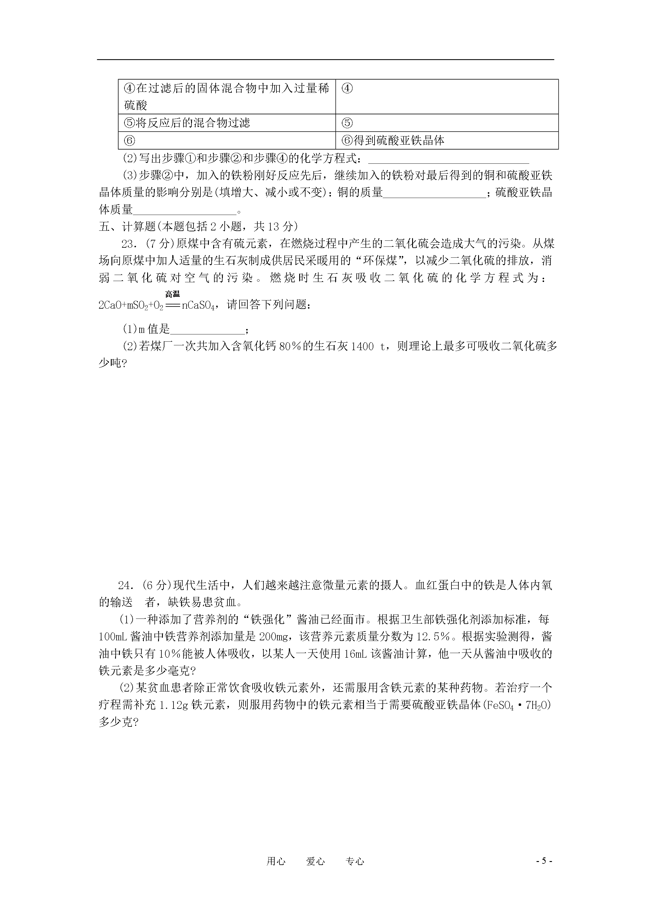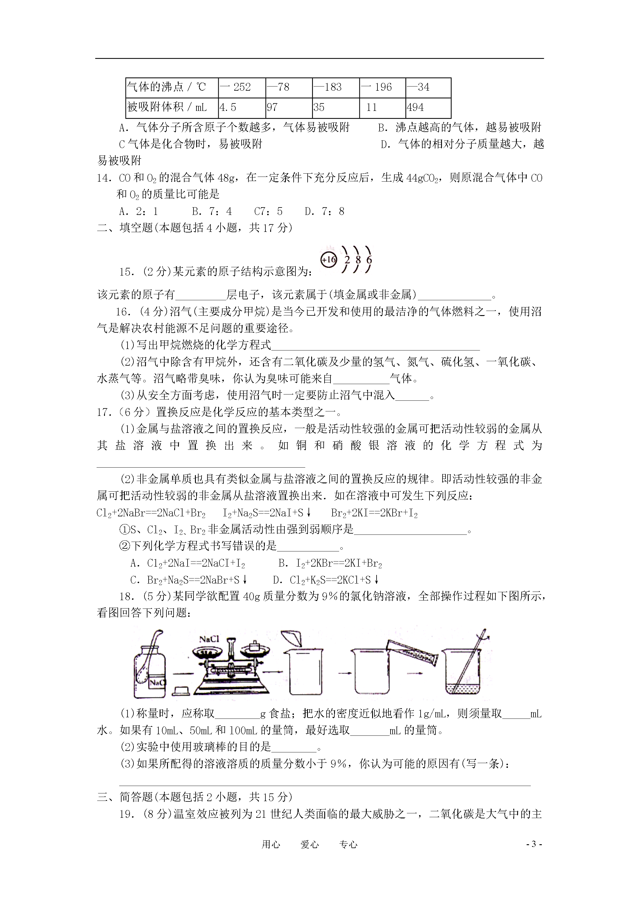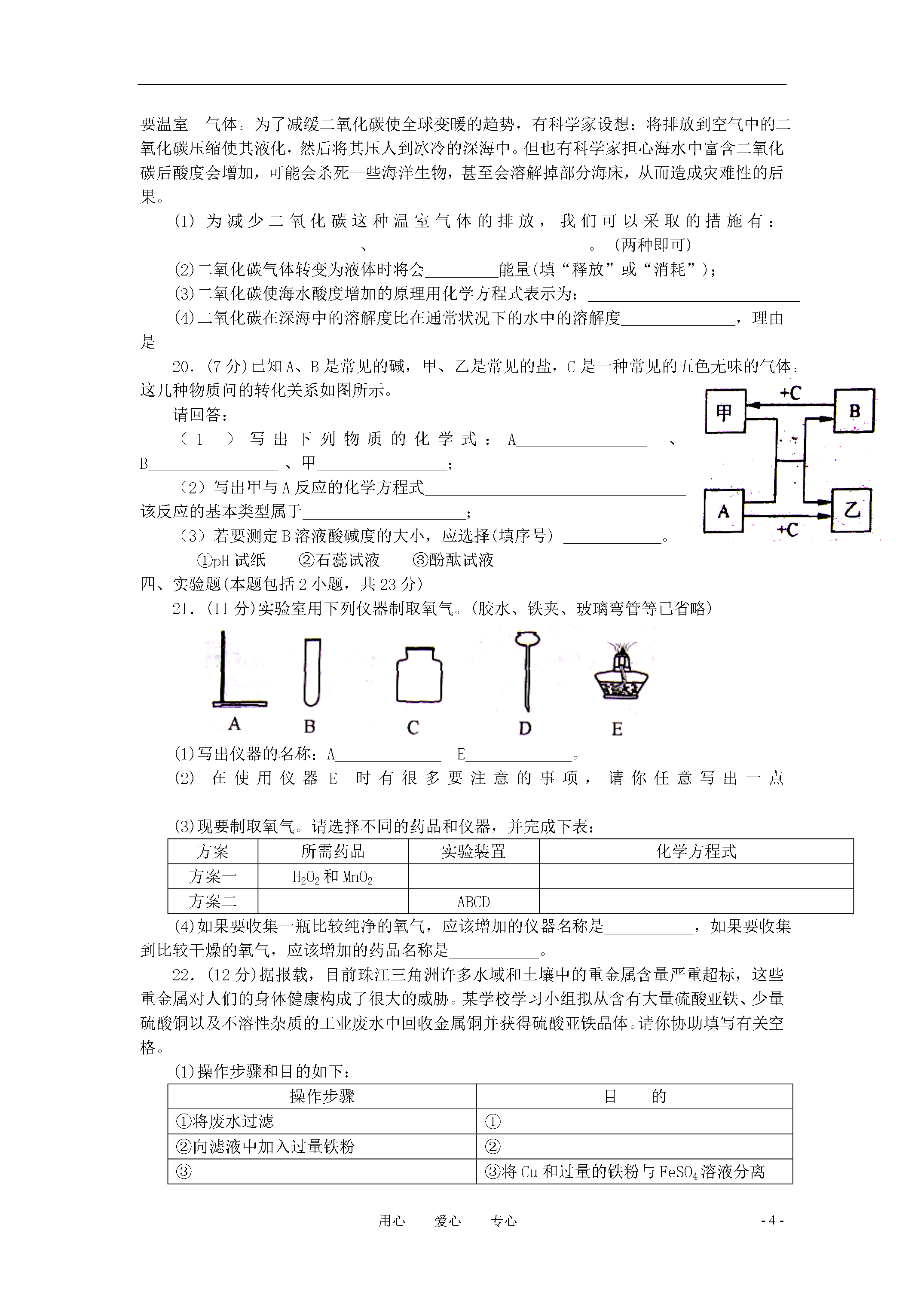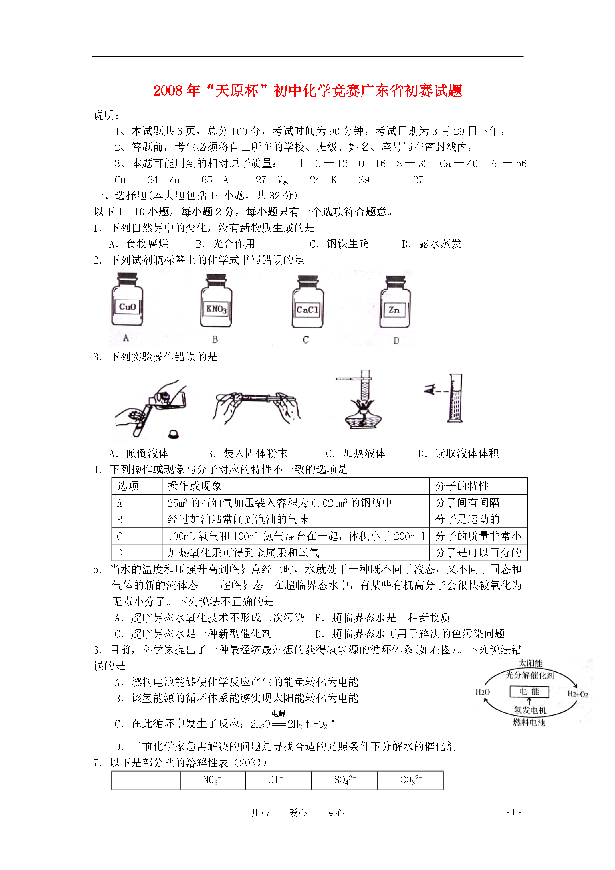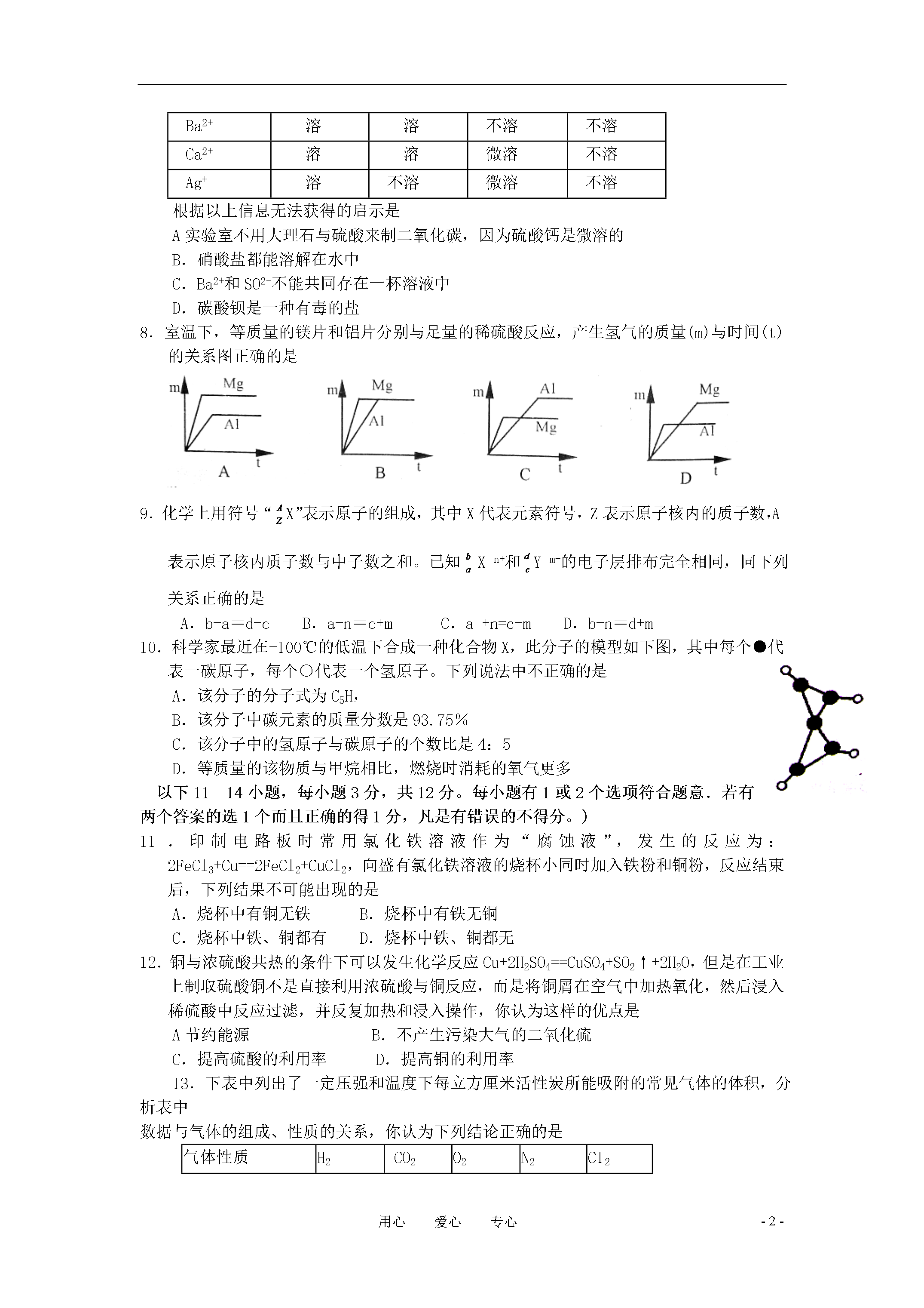 -8-用心爱心专心2008年“天原杯”初中化学竞赛广东省初赛试题说明:1、本试题,总分100分,考试时间为90分钟。考试日期为3月29日下午。2、答题前,考生必须将自己所在的学校、班级、姓名、座号写在密封线内。3、本题可能用到的相对原子质量:H—lC一12O—16S一32Ca一40Fe一56Cu——64Zn——65A1——27Mg——24K——391——127一、选择题(本大题包括14小题,共32分)以下1—10小题,每小题2分,每小题只有一个选项符合题意。1.下列自然界中的变化,没有新物质生成的是A.食物腐烂B.光合作用C.钢铁生锈D.露水蒸发2.下列试剂瓶标签上的化学式书写错误的是3.下列实验操作错误的是A.倾倒液体B.装入固体粉末C.加热液体D.读取液体体积4.下列操作或现象与分子对应的特性不一致的选项是选项操作或现象分子的特性A25m3的石油气加压装入容积为0.024m3的钢瓶中分子间有间隔B经过加油站常闻到汽油的气味分子是运动的C100mL氧气和100ml氮气混合在一起,体积小于200ml分子的质量非常小D加热氧化汞可得到金属汞和氧气分子是可以再分的5.当水的温度和压强升高到临界点经上时,水就处于一种既不同于液态,又不同于固态和气体的新的流体态——超临界态。在超临界态水中,有某些有机高分子会很快被氧化为无毒小分子。下列说法不正确的是A.超临界态水氧化技术不形成二次污染B.超临界态水是一种新物质C.超临界态水足一种新型催化剂D.超临界态水可用于解决的色污染问题6.目前,科学家提出了一种最经济最州想的获得氢能源的循环体系(如右图)。下列说法错误的是A.燃料电池能够使化学反应产生的能量转化为电能B.该氢能源的循环体系能够实现太阳能转化为电能C.在此循环中发生了反应:2H2O2H2↑+O2↑D.目前化学家急需解决的问题是寻找合适的光照条件下分解水的催化剂7.以下是部分盐的溶解性表(20℃)N03-Cl-SO42-C032-Ba2+溶溶不溶不溶Ca2+溶溶微溶不溶Ag+溶不溶微溶不溶根据以上信息无法获得的启示是A实验室不用大理石与硫酸来制二氧化碳,因为硫酸钙是微溶的B.硝酸盐都能溶解在水中C.Ba2+和SO2-不能共同存在一杯溶液中D.碳酸钡是一种有毒的盐8.室温下,等质量的镁片和铝片分别与足量的稀硫酸反应,产生氢气的质量(m)与时间(t)的关系图正确的是9.化学上用符号“X”表示原子的组成,其中X代表元素符号,Z表示原子核内的质子数,A表示原子核内质子数与中子数之和。已知Xn+和Ym-的电子层排布完全相同,同下列关系正确的是A.b-a=d-cB.a-n=c+mC.a+n=c-mD.b-n=d+m10.科学家最近在-100℃的低温下合成一种化合物X,此分子的模型如下图,其中每个●代表一碳原子,每个○代表一个氢原子。下列说法中不正确的是A.该分子的分子式为C5H,B.该分子中碳元素的质量分数是93.75%C.该分子中的氢原子与碳原子的个数比是4:5D.等质量的该物质与甲烷相比,燃烧时消耗的氧气更多以下11—14小题,每小题3分,共12分。每小题有1或2个选项符合题意.若有两个答案的选1个而且正确的得1分,凡是有错误的不得分。)11.印制电路板时常用氯化铁溶液作为“腐蚀液”,发生的反应为:2FeCl3+Cu==2FeCl2+CuCl2,向盛有氯化铁溶液的烧杯小同时加入铁粉和铜粉,反应结束后,下列结果不可能出现的是A.烧杯中有铜无铁B.烧杯中有铁无铜C.烧杯中铁、铜都有D.烧杯中铁、铜都无12.铜与浓硫酸共热的条件下可以发生化学反应Cu+2H2SO4==CuSO4+SO2↑+2H2O,但是在工业上制取硫酸铜不是直接利用浓硫酸与铜反应,而是将铜屑在空气中加热氧化,然后浸入稀硫酸中反应过滤,并反复加热和浸入操作,你认为这样的优点是A节约能源B.不产生污染大气的二氧化硫C.提高硫酸的利用率D.提高铜的利用率13.下表中列出了一定压强和温度下每立方厘米活性炭所能吸附的常见气体的体积,分析表中数据与气体的组成、性质的关系,你认为下列结论正确的是气体性质H2CO2O2N2C12气体的沸点/℃一252—78—183一196—34被吸附体积/mL4.5973511494A.气体分子所含原子个数越多,气体易被吸附B.沸点越高的气体,越易被吸附C气体是化合物时,易被吸附D.气体的相对分子质量越大,越易被吸附14.CO和O2的混合气体48g,在一定条件下充分反应后,生成44gCO2,则原混合气体中CO和O2的质量比可能是A.2:1B.7:4C7:5D.7:8二、填空题(本题包括4小题,共17分)15.(2分)某元素的原子结构示意图为:该元素的原子有_________层电子,该元素属于(填金属或非金属)_____________。16.(4分)沼气(主要成