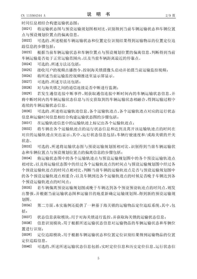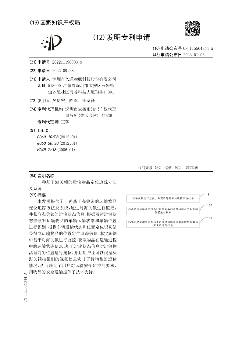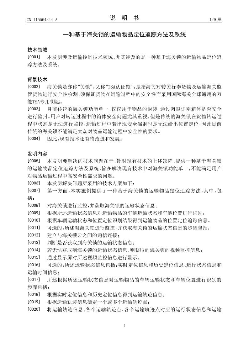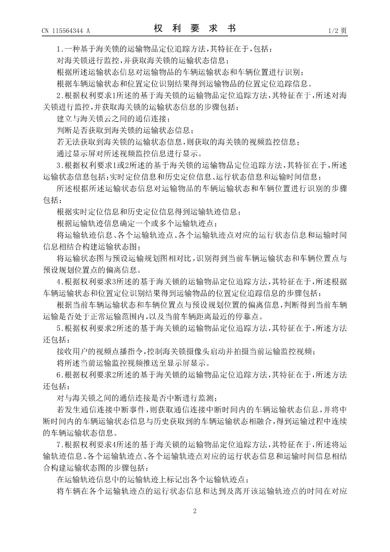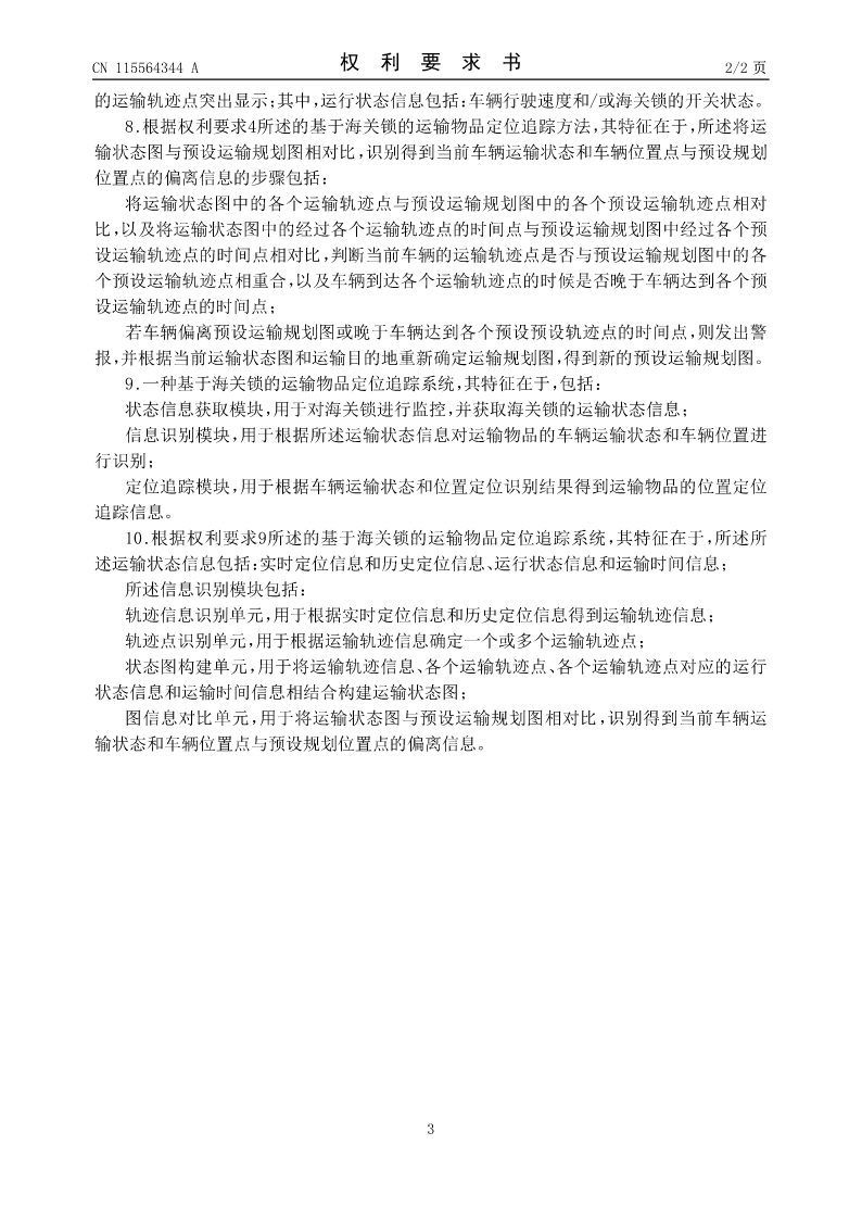 (19)国家知识产权局 (12)发明专利申请 (10)申请公布号CN115564344A (43)申请公布日2023.01.03 (21)申请号202211196883.9 (22)申请日2022.09.28 (71)申请人深圳市久通物联科技股份有限公司 地址518000广东省深圳市宝安区石岩街 道罗租社区海谷科技大厦T4栋4-301 (72)发明人吴良宏陈军李孝祯 (74)专利代理机构深圳市宏德雨知识产权代理 事务所(普通合伙)44526 专利代理师王攀 (51)Int.Cl. G06Q10/08(2012.01) G06Q50/30(2012.01) H04N7/18(2006.01) 权利要求书2页说明书9页附图2页 (54)发明名称 一种基于海关锁的运输物品定位追踪方法 及系统 (57)摘要 本发明提供了一种基于海关锁的运输物品 定位追踪方法及系统,通过对海关锁进行监控, 并获取海关锁的运输状态信息,根据所述运输状 态信息对运输物品的车辆运输状态和车辆位置 进行识别,根据车辆运输状态和位置定位识别结 果得到运输物品的位置定位追踪信息。本实施例 中基于对海关锁进行监控,获取物品在运输过程 中的运输状态信息,基于运输状态信息对运输物 品当前的位置进行定位,并且用户还可以根据从 海关锁拍摄到的视频信息实时了解物品的运输 情况,从而满足了用户对运输安全监控的要求, 用物品的安全运输提供了技术支持。 CN115564344A CN115564344A权利要求书1/2页 1.一种基于海关锁的运输物品定位追踪方法,其特征在于,包括: 对海关锁进行监控,并获取海关锁的运输状态信息; 根据所述运输状态信息对运输物品的车辆运输状态和车辆位置进行识别; 根据车辆运输状态和位置定位识别结果得到运输物品的位置定位追踪信息。 2.根据权利要求1所述的基于海关锁的运输物品定位追踪方法,其特征在于,所述对海 关锁进行监控,并获取海关锁的运输状态信息的步骤包括: 建立与海关锁云之间的通信连接; 判断是否获取到海关锁的运输状态信息; 若无法获取到海关锁的运输状态信息,则获取的海关锁的视频监控信息; 通过显示屏对所述视频监控信息进行显示。 3.根据权利要求1或2所述的基于海关锁的运输物品定位追踪方法,其特征在于,所述 运输状态信息包括:实时定位信息和历史定位信息、运行状态信息和运输时间信息; 所述根据所述运输状态信息对运输物品的车辆运输状态和车辆位置进行识别的步骤 包括: 根据实时定位信息和历史定位信息得到运输轨迹信息; 根据运输轨迹信息确定一个或多个运输轨迹点; 将运输轨迹信息、各个运输轨迹点、各个运输轨迹点对应的运行状态信息和运输时间 信息相结合构建运输状态图; 将运输状态图与预设运输规划图相对比,识别得到当前车辆运输状态和车辆位置点与 预设规划位置点的偏离信息。 4.根据权利要求3所述的基于海关锁的运输物品定位追踪方法,其特征在于,所述根据 车辆运输状态和位置定位识别结果得到运输物品的位置定位追踪信息的步骤包括: 根据当前车辆运输状态和车辆位置点与预设规划位置的偏离信息,判断得到当前车辆 运输是否处于正常运输范围内,以及当前车辆距离最近的停靠点。 5.根据权利要求2所述的基于海关锁的运输物品定位追踪方法,其特征在于,所述方法 还包括: 接收用户的视频点播指令,控制海关锁摄像头启动并拍摄当前运输监控视频; 将所述当前运输监控视频推送至显示屏显示。 6.根据权利要求2所述的基于海关锁的运输物品定位追踪方法,其特征在于,所述方法 还包括: 对与海关锁之间的通信连接是否中断进行监测; 若发生通信连接中断事件,则获取通信连接中断时间内的车辆运输状态信息,并将中 断时间内的车辆运输状态信息与历史获取到的车辆运输状态相融合,得到运输过程中连续 的车辆运输状态信息。 7.根据权利要求4所述的基于海关锁的运输物品定位追踪方法,其特征在于,所述将运 输轨迹信息、各个运输轨迹点、各个运输轨迹点对应的运行状态信息和运输时间信息相结 合构建运输状态图的步骤包括: 在运输轨迹信息中的运输轨迹上标记出各个运输轨迹点; 将车辆在各个运输轨迹点的运行状态信息和达到及离开该运输轨迹点的时间在对应 2 CN115564344A权利要求书2/2页 的运输轨迹点突出显示;其中,运行状态信息包括:车辆行驶速度和/或海关锁的开关状态。 8.根据权利要求4所述的基于海关锁的运输物品定位追踪方法,其特征在于,所述将运 输状态图与预设运输规划图相对比,识别得到当前车辆运输状态和车辆位置点与预设规划 位置点的偏离信息的步骤包括: 将运输状态图中的各个运输轨迹点与预设运输规划图中的各个预设运输轨迹点相对 比,以及将运输状态图中的经过各个运输轨迹点的时间点与预设运输规划图中经过各个预 设运