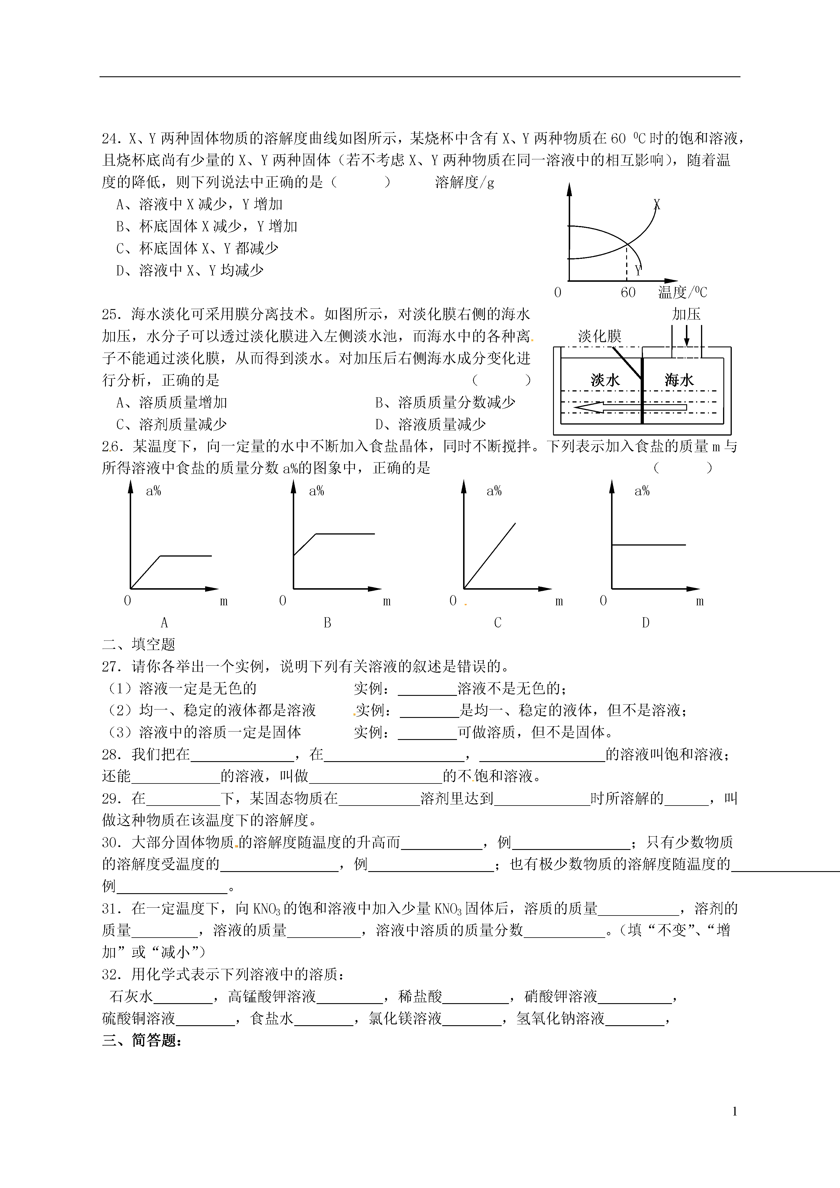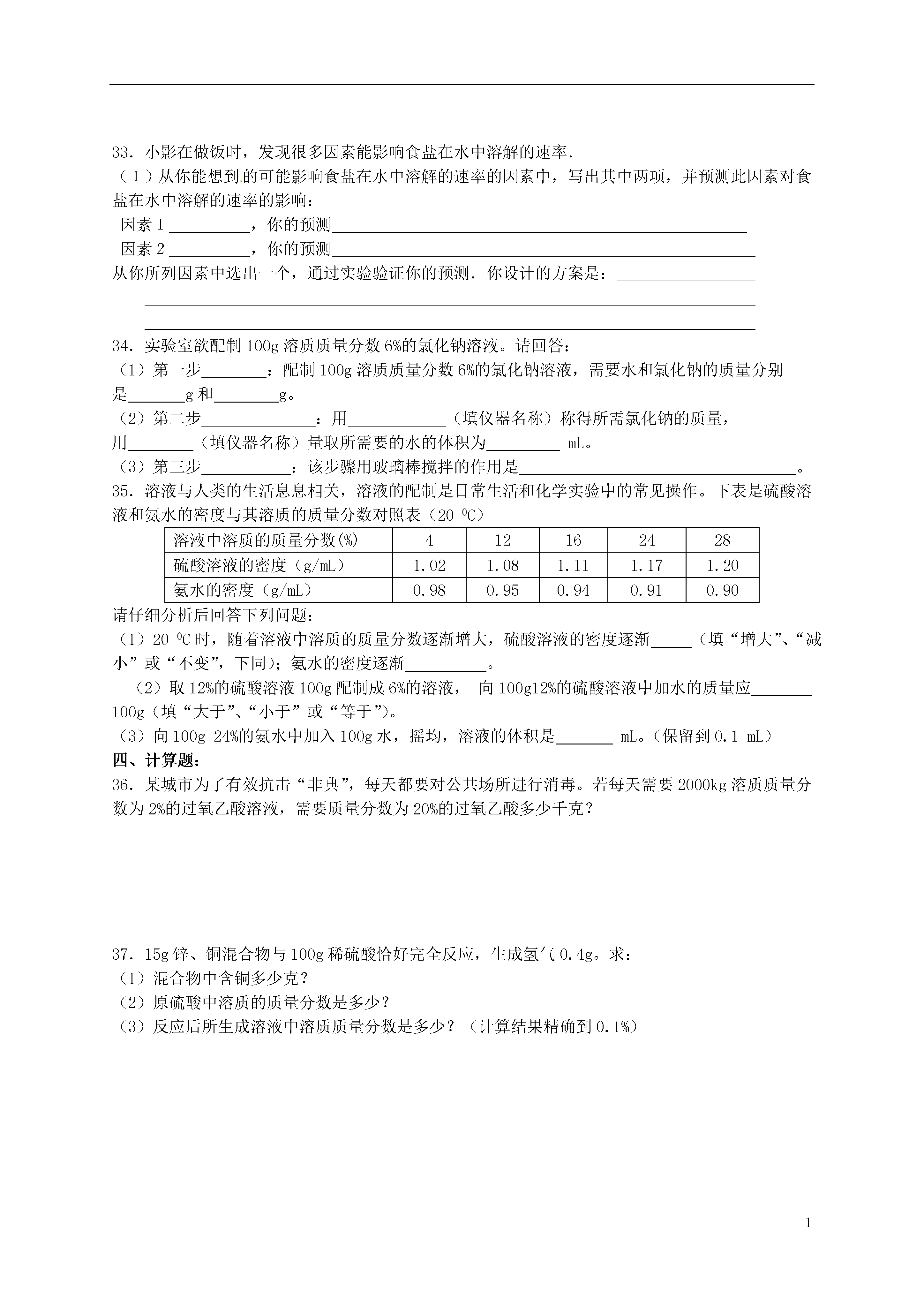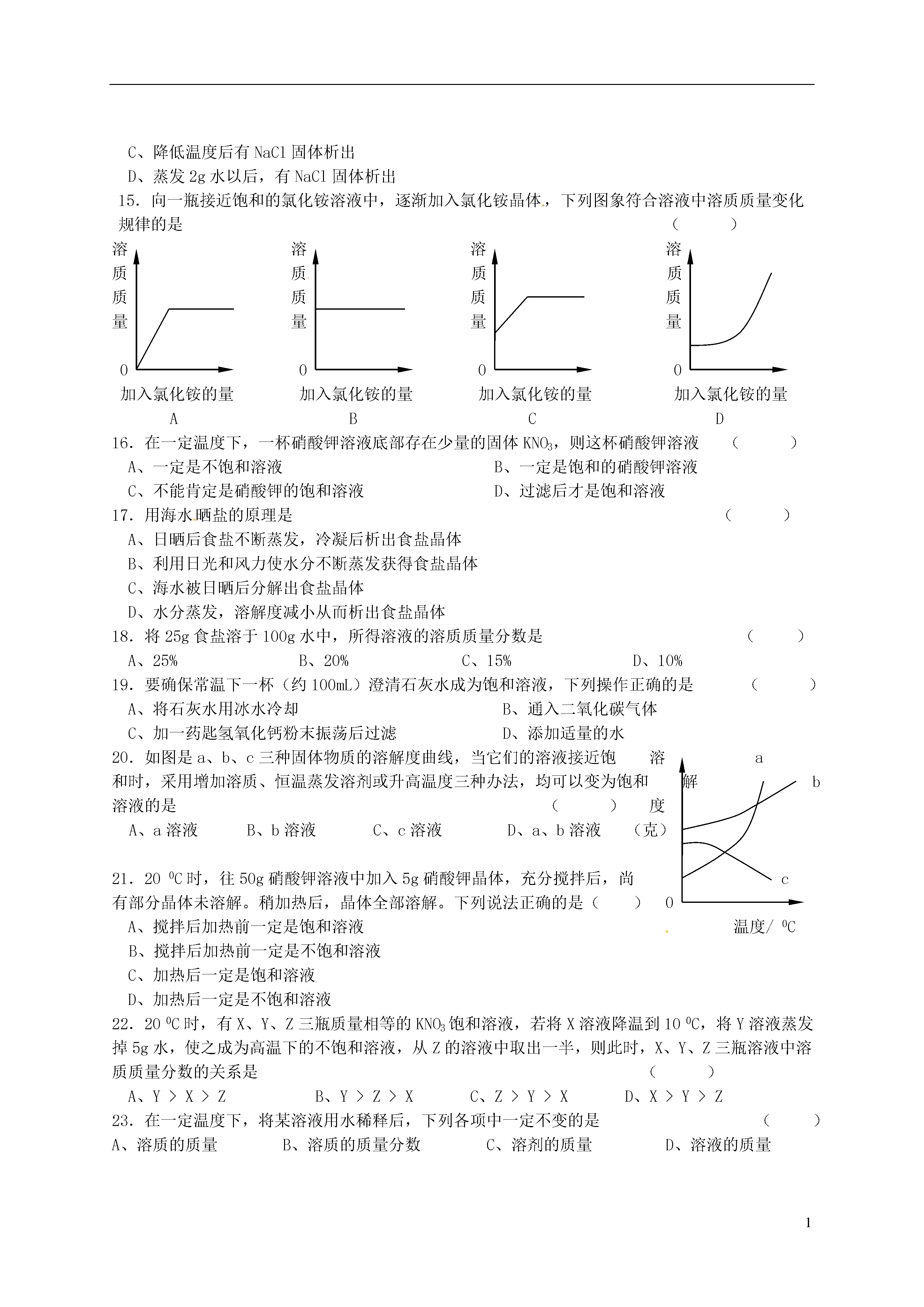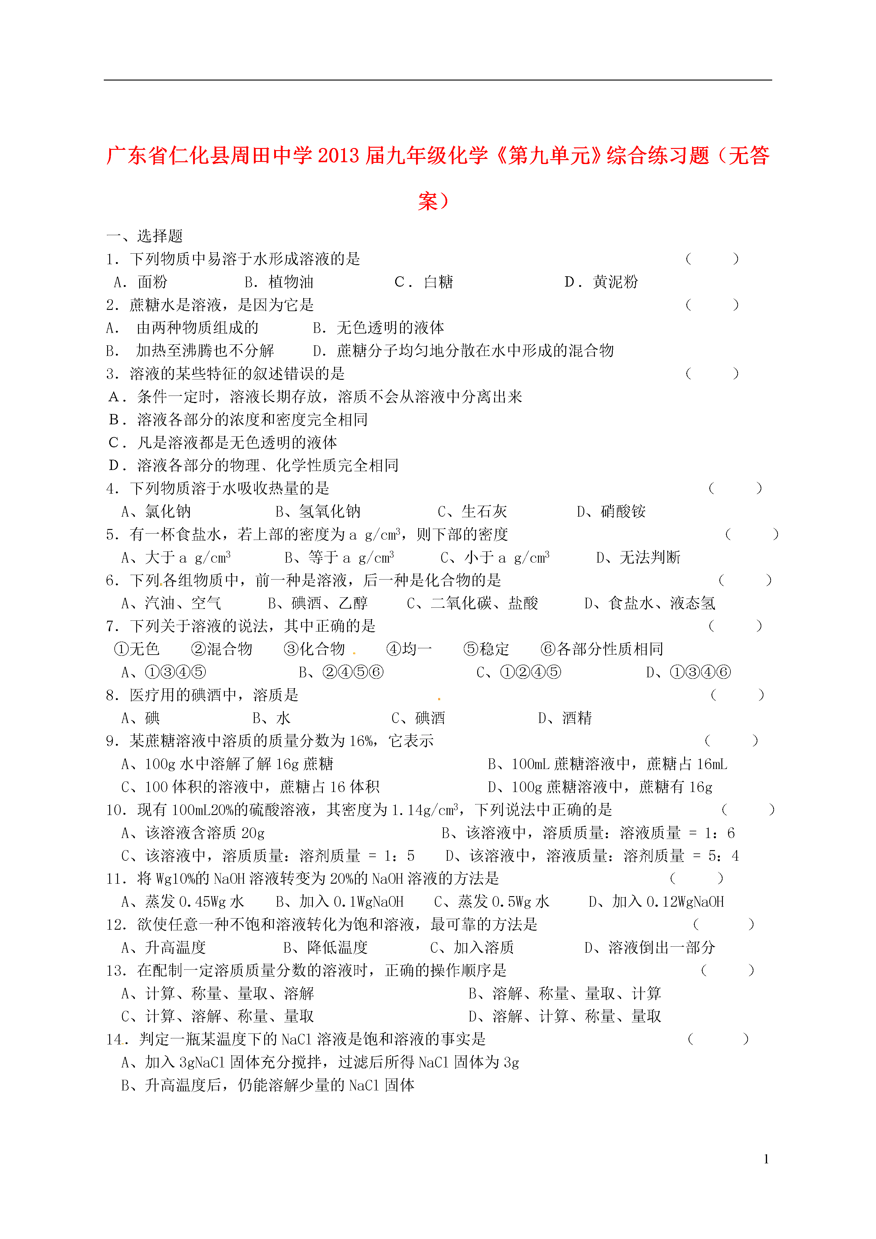 1广东省仁化县周田中学2013届九年级化学《第九单元》综合练习题(无答案)一、选择题1.下列物质中易溶于水形成溶液的是()A.面粉B.植物油C.白糖D.黄泥粉2.蔗糖水是溶液,是因为它是()由两种物质组成的B.无色透明的液体加热至沸腾也不分解D.蔗糖分子均匀地分散在水中形成的混合物3.溶液的某些特征的叙述错误的是()A.条件一定时,溶液长期存放,溶质不会从溶液中分离出来B.溶液各部分的浓度和密度完全相同C.凡是溶液都是无色透明的液体D.溶液各部分的物理﹑化学性质完全相同4.下列物质溶于水吸收热量的是()A、氯化钠B、氢氧化钠C、生石灰D、硝酸铵5.有一杯食盐水,若上部的密度为ag/cm3,则下部的密度()A、大于ag/cm3B、等于ag/cm3C、小于ag/cm3D、无法判断6.下列各组物质中,前一种是溶液,后一种是化合物的是()A、汽油、空气B、碘酒、乙醇C、二氧化碳、盐酸D、食盐水、液态氢7.下列关于溶液的说法,其中正确的是()①无色②混合物③化合物④均一⑤稳定⑥各部分性质相同A、①③④⑤B、②④⑤⑥C、①②④⑤D、①③④⑥8.医疗用的碘酒中,溶质是()A、碘B、水C、碘酒D、酒精9.某蔗糖溶液中溶质的质量分数为16%,它表示()A、100g水中溶解了解16g蔗糖B、100mL蔗糖溶液中,蔗糖占16mLC、100体积的溶液中,蔗糖占16体积D、100g蔗糖溶液中,蔗糖有16g10.现有100mL20%的硫酸溶液,其密度为1.14g/cm3,下列说法中正确的是()A、该溶液含溶质20gB、该溶液中,溶质质量:溶液质量=1:6C、该溶液中,溶质质量:溶剂质量=1:5D、该溶液中,溶液质量:溶剂质量=5:411.将Wg10%的NaOH溶液转变为20%的NaOH溶液的方法是()A、蒸发0.45Wg水B、加入0.1WgNaOHC、蒸发0.5Wg水D、加入0.12WgNaOH12.欲使任意一种不饱和溶液转化为饱和溶液,最可靠的方法是()A、升高温度B、降低温度C、加入溶质D、溶液倒出一部分13.在配制一定溶质质量分数的溶液时,正确的操作顺序是()A、计算、称量、量取、溶解B、溶解、称量、量取、计算C、计算、溶解、称量、量取D、溶解、计算、称量、量取14.判定一瓶某温度下的NaCl溶液是饱和溶液的事实是()A、加入3gNaCl固体充分搅拌,过滤后所得NaCl固体为3gB、升高温度后,仍能溶解少量的NaCl固体C、降低温度后有NaCl固体析出D、蒸发2g水以后,有NaCl固体析出15.向一瓶接近饱和的氯化铵溶液中,逐渐加入氯化铵晶体,下列图象符合溶液中溶质质量变化规律的是()溶溶溶溶质质质质质质质质量量量量0000加入氯化铵的量加入氯化铵的量加入氯化铵的量加入氯化铵的量ABCD16.在一定温度下,一杯硝酸钾溶液底部存在少量的固体KNO3,则这杯硝酸钾溶液()A、一定是不饱和溶液B、一定是饱和的硝酸钾溶液C、不能肯定是硝酸钾的饱和溶液D、过滤后才是饱和溶液17.用海水晒盐的原理是()A、日晒后食盐不断蒸发,冷凝后析出食盐晶体B、利用日光和风力使水分不断蒸发获得食盐晶体C、海水被日晒后分解出食盐晶体D、水分蒸发,溶解度减小从而析出食盐晶体18.将25g食盐溶于100g水中,所得溶液的溶质质量分数是()A、25%B、20%C、15%D、10%19.要确保常温下一杯(约100mL)澄清石灰水成为饱和溶液,下列操作正确的是()A、将石灰水用冰水冷却B、通入二氧化碳气体C、加一药匙氢氧化钙粉末振荡后过滤D、添加适量的水20.如图是a、b、c三种固体物质的溶解度曲线,当它们的溶液接近饱溶a和时,采用增加溶质、恒温蒸发溶剂或升高温度三种办法,均可以变为饱和解b溶液的是()度A、a溶液B、b溶液C、c溶液D、a、b溶液(克)21.200C时,往50g硝酸钾溶液中加入5g硝酸钾晶体,充分搅拌后,尚c有部分晶体未溶解。稍加热后,晶体全部溶解。下列说法正确的是()0A、搅拌后加热前一定是饱和溶液温度/0CB、搅拌后加热前一定是不饱和溶液C、加热后一定是饱和溶液D、加热后一定是不饱和溶液22.200C时,有X、Y、Z三瓶质量相等的KNO3饱和溶液,若将X溶液降温到100C,将Y溶液蒸发掉5g水,使之成为高温下的不饱和溶液,从Z的溶液中取出一半,则此时,X、Y、Z三瓶溶液中溶质质量分数的关系是()A、Y>X>ZB、Y>Z>XC、Z>Y>XD、X>Y>Z23.在一定温度下,将某溶液用水稀释后,下列各项中一定不变的是()A、溶质的质量B、溶质的质量分数C、溶剂的质量D、溶液的质量24.X、Y两种固体物质