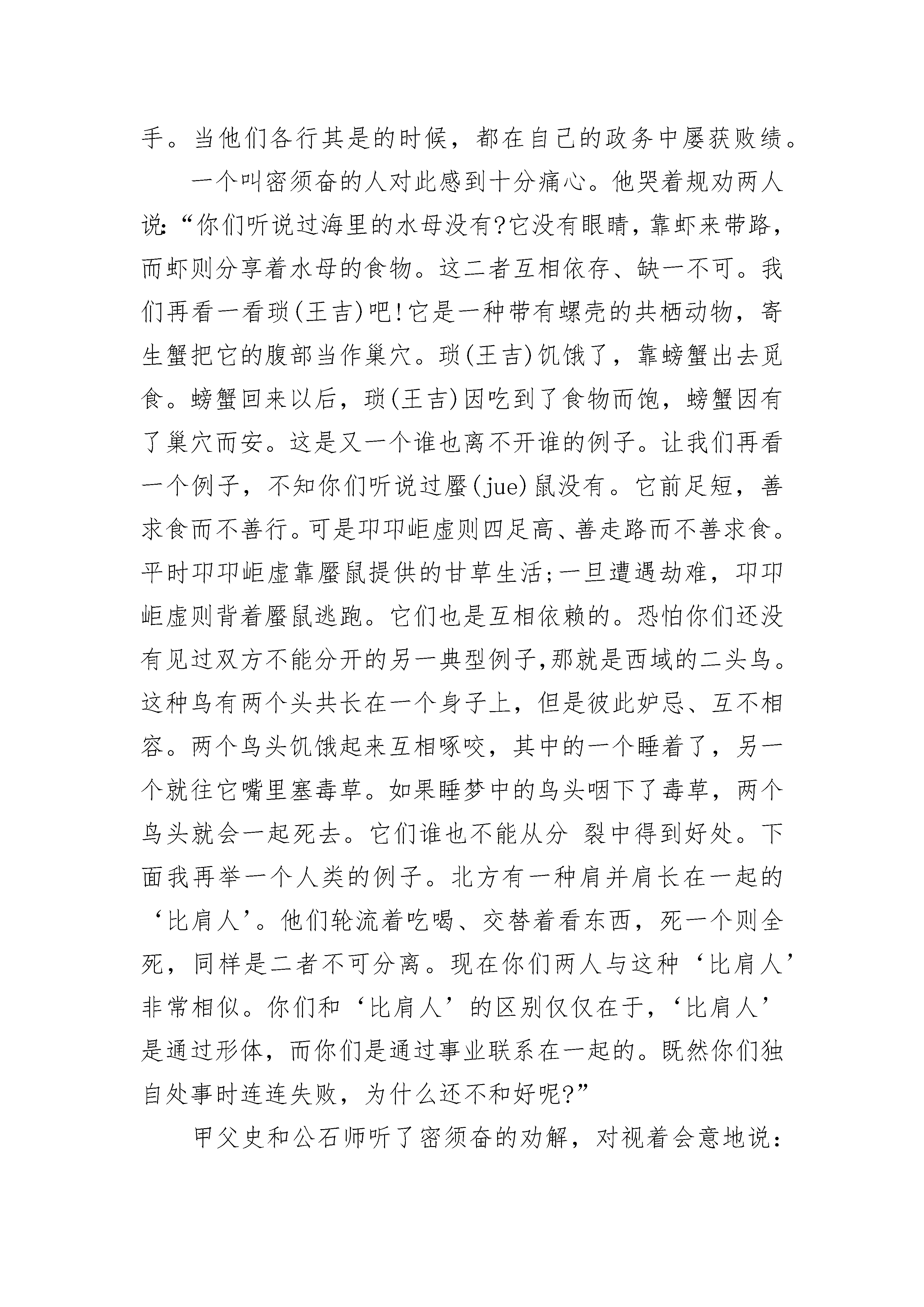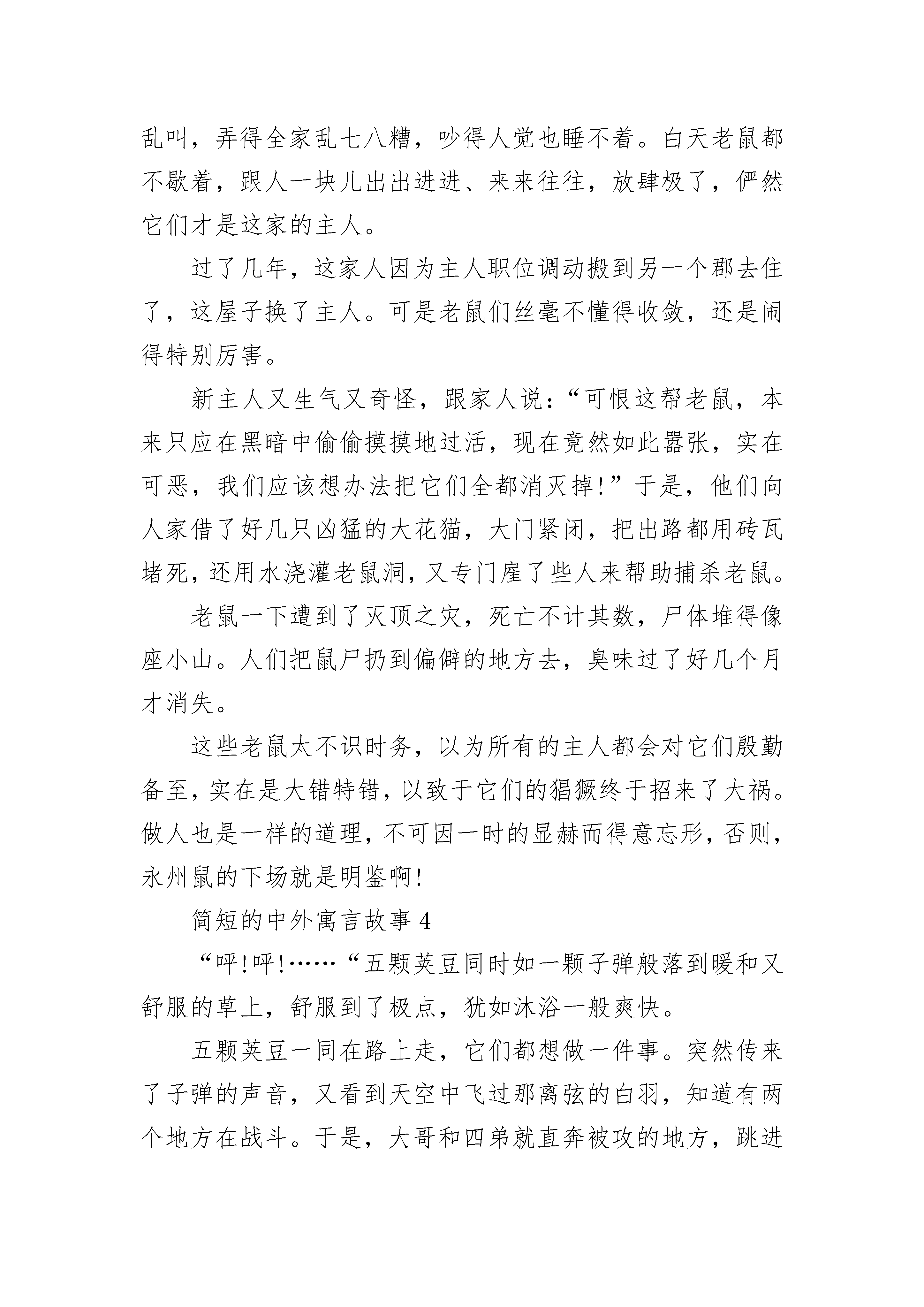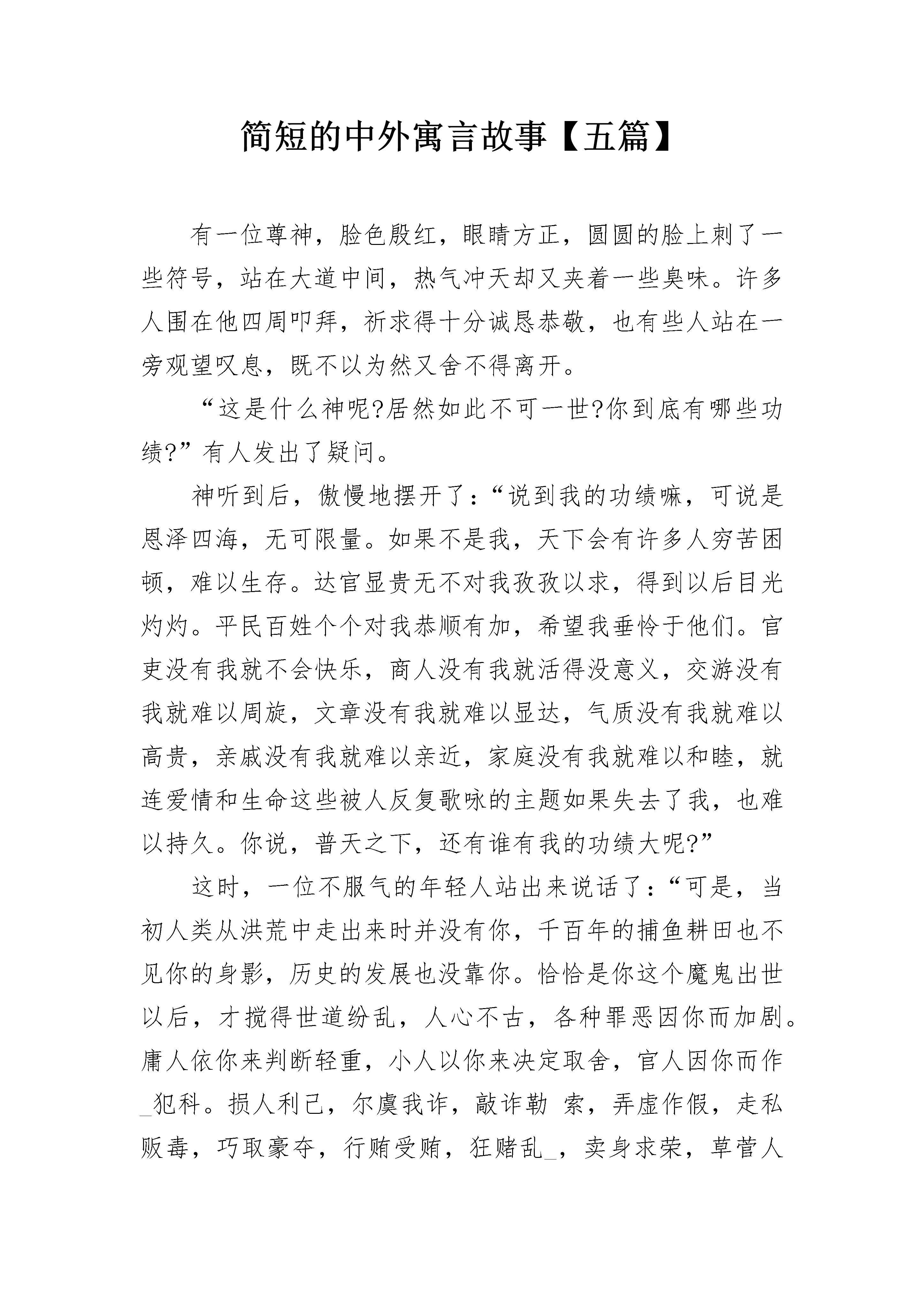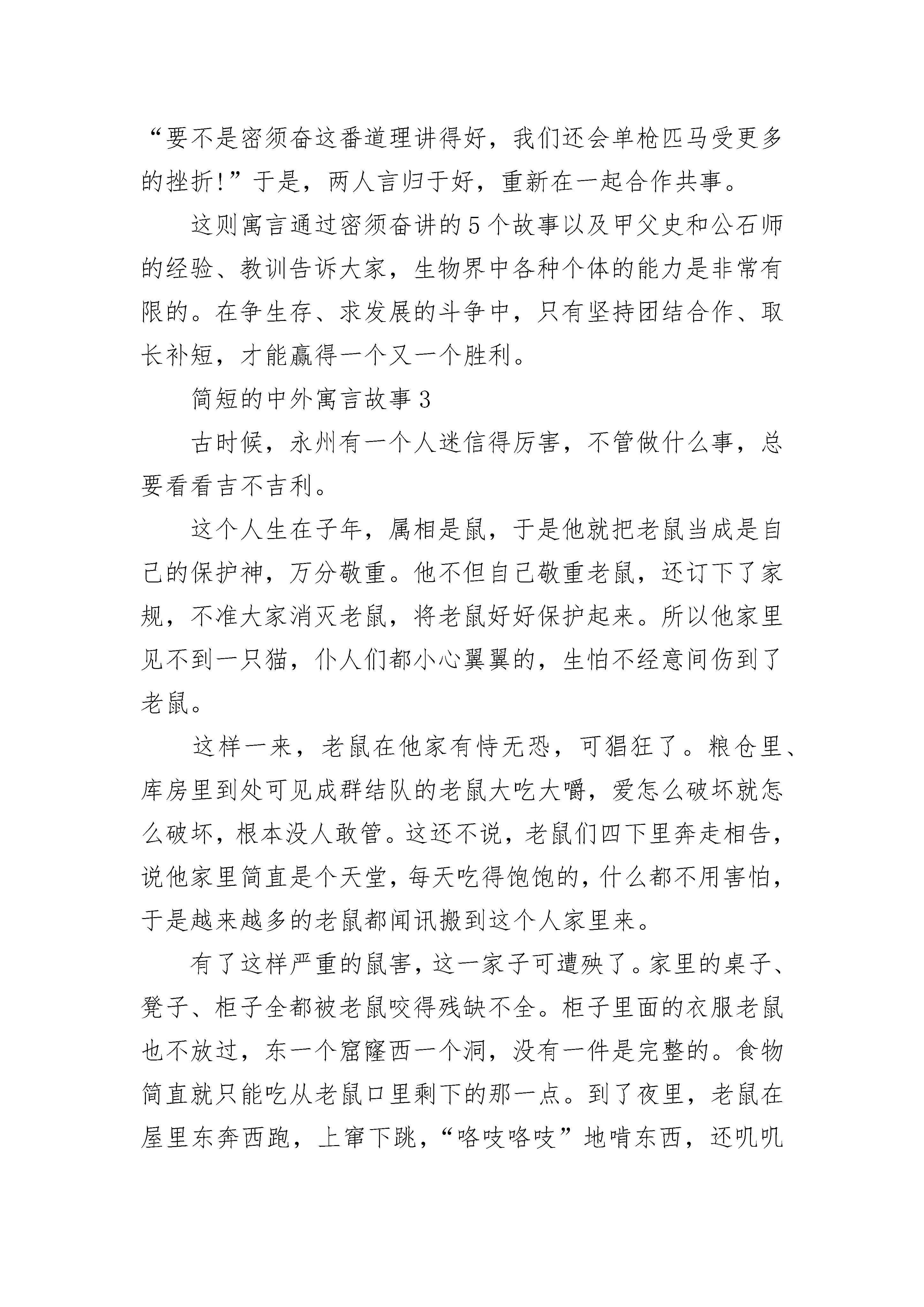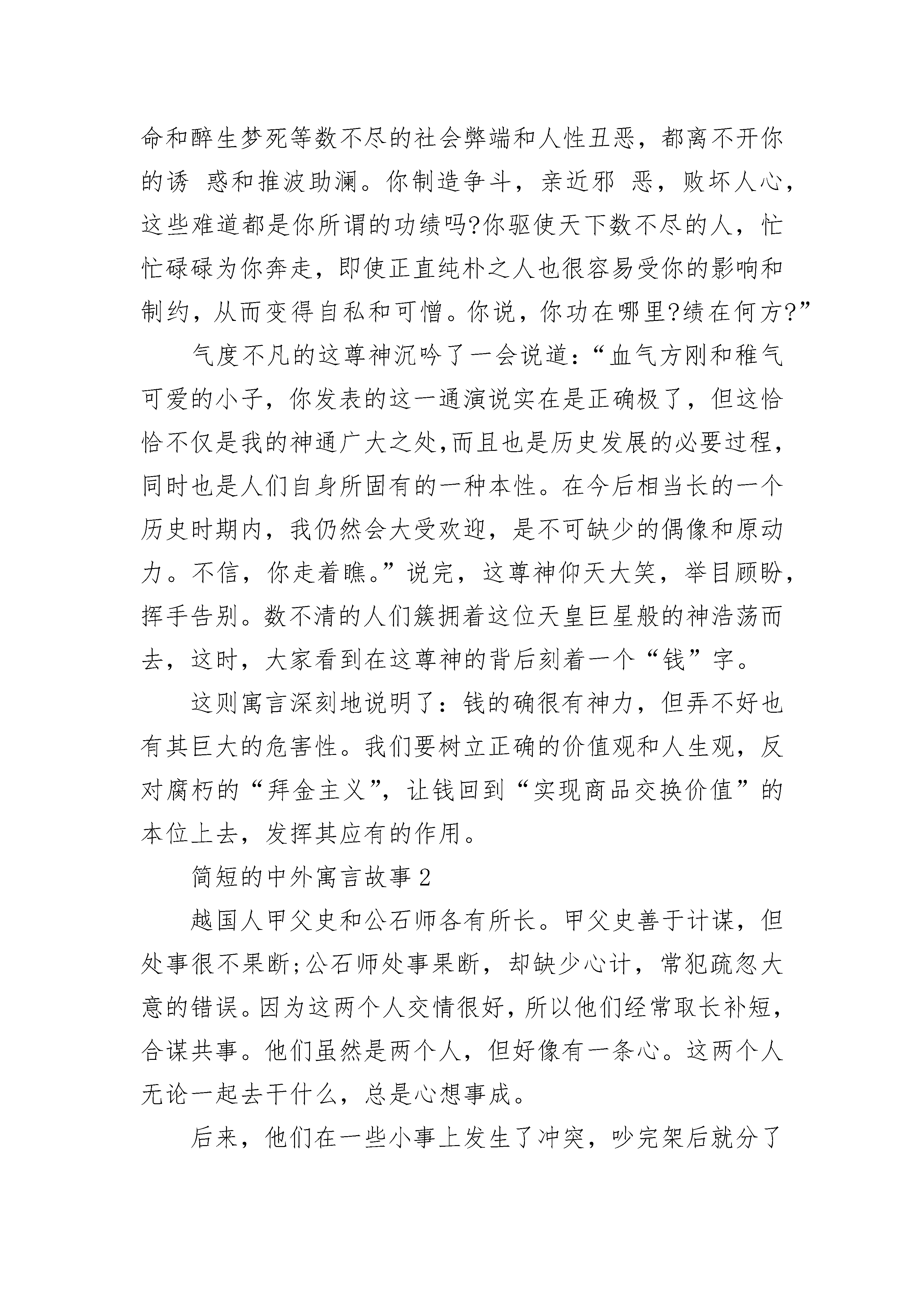 简短的中外寓言故事【五篇】有一位尊神,脸色殷红,眼睛方正,圆圆的脸上刺了一些符号,站在大道中间,热气冲天却又夹着一些臭味。许多人围在他四周叩拜,祈求得十分诚恳恭敬,也有些人站在一旁观望叹息,既不以为然又舍不得离开。“这是什么神呢?居然如此不可一世?你到底有哪些功绩?”有人发出了疑问。神听到后,傲慢地摆开了:“说到我的功绩嘛,可说是恩泽四海,无可限量。如果不是我,天下会有许多人穷苦困顿,难以生存。达官显贵无不对我孜孜以求,得到以后目光灼灼。平民百姓个个对我恭顺有加,希望我垂怜于他们。官吏没有我就不会快乐,商人没有我就活得没意义,交游没有我就难以周旋,文章没有我就难以显达,气质没有我就难以高贵,亲戚没有我就难以亲近,家庭没有我就难以和睦,就连爱情和生命这些被人反复歌咏的主题如果失去了我,也难以持久。你说,普天之下,还有谁有我的功绩大呢?”这时,一位不服气的年轻人站出来说话了:“可是,当初人类从洪荒中走出来时并没有你,千百年的捕鱼耕田也不见你的身影,历史的发展也没靠你。恰恰是你这个魔鬼出世以后,才搅得世道纷乱,人心不古,各种罪恶因你而加剧。庸人依你来判断轻重,小人以你来决定取舍,官人因你而作_犯科。损人利己,尔虞我诈,敲诈勒索,弄虚作假,走私贩毒,巧取豪夺,行贿受贿,狂赌乱_,卖身求荣,草菅人命和醉生梦死等数不尽的社会弊端和人性丑恶,都离不开你的诱惑和推波助澜。你制造争斗,亲近邪恶,败坏人心,这些难道都是你所谓的功绩吗?你驱使天下数不尽的人,忙忙碌碌为你奔走,即使正直纯朴之人也很容易受你的影响和制约,从而变得自私和可憎。你说,你功在哪里?绩在何方?”气度不凡的这尊神沉吟了一会说道:“血气方刚和稚气可爱的小子,你发表的这一通演说实在是正确极了,但这恰恰不仅是我的神通广大之处,而且也是历史发展的必要过程,同时也是人们自身所固有的一种本性。在今后相当长的一个历史时期内,我仍然会大受欢迎,是不可缺少的偶像和原动力。不信,你走着瞧。”说完,这尊神仰天大笑,举目顾盼,挥手告别。数不清的人们簇拥着这位天皇巨星般的神浩荡而去,这时,大家看到在这尊神的背后刻着一个“钱”字。这则寓言深刻地说明了:钱的确很有神力,但弄不好也有其巨大的危害性。我们要树立正确的价值观和人生观,反对腐朽的“拜金主义”,让钱回到“实现商品交换价值”的本位上去,发挥其应有的作用。简短的中外寓言故事2越国人甲父史和公石师各有所长。甲父史善于计谋,但处事很不果断;公石师处事果断,却缺少心计,常犯疏忽大意的错误。因为这两个人交情很好,所以他们经常取长补短,合谋共事。他们虽然是两个人,但好像有一条心。这两个人无论一起去干什么,总是心想事成。后来,他们在一些小事上发生了冲突,吵完架后就分了手。当他们各行其是的时候,都在自己的政务中屡获败绩。一个叫密须奋的人对此感到十分痛心。他哭着规劝两人说:“你们听说过海里的水母没有?它没有眼睛,靠虾来带路,而虾则分享着水母的食物。这二者互相依存、缺一不可。我们再看一看琐(王吉)吧!它是一种带有螺壳的共栖动物,寄生蟹把它的腹部当作巢穴。琐(王吉)饥饿了,靠螃蟹出去觅食。螃蟹回来以后,琐(王吉)因吃到了食物而饱,螃蟹因有了巢穴而安。这是又一个谁也离不开谁的例子。让我们再看一个例子,不知你们听说过蟨(jue)鼠没有。它前足短,善求食而不善行。可是卭卭岠虚则四足高、善走路而不善求食。平时卭卭岠虚靠蟨鼠提供的甘草生活;一旦遭遇劫难,卭卭岠虚则背着蟨鼠逃跑。它们也是互相依赖的。恐怕你们还没有见过双方不能分开的另一典型例子,那就是西域的二头鸟。这种鸟有两个头共长在一个身子上,但是彼此妒忌、互不相容。两个鸟头饥饿起来互相啄咬,其中的一个睡着了,另一个就往它嘴里塞毒草。如果睡梦中的鸟头咽下了毒草,两个鸟头就会一起死去。它们谁也不能从分裂中得到好处。下面我再举一个人类的例子。北方有一种肩并肩长在一起的‘比肩人’。他们轮流着吃喝、交替着看东西,死一个则全死,同样是二者不可分离。现在你们两人与这种‘比肩人’非常相似。你们和‘比肩人’的区别仅仅在于,‘比肩人’是通过形体,而你们是通过事业联系在一起的。既然你们独自处事时连连失败,为什么还不和好呢?”甲父史和公石师听了密须奋的劝解,对视着会意地说:“要不是密须奋这番道理讲得好,我们还会单枪匹马受更多的挫折!”于是,两人言归于好,重新在一起合作共事。这则寓言通过密须奋讲的5个故事以及甲父史和公石师的经验、教训告诉大家,生物界中各种个体的能力是非常有限的。在争生存、求发展的斗争中,只有坚持团结合作、取长补短,才能赢得一个又一个胜利。简短的中外寓言故事3古时候,永州有一个人迷信得厉害,不管做什么事,总要看看吉不吉利。这个人生在子年,属相是鼠,于是他就把老鼠当成是自己的保护神,万分敬重。他不但自己敬重老鼠,还订下了家规,不准大家消灭老鼠