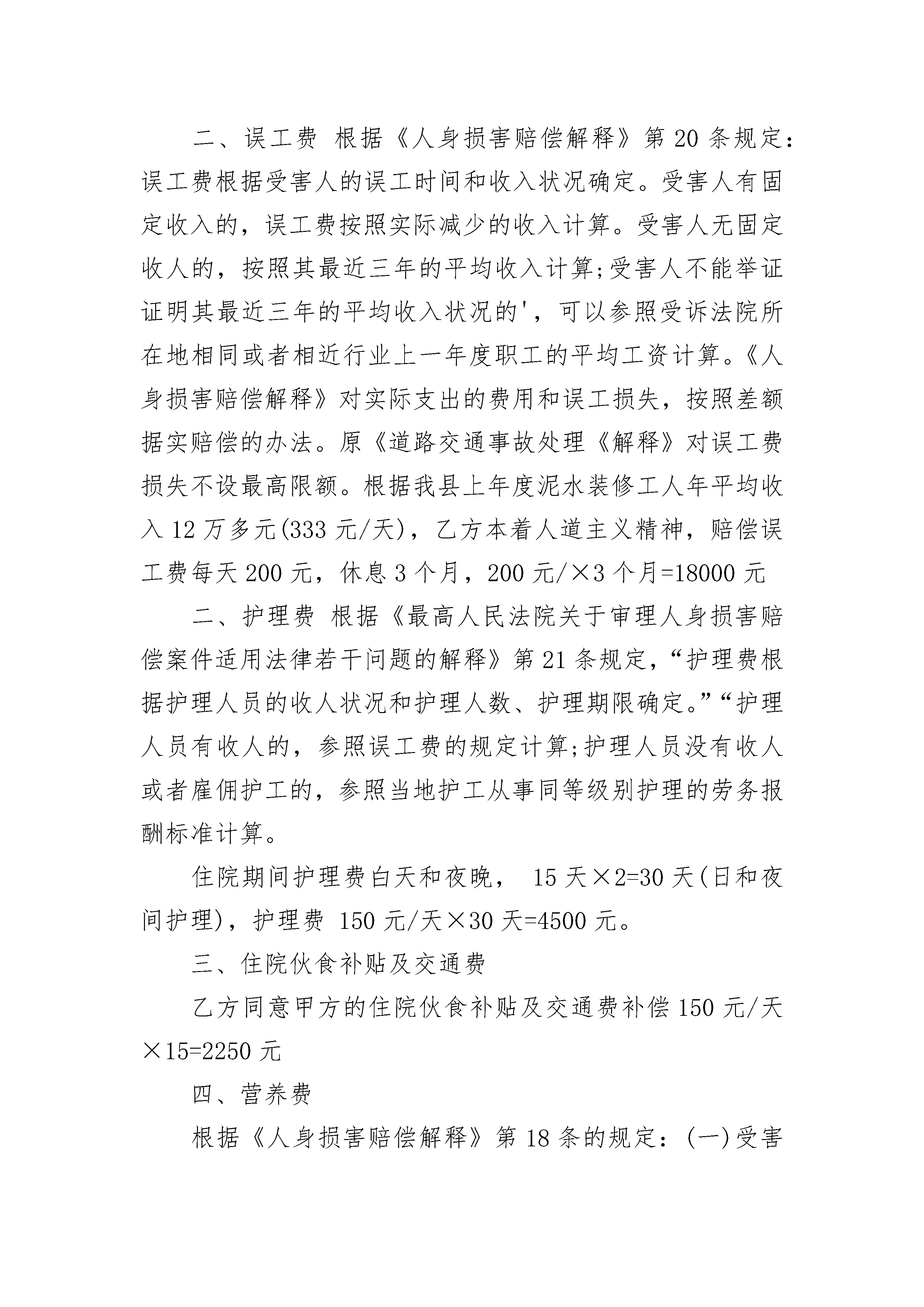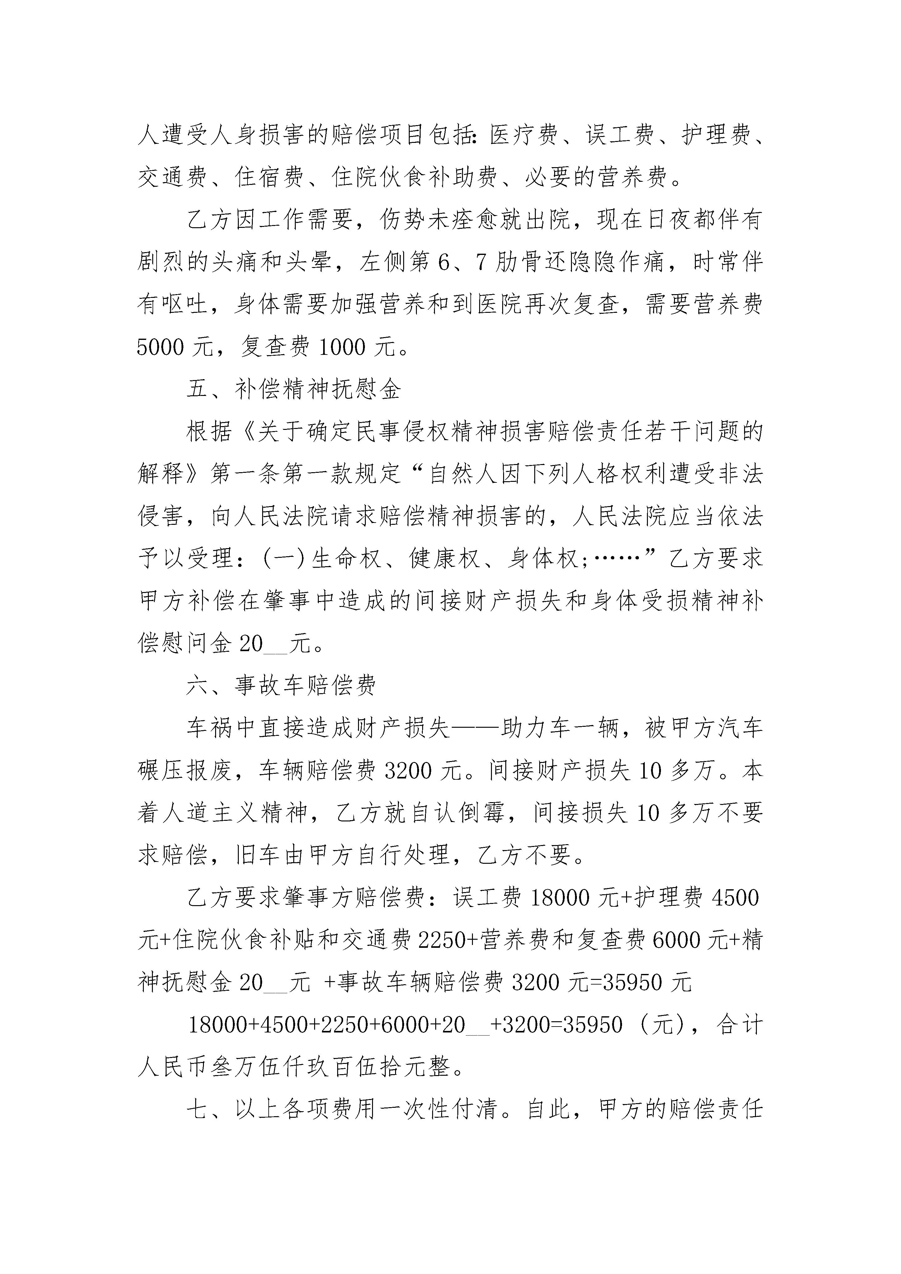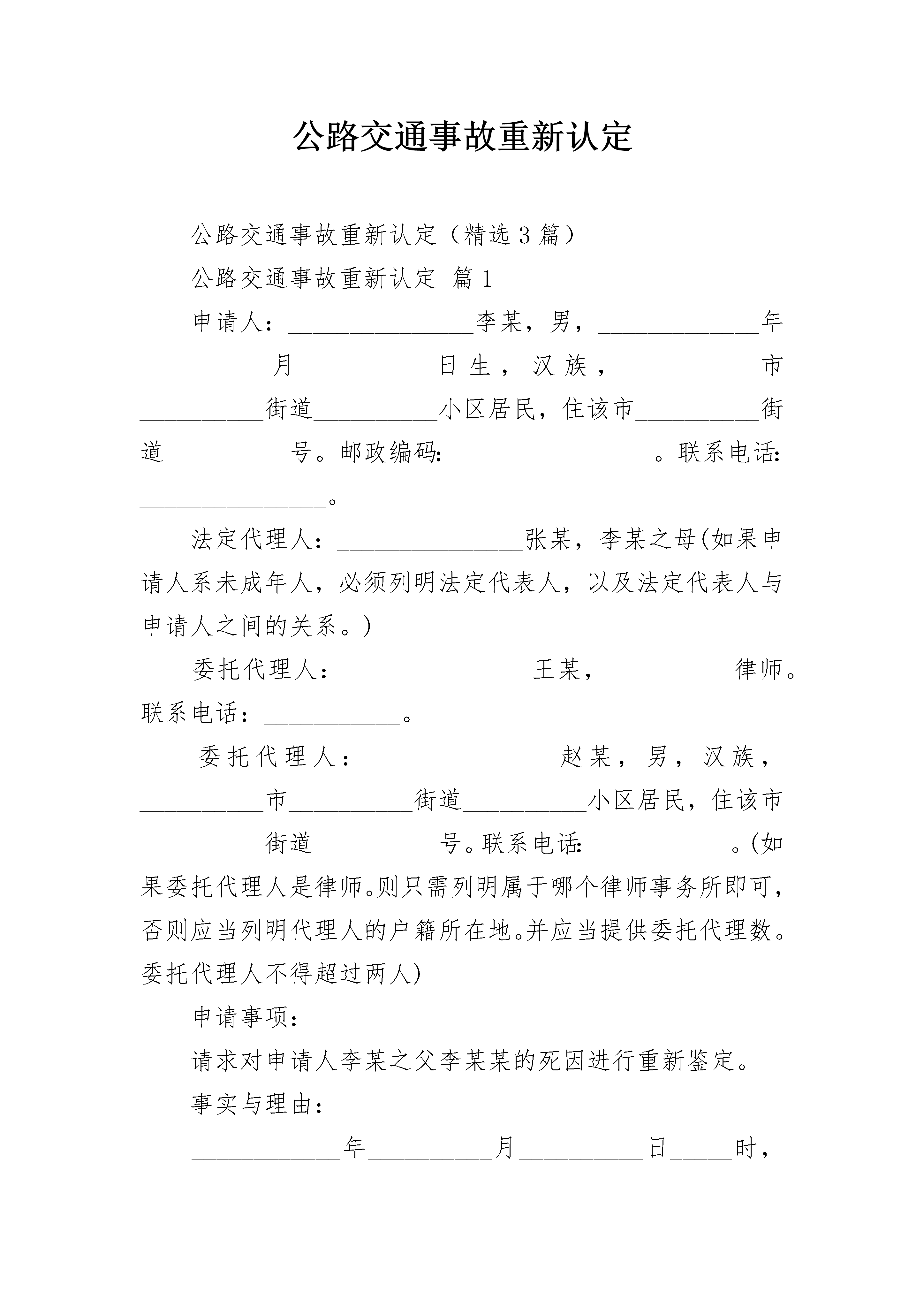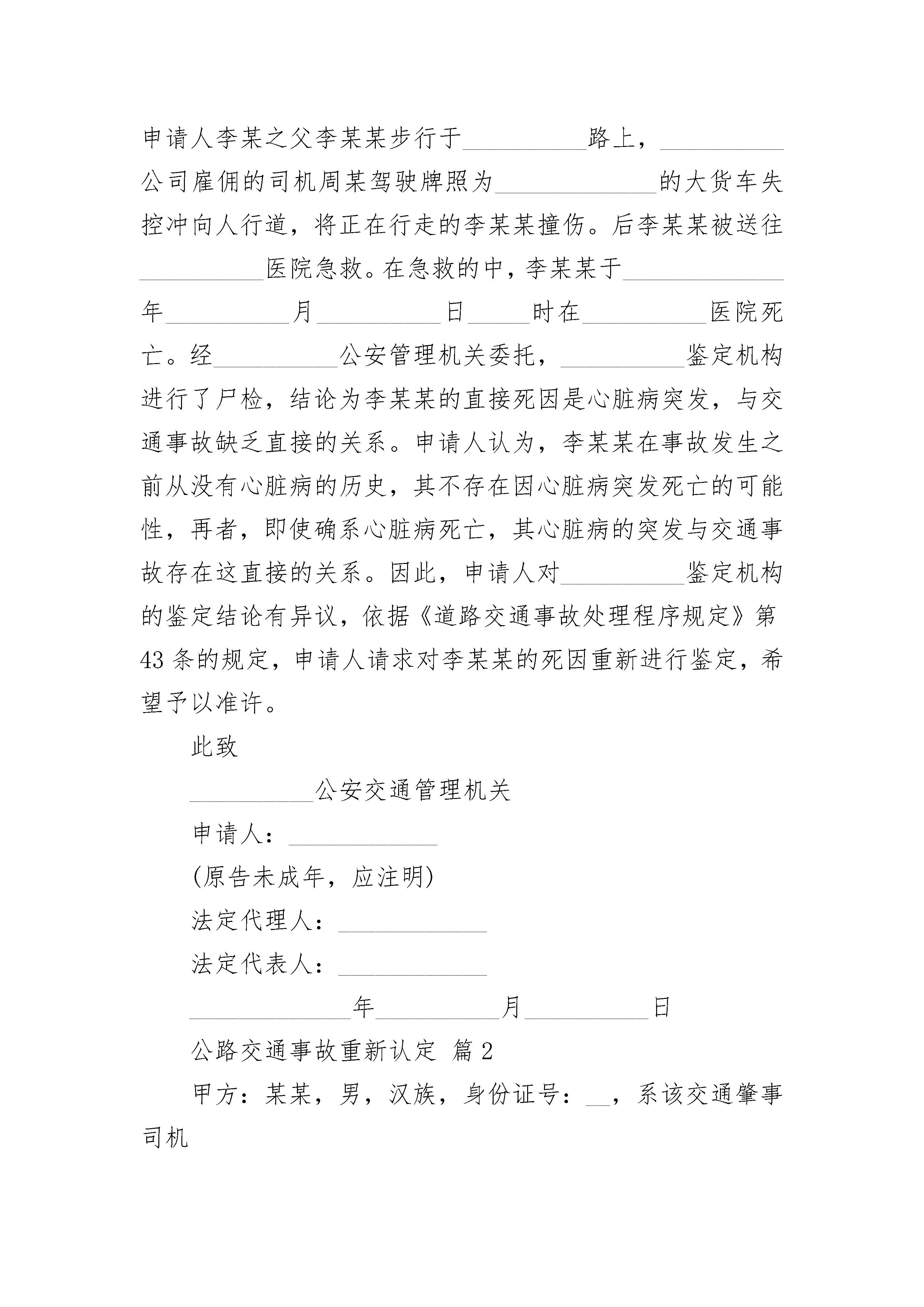 公路交通事故重新认定公路交通事故重新认定(精选3篇)公路交通事故重新认定篇1申请人:_______________李某,男,_____________年__________月__________日生,汉族,__________市__________街道__________小区居民,住该市__________街道__________号。邮政编码:________________。联系电话:_______________。法定代理人:_______________张某,李某之母(如果申请人系未成年人,必须列明法定代表人,以及法定代表人与申请人之间的关系。)委托代理人:_______________王某,__________律师。联系电话:___________。委托代理人:_______________赵某,男,汉族,__________市__________街道__________小区居民,住该市__________街道__________号。联系电话:___________。(如果委托代理人是律师。则只需列明属于哪个律师事务所即可,否则应当列明代理人的户籍所在地。并应当提供委托代理数。委托代理人不得超过两人)申请事项:请求对申请人李某之父李某某的死因进行重新鉴定。事实与理由:____________年__________月__________日_____时,申请人李某之父李某某步行于__________路上,__________公司雇佣的司机周某驾驶牌照为_____________的大货车失控冲向人行道,将正在行走的李某某撞伤。后李某某被送往__________医院急救。在急救的中,李某某于_____________年__________月__________日_____时在__________医院死亡。经__________公安管理机关委托,__________鉴定机构进行了尸检,结论为李某某的直接死因是心脏病突发,与交通事故缺乏直接的关系。申请人认为,李某某在事故发生之前从没有心脏病的历史,其不存在因心脏病突发死亡的可能性,再者,即使确系心脏病死亡,其心脏病的突发与交通事故存在这直接的关系。因此,申请人对__________鉴定机构的鉴定结论有异议,依据《道路交通事故处理程序规定》第43条的规定,申请人请求对李某某的死因重新进行鉴定,希望予以准许。此致__________公安交通管理机关申请人:____________(原告未成年,应注明)法定代理人:____________法定代表人:_________________________年__________月__________日公路交通事故重新认定篇2甲方:某某,男,汉族,身份证号:__,系该交通肇事司机乙方:某某,男,汉族,身份证号:_,系该交通事故受害人。根据经将乐县公安局交通管理大队道路交通事故认定“20__年9月10日上午9:40分左右,甲方驾驶闽G52733小车,自将乐城关往机床厂方向行驶至肇事路段因超车时,与对向骑助力车行驶在路边沿的乙方碰撞,造成乙方受伤及两车部分损坏的后果。当事人王峰驾驶车辆至肇事路段时,在与对面来车有会车可能时实施超车,其行为违反了《中华人民共和国道路交通安全法》第四十三条第(二)项的有关规定,是造成本起事故的全部过错,应承担本起事故的全部责任。当事人蔡立新无导致本起交通事故的过错,不承担本起事故的责任。”经县医院鉴定“乙方全身多处软组织严重挫伤,左侧第6、7前肋骨骨折,左大腿和,左肩肌肉严重拉伤。”住院期间,乙方家人一直陪伴照顾15天。乙方因工程需要人管理,误工耽搁不起,在受伤住院期间,工程因无人管理耽搁拖延了时间,损失高达10来万元。无奈,只好要求出院,请示医师后,于20__年9月26日伤势未治痊愈出院,医生要求乙方带药回家治疗调养,建议休息一个月,注意营养,如有不适随诊,并定期到医院复查。现乙方要求甲方,赔偿乙方这次交通事故中所有费用。经双方友好协商,同意就该交通事故相关赔偿事宜,达成协议如下:一、乙方住院期间已经产生的医疗费用及其他必要费用全部由甲方承担。二、误工费根据《人身损害赔偿解释》第20条规定:误工费根据受害人的误工时间和收入状况确定。受害人有固定收入的,误工费按照实际减少的收入计算。受害人无固定收人的,按照其最近三年的平均收入计算;受害人不能举证证明其最近三年的平均收入状况的',可以参照受诉法院所在地相同或者相近行业上一年度职工的平均工资计算。《人身损害赔偿解释》对实际支出的费用和误工损失,按照差额据实赔偿的办法。原《道路交通事故处理《解释》对误工费损失不设最高限额。根据我县上年度泥水装修工人年平均收入12万多元(333元/天),乙方本着人道主义精神,赔偿误工费每天200元,休息3个月,200元/×3个月=1800
