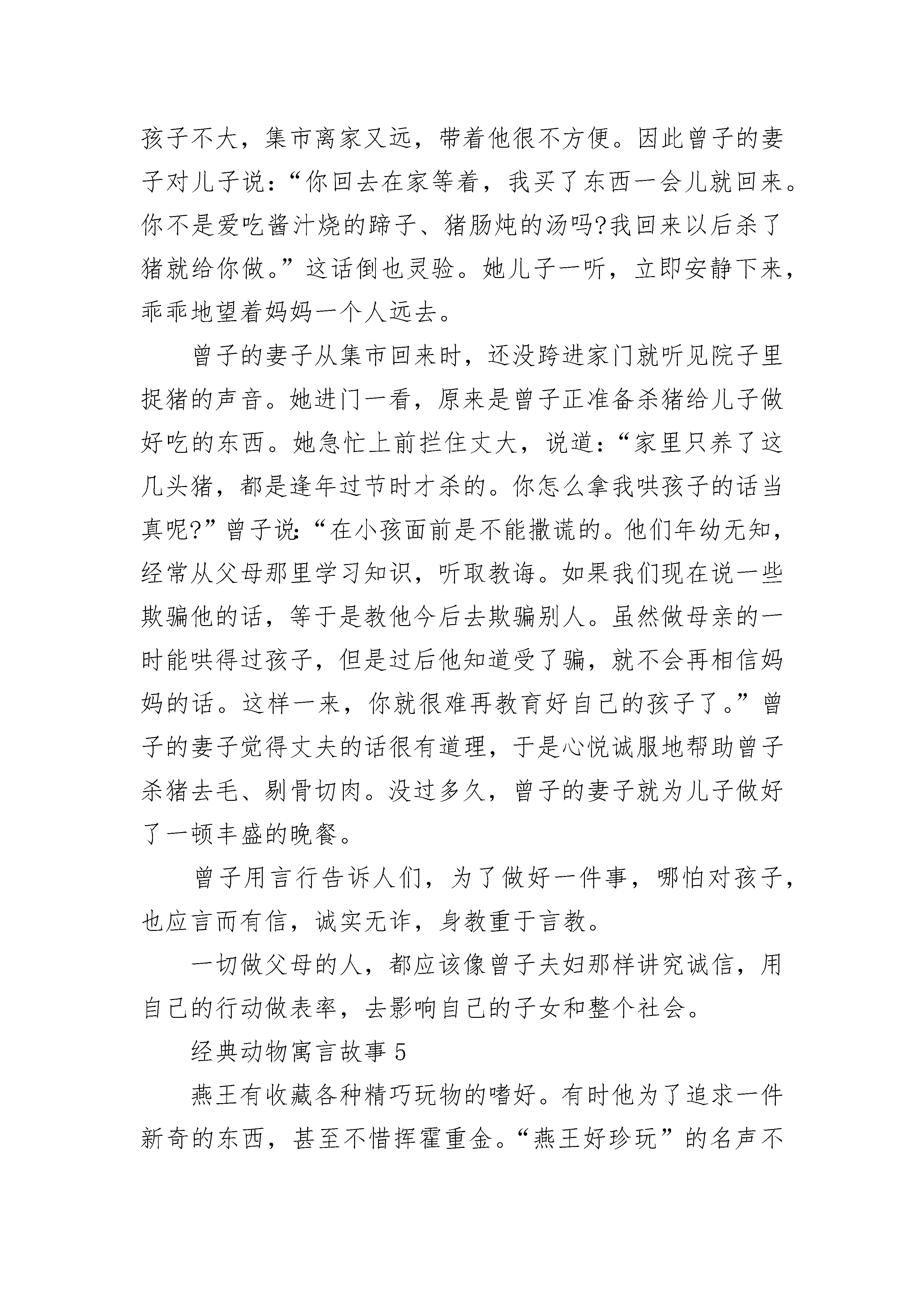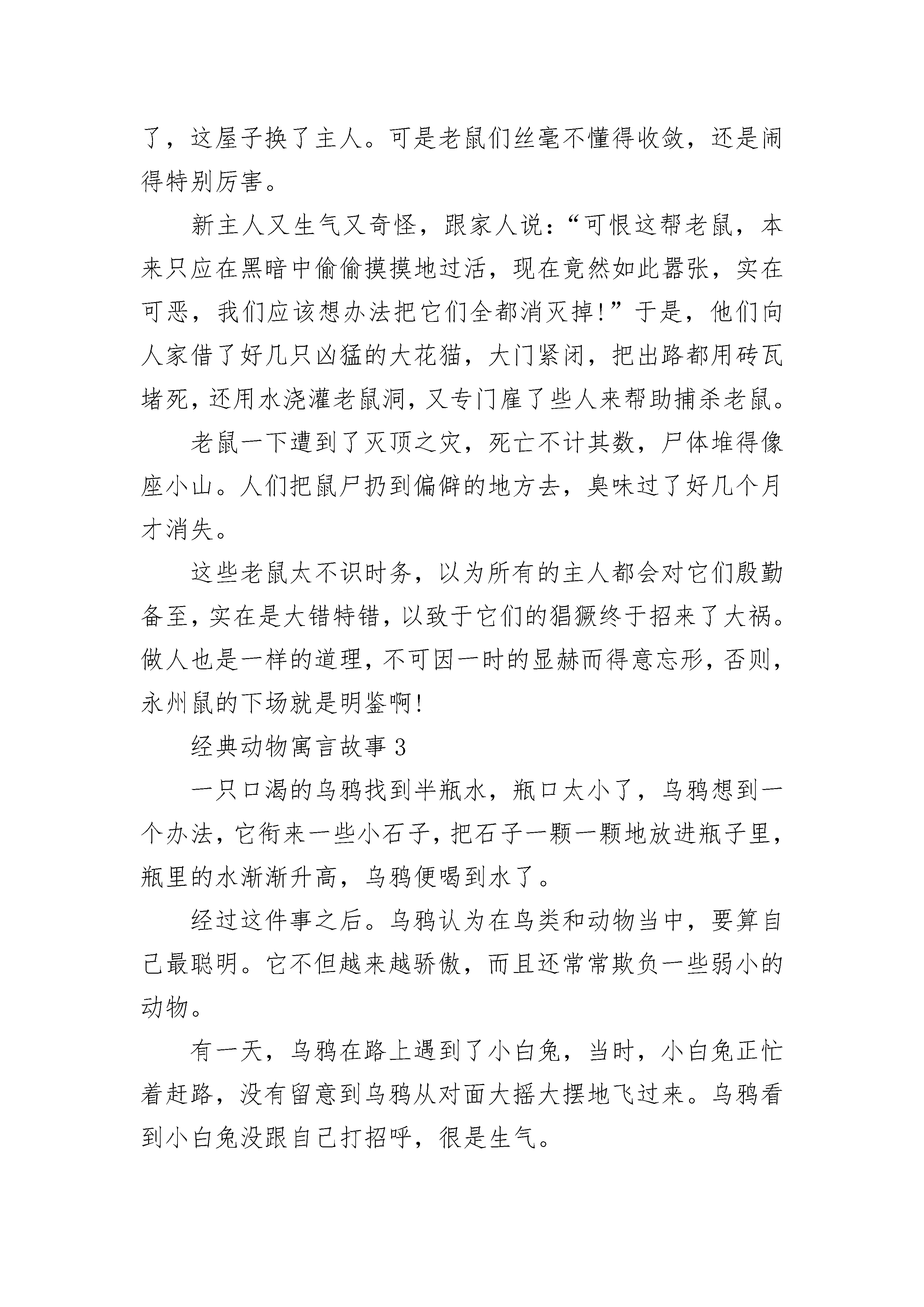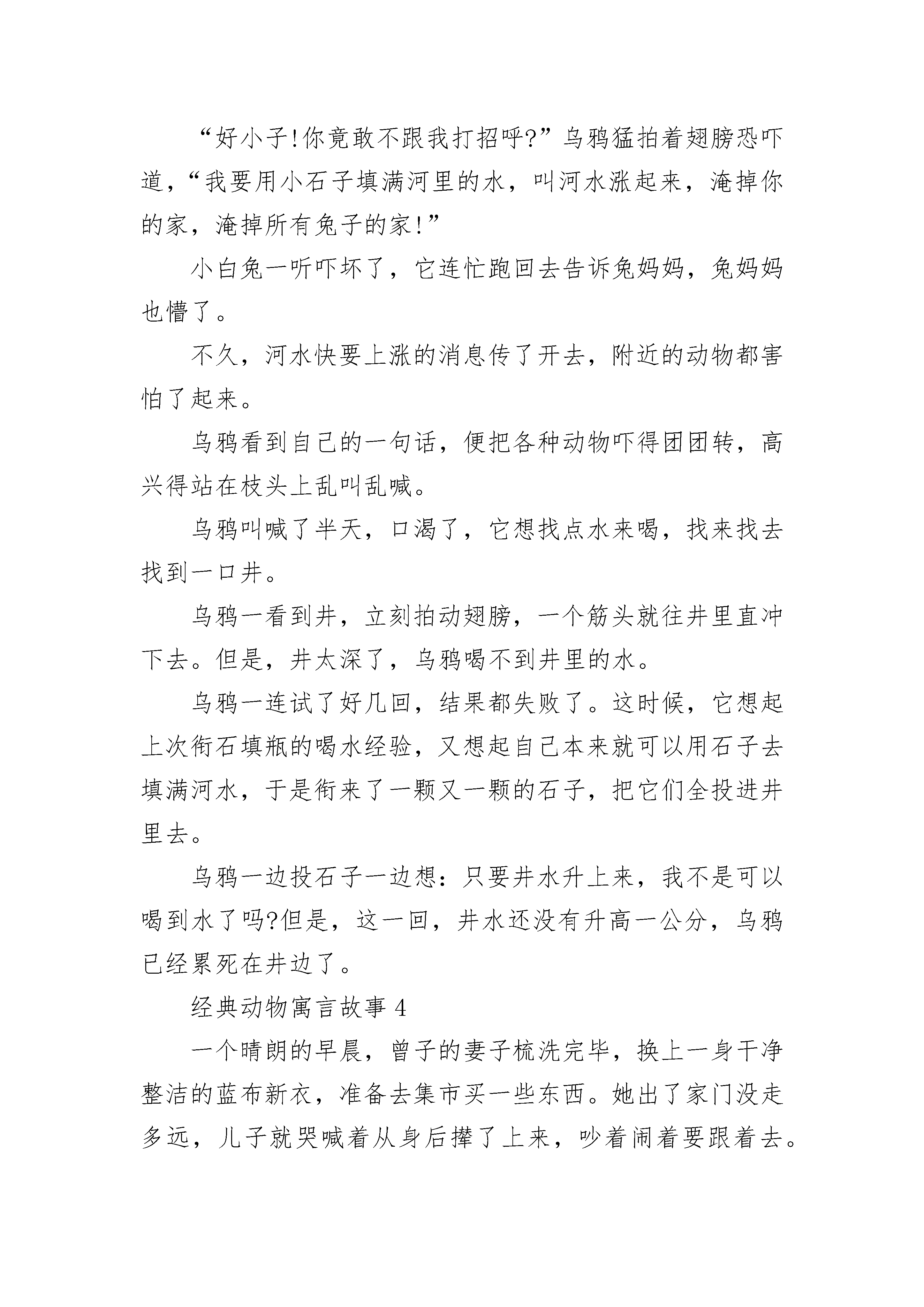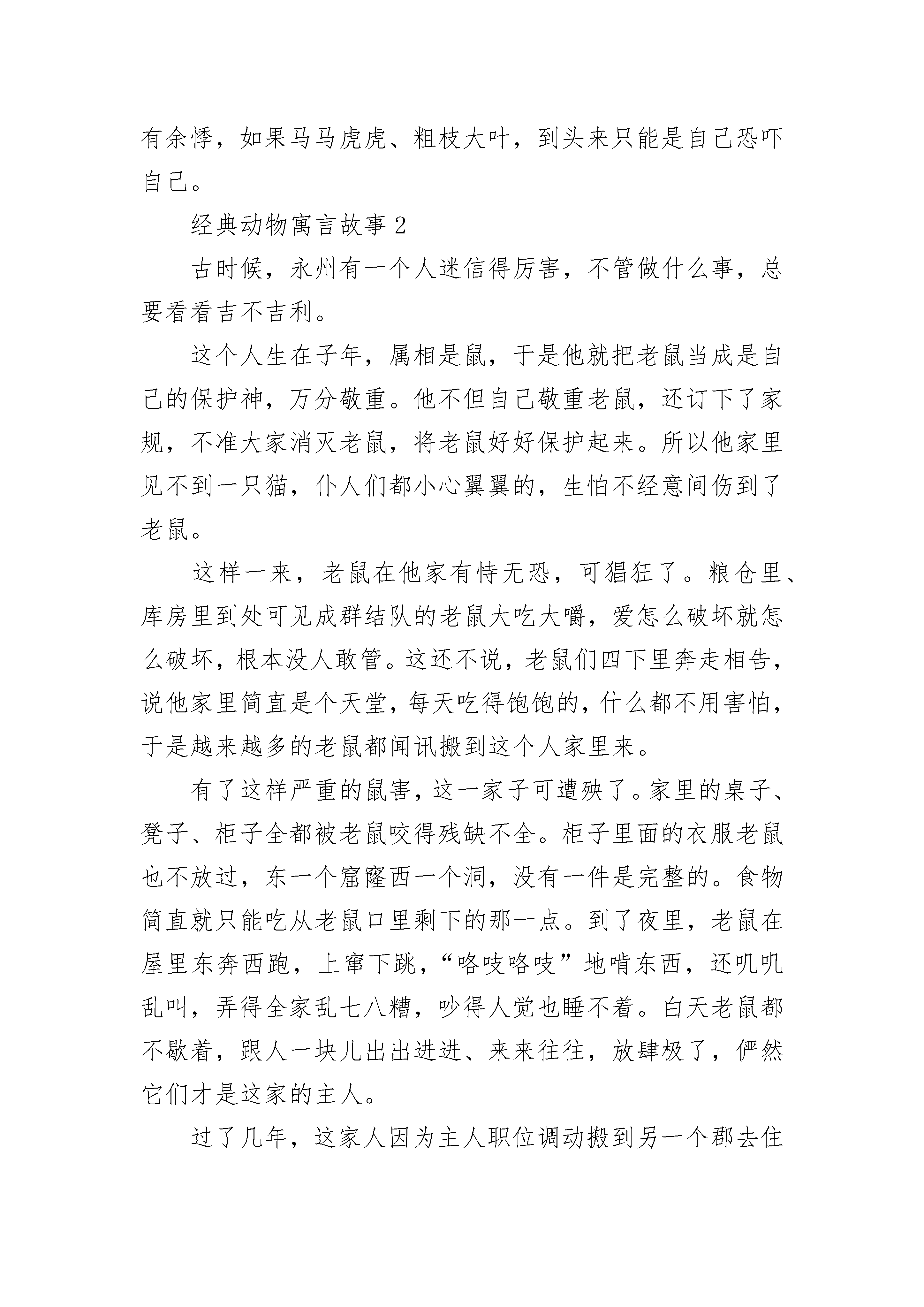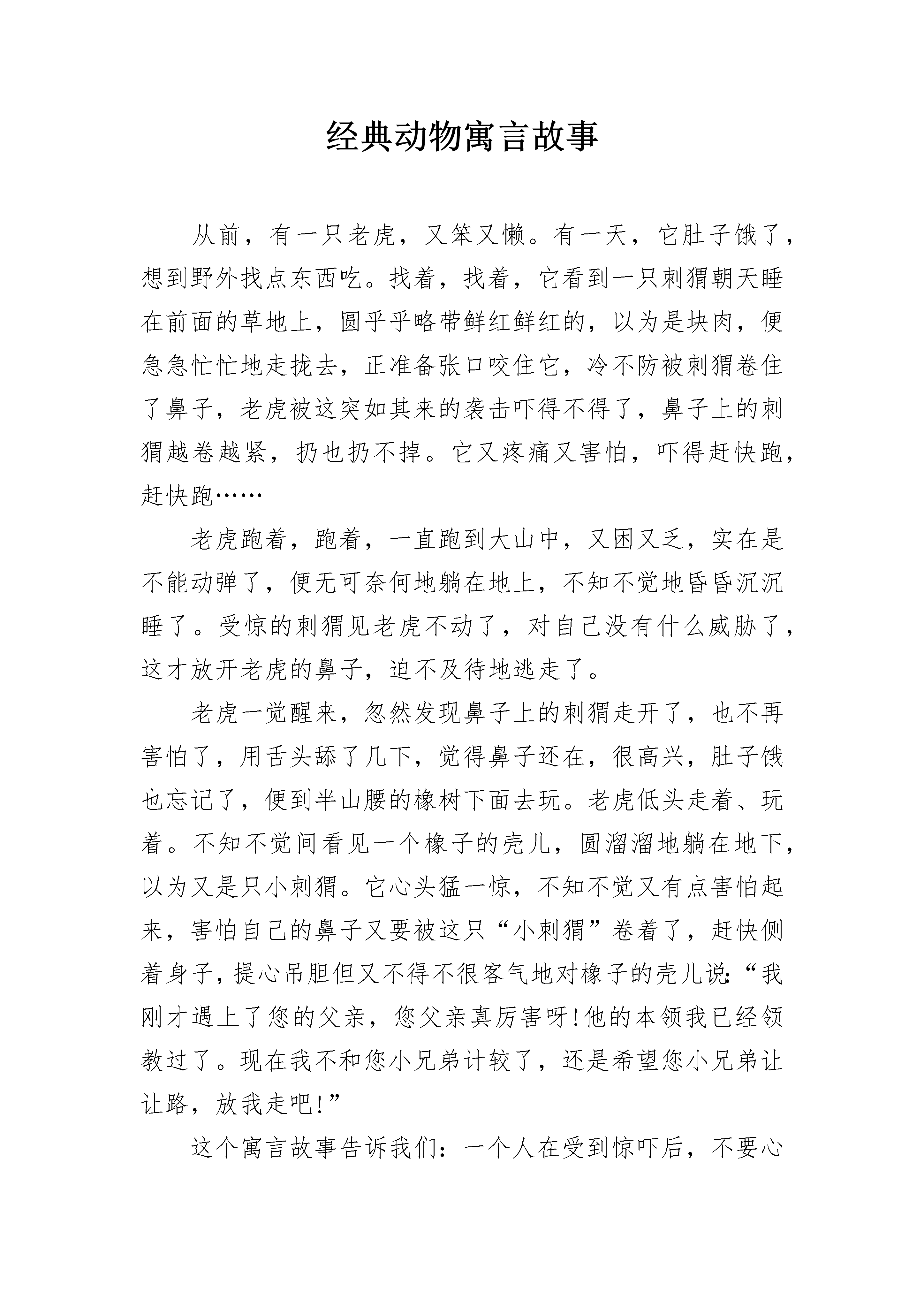 经典动物寓言故事从前,有一只老虎,又笨又懒。有一天,它肚子饿了,想到野外找点东西吃。找着,找着,它看到一只刺猬朝天睡在前面的草地上,圆乎乎略带鲜红鲜红的,以为是块肉,便急急忙忙地走拢去,正准备张口咬住它,冷不防被刺猬卷住了鼻子,老虎被这突如其来的袭击吓得不得了,鼻子上的刺猬越卷越紧,扔也扔不掉。它又疼痛又害怕,吓得赶快跑,赶快跑……老虎跑着,跑着,一直跑到大山中,又困又乏,实在是不能动弹了,便无可奈何地躺在地上,不知不觉地昏昏沉沉睡了。受惊的刺猬见老虎不动了,对自己没有什么威胁了,这才放开老虎的鼻子,迫不及待地逃走了。老虎一觉醒来,忽然发现鼻子上的刺猬走开了,也不再害怕了,用舌头舔了几下,觉得鼻子还在,很高兴,肚子饿也忘记了,便到半山腰的橡树下面去玩。老虎低头走着、玩着。不知不觉间看见一个橡子的壳儿,圆溜溜地躺在地下,以为又是只小刺猬。它心头猛一惊,不知不觉又有点害怕起来,害怕自己的鼻子又要被这只“小刺猬”卷着了,赶快侧着身子,提心吊胆但又不得不很客气地对橡子的壳儿说:“我刚才遇上了您的父亲,您父亲真厉害呀!他的本领我已经领教过了。现在我不和您小兄弟计较了,还是希望您小兄弟让让路,放我走吧!”这个寓言故事告诉我们:一个人在受到惊吓后,不要心有余悸,如果马马虎虎、粗枝大叶,到头来只能是自己恐吓自己。经典动物寓言故事2古时候,永州有一个人迷信得厉害,不管做什么事,总要看看吉不吉利。这个人生在子年,属相是鼠,于是他就把老鼠当成是自己的保护神,万分敬重。他不但自己敬重老鼠,还订下了家规,不准大家消灭老鼠,将老鼠好好保护起来。所以他家里见不到一只猫,仆人们都小心翼翼的,生怕不经意间伤到了老鼠。这样一来,老鼠在他家有恃无恐,可猖狂了。粮仓里、库房里到处可见成群结队的老鼠大吃大嚼,爱怎么破坏就怎么破坏,根本没人敢管。这还不说,老鼠们四下里奔走相告,说他家里简直是个天堂,每天吃得饱饱的,什么都不用害怕,于是越来越多的老鼠都闻讯搬到这个人家里来。有了这样严重的鼠害,这一家子可遭殃了。家里的桌子、凳子、柜子全都被老鼠咬得残缺不全。柜子里面的衣服老鼠也不放过,东一个窟窿西一个洞,没有一件是完整的。食物简直就只能吃从老鼠口里剩下的那一点。到了夜里,老鼠在屋里东奔西跑,上窜下跳,“咯吱咯吱”地啃东西,还叽叽乱叫,弄得全家乱七八糟,吵得人觉也睡不着。白天老鼠都不歇着,跟人一块儿出出进进、来来往往,放肆极了,俨然它们才是这家的主人。过了几年,这家人因为主人职位调动搬到另一个郡去住了,这屋子换了主人。可是老鼠们丝毫不懂得收敛,还是闹得特别厉害。新主人又生气又奇怪,跟家人说:“可恨这帮老鼠,本来只应在黑暗中偷偷摸摸地过活,现在竟然如此嚣张,实在可恶,我们应该想办法把它们全都消灭掉!”于是,他们向人家借了好几只凶猛的大花猫,大门紧闭,把出路都用砖瓦堵死,还用水浇灌老鼠洞,又专门雇了些人来帮助捕杀老鼠。老鼠一下遭到了灭顶之灾,死亡不计其数,尸体堆得像座小山。人们把鼠尸扔到偏僻的地方去,臭味过了好几个月才消失。这些老鼠太不识时务,以为所有的主人都会对它们殷勤备至,实在是大错特错,以致于它们的猖獗终于招来了大祸。做人也是一样的道理,不可因一时的显赫而得意忘形,否则,永州鼠的下场就是明鉴啊!经典动物寓言故事3一只口渴的乌鸦找到半瓶水,瓶口太小了,乌鸦想到一个办法,它衔来一些小石子,把石子一颗一颗地放进瓶子里,瓶里的水渐渐升高,乌鸦便喝到水了。经过这件事之后。乌鸦认为在鸟类和动物当中,要算自己最聪明。它不但越来越骄傲,而且还常常欺负一些弱小的动物。有一天,乌鸦在路上遇到了小白兔,当时,小白兔正忙着赶路,没有留意到乌鸦从对面大摇大摆地飞过来。乌鸦看到小白兔没跟自己打招呼,很是生气。“好小子!你竟敢不跟我打招呼?”乌鸦猛拍着翅膀恐吓道,“我要用小石子填满河里的水,叫河水涨起来,淹掉你的家,淹掉所有兔子的家!”小白兔一听吓坏了,它连忙跑回去告诉兔妈妈,兔妈妈也懵了。不久,河水快要上涨的消息传了开去,附近的动物都害怕了起来。乌鸦看到自己的一句话,便把各种动物吓得团团转,高兴得站在枝头上乱叫乱喊。乌鸦叫喊了半天,口渴了,它想找点水来喝,找来找去找到一口井。乌鸦一看到井,立刻拍动翅膀,一个筋头就往井里直冲下去。但是,井太深了,乌鸦喝不到井里的水。乌鸦一连试了好几回,结果都失败了。这时候,它想起上次衔石填瓶的喝水经验,又想起自己本来就可以用石子去填满河水,于是衔来了一颗又一颗的石子,把它们全投进井里去。乌鸦一边投石子一边想:只要井水升上来,我不是可以喝到水了吗?但是,这一回,井水还没有升高一公分,乌鸦已经累死在井边了。经典动物寓言故事4一个晴朗的早晨,曾子的妻子梳洗完毕,换上一身干净整洁的蓝布新衣,准备去集市买一些东西。她出了家门没走多远,儿子就哭喊着从身后撵了上来,吵着闹着要跟着