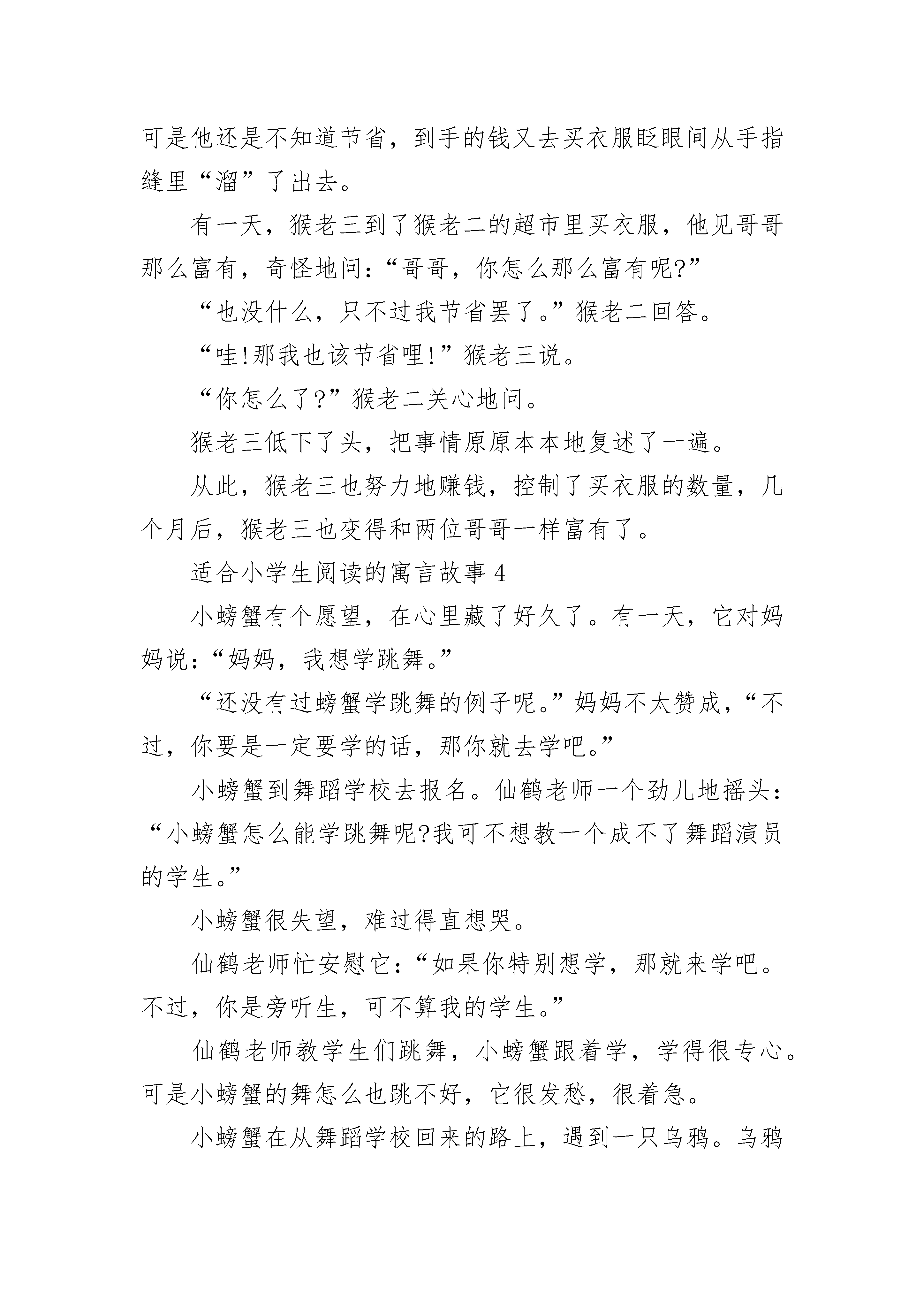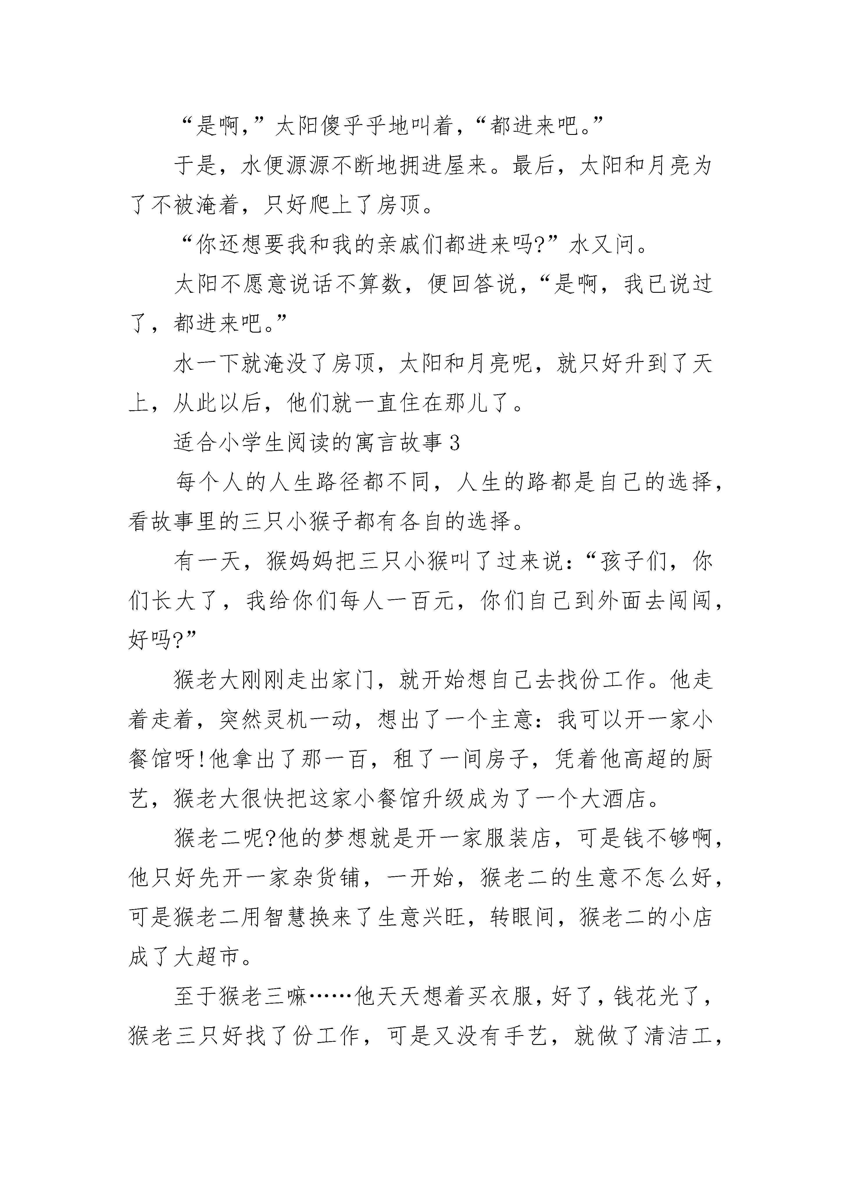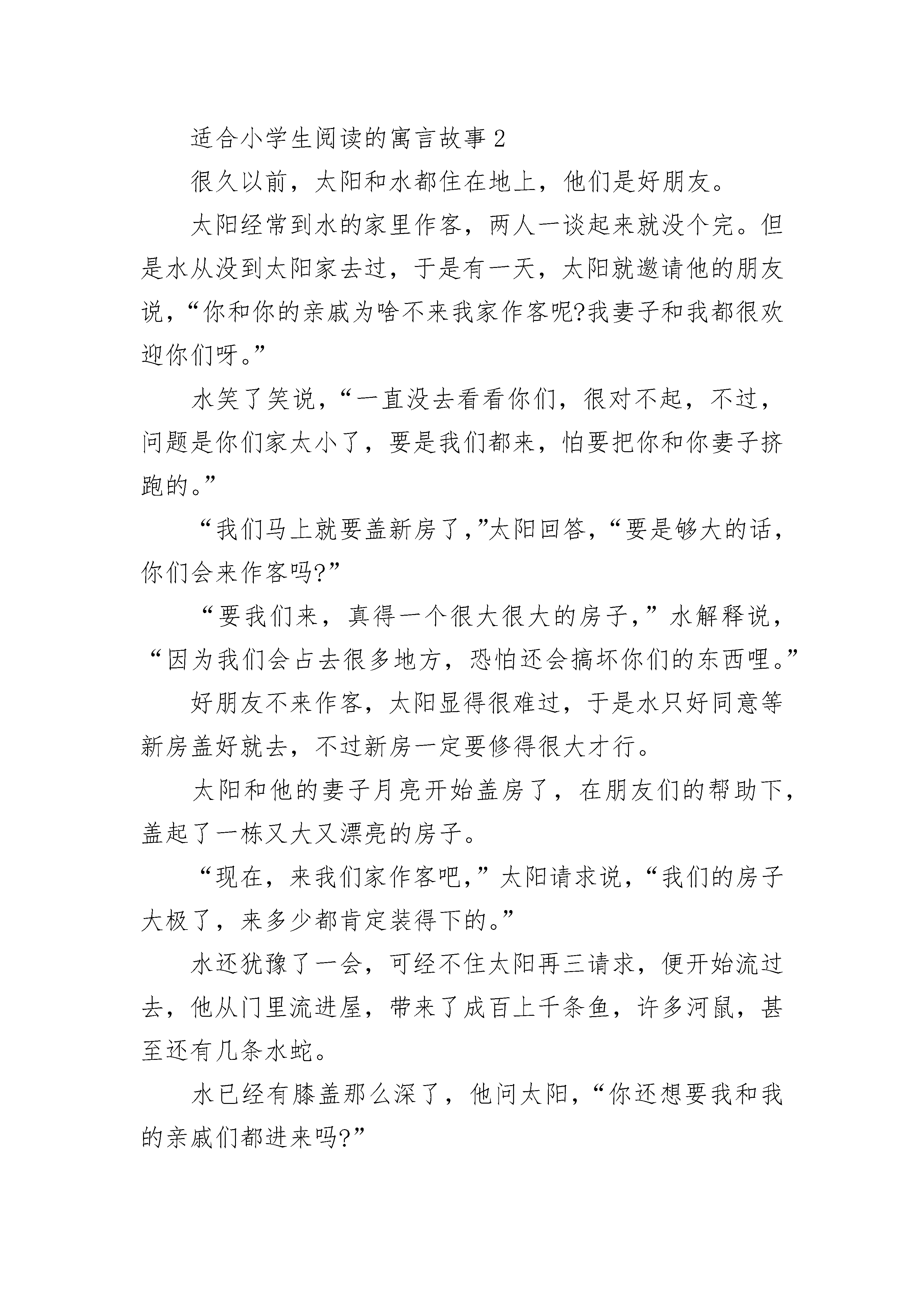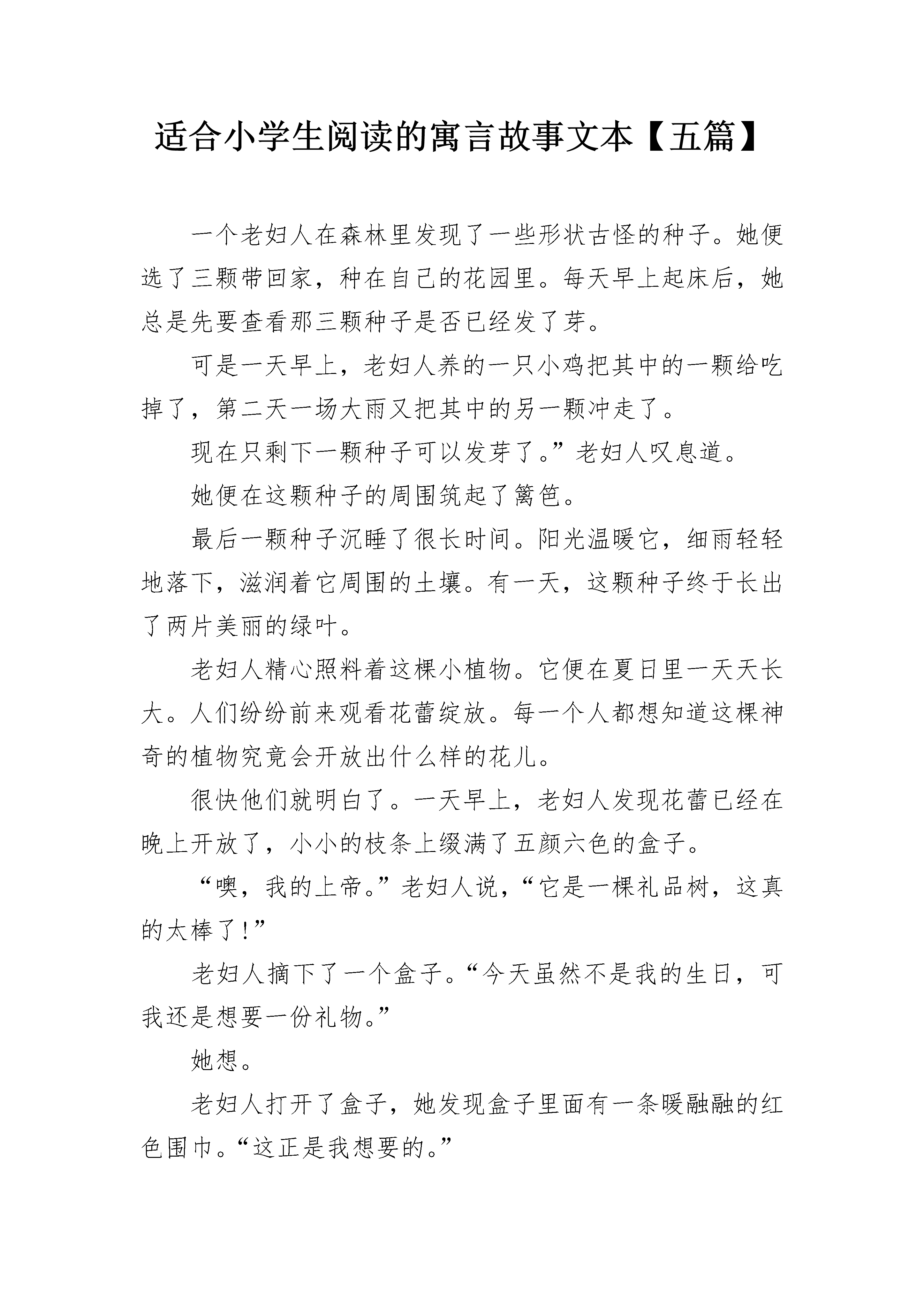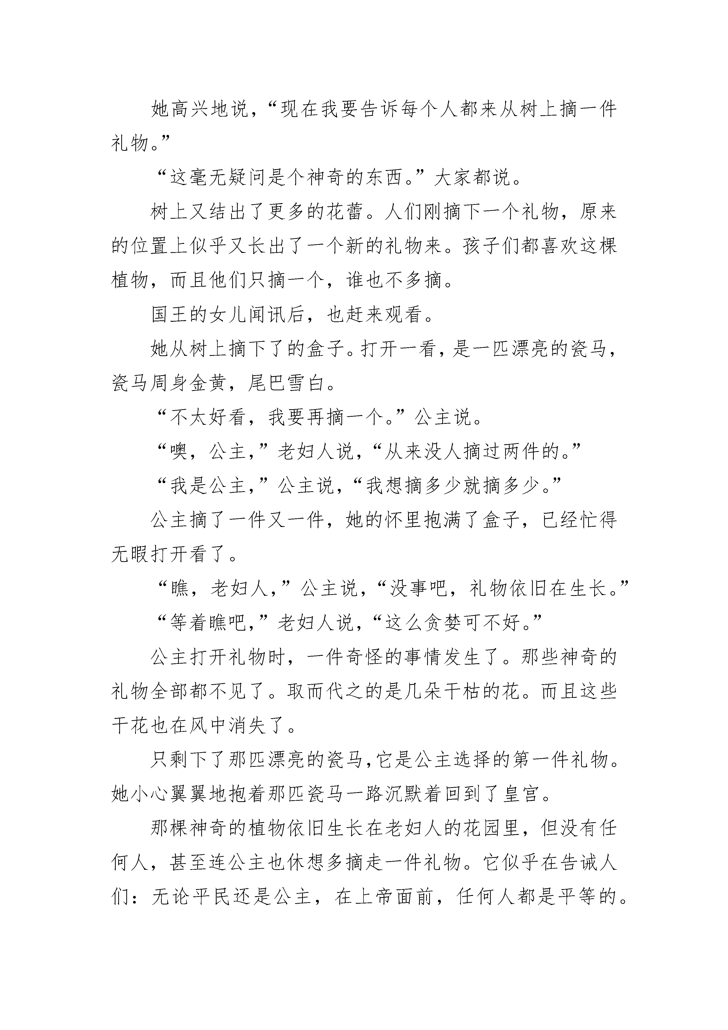 适合小学生阅读的寓言故事文本【五篇】一个老妇人在森林里发现了一些形状古怪的种子。她便选了三颗带回家,种在自己的花园里。每天早上起床后,她总是先要查看那三颗种子是否已经发了芽。可是一天早上,老妇人养的一只小鸡把其中的一颗给吃掉了,第二天一场大雨又把其中的另一颗冲走了。现在只剩下一颗种子可以发芽了。”老妇人叹息道。她便在这颗种子的周围筑起了篱笆。最后一颗种子沉睡了很长时间。阳光温暖它,细雨轻轻地落下,滋润着它周围的土壤。有一天,这颗种子终于长出了两片美丽的绿叶。老妇人精心照料着这棵小植物。它便在夏日里一天天长大。人们纷纷前来观看花蕾绽放。每一个人都想知道这棵神奇的植物究竟会开放出什么样的花儿。很快他们就明白了。一天早上,老妇人发现花蕾已经在晚上开放了,小小的枝条上缀满了五颜六色的盒子。“噢,我的上帝。”老妇人说,“它是一棵礼品树,这真的太棒了!”老妇人摘下了一个盒子。“今天虽然不是我的生日,可我还是想要一份礼物。”她想。老妇人打开了盒子,她发现盒子里面有一条暖融融的红色围巾。“这正是我想要的。”她高兴地说,“现在我要告诉每个人都来从树上摘一件礼物。”“这毫无疑问是个神奇的东西。”大家都说。树上又结出了更多的花蕾。人们刚摘下一个礼物,原来的位置上似乎又长出了一个新的礼物来。孩子们都喜欢这棵植物,而且他们只摘一个,谁也不多摘。国王的女儿闻讯后,也赶来观看。她从树上摘下了的盒子。打开一看,是一匹漂亮的瓷马,瓷马周身金黄,尾巴雪白。“不太好看,我要再摘一个。”公主说。“噢,公主,”老妇人说,“从来没人摘过两件的。”“我是公主,”公主说,“我想摘多少就摘多少。”公主摘了一件又一件,她的怀里抱满了盒子,已经忙得无暇打开看了。“瞧,老妇人,”公主说,“没事吧,礼物依旧在生长。”“等着瞧吧,”老妇人说,“这么贪婪可不好。”公主打开礼物时,一件奇怪的事情发生了。那些神奇的礼物全部都不见了。取而代之的是几朵干枯的花。而且这些干花也在风中消失了。只剩下了那匹漂亮的瓷马,它是公主选择的第一件礼物。她小心翼翼地抱着那匹瓷马一路沉默着回到了皇宫。那棵神奇的植物依旧生长在老妇人的花园里,但没有任何人,甚至连公主也休想多摘走一件礼物。它似乎在告诫人们:无论平民还是公主,在上帝面前,任何人都是平等的。适合小学生阅读的寓言故事2很久以前,太阳和水都住在地上,他们是好朋友。太阳经常到水的家里作客,两人一谈起来就没个完。但是水从没到太阳家去过,于是有一天,太阳就邀请他的朋友说,“你和你的亲戚为啥不来我家作客呢?我妻子和我都很欢迎你们呀。”水笑了笑说,“一直没去看看你们,很对不起,不过,问题是你们家太小了,要是我们都来,怕要把你和你妻子挤跑的。”“我们马上就要盖新房了,”太阳回答,“要是够大的话,你们会来作客吗?”“要我们来,真得一个很大很大的房子,”水解释说,“因为我们会占去很多地方,恐怕还会搞坏你们的东西哩。”好朋友不来作客,太阳显得很难过,于是水只好同意等新房盖好就去,不过新房一定要修得很大才行。太阳和他的妻子月亮开始盖房了,在朋友们的帮助下,盖起了一栋又大又漂亮的房子。“现在,来我们家作客吧,”太阳请求说,“我们的房子大极了,来多少都肯定装得下的。”水还犹豫了一会,可经不住太阳再三请求,便开始流过去,他从门里流进屋,带来了成百上千条鱼,许多河鼠,甚至还有几条水蛇。水已经有膝盖那么深了,他问太阳,“你还想要我和我的亲戚们都进来吗?”“是啊,”太阳傻乎乎地叫着,“都进来吧。”于是,水便源源不断地拥进屋来。最后,太阳和月亮为了不被淹着,只好爬上了房顶。“你还想要我和我的亲戚们都进来吗?”水又问。太阳不愿意说话不算数,便回答说,“是啊,我已说过了,都进来吧。”水一下就淹没了房顶,太阳和月亮呢,就只好升到了天上,从此以后,他们就一直住在那儿了。适合小学生阅读的寓言故事3每个人的人生路径都不同,人生的路都是自己的选择,看故事里的三只小猴子都有各自的选择。有一天,猴妈妈把三只小猴叫了过来说:“孩子们,你们长大了,我给你们每人一百元,你们自己到外面去闯闯,好吗?”猴老大刚刚走出家门,就开始想自己去找份工作。他走着走着,突然灵机一动,想出了一个主意:我可以开一家小餐馆呀!他拿出了那一百,租了一间房子,凭着他高超的厨艺,猴老大很快把这家小餐馆升级成为了一个大酒店。猴老二呢?他的梦想就是开一家服装店,可是钱不够啊,他只好先开一家杂货铺,一开始,猴老二的生意不怎么好,可是猴老二用智慧换来了生意兴旺,转眼间,猴老二的小店成了大超市。至于猴老三嘛……他天天想着买衣服,好了,钱花光了,猴老三只好找了份工作,可是又没有手艺,就做了清洁工,可是他还是不知道节省,到手的钱又去买衣服眨眼间从手指缝里“溜”了出去。有一天,猴老三到了猴老二的超市里买衣服,他见哥哥那么富有,奇怪地问:“哥哥,你怎么那么