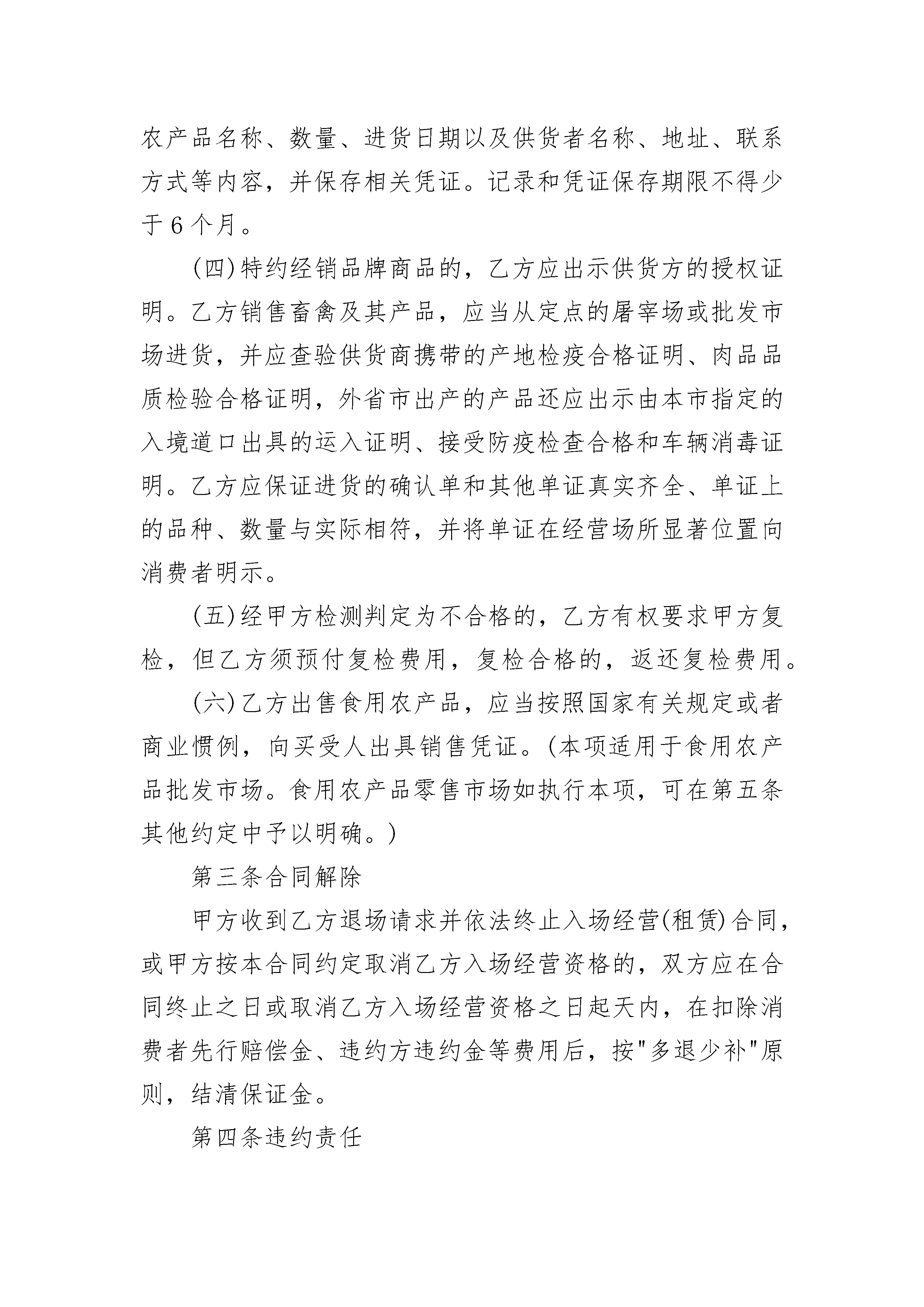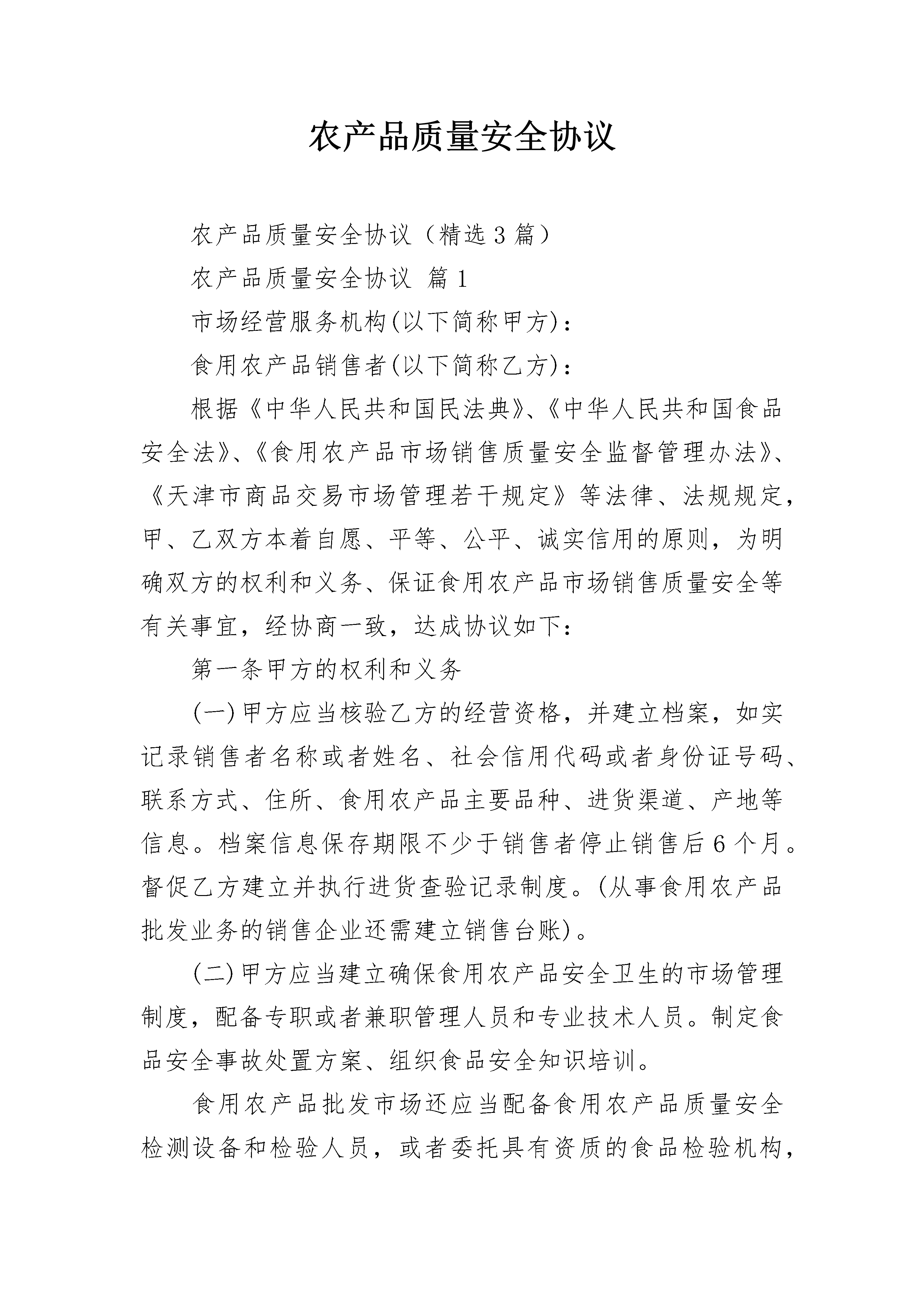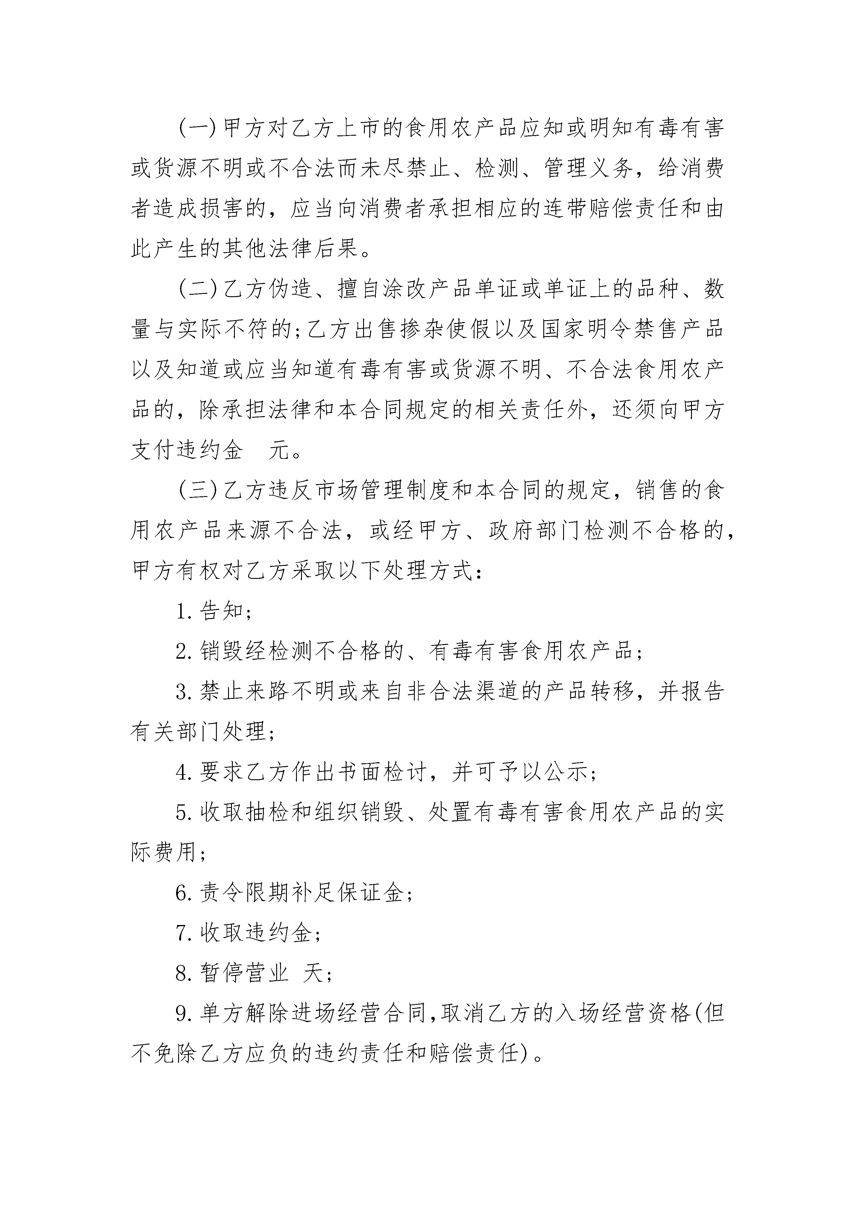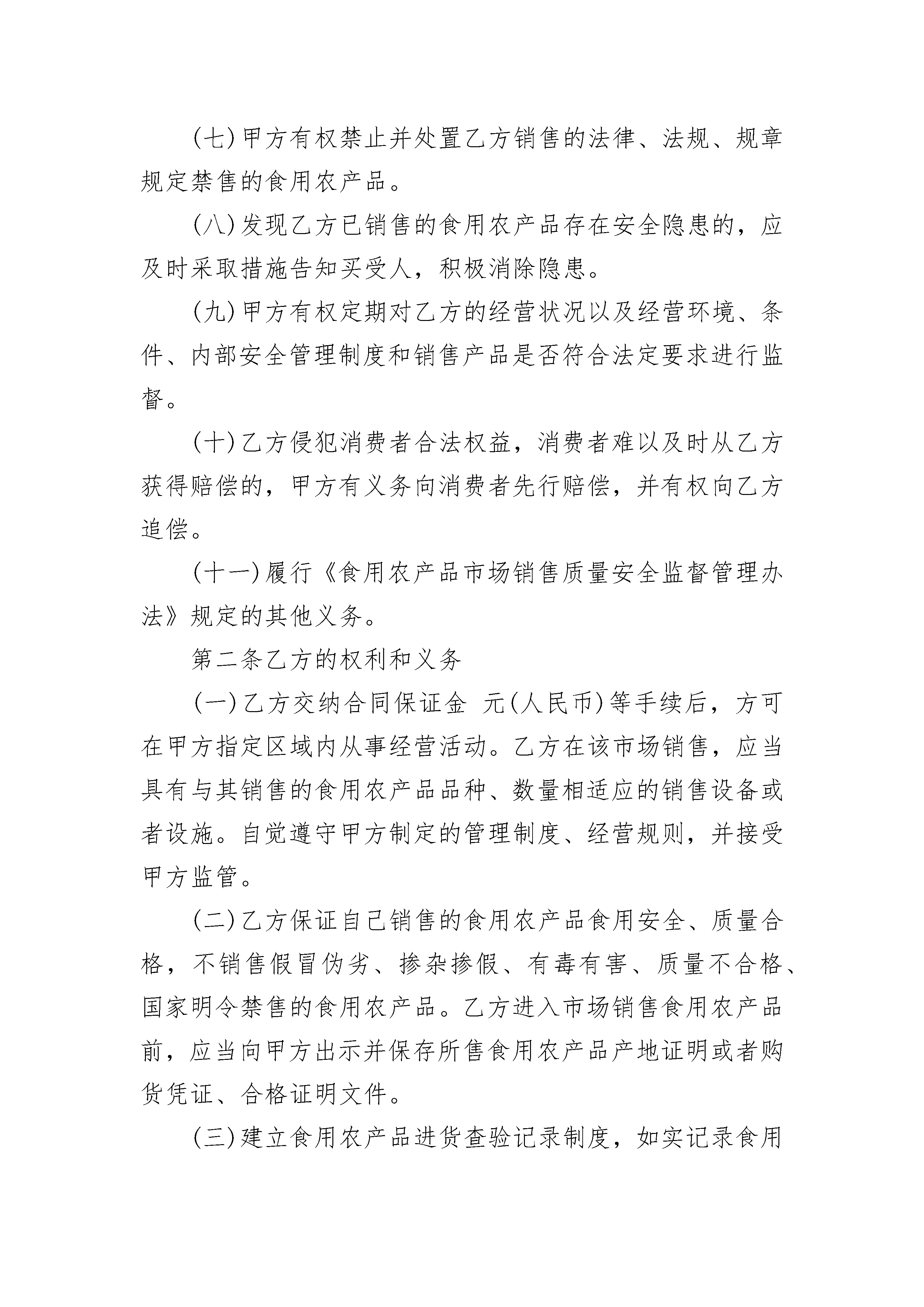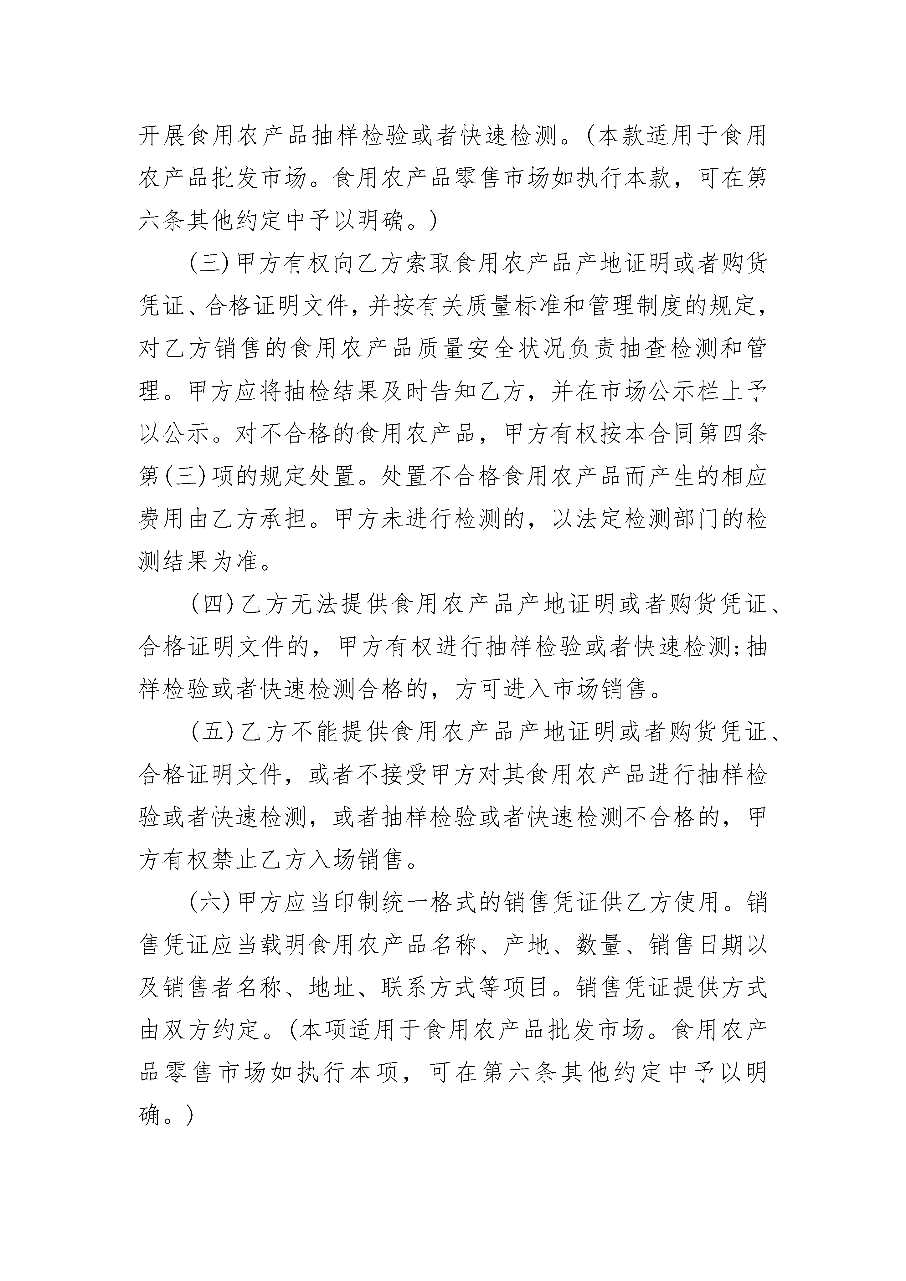 农产品质量安全协议农产品质量安全协议(精选3篇)农产品质量安全协议篇1市场经营服务机构(以下简称甲方):食用农产品销售者(以下简称乙方):根据《中华人民共和国民法典》、《中华人民共和国食品安全法》、《食用农产品市场销售质量安全监督管理办法》、《天津市商品交易市场管理若干规定》等法律、法规规定,甲、乙双方本着自愿、平等、公平、诚实信用的原则,为明确双方的权利和义务、保证食用农产品市场销售质量安全等有关事宜,经协商一致,达成协议如下:第一条甲方的权利和义务(一)甲方应当核验乙方的经营资格,并建立档案,如实记录销售者名称或者姓名、社会信用代码或者身份证号码、联系方式、住所、食用农产品主要品种、进货渠道、产地等信息。档案信息保存期限不少于销售者停止销售后6个月。督促乙方建立并执行进货查验记录制度。(从事食用农产品批发业务的销售企业还需建立销售台账)。(二)甲方应当建立确保食用农产品安全卫生的市场管理制度,配备专职或者兼职管理人员和专业技术人员。制定食品安全事故处置方案、组织食品安全知识培训。食用农产品批发市场还应当配备食用农产品质量安全检测设备和检验人员,或者委托具有资质的食品检验机构,开展食用农产品抽样检验或者快速检测。(本款适用于食用农产品批发市场。食用农产品零售市场如执行本款,可在第六条其他约定中予以明确。)(三)甲方有权向乙方索取食用农产品产地证明或者购货凭证、合格证明文件,并按有关质量标准和管理制度的规定,对乙方销售的食用农产品质量安全状况负责抽查检测和管理。甲方应将抽检结果及时告知乙方,并在市场公示栏上予以公示。对不合格的食用农产品,甲方有权按本合同第四条第(三)项的规定处置。处置不合格食用农产品而产生的相应费用由乙方承担。甲方未进行检测的,以法定检测部门的检测结果为准。(四)乙方无法提供食用农产品产地证明或者购货凭证、合格证明文件的,甲方有权进行抽样检验或者快速检测;抽样检验或者快速检测合格的,方可进入市场销售。(五)乙方不能提供食用农产品产地证明或者购货凭证、合格证明文件,或者不接受甲方对其食用农产品进行抽样检验或者快速检测,或者抽样检验或者快速检测不合格的,甲方有权禁止乙方入场销售。(六)甲方应当印制统一格式的销售凭证供乙方使用。销售凭证应当载明食用农产品名称、产地、数量、销售日期以及销售者名称、地址、联系方式等项目。销售凭证提供方式由双方约定。(本项适用于食用农产品批发市场。食用农产品零售市场如执行本项,可在第六条其他约定中予以明确。)(七)甲方有权禁止并处置乙方销售的法律、法规、规章规定禁售的食用农产品。(八)发现乙方已销售的食用农产品存在安全隐患的,应及时采取措施告知买受人,积极消除隐患。(九)甲方有权定期对乙方的经营状况以及经营环境、条件、内部安全管理制度和销售产品是否符合法定要求进行监督。(十)乙方侵犯消费者合法权益,消费者难以及时从乙方获得赔偿的,甲方有义务向消费者先行赔偿,并有权向乙方追偿。(十一)履行《食用农产品市场销售质量安全监督管理办法》规定的其他义务。第二条乙方的权利和义务(一)乙方交纳合同保证金元(人民币)等手续后,方可在甲方指定区域内从事经营活动。乙方在该市场销售,应当具有与其销售的食用农产品品种、数量相适应的销售设备或者设施。自觉遵守甲方制定的管理制度、经营规则,并接受甲方监管。(二)乙方保证自己销售的食用农产品食用安全、质量合格,不销售假冒伪劣、掺杂掺假、有毒有害、质量不合格、国家明令禁售的食用农产品。乙方进入市场销售食用农产品前,应当向甲方出示并保存所售食用农产品产地证明或者购货凭证、合格证明文件。(三)建立食用农产品进货查验记录制度,如实记录食用农产品名称、数量、进货日期以及供货者名称、地址、联系方式等内容,并保存相关凭证。记录和凭证保存期限不得少于6个月。(四)特约经销品牌商品的,乙方应出示供货方的授权证明。乙方销售畜禽及其产品,应当从定点的屠宰场或批发市场进货,并应查验供货商携带的产地检疫合格证明、肉品品质检验合格证明,外省市出产的产品还应出示由本市指定的入境道口出具的运入证明、接受防疫检查合格和车辆消毒证明。乙方应保证进货的确认单和其他单证真实齐全、单证上的品种、数量与实际相符,并将单证在经营场所显著位置向消费者明示。(五)经甲方检测判定为不合格的,乙方有权要求甲方复检,但乙方须预付复检费用,复检合格的,返还复检费用。(六)乙方出售食用农产品,应当按照国家有关规定或者商业惯例,向买受人出具销售凭证。(本项适用于食用农产品批发市场。食用农产品零售市场如执行本项,可在第五条其他约定中予以明确。)第三条合同解除甲方收到乙方退场请求并依法终止入场经营(租赁)合同,或甲方按本合同约定取消乙方入场经营资格的,双方应在合同终止之日或取消乙方入场经营资格之日起天内,在扣除消费者先行赔偿金、