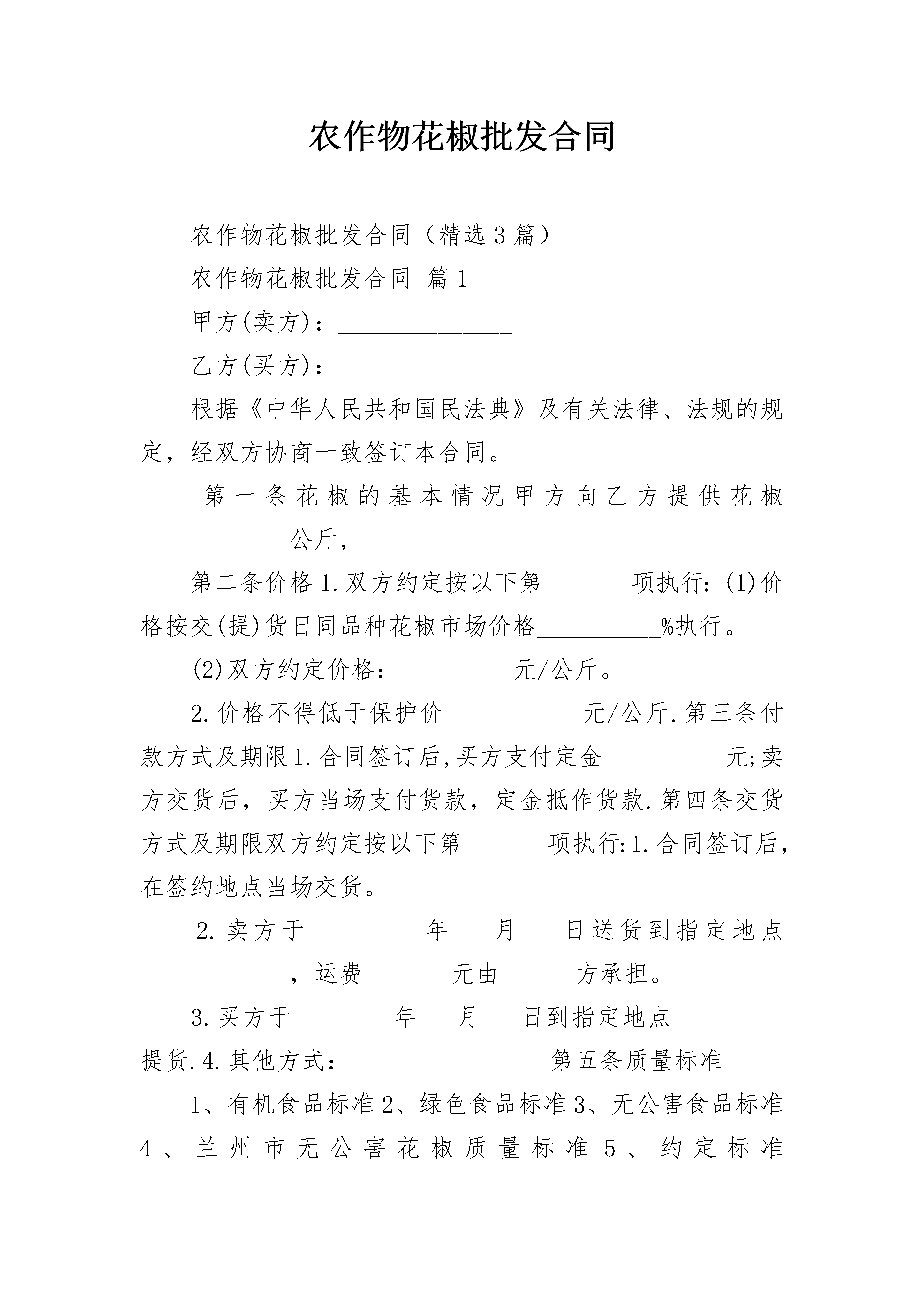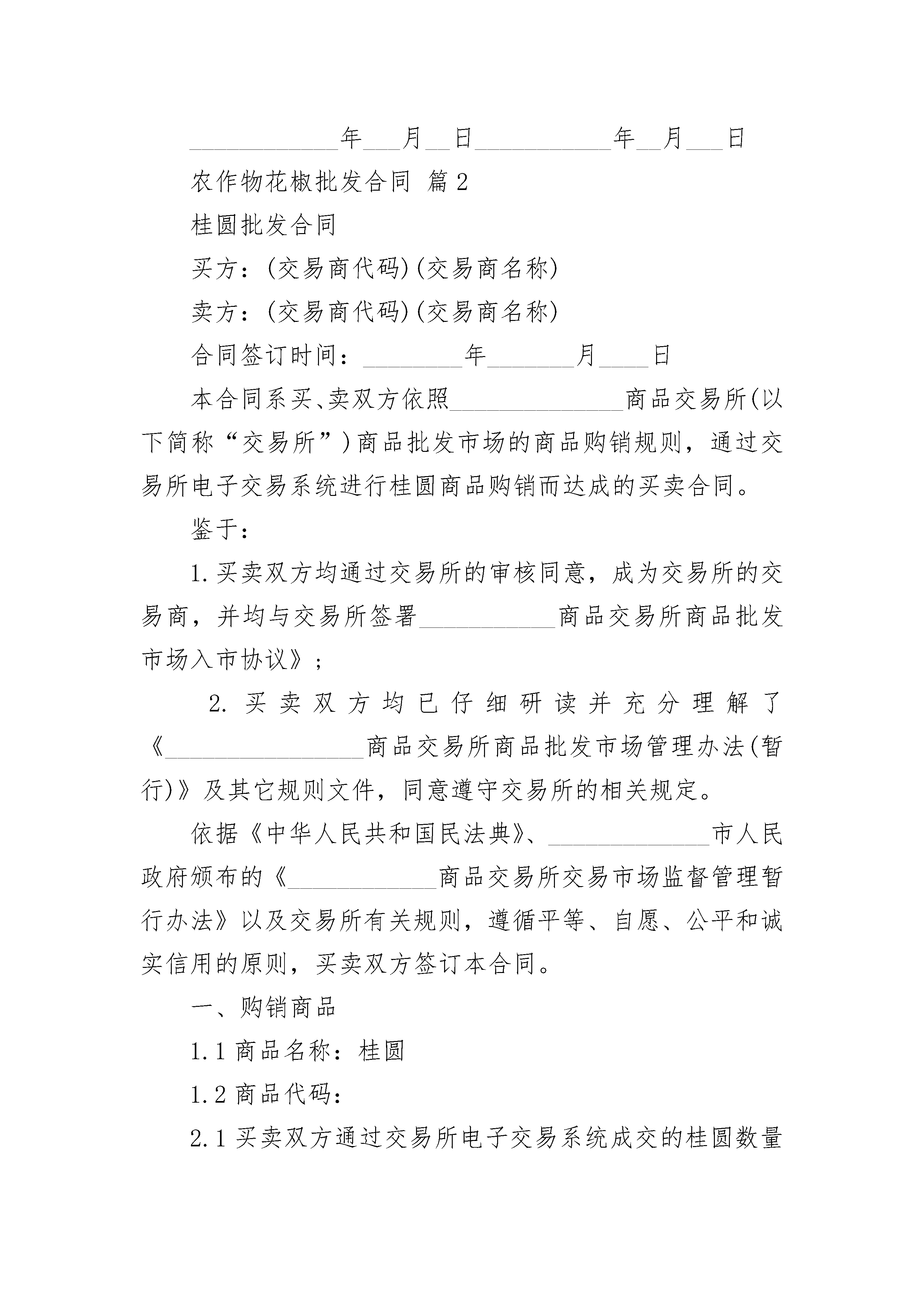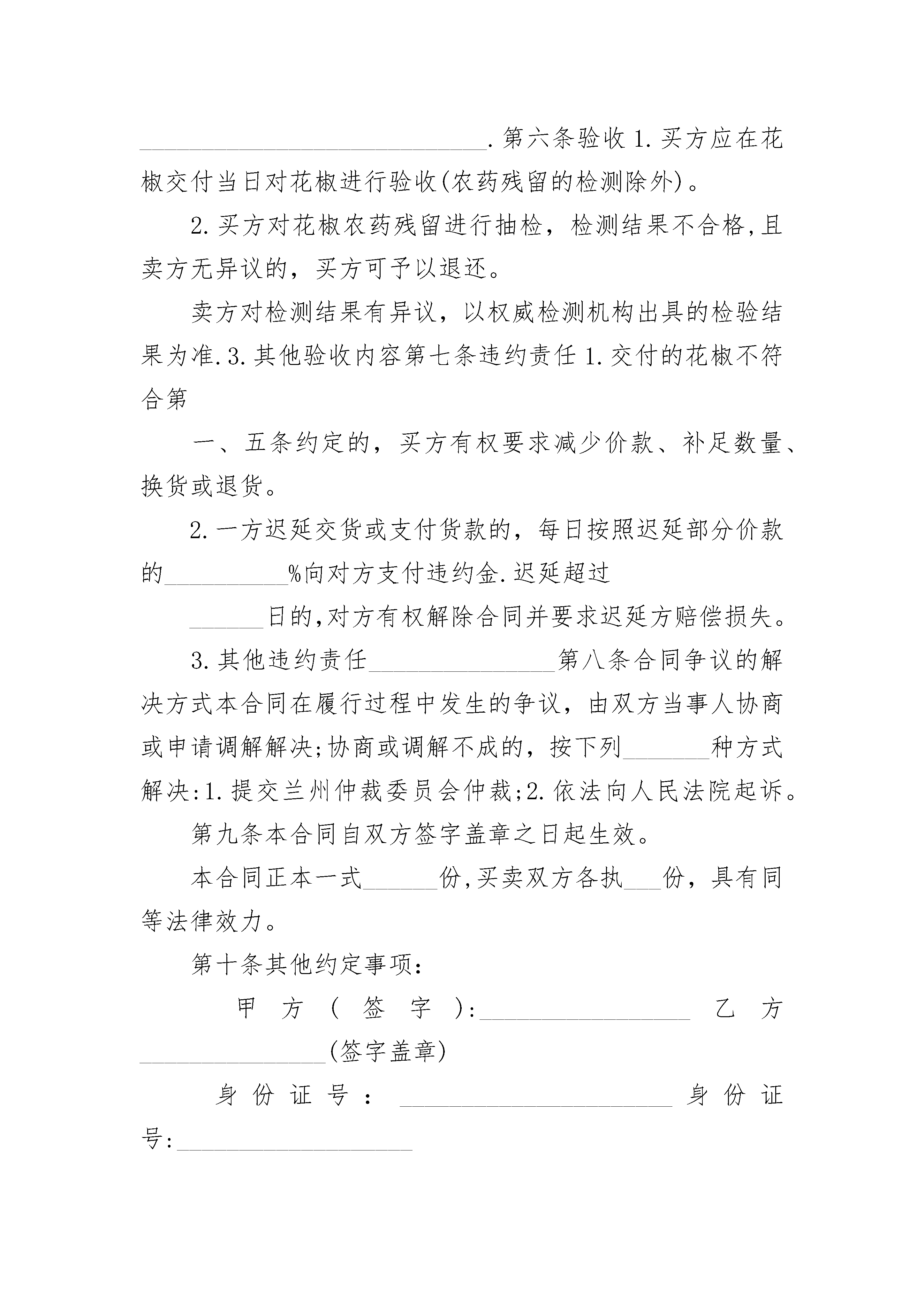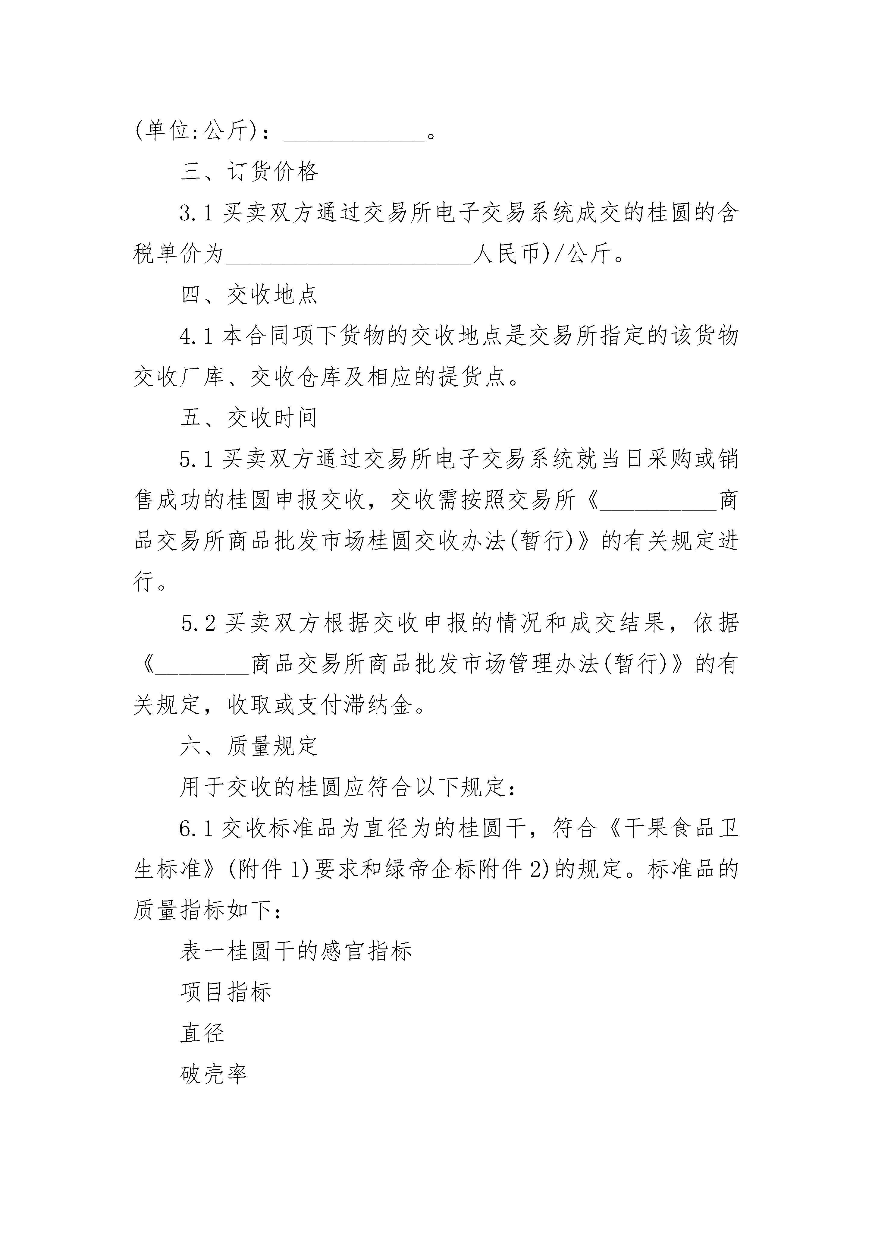 农作物花椒批发合同农作物花椒批发合同(精选3篇)农作物花椒批发合同篇1甲方(卖方):______________乙方(买方):____________________根据《中华人民共和国民法典》及有关法律、法规的规定,经双方协商一致签订本合同。第一条花椒的基本情况甲方向乙方提供花椒____________公斤,第二条价格1.双方约定按以下第_______项执行:(1)价格按交(提)货日同品种花椒市场价格__________%执行。(2)双方约定价格:_________元/公斤。2.价格不得低于保护价___________元/公斤.第三条付款方式及期限1.合同签订后,买方支付定金__________元;卖方交货后,买方当场支付货款,定金抵作货款.第四条交货方式及期限双方约定按以下第_______项执行:1.合同签订后,在签约地点当场交货。2.卖方于_________年___月___日送货到指定地点____________,运费_______元由______方承担。3.买方于________年___月___日到指定地点_________提货.4.其他方式:________________第五条质量标准1、有机食品标准2、绿色食品标准3、无公害食品标准4、兰州市无公害花椒质量标准5、约定标准____________________________.第六条验收1.买方应在花椒交付当日对花椒进行验收(农药残留的检测除外)。2.买方对花椒农药残留进行抽检,检测结果不合格,且卖方无异议的,买方可予以退还。卖方对检测结果有异议,以权威检测机构出具的检验结果为准.3.其他验收内容第七条违约责任1.交付的花椒不符合第一、五条约定的,买方有权要求减少价款、补足数量、换货或退货。2.一方迟延交货或支付货款的,每日按照迟延部分价款的__________%向对方支付违约金.迟延超过______日的,对方有权解除合同并要求迟延方赔偿损失。3.其他违约责任_______________第八条合同争议的解决方式本合同在履行过程中发生的争议,由双方当事人协商或申请调解解决;协商或调解不成的,按下列_______种方式解决:1.提交兰州仲裁委员会仲裁;2.依法向人民法院起诉。第九条本合同自双方签字盖章之日起生效。本合同正本一式______份,买卖双方各执___份,具有同等法律效力。第十条其他约定事项:甲方(签字):_________________乙方_______________(签字盖章)身份证号:______________________身份证号:_______________________________年___月__日___________年__月___日农作物花椒批发合同篇2桂圆批发合同买方:(交易商代码)(交易商名称)卖方:(交易商代码)(交易商名称)合同签订时间:________年_______月____日本合同系买、卖双方依照______________商品交易所(以下简称“交易所”)商品批发市场的商品购销规则,通过交易所电子交易系统进行桂圆商品购销而达成的买卖合同。鉴于:1.买卖双方均通过交易所的审核同意,成为交易所的交易商,并均与交易所签署___________商品交易所商品批发市场入市协议》;2.买卖双方均已仔细研读并充分理解了《________________商品交易所商品批发市场管理办法(暂行)》及其它规则文件,同意遵守交易所的相关规定。依据《中华人民共和国民法典》、_____________市人民政府颁布的《____________商品交易所交易市场监督管理暂行办法》以及交易所有关规则,遵循平等、自愿、公平和诚实信用的原则,买卖双方签订本合同。一、购销商品1.1商品名称:桂圆1.2商品代码:2.1买卖双方通过交易所电子交易系统成交的桂圆数量(单位:公斤):____________。三、订货价格3.1买卖双方通过交易所电子交易系统成交的桂圆的含税单价为_____________________人民币)/公斤。四、交收地点4.1本合同项下货物的交收地点是交易所指定的该货物交收厂库、交收仓库及相应的提货点。五、交收时间5.1买卖双方通过交易所电子交易系统就当日采购或销售成功的桂圆申报交收,交收需按照交易所《__________商品交易所商品批发市场桂圆交收办法(暂行)》的有关规定进行。5.2买卖双方根据交收申报的情况和成交结果,依据《________商品交易所商品批发市场管理办法(暂行)》的有关规定,收取或支付滞纳金。六、质量规定用于交收的桂圆应符合以下规定:6.1交收标准品为直径为的桂圆干,符合《干果食品卫生标准》(附件1)要求和绿帝企标附件2)的规定。标准品的质量指标如下:表一桂圆干的感官指标项目指标直径破壳率色泽果壳具有固有的