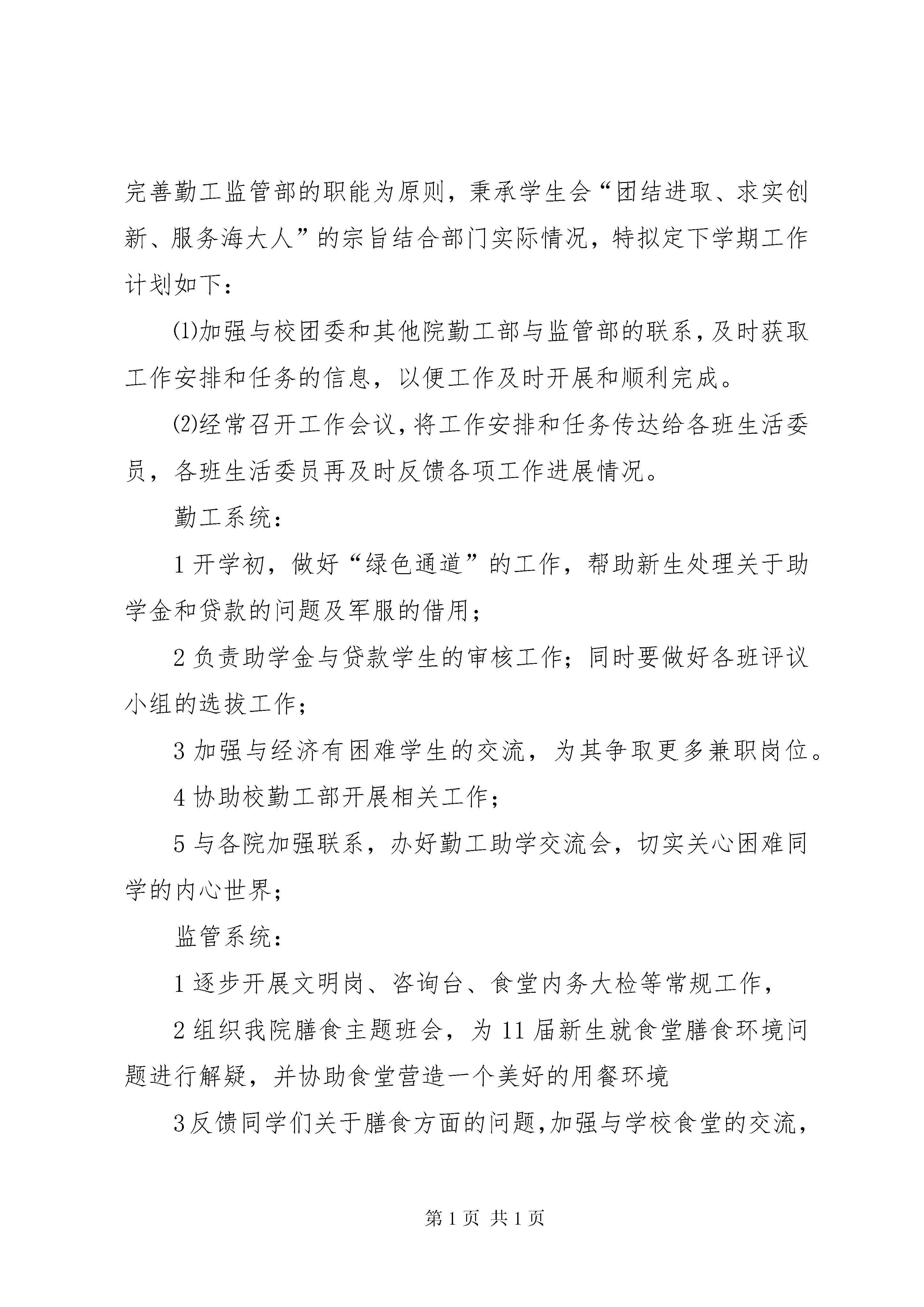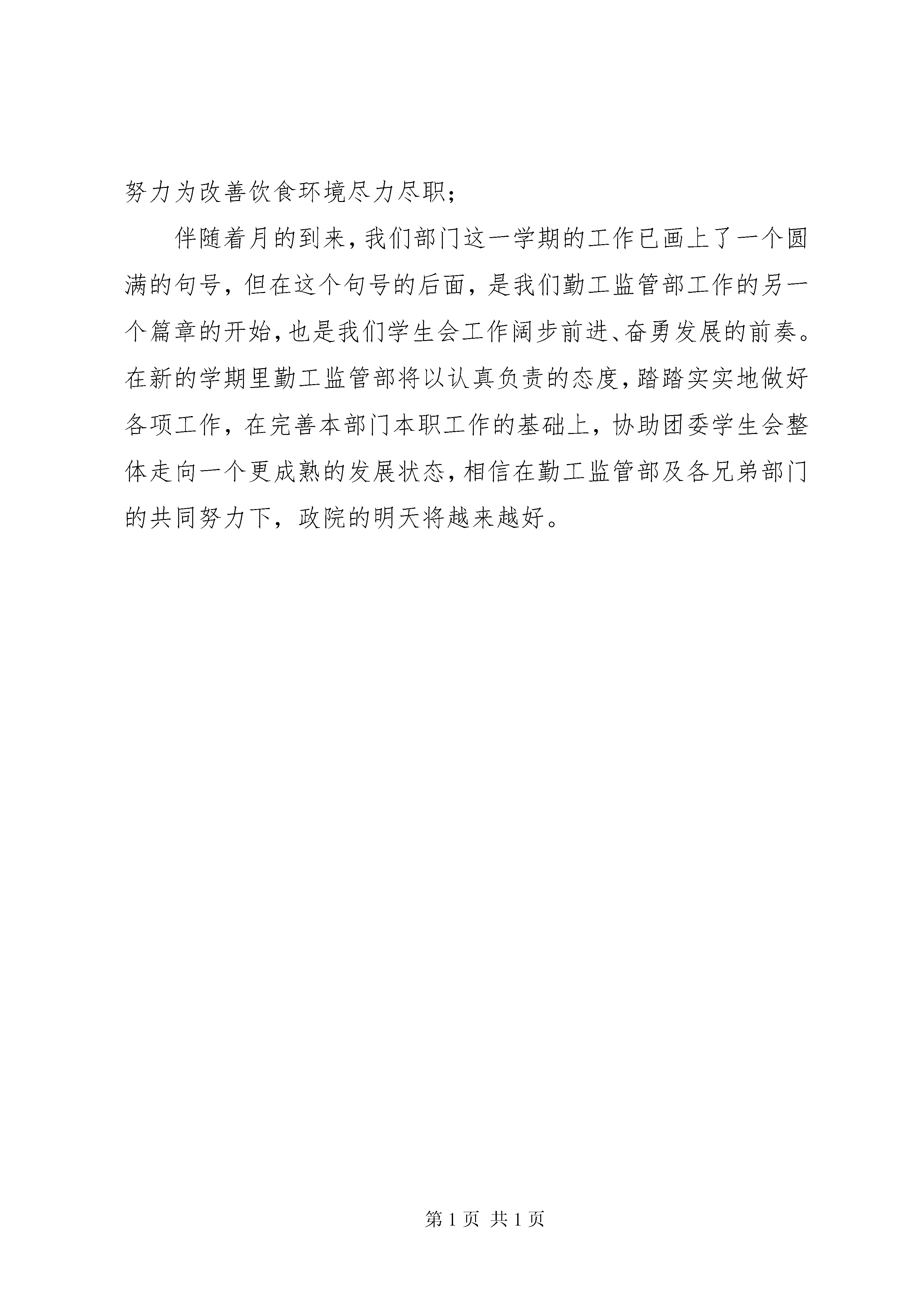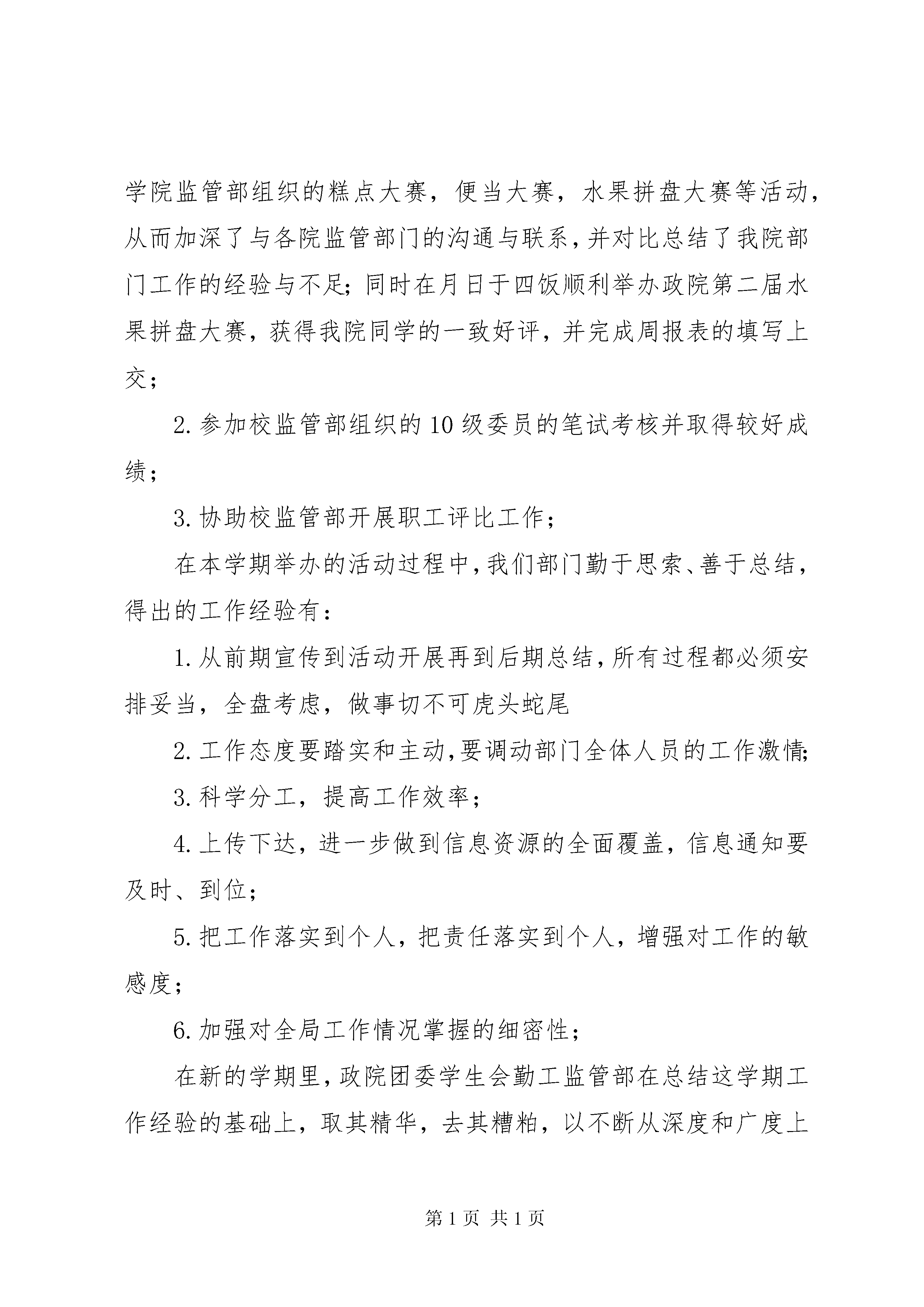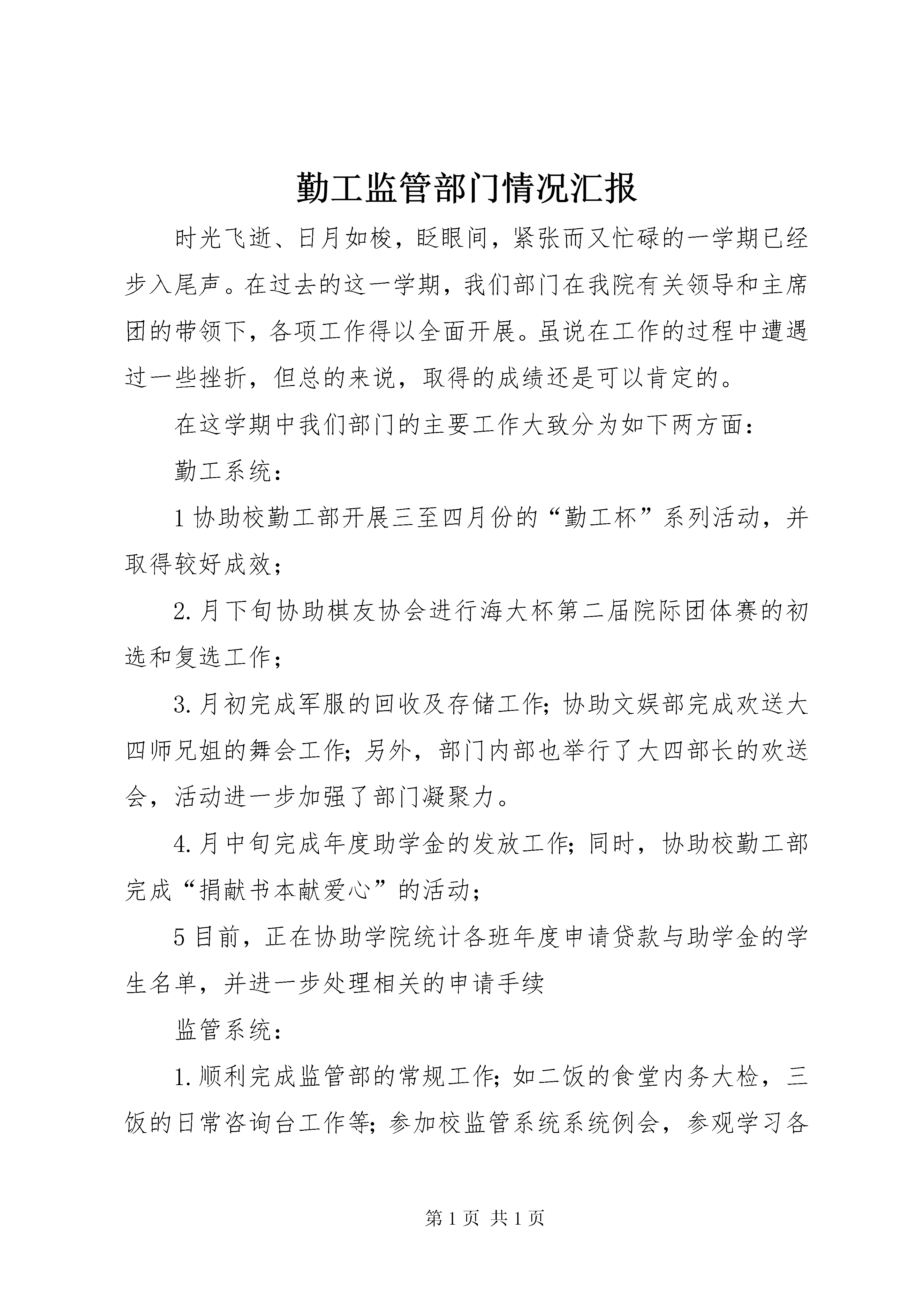 勤工监管部门情况汇报时光飞逝、日月如梭,眨眼间,紧张而又忙碌的一学期已经步入尾声。在过去的这一学期,我们部门在我院有关领导和主席团的带领下,各项工作得以全面开展。虽说在工作的过程中遭遇过一些挫折,但总的来说,取得的成绩还是可以肯定的。在这学期中我们部门的主要工作大致分为如下两方面:勤工系统:1协助校勤工部开展三至四月份的“勤工杯”系列活动,并取得较好成效;2.月下旬协助棋友协会进行海大杯第二届院际团体赛的初选和复选工作;3.月初完成军服的回收及存储工作;协助文娱部完成欢送大四师兄姐的舞会工作;另外,部门内部也举行了大四部长的欢送会,活动进一步加强了部门凝聚力。4.月中旬完成年度助学金的发放工作;同时,协助校勤工部完成“捐献书本献爱心”的活动;5目前,正在协助学院统计各班年度申请贷款与助学金的学生名单,并进一步处理相关的申请手续监管系统:1.顺利完成监管部的常规工作;如二饭的食堂内务大检,三饭的日常咨询台工作等;参加校监管系统系统例会,参观学习各学院监管部组织的糕点大赛,便当大赛,水果拼盘大赛等活动,从而加深了与各院监管部门的沟通与联系,并对比总结了我院部门工作的经验与不足;同时在月日于四饭顺利举办政院第二届水果拼盘大赛,获得我院同学的一致好评,并完成周报表的填写上交;2.参加校监管部组织的10级委员的笔试考核并取得较好成绩;3.协助校监管部开展职工评比工作;在本学期举办的活动过程中,我们部门勤于思索、善于总结,得出的工作经验有:1.从前期宣传到活动开展再到后期总结,所有过程都必须安排妥当,全盘考虑,做事切不可虎头蛇尾2.工作态度要踏实和主动,要调动部门全体人员的工作激情;3.科学分工,提高工作效率;4.上传下达,进一步做到信息资源的全面覆盖,信息通知要及时、到位;5.把工作落实到个人,把责任落实到个人,增强对工作的敏感度;6.加强对全局工作情况掌握的细密性;在新的学期里,政院团委学生会勤工监管部在总结这学期工作经验的基础上,取其精华,去其糟粕,以不断从深度和广度上完善勤工监管部的职能为原则,秉承学生会“团结进取、求实创新、服务海大人”的宗旨结合部门实际情况,特拟定下学期工作计划如下:⑴加强与校团委和其他院勤工部与监管部的联系,及时获取工作安排和任务的信息,以便工作及时开展和顺利完成。⑵经常召开工作会议,将工作安排和任务传达给各班生活委员,各班生活委员再及时反馈各项工作进展情况。勤工系统:1开学初,做好“绿色通道”的工作,帮助新生处理关于助学金和贷款的问题及军服的借用;2负责助学金与贷款学生的审核工作;同时要做好各班评议小组的选拔工作;3加强与经济有困难学生的交流,为其争取更多兼职岗位。4协助校勤工部开展相关工作;5与各院加强联系,办好勤工助学交流会,切实关心困难同学的内心世界;监管系统:1逐步开展文明岗、咨询台、食堂内务大检等常规工作,2组织我院膳食主题班会,为11届新生就食堂膳食环境问题进行解疑,并协助食堂营造一个美好的用餐环境3反馈同学们关于膳食方面的问题,加强与学校食堂的交流,努力为改善饮食环境尽力尽职;伴随着月的到来,我们部门这一学期的工作已画上了一个圆满的句号,但在这个句号的后面,是我们勤工监管部工作的另一个篇章的开始,也是我们学生会工作阔步前进、奋勇发展的前奏。在新的学期里勤工监管部将以认真负责的态度,踏踏实实地做好各项工作,在完善本部门本职工作的基础上,协助团委学生会整体走向一个更成熟的发展状态,相信在勤工监管部及各兄弟部门的共同努力下,政院的明天将越来越好。