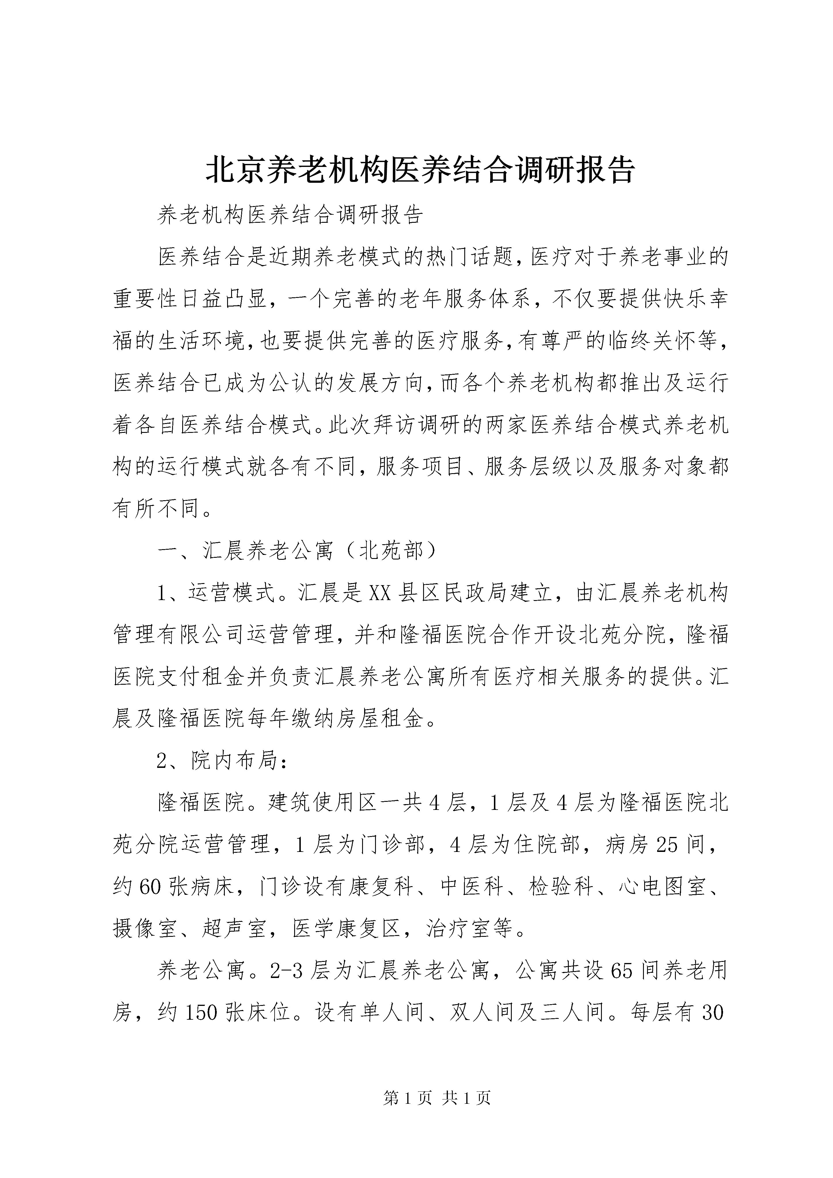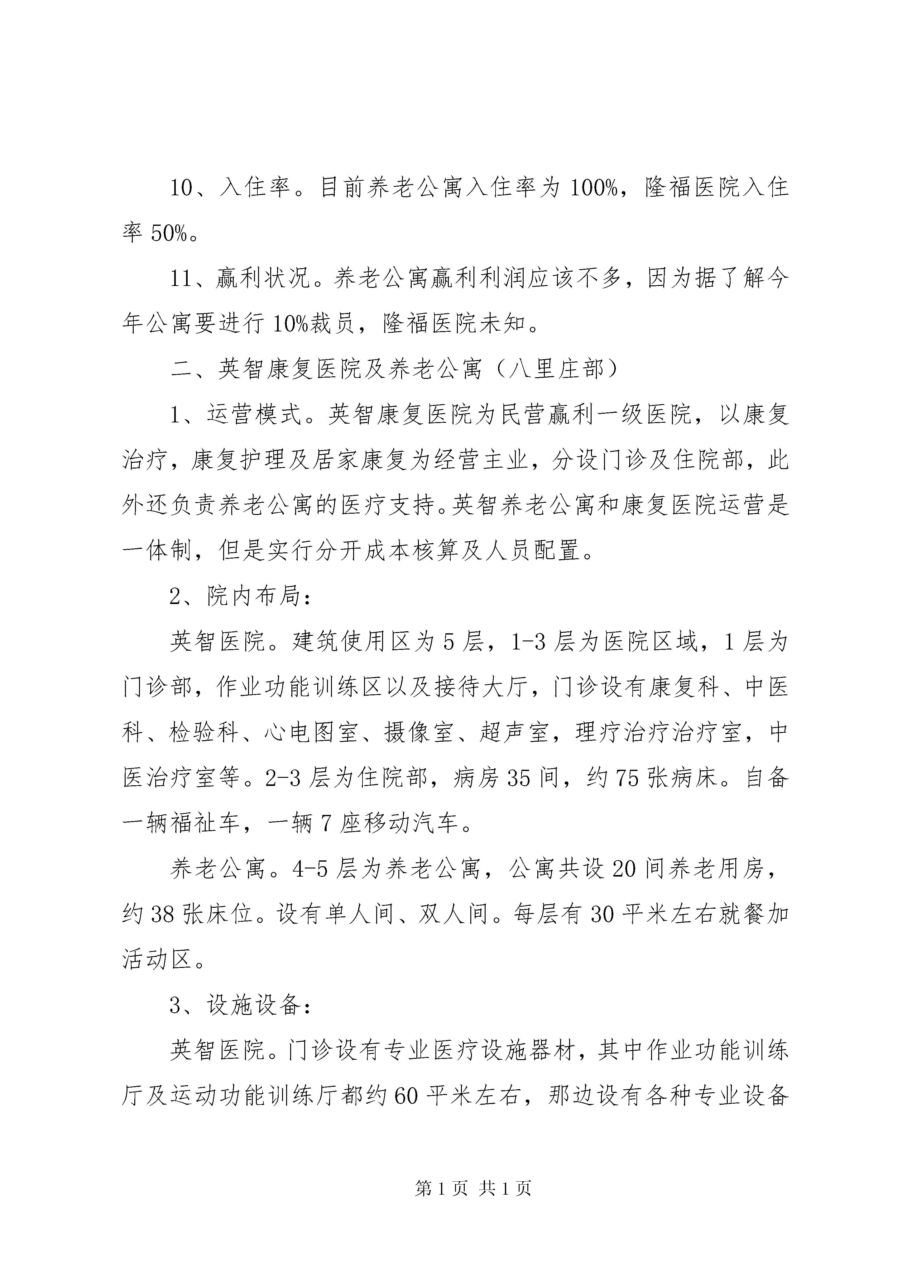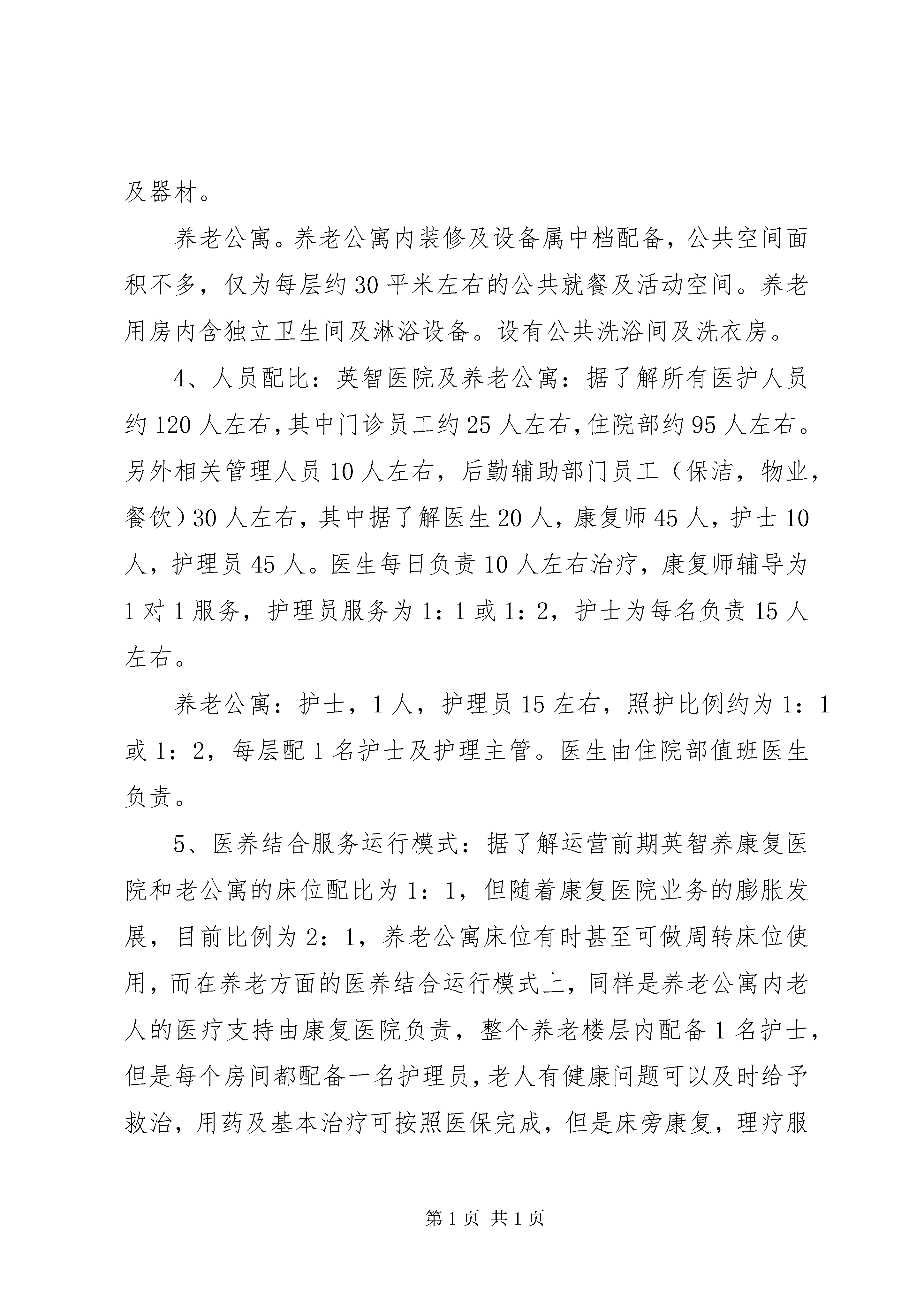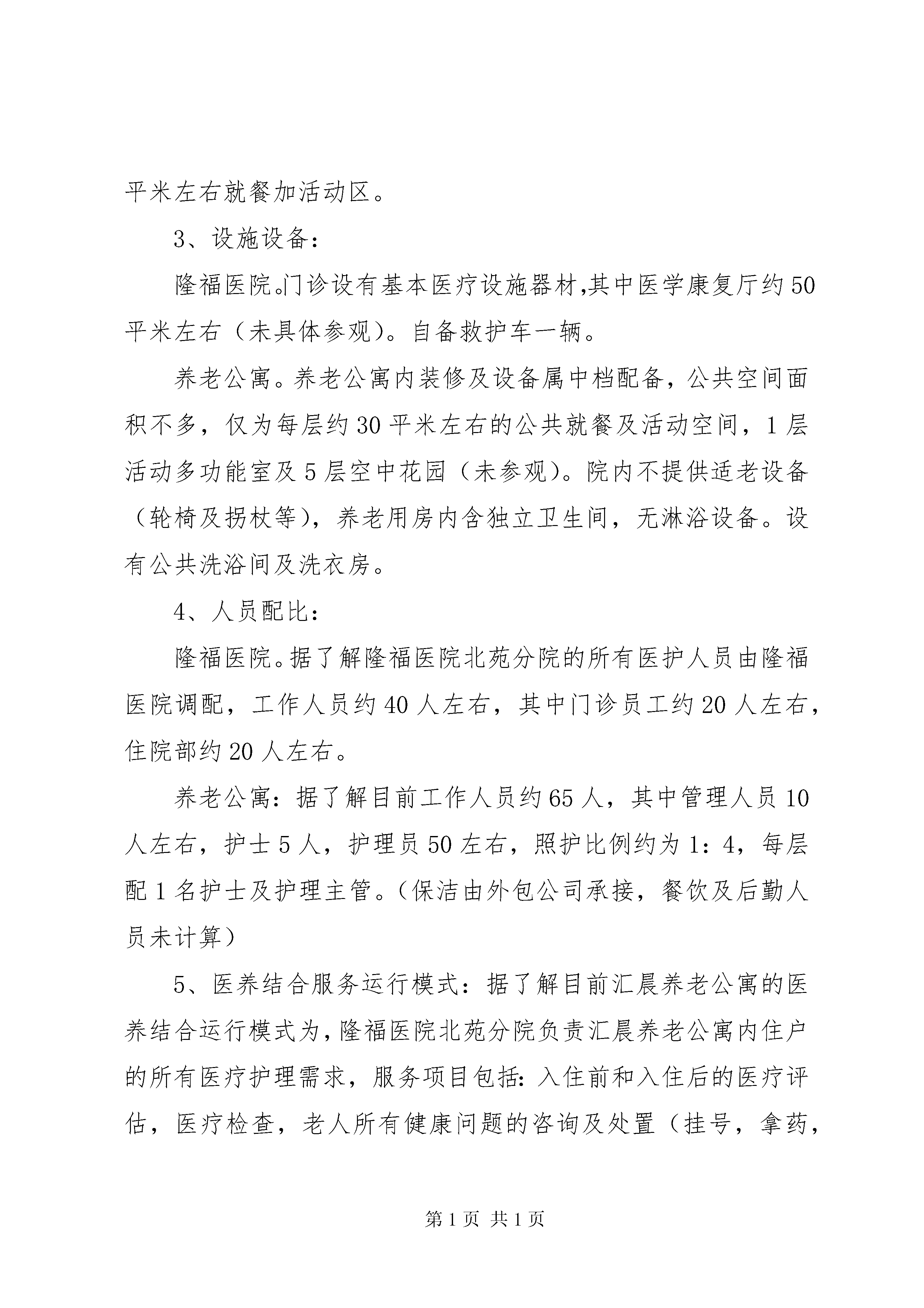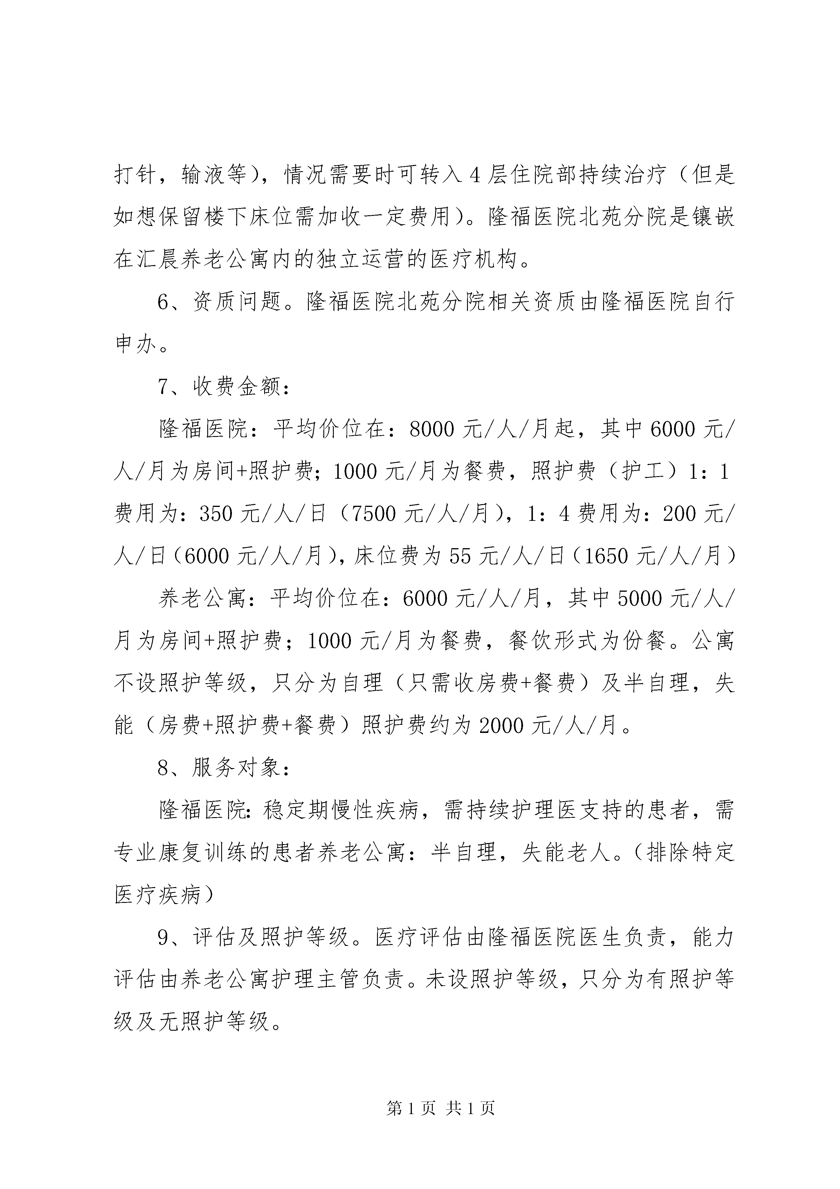 北京养老机构医养结合调研报告养老机构医养结合调研报告医养结合是近期养老模式的热门话题,医疗对于养老事业的重要性日益凸显,一个完善的老年服务体系,不仅要提供快乐幸福的生活环境,也要提供完善的医疗服务,有尊严的临终关怀等,医养结合已成为公认的发展方向,而各个养老机构都推出及运行着各自医养结合模式。此次拜访调研的两家医养结合模式养老机构的运行模式就各有不同,服务项目、服务层级以及服务对象都有所不同。一、汇晨养老公寓(北苑部)1、运营模式。汇晨是XX县区民政局建立,由汇晨养老机构管理有限公司运营管理,并和隆福医院合作开设北苑分院,隆福医院支付租金并负责汇晨养老公寓所有医疗相关服务的提供。汇晨及隆福医院每年缴纳房屋租金。2、院内布局:隆福医院。建筑使用区一共4层,1层及4层为隆福医院北苑分院运营管理,1层为门诊部,4层为住院部,病房25间,约60张病床,门诊设有康复科、中医科、检验科、心电图室、摄像室、超声室,医学康复区,治疗室等。养老公寓。2-3层为汇晨养老公寓,公寓共设65间养老用房,约150张床位。设有单人间、双人间及三人间。每层有30平米左右就餐加活动区。3、设施设备:隆福医院。门诊设有基本医疗设施器材,其中医学康复厅约50平米左右(未具体参观)。自备救护车一辆。养老公寓。养老公寓内装修及设备属中档配备,公共空间面积不多,仅为每层约30平米左右的公共就餐及活动空间,1层活动多功能室及5层空中花园(未参观)。院内不提供适老设备(轮椅及拐杖等),养老用房内含独立卫生间,无淋浴设备。设有公共洗浴间及洗衣房。4、人员配比:隆福医院。据了解隆福医院北苑分院的所有医护人员由隆福医院调配,工作人员约40人左右,其中门诊员工约20人左右,住院部约20人左右。养老公寓:据了解目前工作人员约65人,其中管理人员10人左右,护士5人,护理员50左右,照护比例约为1:4,每层配1名护士及护理主管。(保洁由外包公司承接,餐饮及后勤人员未计算)5、医养结合服务运行模式:据了解目前汇晨养老公寓的医养结合运行模式为,隆福医院北苑分院负责汇晨养老公寓内住户的所有医疗护理需求,服务项目包括:入住前和入住后的医疗评估,医疗检查,老人所有健康问题的咨询及处置(挂号,拿药,打针,输液等),情况需要时可转入4层住院部持续治疗(但是如想保留楼下床位需加收一定费用)。隆福医院北苑分院是镶嵌在汇晨养老公寓内的独立运营的医疗机构。6、资质问题。隆福医院北苑分院相关资质由隆福医院自行申办。7、收费金额:隆福医院:平均价位在:8000元/人/月起,其中6000元/人/月为房间+照护费;1000元/月为餐费,照护费(护工)1:1费用为:350元/人/日(7500元/人/月),1:4费用为:200元/人/日(6000元/人/月),床位费为55元/人/日(1650元/人/月)养老公寓:平均价位在:6000元/人/月,其中5000元/人/月为房间+照护费;1000元/月为餐费,餐饮形式为份餐。公寓不设照护等级,只分为自理(只需收房费+餐费)及半自理,失能(房费+照护费+餐费)照护费约为2000元/人/月。8、服务对象:隆福医院:稳定期慢性疾病,需持续护理医支持的患者,需专业康复训练的患者养老公寓:半自理,失能老人。(排除特定医疗疾病)9、评估及照护等级。医疗评估由隆福医院医生负责,能力评估由养老公寓护理主管负责。未设照护等级,只分为有照护等级及无照护等级。10、入住率。目前养老公寓入住率为100%,隆福医院入住率50%。11、赢利状况。养老公寓赢利利润应该不多,因为据了解今年公寓要进行10%裁员,隆福医院未知。二、英智康复医院及养老公寓(八里庄部)1、运营模式。英智康复医院为民营赢利一级医院,以康复治疗,康复护理及居家康复为经营主业,分设门诊及住院部,此外还负责养老公寓的医疗支持。英智养老公寓和康复医院运营是一体制,但是实行分开成本核算及人员配置。2、院内布局:英智医院。建筑使用区为5层,1-3层为医院区域,1层为门诊部,作业功能训练区以及接待大厅,门诊设有康复科、中医科、检验科、心电图室、摄像室、超声室,理疗治疗治疗室,中医治疗室等。2-3层为住院部,病房35间,约75张病床。自备一辆福祉车,一辆7座移动汽车。养老公寓。4-5层为养老公寓,公寓共设20间养老用房,约38张床位。设有单人间、双人间。每层有30平米左右就餐加活动区。3、设施设备:英智医院。门诊设有专业医疗设施器材,其中作业功能训练厅及运动功能训练厅都约60平米左右,那边设有各种专业设备及器材。养老公寓。养老公寓内装修及设备属中档配备,公共空间面积不多,仅为每层约30平米左右的公共就餐及活动空间。养老用房内含独立卫生间及淋浴设备。设有公共洗浴间及洗衣房。4、人员配比:英智医院及养老公寓:据了解所有医护人