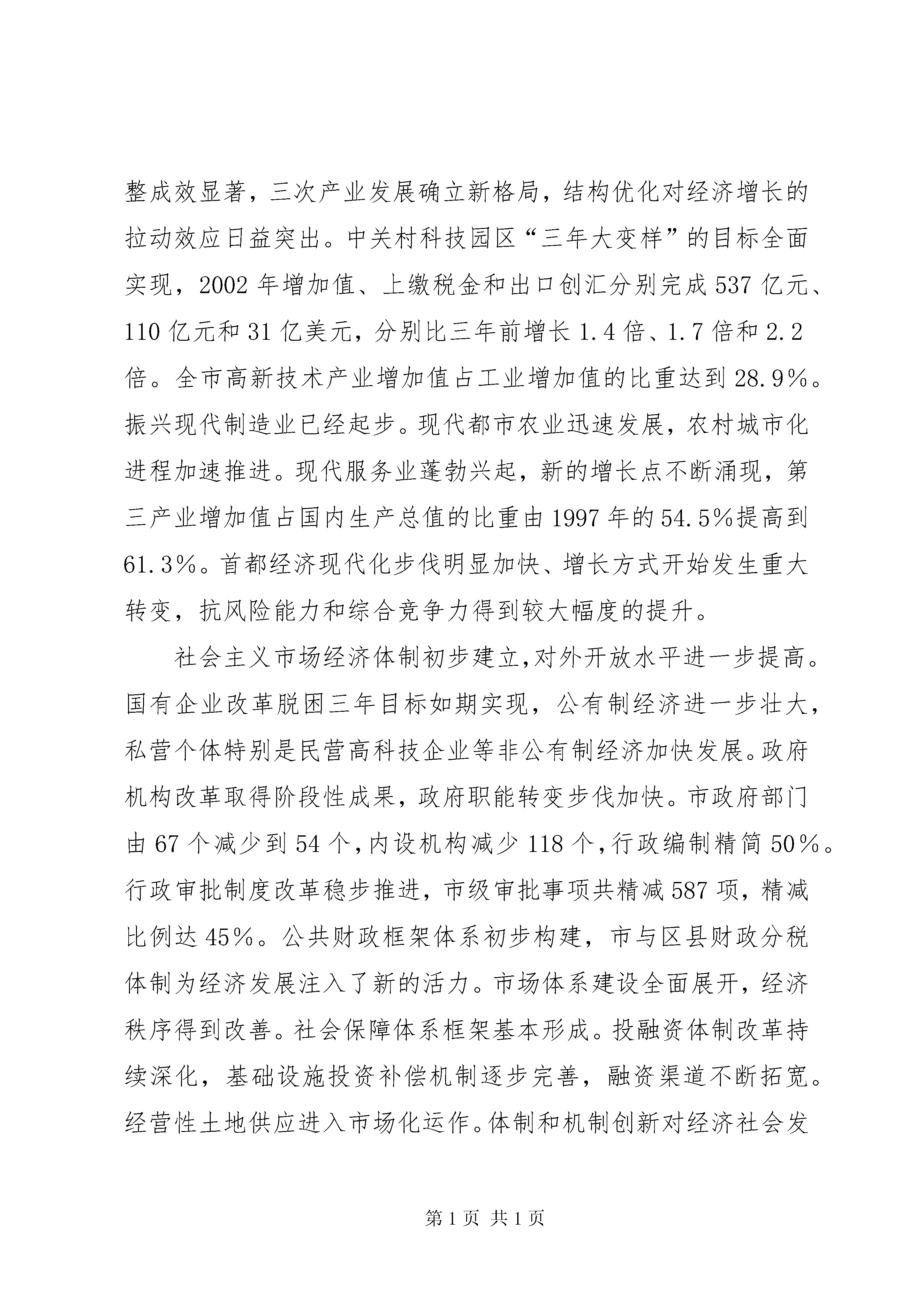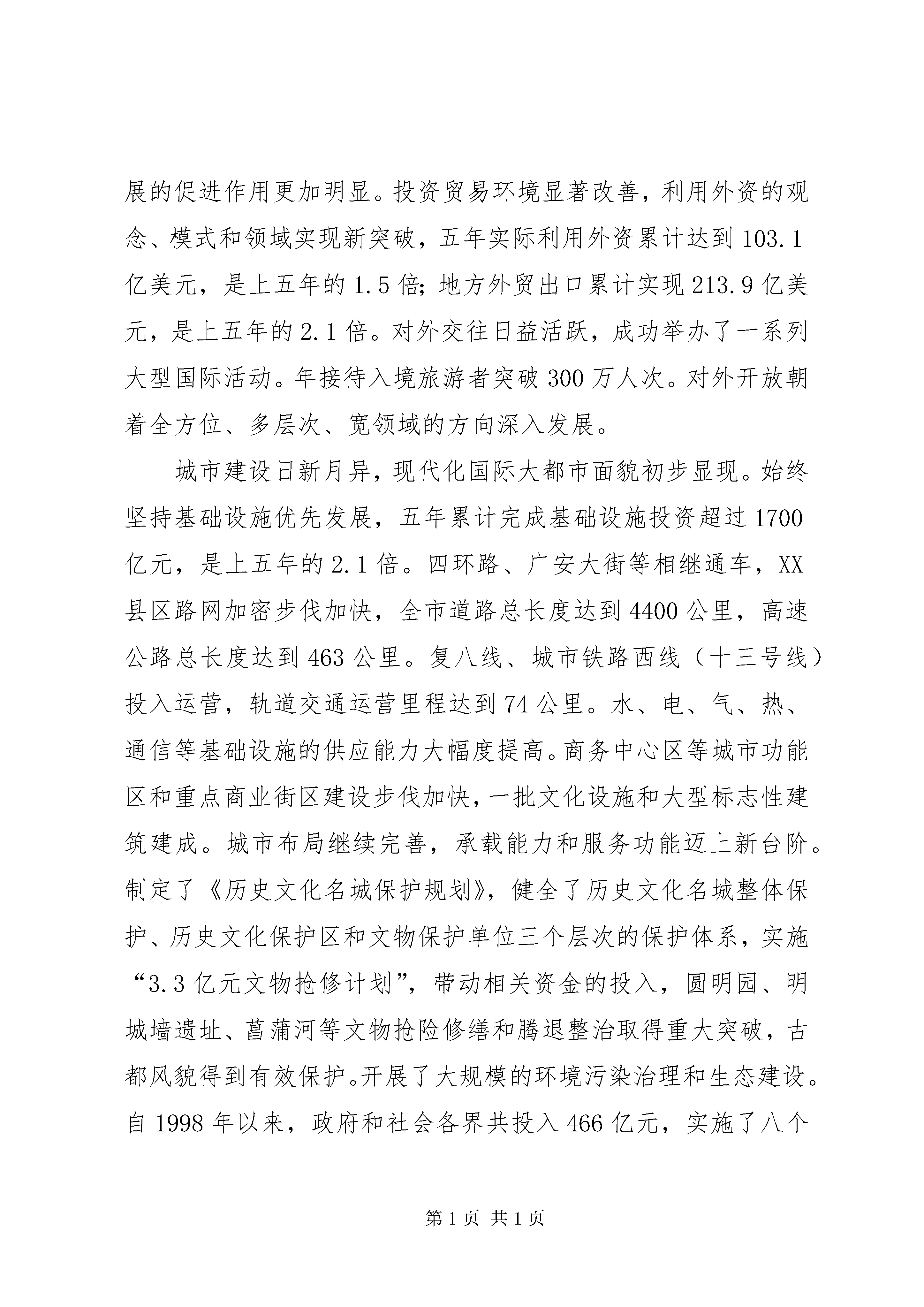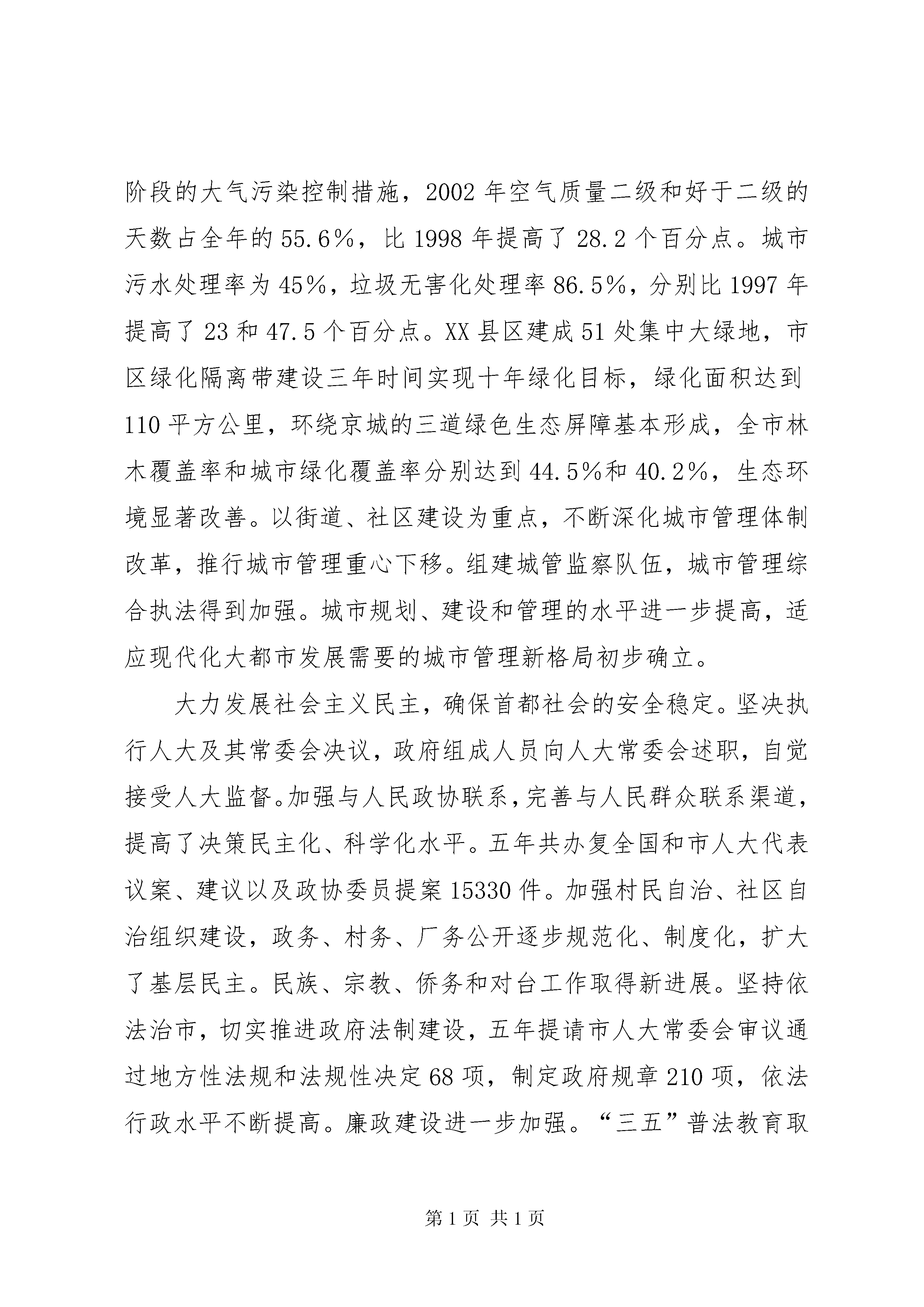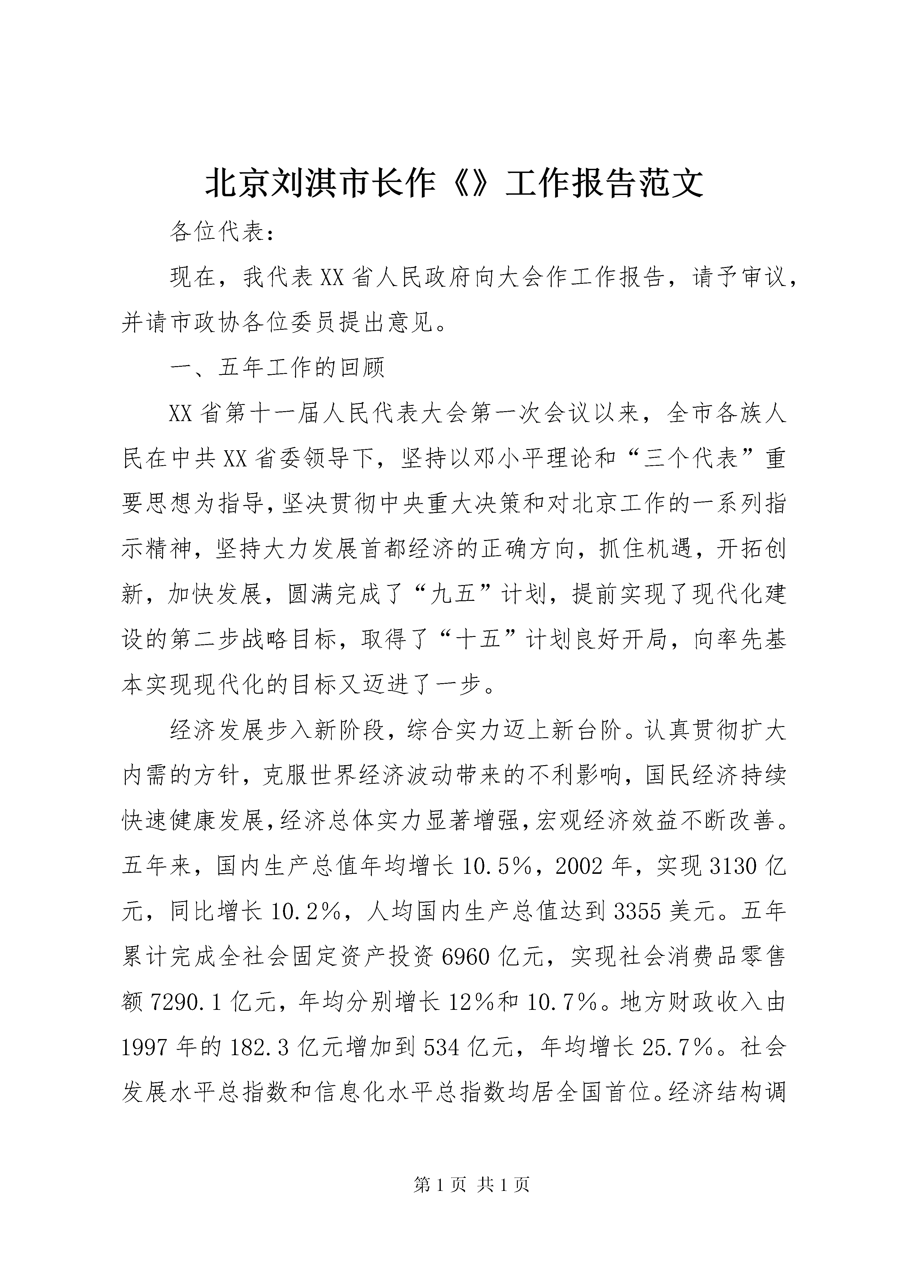 北京刘淇市长作《》工作报告范文各位代表:现在,我代表XX省人民政府向大会作工作报告,请予审议,并请市政协各位委员提出意见。一、五年工作的回顾XX省第十一届人民代表大会第一次会议以来,全市各族人民在中共XX省委领导下,坚持以邓小平理论和“三个代表”重要思想为指导,坚决贯彻中央重大决策和对北京工作的一系列指示精神,坚持大力发展首都经济的正确方向,抓住机遇,开拓创新,加快发展,圆满完成了“九五”计划,提前实现了现代化建设的第二步战略目标,取得了“十五”计划良好开局,向率先基本实现现代化的目标又迈进了一步。经济发展步入新阶段,综合实力迈上新台阶。认真贯彻扩大内需的方针,克服世界经济波动带来的不利影响,国民经济持续快速健康发展,经济总体实力显著增强,宏观经济效益不断改善。五年来,国内生产总值年均增长10.5%,2002年,实现3130亿元,同比增长10.2%,人均国内生产总值达到3355美元。五年累计完成全社会固定资产投资6960亿元,实现社会消费品零售额7290.1亿元,年均分别增长12%和10.7%。地方财政收入由1997年的182.3亿元增加到534亿元,年均增长25.7%。社会发展水平总指数和信息化水平总指数均居全国首位。经济结构调整成效显著,三次产业发展确立新格局,结构优化对经济增长的拉动效应日益突出。中关村科技园区“三年大变样”的目标全面实现,2002年增加值、上缴税金和出口创汇分别完成537亿元、110亿元和31亿美元,分别比三年前增长1.4倍、1.7倍和2.2倍。全市高新技术产业增加值占工业增加值的比重达到28.9%。振兴现代制造业已经起步。现代都市农业迅速发展,农村城市化进程加速推进。现代服务业蓬勃兴起,新的增长点不断涌现,第三产业增加值占国内生产总值的比重由1997年的54.5%提高到61.3%。首都经济现代化步伐明显加快、增长方式开始发生重大转变,抗风险能力和综合竞争力得到较大幅度的提升。社会主义市场经济体制初步建立,对外开放水平进一步提高。国有企业改革脱困三年目标如期实现,公有制经济进一步壮大,私营个体特别是民营高科技企业等非公有制经济加快发展。政府机构改革取得阶段性成果,政府职能转变步伐加快。市政府部门由67个减少到54个,内设机构减少118个,行政编制精简50%。行政审批制度改革稳步推进,市级审批事项共精减587项,精减比例达45%。公共财政框架体系初步构建,市与区县财政分税体制为经济发展注入了新的活力。市场体系建设全面展开,经济秩序得到改善。社会保障体系框架基本形成。投融资体制改革持续深化,基础设施投资补偿机制逐步完善,融资渠道不断拓宽。经营性土地供应进入市场化运作。体制和机制创新对经济社会发展的促进作用更加明显。投资贸易环境显著改善,利用外资的观念、模式和领域实现新突破,五年实际利用外资累计达到103.1亿美元,是上五年的1.5倍;地方外贸出口累计实现213.9亿美元,是上五年的2.1倍。对外交往日益活跃,成功举办了一系列大型国际活动。年接待入境旅游者突破300万人次。对外开放朝着全方位、多层次、宽领域的方向深入发展。城市建设日新月异,现代化国际大都市面貌初步显现。始终坚持基础设施优先发展,五年累计完成基础设施投资超过1700亿元,是上五年的2.1倍。四环路、广安大街等相继通车,XX县区路网加密步伐加快,全市道路总长度达到4400公里,高速公路总长度达到463公里。复八线、城市铁路西线(十三号线)投入运营,轨道交通运营里程达到74公里。水、电、气、热、通信等基础设施的供应能力大幅度提高。商务中心区等城市功能区和重点商业街区建设步伐加快,一批文化设施和大型标志性建筑建成。城市布局继续完善,承载能力和服务功能迈上新台阶。制定了《历史文化名城保护规划》,健全了历史文化名城整体保护、历史文化保护区和文物保护单位三个层次的保护体系,实施“3.3亿元文物抢修计划”,带动相关资金的投入,圆明园、明城墙遗址、菖蒲河等文物抢险修缮和腾退整治取得重大突破,古都风貌得到有效保护。开展了大规模的环境污染治理和生态建设。自1998年以来,政府和社会各界共投入466亿元,实施了八个阶段的大气污染控制措施,2002年空气质量二级和好于二级的天数占全年的55.6%,比1998年提高了28.2个百分点。城市污水处理率为45%,垃圾无害化处理率86.5%,分别比1997年提高了23和47.5个百分点。XX县区建成51处集中大绿地,市区绿化隔离带建设三年时间实现十年绿化目标,绿化面积达到110平方公里,环绕京城的三道绿色生态屏障基本形成,全市林木覆盖率和城市绿化覆盖率分别达到44.5%和40.2%,生态环境显著改善。以街道、社区建设为重点,不断深化城市管理体制改革,推行城市管理重心下移。组建城管监察队伍,城市管理综合