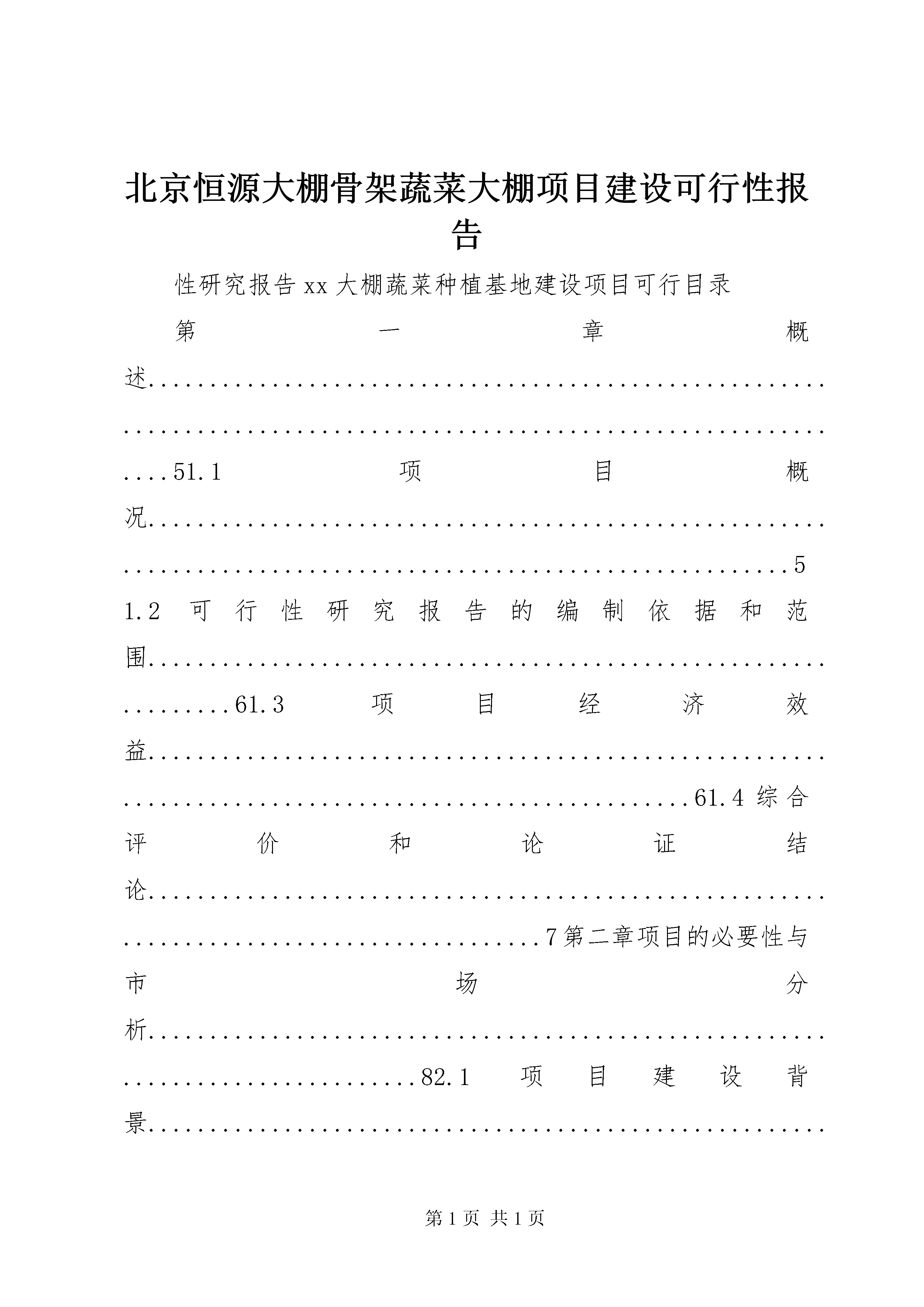 北京恒源大棚骨架蔬菜大棚项目建设可行性报告性研究报告xx大棚蔬菜种植基地建设项目可行目录第一章概述....................................................................................................................51.1项目概况.............................................................................................................51.2可行性研究报告的编制依据和范围................................................................61.3项目经济效益.....................................................................................................61.4综合评价和论证结论.........................................................................................7第二章项目的必要性与市场分析...............................................................................82.1项目建设背景.....................................................................................................82.2项目建设的必要性..........................................................................................102.3市场分析..........................................................................................................112.4市场风险分析..................................................................................................13第三章建设条件.........................................................................................................143.1区域概况..........................................................................................................143.2项目关联产业发展现状.................................................................................163.3项目建设条件优劣势分析.............................................................................17第四章建设规模和生产设计方案............................................................................194.1建设规模及内容..............................................................................................194.2生产方案..........................................................................................................204.3温室大棚建设方案..........................................................................................222第五章节能....................................