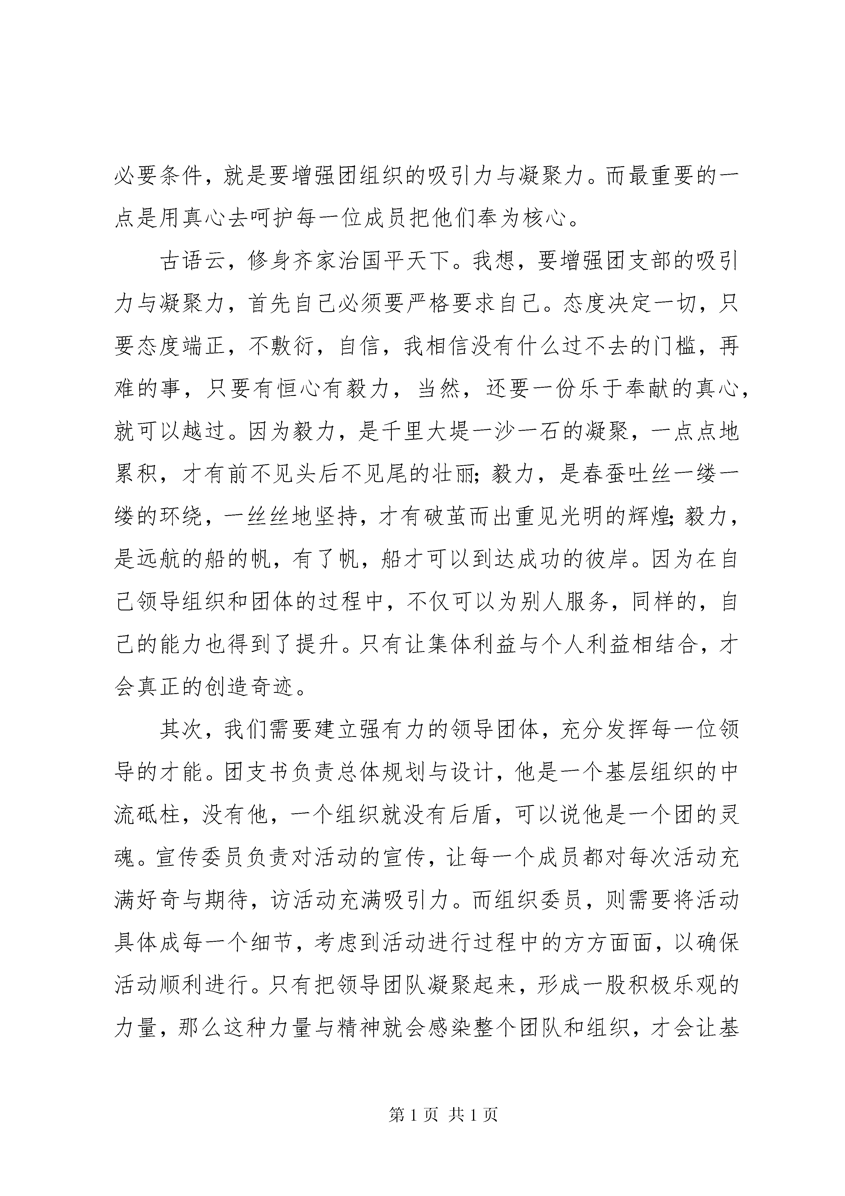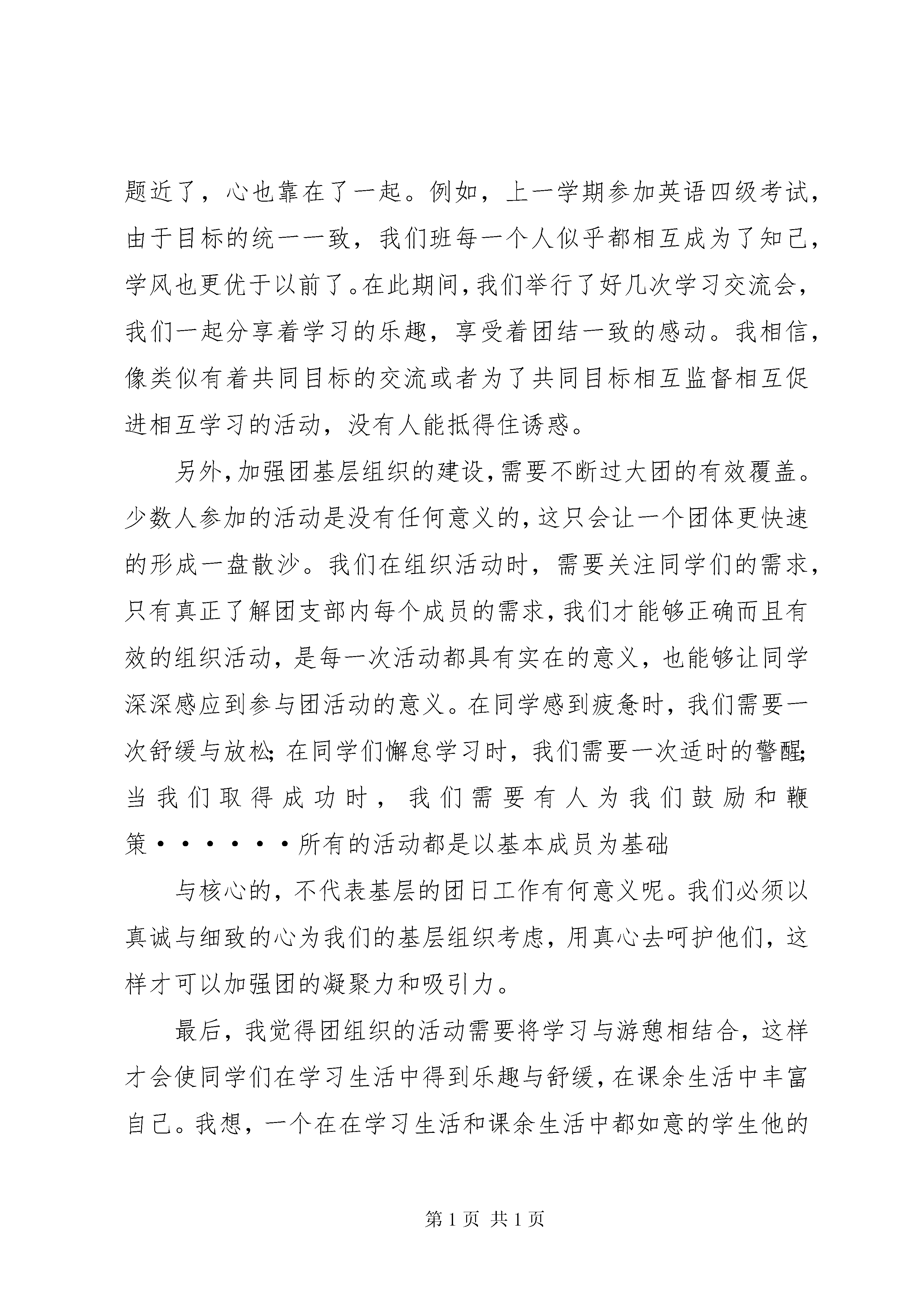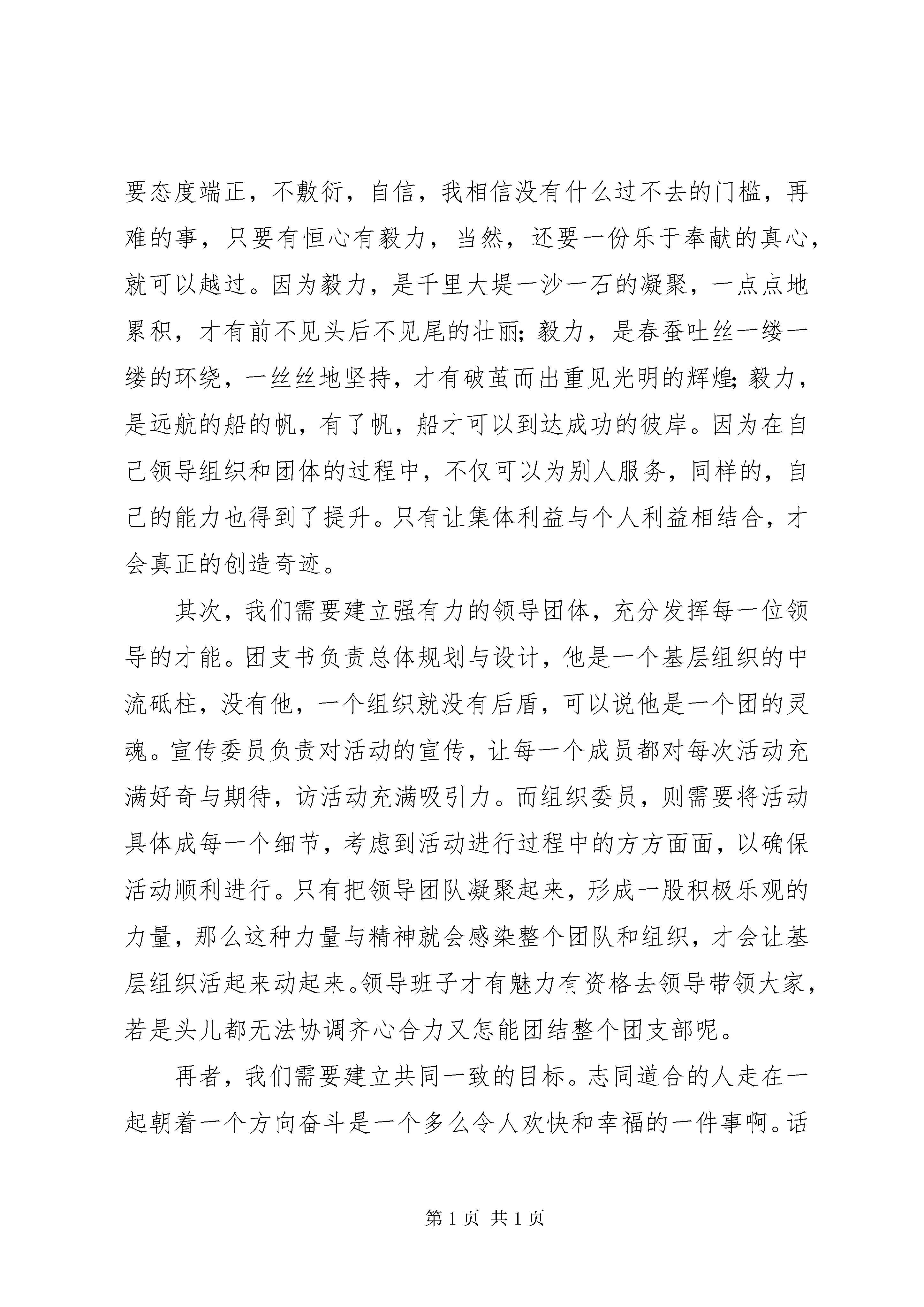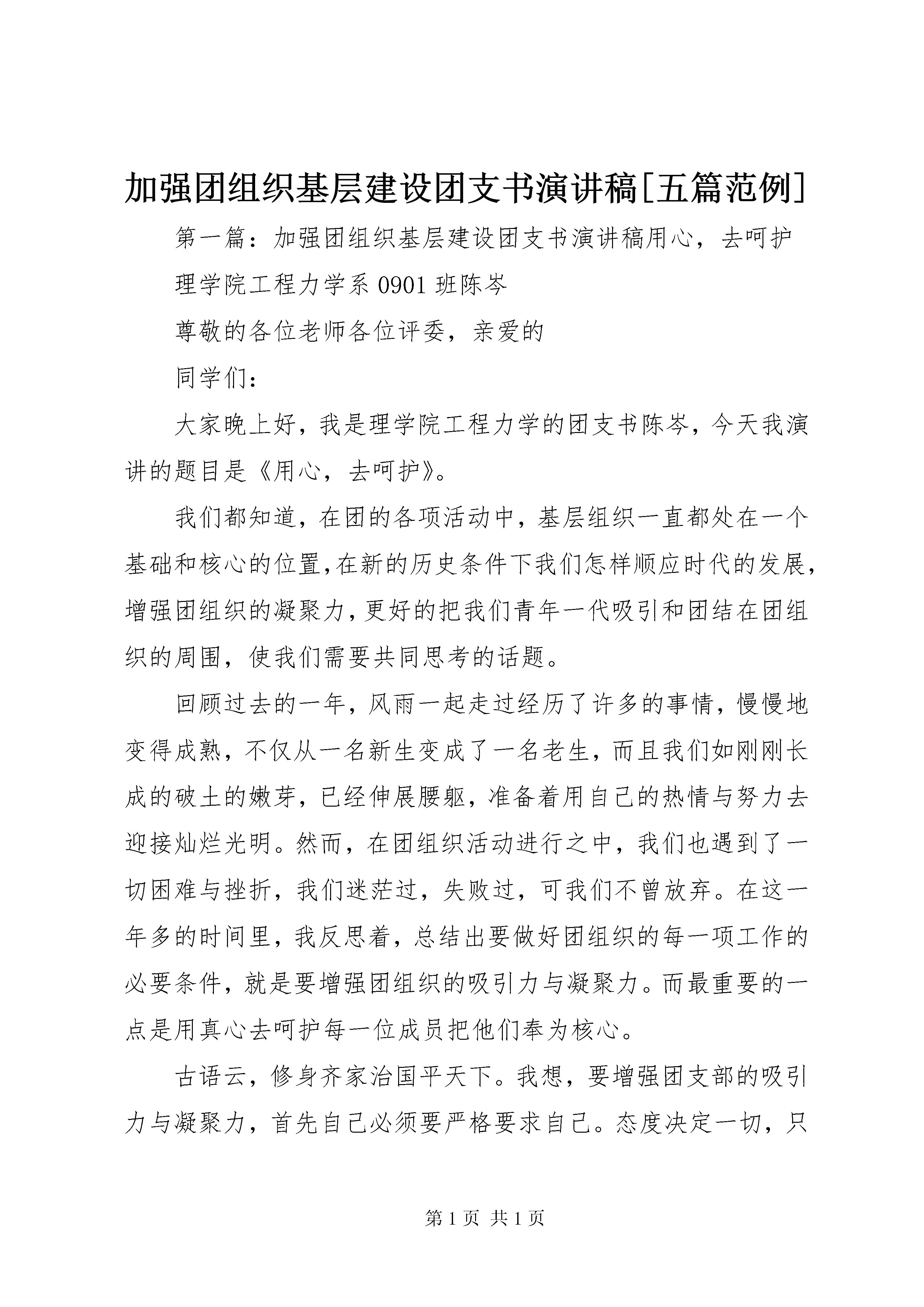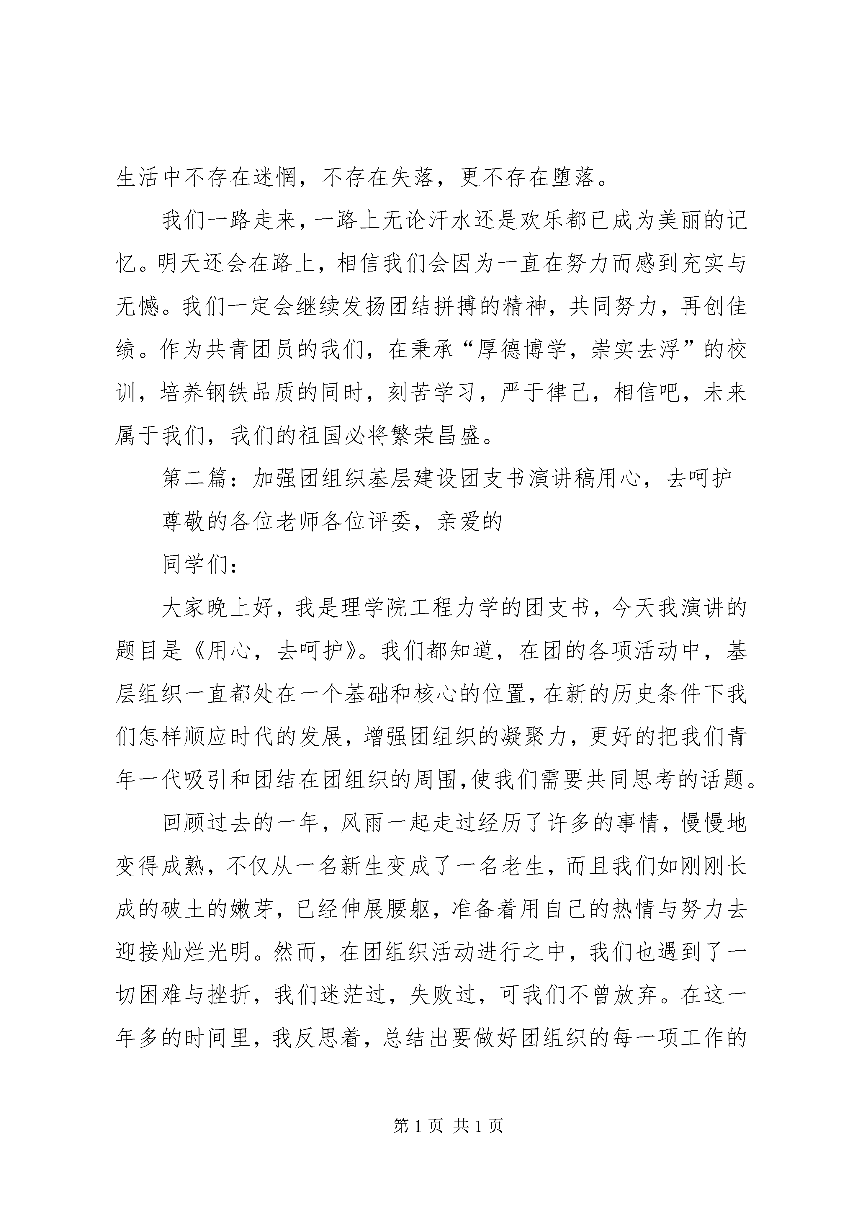 加强团组织基层建设团支书演讲稿[五篇范例]第一篇:加强团组织基层建设团支书演讲稿用心,去呵护理学院工程力学系0901班陈岑尊敬的各位老师各位评委,亲爱的同学们:大家晚上好,我是理学院工程力学的团支书陈岑,今天我演讲的题目是《用心,去呵护》。我们都知道,在团的各项活动中,基层组织一直都处在一个基础和核心的位置,在新的历史条件下我们怎样顺应时代的发展,增强团组织的凝聚力,更好的把我们青年一代吸引和团结在团组织的周围,使我们需要共同思考的话题。回顾过去的一年,风雨一起走过经历了许多的事情,慢慢地变得成熟,不仅从一名新生变成了一名老生,而且我们如刚刚长成的破土的嫩芽,已经伸展腰躯,准备着用自己的热情与努力去迎接灿烂光明。然而,在团组织活动进行之中,我们也遇到了一切困难与挫折,我们迷茫过,失败过,可我们不曾放弃。在这一年多的时间里,我反思着,总结出要做好团组织的每一项工作的必要条件,就是要增强团组织的吸引力与凝聚力。而最重要的一点是用真心去呵护每一位成员把他们奉为核心。古语云,修身齐家治国平天下。我想,要增强团支部的吸引力与凝聚力,首先自己必须要严格要求自己。态度决定一切,只要态度端正,不敷衍,自信,我相信没有什么过不去的门槛,再难的事,只要有恒心有毅力,当然,还要一份乐于奉献的真心,就可以越过。因为毅力,是千里大堤一沙一石的凝聚,一点点地累积,才有前不见头后不见尾的壮丽;毅力,是春蚕吐丝一缕一缕的环绕,一丝丝地坚持,才有破茧而出重见光明的辉煌;毅力,是远航的船的帆,有了帆,船才可以到达成功的彼岸。因为在自己领导组织和团体的过程中,不仅可以为别人服务,同样的,自己的能力也得到了提升。只有让集体利益与个人利益相结合,才会真正的创造奇迹。其次,我们需要建立强有力的领导团体,充分发挥每一位领导的才能。团支书负责总体规划与设计,他是一个基层组织的中流砥柱,没有他,一个组织就没有后盾,可以说他是一个团的灵魂。宣传委员负责对活动的宣传,让每一个成员都对每次活动充满好奇与期待,访活动充满吸引力。而组织委员,则需要将活动具体成每一个细节,考虑到活动进行过程中的方方面面,以确保活动顺利进行。只有把领导团队凝聚起来,形成一股积极乐观的力量,那么这种力量与精神就会感染整个团队和组织,才会让基层组织活起来动起来。领导班子才有魅力有资格去领导带领大家,若是头儿都无法协调齐心合力又怎能团结整个团支部呢。再者,我们需要建立共同一致的目标。志同道合的人走在一起朝着一个方向奋斗是一个多么令人欢快和幸福的一件事啊。话题近了,心也靠在了一起。例如,上一学期参加英语四级考试,由于目标的统一一致,我们班每一个人似乎都相互成为了知己,学风也更优于以前了。在此期间,我们举行了好几次学习交流会,我们一起分享着学习的乐趣,享受着团结一致的感动。我相信,像类似有着共同目标的交流或者为了共同目标相互监督相互促进相互学习的活动,没有人能抵得住诱惑。另外,加强团基层组织的建设,需要不断过大团的有效覆盖。少数人参加的活动是没有任何意义的,这只会让一个团体更快速的形成一盘散沙。我们在组织活动时,需要关注同学们的需求,只有真正了解团支部内每个成员的需求,我们才能够正确而且有效的组织活动,是每一次活动都具有实在的意义,也能够让同学深深感应到参与团活动的意义。在同学感到疲惫时,我们需要一次舒缓与放松;在同学们懈怠学习时,我们需要一次适时的警醒;当我们取得成功时,我们需要有人为我们鼓励和鞭策······所有的活动都是以基本成员为基础与核心的,不代表基层的团日工作有何意义呢。我们必须以真诚与细致的心为我们的基层组织考虑,用真心去呵护他们,这样才可以加强团的凝聚力和吸引力。最后,我觉得团组织的活动需要将学习与游憩相结合,这样才会使同学们在学习生活中得到乐趣与舒缓,在课余生活中丰富自己。我想,一个在在学习生活和课余生活中都如意的学生他的生活中不存在迷惘,不存在失落,更不存在堕落。我们一路走来,一路上无论汗水还是欢乐都已成为美丽的记忆。明天还会在路上,相信我们会因为一直在努力而感到充实与无憾。我们一定会继续发扬团结拼搏的精神,共同努力,再创佳绩。作为共青团员的我们,在秉承“厚德博学,崇实去浮”的校训,培养钢铁品质的同时,刻苦学习,严于律己,相信吧,未来属于我们,我们的祖国必将繁荣昌盛。第二篇:加强团组织基层建设团支书演讲稿用心,去呵护尊敬的各位老师各位评委,亲爱的同学们:大家晚上好,我是理学院工程力学的团支书,今天我演讲的题目是《用心,去呵护》。我们都知道,在团的各项活动中,基层组织一直都处在一个基础和核心的位置,在新的历史条件下我们怎样顺应时代的发展,增强团组织的凝聚力,更好的把我们青年一代吸引和团结在团组织的周围,使我们需要共同思考的话题。回顾过去的一年,风雨一起走过经历了许多的事情