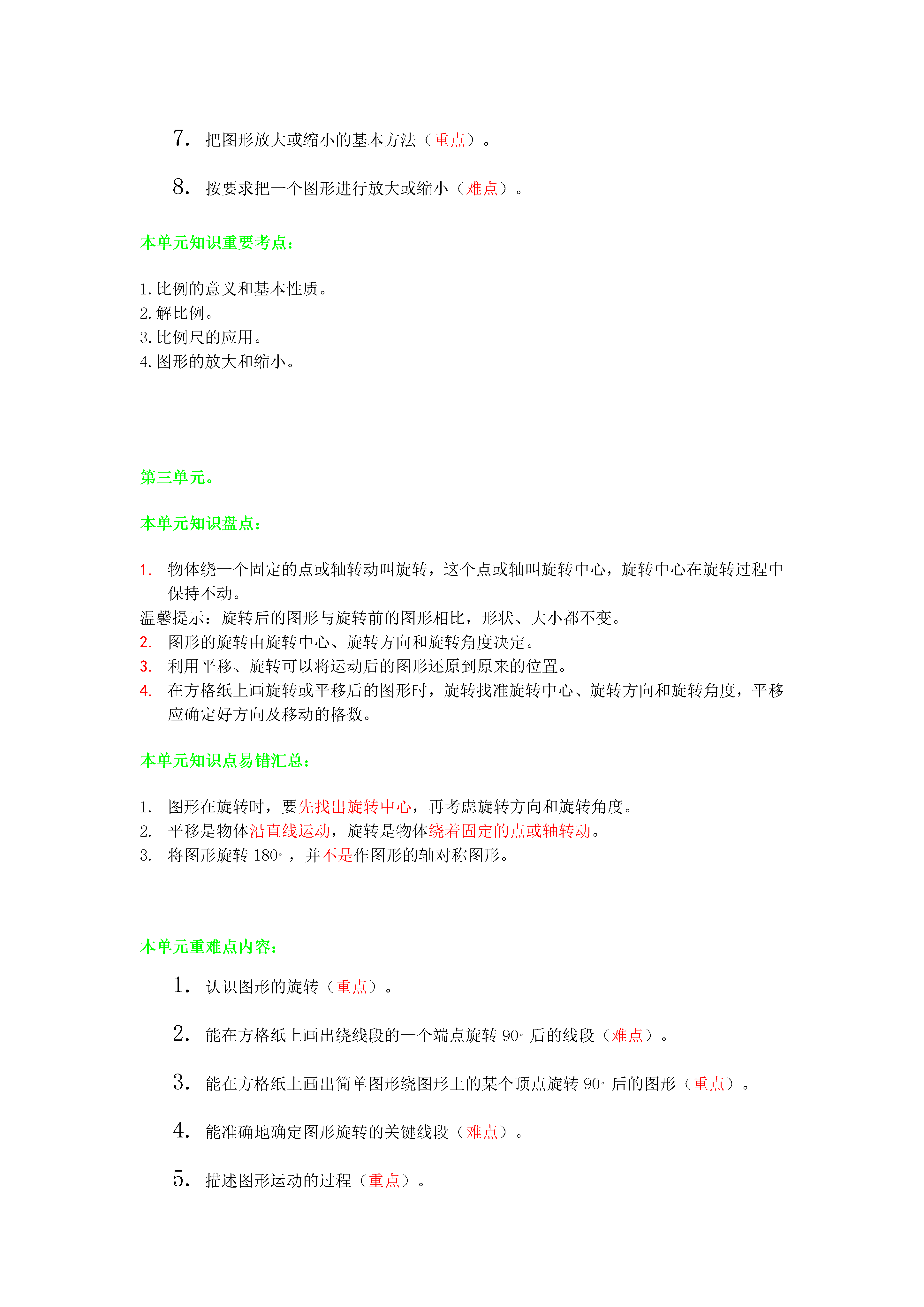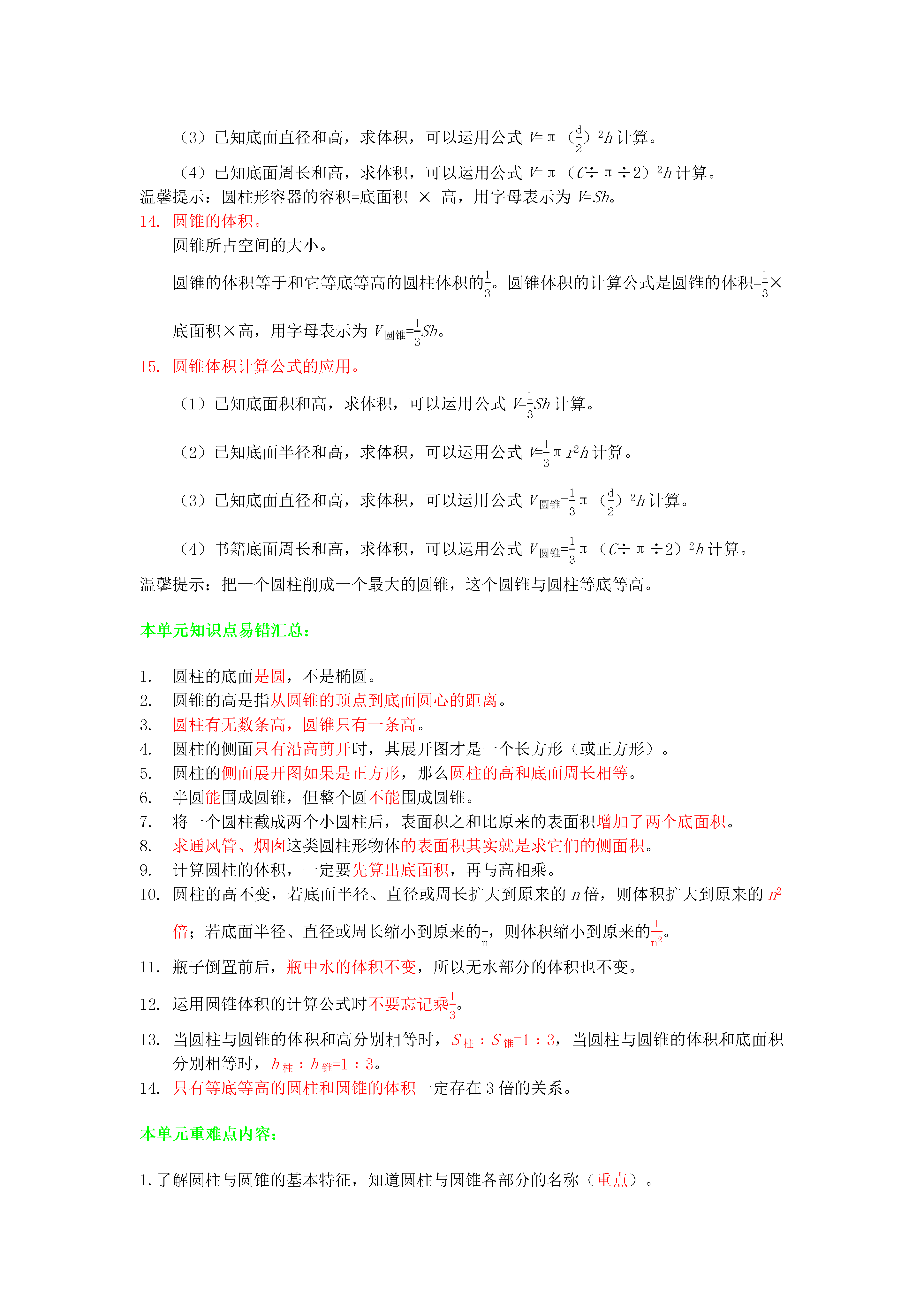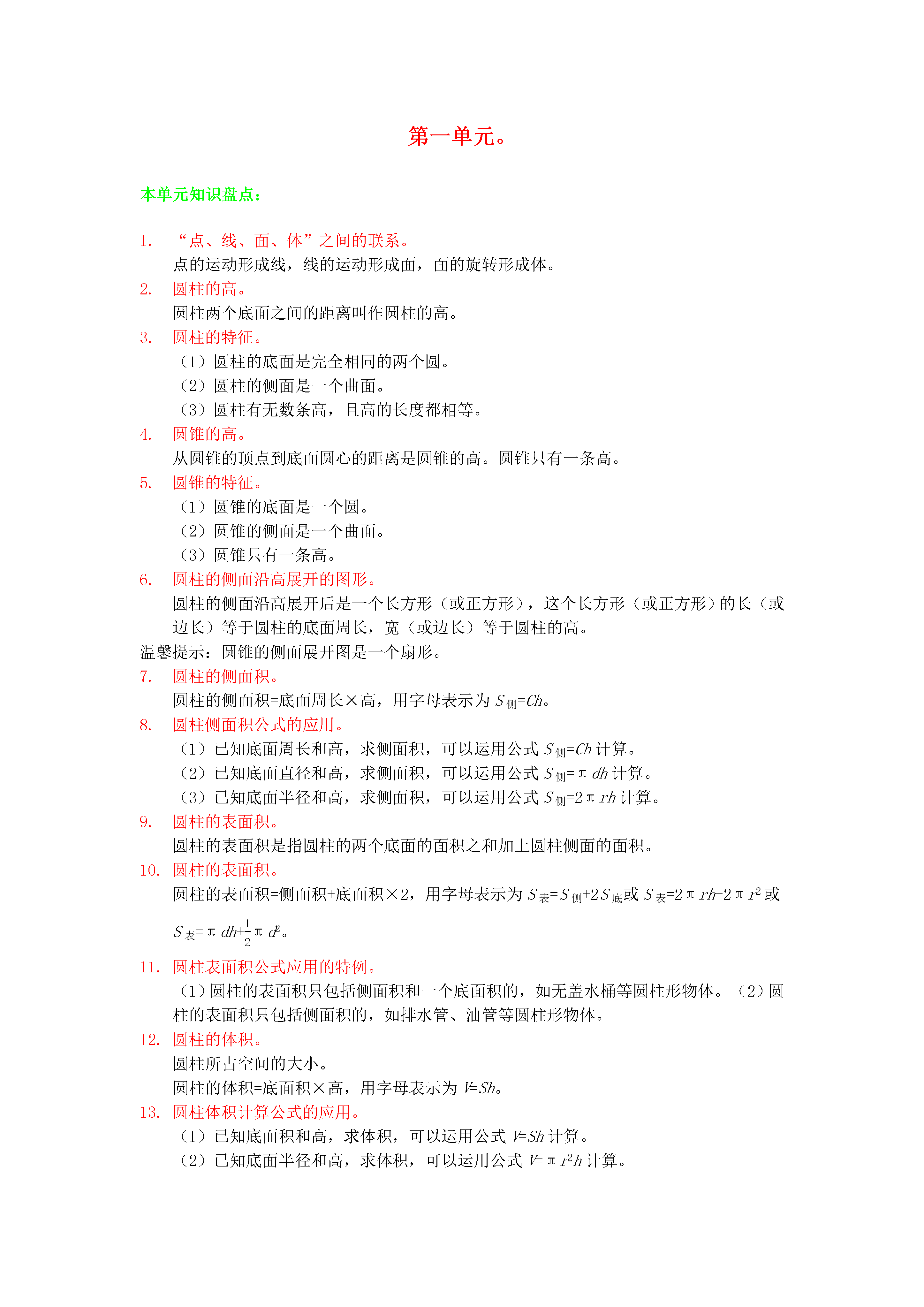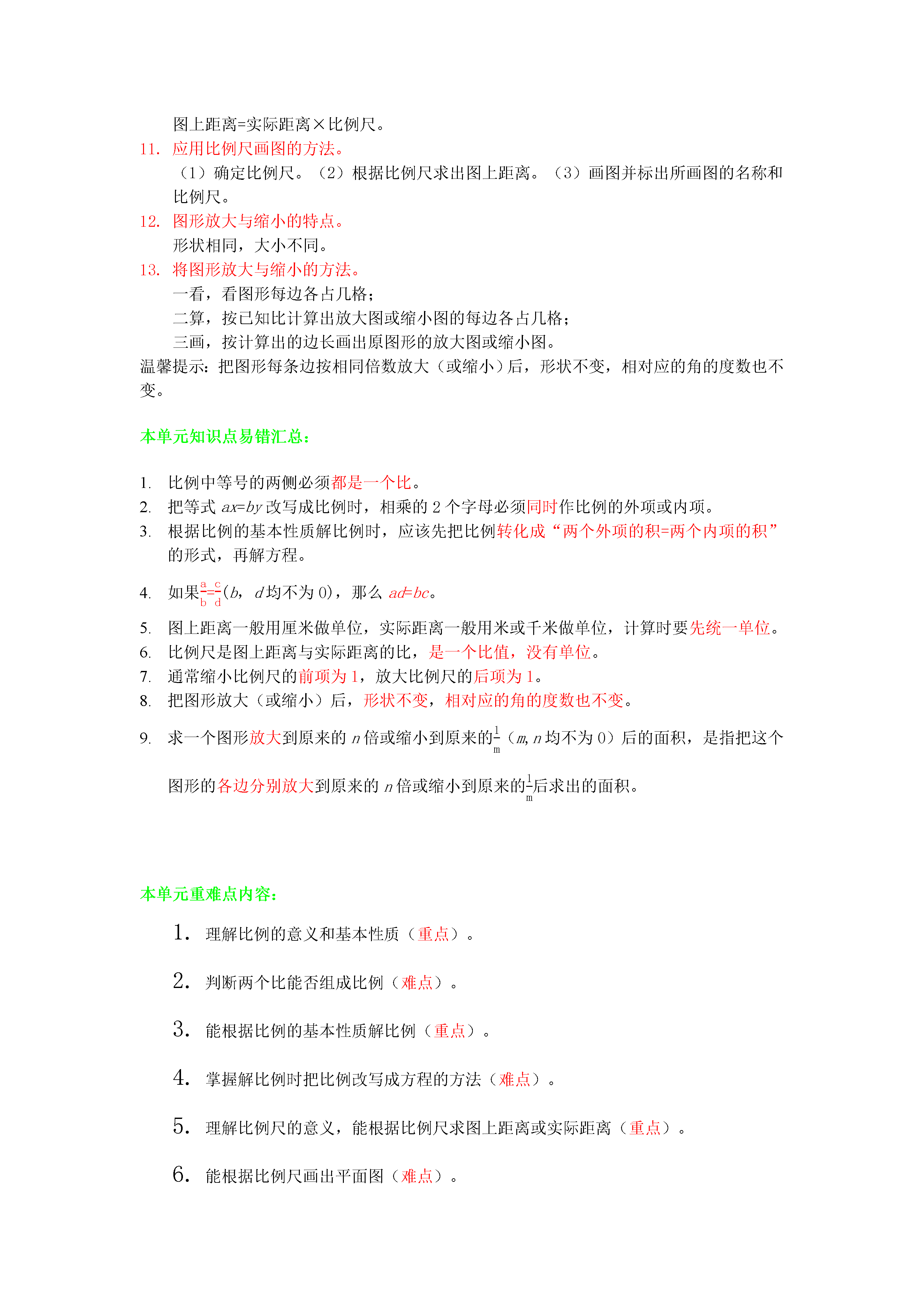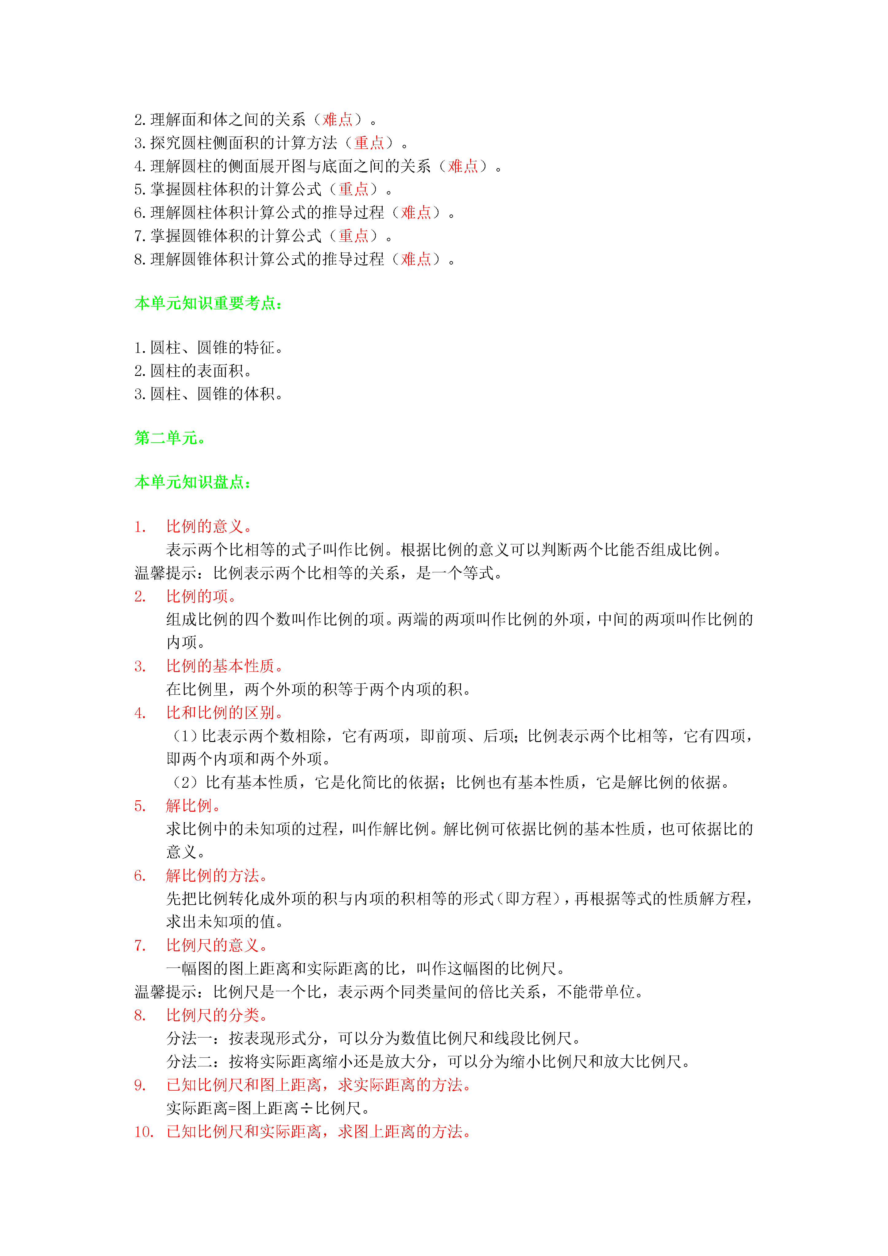 第一单元。本单元知识盘点:“点、线、面、体”之间的联系。点的运动形成线,线的运动形成面,面的旋转形成体。圆柱的高。圆柱两个底面之间的距离叫作圆柱的高。圆柱的特征。(1)圆柱的底面是完全相同的两个圆。(2)圆柱的侧面是一个曲面。(3)圆柱有无数条高,且高的长度都相等。圆锥的高。从圆锥的顶点到底面圆心的距离是圆锥的高。圆锥只有一条高。圆锥的特征。(1)圆锥的底面是一个圆。(2)圆锥的侧面是一个曲面。(3)圆锥只有一条高。圆柱的侧面沿高展开的图形。圆柱的侧面沿高展开后是一个长方形(或正方形),这个长方形(或正方形)的长(或边长)等于圆柱的底面周长,宽(或边长)等于圆柱的高。温馨提示:圆锥的侧面展开图是一个扇形。圆柱的侧面积。圆柱的侧面积=底面周长×高,用字母表示为S侧=Ch。圆柱侧面积公式的应用。(1)已知底面周长和高,求侧面积,可以运用公式S侧=Ch计算。(2)已知底面直径和高,求侧面积,可以运用公式S侧=πdh计算。(3)已知底面半径和高,求侧面积,可以运用公式S侧=2πrh计算。圆柱的表面积。圆柱的表面积是指圆柱的两个底面的面积之和加上圆柱侧面的面积。圆柱的表面积。圆柱的表面积=侧面积+底面积×2,用字母表示为S表=S侧+2S底或S表=2πrh+2πr2或S表=πdh+12πd2。圆柱表面积公式应用的特例。(1)圆柱的表面积只包括侧面积和一个底面积的,如无盖水桶等圆柱形物体。(2)圆柱的表面积只包括侧面积的,如排水管、油管等圆柱形物体。圆柱的体积。圆柱所占空间的大小。圆柱的体积=底面积×高,用字母表示为V=Sh。圆柱体积计算公式的应用。(1)已知底面积和高,求体积,可以运用公式V=Sh计算。(2)已知底面半径和高,求体积,可以运用公式V=πr2h计算。(3)已知底面直径和高,求体积,可以运用公式V=π(d2)2h计算。(4)已知底面周长和高,求体积,可以运用公式V=π(C÷π÷2)2h计算。温馨提示:圆柱形容器的容积=底面积×高,用字母表示为V=Sh。圆锥的体积。圆锥所占空间的大小。圆锥的体积等于和它等底等高的圆柱体积的13。圆锥体积的计算公式是圆锥的体积=13×底面积×高,用字母表示为V圆锥=13Sh。圆锥体积计算公式的应用。(1)已知底面积和高,求体积,可以运用公式V=13Sh计算。(2)已知底面半径和高,求体积,可以运用公式V=13πr2h计算。(3)已知底面直径和高,求体积,可以运用公式V圆锥=13π(d2)2h计算。(4)书籍底面周长和高,求体积,可以运用公式V圆锥=13π(C÷π÷2)2h计算。温馨提示:把一个圆柱削成一个最大的圆锥,这个圆锥与圆柱等底等高。本单元知识点易错汇总:圆柱的底面是圆,不是椭圆。圆锥的高是指从圆锥的顶点到底面圆心的距离。圆柱有无数条高,圆锥只有一条高。圆柱的侧面只有沿高剪开时,其展开图才是一个长方形(或正方形)。圆柱的侧面展开图如果是正方形,那么圆柱的高和底面周长相等。半圆能围成圆锥,但整个圆不能围成圆锥。将一个圆柱截成两个小圆柱后,表面积之和比原来的表面积增加了两个底面积。求通风管、烟囱这类圆柱形物体的表面积其实就是求它们的侧面积。计算圆柱的体积,一定要先算出底面积,再与高相乘。圆柱的高不变,若底面半径、直径或周长扩大到原来的n倍,则体积扩大到原来的n2倍;若底面半径、直径或周长缩小到原来的1n,则体积缩小到原来的1n2。瓶子倒置前后,瓶中水的体积不变,所以无水部分的体积也不变。运用圆锥体积的计算公式时不要忘记乘13。当圆柱与圆锥的体积和高分别相等时,S柱﹕S锥=1﹕3,当圆柱与圆锥的体积和底面积分别相等时,h柱﹕h锥=1﹕3。只有等底等高的圆柱和圆锥的体积一定存在3倍的关系。本单元重难点内容:了解圆柱与圆锥的基本特征,知道圆柱与圆锥各部分的名称(重点)。理解面和体之间的关系(难点)。探究圆柱侧面积的计算方法(重点)。理解圆柱的侧面展开图与底面之间的关系(难点)。掌握圆柱体积的计算公式(重点)。理解圆柱体积计算公式的推导过程(难点)。掌握圆锥体积的计算公式(重点)。理解圆锥体积计算公式的推导过程(难点)。本单元知识重要考点:圆柱、圆锥的特征。圆柱的表面积。圆柱、圆锥的体积。第二单元。本单元知识盘点:比例的意义。表示两个比相等的式子叫作比例。根据比例的意义可以判断两个比能否组成比例。温馨提示:比例表示两个比相等的关系,是一个等式。比例的项。组成比例的四个数叫作比例的项。两端的两项叫作比例的外项,中间的两项叫作比例的内项。比例的基本性质。在比例里,两个外项的积等于两个内项的积。比和比例的区别。(1)比表示两个数相除,