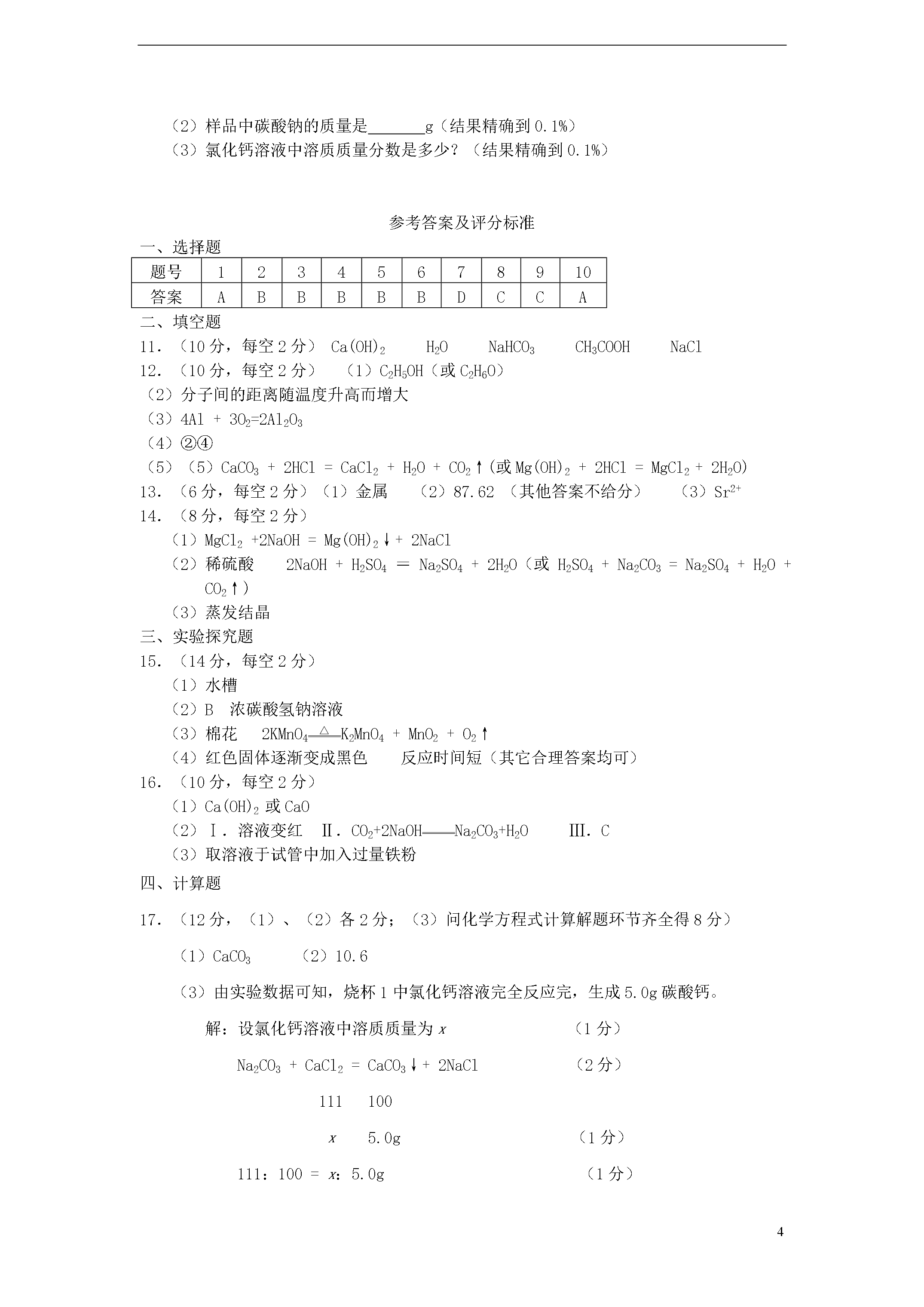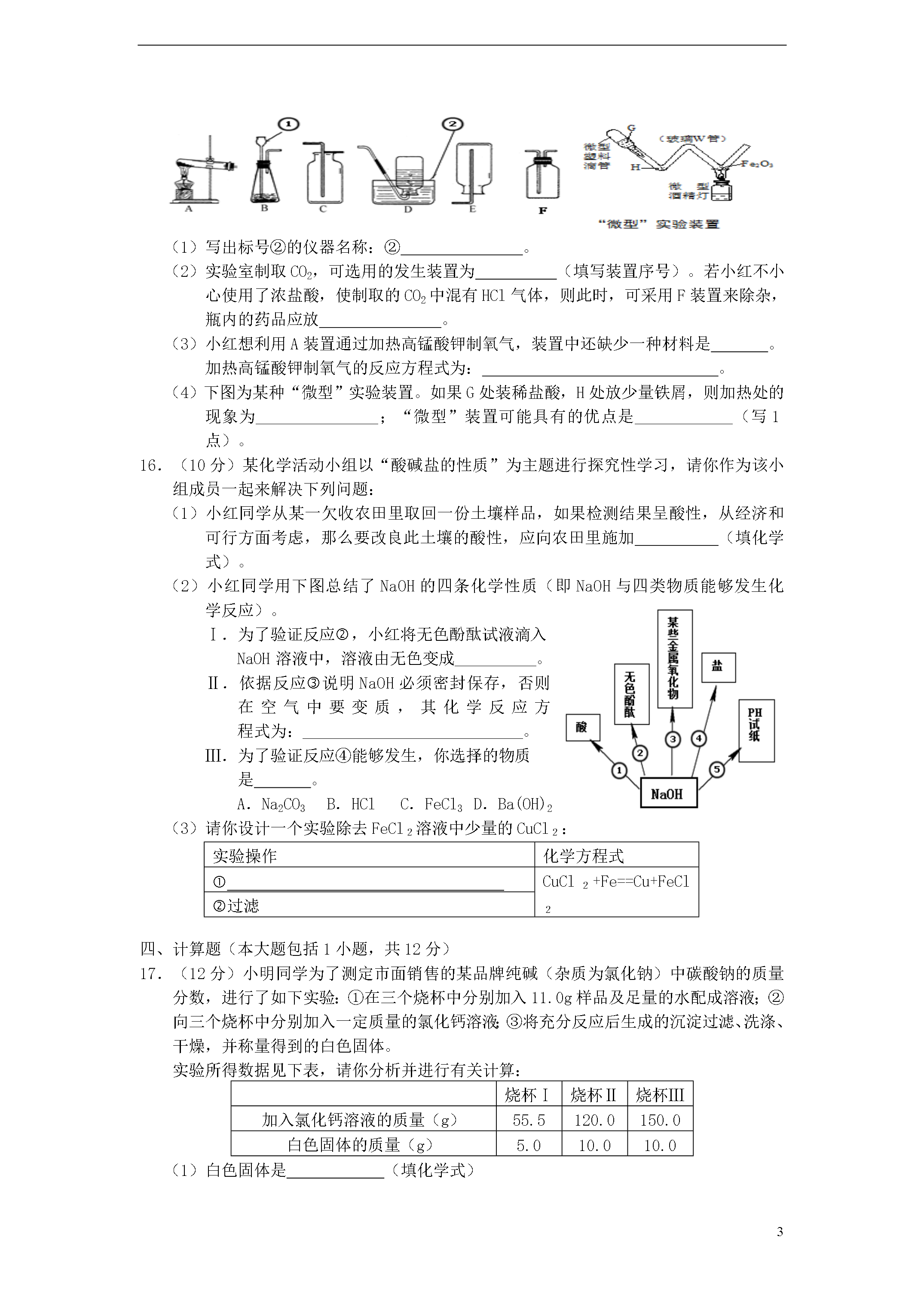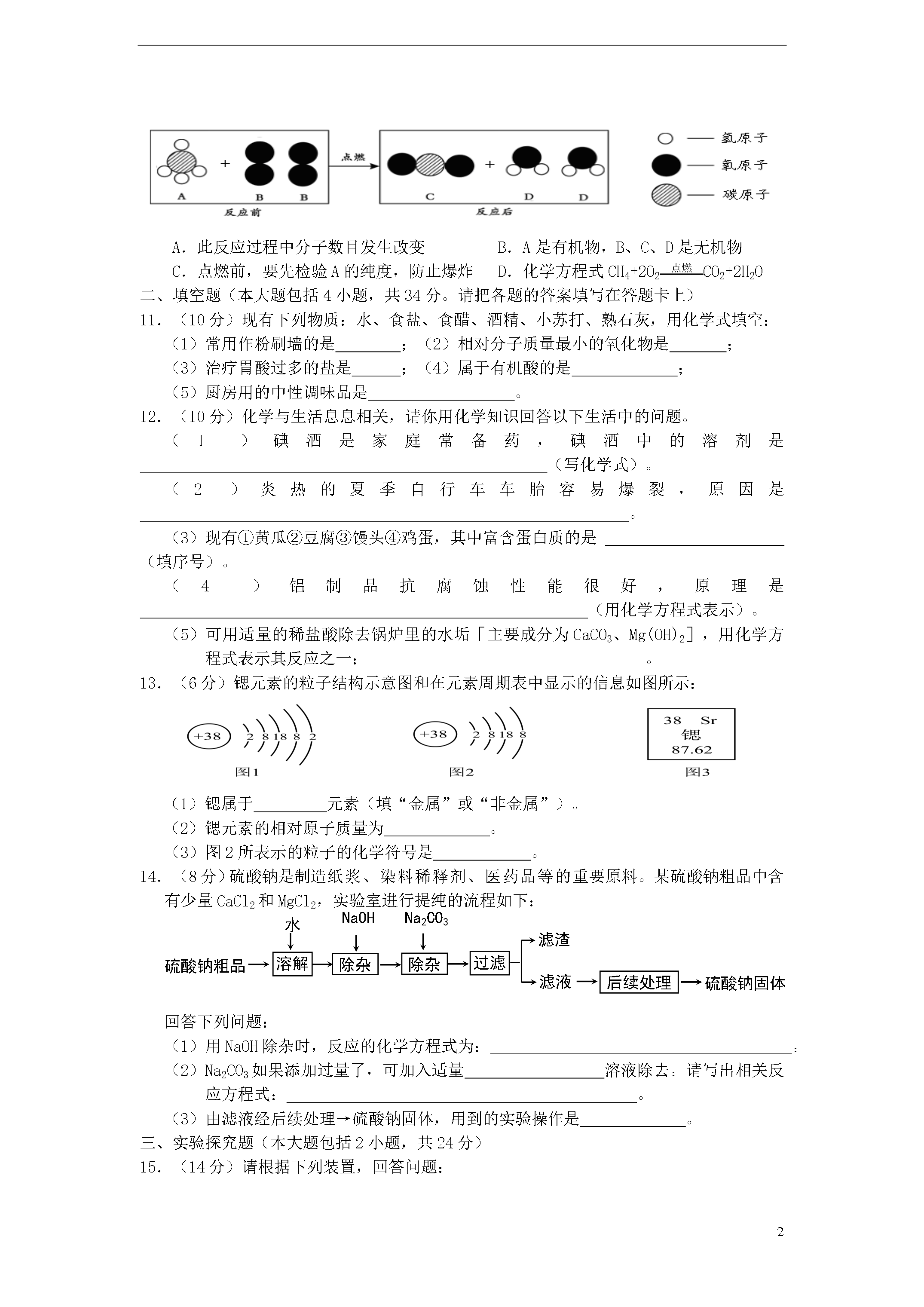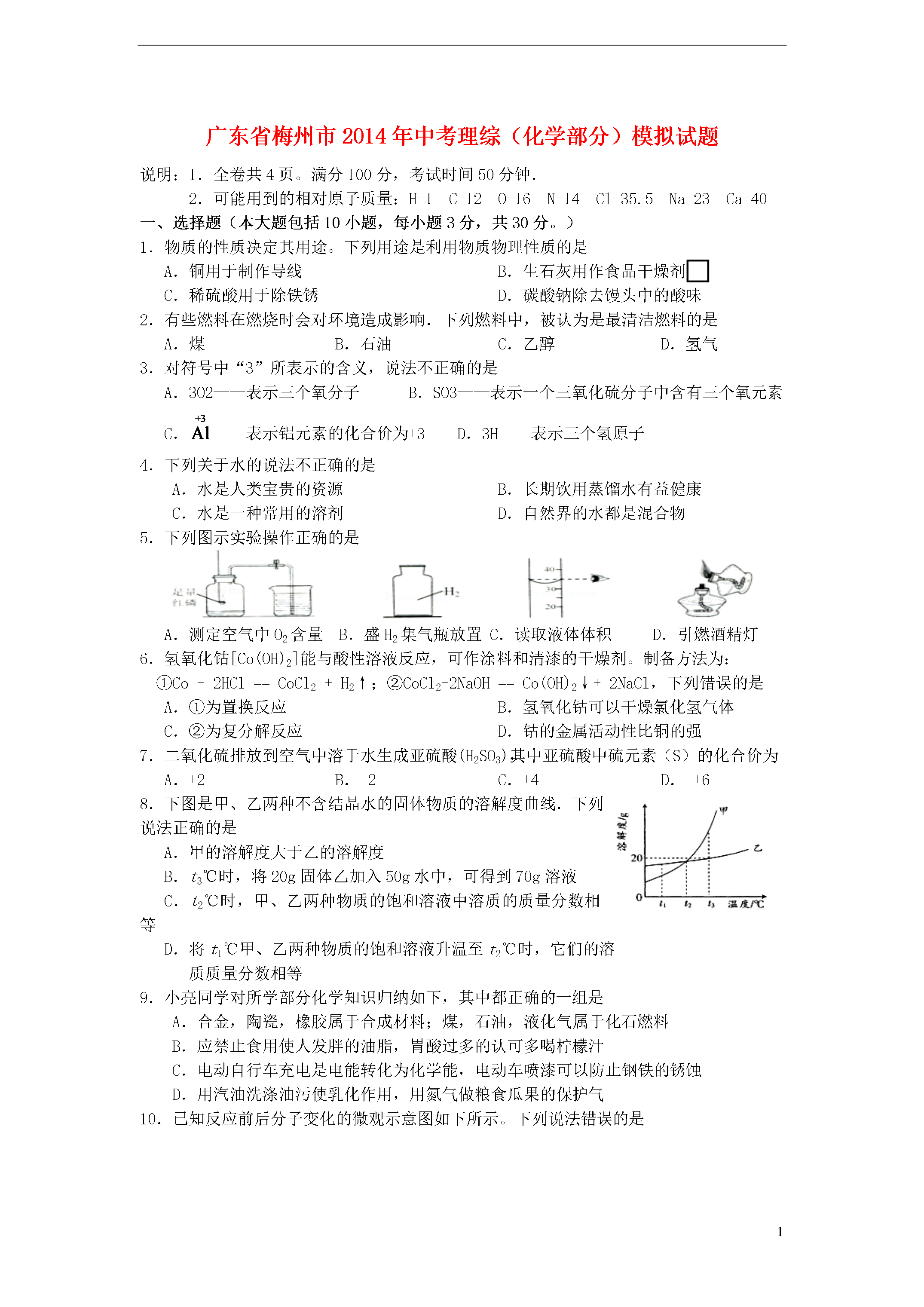 5广东省梅州市2014年中考理综(化学部分)模拟试题说明:1.全卷。满分100分,考试时间50分钟.2.可能用到的相对原子质量:H-1C-12O-16N-14Cl-35.5Na-23Ca-40一、选择题(本大题包括10小题,每小题3分,共30分。)1.物质的性质决定其用途。下列用途是利用物质物理性质的是A.铜用于制作导线B.生石灰用作食品干燥剂C.稀硫酸用于除铁锈D.碳酸钠除去馒头中的酸味2.有些燃料在燃烧时会对环境造成影响.下列燃料中,被认为是最清洁燃料的是A.煤B.石油C.乙醇D.氢气3.对符号中“3”所表示的含义,说法不正确的是A.3O2——表示三个氧分子B.SO3——表示一个三氧化硫分子中含有三个氧元素C.——表示铝元素的化合价为+3D.3H——表示三个氢原子4.下列关于水的说法不正确的是A.水是人类宝贵的资源B.长期饮用蒸馏水有益健康C.水是一种常用的溶剂D.自然界的水都是混合物5.下列图示实验操作正确的是A.测定空气中O2含量B.盛H2集气瓶放置C.读取液体体积D.引燃酒精灯6.氢氧化钴[Co(OH)2]能与酸性溶液反应,可作涂料和清漆的干燥剂。制备方法为:①Co+2HCl==CoCl2+H2↑;②CoCl2+2NaOH==Co(OH)2↓+2NaCl,下列错误的是A.①为置换反应B.氢氧化钴可以干燥氯化氢气体C.②为复分解反应D.钴的金属活动性比铜的强7.二氧化硫排放到空气中溶于水生成亚硫酸(H2SO3),其中亚硫酸中硫元素(S)的化合价为A.+2B.-2C.+4D.+68.下图是甲、乙两种不含结晶水的固体物质的溶解度曲线.下列说法正确的是A.甲的溶解度大于乙的溶解度B.t3℃时,将20g固体乙加入50g水中,可得到70g溶液C.t2℃时,甲、乙两种物质的饱和溶液中溶质的质量分数相等D.将t1℃甲、乙两种物质的饱和溶液升温至t2℃时,它们的溶质质量分数相等9.小亮同学对所学部分化学知识归纳如下,其中都正确的一组是A.合金,陶瓷,橡胶属于合成材料;煤,石油,液化气属于化石燃料B.应禁止食用使人发胖的油脂,胃酸过多的认可多喝柠檬汁C.电动自行车充电是电能转化为化学能,电动车喷漆可以防止钢铁的锈蚀D.用汽油洗涤油污使乳化作用,用氮气做粮食瓜果的保护气10.已知反应前后分子变化的微观示意图如下所示。下列说法错误的是A.此反应过程中分子数目发生改变B.A是有机物,B、C、D是无机物C.点燃前,要先检验A的纯度,防止爆炸D.化学方程式CH4+2O2点燃CO2+2H2O二、填空题(本大题包括4小题,共34分。请把各题的答案填写在答题卡上)11.(10分)现有下列物质:水、食盐、食醋、酒精、小苏打、熟石灰,用化学式填空:(1)常用作粉刷墙的是;(2)相对分子质量最小的氧化物是;治疗胃酸过多的盐是;(4)属于有机酸的是;(5)厨房用的中性调味品是。12.(10分)化学与生活息息相关,请你用化学知识回答以下生活中的问题。(1)碘酒是家庭常备药,碘酒中的溶剂是(写化学式)。(2)炎热的夏季自行车车胎容易爆裂,原因是。(3)现有①黄瓜②豆腐③馒头④鸡蛋,其中富含蛋白质的是(填序号)。(4)铝制品抗腐蚀性能很好,原理是(用化学方程式表示)。(5)可用适量的稀盐酸除去锅炉里的水垢[主要成分为CaCO3、Mg(OH)2],用化学方程式表示其反应之一:__________________________________。13.(6分)锶元素的粒子结构示意图和在元素周期表中显示的信息如图所示:(1)锶属于元素(填“金属”或“非金属”)。(2)锶元素的相对原子质量为。(3)图2所表示的粒子的化学符号是。14.(8分)硫酸钠是制造纸浆、染料稀释剂、医药品等的重要原料。某硫酸钠粗品中含有少量CaCl2和MgCl2,实验室进行提纯的流程如下:硫酸钠粗品溶解除杂NaOH过滤滤渣滤液后续处理硫酸钠固体水Na2CO3除杂回答下列问题:(1)用NaOH除杂时,反应的化学方程式为:。(2)Na2CO3如果添加过量了,可加入适量溶液除去。请写出相关反应方程式:。(3)由滤液经后续处理→硫酸钠固体,用到的实验操作是。三、实验探究题(本大题包括2小题,共24分)15.(14分)请根据下列装置,回答问题:(1)写出标号②的仪器名称:②。(2)实验室制取CO2,可选用的发生装置为(填写装置序号)。若小红不小心使用了浓盐酸,使制取的CO2中混有HCl气体,则此时,可采用F装置来除杂,瓶内的药品应放。(3)小红想利用A装置通过加热高锰酸钾制氧气,装置中还缺少一种材料是。加热高锰酸钾制氧气的反应方程式为:。(4)下图为某种“微型”实验装置。如果G处装稀盐酸,H处放少量铁屑,则加热处的现象为_______________;“微型”装置可能具有的优点是____________(写1