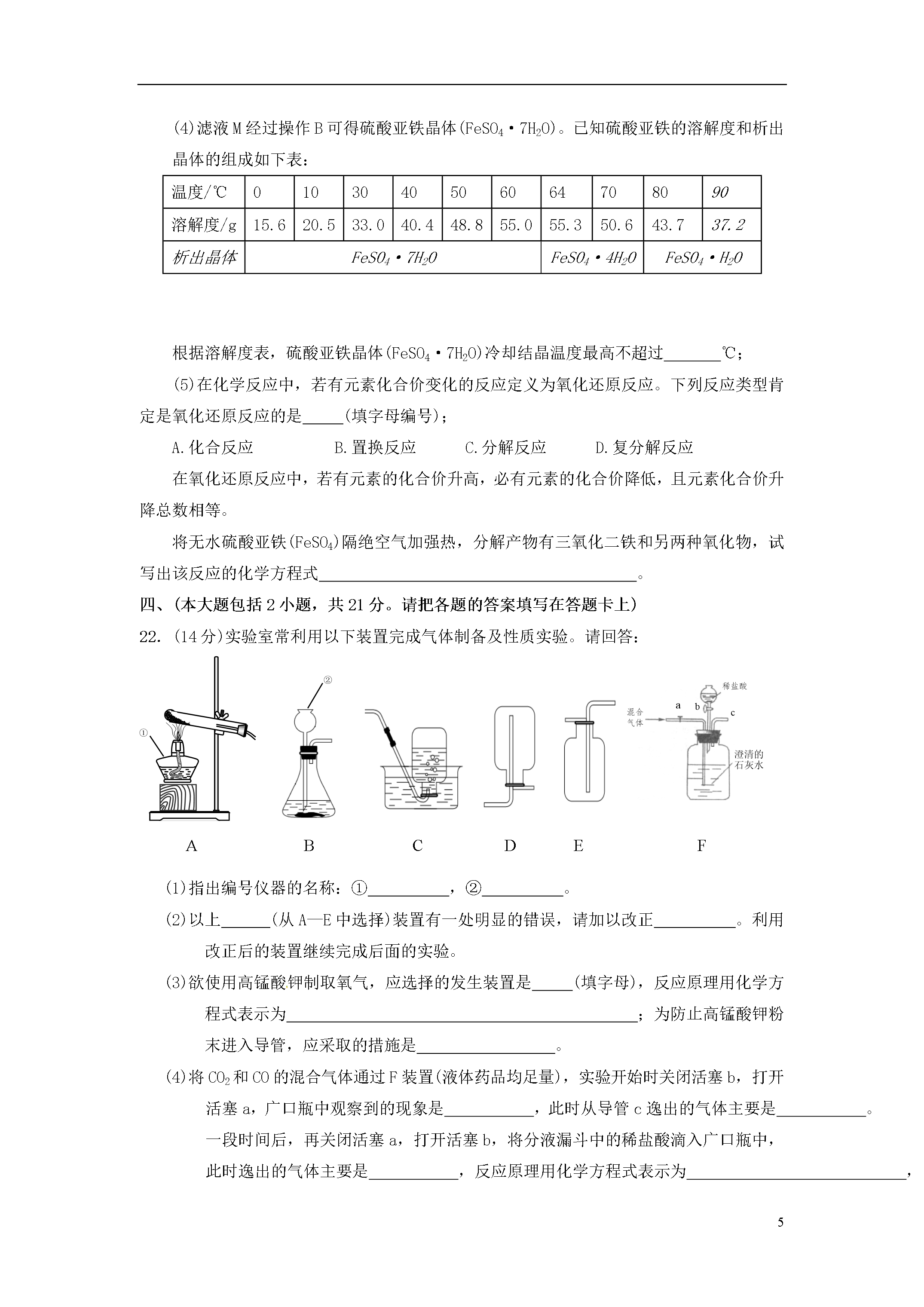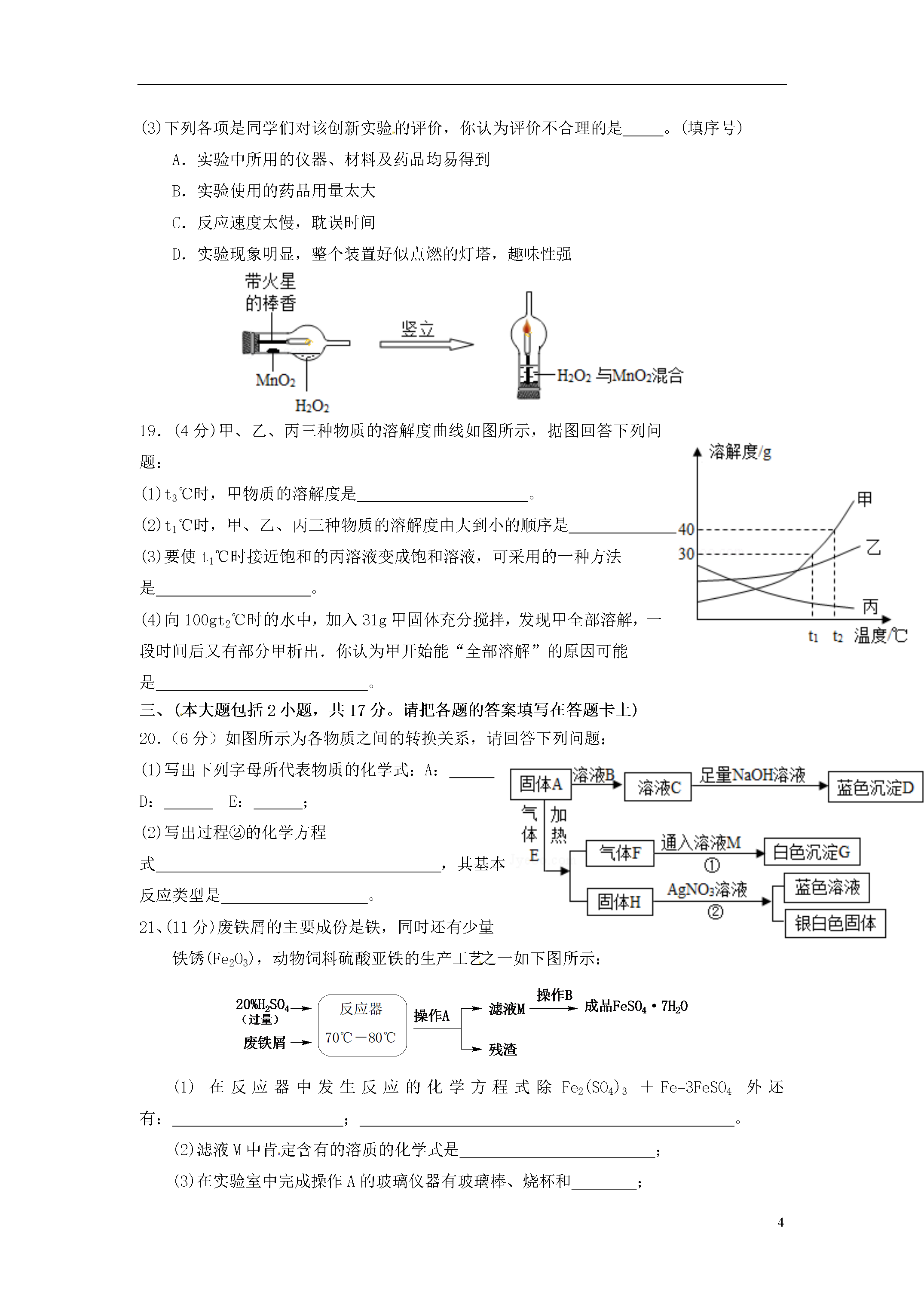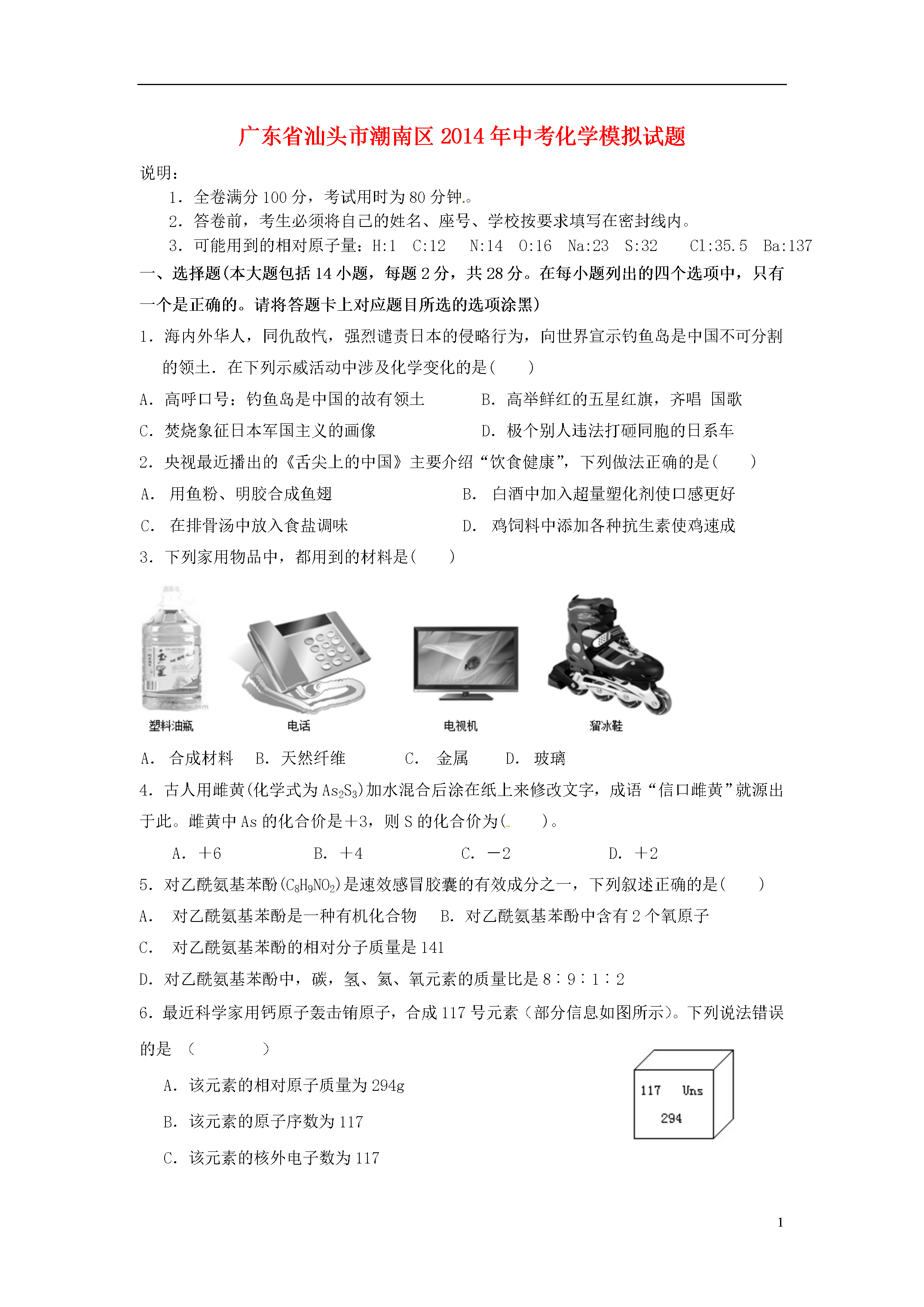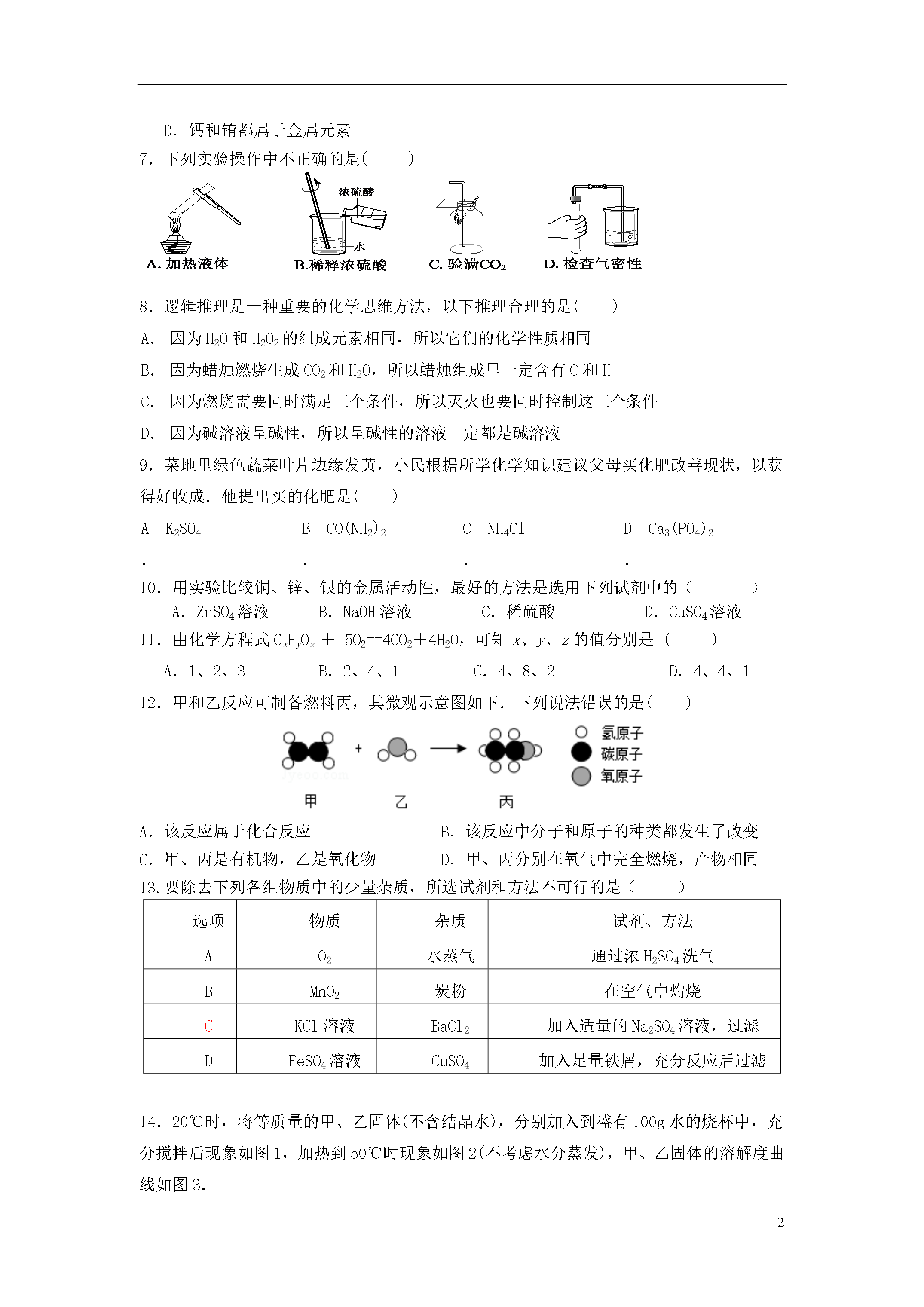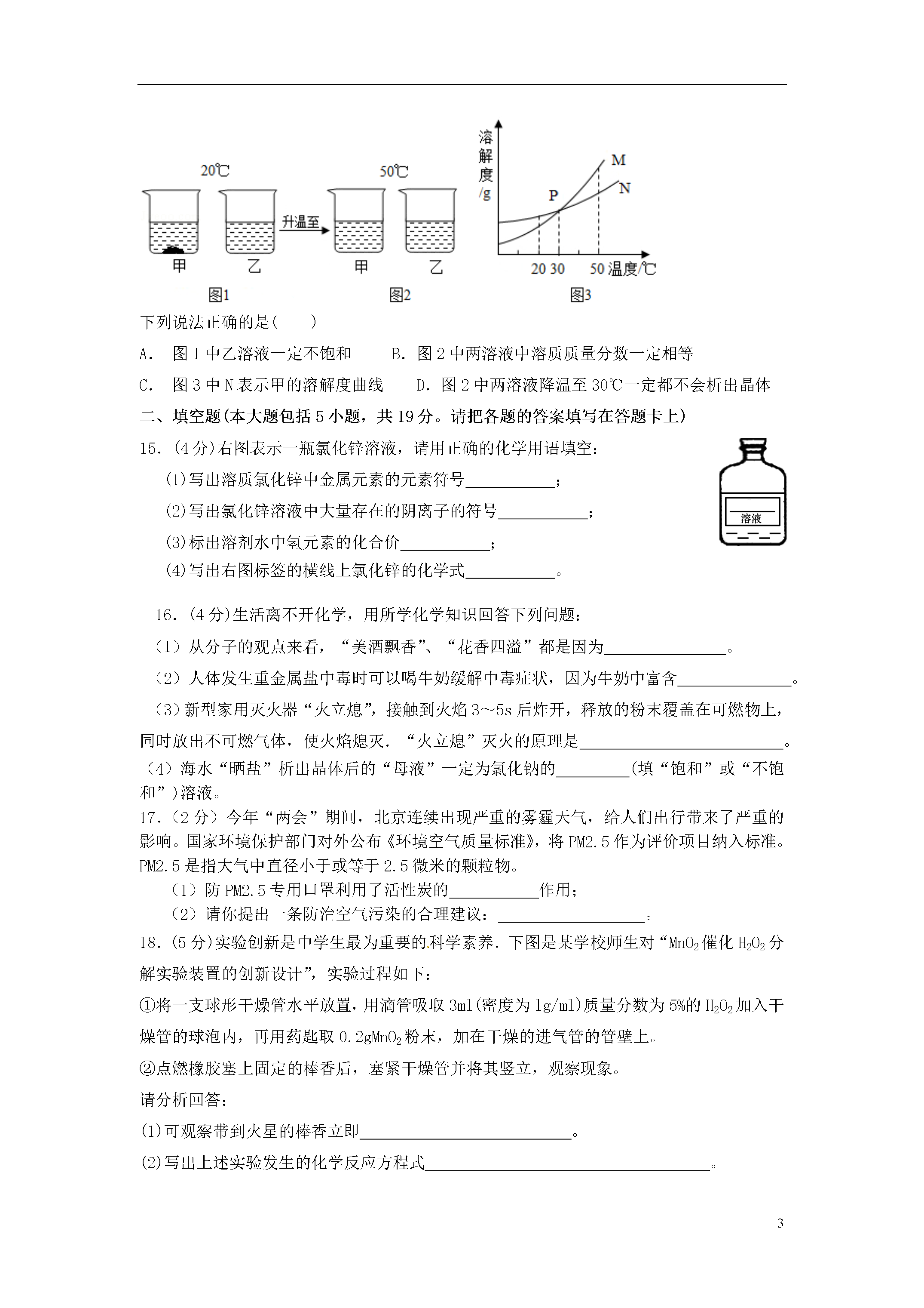 89广东省汕头市潮南区2014年中考化学模拟试题说明:1.全卷满分100分,考试用时为80分钟。2.答卷前,考生必须将自己的姓名、座号、学校按要求填写在密封线内。3.可能用到的相对原子量:H:1C:12N:14O:16Na:23S:32Cl:35.5Ba:137一、选择题(本大题包括14小题,每题2分,共28分。在每小题列出的四个选项中,只有一个是正确的。请将答题卡上对应题目所选的选项涂黑)1.海内外华人,同仇敌忾,强烈谴责日本的侵略行为,向世界宣示钓鱼岛是中国不可分割的领土.在下列示威活动中涉及化学变化的是()A.高呼口号:钓鱼岛是中国的故有领土B.高举鲜红的五星红旗,齐唱国歌C.焚烧象征日本军国主义的画像D.极个别人违法打砸同胞的日系车2.央视最近播出的《舌尖上的中国》主要介绍“饮食健康”,下列做法正确的是()A.用鱼粉、明胶合成鱼翅B.白酒中加入超量塑化剂使口感更好C.在排骨汤中放入食盐调味D.鸡饲料中添加各种抗生素使鸡速成3.下列家用物品中,都用到的材料是()A.合成材料B.天然纤维C.金属D.玻璃4.古人用雌黄(化学式为As2S3)加水混合后涂在纸上来修改文字,成语“信口雌黄”就源出于此。雌黄中As的化合价是+3,则S的化合价为()。A.+6B.+4C.-2D.+25.对乙酰氨基苯酚(C8H9NO2)是速效感冒胶囊的有效成分之一,下列叙述正确的是()A.对乙酰氨基苯酚是一种有机化合物B.对乙酰氨基苯酚中含有2个氧原子C.对乙酰氨基苯酚的相对分子质量是141D.对乙酰氨基苯酚中,碳,氢、氦、氧元素的质量比是8︰9︰1︰26.最近科学家用钙原子轰击铕原子,合成117号元素(部分信息如图所示)。下列说法错误的是()A.该元素的相对原子质量为294gB.该元素的原子序数为117C.该元素的核外电子数为117D.钙和铕都属于金属元素7.下列实验操作中不正确的是()8.逻辑推理是一种重要的化学思维方法,以下推理合理的是()A.因为H2O和H2O2的组成元素相同,所以它们的化学性质相同B.因为蜡烛燃烧生成CO2和H2O,所以蜡烛组成里一定含有C和HC.因为燃烧需要同时满足三个条件,所以灭火也要同时控制这三个条件D.因为碱溶液呈碱性,所以呈碱性的溶液一定都是碱溶液9.菜地里绿色蔬菜叶片边缘发黄,小民根据所学化学知识建议父母买化肥改善现状,以获得好收成.他提出买的化肥是()A.K2SO4B.CO(NH2)2C.NH4ClD.Ca3(PO4)210.用实验比较铜、锌、银的金属活动性,最好的方法是选用下列试剂中的()A.ZnSO4溶液B.NaOH溶液C.稀硫酸D.CuSO4溶液11.由化学方程式CxHyOz+5O2==4CO2+4H2O,可知x、y、z的值分别是()A.1、2、3B.2、4、1C.4、8、2D.4、4、112.甲和乙反应可制备燃料丙,其微观示意图如下.下列说法错误的是()A.该反应属于化合反应B.该反应中分子和原子的种类都发生了改变C.甲、丙是有机物,乙是氧化物D.甲、丙分别在氧气中完全燃烧,产物相同13.要除去下列各组物质中的少量杂质,所选试剂和方法不可行的是()选项物质杂质试剂、方法AO2水蒸气通过浓H2SO4洗气BMnO2炭粉在空气中灼烧CKCl溶液BaCl2加入适量的Na2SO4溶液,过滤DFeSO4溶液CuSO4加入足量铁屑,充分反应后过滤14.20℃时,将等质量的甲、乙固体(不含结晶水),分别加入到盛有100g水的烧杯中,充分搅拌后现象如图1,加热到50℃时现象如图2(不考虑水分蒸发),甲、乙固体的溶解度曲线如图3.下列说法正确的是()A.图1中乙溶液一定不饱和B.图2中两溶液中溶质质量分数一定相等C.图3中N表示甲的溶解度曲线D.图2中两溶液降温至30℃一定都不会析出晶体二、填空题(本大题包括5小题,共19分。请把各题的答案填写在答题卡上)15.(4分)右图表示一瓶氯化锌溶液,请用正确的化学用语填空:(1)写出溶质氯化锌中金属元素的元素符号;(2)写出氯化锌溶液中大量存在的阴离子的符号;(3)标出溶剂水中氢元素的化合价;(4)写出右图标签的横线上氯化锌的化学式。答案:(1)Zn(2)Cl-(3)2O(4)ZnCl2(每空1分,共4分)16.(4分)生活离不开化学,用所学化学知识回答下列问题:(1)从分子的观点来看,“美酒飘香”、“花香四溢”都是因为。(2)人体发生重金属盐中毒时可以喝牛奶缓解中毒症状,因为牛奶中富含。(3)新型家用灭火器“火立熄”,接触到火焰3~5s后炸开,释放的粉末覆盖在可燃物上,同时放出不可燃气体,使火焰熄灭.“火立熄”灭火的原理是。(4)海水“晒盐”析出晶体后的“母液”一定为氯化钠的(填“饱和”或“不饱和”)溶液。17.(2分)今年“两会”期间,北京连续出现严重的雾霾天气,给人们出行带来