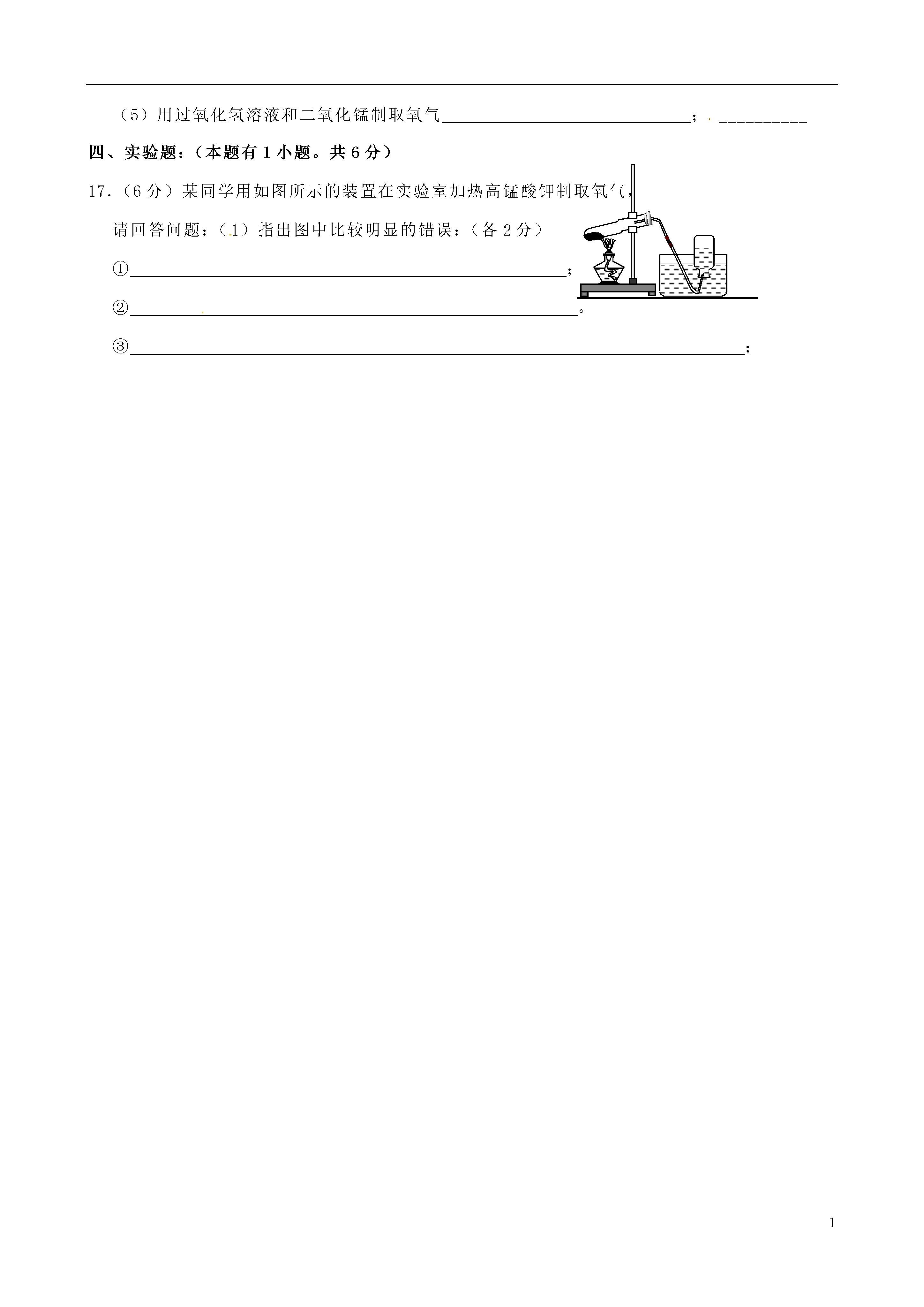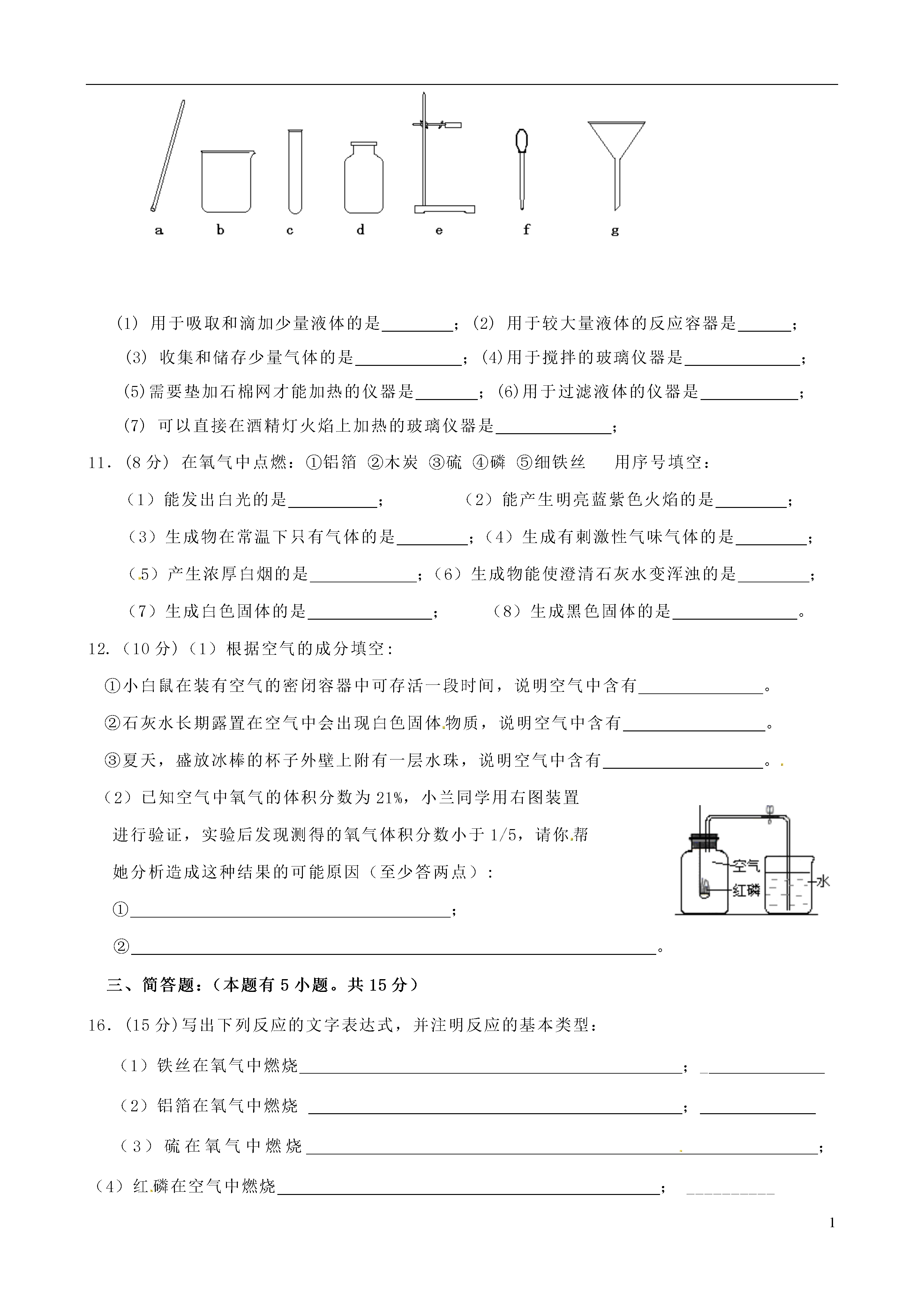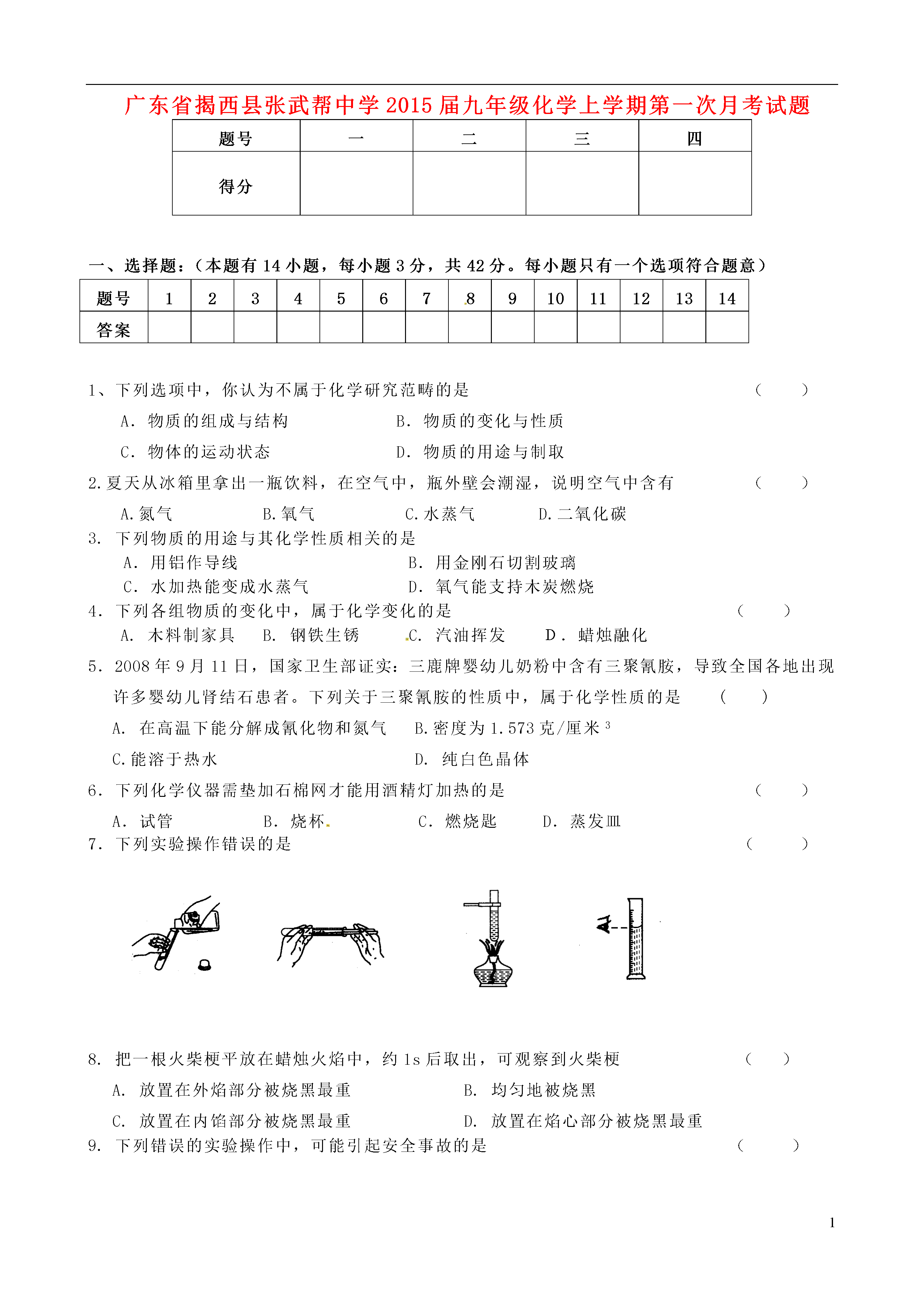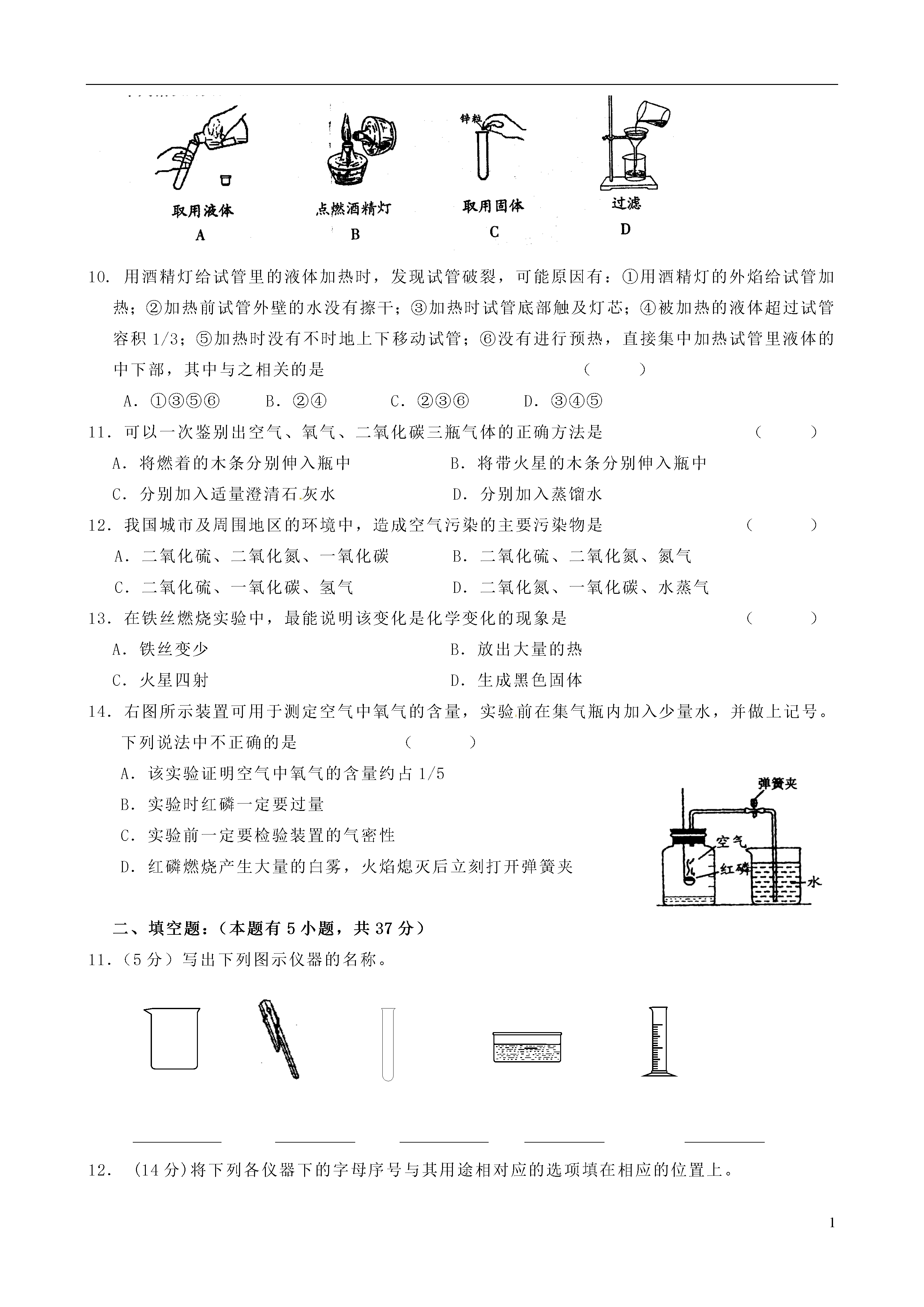 1广东省揭西县张武帮中学2015届九年级化学上学期第一次月考试题题号一二三四得分一、选择题:(本题有14小题,每小题3分,共42分。每小题只有一个选项符合题意)题号1234567891011121314答案1、下列选项中,你认为不属于化学研究范畴的是()A.物质的组成与结构B.物质的变化与性质C.物体的运动状态D.物质的用途与制取2.夏天从冰箱里拿出一瓶饮料,在空气中,瓶外壁会潮湿,说明空气中含有()A.氮气B.氧气C.水蒸气D.二氧化碳3.下列物质的用途与其化学性质相关的是A.用铝作导线B.用金刚石切割玻璃C.水加热能变成水蒸气D.氧气能支持木炭燃烧4.下列各组物质的变化中,属于化学变化的是()A.木料制家具B.钢铁生锈C.汽油挥发D.蜡烛融化5.2008年9月11日,国家卫生部证实:三鹿牌婴幼儿奶粉中含有三聚氰胺,导致全国各地出现许多婴幼儿肾结石患者。下列关于三聚氰胺的性质中,属于化学性质的是()A.在高温下能分解成氰化物和氮气B.密度为1.573克/厘米3C.能溶于热水D.纯白色晶体6.下列化学仪器需垫加石棉网才能用酒精灯加热的是()A.试管B.烧杯C.燃烧匙D.蒸发皿7.下列实验操作错误的是()8.把一根火柴梗平放在蜡烛火焰中,约1s后取出,可观察到火柴梗()A.放置在外焰部分被烧黑最重B.均匀地被烧黑C.放置在内馅部分被烧黑最重D.放置在焰心部分被烧黑最重9.下列错误的实验操作中,可能引起安全事故的是()10.用酒精灯给试管里的液体加热时,发现试管破裂,可能原因有:①用酒精灯的外焰给试管加热;②加热前试管外壁的水没有擦干;③加热时试管底部触及灯芯;④被加热的液体超过试管容积1/3;⑤加热时没有不时地上下移动试管;⑥没有进行预热,直接集中加热试管里液体的中下部,其中与之相关的是()A.①③⑤⑥B.②④C.②③⑥D.③④⑤11.可以一次鉴别出空气、氧气、二氧化碳三瓶气体的正确方法是()A.将燃着的木条分别伸入瓶中B.将带火星的木条分别伸入瓶中C.分别加入适量澄清石灰水D.分别加入蒸馏水12.我国城市及周围地区的环境中,造成空气污染的主要污染物是()A.二氧化硫、二氧化氮、一氧化碳B.二氧化硫、二氧化氮、氮气C.二氧化硫、一氧化碳、氢气D.二氧化氮、一氧化碳、水蒸气13.在铁丝燃烧实验中,最能说明该变化是化学变化的现象是()A.铁丝变少B.放出大量的热C.火星四射D.生成黑色固体14.右图所示装置可用于测定空气中氧气的含量,实验前在集气瓶内加入少量水,并做上记号。下列说法中不正确的是()A.该实验证明空气中氧气的含量约占1/5B.实验时红磷一定要过量C.实验前一定要检验装置的气密性D.红磷燃烧产生大量的白雾,火焰熄灭后立刻打开弹簧夹二、填空题:(本题有5小题,共37分)11.(5分)写出下列图示仪器的名称。12.(14分)将下列各仪器下的字母序号与其用途相对应的选项填在相应的位置上。(1)用于吸取和滴加少量液体的是;(2)用于较大量液体的反应容器是;(3)收集和储存少量气体的是;(4)用于搅拌的玻璃仪器是;(5)需要垫加石棉网才能加热的仪器是;(6)用于过滤液体的仪器是;(7)可以直接在酒精灯火焰上加热的玻璃仪器是;11.(8分)在氧气中点燃:①铝箔②木炭③硫④磷⑤细铁丝用序号填空:(1)能发出白光的是;(2)能产生明亮蓝紫色火焰的是;(3)生成物在常温下只有气体的是;(4)生成有刺激性气味气体的是;(5)产生浓厚白烟的是;(6)生成物能使澄清石灰水变浑浊的是;(7)生成白色固体的是;(8)生成黑色固体的是。12.(10分)(1)根据空气的成分填空:①小白鼠在装有空气的密闭容器中可存活一段时间,说明空气中含有。②石灰水长期露置在空气中会出现白色固体物质,说明空气中含有。③夏天,盛放冰棒的杯子外壁上附有一层水珠,说明空气中含有。装订线内不要答题装订线(2)已知空气中氧气的体积分数为21%,小兰同学用右图装置进行验证,实验后发现测得的氧气体积分数小于1/5,请你帮她分析造成这种结果的可能原因(至少答两点):①;②。三、简答题:(本题有5小题。共15分)16.(15分)写出下列反应的文字表达式,并注明反应的基本类型:(1)铁丝在氧气中燃烧;_(2)铝箔在氧气中燃烧;(3)硫在氧气中燃烧;(4)红磷在空气中燃烧;_