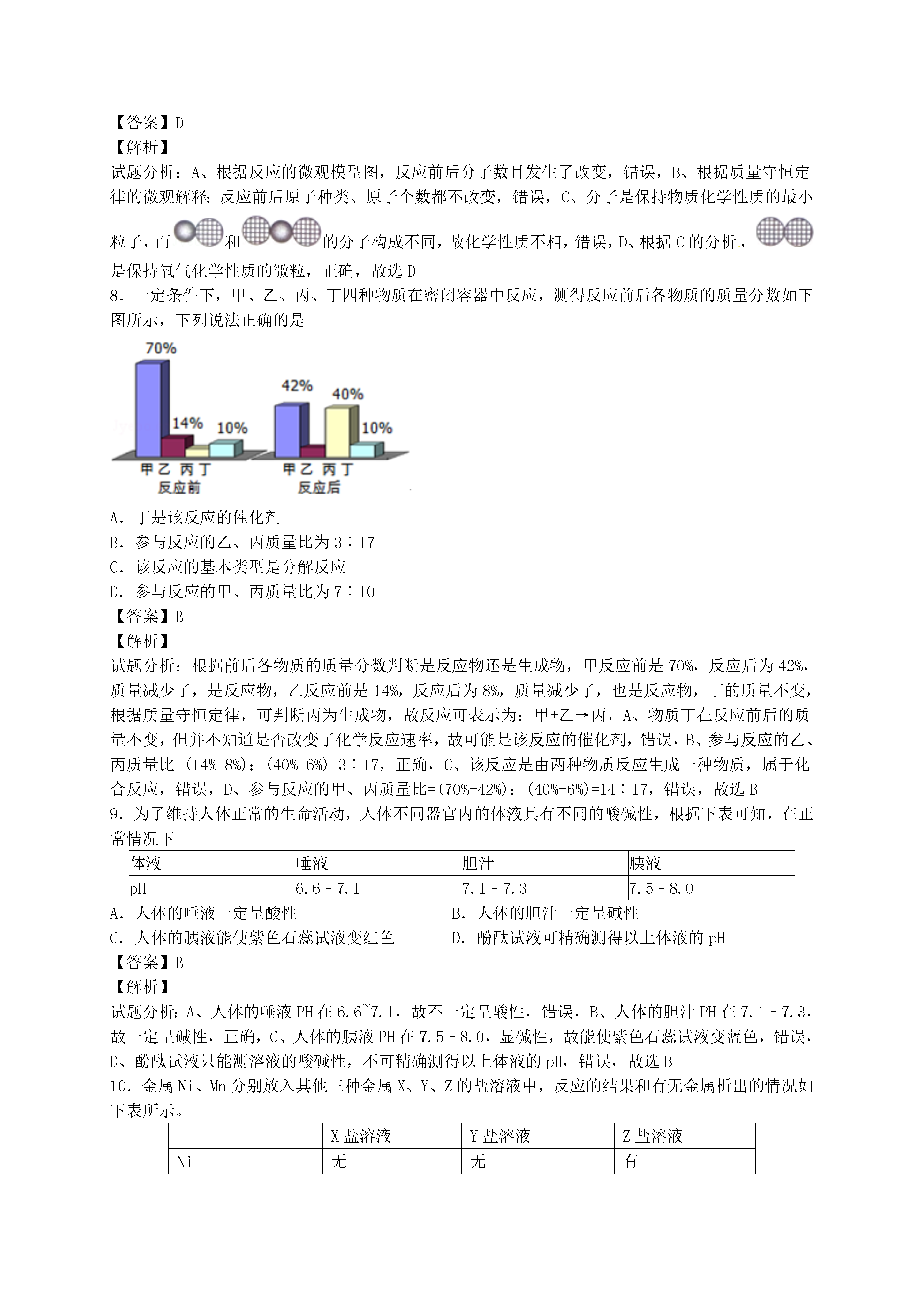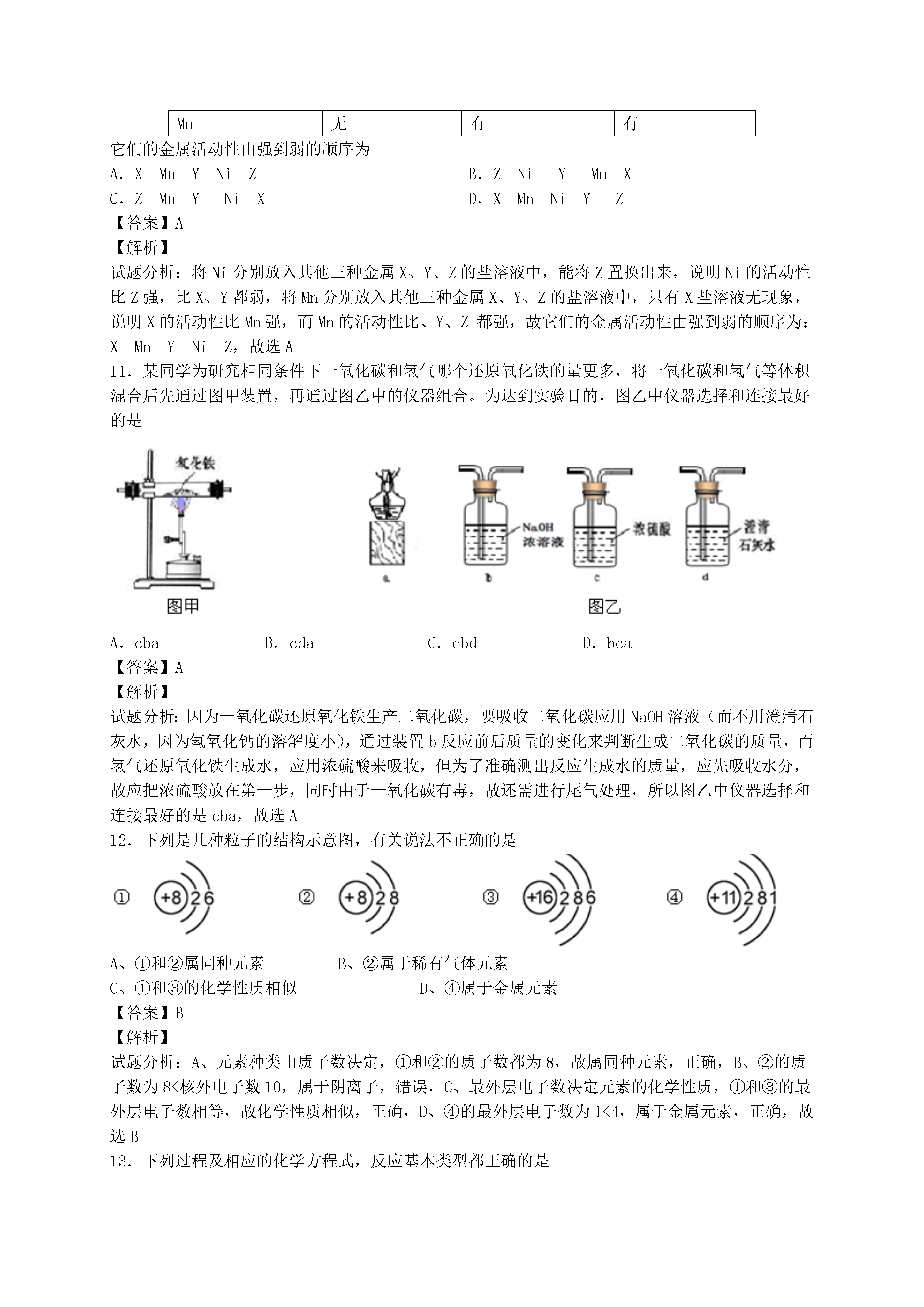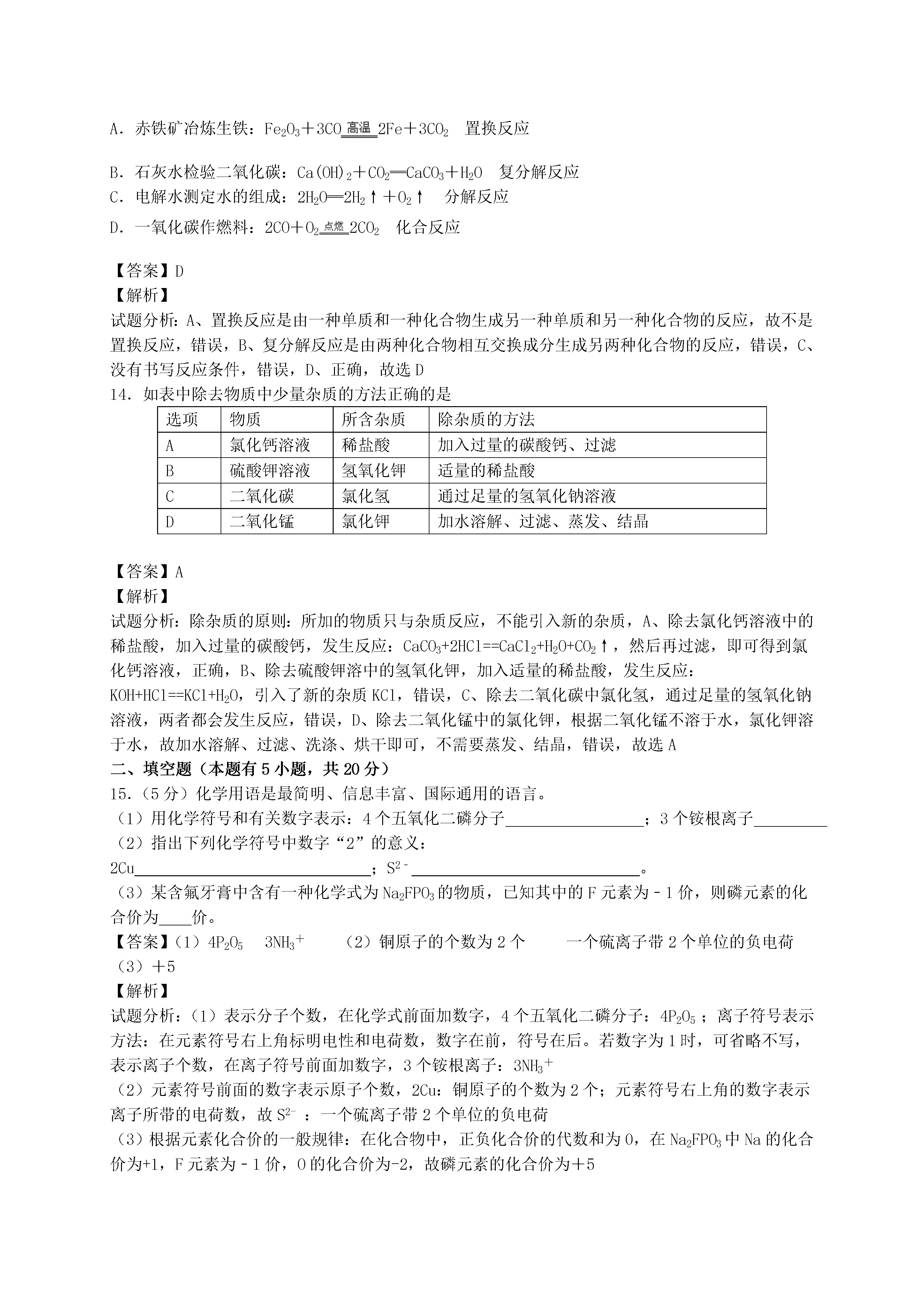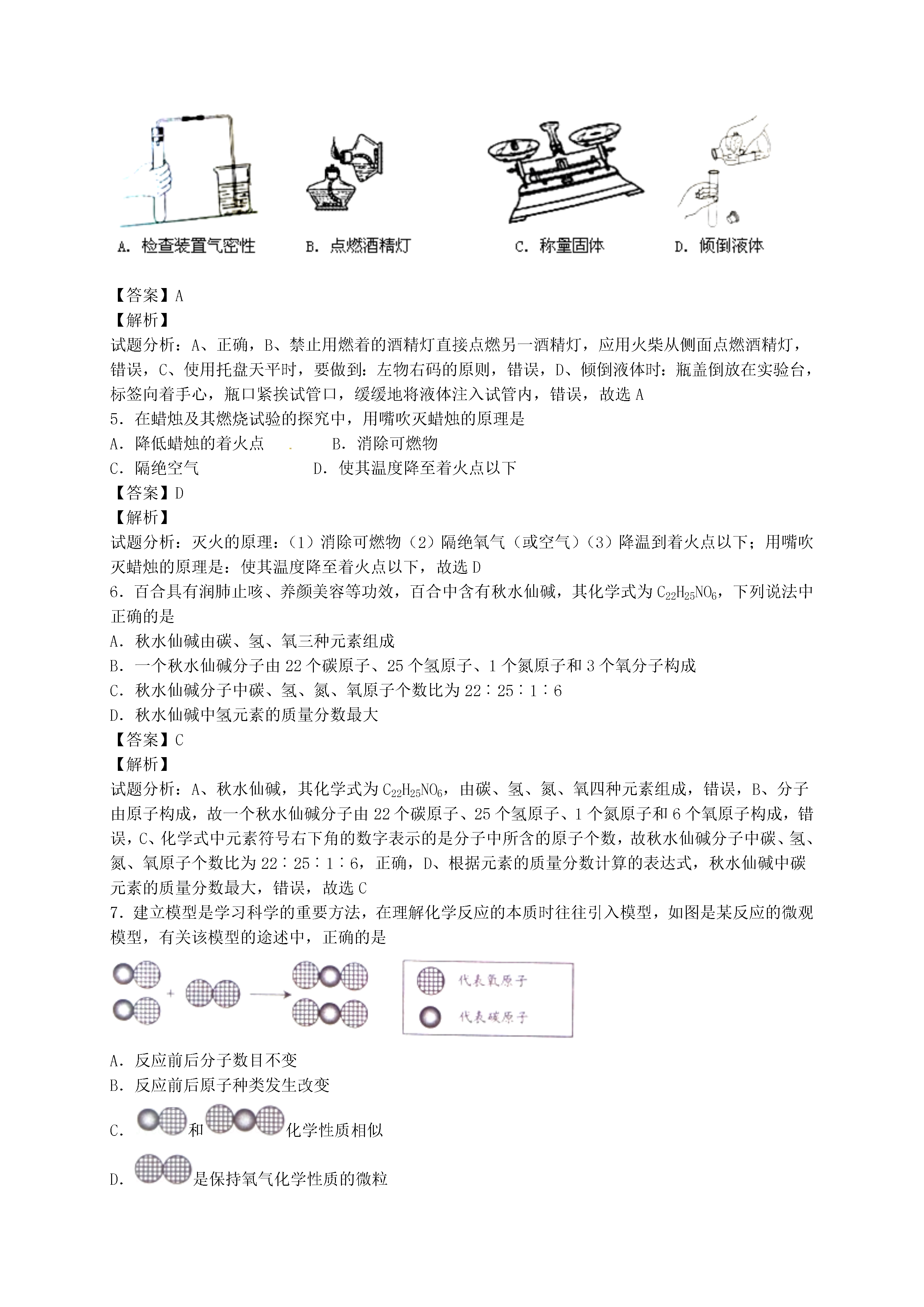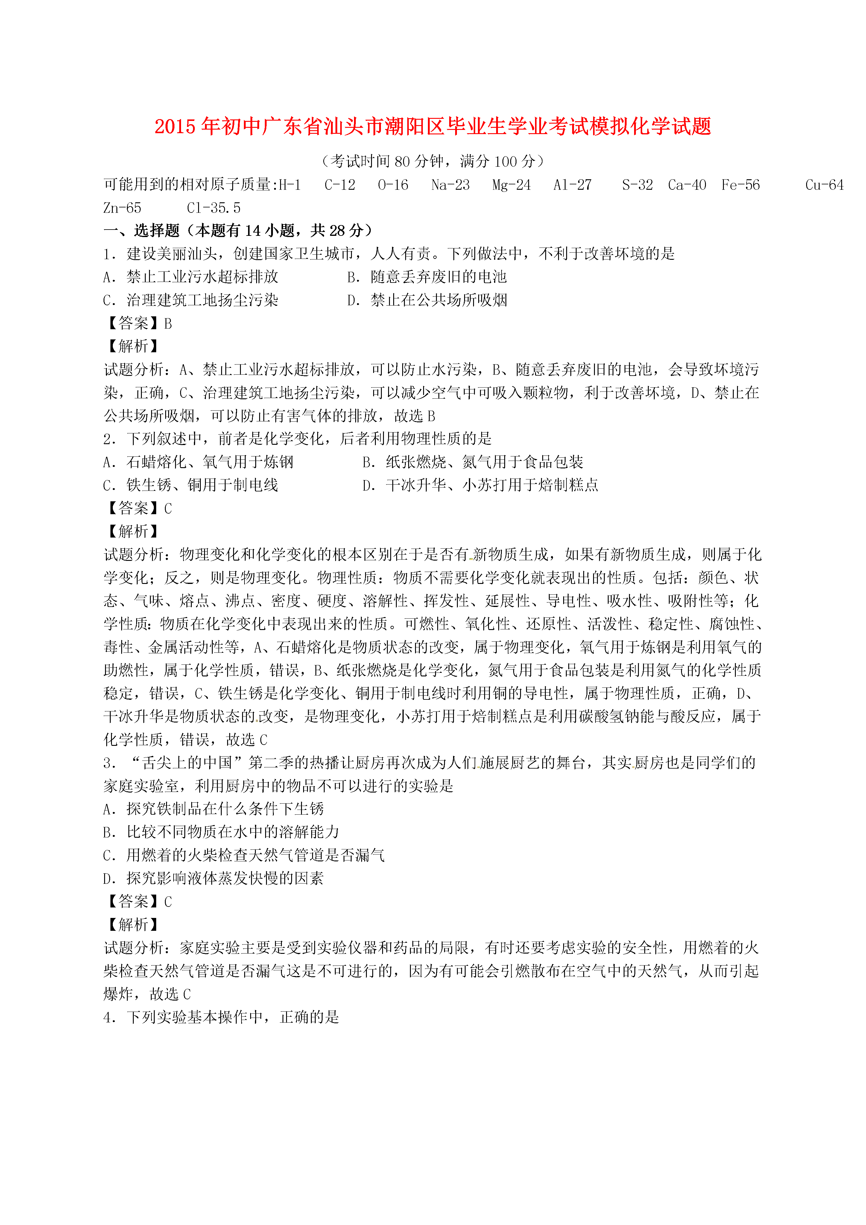 2015年初中广东省汕头市潮阳区毕业生学业考试模拟化学试题(考试时间80分钟,满分100分)可能用到的相对原子质量:H-1C-12O-16Na-23Mg-24Al-27S-32Ca-40Fe-56Cu-64Zn-65Cl-35.5一、选择题(本题有14小题,共28分)1.建设美丽汕头,创建国家卫生城市,人人有责。下列做法中,不利于改善坏境的是A.禁止工业污水超标排放B.随意丢弃废旧的电池C.治理建筑工地扬尘污染D.禁止在公共场所吸烟【答案】B【解析】试题分析:A、禁止工业污水超标排放,可以防止水污染,B、随意丢弃废旧的电池,会导致坏境污染,正确,C、治理建筑工地扬尘污染,可以减少空气中可吸入颗粒物,利于改善坏境,D、禁止在公共场所吸烟,可以防止有害气体的排放,故选B2.下列叙述中,前者是化学变化,后者利用物理性质的是A.石蜡熔化、氧气用于炼钢B.纸张燃烧、氮气用于食品包装C.铁生锈、铜用于制电线D.干冰升华、小苏打用于焙制糕点【答案】C【解析】试题分析:物理变化和化学变化的根本区别在于是否有新物质生成,如果有新物质生成,则属于化学变化;反之,则是物理变化。物理性质:物质不需要化学变化就表现出的性质。包括:颜色、状态、气味、熔点、沸点、密度、硬度、溶解性、挥发性、延展性、导电性、吸水性、吸附性等;化学性质:物质在化学变化中表现出来的性质。可燃性、氧化性、还原性、活泼性、稳定性、腐蚀性、毒性、金属活动性等,A、石蜡熔化是物质状态的改变,属于物理变化,氧气用于炼钢是利用氧气的助燃性,属于化学性质,错误,B、纸张燃烧是化学变化,氮气用于食品包装是利用氮气的化学性质稳定,错误,C、铁生锈是化学变化、铜用于制电线时利用铜的导电性,属于物理性质,正确,D、干冰升华是物质状态的改变,是物理变化,小苏打用于焙制糕点是利用碳酸氢钠能与酸反应,属于化学性质,错误,故选C3.“舌尖上的中国”第二季的热播让厨房再次成为人们施展厨艺的舞台,其实厨房也是同学们的家庭实验室,利用厨房中的物品不可以进行的实验是A.探究铁制品在什么条件下生锈B.比较不同物质在水中的溶解能力C.用燃着的火柴检查天然气管道是否漏气D.探究影响液体蒸发快慢的因素【答案】C【解析】试题分析:家庭实验主要是受到实验仪器和药品的局限,有时还要考虑实验的安全性,用燃着的火柴检查天然气管道是否漏气这是不可进行的,因为有可能会引燃散布在空气中的天然气,从而引起爆炸,故选C4.下列实验基本操作中,正确的是【答案】A【解析】试题分析:A、正确,B、禁止用燃着的酒精灯直接点燃另一酒精灯,应用火柴从侧面点燃酒精灯,错误,C、使用托盘天平时,要做到:左物右码的原则,错误,D、倾倒液体时:瓶盖倒放在实验台,标签向着手心,瓶口紧挨试管口,缓缓地将液体注入试管内,错误,故选A5.在蜡烛及其燃烧试验的探究中,用嘴吹灭蜡烛的原理是A.降低蜡烛的着火点B.消除可燃物C.隔绝空气D.使其温度降至着火点以下【答案】D【解析】试题分析:灭火的原理:(1)消除可燃物(2)隔绝氧气(或空气)(3)降温到着火点以下;用嘴吹灭蜡烛的原理是:使其温度降至着火点以下,故选D6.百合具有润肺止咳、养颜美容等功效,百合中含有秋水仙碱,其化学式为C22H25NO6,下列说法中正确的是A.秋水仙碱由碳、氢、氧三种元素组成B.一个秋水仙碱分子由22个碳原子、25个氢原子、1个氮原子和3个氧分子构成C.秋水仙碱分子中碳、氢、氮、氧原子个数比为22︰25︰1︰6D.秋水仙碱中氢元素的质量分数最大【答案】C【解析】试题分析:A、秋水仙碱,其化学式为C22H25NO6,由碳、氢、氮、氧四种元素组成,错误,B、分子由原子构成,故一个秋水仙碱分子由22个碳原子、25个氢原子、1个氮原子和6个氧原子构成,错误,C、化学式中元素符号右下角的数字表示的是分子中所含的原子个数,故秋水仙碱分子中碳、氢、氮、氧原子个数比为22︰25︰1︰6,正确,D、根据元素的质量分数计算的表达式,秋水仙碱中碳元素的质量分数最大,错误,故选C7.建立模型是学习科学的重要方法,在理解化学反应的本质时往往引入模型,如图是某反应的微观模型,有关该模型的途述中,正确的是A.反应前后分子数目不变B.反应前后原子种类发生改变C.和化学性质相似D.是保持氧气化学性质的微粒【答案】D【解析】试题分析:A、根据反应的微观模型图,反应前后分子数目发生了改变,错误,B、根据质量守恒定律的微观解释:反应前后原子种类、原子个数都不改变,错误,C、分子是保持物质化学性质的最小粒子,而和的分子构成不同,故化学性质不相,错误,D、根据C的分析,是保持氧气化学性质的微粒,正确,故选D8.一定条件下,甲、乙、丙