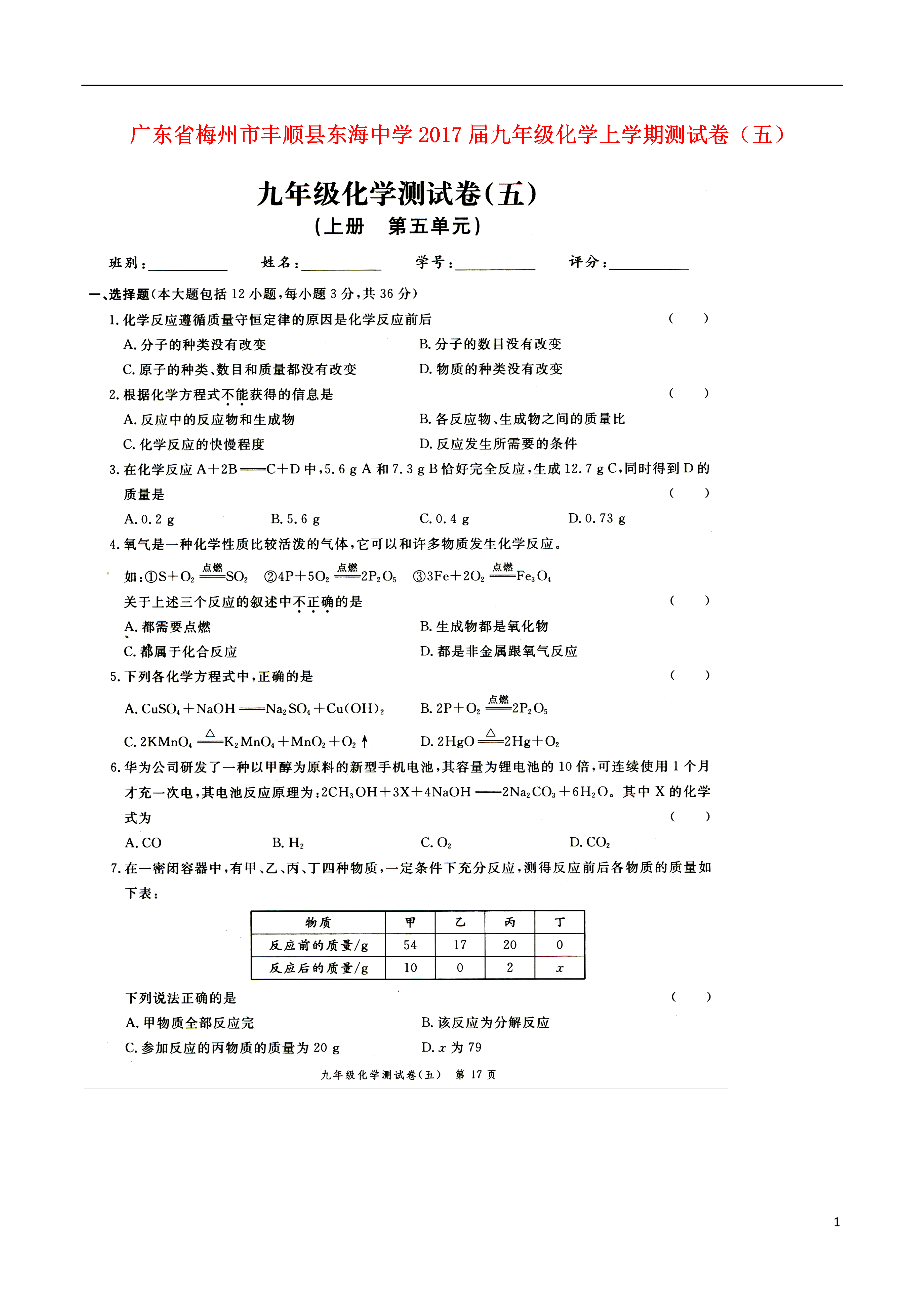 1广东省梅州市丰顺县东海中学2017届九年级化学上学期测试卷(五)