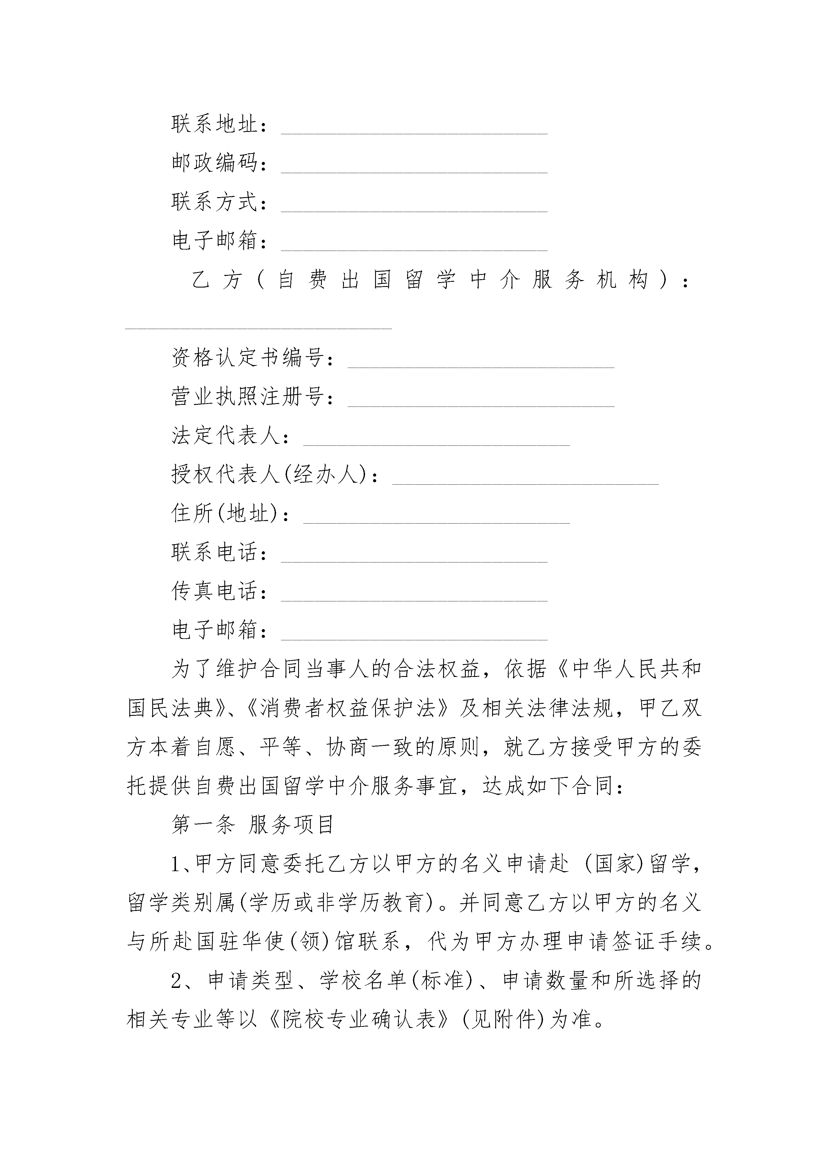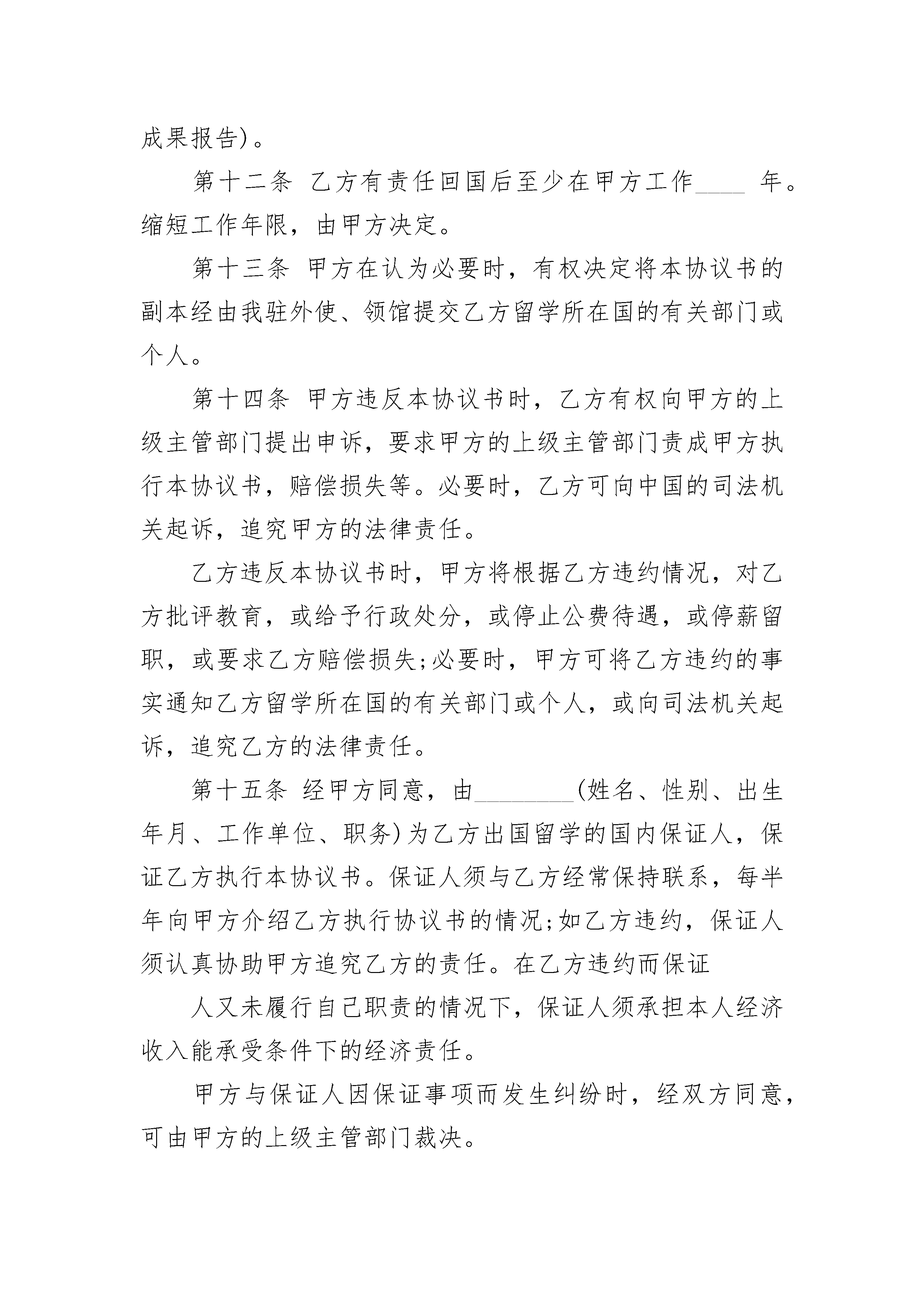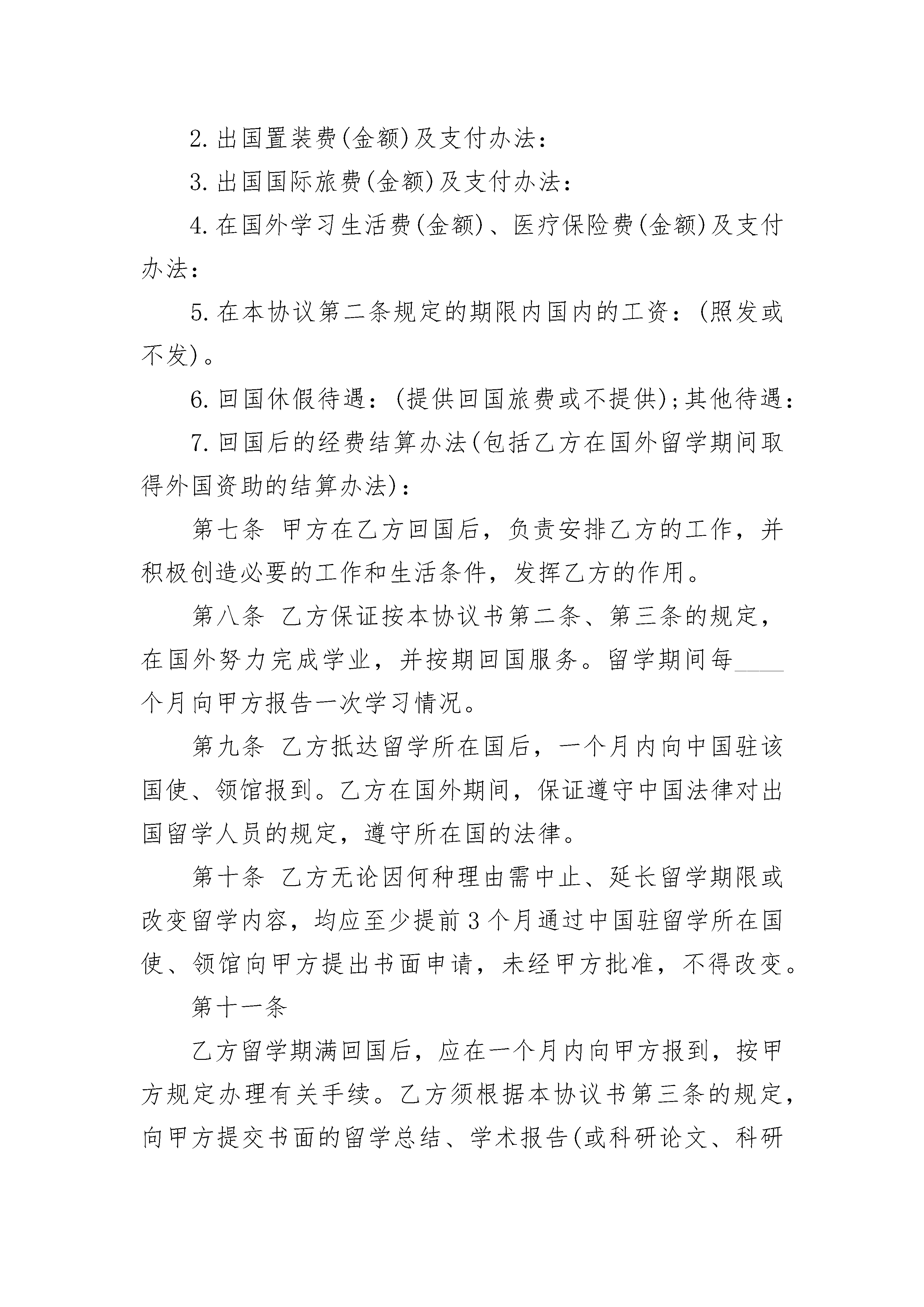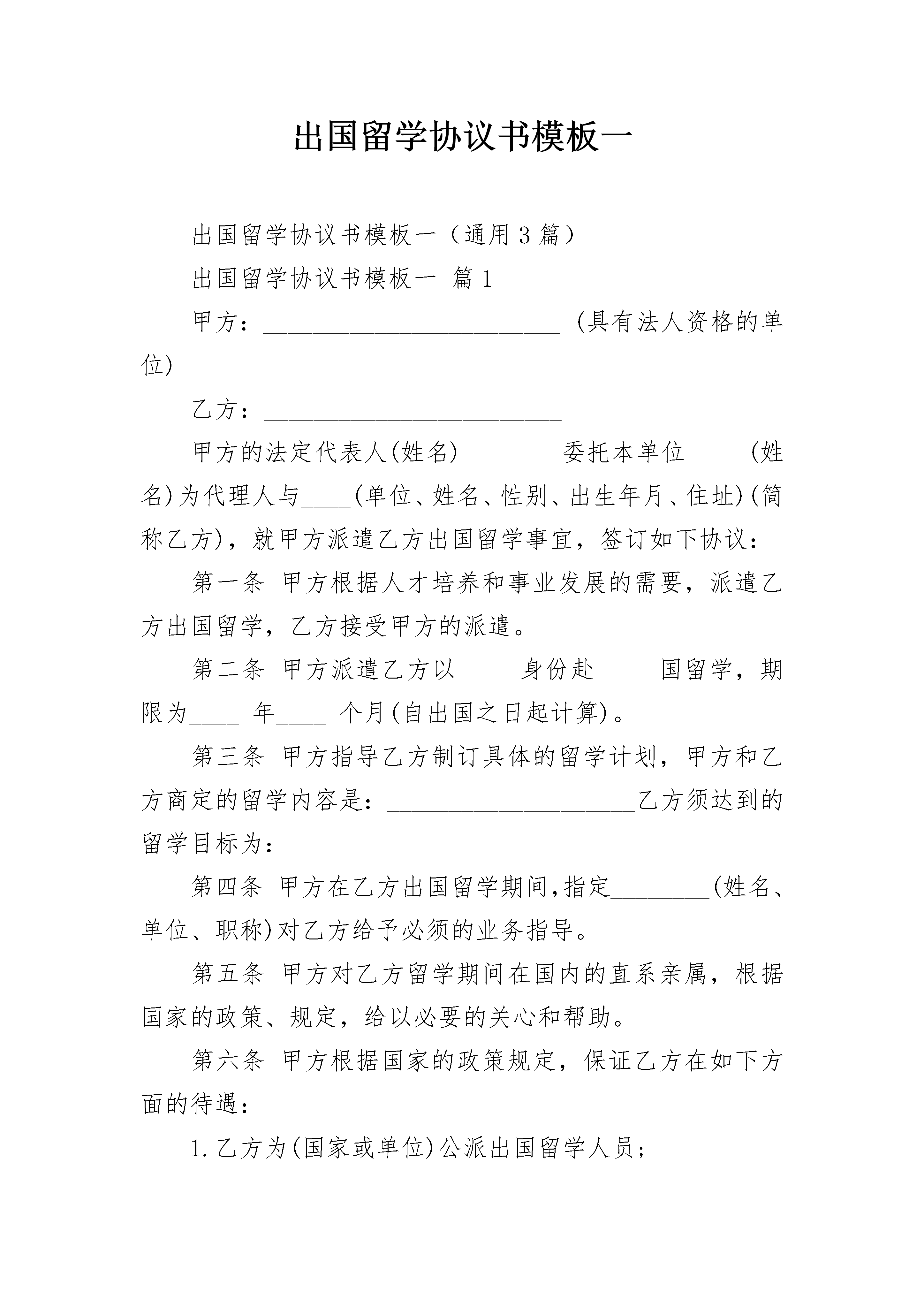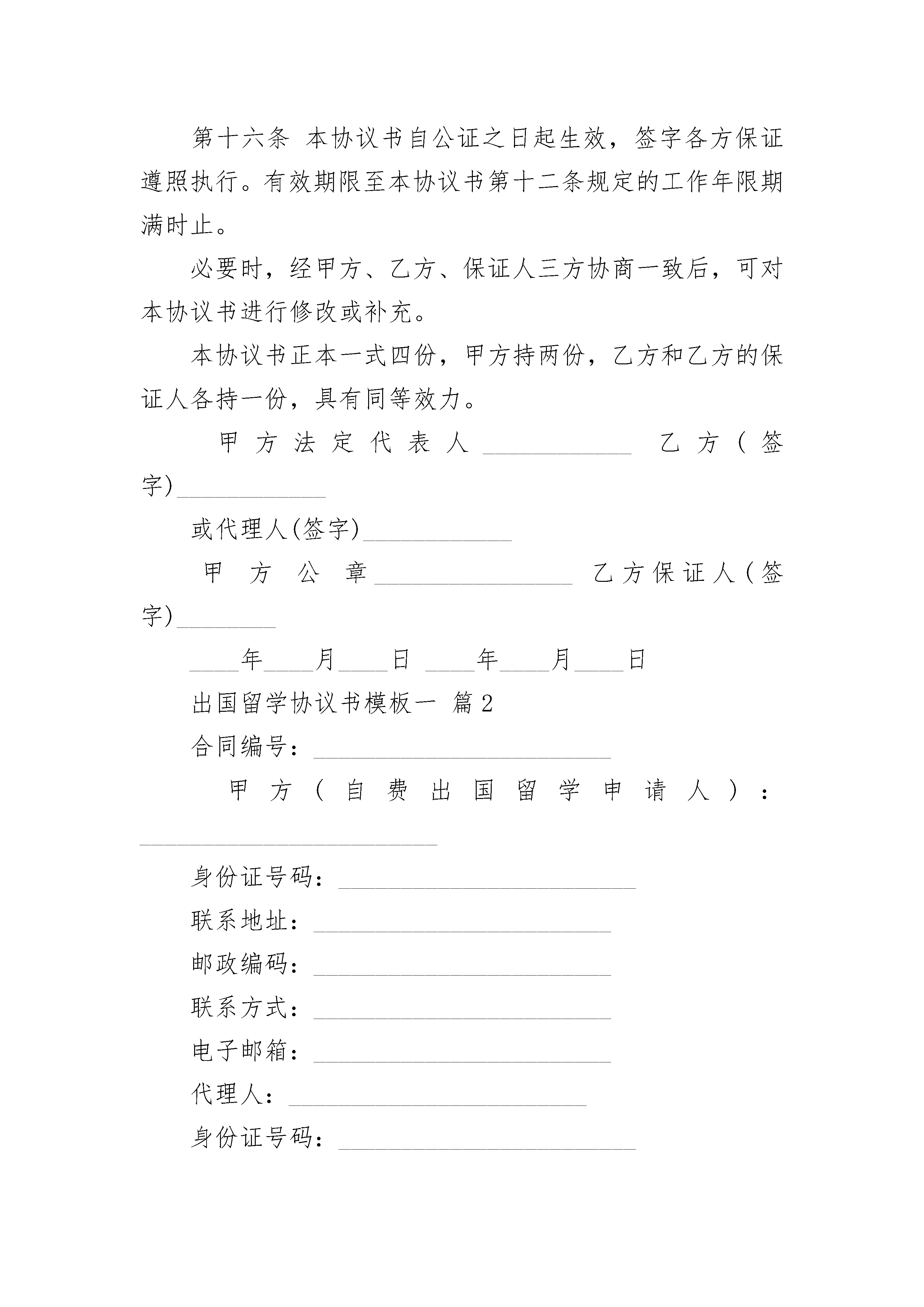 出国留学协议书模板一出国留学协议书模板一(通用3篇)出国留学协议书模板一篇1甲方:________________________(具有法人资格的单位)乙方:________________________甲方的法定代表人(姓名)________委托本单位____(姓名)为代理人与____(单位、姓名、性别、出生年月、住址)(简称乙方),就甲方派遣乙方出国留学事宜,签订如下协议:第一条甲方根据人才培养和事业发展的需要,派遣乙方出国留学,乙方接受甲方的派遣。第二条甲方派遣乙方以____身份赴____国留学,期限为____年____个月(自出国之日起计算)。第三条甲方指导乙方制订具体的留学计划,甲方和乙方商定的留学内容是:____________________乙方须达到的留学目标为:第四条甲方在乙方出国留学期间,指定________(姓名、单位、职称)对乙方给予必须的业务指导。第五条甲方对乙方留学期间在国内的直系亲属,根据国家的政策、规定,给以必要的关心和帮助。第六条甲方根据国家的政策规定,保证乙方在如下方面的待遇:1.乙方为(国家或单位)公派出国留学人员;2.出国置装费(金额)及支付办法:3.出国国际旅费(金额)及支付办法:4.在国外学习生活费(金额)、医疗保险费(金额)及支付办法:5.在本协议第二条规定的期限内国内的工资:(照发或不发)。6.回国休假待遇:(提供回国旅费或不提供);其他待遇:7.回国后的经费结算办法(包括乙方在国外留学期间取得外国资助的结算办法):第七条甲方在乙方回国后,负责安排乙方的工作,并积极创造必要的工作和生活条件,发挥乙方的作用。第八条乙方保证按本协议书第二条、第三条的规定,在国外努力完成学业,并按期回国服务。留学期间每____个月向甲方报告一次学习情况。第九条乙方抵达留学所在国后,一个月内向中国驻该国使、领馆报到。乙方在国外期间,保证遵守中国法律对出国留学人员的规定,遵守所在国的法律。第十条乙方无论因何种理由需中止、延长留学期限或改变留学内容,均应至少提前3个月通过中国驻留学所在国使、领馆向甲方提出书面申请,未经甲方批准,不得改变。第十一条乙方留学期满回国后,应在一个月内向甲方报到,按甲方规定办理有关手续。乙方须根据本协议书第三条的规定,向甲方提交书面的留学总结、学术报告(或科研论文、科研成果报告)。第十二条乙方有责任回国后至少在甲方工作____年。缩短工作年限,由甲方决定。第十三条甲方在认为必要时,有权决定将本协议书的副本经由我驻外使、领馆提交乙方留学所在国的有关部门或个人。第十四条甲方违反本协议书时,乙方有权向甲方的上级主管部门提出申诉,要求甲方的上级主管部门责成甲方执行本协议书,赔偿损失等。必要时,乙方可向中国的司法机关起诉,追究甲方的法律责任。乙方违反本协议书时,甲方将根据乙方违约情况,对乙方批评教育,或给予行政处分,或停止公费待遇,或停薪留职,或要求乙方赔偿损失;必要时,甲方可将乙方违约的事实通知乙方留学所在国的有关部门或个人,或向司法机关起诉,追究乙方的法律责任。第十五条经甲方同意,由________(姓名、性别、出生年月、工作单位、职务)为乙方出国留学的国内保证人,保证乙方执行本协议书。保证人须与乙方经常保持联系,每半年向甲方介绍乙方执行协议书的情况;如乙方违约,保证人须认真协助甲方追究乙方的责任。在乙方违约而保证人又未履行自己职责的情况下,保证人须承担本人经济收入能承受条件下的经济责任。甲方与保证人因保证事项而发生纠纷时,经双方同意,可由甲方的上级主管部门裁决。第十六条本协议书自公证之日起生效,签字各方保证遵照执行。有效期限至本协议书第十二条规定的工作年限期满时止。必要时,经甲方、乙方、保证人三方协商一致后,可对本协议书进行修改或补充。本协议书正本一式四份,甲方持两份,乙方和乙方的保证人各持一份,具有同等效力。甲方法定代表人____________乙方(签字)____________或代理人(签字)____________甲方公章________________乙方保证人(签字)____________年____月____日____年____月____日出国留学协议书模板一篇2合同编号:________________________甲方(自费出国留学申请人):________________________身份证号码:________________________联系地址:________________________邮政编码:________________________联系方式:________________________电子邮箱:________________________代理人:________________________身份证号码:_________