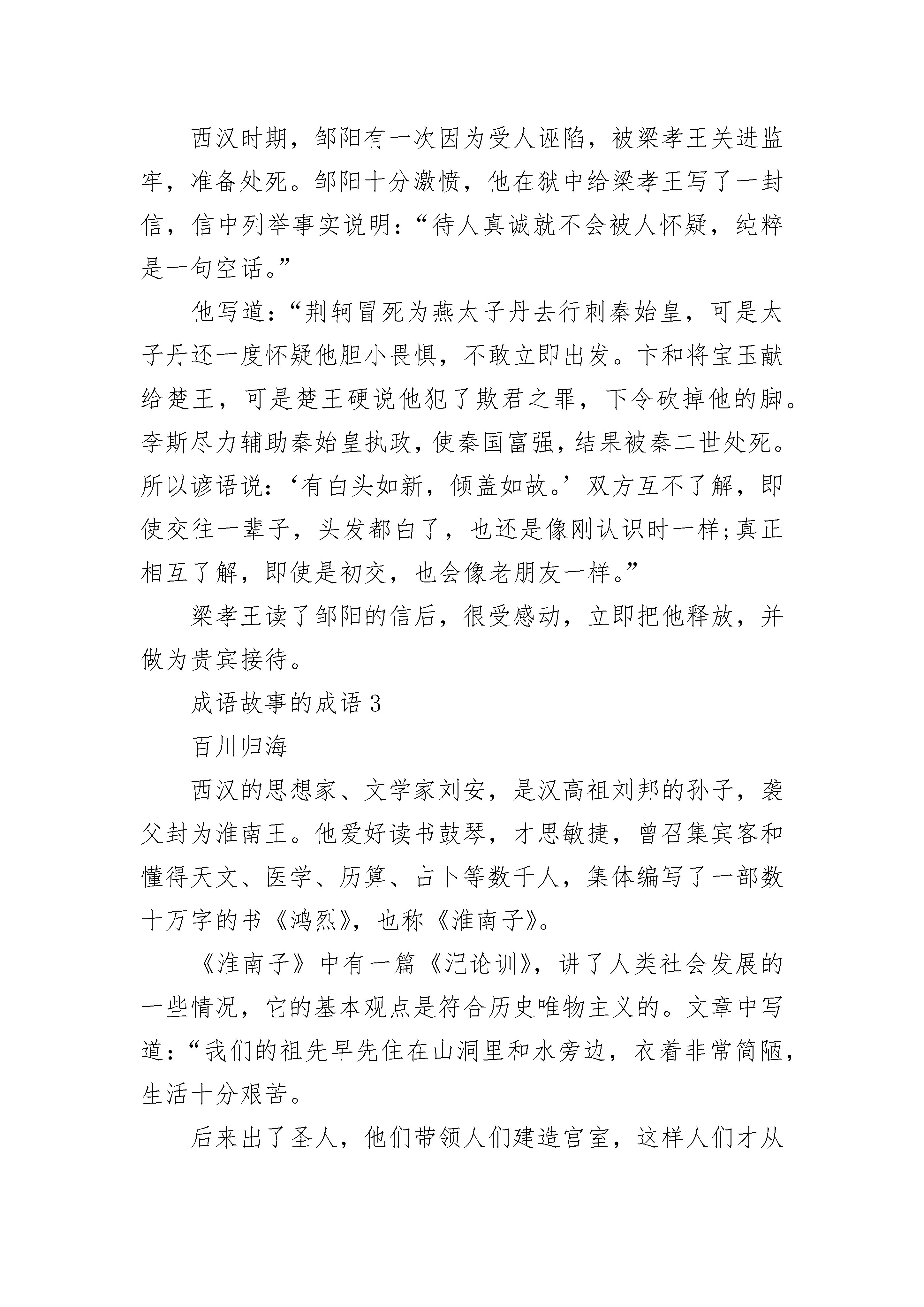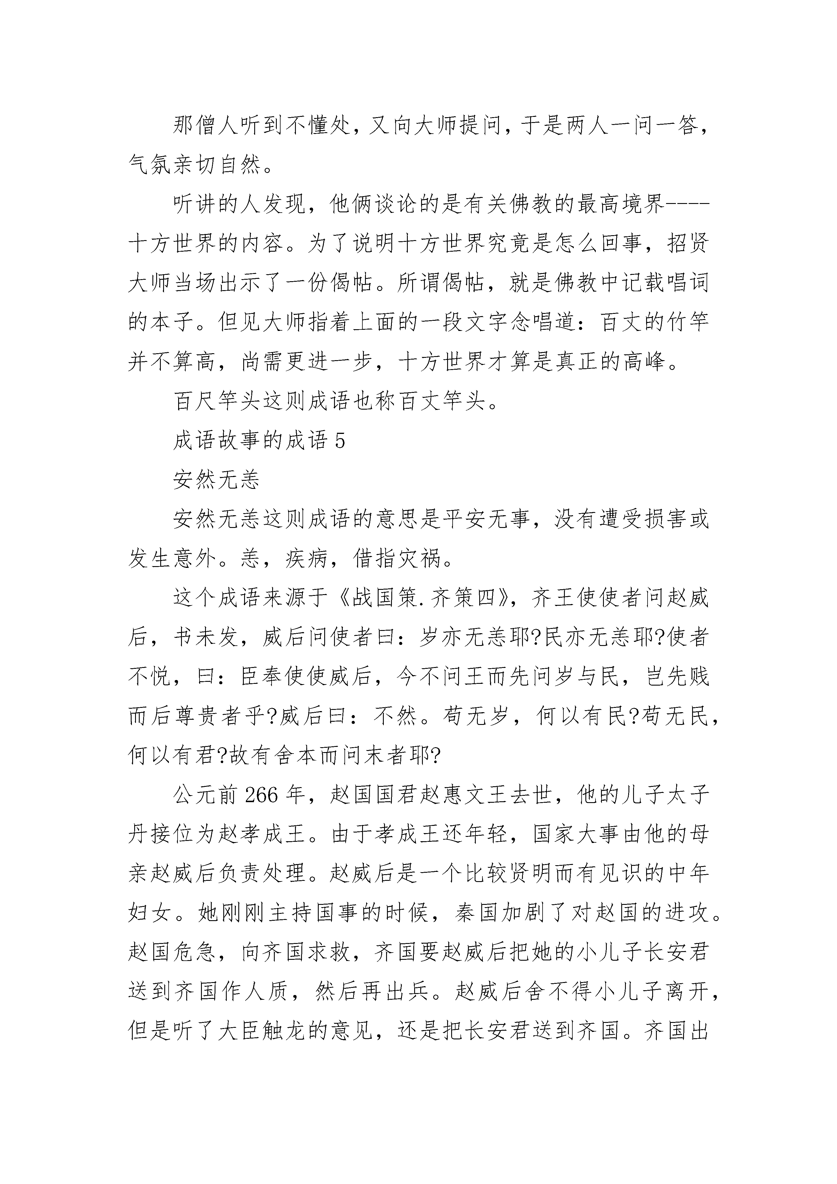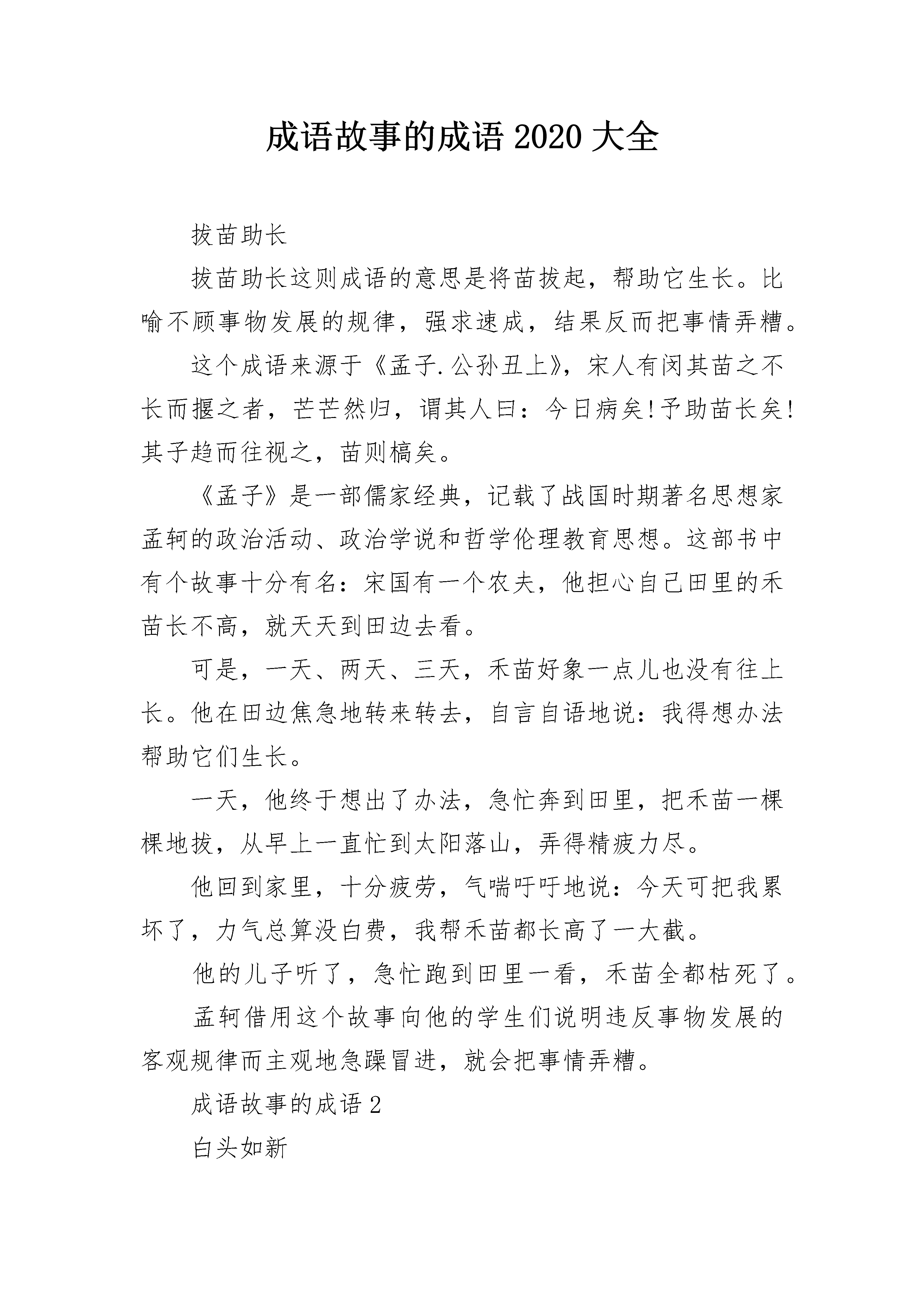成语故事的成语2020大全拔苗助长拔苗助长这则成语的意思是将苗拔起,帮助它生长。比喻不顾事物发展的规律,强求速成,结果反而把事情弄糟。这个成语来源于《孟子.公孙丑上》,宋人有闵其苗之不长而揠之者,芒芒然归,谓其人曰:今日病矣!予助苗长矣!其子趋而往视之,苗则槁矣。《孟子》是一部儒家经典,记载了战国时期著名思想家孟轲的政治活动、政治学说和哲学伦理教育思想。这部书中有个故事十分有名:宋国有一个农夫,他担心自己田里的禾苗长不高,就天天到田边去看。可是,一天、两天、三天,禾苗好象一点儿也没有往上长。他在田边焦急地转来转去,自言自语地说:我得想办法帮助它们生长。一天,他终于想出了办法,急忙奔到田里,把禾苗一棵棵地拔,从早上一直忙到太阳落山,弄得精疲力尽。他回到家里,十分疲劳,气喘吁吁地说:今天可把我累坏了,力气总算没白费,我帮禾苗都长高了一大截。他的儿子听了,急忙跑到田里一看,禾苗全都枯死了。孟轲借用这个故事向他的学生们说明违反事物发展的客观规律而主观地急躁冒进,就会把事情弄糟。成语故事的成语2白头如新西汉时期,邹阳有一次因为受人诬陷,被梁孝王关进监牢,准备处死。邹阳十分激愤,他在狱中给梁孝王写了一封信,信中列举事实说明:“待人真诚就不会被人怀疑,纯粹是一句空话。”他写道:“荆轲冒死为燕太子丹去行刺秦始皇,可是太子丹还一度怀疑他胆小畏惧,不敢立即出发。卞和将宝玉献给楚王,可是楚王硬说他犯了欺君之罪,下令砍掉他的脚。李斯尽力辅助秦始皇执政,使秦国富强,结果被秦二世处死。所以谚语说:‘有白头如新,倾盖如故。’双方互不了解,即使交往一辈子,头发都白了,也还是像刚认识时一样;真正相互了解,即使是初交,也会像老朋友一样。”梁孝王读了邹阳的信后,很受感动,立即把他释放,并做为贵宾接待。成语故事的成语3百川归海西汉的思想家、文学家刘安,是汉高祖刘邦的孙子,袭父封为淮南王。他爱好读书鼓琴,才思敏捷,曾召集宾客和懂得天文、医学、历算、占卜等数千人,集体编写了一部数十万字的书《鸿烈》,也称《淮南子》。《淮南子》中有一篇《汜论训》,讲了人类社会发展的一些情况,它的基本观点是符合历史唯物主义的。文章中写道:“我们的祖先早先住在山洞里和水旁边,衣着非常简陋,生活十分艰苦。后来出了圣人,他们带领人们建造宫室,这样人们才从山洞里走出来,住进了可以躲避风雨寒暑的房子。圣人又教人们制造农具和兵器,用来耕作和捕杀猛兽,使人们的生活比过去有了保障。后来,圣人又制礼作乐,订出各种各样的规矩,使人们有了礼节和约束。由此可见,社会是不断发展的,人们不是老是用一个方式生活。所以对古时候的制度,如果不再适合使用,就应该废除;而对于现在的,如果适合使用,就应该发扬。以上的一切都说明像千百条来自不同源头的江河,但最后都会归流入大海一样,各人做的事不同,但都是为了求得更好地治理社会,过更美好的生活。成语故事的成语4百丈竿头这个成语来源于宋.释道原《景德传灯录.招贤大师》,师示一偈曰:百丈竿头不动人,虽然得入未为真。百丈竿头须进步,十方世界是全身。宋朝时,长沙有位高僧名叫景岑,号招贤大师。这位太师佛学造诣高深,时常到各地去传道讲经。一天,招贤大师应邀到一座佛寺的法堂上讲经。前来听讲的僧人很多,大师讲得深入浅出,娓娓动听,听的人深受感染。法堂内除了大师的声音外,一片寂静。招贤大师讲经完毕后,一名僧人站立起来,问他行了一个礼,然后提了几个问题,请求大师解答。大师还了礼,慢慢地作答起来。那僧人听到不懂处,又向大师提问,于是两人一问一答,气氛亲切自然。听讲的人发现,他俩谈论的是有关佛教的最高境界----十方世界的内容。为了说明十方世界究竟是怎么回事,招贤大师当场出示了一份偈帖。所谓偈帖,就是佛教中记载唱词的本子。但见大师指着上面的一段文字念唱道:百丈的竹竿并不算高,尚需更进一步,十方世界才算是真正的高峰。百尺竿头这则成语也称百丈竿头。成语故事的成语5安然无恙安然无恙这则成语的意思是平安无事,没有遭受损害或发生意外。恙,疾病,借指灾祸。这个成语来源于《战国策.齐策四》,齐王使使者问赵威后,书未发,威后问使者曰:岁亦无恙耶?民亦无恙耶?使者不悦,曰:臣奉使使威后,今不问王而先问岁与民,岂先贱而后尊贵者乎?威后曰:不然。苟无岁,何以有民?苟无民,何以有君?故有舍本而问末者耶?公元前266年,赵国国君赵惠文王去世,他的儿子太子丹接位为赵孝成王。由于孝成王还年轻,国家大事由他的母亲赵威后负责处理。赵威后是一个比较贤明而有见识的中年妇女。她刚刚主持国事的时候,秦国加剧了对赵国的进攻。赵国危急,向齐国求救,齐国要赵威后把她的小儿子长安君送到齐国作人质,然后再出兵。赵威后舍不得小儿子离开,但是听了大臣触龙的意见,还是把长安君送到齐国。齐国出兵帮助赵国打退了秦军。有一次,齐王派使者带着信到赵国问候赵威后。威后还没
