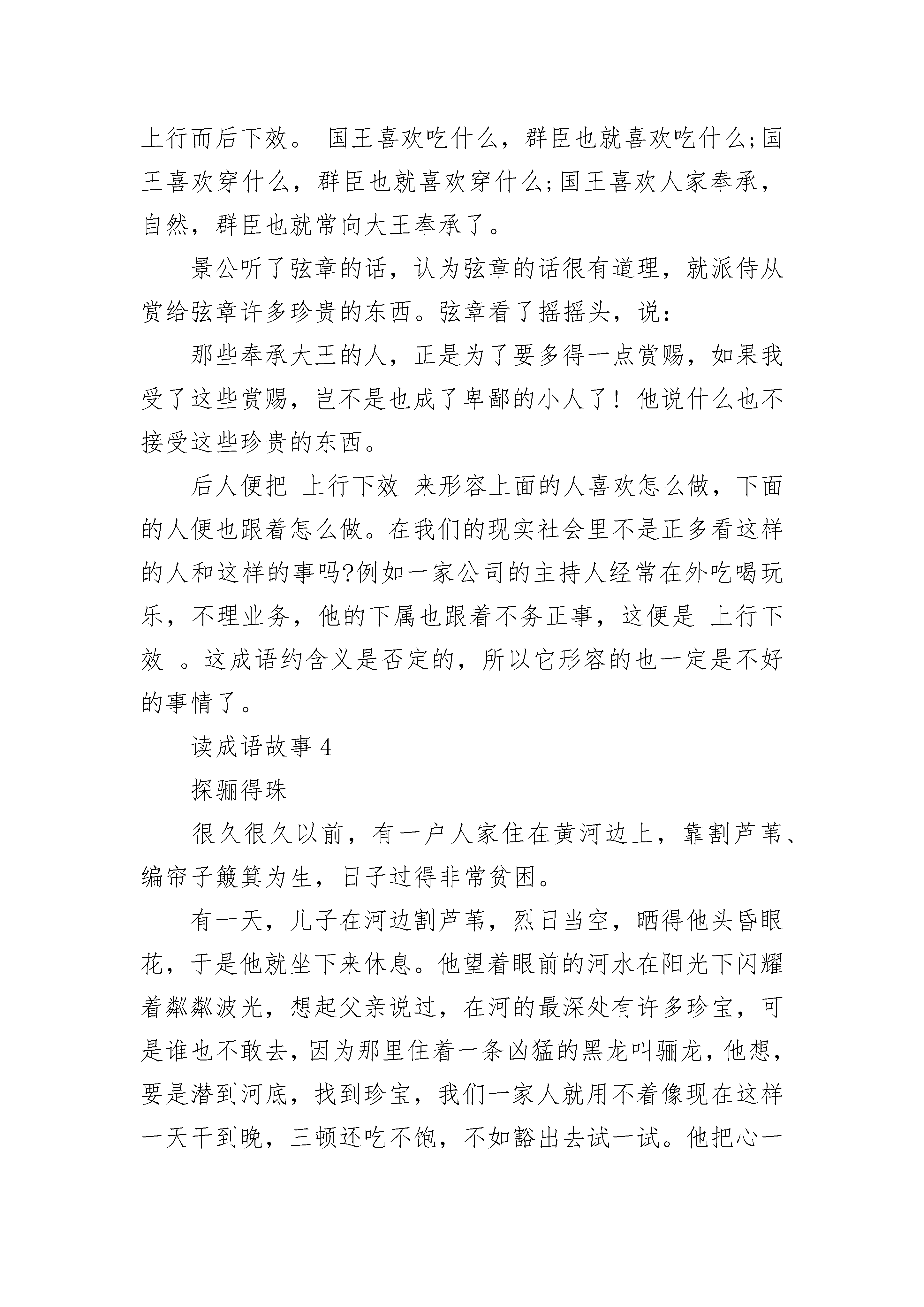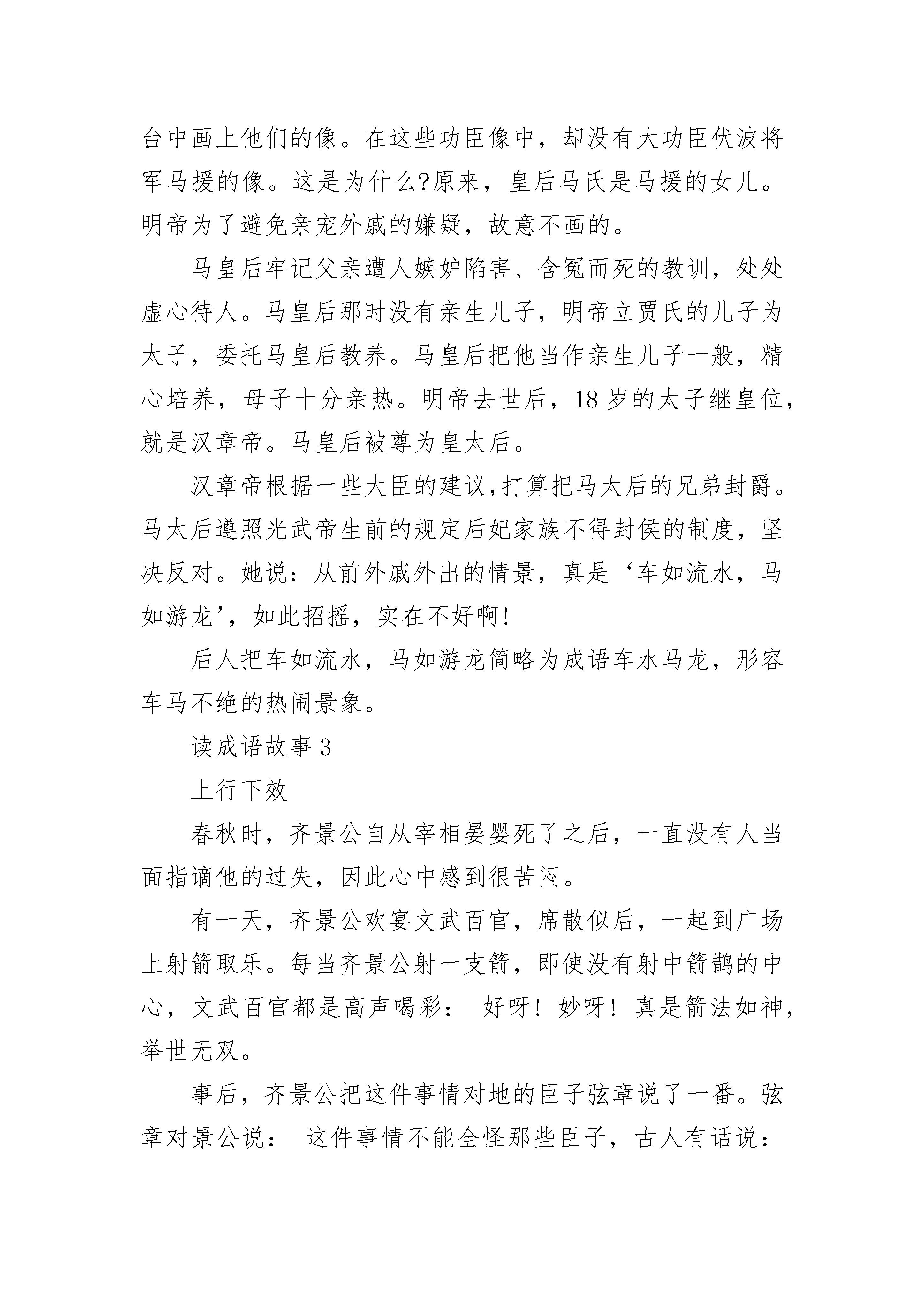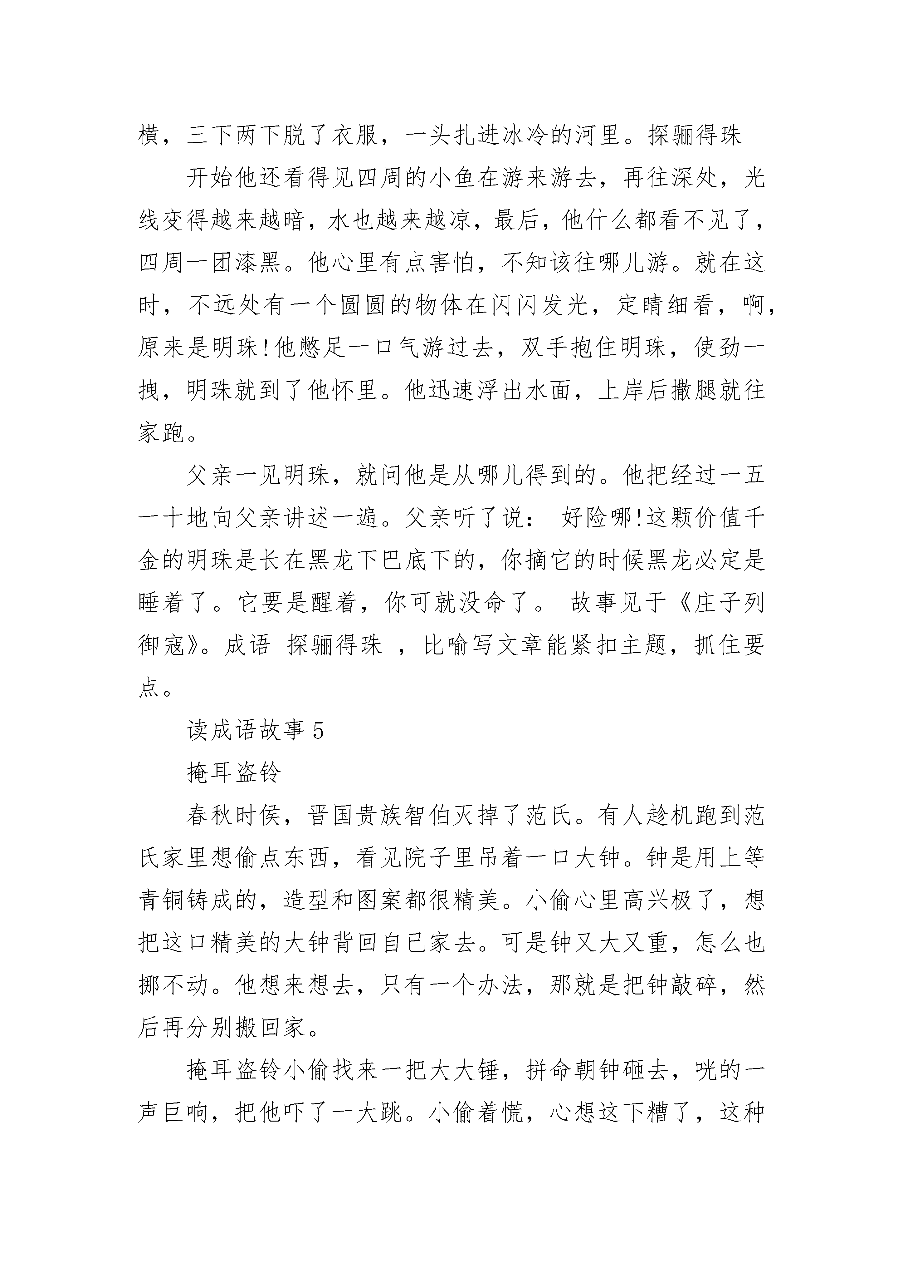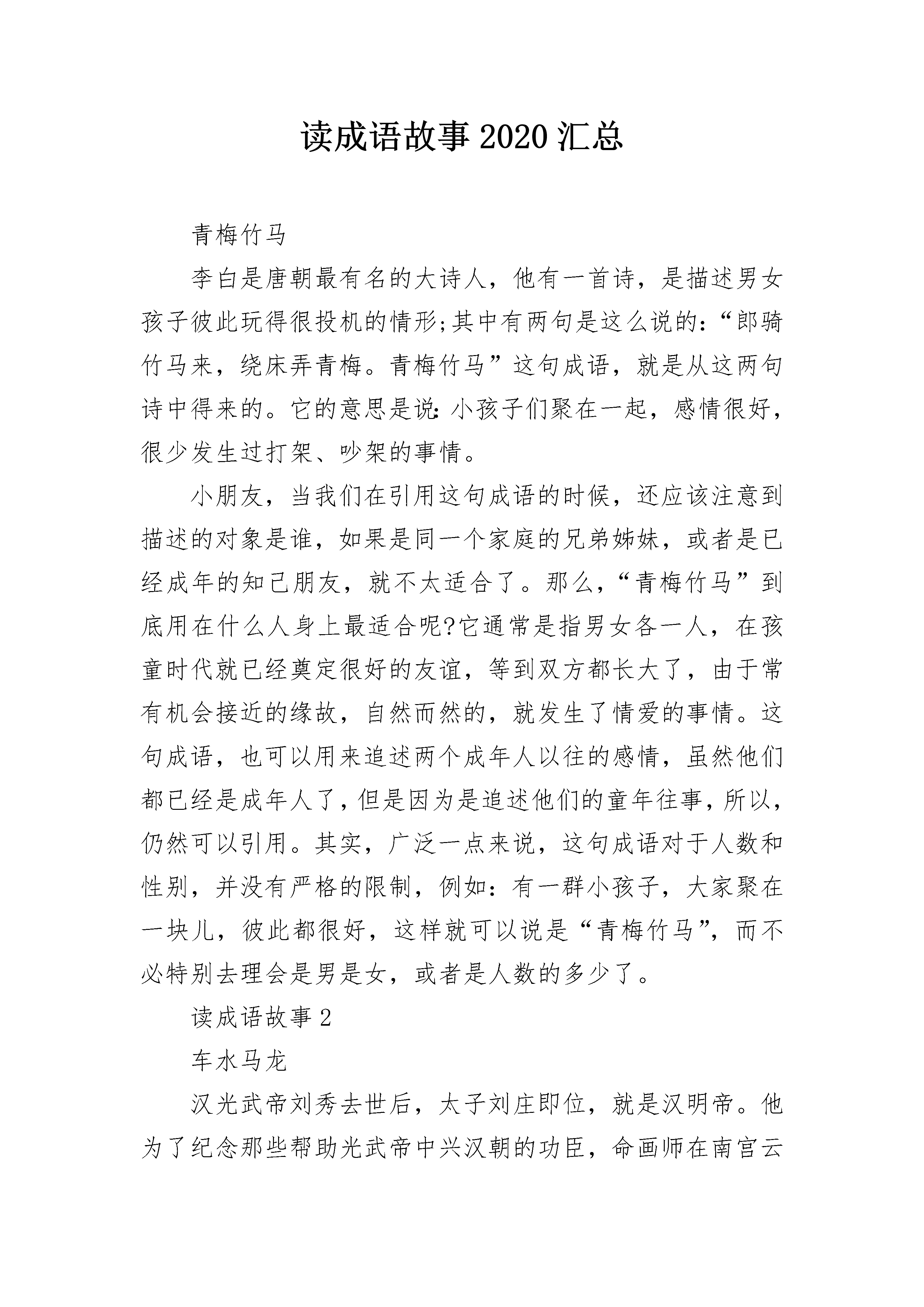 读成语故事2020汇总青梅竹马李白是唐朝最有名的大诗人,他有一首诗,是描述男女孩子彼此玩得很投机的情形;其中有两句是这么说的:“郎骑竹马来,绕床弄青梅。青梅竹马”这句成语,就是从这两句诗中得来的。它的意思是说:小孩子们聚在一起,感情很好,很少发生过打架、吵架的事情。小朋友,当我们在引用这句成语的时候,还应该注意到描述的对象是谁,如果是同一个家庭的兄弟姊妹,或者是已经成年的知己朋友,就不太适合了。那么,“青梅竹马”到底用在什么人身上最适合呢?它通常是指男女各一人,在孩童时代就已经奠定很好的友谊,等到双方都长大了,由于常有机会接近的缘故,自然而然的,就发生了情爱的事情。这句成语,也可以用来追述两个成年人以往的感情,虽然他们都已经是成年人了,但是因为是追述他们的童年往事,所以,仍然可以引用。其实,广泛一点来说,这句成语对于人数和性别,并没有严格的限制,例如:有一群小孩子,大家聚在一块儿,彼此都很好,这样就可以说是“青梅竹马”,而不必特别去理会是男是女,或者是人数的多少了。读成语故事2车水马龙汉光武帝刘秀去世后,太子刘庄即位,就是汉明帝。他为了纪念那些帮助光武帝中兴汉朝的功臣,命画师在南宫云台中画上他们的像。在这些功臣像中,却没有大功臣伏波将军马援的像。这是为什么?原来,皇后马氏是马援的女儿。明帝为了避免亲宠外戚的嫌疑,故意不画的。马皇后牢记父亲遭人嫉妒陷害、含冤而死的教训,处处虚心待人。马皇后那时没有亲生儿子,明帝立贾氏的儿子为太子,委托马皇后教养。马皇后把他当作亲生儿子一般,精心培养,母子十分亲热。明帝去世后,18岁的太子继皇位,就是汉章帝。马皇后被尊为皇太后。汉章帝根据一些大臣的建议,打算把马太后的兄弟封爵。马太后遵照光武帝生前的规定后妃家族不得封侯的制度,坚决反对。她说:从前外戚外出的情景,真是‘车如流水,马如游龙’,如此招摇,实在不好啊!后人把车如流水,马如游龙简略为成语车水马龙,形容车马不绝的热闹景象。读成语故事3上行下效春秋时,齐景公自从宰相晏婴死了之后,一直没有人当面指谪他的过失,因此心中感到很苦闷。有一天,齐景公欢宴文武百官,席散似后,一起到广场上射箭取乐。每当齐景公射一支箭,即使没有射中箭鹊的中心,文武百官都是高声喝彩:好呀!妙呀!真是箭法如神,举世无双。事后,齐景公把这件事情对地的臣子弦章说了一番。弦章对景公说:这件事情不能全怪那些臣子,古人有话说:上行而后下效。国王喜欢吃什么,群臣也就喜欢吃什么;国王喜欢穿什么,群臣也就喜欢穿什么;国王喜欢人家奉承,自然,群臣也就常向大王奉承了。景公听了弦章的话,认为弦章的话很有道理,就派侍从赏给弦章许多珍贵的东西。弦章看了摇摇头,说:那些奉承大王的人,正是为了要多得一点赏赐,如果我受了这些赏赐,岂不是也成了卑鄙的小人了!他说什么也不接受这些珍贵的东西。后人便把上行下效来形容上面的人喜欢怎么做,下面的人便也跟着怎么做。在我们的现实社会里不是正多看这样的人和这样的事吗?例如一家公司的主持人经常在外吃喝玩乐,不理业务,他的下属也跟着不务正事,这便是上行下效。这成语约含义是否定的,所以它形容的也一定是不好的事情了。读成语故事4探骊得珠很久很久以前,有一户人家住在黄河边上,靠割芦苇、编帘子簸箕为生,日子过得非常贫困。有一天,儿子在河边割芦苇,烈日当空,晒得他头昏眼花,于是他就坐下来休息。他望着眼前的河水在阳光下闪耀着粼粼波光,想起父亲说过,在河的最深处有许多珍宝,可是谁也不敢去,因为那里住着一条凶猛的黑龙叫骊龙,他想,要是潜到河底,找到珍宝,我们一家人就用不着像现在这样一天干到晚,三顿还吃不饱,不如豁出去试一试。他把心一横,三下两下脱了衣服,一头扎进冰冷的河里。探骊得珠开始他还看得见四周的小鱼在游来游去,再往深处,光线变得越来越暗,水也越来越凉,最后,他什么都看不见了,四周一团漆黑。他心里有点害怕,不知该往哪儿游。就在这时,不远处有一个圆圆的物体在闪闪发光,定睛细看,啊,原来是明珠!他憋足一口气游过去,双手抱住明珠,使劲一拽,明珠就到了他怀里。他迅速浮出水面,上岸后撒腿就往家跑。父亲一见明珠,就问他是从哪儿得到的。他把经过一五一十地向父亲讲述一遍。父亲听了说:好险哪!这颗价值千金的明珠是长在黑龙下巴底下的,你摘它的时候黑龙必定是睡着了。它要是醒着,你可就没命了。故事见于《庄子列御寇》。成语探骊得珠,比喻写文章能紧扣主题,抓住要点。读成语故事5掩耳盗铃春秋时侯,晋国贵族智伯灭掉了范氏。有人趁机跑到范氏家里想偷点东西,看见院子里吊着一口大钟。钟是用上等青铜铸成的,造型和图案都很精美。小偷心里高兴极了,想把这口精美的大钟背回自已家去。可是钟又大又重,怎么也挪不动。他想来想去,只有一个办法,那就是把钟敲碎,然后再分别搬回家。掩耳盗铃小偷找来一把大大锤,拼命朝钟砸去,咣的一声巨响,把他吓了一