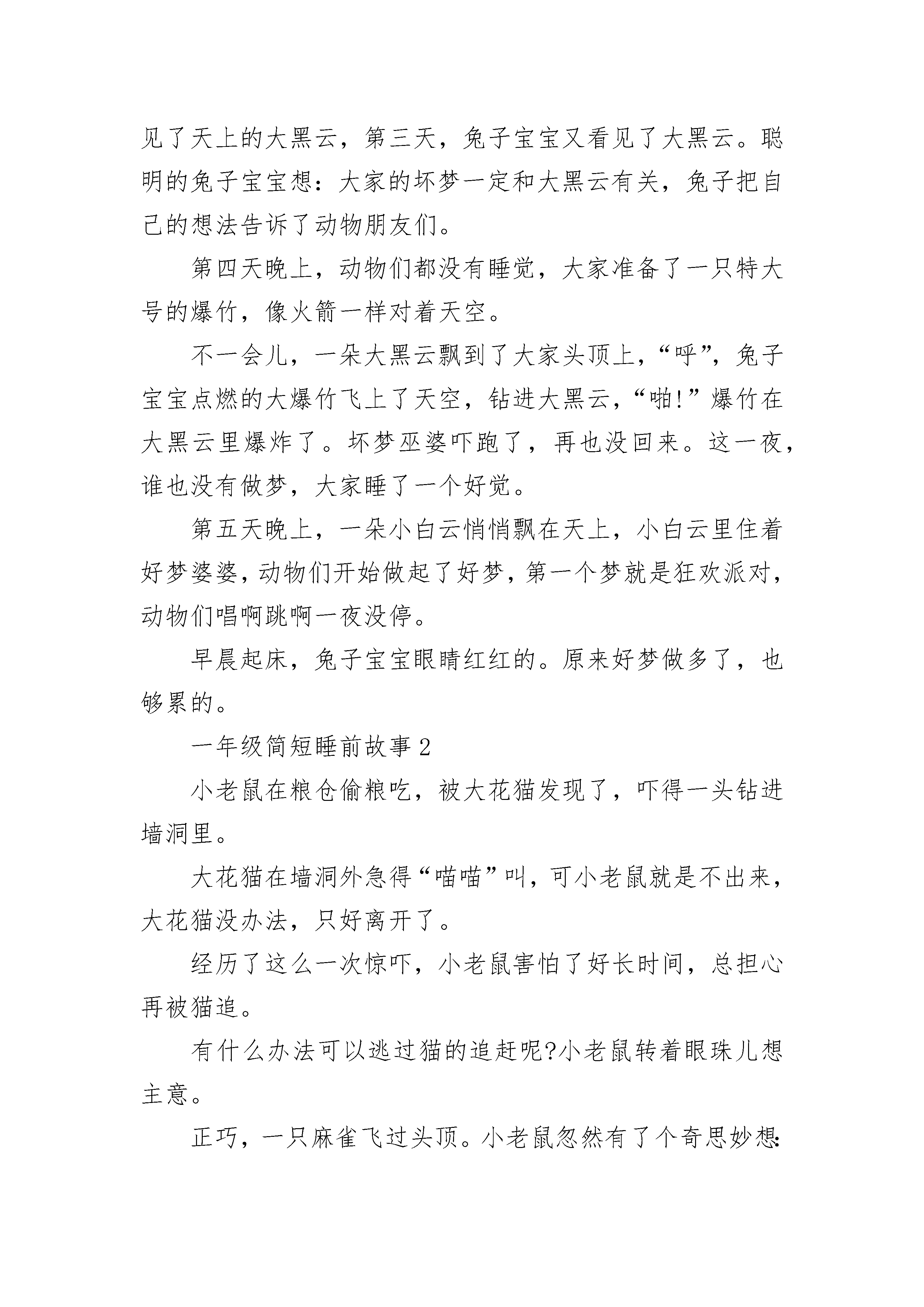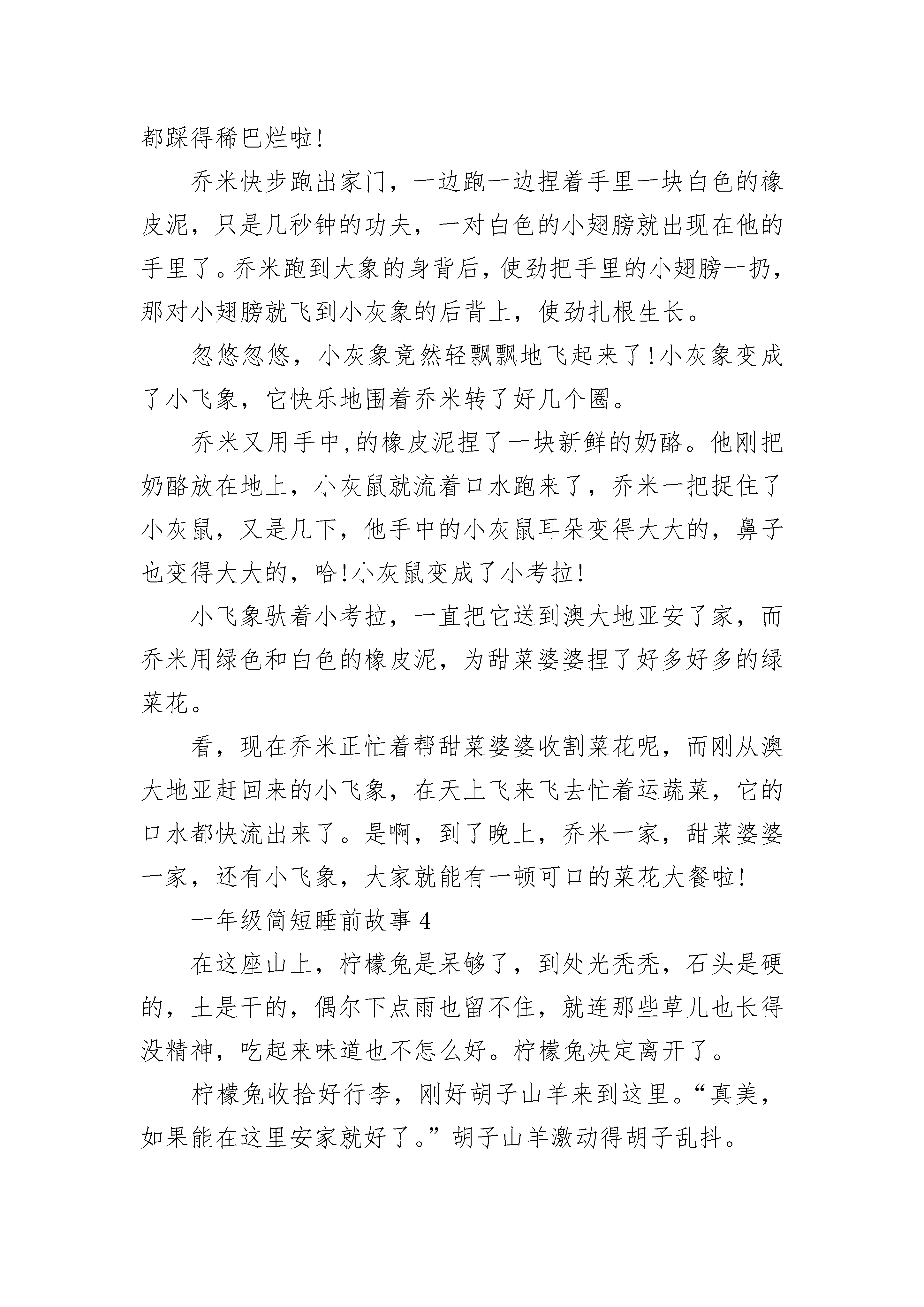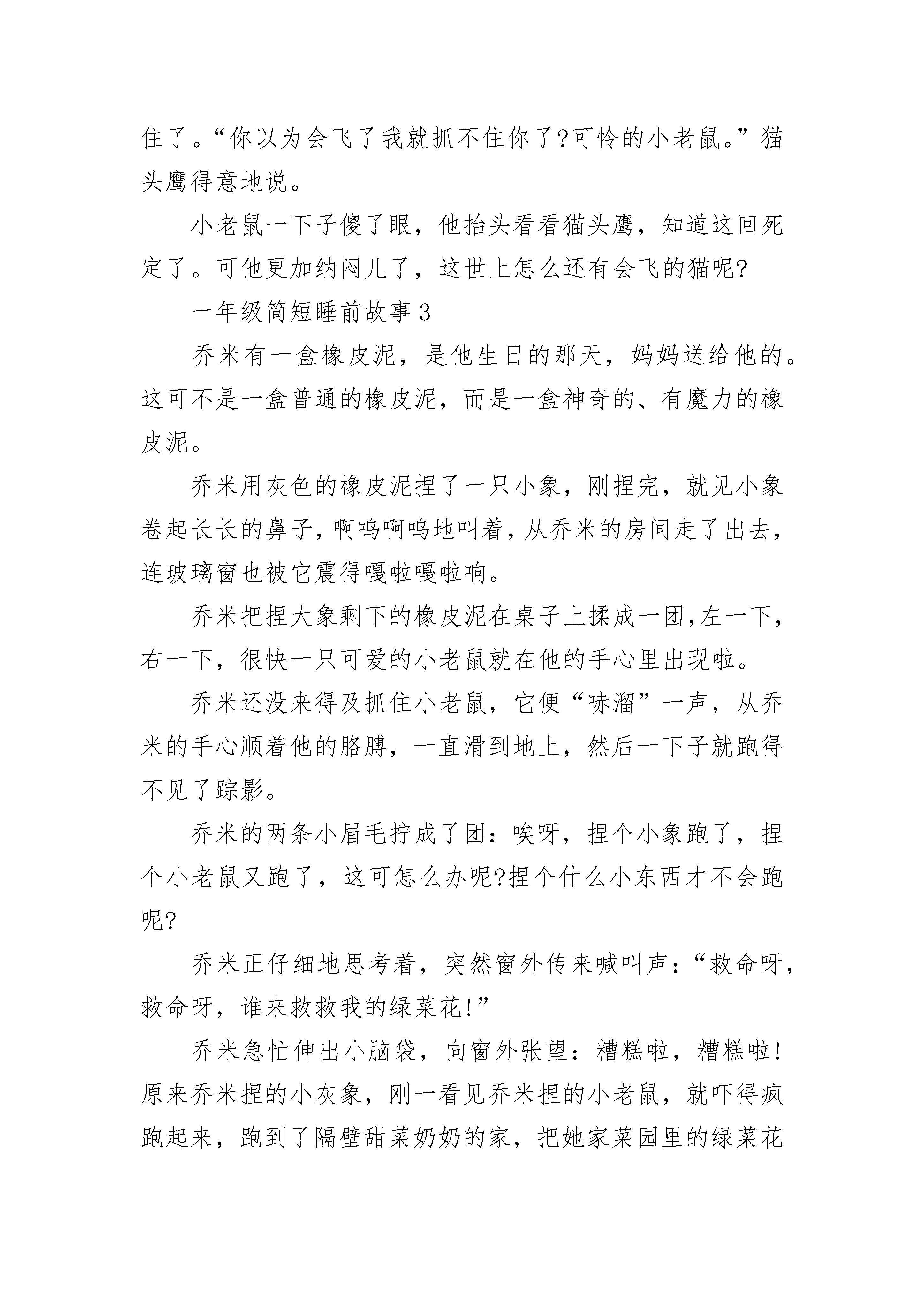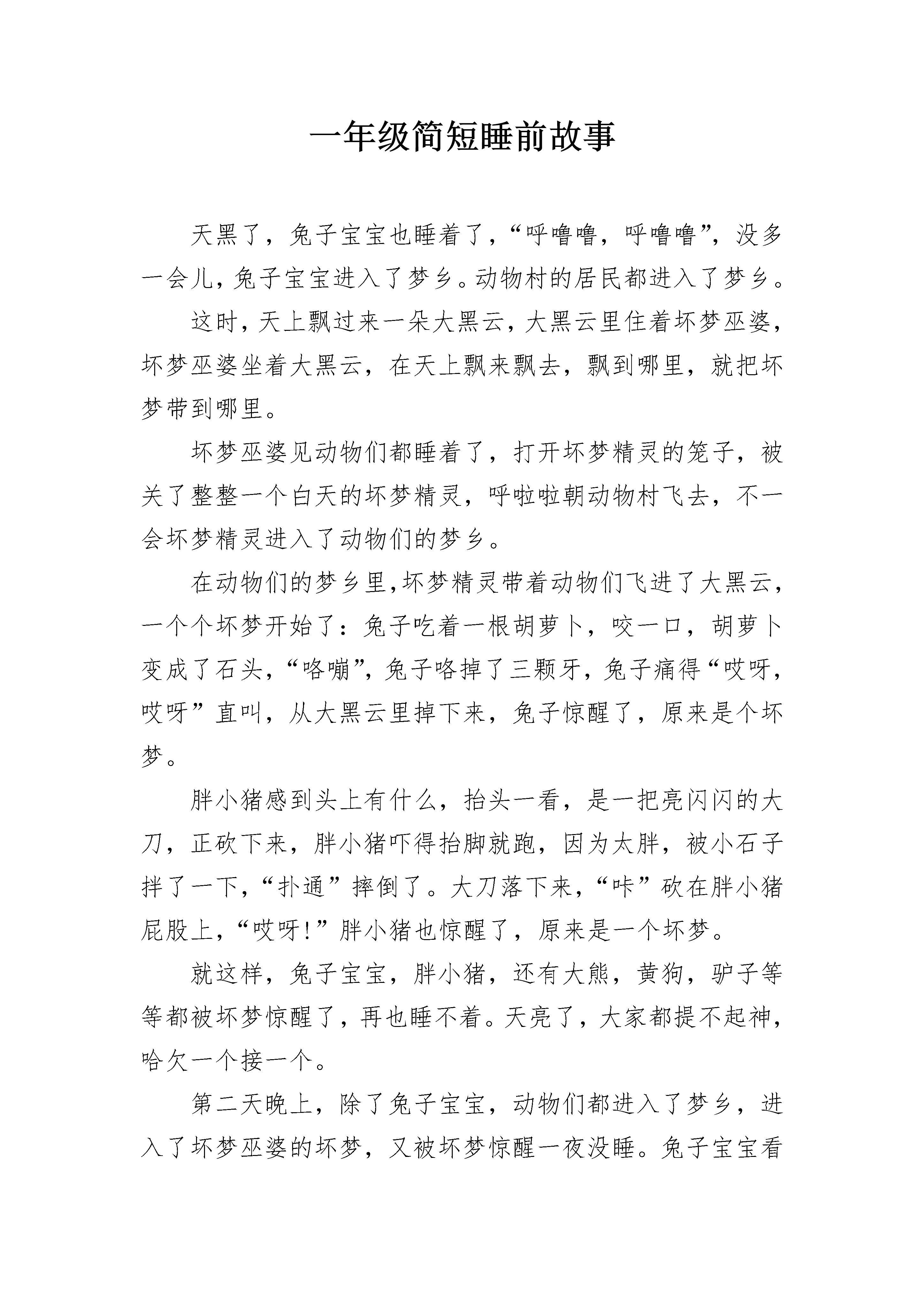 一年级简短睡前故事天黑了,兔子宝宝也睡着了,“呼噜噜,呼噜噜”,没多一会儿,兔子宝宝进入了梦乡。动物村的居民都进入了梦乡。这时,天上飘过来一朵大黑云,大黑云里住着坏梦巫婆,坏梦巫婆坐着大黑云,在天上飘来飘去,飘到哪里,就把坏梦带到哪里。坏梦巫婆见动物们都睡着了,打开坏梦精灵的笼子,被关了整整一个白天的坏梦精灵,呼啦啦朝动物村飞去,不一会坏梦精灵进入了动物们的梦乡。在动物们的梦乡里,坏梦精灵带着动物们飞进了大黑云,一个个坏梦开始了:兔子吃着一根胡萝卜,咬一口,胡萝卜变成了石头,“咯嘣”,兔子咯掉了三颗牙,兔子痛得“哎呀,哎呀”直叫,从大黑云里掉下来,兔子惊醒了,原来是个坏梦。胖小猪感到头上有什么,抬头一看,是一把亮闪闪的大刀,正砍下来,胖小猪吓得抬脚就跑,因为太胖,被小石子拌了一下,“扑通”摔倒了。大刀落下来,“咔”砍在胖小猪屁股上,“哎呀!”胖小猪也惊醒了,原来是一个坏梦。就这样,兔子宝宝,胖小猪,还有大熊,黄狗,驴子等等都被坏梦惊醒了,再也睡不着。天亮了,大家都提不起神,哈欠一个接一个。第二天晚上,除了兔子宝宝,动物们都进入了梦乡,进入了坏梦巫婆的坏梦,又被坏梦惊醒一夜没睡。兔子宝宝看见了天上的大黑云,第三天,兔子宝宝又看见了大黑云。聪明的兔子宝宝想:大家的坏梦一定和大黑云有关,兔子把自己的想法告诉了动物朋友们。第四天晚上,动物们都没有睡觉,大家准备了一只特大号的爆竹,像火箭一样对着天空。不一会儿,一朵大黑云飘到了大家头顶上,“呼”,兔子宝宝点燃的大爆竹飞上了天空,钻进大黑云,“啪!”爆竹在大黑云里爆炸了。坏梦巫婆吓跑了,再也没回来。这一夜,谁也没有做梦,大家睡了一个好觉。第五天晚上,一朵小白云悄悄飘在天上,小白云里住着好梦婆婆,动物们开始做起了好梦,第一个梦就是狂欢派对,动物们唱啊跳啊一夜没停。早晨起床,兔子宝宝眼睛红红的。原来好梦做多了,也够累的。一年级简短睡前故事2小老鼠在粮仓偷粮吃,被大花猫发现了,吓得一头钻进墙洞里。大花猫在墙洞外急得“喵喵”叫,可小老鼠就是不出来,大花猫没办法,只好离开了。经历了这么一次惊吓,小老鼠害怕了好长时间,总担心再被猫追。有什么办法可以逃过猫的追赶呢?小老鼠转着眼珠儿想主意。正巧,一只麻雀飞过头顶。小老鼠忽然有了个奇思妙想:要是自己能飞,就再也不怕猫追了。我要练习飞翔!小老鼠下定决心。于是他拼尽全力向前冲,希望自己能飞起来。可任凭他再怎么使劲,还是不能彻底离开地面。“哈哈,你们老鼠是不能飞的,怎么练习也没用!”麻雀告诉他。“不可能!”小老鼠不相信,还是拼命跑。傍晚,小老鼠累得要死,可他还是不甘心,依然拖着沉重的双腿,艰难地向前挪着步。一只蝙蝠飞过来。“咦,这不就是只飞翔的老鼠嘛!”小老鼠兴奋地朝空中大喊,“喂,你这只老鼠,是怎么飞起来的?”蝙蝠一听乐得吱吱叫:“什么?我才不是老鼠呢!我是一只蝙蝠,我们天生就会飞。”“你就是只老鼠,骗不了我,快告诉我,你是怎么飞起来的?”小老鼠生气地说。“这个嘛——”蝙蝠觉得小老鼠很讨厌,决定教训一下他,“你爬上前面的高山,然后冲下悬崖,当身体腾空的时候,你自然就会飞了。”“哦,这么简单啊!我就知道我一定能飞。”小老鼠兴奋地往山上爬。到了山顶,他奋力冲下悬崖。当身子腾空而起时,他激动得朝山谷大喊:“我会飞了,我再也不怕猫了。”可谁知,话音未落,就被一只悄然飞来的猫头鹰牢牢抓住了。“你以为会飞了我就抓不住你了?可怜的小老鼠。”猫头鹰得意地说。小老鼠一下子傻了眼,他抬头看看猫头鹰,知道这回死定了。可他更加纳闷儿了,这世上怎么还有会飞的猫呢?一年级简短睡前故事3乔米有一盒橡皮泥,是他生日的那天,妈妈送给他的。这可不是一盒普通的橡皮泥,而是一盒神奇的、有魔力的橡皮泥。乔米用灰色的橡皮泥捏了一只小象,刚捏完,就见小象卷起长长的鼻子,啊呜啊呜地叫着,从乔米的房间走了出去,连玻璃窗也被它震得嘎啦嘎啦响。乔米把捏大象剩下的橡皮泥在桌子上揉成一团,左一下,右一下,很快一只可爱的小老鼠就在他的手心里出现啦。乔米还没来得及抓住小老鼠,它便“哧溜”一声,从乔米的手心顺着他的胳膊,一直滑到地上,然后一下子就跑得不见了踪影。乔米的两条小眉毛拧成了团:唉呀,捏个小象跑了,捏个小老鼠又跑了,这可怎么办呢?捏个什么小东西才不会跑呢?乔米正仔细地思考着,突然窗外传来喊叫声:“救命呀,救命呀,谁来救救我的绿菜花!”乔米急忙伸出小脑袋,向窗外张望:糟糕啦,糟糕啦!原来乔米捏的小灰象,刚一看见乔米捏的小老鼠,就吓得疯跑起来,跑到了隔壁甜菜奶奶的家,把她家菜园里的绿菜花都踩得稀巴烂啦!乔米快步跑出家门,一边跑一边捏着手里一块白色的橡皮泥,只是几秒钟的功夫,一对白色的小翅膀就出现在他的手里了。乔米跑到大象的身背后,使劲把手里的小翅膀一扔,那对小翅膀就飞到小灰象的后背上,使劲扎根生长。忽悠忽悠,小灰象