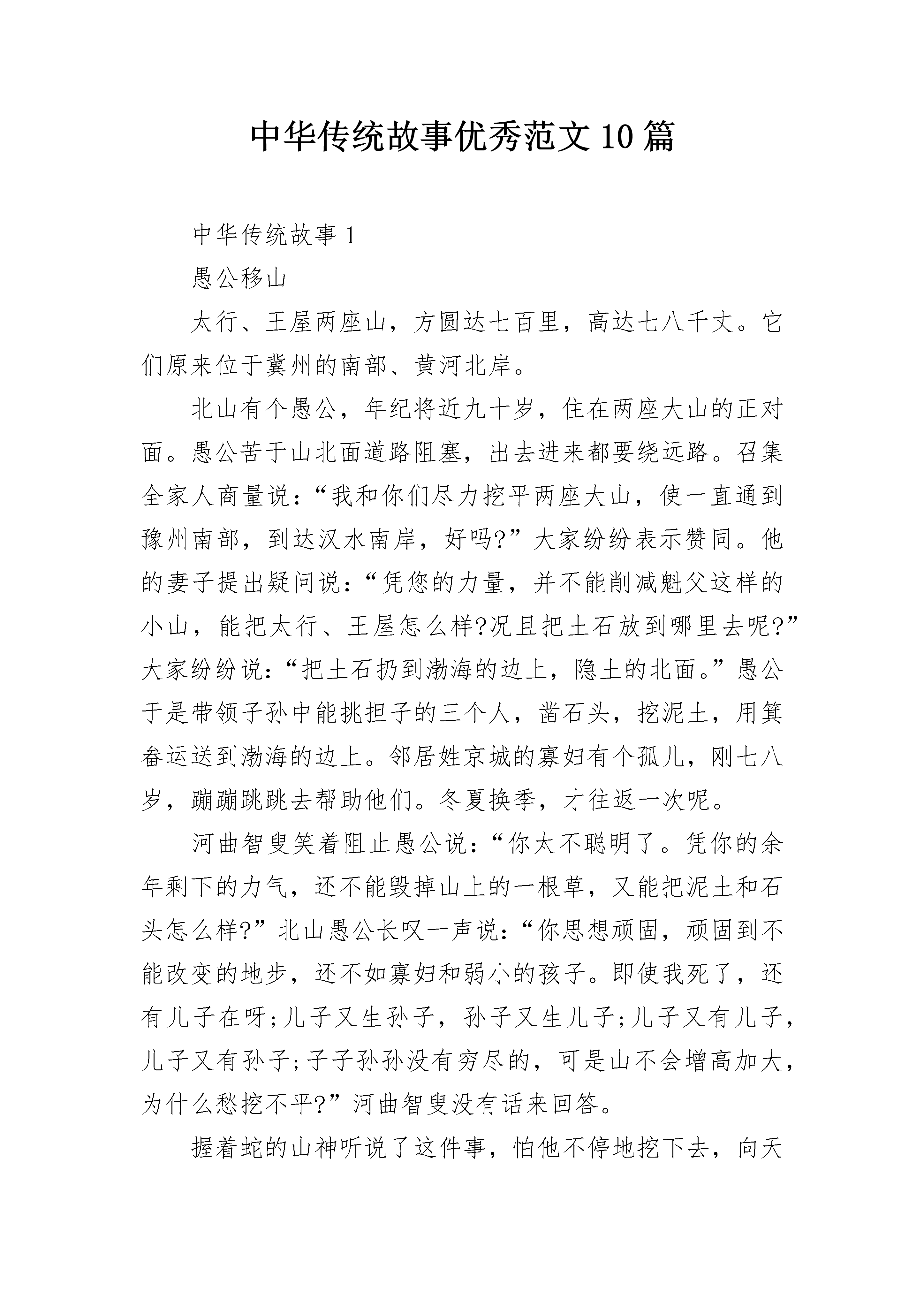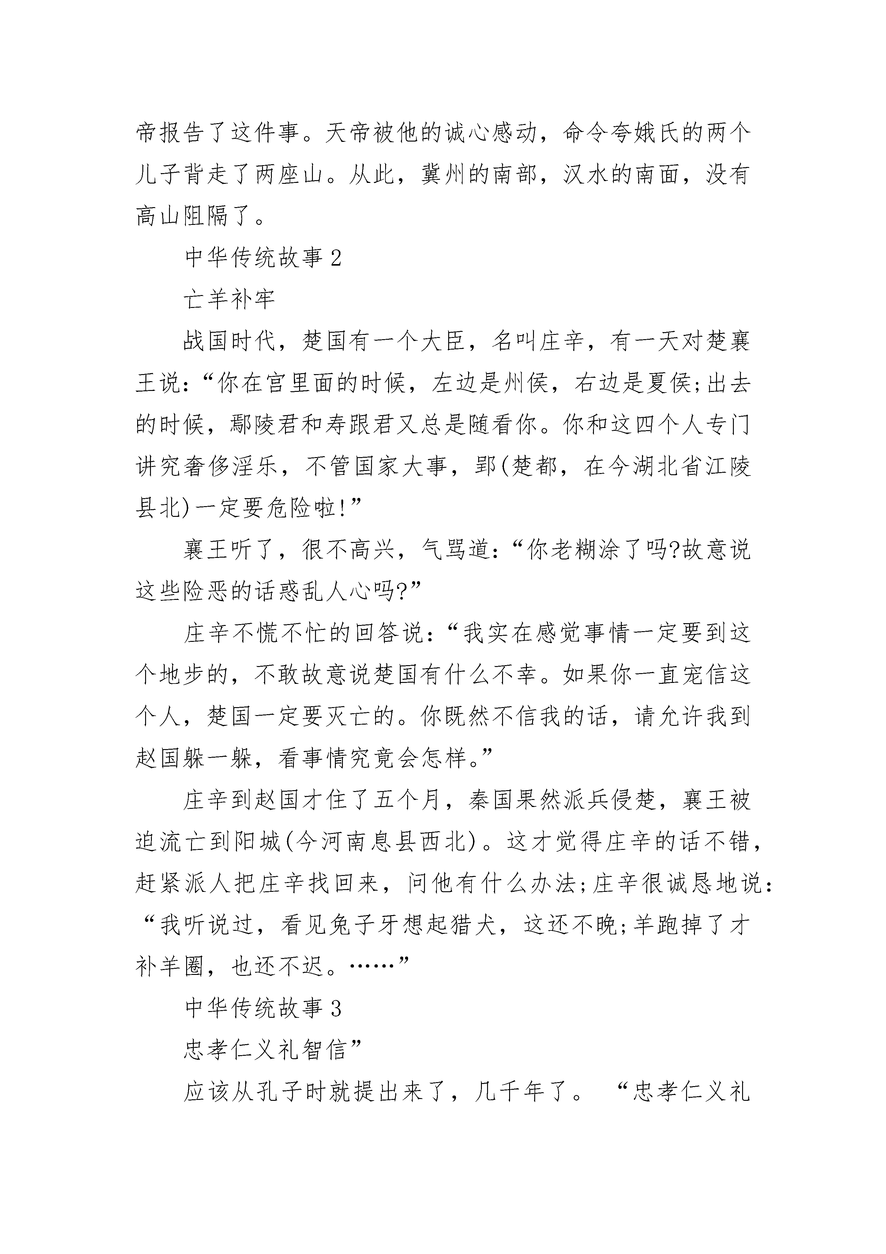 中华传统故事优秀范文10篇中华传统故事1愚公移山太行、王屋两座山,方圆达七百里,高达七八千丈。它们原来位于冀州的南部、黄河北岸。北山有个愚公,年纪将近九十岁,住在两座大山的正对面。愚公苦于山北面道路阻塞,出去进来都要绕远路。召集全家人商量说:“我和你们尽力挖平两座大山,使一直通到豫州南部,到达汉水南岸,好吗?”大家纷纷表示赞同。他的妻子提出疑问说:“凭您的力量,并不能削减魁父这样的小山,能把太行、王屋怎么样?况且把土石放到哪里去呢?”大家纷纷说:“把土石扔到渤海的边上,隐土的北面。”愚公于是带领子孙中能挑担子的三个人,凿石头,挖泥土,用箕畚运送到渤海的边上。邻居姓京城的寡妇有个孤儿,刚七八岁,蹦蹦跳跳去帮助他们。冬夏换季,才往返一次呢。河曲智叟笑着阻止愚公说:“你太不聪明了。凭你的余年剩下的力气,还不能毁掉山上的一根草,又能把泥土和石头怎么样?”北山愚公长叹一声说:“你思想顽固,顽固到不能改变的地步,还不如寡妇和弱小的孩子。即使我死了,还有儿子在呀;儿子又生孙子,孙子又生儿子;儿子又有儿子,儿子又有孙子;子子孙孙没有穷尽的,可是山不会增高加大,为什么愁挖不平?”河曲智叟没有话来回答。握着蛇的山神听说了这件事,怕他不停地挖下去,向天帝报告了这件事。天帝被他的诚心感动,命令夸娥氏的两个儿子背走了两座山。从此,冀州的南部,汉水的南面,没有高山阻隔了。中华传统故事2亡羊补牢战国时代,楚国有一个大臣,名叫庄辛,有一天对楚襄王说:“你在宫里面的时候,左边是州侯,右边是夏侯;出去的时候,鄢陵君和寿跟君又总是随看你。你和这四个人专门讲究奢侈淫乐,不管国家大事,郢(楚都,在今湖北省江陵县北)一定要危险啦!”襄王听了,很不高兴,气骂道:“你老糊涂了吗?故意说这些险恶的话惑乱人心吗?”庄辛不慌不忙的回答说:“我实在感觉事情一定要到这个地步的,不敢故意说楚国有什么不幸。如果你一直宠信这个人,楚国一定要灭亡的。你既然不信我的话,请允许我到赵国躲一躲,看事情究竟会怎样。”庄辛到赵国才住了五个月,秦国果然派兵侵楚,襄王被迫流亡到阳城(今河南息县西北)。这才觉得庄辛的话不错,赶紧派人把庄辛找回来,问他有什么办法;庄辛很诚恳地说:“我听说过,看见兔子牙想起猎犬,这还不晚;羊跑掉了才补羊圈,也还不迟。……”中华传统故事3忠孝仁义礼智信”应该从孔子时就提出来了,几千年了。“忠孝仁义礼智信”中,“忠孝”是最基本的。忠是立国之本;孝是立家之本。“忠孝”两字,支撑着这个国家、民族以至于整个家庭的“大厦”,就如“四根柱子”,屹立不动;否则,家国大厦将倾。“仁义礼智信”称之为“五常”,(三纲:指君为臣纲,父为子纲,夫为妻纲;五常:指仁、义、礼、智、信。)这是立身之本。现在有必要学习发扬广大。提倡“忠”,就是热爱祖国,忠于职守。忠的本义,是指人在祭祀时要保持肃穆恭敬的态度。后来,引申为人要忠于君主及国家等多种含义,一般特指为“忠君爱国”,正如孔子说,“君使臣以礼,臣事君以忠”。这方面,抗金名将岳飞被认为是“忠”的典范。现在不需要“忠君”,但把忠君延伸为爱国,这是新时代的人最起码的要求。忠于职守,就是忠于你的单位、忠于你从事的工作。至少,你不能当一天和尚不撞一天钟,不能占着茅坑不拉屎,更不能象邓小平说的有些人那样,拿起筷子吃肉,放下筷子骂娘。提倡“孝”,就是孝敬父母,尊老敬贤。孝字上半部是“老”字的一半,下半部是“子”字全形,上一代人与下一代人融为一体,儿子继承老子,子能承其亲,并能顺其意,所以,孔子把“善事父母”的人士,称之为“孝”者。“百善孝为先”,中国的孝文化源远流长,在传统文化占有重要之地,不忠不孝之徒不能立于天地之间。最典型的当属“二十四孝”的故事。古人非常强调孝道,并且有绝对化的思想,如“父命难违”、“父叫子亡子必亡”等,这些是不可取的。但是,孝是维系社会的最小细胞家庭的基本纽带,如果子孙不孝,这个家庭就将乱套,这个国家就将乱套。所以,孔子提倡“父母在,不远游,游必有方”。尤其是对待父母,关键是要真心爱敬,缺乏爱敬,不赡养父母,就跟养个猪养个狗没有什么区别了。孝道的另一引申义,就是要尊老敬贤,一个社会只有这样,老者有所养,贤者有所尊,这个社会就文明进步。一个不孝者,他能蒙人一时,却不能蒙混一世一定会被社会抛弃的。提倡“仁”,就是以人为本,富有爱心。孔子说,仁就是“爱人”。“仁”体现人的高尚情怀,是仅次于德的、人类所特有的一种美好的情操。古代君主把推行仁政,作为孜孜以求的目标。仁的核心,就是要以人为本,一切从关怀人、爱护人、发展人的'目标出发,使这个国家民族达到和谐的最佳状态,《礼记》说,“上下相亲谓之仁”,能够做到上下相亲,这个社会一定是很和谐的。仁的思想,还体现在众生平等的状态,孔子的教育观是“有教无类”,社会平等才能体现爱心,如果对待别人,不是出于一种平等的