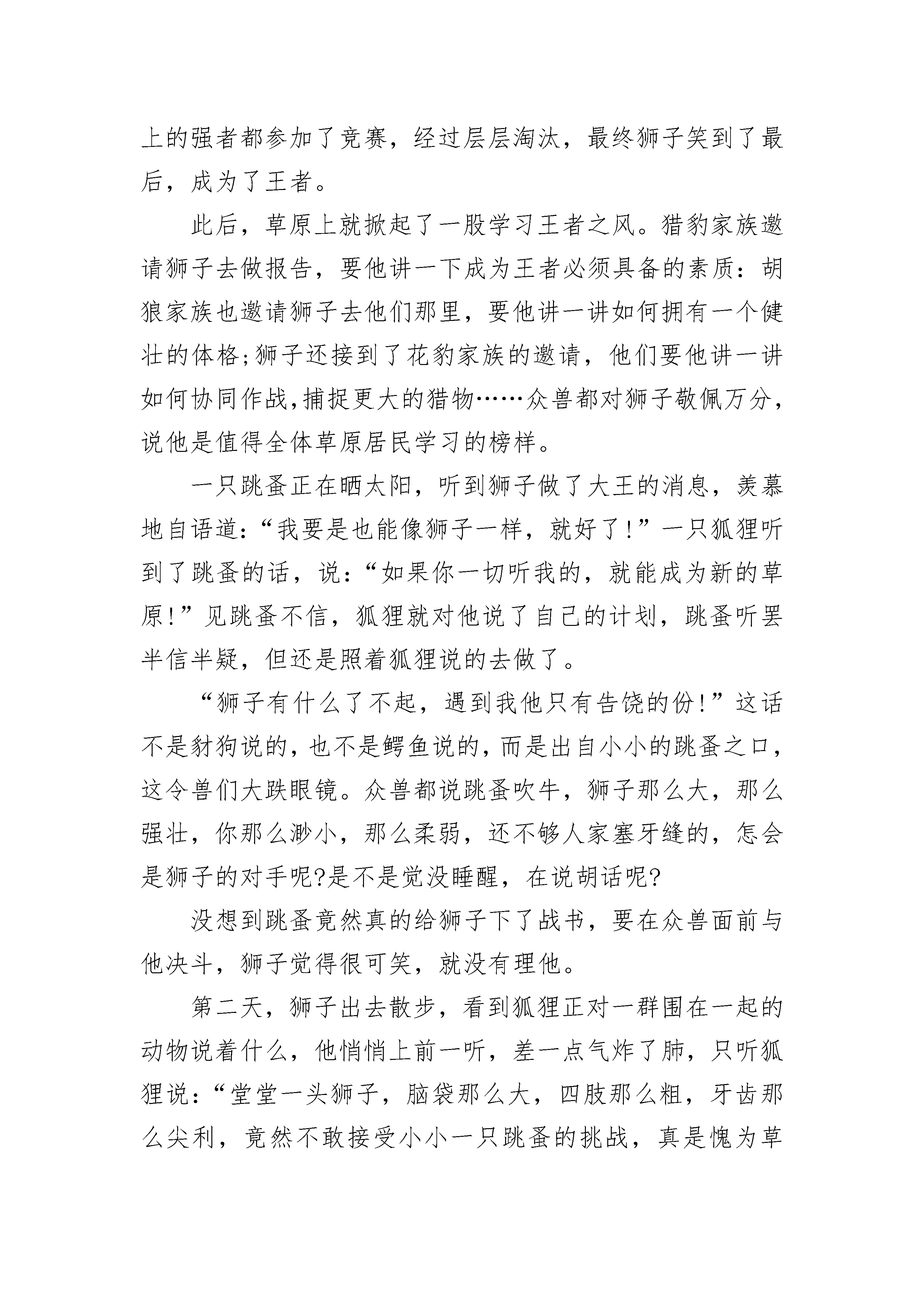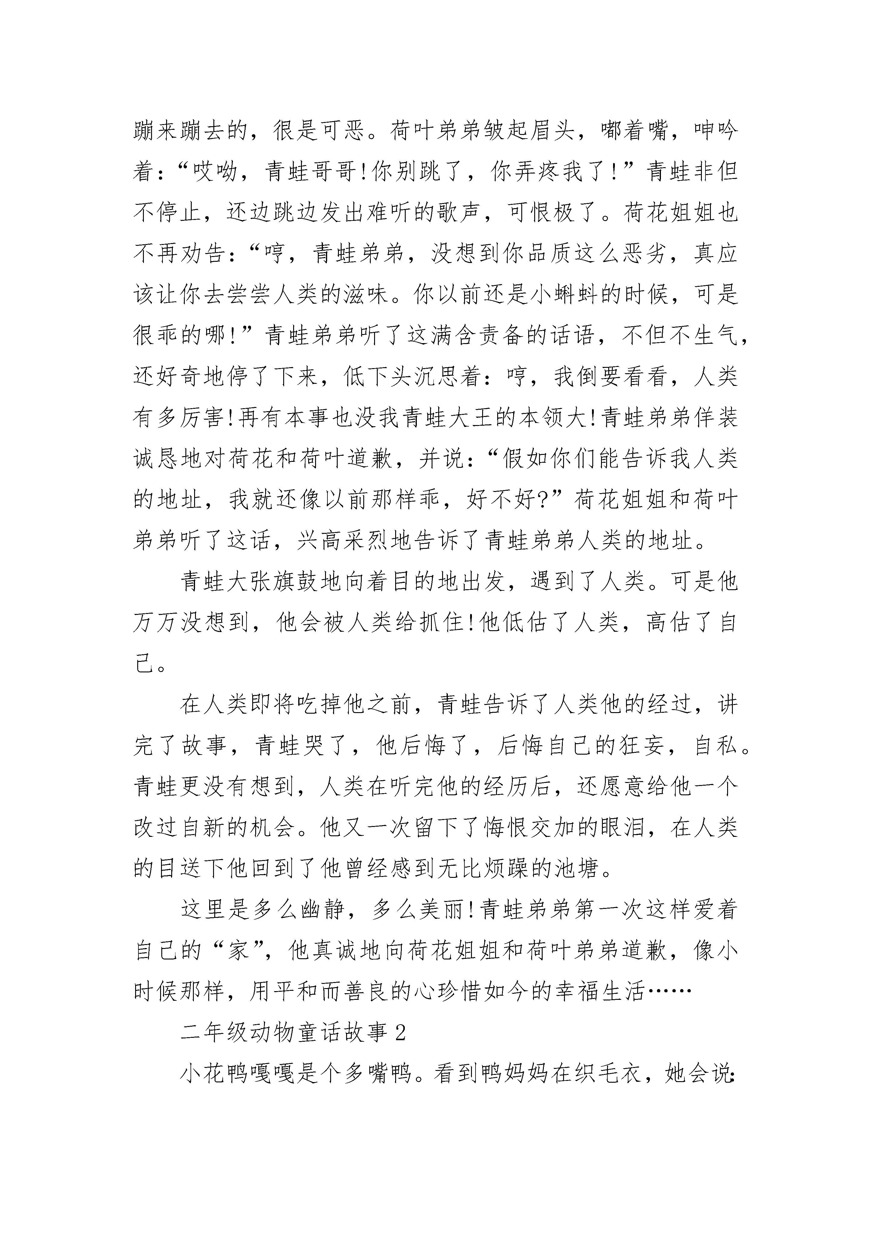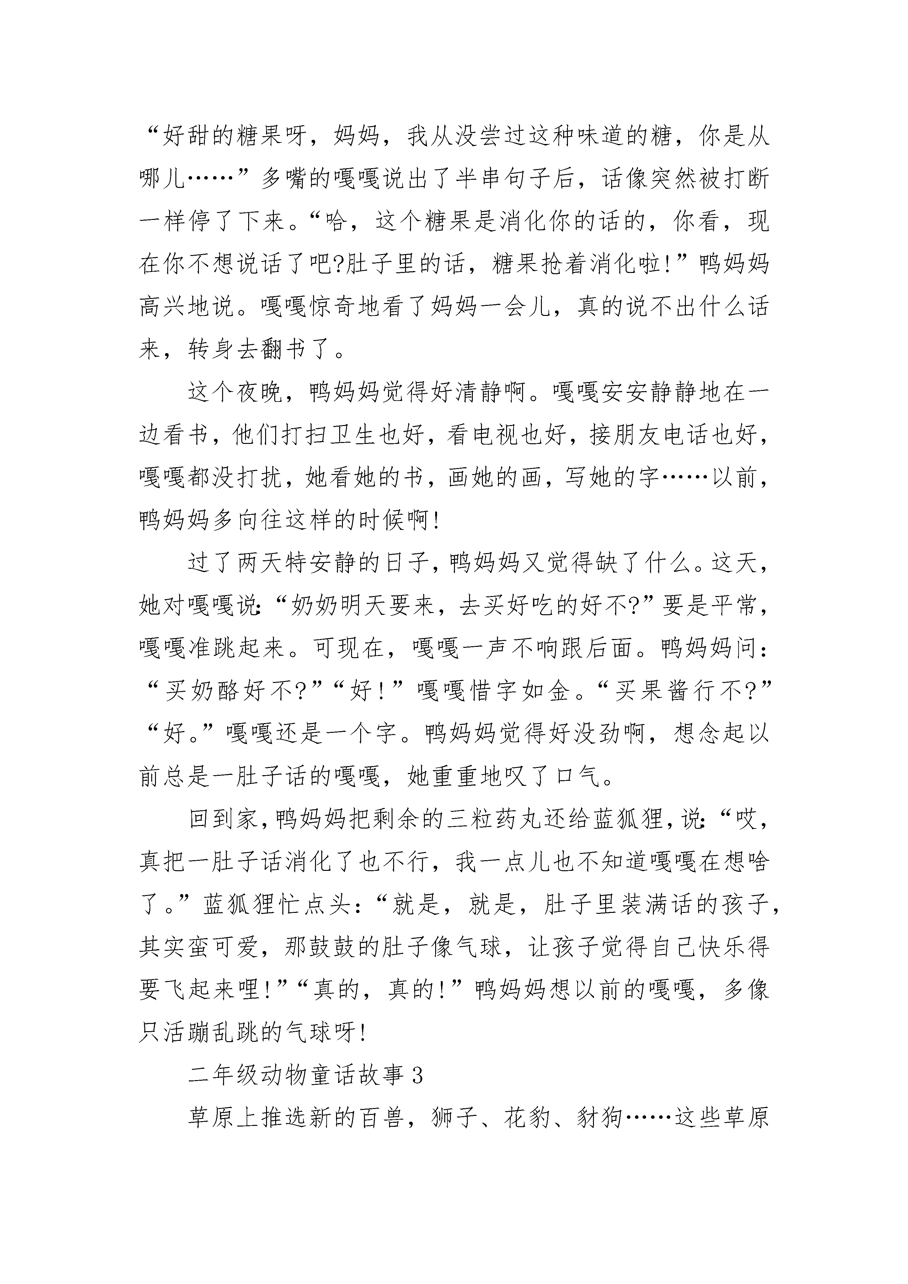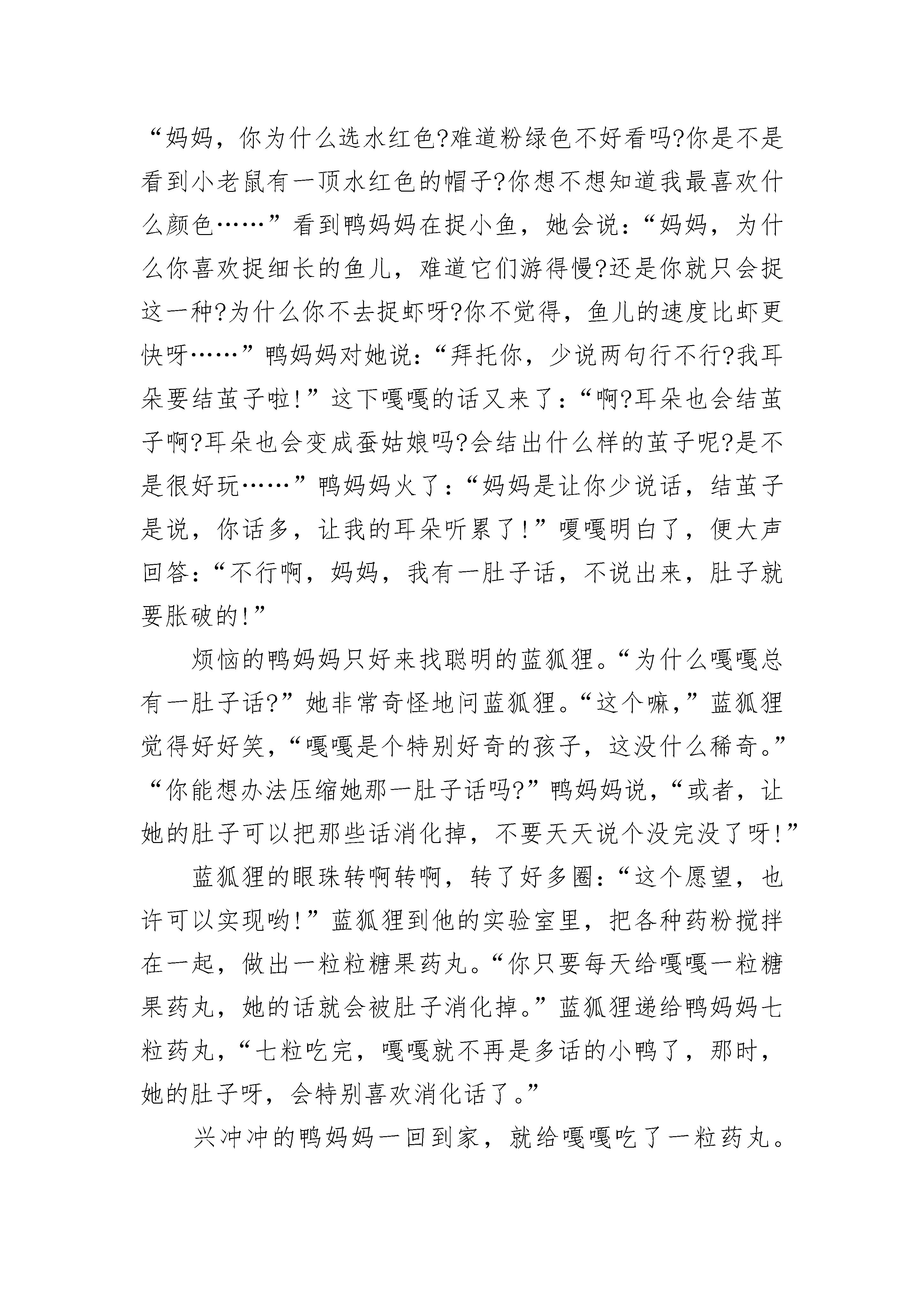 二年级动物童话故事5篇二年级自编童话故事二年级格林童话故事二年级小学生童话故事经典童话故事二年级安徒生童话故事二年级5篇二年级动物童话故事1在一片茂密的森林深处,有一潭清澈见底的池塘,池边有一缕缕阳光侥幸从这密不透风的树林里射过来,打在婀娜的荷花上。一阵微风拂过,几丝仅余的阳光调皮地蹦跳着,似是在比谁跳得比荷花高。一只青蛙不雅地从水里“噗通”一声跳到了如圆盘般精致又通体碧绿的荷叶上,带起的水珠扬起一道优雅的弧度,旋即落在了荷花和荷叶上,圆滚滚的,甚是可爱。安宁平静的曲调被打乱了。小青蛙“呱呱”地叫嚣起来,越来越大声。被喧闹的声音吵醒,荷花姐姐和荷叶弟弟有点烦躁地睁开眼。荷花姐姐开口道:“青蛙弟弟呀,你能到别处唱歌吗?这样打扰到我和荷叶弟弟休息了,好不好?”嚣张的青蛙听了这话,叫声只是顿了一顿,立马又叫起来,还故意在荷叶弟弟身上蹦来蹦去的,很是可恶。荷叶弟弟皱起眉头,嘟着嘴,呻吟着:“哎呦,青蛙哥哥!你别跳了,你弄疼我了!”青蛙非但不停止,还边跳边发出难听的歌声,可恨极了。荷花姐姐也不再劝告:“哼,青蛙弟弟,没想到你品质这么恶劣,真应该让你去尝尝人类的滋味。你以前还是小蝌蚪的时候,可是很乖的哪!”青蛙弟弟听了这满含责备的话语,不但不生气,还好奇地停了下来,低下头沉思着:哼,我倒要看看,人类有多厉害!再有本事也没我青蛙大王的本领大!青蛙弟弟佯装诚恳地对荷花和荷叶道歉,并说:“假如你们能告诉我人类的地址,我就还像以前那样乖,好不好?”荷花姐姐和荷叶弟弟听了这话,兴高采烈地告诉了青蛙弟弟人类的地址。青蛙大张旗鼓地向着目的地出发,遇到了人类。可是他万万没想到,他会被人类给抓住!他低估了人类,高估了自己。在人类即将吃掉他之前,青蛙告诉了人类他的经过,讲完了故事,青蛙哭了,他后悔了,后悔自己的狂妄,自私。青蛙更没有想到,人类在听完他的经历后,还愿意给他一个改过自新的机会。他又一次留下了悔恨交加的眼泪,在人类的目送下他回到了他曾经感到无比烦躁的池塘。这里是多么幽静,多么美丽!青蛙弟弟第一次这样爱着自己的“家”,他真诚地向荷花姐姐和荷叶弟弟道歉,像小时候那样,用平和而善良的心珍惜如今的幸福生活……二年级动物童话故事2小花鸭嘎嘎是个多嘴鸭。看到鸭妈妈在织毛衣,她会说:“妈妈,你为什么选水红色?难道粉绿色不好看吗?你是不是看到小老鼠有一顶水红色的帽子?你想不想知道我最喜欢什么颜色……”看到鸭妈妈在捉小鱼,她会说:“妈妈,为什么你喜欢捉细长的鱼儿,难道它们游得慢?还是你就只会捉这一种?为什么你不去捉虾呀?你不觉得,鱼儿的速度比虾更快呀……”鸭妈妈对她说:“拜托你,少说两句行不行?我耳朵要结茧子啦!”这下嘎嘎的话又来了:“啊?耳朵也会结茧子啊?耳朵也会变成蚕姑娘吗?会结出什么样的茧子呢?是不是很好玩……”鸭妈妈火了:“妈妈是让你少说话,结茧子是说,你话多,让我的耳朵听累了!”嗄嘎明白了,便大声回答:“不行啊,妈妈,我有一肚子话,不说出来,肚子就要胀破的!”烦恼的鸭妈妈只好来找聪明的蓝狐狸。“为什么嘎嘎总有一肚子话?”她非常奇怪地问蓝狐狸。“这个嘛,”蓝狐狸觉得好好笑,“嘎嘎是个特别好奇的孩子,这没什么稀奇。”“你能想办法压缩她那一肚子话吗?”鸭妈妈说,“或者,让她的肚子可以把那些话消化掉,不要天天说个没完没了呀!”蓝狐狸的眼珠转啊转啊,转了好多圈:“这个愿望,也许可以实现哟!”蓝狐狸到他的实验室里,把各种药粉搅拌在一起,做出一粒粒糖果药丸。“你只要每天给嘎嘎一粒糖果药丸,她的话就会被肚子消化掉。”蓝狐狸递给鸭妈妈七粒药丸,“七粒吃完,嘎嘎就不再是多话的小鸭了,那时,她的肚子呀,会特别喜欢消化话了。”兴冲冲的鸭妈妈一回到家,就给嘎嘎吃了一粒药丸。“好甜的糖果呀,妈妈,我从没尝过这种味道的糖,你是从哪儿……”多嘴的嘎嘎说出了半串句子后,话像突然被打断一样停了下来。“哈,这个糖果是消化你的话的,你看,现在你不想说话了吧?肚子里的话,糖果抢着消化啦!”鸭妈妈高兴地说。嘎嘎惊奇地看了妈妈一会儿,真的说不出什么话来,转身去翻书了。这个夜晚,鸭妈妈觉得好清静啊。嘎嘎安安静静地在一边看书,他们打扫卫生也好,看电视也好,接朋友电话也好,嘎嘎都没打扰,她看她的书,画她的画,写她的字……以前,鸭妈妈多向往这样的时候啊!过了两天特安静的日子,鸭妈妈又觉得缺了什么。这天,她对嘎嘎说:“奶奶明天要来,去买好吃的好不?”要是平常,嘎嘎准跳起来。可现在,嘎嘎一声不响跟后面。鸭妈妈问:“买奶酪好不?”“好!”嘎嘎惜字如金。“买果酱行不?”“好。”嘎嘎还是一个字。鸭妈妈觉得好没劲啊,想念起以前总是一肚子话的嘎嘎,她重重地叹了口气。回到家,鸭妈妈把剩余的三粒药丸还给蓝狐狸,说:“哎,真把一肚子话消化了也不行,我一点儿也不知道嘎嘎在想啥了。”蓝狐狸忙点头:“就是,就是,肚子里装满话的孩子