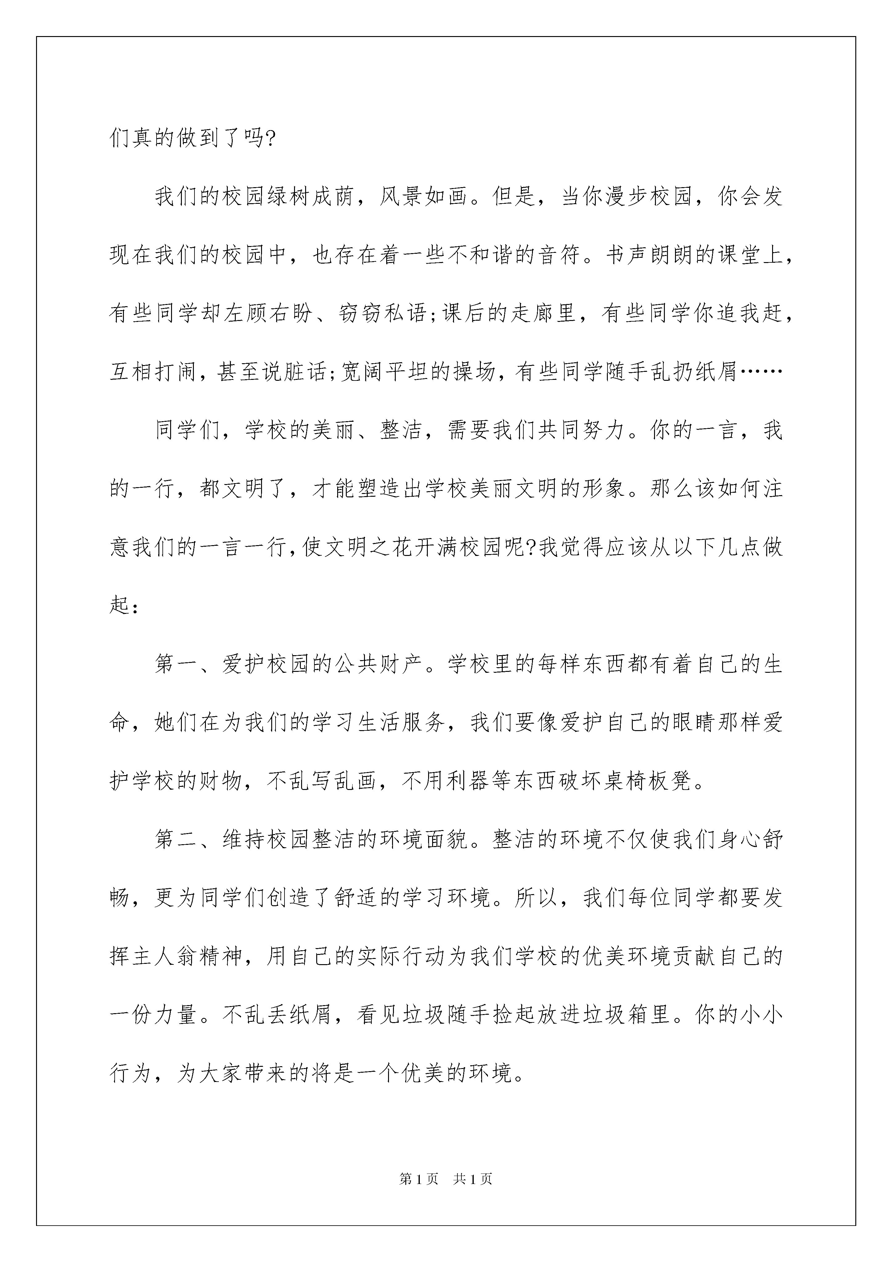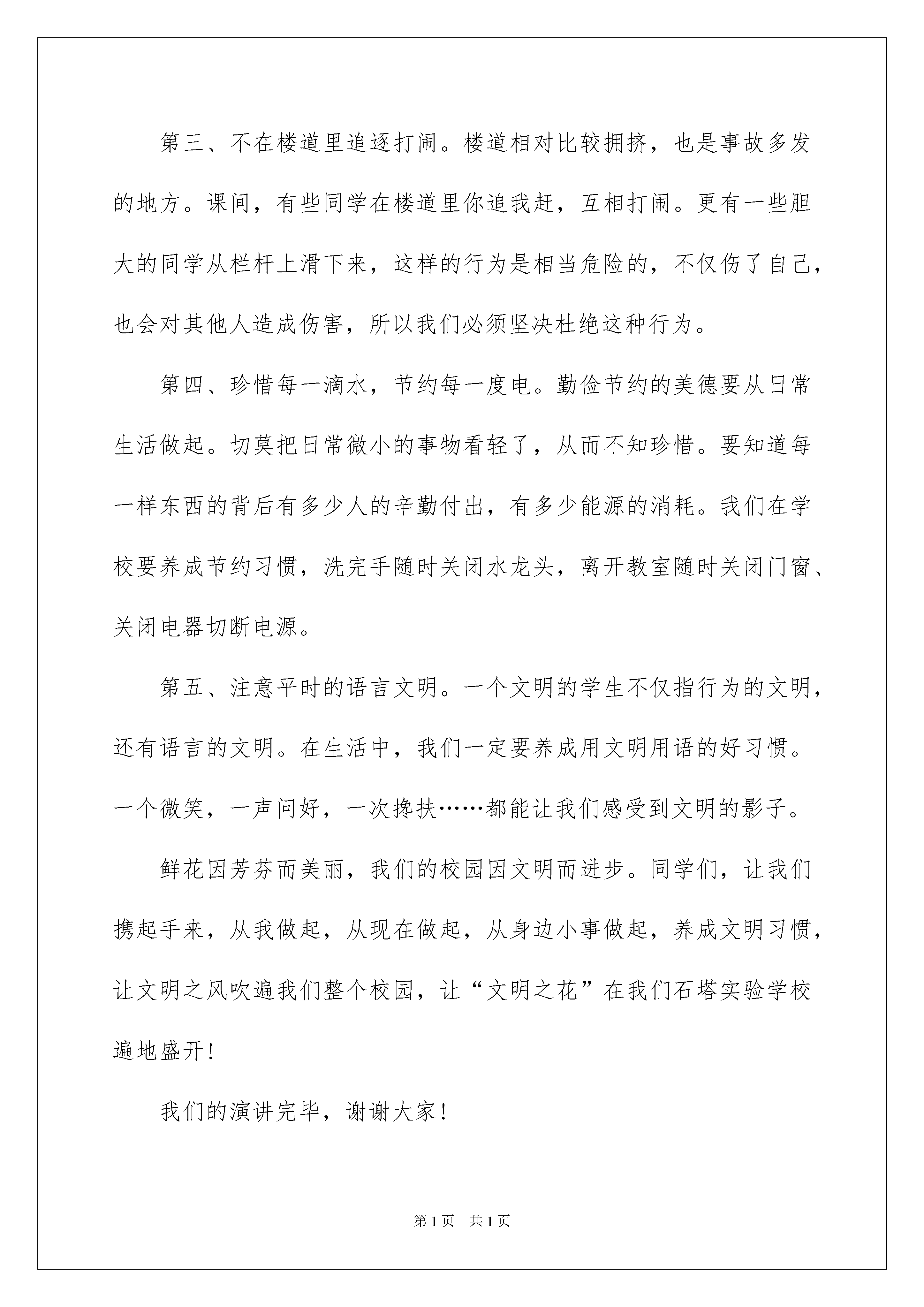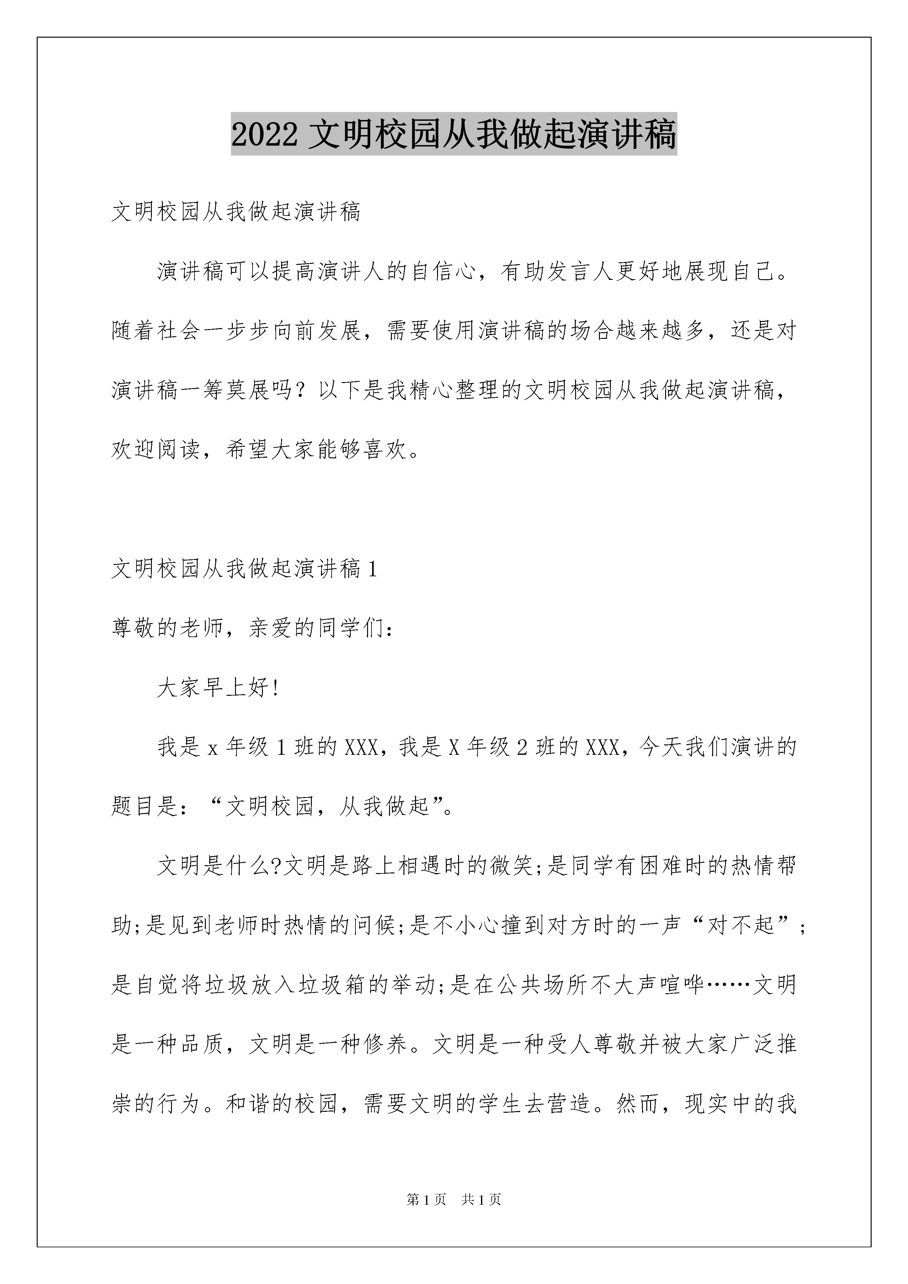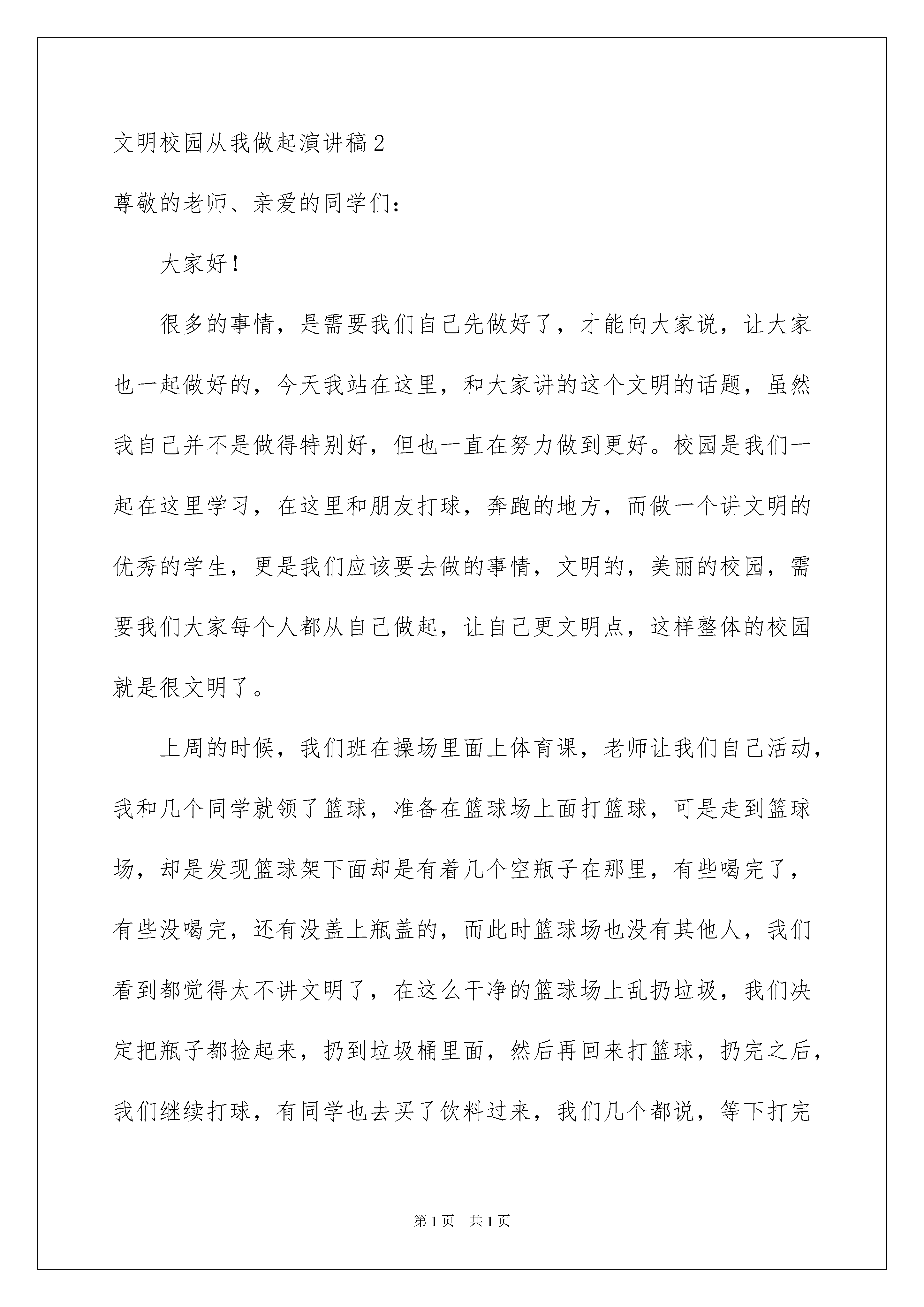 2022文明校园从我做起演讲稿文明校园从我做起演讲稿演讲稿可以提高演讲人的自信心,有助发言人更好地展现自己。随着社会一步步向前发展,需要使用演讲稿的场合越来越多,还是对演讲稿一筹莫展吗?以下是我精心整理的文明校园从我做起演讲稿,欢迎阅读,希望大家能够喜欢。文明校园从我做起演讲稿1尊敬的老师,亲爱的同学们:大家早上好!我是x年级1班的XXX,我是X年级2班的XXX,今天我们演讲的题目是:“文明校园,从我做起”。文明是什么?文明是路上相遇时的微笑;是同学有困难时的热情帮助;是见到老师时热情的问候;是不小心撞到对方时的一声“对不起”;是自觉将垃圾放入垃圾箱的举动;是在公共场所不大声喧哗……文明是一种品质,文明是一种修养。文明是一种受人尊敬并被大家广泛推崇的行为。和谐的校园,需要文明的学生去营造。然而,现实中的我们真的做到了吗?我们的校园绿树成荫,风景如画。但是,当你漫步校园,你会发现在我们的校园中,也存在着一些不和谐的音符。书声朗朗的课堂上,有些同学却左顾右盼、窃窃私语;课后的走廊里,有些同学你追我赶,互相打闹,甚至说脏话;宽阔平坦的操场,有些同学随手乱扔纸屑……同学们,学校的美丽、整洁,需要我们共同努力。你的一言,我的一行,都文明了,才能塑造出学校美丽文明的形象。那么该如何注意我们的一言一行,使文明之花开满校园呢?我觉得应该从以下几点做起:第一、爱护校园的公共财产。学校里的每样东西都有着自己的生命,她们在为我们的学习生活服务,我们要像爱护自己的眼睛那样爱护学校的财物,不乱写乱画,不用利器等东西破坏桌椅板凳。第二、维持校园整洁的环境面貌。整洁的环境不仅使我们身心舒畅,更为同学们创造了舒适的学习环境。所以,我们每位同学都要发挥主人翁精神,用自己的实际行动为我们学校的优美环境贡献自己的一份力量。不乱丢纸屑,看见垃圾随手捡起放进垃圾箱里。你的小小行为,为大家带来的将是一个优美的环境。第三、不在楼道里追逐打闹。楼道相对比较拥挤,也是事故多发的地方。课间,有些同学在楼道里你追我赶,互相打闹。更有一些胆大的同学从栏杆上滑下来,这样的行为是相当危险的,不仅伤了自己,也会对其他人造成伤害,所以我们必须坚决杜绝这种行为。第四、珍惜每一滴水,节约每一度电。勤俭节约的美德要从日常生活做起。切莫把日常微小的事物看轻了,从而不知珍惜。要知道每一样东西的背后有多少人的辛勤付出,有多少能源的消耗。我们在学校要养成节约习惯,洗完手随时关闭水龙头,离开教室随时关闭门窗、关闭电器切断电源。第五、注意平时的语言文明。一个文明的学生不仅指行为的文明,还有语言的文明。在生活中,我们一定要养成用文明用语的好习惯。一个微笑,一声问好,一次搀扶……都能让我们感受到文明的影子。鲜花因芳芬而美丽,我们的校园因文明而进步。同学们,让我们携起手来,从我做起,从现在做起,从身边小事做起,养成文明习惯,让文明之风吹遍我们整个校园,让“文明之花”在我们石塔实验学校遍地盛开!我们的演讲完毕,谢谢大家!文明校园从我做起演讲稿2尊敬的老师、亲爱的同学们:大家好!很多的事情,是需要我们自己先做好了,才能向大家说,让大家也一起做好的,今天我站在这里,和大家讲的这个文明的话题,虽然我自己并不是做得特别好,但也一直在努力做到更好。校园是我们一起在这里学习,在这里和朋友打球,奔跑的地方,而做一个讲文明的优秀的学生,更是我们应该要去做的事情,文明的,美丽的校园,需要我们大家每个人都从自己做起,让自己更文明点,这样整体的校园就是很文明了。上周的时候,我们班在操场里面上体育课,老师让我们自己活动,我和几个同学就领了篮球,准备在篮球场上面打篮球,可是走到篮球场,却是发现篮球架下面却是有着几个空瓶子在那里,有些喝完了,有些没喝完,还有没盖上瓶盖的,而此时篮球场也没有其他人,我们看到都觉得太不讲文明了,在这么干净的篮球场上乱扔垃圾,我们决定把瓶子都捡起来,扔到垃圾桶里面,然后再回来打篮球,扔完之后,我们继续打球,有同学也去买了饮料过来,我们几个都说,等下打完球,一定得把瓶子都带走,都相互提醒下。体育课快结束的时候,老师叫我们集合,我们急忙把瓶子都收了起来,喝完了的就扔进了垃圾桶,没喝完的就先带走,确保篮球场干干净净的。这件事一直都在我脑海里,随后的几天,我也时刻留心我们的校园,还发现还有好多是不文明的现象,像实验楼二楼雪白的楼梯间里面却是有几个黑漆漆的脚印,虽然已经有一段时间了,但是也是同学们留下来的不文明的证据,在食堂里面,也会发现,有些同学把不吃的食物丢在桌子上,吃完饭之后也不收拾,还有我们的草地,大家可以看到那上面有一条很光秃秃的伤痕,那是同学们为了图方便,抄