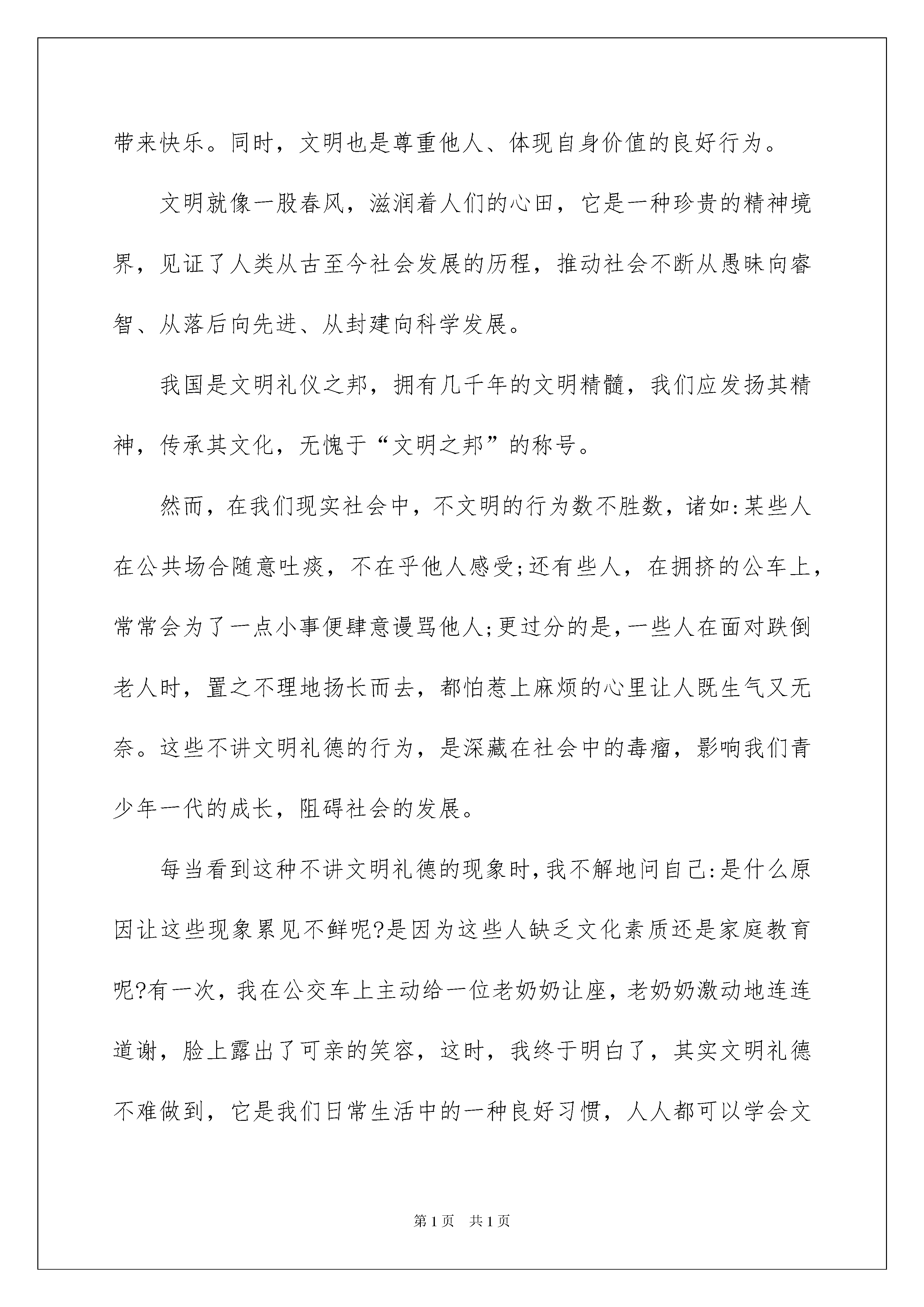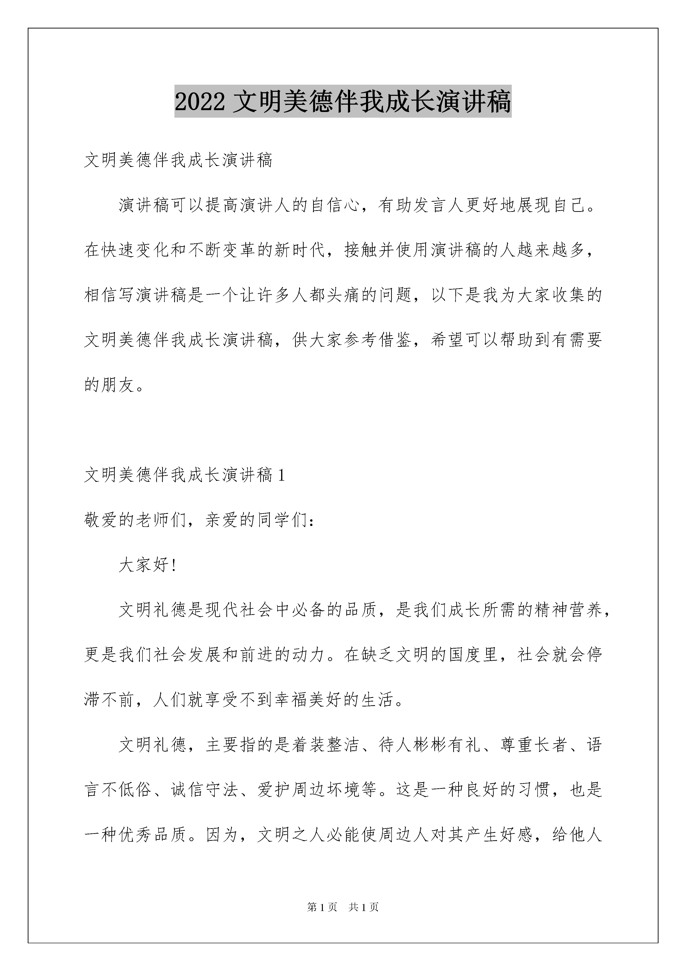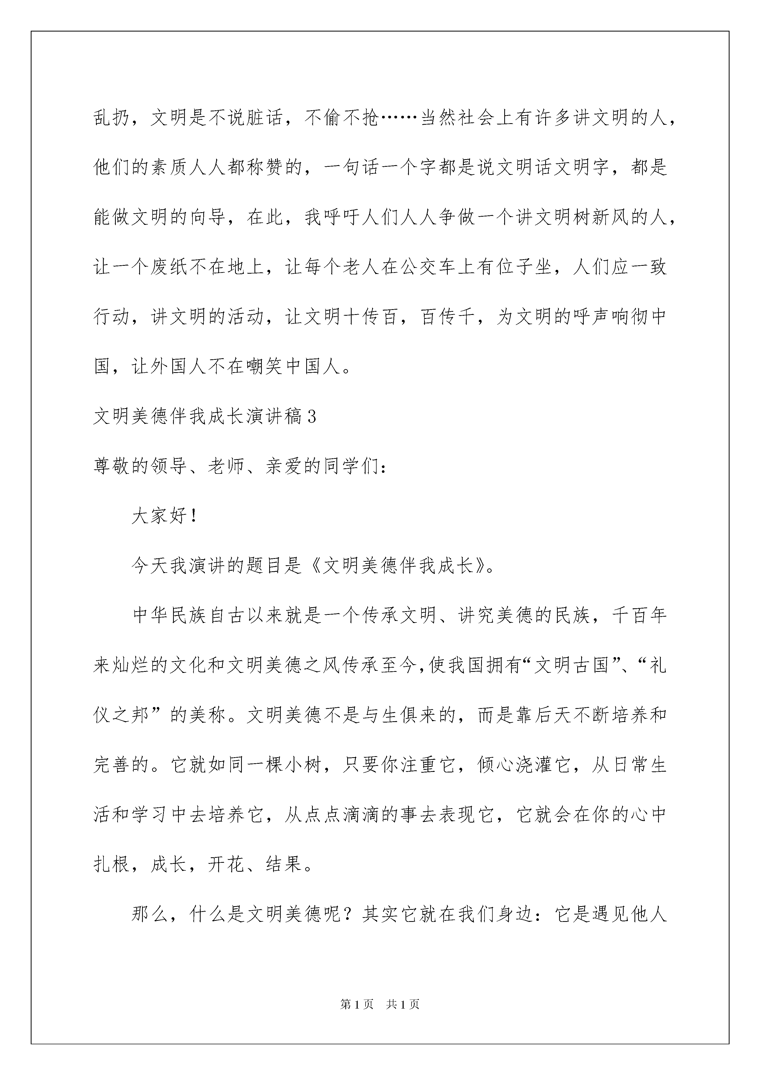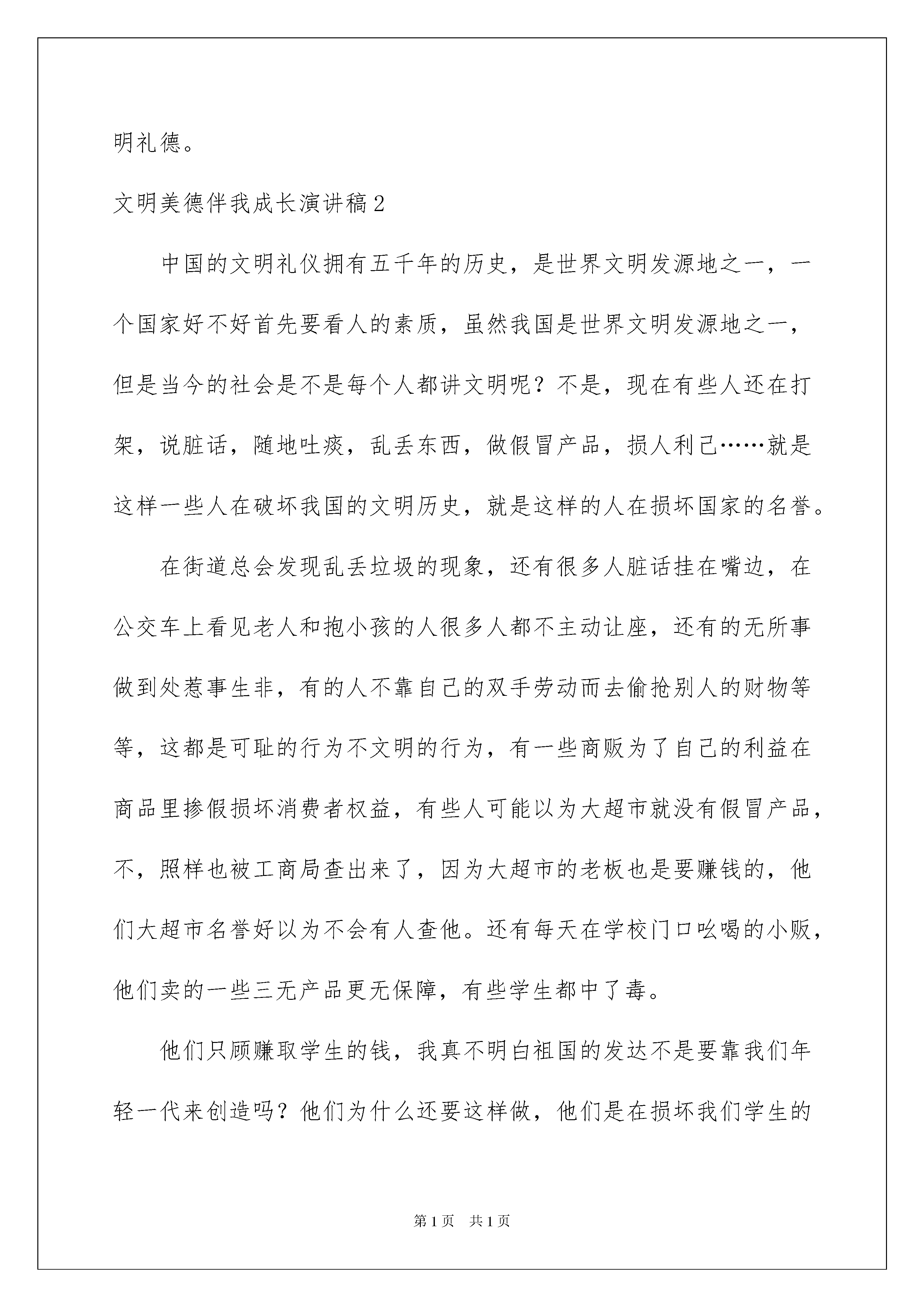 2022文明美德伴我成长演讲稿文明美德伴我成长演讲稿演讲稿可以提高演讲人的自信心,有助发言人更好地展现自己。在快速变化和不断变革的新时代,接触并使用演讲稿的人越来越多,相信写演讲稿是一个让许多人都头痛的问题,以下是我为大家收集的文明美德伴我成长演讲稿,供大家参考借鉴,希望可以帮助到有需要的朋友。文明美德伴我成长演讲稿1敬爱的老师们,亲爱的同学们:大家好!文明礼德是现代社会中必备的品质,是我们成长所需的精神营养,更是我们社会发展和前进的动力。在缺乏文明的国度里,社会就会停滞不前,人们就享受不到幸福美好的生活。文明礼德,主要指的是着装整洁、待人彬彬有礼、尊重长者、语言不低俗、诚信守法、爱护周边坏境等。这是一种良好的习惯,也是一种优秀品质。因为,文明之人必能使周边人对其产生好感,给他人带来快乐。同时,文明也是尊重他人、体现自身价值的良好行为。文明就像一股春风,滋润着人们的心田,它是一种珍贵的精神境界,见证了人类从古至今社会发展的历程,推动社会不断从愚昧向睿智、从落后向先进、从封建向科学发展。我国是文明礼仪之邦,拥有几千年的文明精髓,我们应发扬其精神,传承其文化,无愧于“文明之邦”的称号。然而,在我们现实社会中,不文明的行为数不胜数,诸如:某些人在公共场合随意吐痰,不在乎他人感受;还有些人,在拥挤的公车上,常常会为了一点小事便肆意谩骂他人;更过分的是,一些人在面对跌倒老人时,置之不理地扬长而去,都怕惹上麻烦的心里让人既生气又无奈。这些不讲文明礼德的行为,是深藏在社会中的毒瘤,影响我们青少年一代的成长,阻碍社会的发展。每当看到这种不讲文明礼德的现象时,我不解地问自己:是什么原因让这些现象累见不鲜呢?是因为这些人缺乏文化素质还是家庭教育呢?有一次,我在公交车上主动给一位老奶奶让座,老奶奶激动地连连道谢,脸上露出了可亲的笑容,这时,我终于明白了,其实文明礼德不难做到,它是我们日常生活中的一种良好习惯,人人都可以学会文明礼德。文明美德伴我成长演讲稿2中国的文明礼仪拥有五千年的历史,是世界文明发源地之一,一个国家好不好首先要看人的素质,虽然我国是世界文明发源地之一,但是当今的社会是不是每个人都讲文明呢?不是,现在有些人还在打架,说脏话,随地吐痰,乱丢东西,做假冒产品,损人利己……就是这样一些人在破坏我国的文明历史,就是这样的人在损坏国家的名誉。在街道总会发现乱丢垃圾的现象,还有很多人脏话挂在嘴边,在公交车上看见老人和抱小孩的人很多人都不主动让座,还有的无所事做到处惹事生非,有的人不靠自己的双手劳动而去偷抢别人的财物等等,这都是可耻的行为不文明的行为,有一些商贩为了自己的利益在商品里掺假损坏消费者权益,有些人可能以为大超市就没有假冒产品,不,照样也被工商局查出来了,因为大超市的老板也是要赚钱的,他们大超市名誉好以为不会有人查他。还有每天在学校门口吆喝的小贩,他们卖的一些三无产品更无保障,有些学生都中了毒。他们只顾赚取学生的钱,我真不明白祖国的发达不是要靠我们年轻一代来创造吗?他们为什么还要这样做,他们是在损坏我们学生的身体,让祖国不发达他们自己也过不上好日子的。新闻经常报道一些商店出售假酒假烟等,他们可能不知道假烟假酒和其他假冒产品对人的伤害,轻的生个小病,重的可让人死亡,尽管有些商贩明知假冒产品对人的伤害但是他们还在销售,难道他们的心里就不惭愧吗?如果换一个角度想想是他们自己吃了,他会怎么想,假如他死了他的亲人又该找谁,如果每个人讲文明讲良心这种事会出现吗?有一个故事是一对夫妇,他们开了一家酒店,以诚为本生意很红火,人们都称赞这个卖酒的店子物美价廉,可是,有一天,丈夫出去了只有妻子在家,有一个人来买酒,而没有想到妻子在酒中掺了水多卖了5元钱,晚上丈夫回来一听气得狗急跳墙,对妻子说:"你把我们最有价值的东西"信誉"就用5元钱卖掉了".果然,从此他们的酒店不再红火,妻子后来得了重病,家里没有钱治疗在快要死时,妻子含着泪对丈夫说:"我明白了一个商人最重要的是信誉,没有这个生意一定会破产".俗话说躲得初一躲不过十五,只有讲文明守信用的商人才会被百姓称为好商人,一个细节一个小事你只要用心处理一定会处理好的。有人会说文明是什么,文明是一次给人让座,文明是一张废纸不乱扔,文明是不说脏话,不偷不抢……当然社会上有许多讲文明的人,他们的素质人人都称赞的,一句话一个字都是说文明话文明字,都是能做文明的向导,在此,我呼吁人们人人争做一个讲文明树新风的人,让一个废纸不在地上,让每个老人在公交车上有位子坐,人们应一致行动,讲文明的活动,让文明十传百,百传千,为文明的呼声响彻中国,让外国人不在嘲笑中国人。文明美德伴我